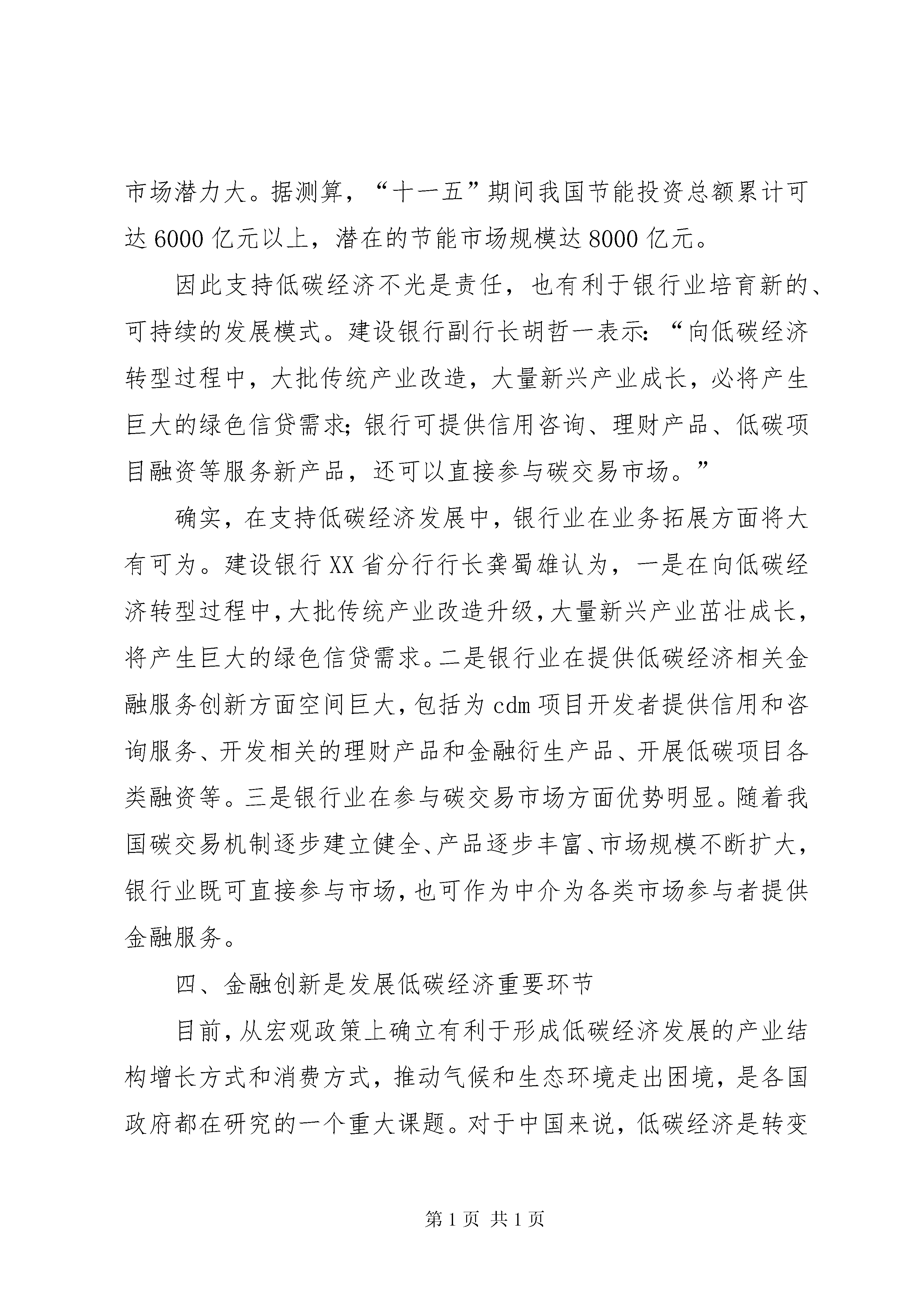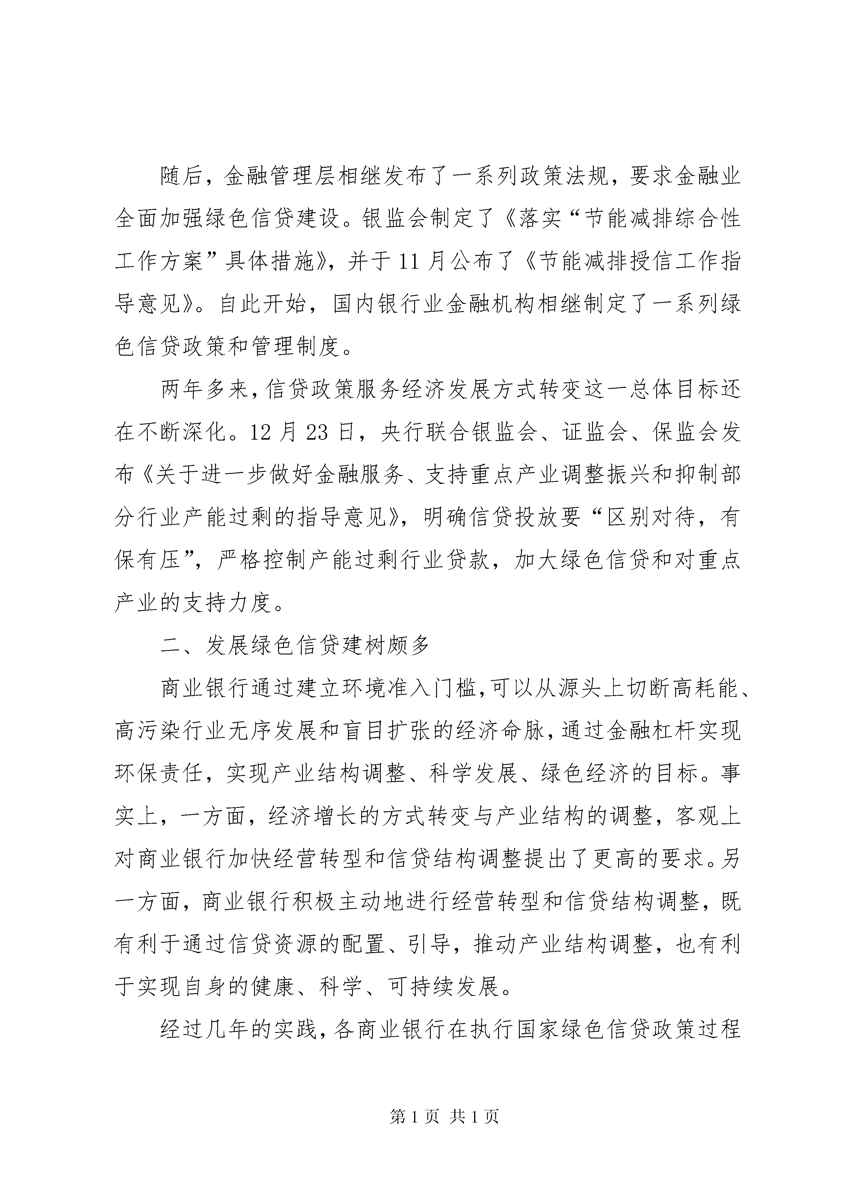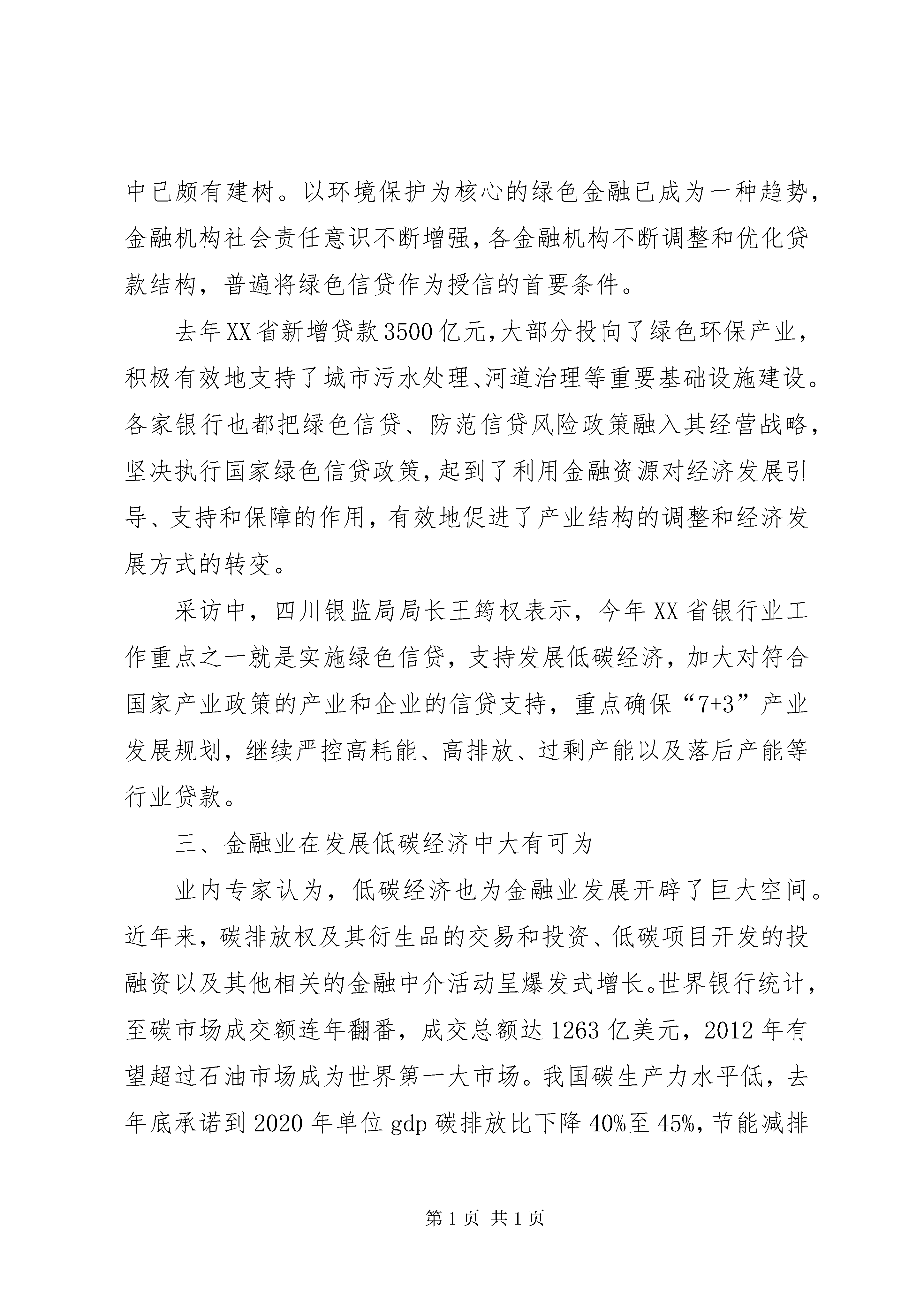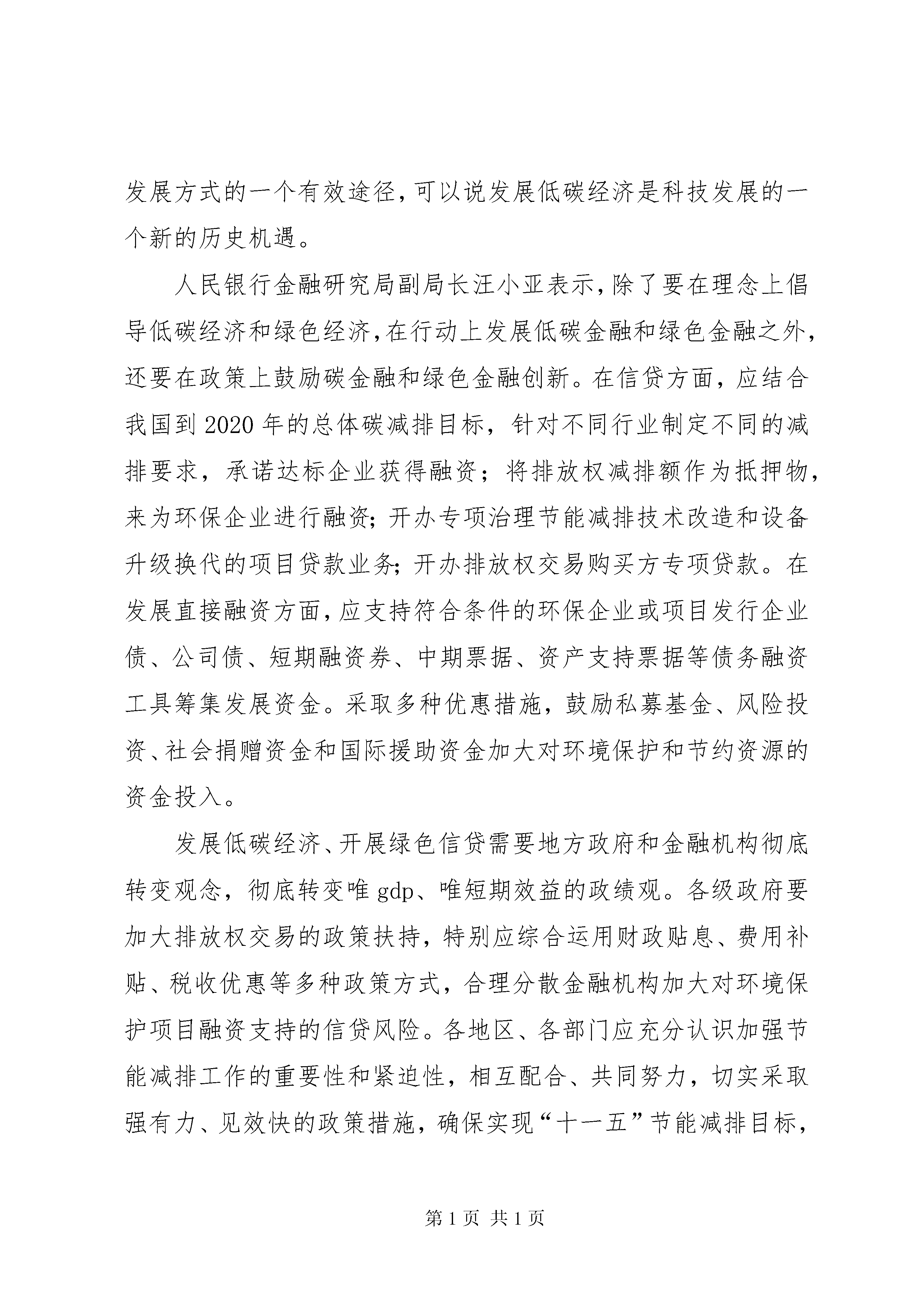 助力低碳经济调查研究报告加快转变经济发展方式,是党中央、国务院着眼于我国经济社会全面协调可持续发展的重大战略部署。国务院日前召开全国节能减排工作电视电话会议,动员和部署加强节能减排工作,强调要采取强有力的手段淘汰落后产能。会议再次显示出中国政府高度重视节能减排、发展新能源和提高能源效率,早已将其作为推动产业升级、调整经济结构和转变发展方式的重要任务。金融作为现代经济的核心,在引导和支持转变经济发展方式中,发挥着不可替代的积极作用。一、金融政策大力支持绿色信贷加快转变经济发展方式,除了运用常规的行政、法律、税收等手段外,应充分发挥金融业在资源配置中的“调节阀”、“控制闸”作用。早在7月,国家环保总局、央行、银监会三部委联合发布了《关于落实环保政策法规防范信贷风险的意见》,首次提出将环保调控手段通过金融杠杆来具体实现的政策,这标志着绿色信贷全面进入节能减排的主战场。通过在金融信贷领域建立环境准入门槛,对限制和淘汰类新建项目,不得提供信贷支持;对于淘汰类项目,应停止各类形式的新增授信支持,并采取措施收回已发放的贷款,从源头上切断高耗能、高污染行业无序发展和盲目扩张的经济命脉,有效地切断严重违法者的资金链条,遏制其投资冲动,解决环境问题,通过信贷发放进行产业结构调整。随后,金融管理层相继发布了一系列政策法规,要求金融业全面加强绿色信贷建设。银监会制定了《落实“节能减排综合性工作方案”具体措施》,并于11月公布了《节能减排授信工作指导意见》。自此开始,国内银行业金融机构相继制定了一系列绿色信贷政策和管理制度。两年多来,信贷政策服务经济发展方式转变这一总体目标还在不断深化。12月23日,央行联合银监会、证监会、保监会发布《关于进一步做好金融服务、支持重点产业调整振兴和抑制部分行业产能过剩的指导意见》,明确信贷投放要“区别对待,有保有压”,严格控制产能过剩行业贷款,加大绿色信贷和对重点产业的支持力度。二、发展绿色信贷建树颇多商业银行通过建立环境准入门槛,可以从源头上切断高耗能、高污染行业无序发展和盲目扩张的经济命脉,通过金融杠杆实现环保责任,实现产业结构调整、科学发展、绿色经济的目标。事实上,一方面,经济增长的方式转变与产业结构的调整,客观上对商业银行加快经营转型和信贷结构调整提出了更高的要求。另一方面,商业银行积极主动地进行经营转型和信贷结构调整,既有利于通过信贷资源的配置、引导,推动产业结构调整,也有利于实现自身的健康、科学、可持续发展。经过几年的实践,各商业银行在执行国家绿色信贷政策过程中已颇有建树。以环境保护为核心的绿色金融已成为一种趋势,金融机构社会责任意识不断增强,各金融机构不断调整和优化贷款结构,普遍将绿色信贷作为授信的首要条件。去年XX省新增贷款3500亿元,大部分投向了绿色环保产业,积极有效地支持了城市污水处理、河道治理等重要基础设施建设。各家银行也都把绿色信贷、防范信贷风险政策融入其经营战略,坚决执行国家绿色信贷政策,起到了利用金融资源对经济发展引导、支持和保障的作用,有效地促进了产业结构的调整和经济发展方式的转变。采访中,四川银监局局长王筠权表示,今年XX省银行业工作重点之一就是实施绿色信贷,支持发展低碳经济,加大对符合国家产业政策的产业和企业的信贷支持,重点确保“7+3”产业发展规划,继续严控高耗能、高排放、过剩产能以及落后产能等行业贷款。三、金融业在发展低碳经济中大有可为业内专家认为,低碳经济也为金融业发展开辟了巨大空间。近年来,碳排放权及其衍生品的交易和投资、低碳项目开发的投融资以及其他相关的金融中介活动呈爆发式增长。世界银行统计,至碳市场成交额连年翻番,成交总额达1263亿美元,2012年有望超过石油市场成为世界第一大市场。我国碳生产力水平低,去年底承诺到2020年单位gdp碳排放比下降40%至45%,节能减排市场潜力大。据测算,“十一五”期间我国节能投资总额累计可达6000亿元以上,潜在的节能市场规模达8000亿元。因此支持低碳经济不光是责任,也有利于银行业培育新的、可持续的发展模式。建设银行副行长胡哲一表示:“向低碳经济转型过程中,大批传统产业改造,大量新兴产业成长,必将产生巨大的绿色信贷需求;银行可提供信用咨询、理财产品、低碳项目融资等服务新产品,还可以直接参与碳交易市场。”确实,在支持低碳经济发展中,银行业在业务拓展方面将大有可为。建设银行XX省分行行长龚蜀雄认为,一是在向低碳经济转型过程中,大批传统产业改造升级,大量新兴产业茁壮成长,将产生巨大的绿色信贷需求。二是银行业在提供低碳经济相关金融服务创新方面空间巨大,包括为cdm项目开发者提供信用和咨询服务、开发相关的理财产品和金融衍生产品、开展低碳项目各类融资等。三是银行业在参与碳交易市场方面优势明显。随着我国碳交易机制逐步建立