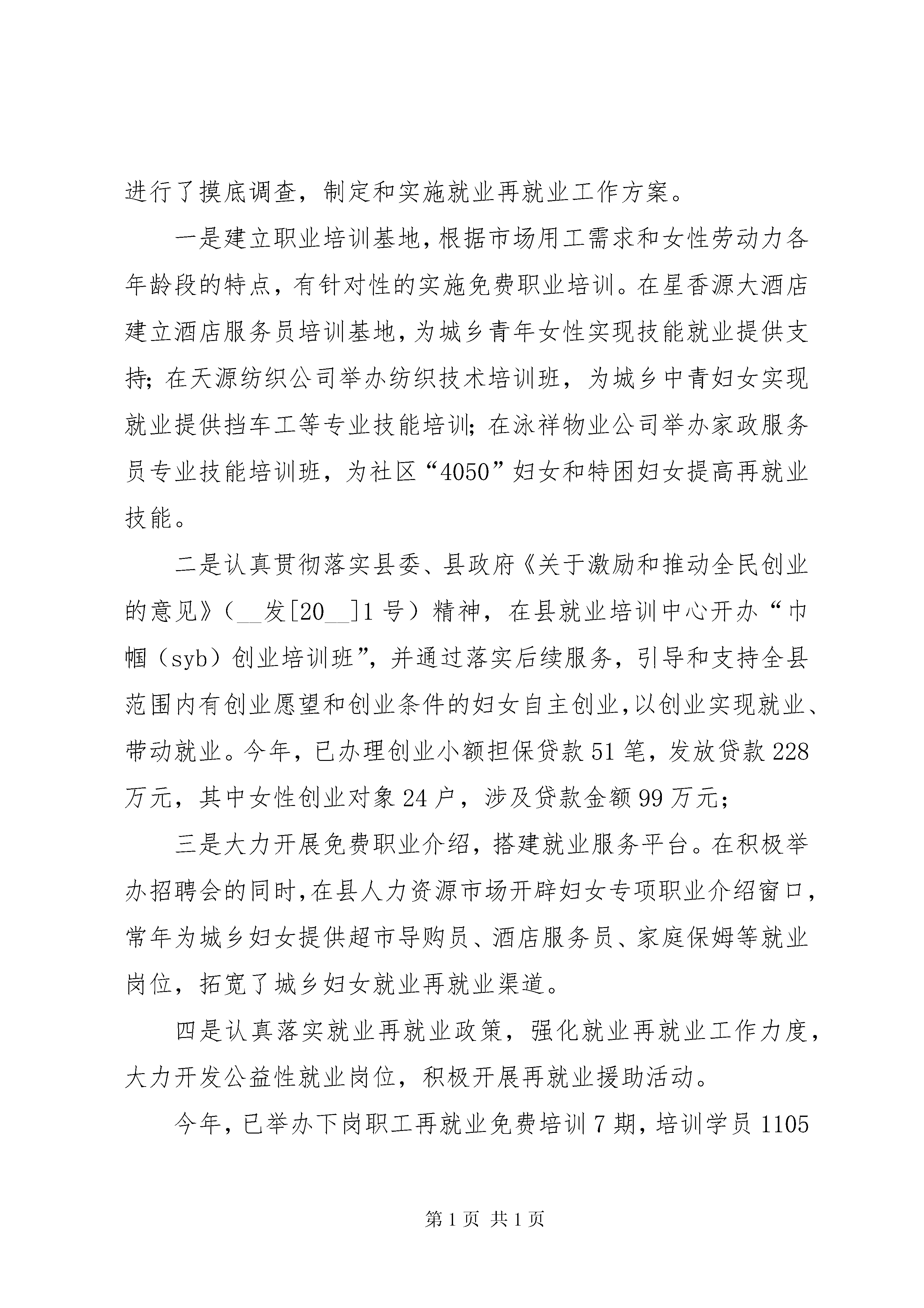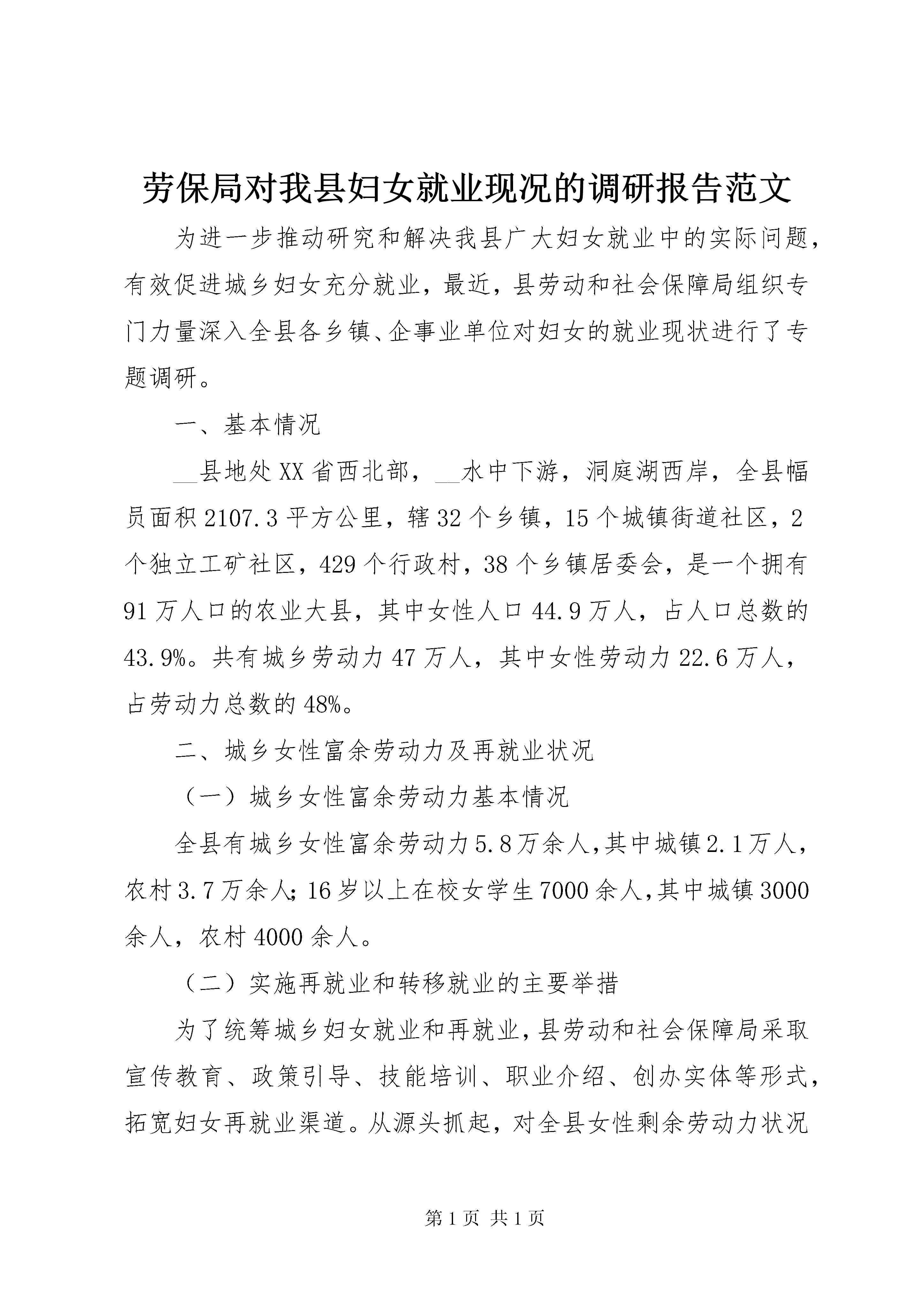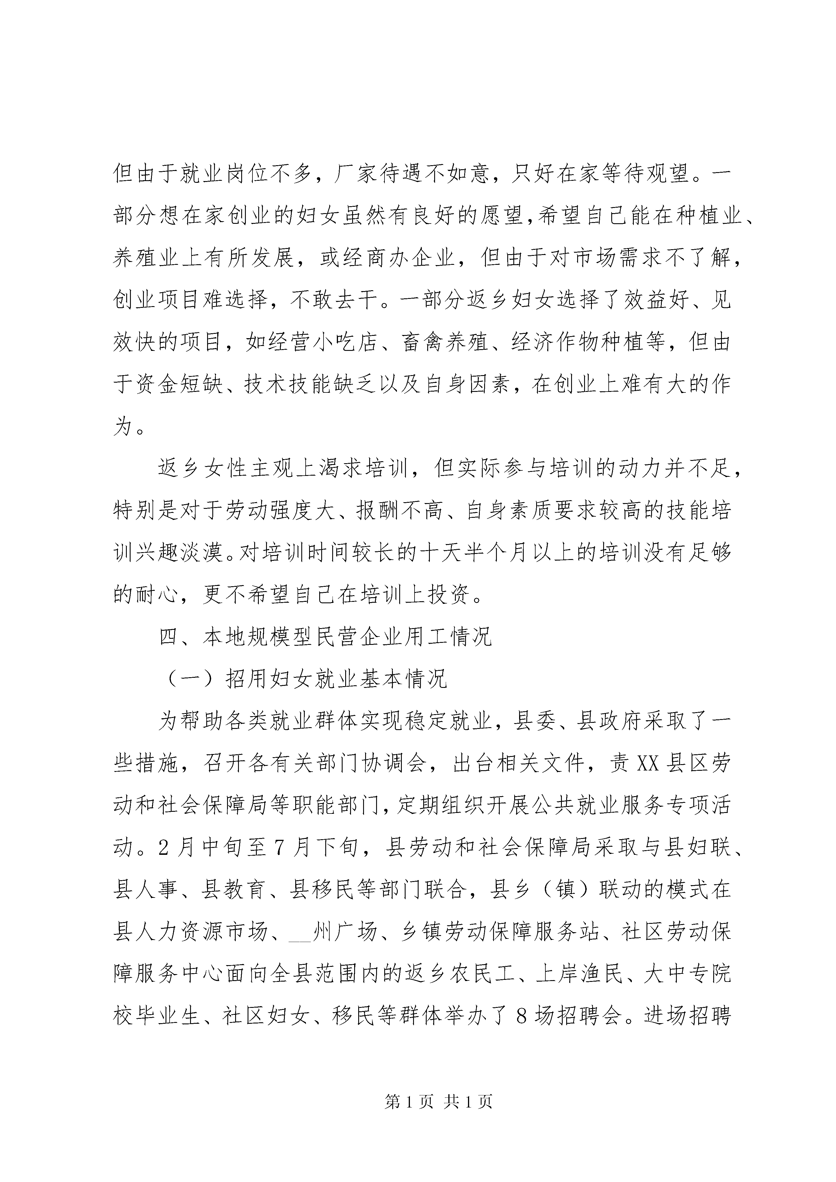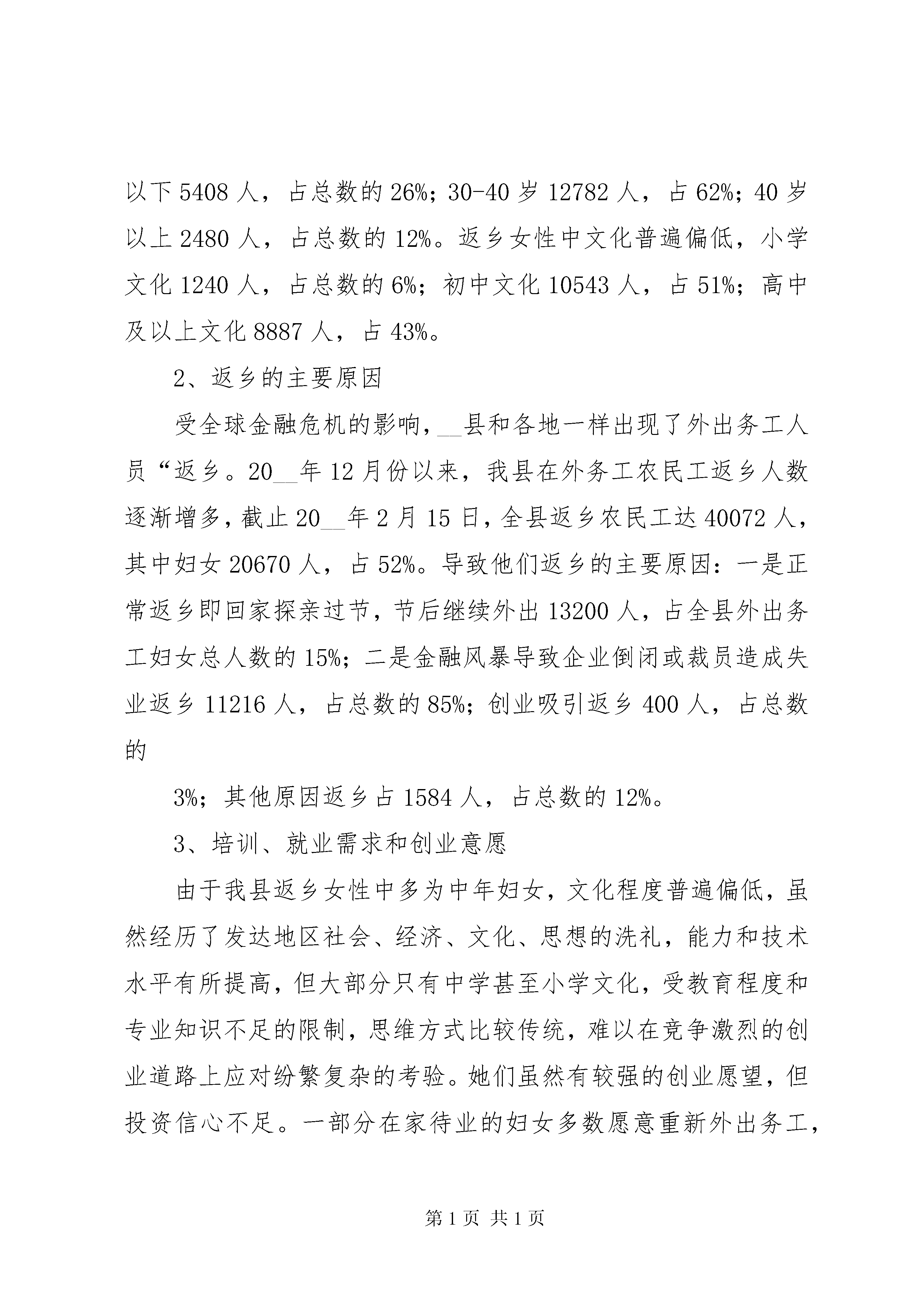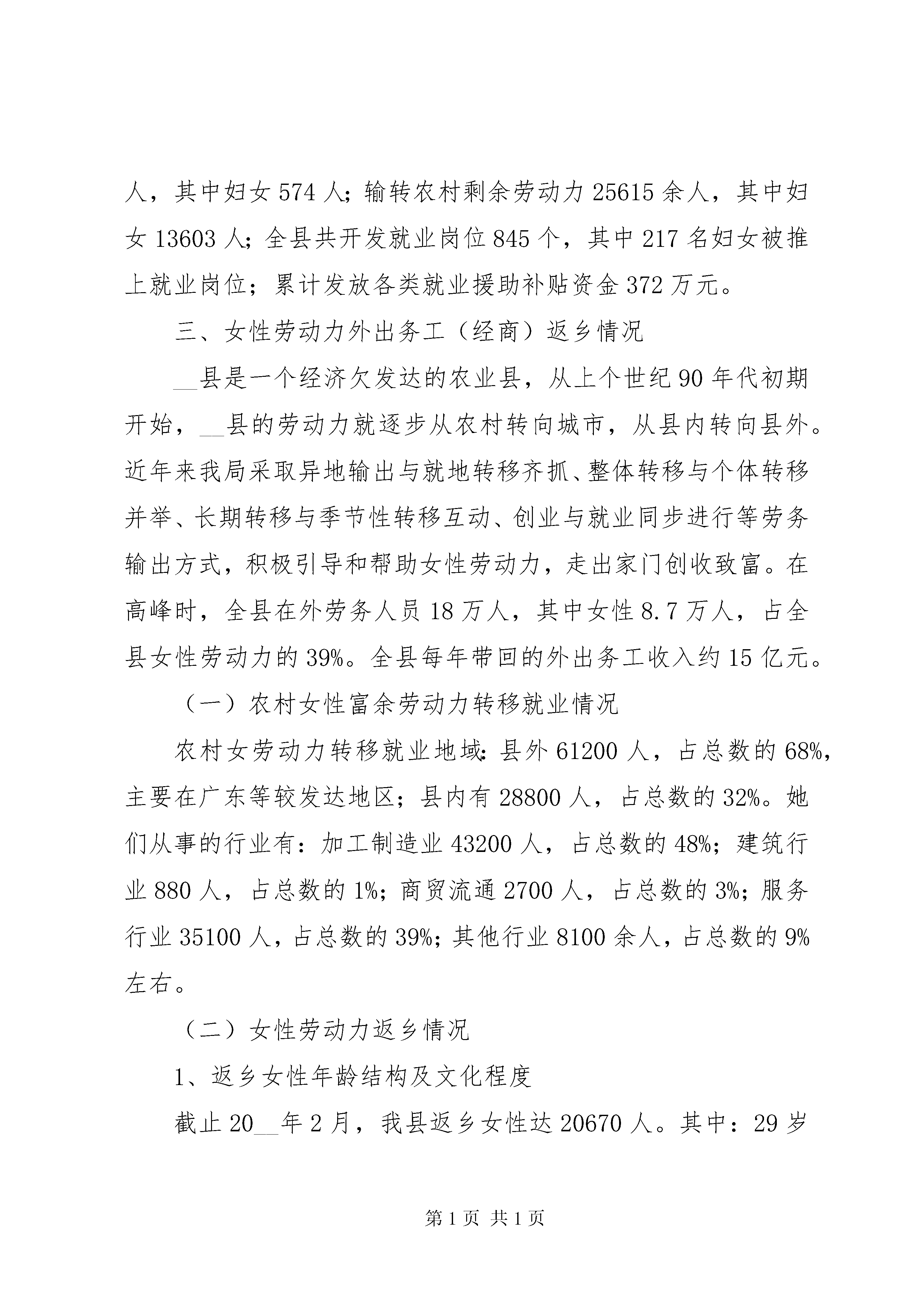 劳保局对我县妇女就业现况的调研报告范文为进一步推动研究和解决我县广大妇女就业中的实际问题,有效促进城乡妇女充分就业,最近,县劳动和社会保障局组织专门力量深入全县各乡镇、企事业单位对妇女的就业现状进行了专题调研。一、基本情况__县地处XX省西北部,__水中下游,洞庭湖西岸,全县幅员面积2107.3平方公里,辖32个乡镇,15个城镇街道社区,2个独立工矿社区,429个行政村,38个乡镇居委会,是一个拥有91万人口的农业大县,其中女性人口44.9万人,占人口总数的43.9%。共有城乡劳动力47万人,其中女性劳动力22.6万人,占劳动力总数的48%。二、城乡女性富余劳动力及再就业状况(一)城乡女性富余劳动力基本情况全县有城乡女性富余劳动力5.8万余人,其中城镇2.1万人,农村3.7万余人;16岁以上在校女学生7000余人,其中城镇3000余人,农村4000余人。(二)实施再就业和转移就业的主要举措为了统筹城乡妇女就业和再就业,县劳动和社会保障局采取宣传教育、政策引导、技能培训、职业介绍、创办实体等形式,拓宽妇女再就业渠道。从源头抓起,对全县女性剩余劳动力状况进行了摸底调查,制定和实施就业再就业工作方案。一是建立职业培训基地,根据市场用工需求和女性劳动力各年龄段的特点,有针对性的实施免费职业培训。在星香源大酒店建立酒店服务员培训基地,为城乡青年女性实现技能就业提供支持;在天源纺织公司举办纺织技术培训班,为城乡中青妇女实现就业提供挡车工等专业技能培训;在泳祥物业公司举办家政服务员专业技能培训班,为社区“4050”妇女和特困妇女提高再就业技能。二是认真贯彻落实县委、县政府《关于激励和推动全民创业的意见》(__发[20__]1号)精神,在县就业培训中心开办“巾帼(syb)创业培训班”,并通过落实后续服务,引导和支持全县范围内有创业愿望和创业条件的妇女自主创业,以创业实现就业、带动就业。今年,已办理创业小额担保贷款51笔,发放贷款228万元,其中女性创业对象24户,涉及贷款金额99万元;三是大力开展免费职业介绍,搭建就业服务平台。在积极举办招聘会的同时,在县人力资源市场开辟妇女专项职业介绍窗口,常年为城乡妇女提供超市导购员、酒店服务员、家庭保姆等就业岗位,拓宽了城乡妇女就业再就业渠道。四是认真落实就业再就业政策,强化就业再就业工作力度,大力开发公益性就业岗位,积极开展再就业援助活动。今年,已举办下岗职工再就业免费培训7期,培训学员1105人,其中妇女574人;输转农村剩余劳动力25615余人,其中妇女13603人;全县共开发就业岗位845个,其中217名妇女被推上就业岗位;累计发放各类就业援助补贴资金372万元。三、女性劳动力外出务工(经商)返乡情况__县是一个经济欠发达的农业县,从上个世纪90年代初期开始,__县的劳动力就逐步从农村转向城市,从县内转向县外。近年来我局采取异地输出与就地转移齐抓、整体转移与个体转移并举、长期转移与季节性转移互动、创业与就业同步进行等劳务输出方式,积极引导和帮助女性劳动力,走出家门创收致富。在高峰时,全县在外劳务人员18万人,其中女性8.7万人,占全县女性劳动力的39%。全县每年带回的外出务工收入约15亿元。(一)农村女性富余劳动力转移就业情况农村女劳动力转移就业地域:县外61200人,占总数的68%,主要在广东等较发达地区;县内有28800人,占总数的32%。她们从事的行业有:加工制造业43200人,占总数的48%;建筑行业880人,占总数的1%;商贸流通2700人,占总数的3%;服务行业35100人,占总数的39%;其他行业8100余人,占总数的9%左右。(二)女性劳动力返乡情况1、返乡女性年龄结构及文化程度截止20__年2月,我县返乡女性达20670人。其中:29岁以下5408人,占总数的26%;30-40岁12782人,占62%;40岁以上2480人,占总数的12%。返乡女性中文化普遍偏低,小学文化1240人,占总数的6%;初中文化10543人,占51%;高中及以上文化8887人,占43%。2、返乡的主要原因受全球金融危机的影响,__县和各地一样出现了外出务工人员“返乡。20__年12月份以来,我县在外务工农民工返乡人数逐渐增多,截止20__年2月15日,全县返乡农民工达40072人,其中妇女20670人,占52%。导致他们返乡的主要原因:一是正常返乡即回家探亲过节,节后继续外出13200人,占全县外出务工妇女总人数的15%;二是金融风暴导致企业倒闭或裁员造成失业返乡11216人,占总数的85%;创业吸引返乡400人,占总数的3%;其他原因返乡占1584人,占总数的12%。3、培训、就业需求和创业意愿由于我县返乡女性中多为中年妇女,文化程度普遍偏低,虽然经历了发达地区社会、经济、