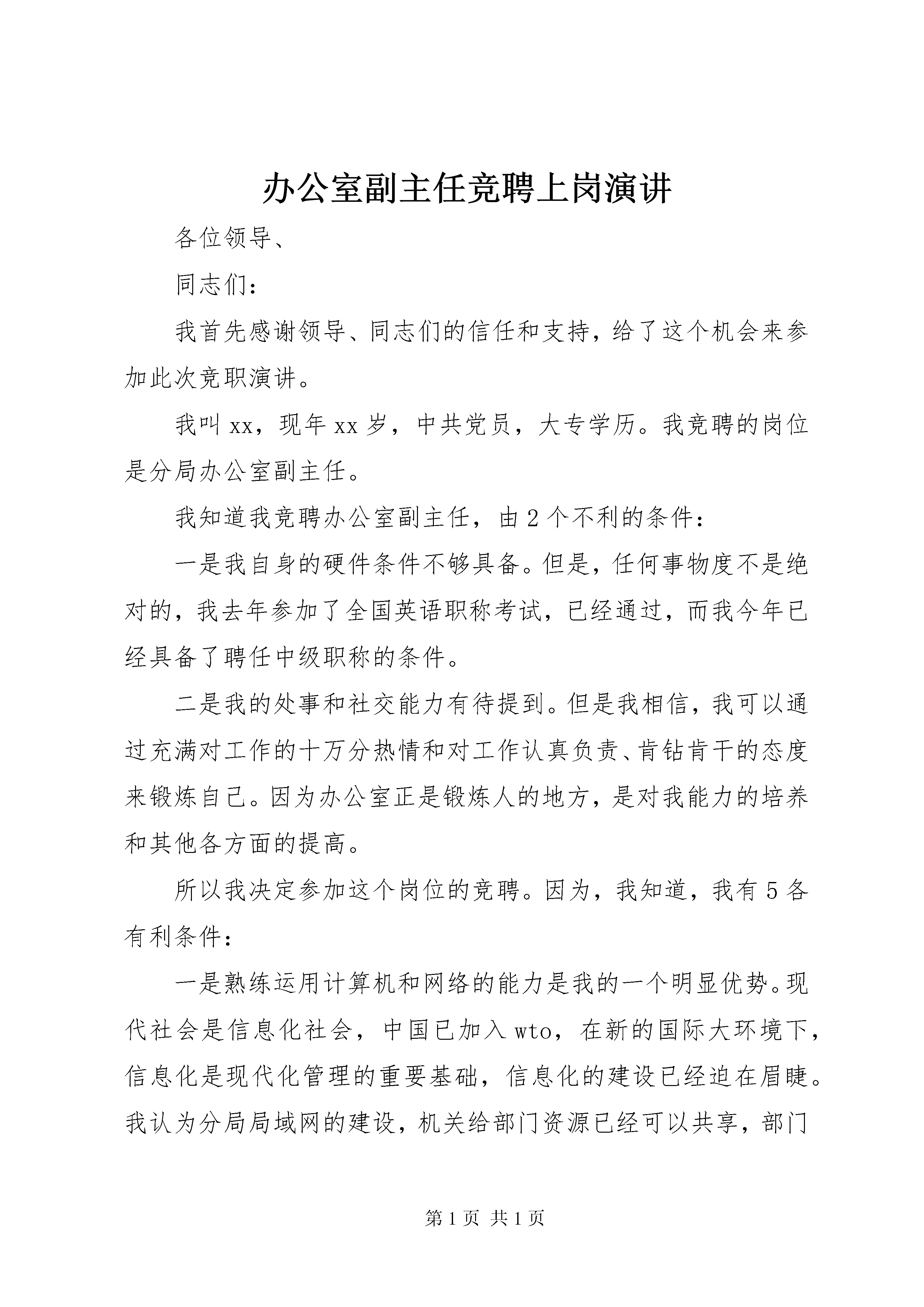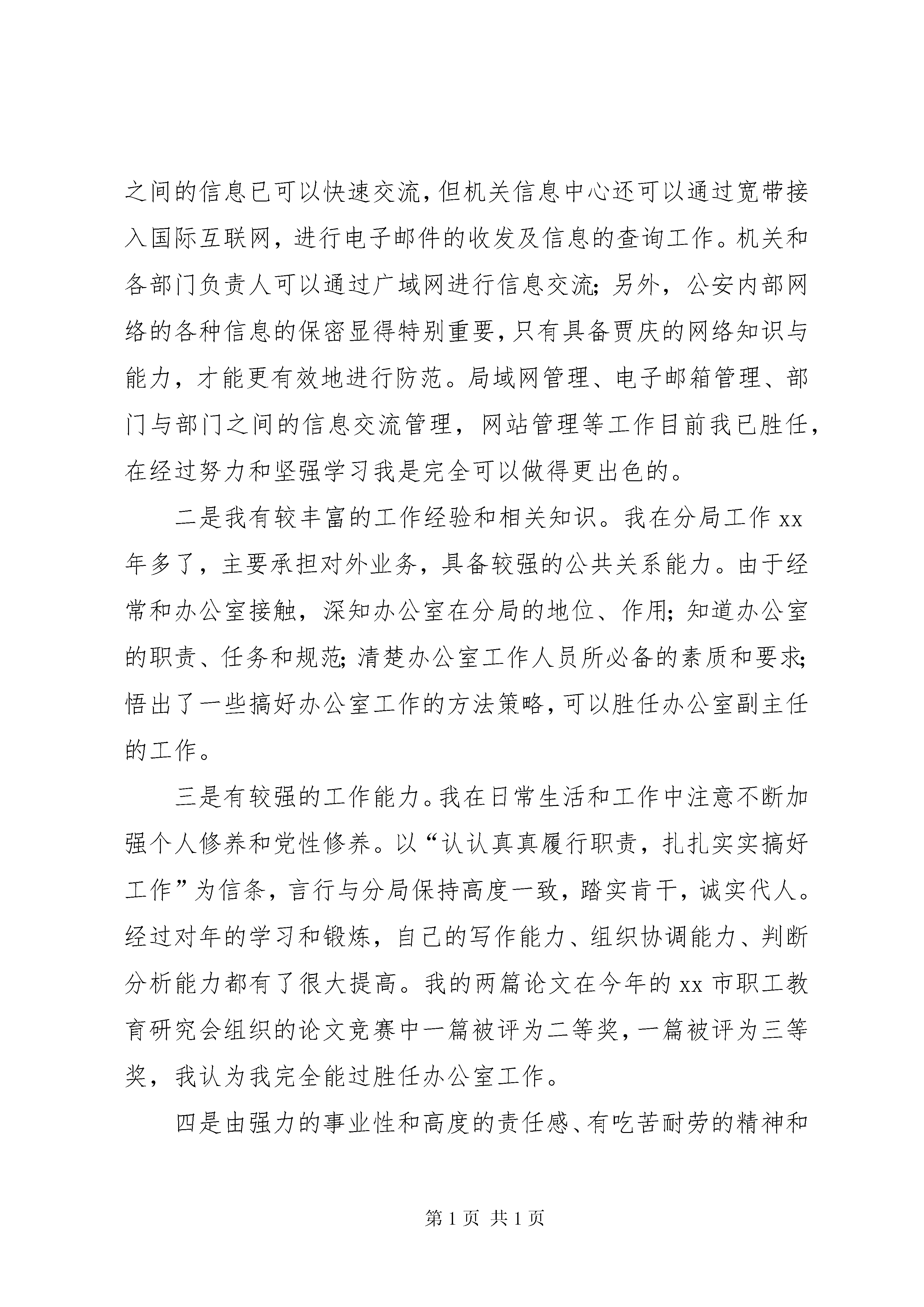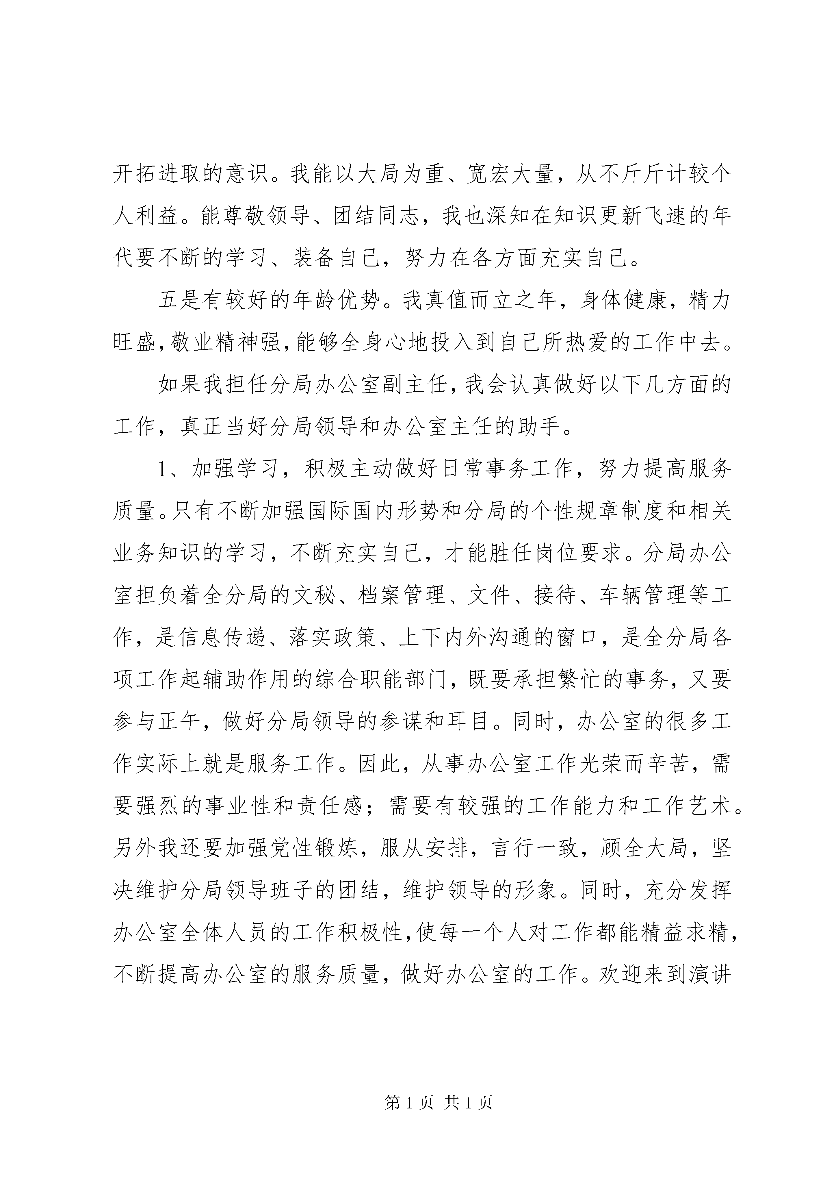 办公室副主任竞聘上岗演讲各位领导、同志们:我首先感谢领导、同志们的信任和支持,给了这个机会来参加此次竞职演讲。我叫xx,现年xx岁,中共党员,大专学历。我竞聘的岗位是分局办公室副主任。我知道我竞聘办公室副主任,由2个不利的条件:一是我自身的硬件条件不够具备。但是,任何事物度不是绝对的,我去年参加了全国英语职称考试,已经通过,而我今年已经具备了聘任中级职称的条件。二是我的处事和社交能力有待提到。但是我相信,我可以通过充满对工作的十万分热情和对工作认真负责、肯钻肯干的态度来锻炼自己。因为办公室正是锻炼人的地方,是对我能力的培养和其他各方面的提高。所以我决定参加这个岗位的竞聘。因为,我知道,我有5各有利条件:一是熟练运用计算机和网络的能力是我的一个明显优势。现代社会是信息化社会,中国已加入wto,在新的国际大环境下,信息化是现代化管理的重要基础,信息化的建设已经迫在眉睫。我认为分局局域网的建设,机关给部门资源已经可以共享,部门之间的信息已可以快速交流,但机关信息中心还可以通过宽带接入国际互联网,进行电子邮件的收发及信息的查询工作。机关和各部门负责人可以通过广域网进行信息交流;另外,公安内部网络的各种信息的保密显得特别重要,只有具备贾庆的网络知识与能力,才能更有效地进行防范。局域网管理、电子邮箱管理、部门与部门之间的信息交流管理,网站管理等工作目前我已胜任,在经过努力和坚强学习我是完全可以做得更出色的。二是我有较丰富的工作经验和相关知识。我在分局工作xx年多了,主要承担对外业务,具备较强的公共关系能力。由于经常和办公室接触,深知办公室在分局的地位、作用;知道办公室的职责、任务和规范;清楚办公室工作人员所必备的素质和要求;悟出了一些搞好办公室工作的方法策略,可以胜任办公室副主任的工作。三是有较强的工作能力。我在日常生活和工作中注意不断加强个人修养和党性修养。以“认认真真履行职责,扎扎实实搞好工作”为信条,言行与分局保持高度一致,踏实肯干,诚实代人。经过对年的学习和锻炼,自己的写作能力、组织协调能力、判断分析能力都有了很大提高。我的两篇论文在今年的xx市职工教育研究会组织的论文竞赛中一篇被评为二等奖,一篇被评为三等奖,我认为我完全能过胜任办公室工作。四是由强力的事业性和高度的责任感、有吃苦耐劳的精神和开拓进取的意识。我能以大局为重、宽宏大量,从不斤斤计较个人利益。能尊敬领导、团结同志,我也深知在知识更新飞速的年代要不断的学习、装备自己,努力在各方面充实自己。五是有较好的年龄优势。我真值而立之年,身体健康,精力旺盛,敬业精神强,能够全身心地投入到自己所热爱的工作中去。如果我担任分局办公室副主任,我会认真做好以下几方面的工作,真正当好分局领导和办公室主任的助手。1、加强学习,积极主动做好日常事务工作,努力提高服务质量。只有不断加强国际国内形势和分局的个性规章制度和相关业务知识的学习,不断充实自己,才能胜任岗位要求。分局办公室担负着全分局的文秘、档案管理、文件、接待、车辆管理等工作,是信息传递、落实政策、上下内外沟通的窗口,是全分局各项工作起辅助作用的综合职能部门,既要承担繁忙的事务,又要参与正午,做好分局领导的参谋和耳目。同时,办公室的很多工作实际上就是服务工作。因此,从事办公室工作光荣而辛苦,需要强烈的事业性和责任感;需要有较强的工作能力和工作艺术。另外我还要加强党性锻炼,服从安排,言行一致,顾全大局,坚决维护分局领导班子的团结,维护领导的形象。同时,充分发挥办公室全体人员的工作积极性,使每一个人对工作都能精益求精,不断提高办公室的服务质量,做好办公室的工作。欢迎来到演讲稿。