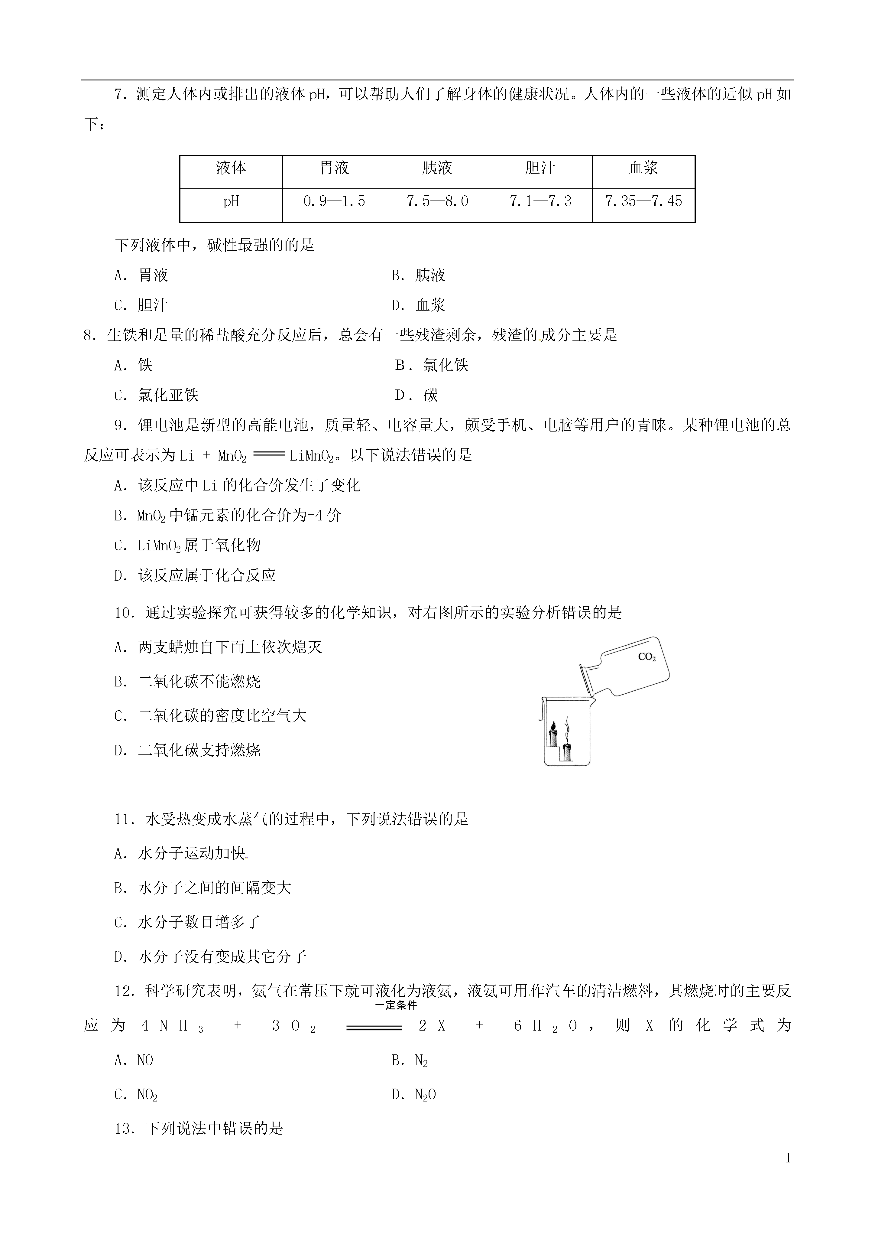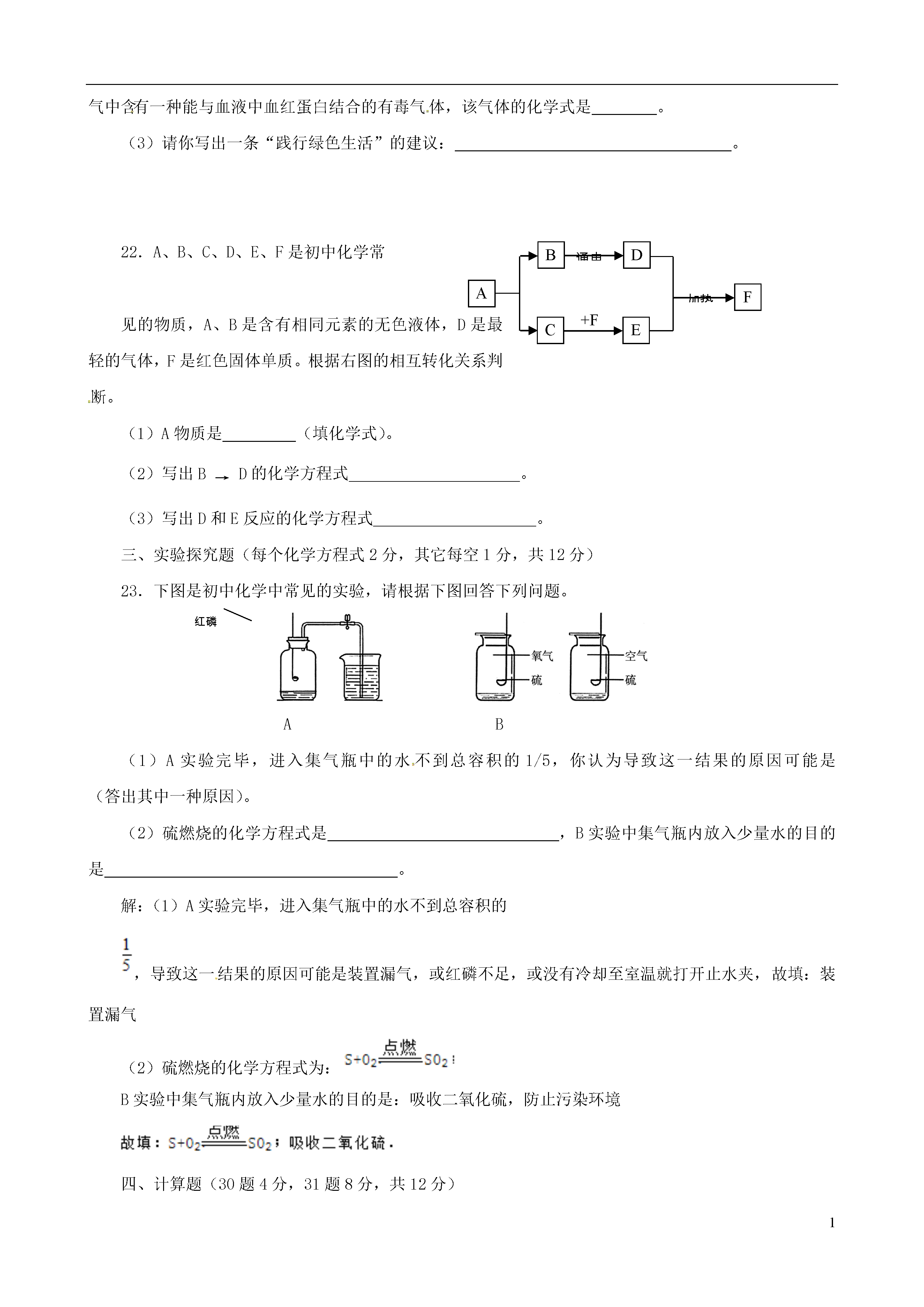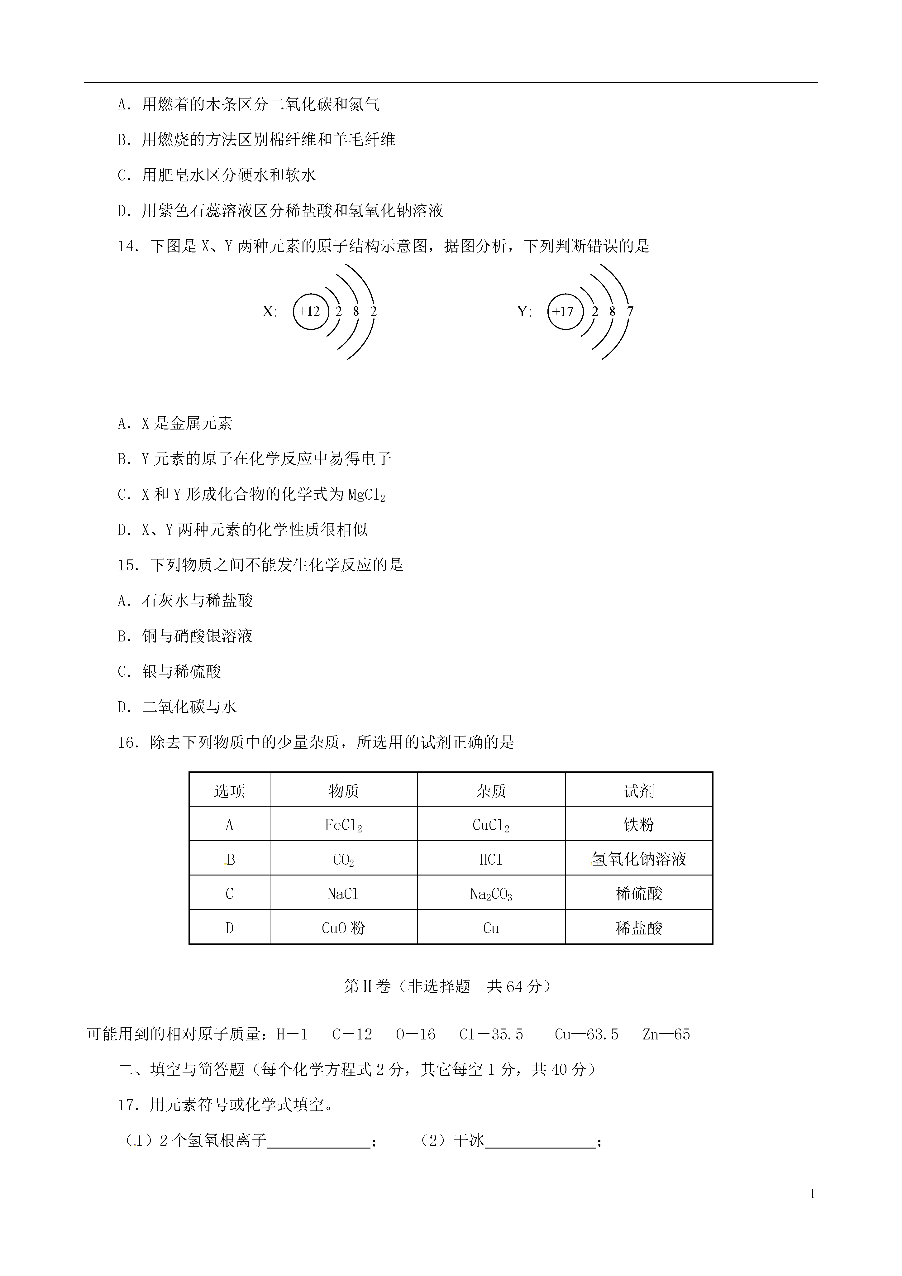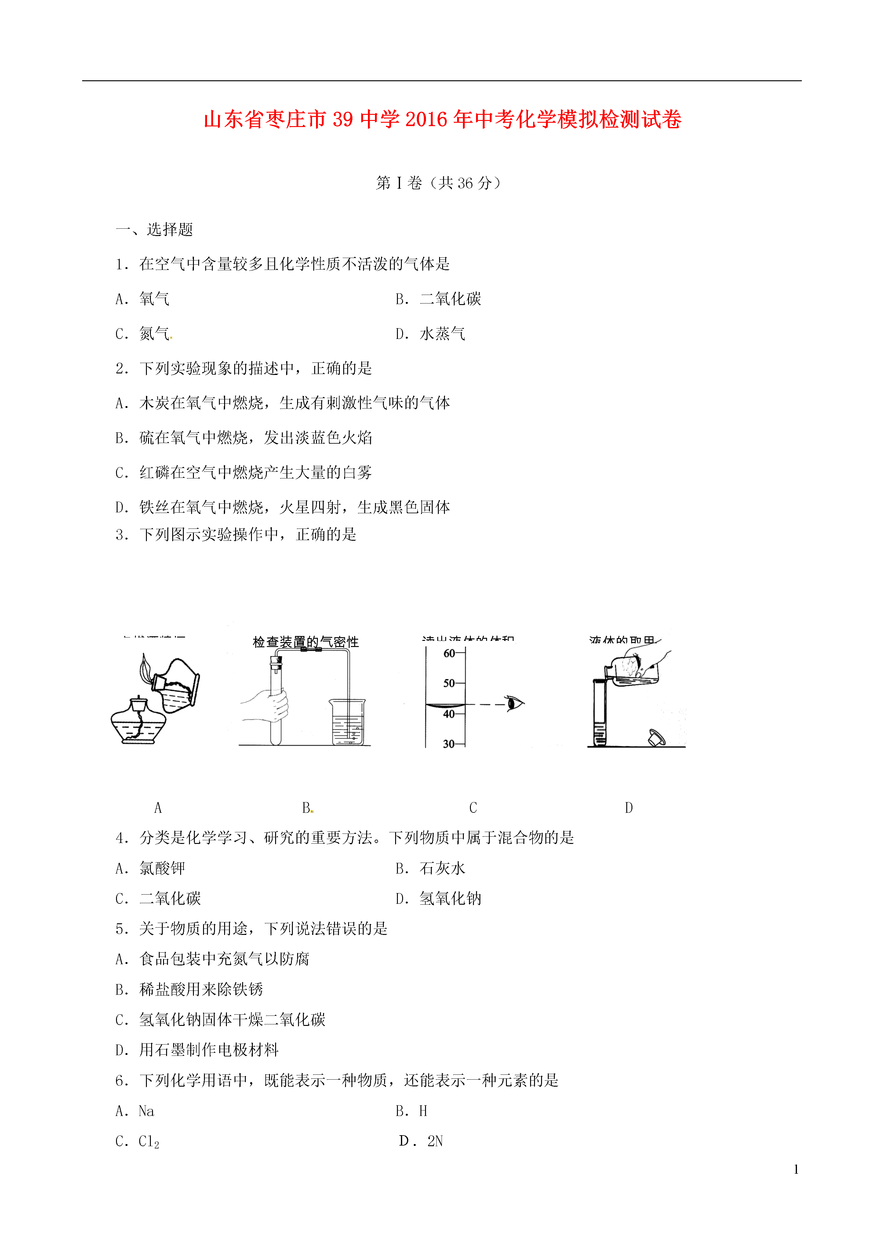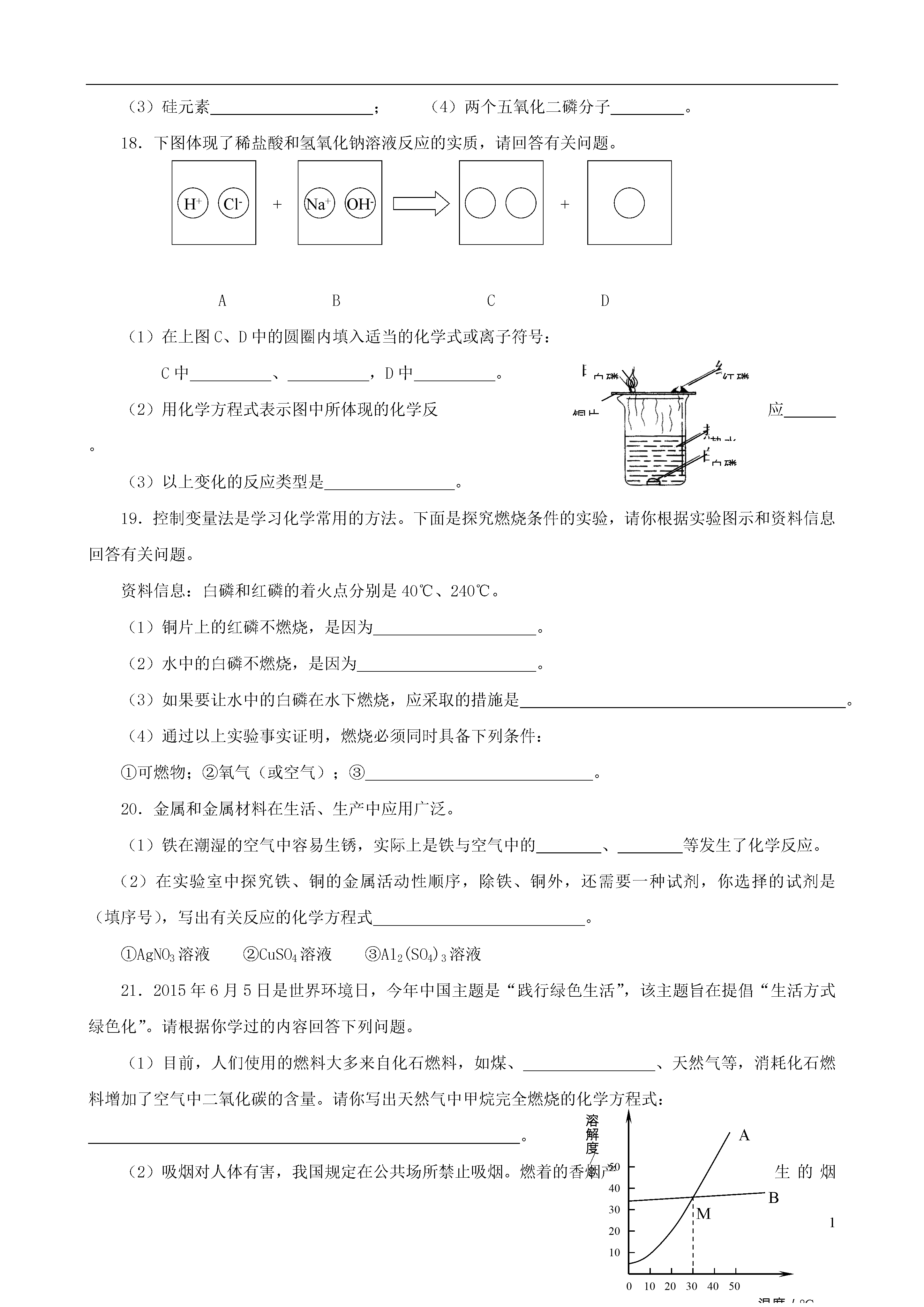 1山东省枣庄市39中学2016年中考化学模拟检测试卷第Ⅰ卷(共36分)一、选择题1.在空气中含量较多且化学性质不活泼的气体是A.氧气B.二氧化碳C.氮气D.水蒸气2.下列实验现象的描述中,正确的是A.木炭在氧气中燃烧,生成有刺激性气味的气体B.硫在氧气中燃烧,发出淡蓝色火焰C.红磷在空气中燃烧产生大量的白雾D.铁丝在氧气中燃烧,火星四射,生成黑色固体3.下列图示实验操作中,正确的是读出液体的体积液体的取用点燃酒精灯检查装置的气密性ABCD4.分类是化学学习、研究的重要方法。下列物质中属于混合物的是A.氯酸钾B.石灰水C.二氧化碳D.氢氧化钠5.关于物质的用途,下列说法错误的是A.食品包装中充氮气以防腐B.稀盐酸用来除铁锈C.氢氧化钠固体干燥二氧化碳D.用石墨制作电极材料6.下列化学用语中,既能表示一种物质,还能表示一种元素的是A.NaB.HC.Cl2D.2N7.测定人体内或排出的液体pH,可以帮助人们了解身体的健康状况。人体内的一些液体的近似pH如下:液体胃液胰液胆汁血浆pH0.9—1.57.5—8.07.1—7.37.35—7.45下列液体中,碱性最强的的是A.胃液B.胰液C.胆汁D.血浆8.生铁和足量的稀盐酸充分反应后,总会有一些残渣剩余,残渣的成分主要是A.铁B.氯化铁C.氯化亚铁D.碳9.锂电池是新型的高能电池,质量轻、电容量大,颇受手机、电脑等用户的青睐。某种锂电池的总反应可表示为Li+MnO2LiMnO2。以下说法错误的是A.该反应中Li的化合价发生了变化B.MnO2中锰元素的化合价为+4价C.LiMnO2属于氧化物D.该反应属于化合反应10.通过实验探究可获得较多的化学知识,对右图所示的实验分析错误的是A.两支蜡烛自下而上依次熄灭B.二氧化碳不能燃烧C.二氧化碳的密度比空气大D.二氧化碳支持燃烧11.水受热变成水蒸气的过程中,下列说法错误的是A.水分子运动加快B.水分子之间的间隔变大C.水分子数目增多了D.水分子没有变成其它分子一定条件12.科学研究表明,氨气在常压下就可液化为液氨,液氨可用作汽车的清洁燃料,其燃烧时的主要反应为4NH3+3O22X+6H2O,则X的化学式为A.NOB.N2C.NO2D.N2O13.下列说法中错误的是A.用燃着的木条区分二氧化碳和氮气B.用燃烧的方法区别棉纤维和羊毛纤维C.用肥皂水区分硬水和软水D.用紫色石蕊溶液区分稀盐酸和氢氧化钠溶液14.下图是X、Y两种元素的原子结构示意图,据图分析,下列判断错误的是+17Y:287+12X:282A.X是金属元素B.Y元素的原子在化学反应中易得电子C.X和Y形成化合物的化学式为MgCl2D.X、Y两种元素的化学性质很相似15.下列物质之间不能发生化学反应的是A.石灰水与稀盐酸B.铜与硝酸银溶液C.银与稀硫酸D.二氧化碳与水16.除去下列物质中的少量杂质,所选用的试剂正确的是选项物质杂质试剂AFeCl2CuCl2铁粉BCO2HCl氢氧化钠溶液CNaClNa2CO3稀硫酸DCuO粉Cu稀盐酸第Ⅱ卷(非选择题共64分)可能用到的相对原子质量:H-1C-12O-16Cl-35.5Cu—63.5Zn—65二、填空与简答题(每个化学方程式2分,其它每空1分,共40分)17.用元素符号或化学式填空。(1)2个氢氧根离子;(2)干冰;(3)硅元素;(4)两个五氧化二磷分子。18.下图体现了稀盐酸和氢氧化钠溶液反应的实质,请回答有关问题。H+Cl-Na+OH-++ABCD(1)在上图C、D中的圆圈内填入适当的化学式或离子符号:红磷热水白磷白磷铜片C中、,D中。(2)用化学方程式表示图中所体现的化学反应。(3)以上变化的反应类型是。19.控制变量法是学习化学常用的方法。下面是探究燃烧条件的实验,请你根据实验图示和资料信息回答有关问题。资料信息:白磷和红磷的着火点分别是40℃、240℃。(1)铜片上的红磷不燃烧,是因为。(2)水中的白磷不燃烧,是因为。(3)如果要让水中的白磷在水下燃烧,应采取的措施是。(4)通过以上实验事实证明,燃烧必须同时具备下列条件:①可燃物;②氧气(或空气);③。20.金属和金属材料在生活、生产中应用广泛。(1)铁在潮湿的空气中容易生锈,实际上是铁与空气中的、等发生了化学反应。(2)在实验室中探究铁、铜的金属活动性顺序,除铁、铜外,还需要一种试剂,你选择的试剂是(填序号),写出有关反应的化学方程式。①AgNO3溶液②CuSO4溶液③Al2(SO4)3溶液21.2