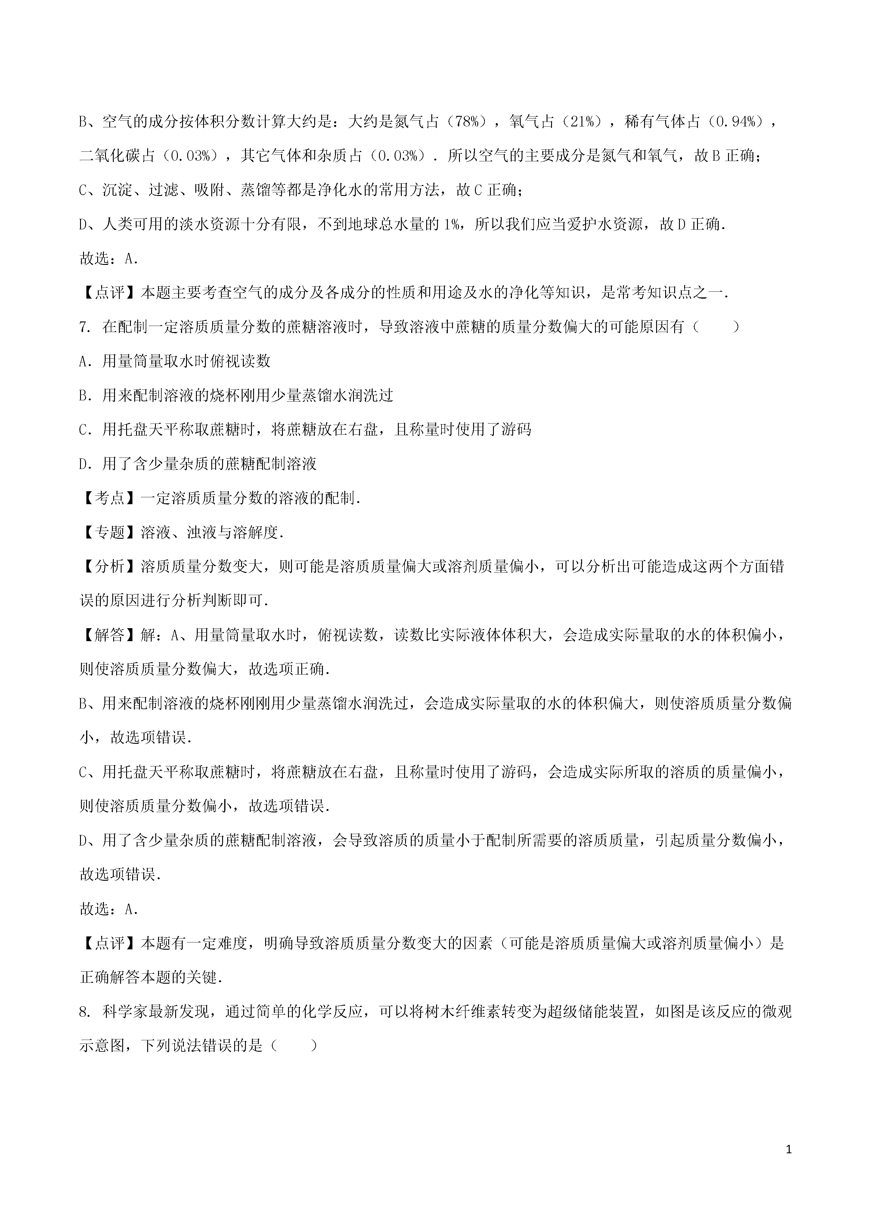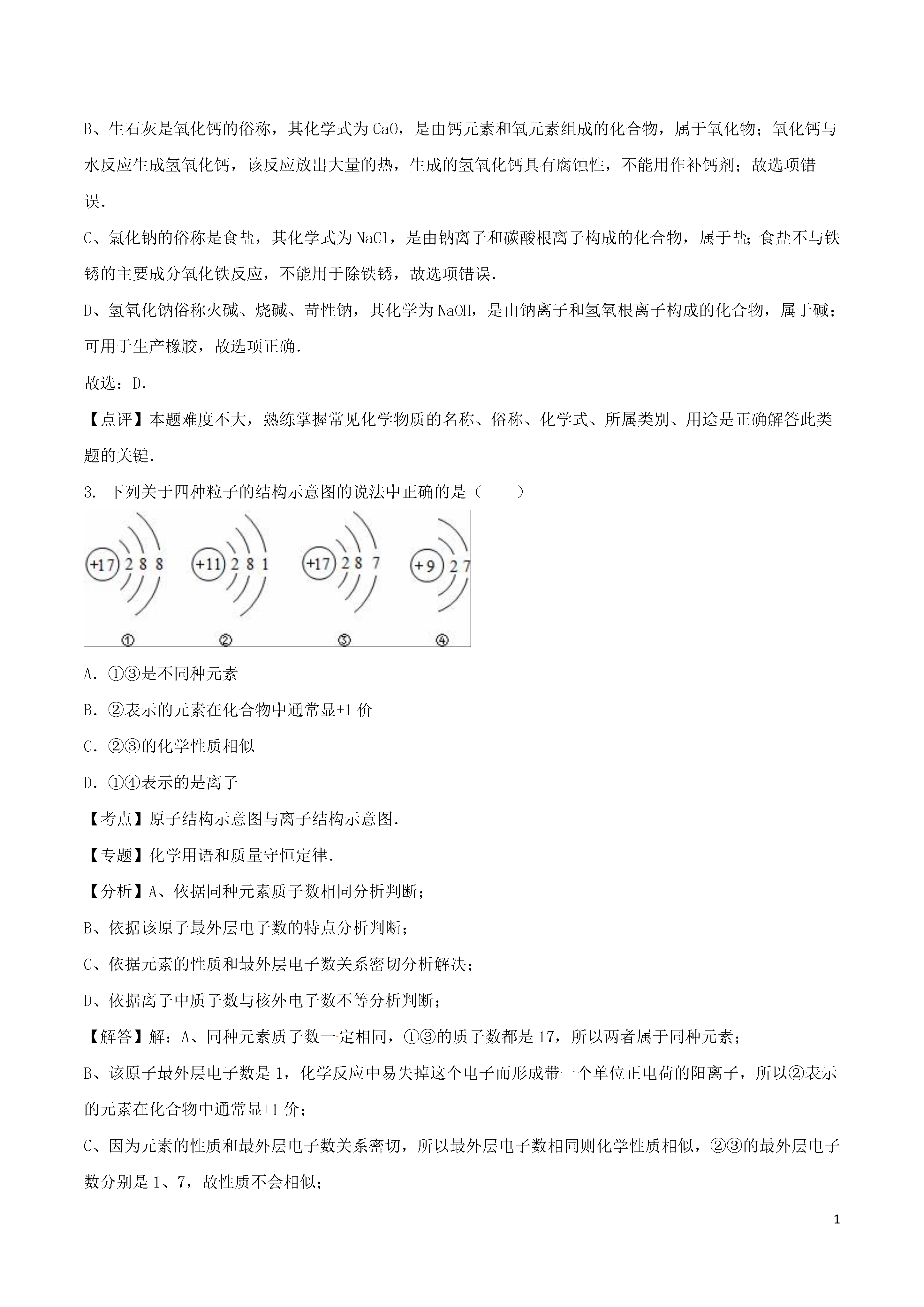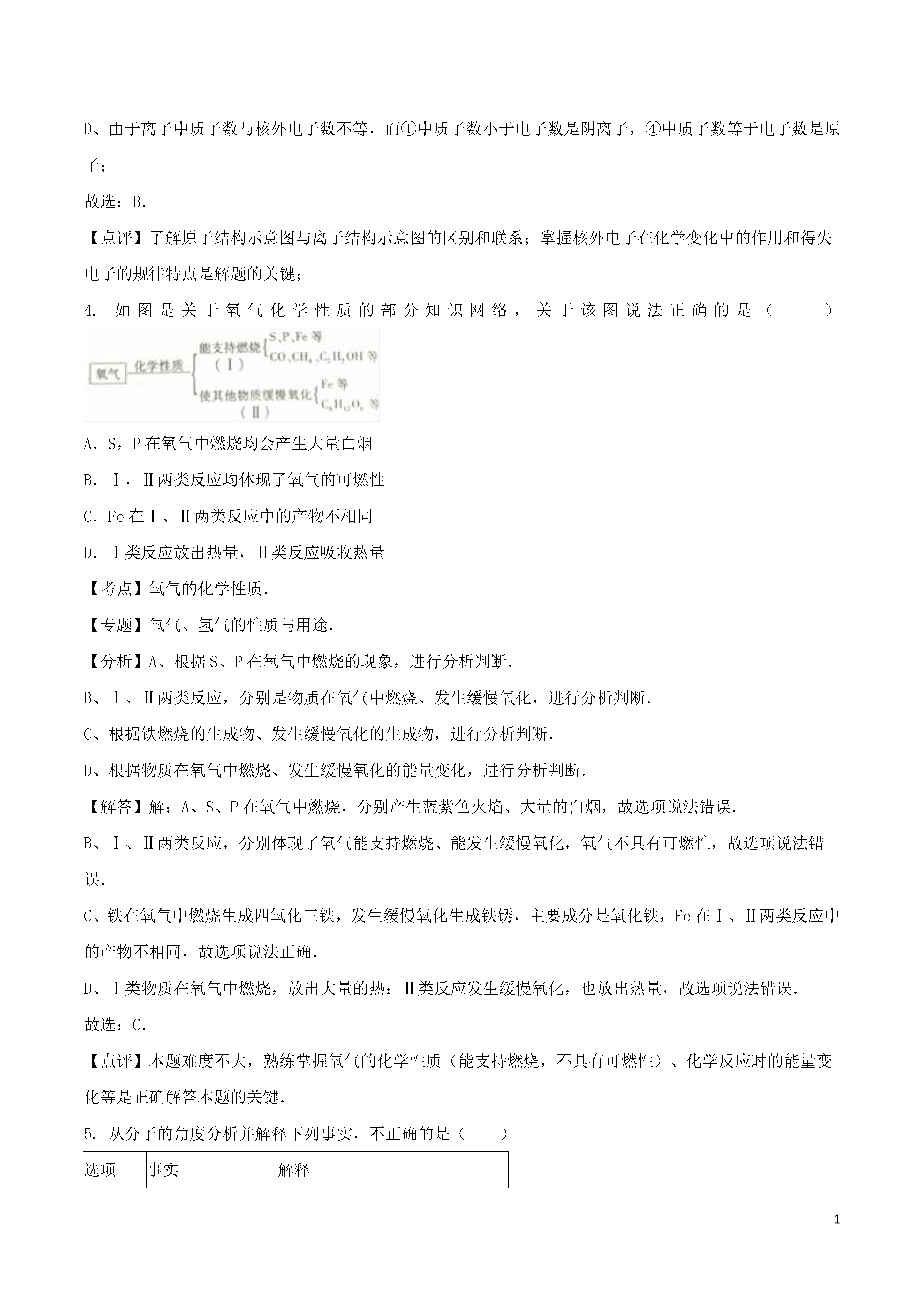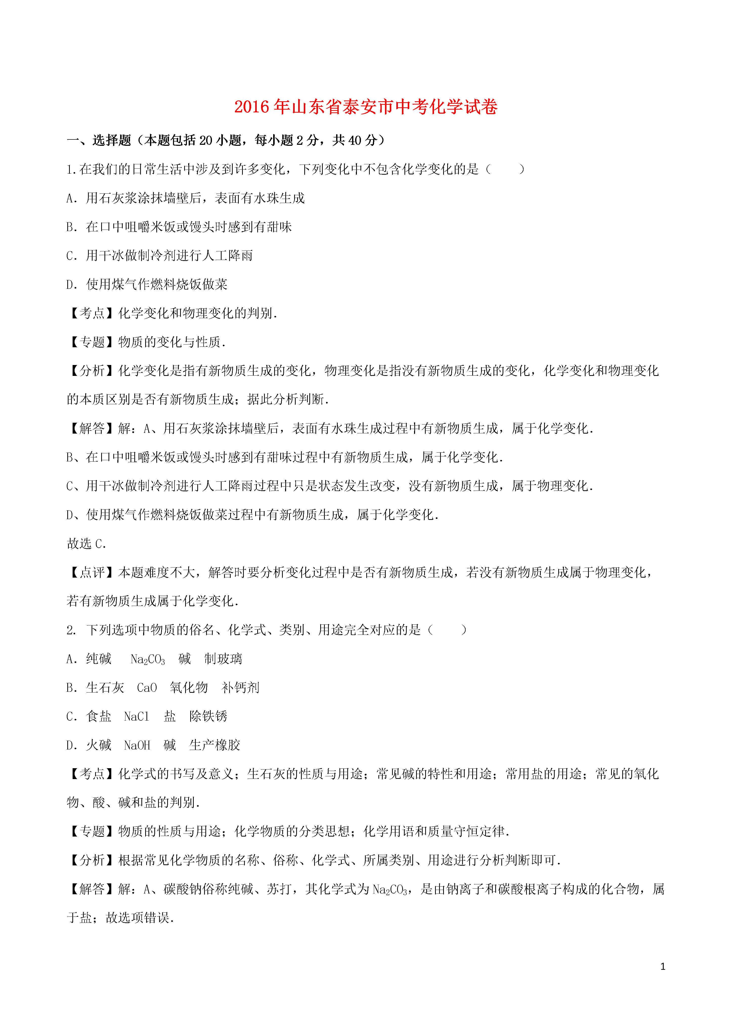 12016年山东省泰安市中考化学试卷一、选择题(本题包括20小题,每小题2分,共40分)1.在我们的日常生活中涉及到许多变化,下列变化中不包含化学变化的是()A.用石灰浆涂抹墙壁后,表面有水珠生成B.在口中咀嚼米饭或馒头时感到有甜味C.用干冰做制冷剂进行人工降雨D.使用煤气作燃料烧饭做菜【考点】化学变化和物理变化的判别.【专题】物质的变化与性质.【分析】化学变化是指有新物质生成的变化,物理变化是指没有新物质生成的变化,化学变化和物理变化的本质区别是否有新物质生成;据此分析判断.【解答】解:A、用石灰浆涂抹墙壁后,表面有水珠生成过程中有新物质生成,属于化学变化.B、在口中咀嚼米饭或馒头时感到有甜味过程中有新物质生成,属于化学变化.C、用干冰做制冷剂进行人工降雨过程中只是状态发生改变,没有新物质生成,属于物理变化.D、使用煤气作燃料烧饭做菜过程中有新物质生成,属于化学变化.故选C.【点评】本题难度不大,解答时要分析变化过程中是否有新物质生成,若没有新物质生成属于物理变化,若有新物质生成属于化学变化.2.下列选项中物质的俗名、化学式、类别、用途完全对应的是()A.纯碱Na2CO3碱制玻璃B.生石灰CaO氧化物补钙剂C.食盐NaCl盐除铁锈D.火碱NaOH碱生产橡胶【考点】化学式的书写及意义;生石灰的性质与用途;常见碱的特性和用途;常用盐的用途;常见的氧化物、酸、碱和盐的判别.【专题】物质的性质与用途;化学物质的分类思想;化学用语和质量守恒定律.【分析】根据常见化学物质的名称、俗称、化学式、所属类别、用途进行分析判断即可.【解答】解:A、碳酸钠俗称纯碱、苏打,其化学式为Na2CO3,是由钠离子和碳酸根离子构成的化合物,属于盐;故选项错误.B、生石灰是氧化钙的俗称,其化学式为CaO,是由钙元素和氧元素组成的化合物,属于氧化物;氧化钙与水反应生成氢氧化钙,该反应放出大量的热,生成的氢氧化钙具有腐蚀性,不能用作补钙剂;故选项错误.C、氯化钠的俗称是食盐,其化学式为NaCl,是由钠离子和碳酸根离子构成的化合物,属于盐;食盐不与铁锈的主要成分氧化铁反应,不能用于除铁锈,故选项错误.D、氢氧化钠俗称火碱、烧碱、苛性钠,其化学为NaOH,是由钠离子和氢氧根离子构成的化合物,属于碱;可用于生产橡胶,故选项正确.故选:D.【点评】本题难度不大,熟练掌握常见化学物质的名称、俗称、化学式、所属类别、用途是正确解答此类题的关键.3.下列关于四种粒子的结构示意图的说法中正确的是()A.①③是不同种元素B.②表示的元素在化合物中通常显+1价C.②③的化学性质相似D.①④表示的是离子【考点】原子结构示意图与离子结构示意图.【专题】化学用语和质量守恒定律.【分析】A、依据同种元素质子数相同分析判断;B、依据该原子最外层电子数的特点分析判断;C、依据元素的性质和最外层电子数关系密切分析解决;D、依据离子中质子数与核外电子数不等分析判断;【解答】解:A、同种元素质子数一定相同,①③的质子数都是17,所以两者属于同种元素;B、该原子最外层电子数是1,化学反应中易失掉这个电子而形成带一个单位正电荷的阳离子,所以②表示的元素在化合物中通常显+1价;C、因为元素的性质和最外层电子数关系密切,所以最外层电子数相同则化学性质相似,②③的最外层电子数分别是1、7,故性质不会相似;D、由于离子中质子数与核外电子数不等,而①中质子数小于电子数是阴离子,④中质子数等于电子数是原子;故选:B.【点评】了解原子结构示意图与离子结构示意图的区别和联系;掌握核外电子在化学变化中的作用和得失电子的规律特点是解题的关键;4.如图是关于氧气化学性质的部分知识网络,关于该图说法正确的是()A.S,P在氧气中燃烧均会产生大量白烟B.Ⅰ,Ⅱ两类反应均体现了氧气的可燃性C.Fe在Ⅰ、Ⅱ两类反应中的产物不相同D.Ⅰ类反应放出热量,Ⅱ类反应吸收热量【考点】氧气的化学性质.【专题】氧气、氢气的性质与用途.【分析】A、根据S、P在氧气中燃烧的现象,进行分析判断.B、Ⅰ、Ⅱ两类反应,分别是物质在氧气中燃烧、发生缓慢氧化,进行分析判断.C、根据铁燃烧的生成物、发生缓慢氧化的生成物,进行分析判断.D、根据物质在氧气中燃烧、发生缓慢氧化的能量变化,进行分析判断.【解答】解:A、S、P在氧气中燃烧,分别产生蓝紫色火焰、大量的白烟,故选项说法错误.B、Ⅰ、Ⅱ两类反应,分别体现了氧气能支持燃烧、能发生缓慢氧化,氧气不具有可燃性,故选项说法错误.C、铁在氧气中燃烧生成四氧化三铁,发生缓慢氧化生成铁锈,主要成分是氧化铁,Fe在Ⅰ、Ⅱ两类反应中的产物不相同,故选项说法正确.D、Ⅰ类物质在氧气中燃烧,放