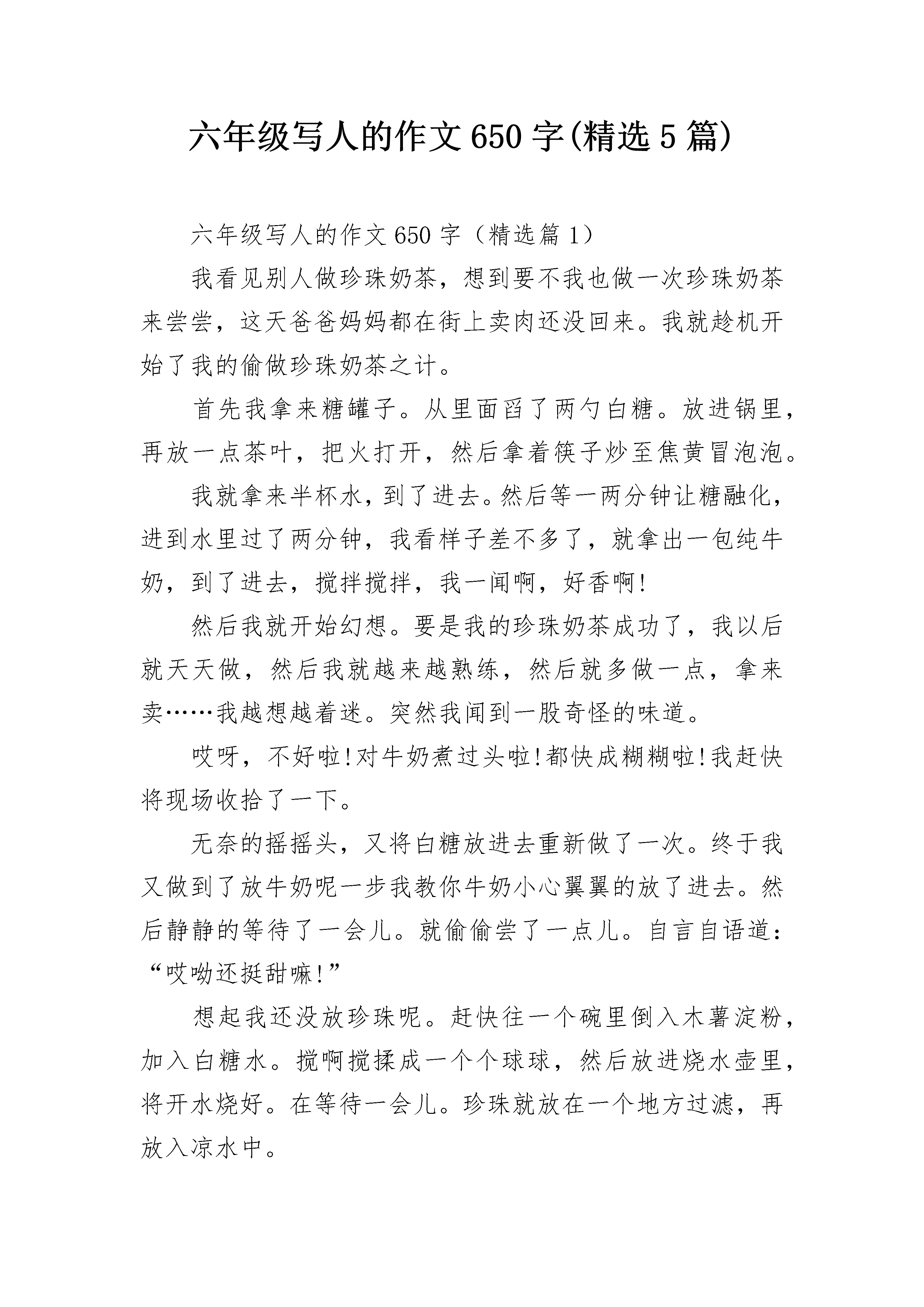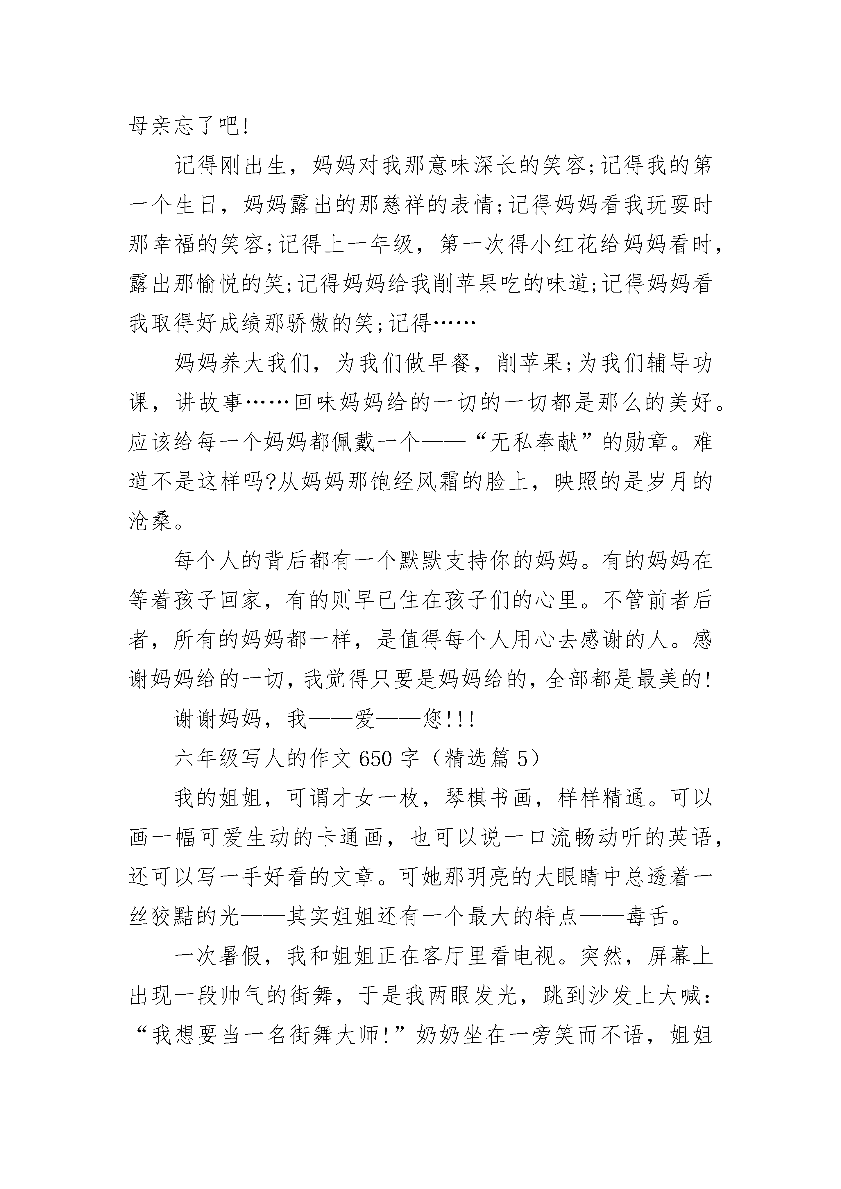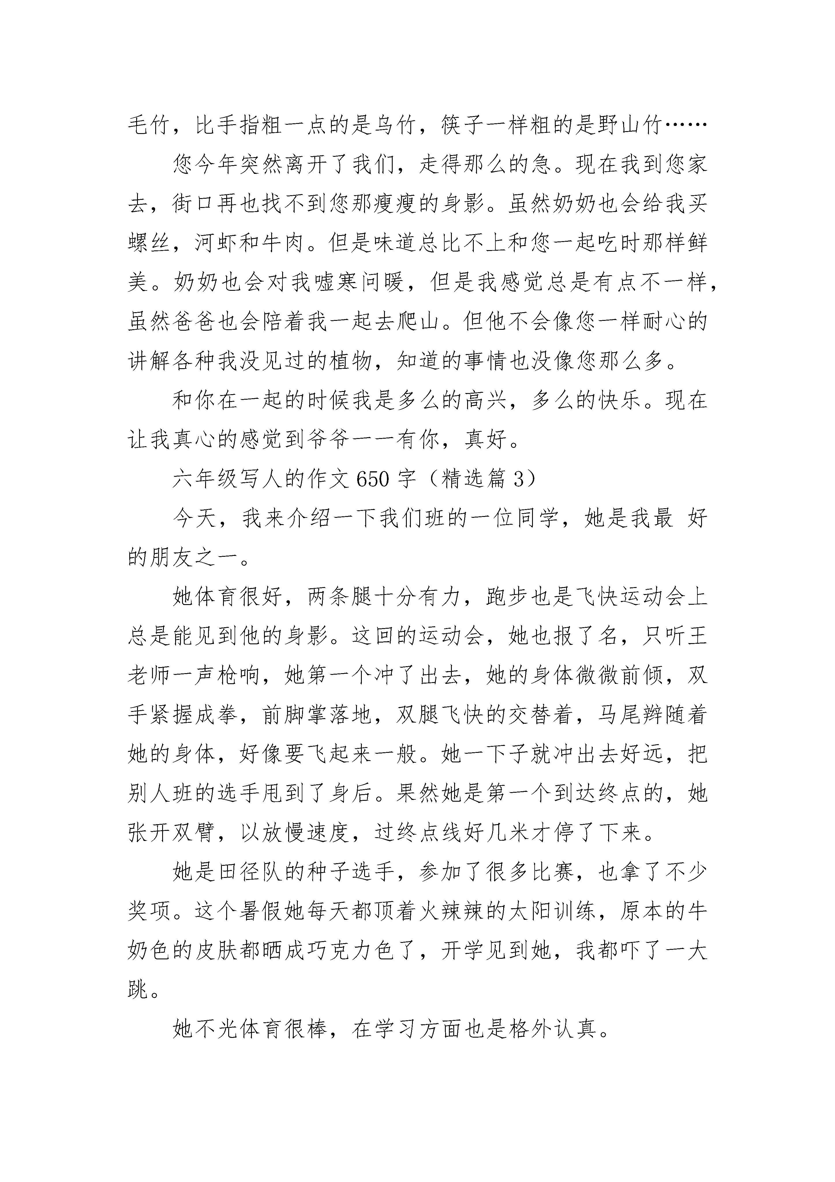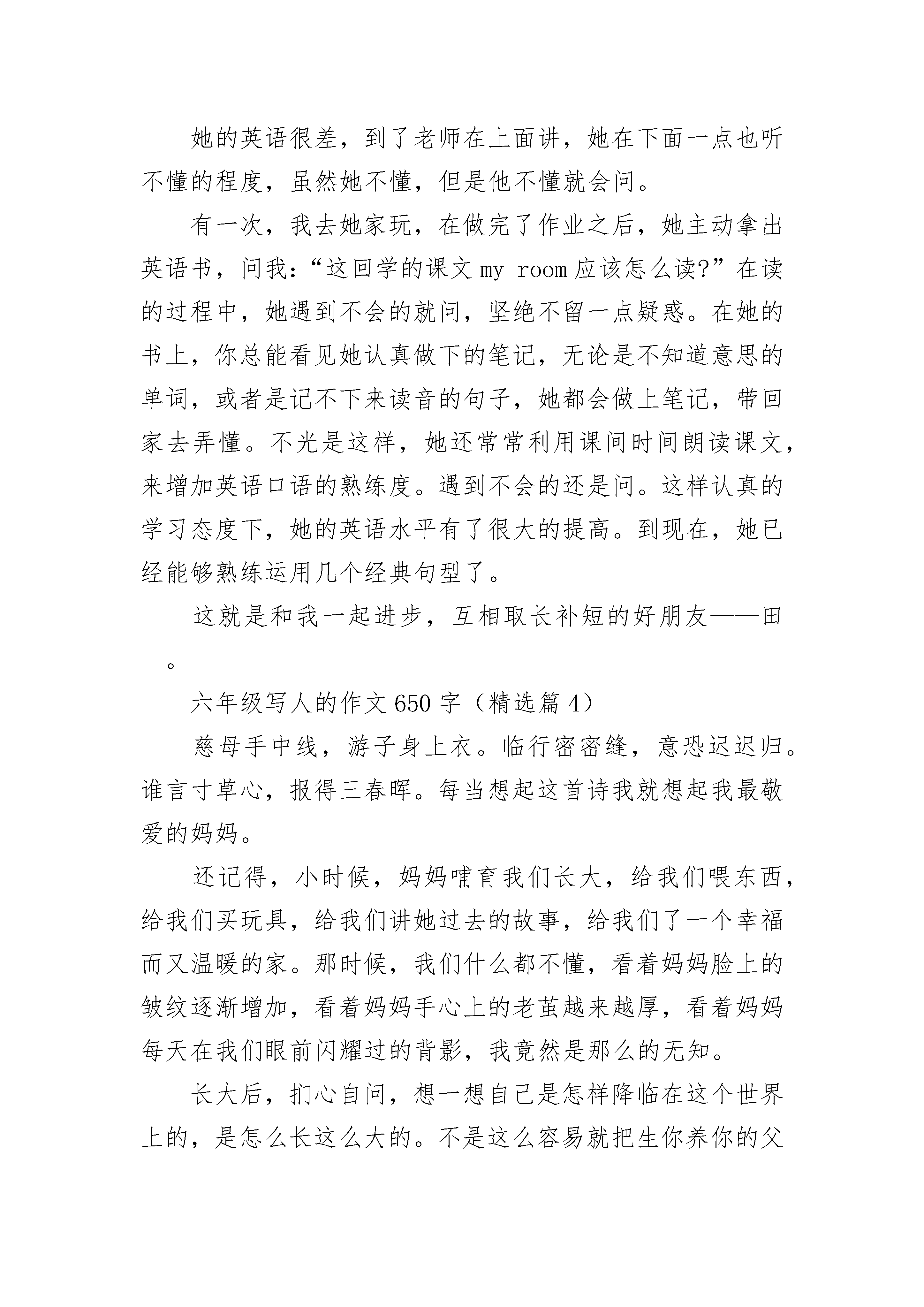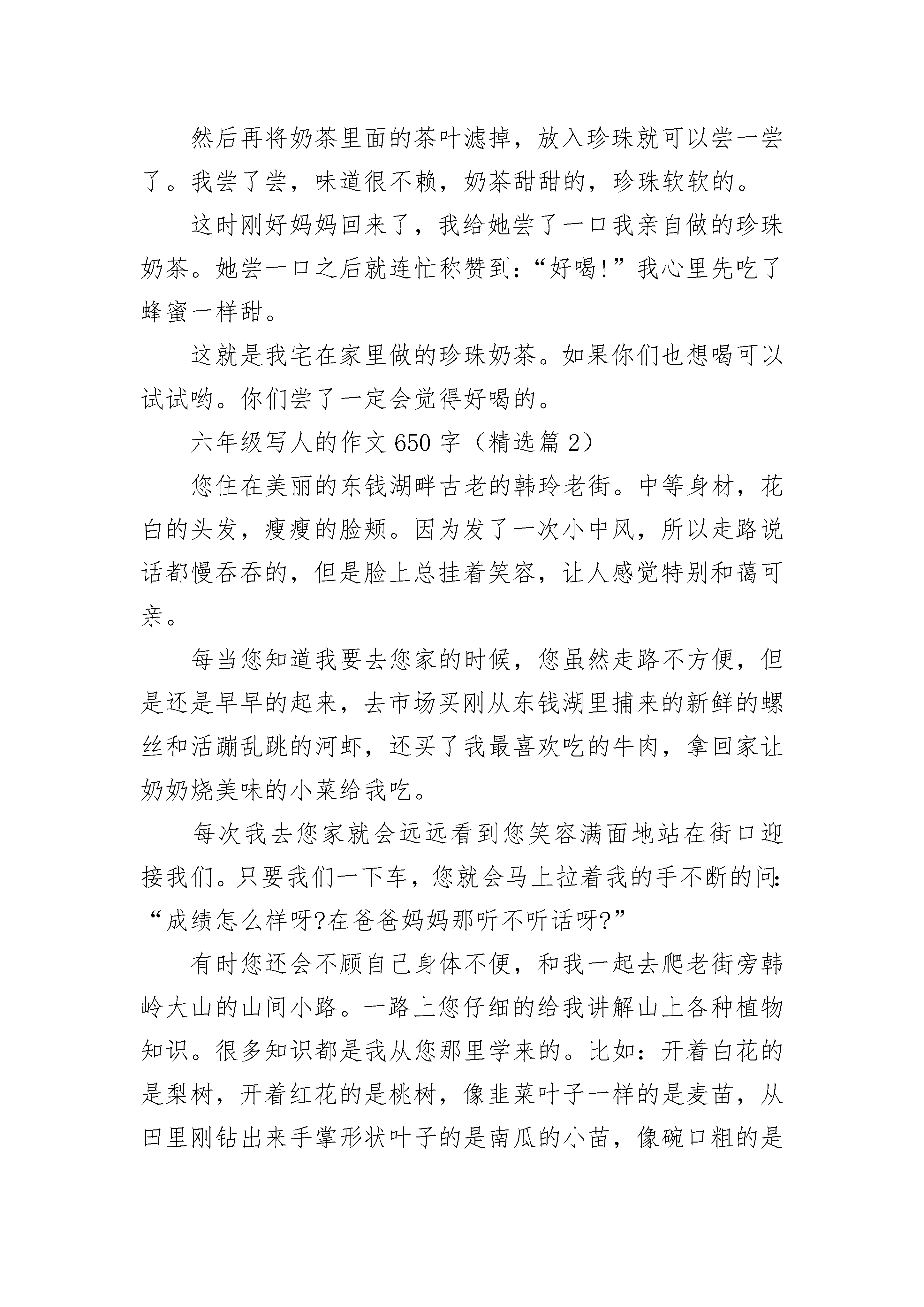 六年级写人的作文650字(精选5篇)六年级写人的作文650字(精选篇1)我看见别人做珍珠奶茶,想到要不我也做一次珍珠奶茶来尝尝,这天爸爸妈妈都在街上卖肉还没回来。我就趁机开始了我的偷做珍珠奶茶之计。首先我拿来糖罐子。从里面舀了两勺白糖。放进锅里,再放一点茶叶,把火打开,然后拿着筷子炒至焦黄冒泡泡。我就拿来半杯水,到了进去。然后等一两分钟让糖融化,进到水里过了两分钟,我看样子差不多了,就拿出一包纯牛奶,到了进去,搅拌搅拌,我一闻啊,好香啊!然后我就开始幻想。要是我的珍珠奶茶成功了,我以后就天天做,然后我就越来越熟练,然后就多做一点,拿来卖……我越想越着迷。突然我闻到一股奇怪的味道。哎呀,不好啦!对牛奶煮过头啦!都快成糊糊啦!我赶快将现场收拾了一下。无奈的摇摇头,又将白糖放进去重新做了一次。终于我又做到了放牛奶呢一步我教你牛奶小心翼翼的放了进去。然后静静的等待了一会儿。就偷偷尝了一点儿。自言自语道:“哎呦还挺甜嘛!”想起我还没放珍珠呢。赶快往一个碗里倒入木薯淀粉,加入白糖水。搅啊搅揉成一个个球球,然后放进烧水壶里,将开水烧好。在等待一会儿。珍珠就放在一个地方过滤,再放入凉水中。然后再将奶茶里面的茶叶滤掉,放入珍珠就可以尝一尝了。我尝了尝,味道很不赖,奶茶甜甜的,珍珠软软的。这时刚好妈妈回来了,我给她尝了一口我亲自做的珍珠奶茶。她尝一口之后就连忙称赞到:“好喝!”我心里先吃了蜂蜜一样甜。这就是我宅在家里做的珍珠奶茶。如果你们也想喝可以试试哟。你们尝了一定会觉得好喝的。六年级写人的作文650字(精选篇2)您住在美丽的东钱湖畔古老的韩玲老街。中等身材,花白的头发,瘦瘦的脸颊。因为发了一次小中风,所以走路说话都慢吞吞的,但是脸上总挂着笑容,让人感觉特别和蔼可亲。每当您知道我要去您家的时候,您虽然走路不方便,但是还是早早的起来,去市场买刚从东钱湖里捕来的新鲜的螺丝和活蹦乱跳的河虾,还买了我最喜欢吃的牛肉,拿回家让奶奶烧美味的小菜给我吃。每次我去您家就会远远看到您笑容满面地站在街口迎接我们。只要我们一下车,您就会马上拉着我的手不断的问:“成绩怎么样呀?在爸爸妈妈那听不听话呀?”有时您还会不顾自己身体不便,和我一起去爬老街旁韩岭大山的山间小路。一路上您仔细的给我讲解山上各种植物知识。很多知识都是我从您那里学来的。比如:开着白花的是梨树,开着红花的是桃树,像韭菜叶子一样的是麦苗,从田里刚钻出来手掌形状叶子的是南瓜的小苗,像碗口粗的是毛竹,比手指粗一点的是乌竹,筷子一样粗的是野山竹……您今年突然离开了我们,走得那么的急。现在我到您家去,街口再也找不到您那瘦瘦的身影。虽然奶奶也会给我买螺丝,河虾和牛肉。但是味道总比不上和您一起吃时那样鲜美。奶奶也会对我嘘寒问暖,但是我感觉总是有点不一样,虽然爸爸也会陪着我一起去爬山。但他不会像您一样耐心的讲解各种我没见过的植物,知道的事情也没像您那么多。和你在一起的时候我是多么的高兴,多么的快乐。现在让我真心的感觉到爷爷一一有你,真好。六年级写人的作文650字(精选篇3)今天,我来介绍一下我们班的一位同学,她是我最好的朋友之一。她体育很好,两条腿十分有力,跑步也是飞快运动会上总是能见到他的身影。这回的运动会,她也报了名,只听王老师一声枪响,她第一个冲了出去,她的身体微微前倾,双手紧握成拳,前脚掌落地,双腿飞快的交替着,马尾辫随着她的身体,好像要飞起来一般。她一下子就冲出去好远,把别人班的选手甩到了身后。果然她是第一个到达终点的,她张开双臂,以放慢速度,过终点线好几米才停了下来。她是田径队的种子选手,参加了很多比赛,也拿了不少奖项。这个暑假她每天都顶着火辣辣的太阳训练,原本的牛奶色的皮肤都晒成巧克力色了,开学见到她,我都吓了一大跳。她不光体育很棒,在学习方面也是格外认真。她的英语很差,到了老师在上面讲,她在下面一点也听不懂的程度,虽然她不懂,但是他不懂就会问。有一次,我去她家玩,在做完了作业之后,她主动拿出英语书,问我:“这回学的课文myroom应该怎么读?”在读的过程中,她遇到不会的就问,坚绝不留一点疑惑。在她的书上,你总能看见她认真做下的笔记,无论是不知道意思的单词,或者是记不下来读音的句子,她都会做上笔记,带回家去弄懂。不光是这样,她还常常利用课间时间朗读课文,来增加英语口语的熟练度。遇到不会的还是问。这样认真的学习态度下,她的英语水平有了很大的提高。到现在,她已经能够熟练运用几个经典句型了。这就是和我一起进步,互相取长补短的好朋友——田__。六年级写人的作文650字(精选篇4)慈母手中线,游子身上衣。临行密密缝,意恐迟迟归。谁言寸草心,报得三春晖。每当想起这首诗我就想起我最敬爱的妈妈。还记得,小时候,妈妈哺育我们长大,给我们喂东西,给我们买玩具,给我们讲她过去的故事,给我们了一个幸福而又温暖的家。那时候,我