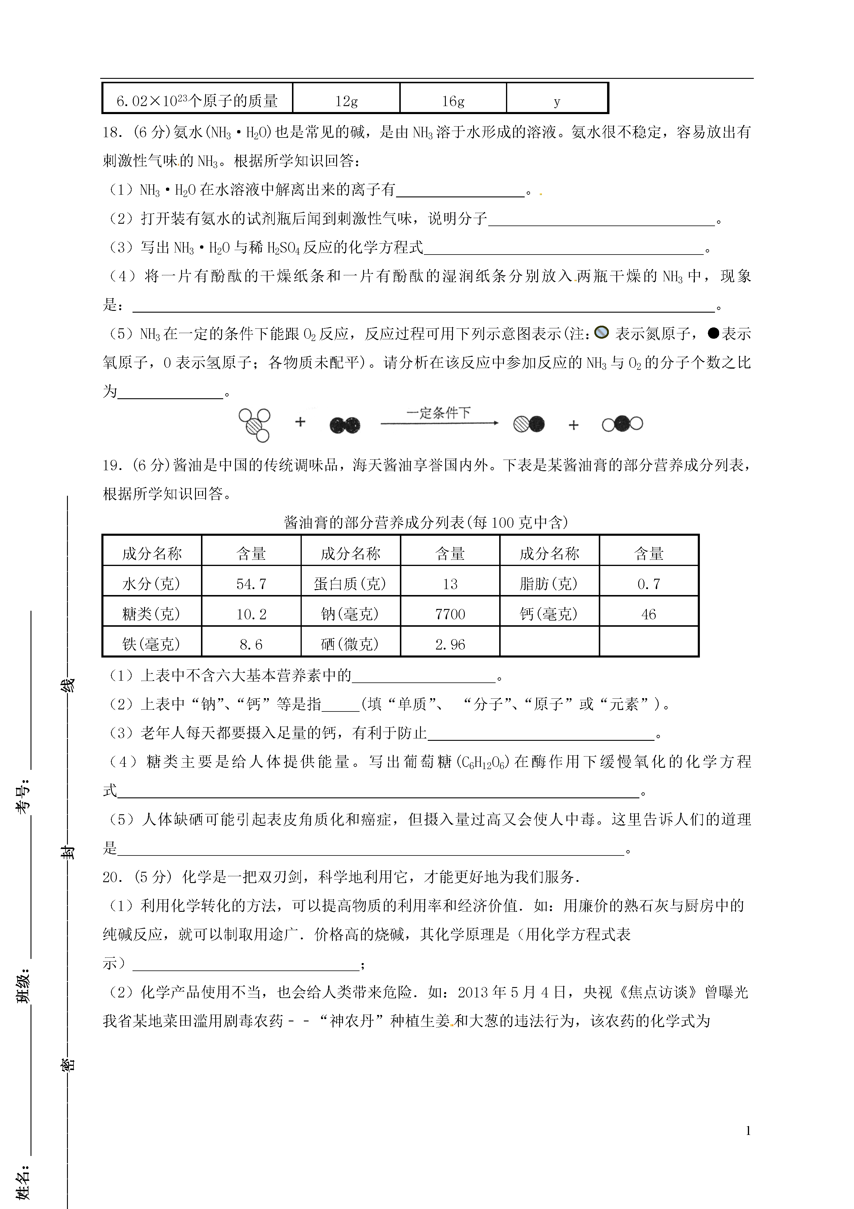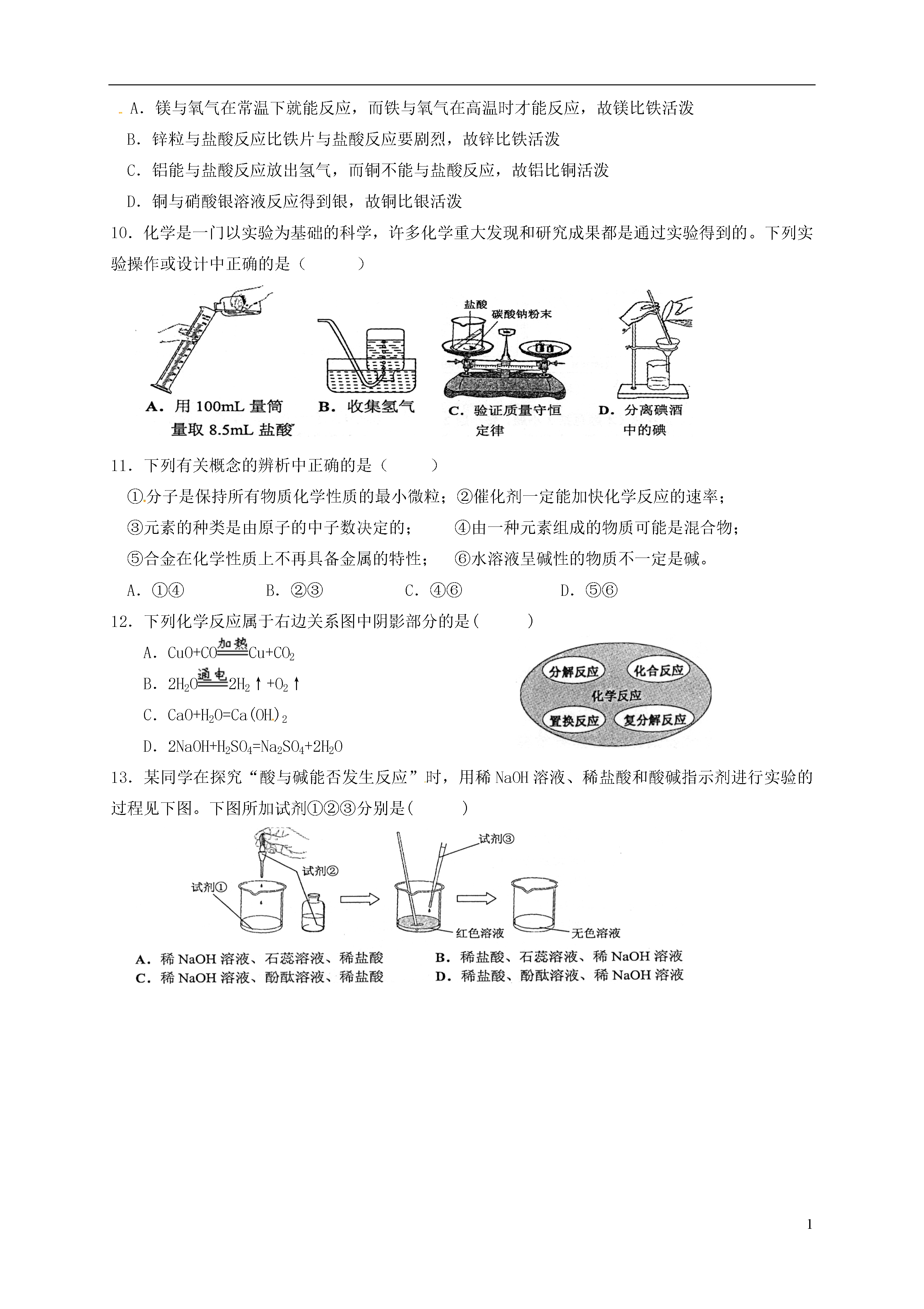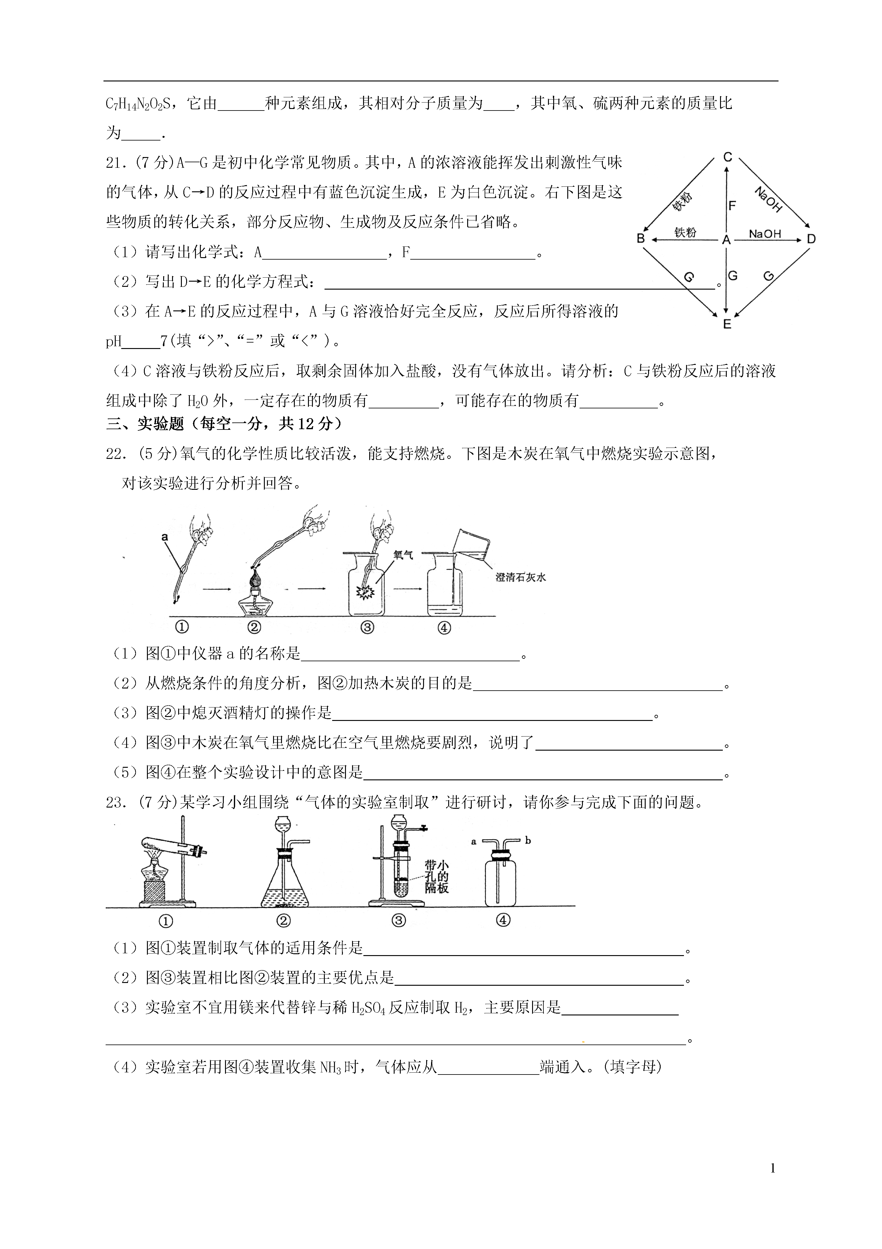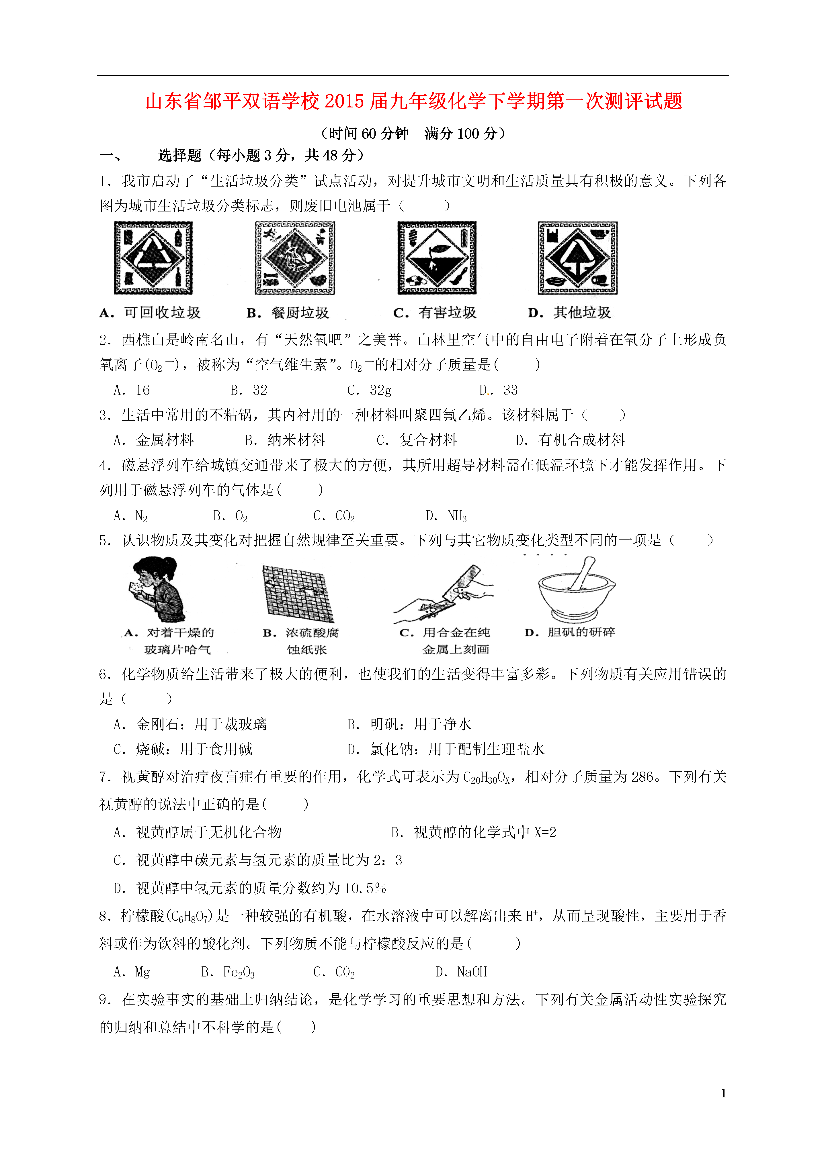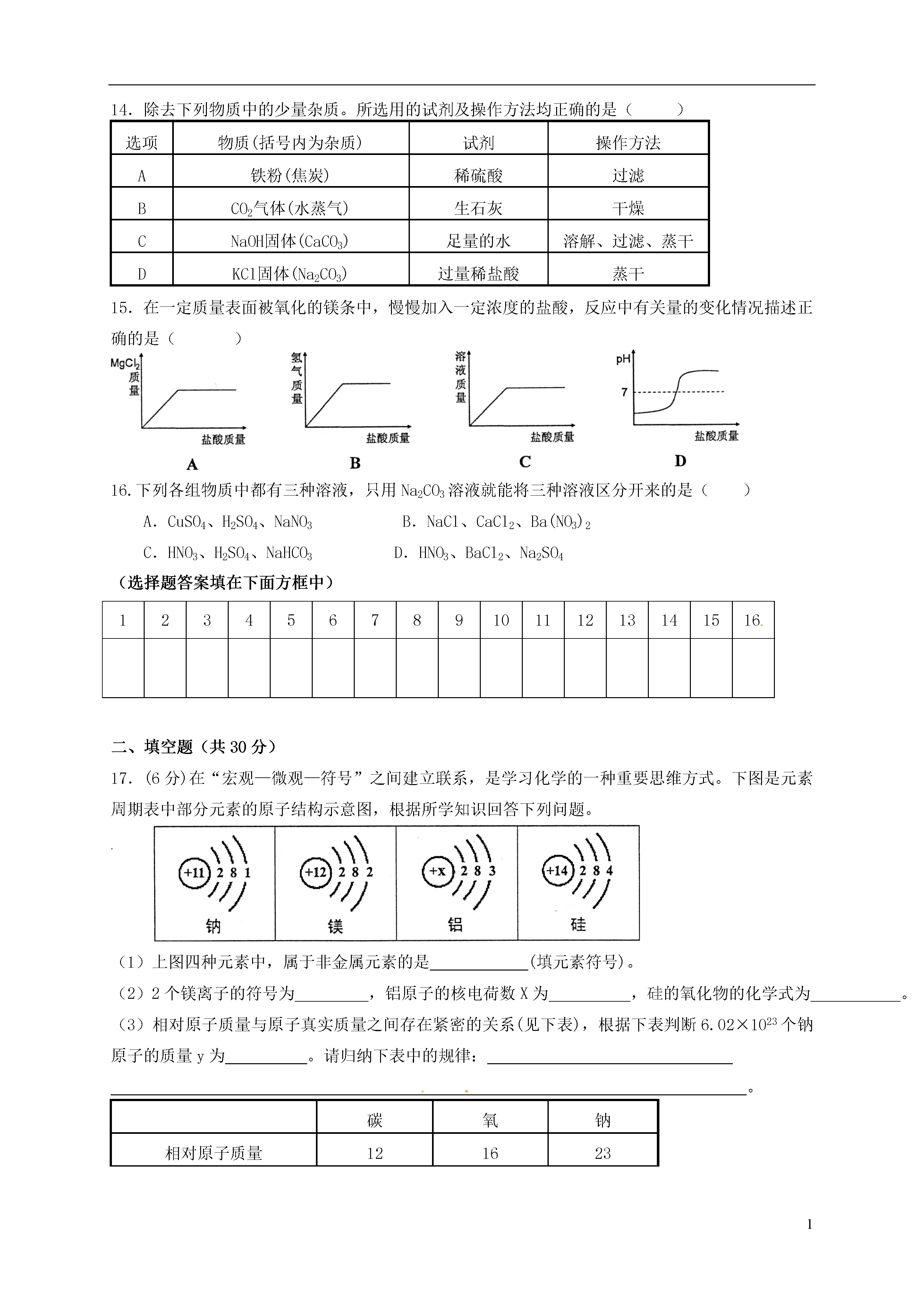 1山东省邹平双语学校2015届九年级化学下学期第一次测评试题(时间60分钟满分100分)选择题(每小题3分,共48分)1.我市启动了“生活垃圾分类”试点活动,对提升城市文明和生活质量具有积极的意义。下列各图为城市生活垃圾分类标志,则废旧电池属于()2.西樵山是岭南名山,有“天然氧吧”之美誉。山林里空气中的自由电子附着在氧分子上形成负氧离子(O2一),被称为“空气维生素”。O2一的相对分子质量是()A.16B.32C.32gD.333.生活中常用的不粘锅,其内衬用的一种材料叫聚四氟乙烯。该材料属于()A.金属材料B.纳米材料C.复合材料D.有机合成材料4.磁悬浮列车给城镇交通带来了极大的方便,其所用超导材料需在低温环境下才能发挥作用。下列用于磁悬浮列车的气体是()A.N2B.O2C.CO2D.NH35.认识物质及其变化对把握自然规律至关重要。下列与其它物质变化类型不同的一项是()6.化学物质给生活带来了极大的便利,也使我们的生活变得丰富多彩。下列物质有关应用错误的是()A.金刚石:用于裁玻璃B.明矾:用于净水C.烧碱:用于食用碱D.氯化钠:用于配制生理盐水7.视黄醇对治疗夜盲症有重要的作用,化学式可表示为C20H30OX,相对分子质量为286。下列有关视黄醇的说法中正确的是()A.视黄醇属于无机化合物B.视黄醇的化学式中X=2C.视黄醇中碳元素与氢元素的质量比为2:3D.视黄醇中氢元素的质量分数约为10.5%8.柠檬酸(C6H8O7)是一种较强的有机酸,在水溶液中可以解离出来H+,从而呈现酸性,主要用于香料或作为饮料的酸化剂。下列物质不能与柠檬酸反应的是()A.MgB.Fe2O3C.C02D.NaOH9.在实验事实的基础上归纳结论,是化学学习的重要思想和方法。下列有关金属活动性实验探究的归纳和总结中不科学的是()A.镁与氧气在常温下就能反应,而铁与氧气在高温时才能反应,故镁比铁活泼B.锌粒与盐酸反应比铁片与盐酸反应要剧烈,故锌比铁活泼C.铝能与盐酸反应放出氢气,而铜不能与盐酸反应,故铝比铜活泼D.铜与硝酸银溶液反应得到银,故铜比银活泼10.化学是一门以实验为基础的科学,许多化学重大发现和研究成果都是通过实验得到的。下列实验操作或设计中正确的是()11.下列有关概念的辨析中正确的是()①分子是保持所有物质化学性质的最小微粒;②催化剂一定能加快化学反应的速率;③元素的种类是由原子的中子数决定的;④由一种元素组成的物质可能是混合物;⑤合金在化学性质上不再具备金属的特性;⑥水溶液呈碱性的物质不一定是碱。A.①④B.②③C.④⑥D.⑤⑥12.下列化学反应属于右边关系图中阴影部分的是()A.CuO+COCu+CO2B.2H2O2H2↑+O2↑C.CaO+H2O=Ca(OH)2D.2NaOH+H2SO4=Na2SO4+2H2O13.某同学在探究“酸与碱能否发生反应”时,用稀NaOH溶液、稀盐酸和酸碱指示剂进行实验的过程见下图。下图所加试剂①②③分别是()14.除去下列物质中的少量杂质。所选用的试剂及操作方法均正确的是()选项物质(括号内为杂质)试剂操作方法A铁粉(焦炭)稀硫酸过滤BCO2气体(水蒸气)生石灰干燥CNaOH固体(CaCO3)足量的水溶解、过滤、蒸干DKCl固体(Na2CO3)过量稀盐酸蒸干15.在一定质量表面被氧化的镁条中,慢慢加入一定浓度的盐酸,反应中有关量的变化情况描述正确的是()16.下列各组物质中都有三种溶液,只用Na2CO3溶液就能将三种溶液区分开来的是()A.CuSO4、H2SO4、NaNO3B.NaCl、CaCl2、Ba(NO3)2C.HNO3、H2SO4、NaHCO3D.HNO3、BaCl2、Na2SO4(选择题答案填在下面方框中)12345678910111213141516二、填空题(共30分)17.(6分)在“宏观—微观—符号”之间建立联系,是学习化学的一种重要思维方式。下图是元素周期表中部分元素的原子结构示意图,根据所学知识回答下列问题。(1)上图四种元素中,属于非金属元素的是(填元素符号)。(2)2个镁离子的符号为,铝原子的核电荷数X为,硅的氧化物的化学式为。(3)相对原子质量与原子真实质量之间存在紧密的关系(见下表),根据下表判断6.02×1023个钠原子的质量y为。请归纳下表中的规律:。碳氧钠相对原子质量1216236.02×1023个原子的质量12g16gy18.(6分)氨水(NH3·H2O)也是常见的碱,是由NH3溶于水形成的溶液。氨水很不稳定,容易放出有刺激性气味的NH3。根据所学知识回答:(1)NH3·H2O在水溶液中解离出来的离子有。(2)打开装有氨水的试剂瓶