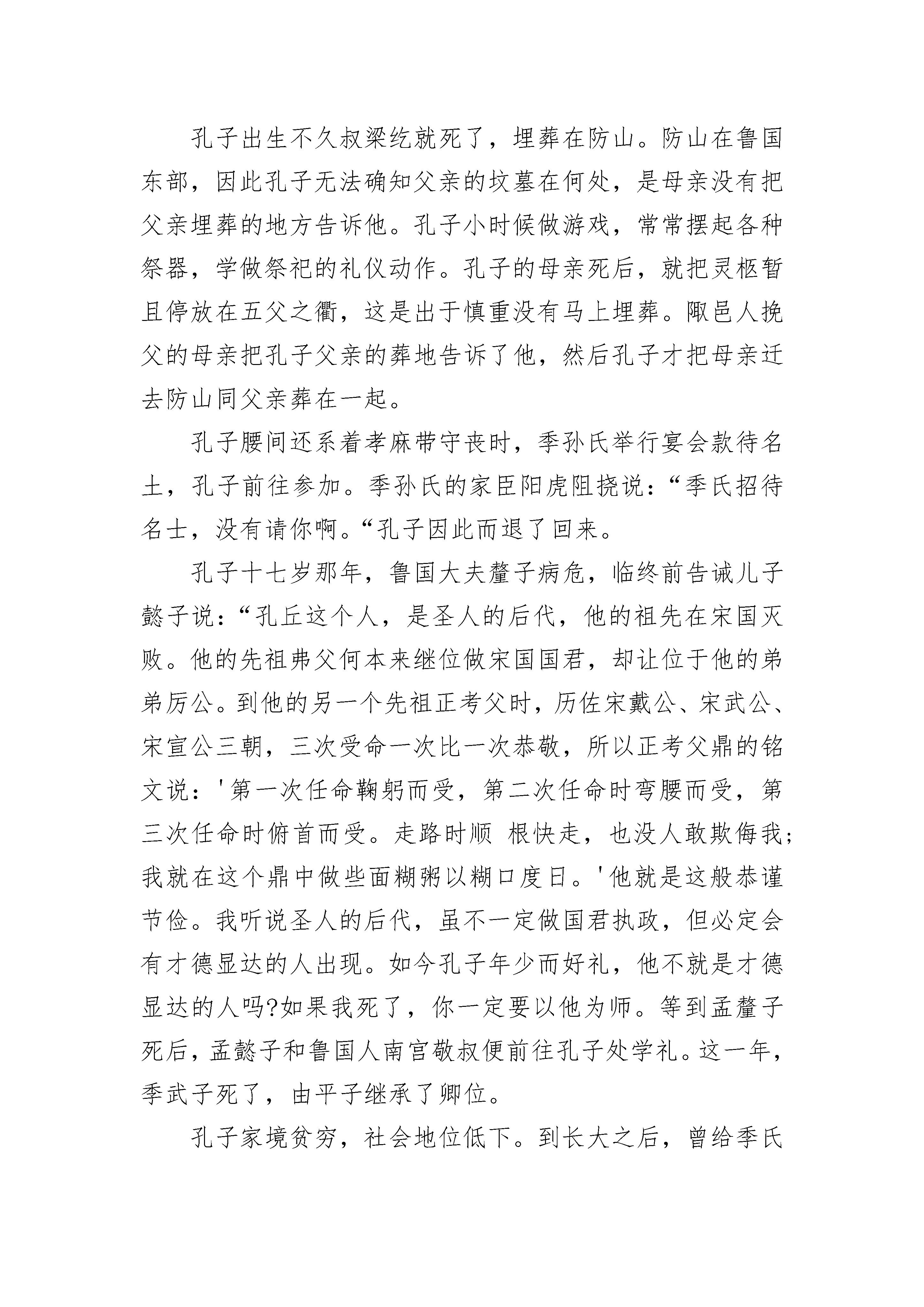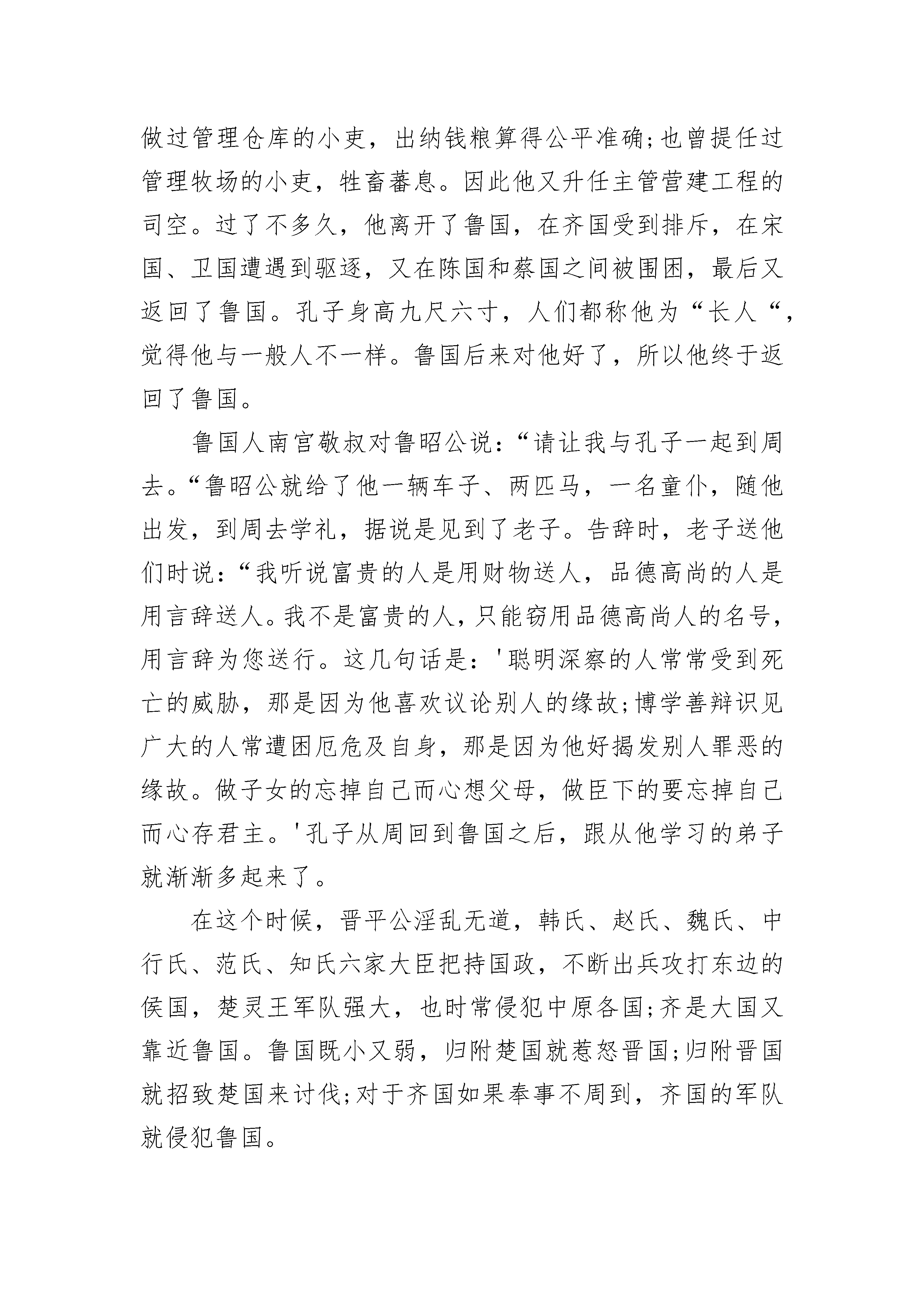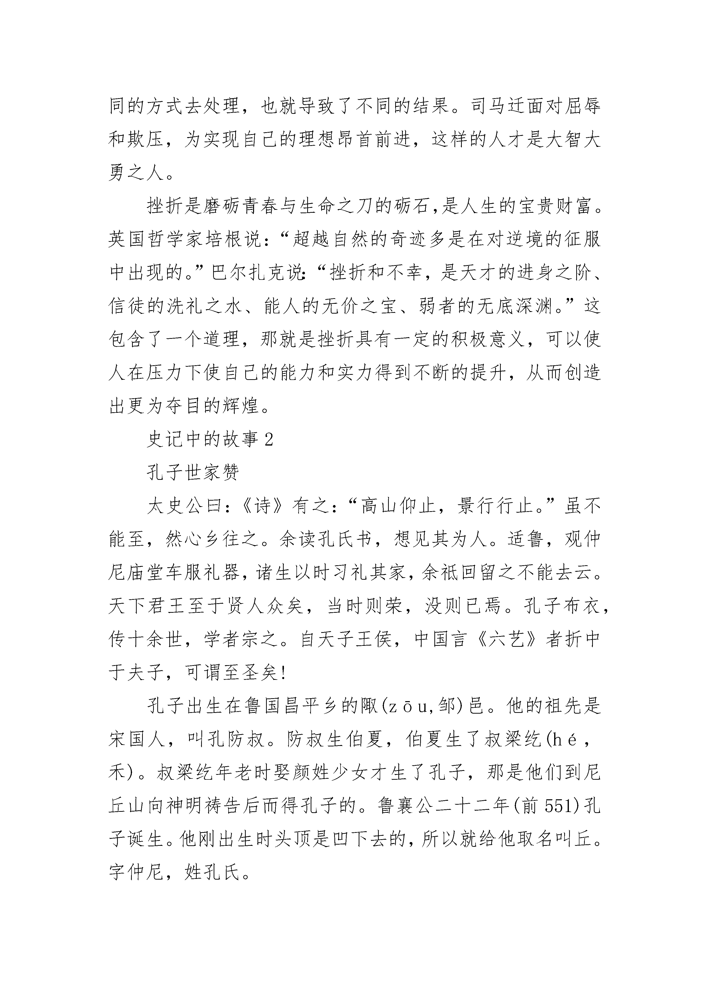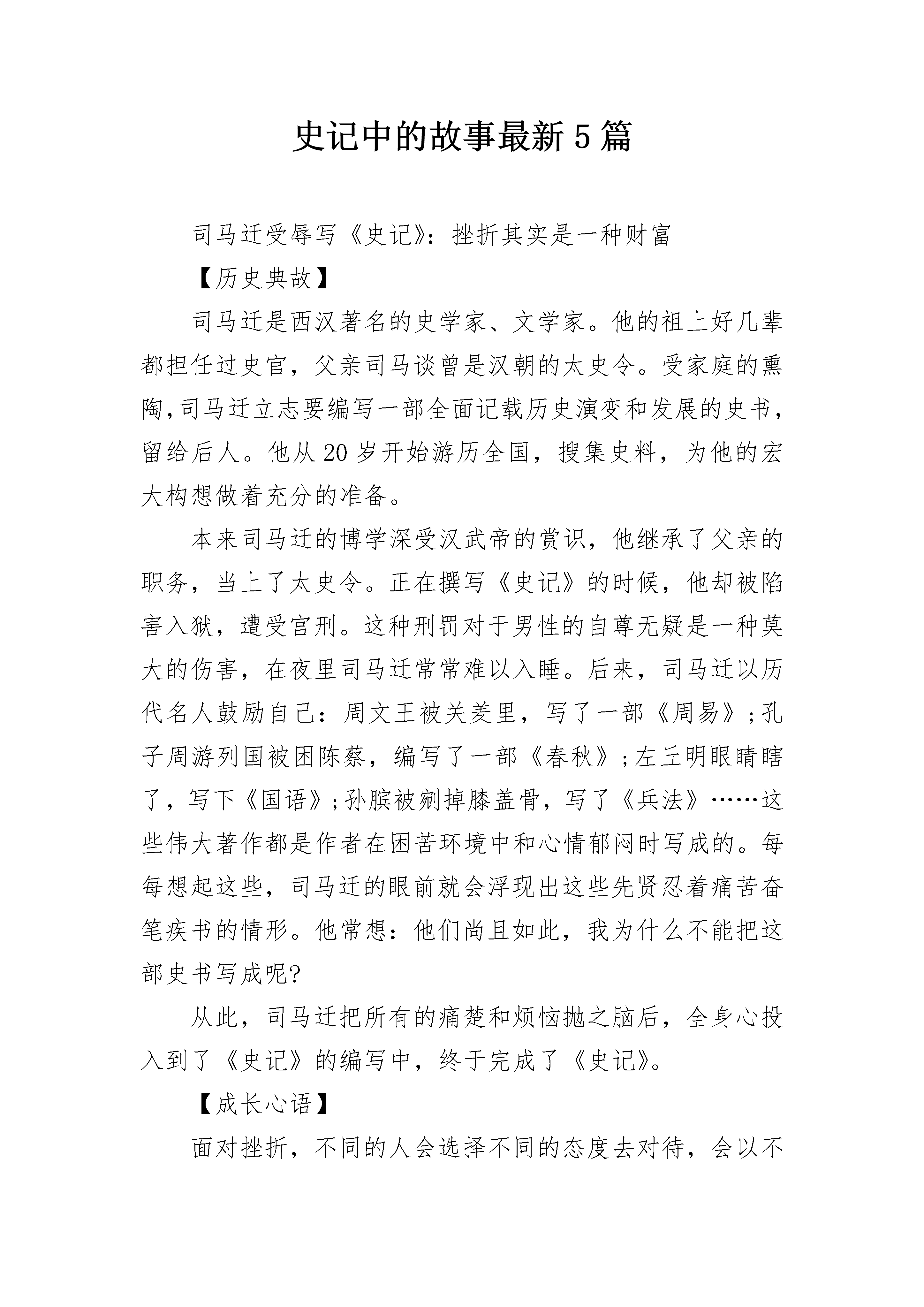 史记中的故事最新5篇司马迁受辱写《史记》:挫折其实是一种财富【历史典故】司马迁是西汉著名的史学家、文学家。他的祖上好几辈都担任过史官,父亲司马谈曾是汉朝的太史令。受家庭的熏陶,司马迁立志要编写一部全面记载历史演变和发展的史书,留给后人。他从20岁开始游历全国,搜集史料,为他的宏大构想做着充分的准备。本来司马迁的博学深受汉武帝的赏识,他继承了父亲的职务,当上了太史令。正在撰写《史记》的时候,他却被陷害入狱,遭受宫刑。这种刑罚对于男性的自尊无疑是一种莫大的伤害,在夜里司马迁常常难以入睡。后来,司马迁以历代名人鼓励自己:周文王被关羑里,写了一部《周易》;孔子周游列国被困陈蔡,编写了一部《春秋》;左丘明眼睛瞎了,写下《国语》;孙膑被剜掉膝盖骨,写了《兵法》……这些伟大著作都是作者在困苦环境中和心情郁闷时写成的。每每想起这些,司马迁的眼前就会浮现出这些先贤忍着痛苦奋笔疾书的情形。他常想:他们尚且如此,我为什么不能把这部史书写成呢?从此,司马迁把所有的痛楚和烦恼抛之脑后,全身心投入到了《史记》的编写中,终于完成了《史记》。【成长心语】面对挫折,不同的人会选择不同的态度去对待,会以不同的方式去处理,也就导致了不同的结果。司马迁面对屈辱和欺压,为实现自己的理想昂首前进,这样的人才是大智大勇之人。挫折是磨砺青春与生命之刀的砺石,是人生的宝贵财富。英国哲学家培根说:“超越自然的奇迹多是在对逆境的征服中出现的。”巴尔扎克说:“挫折和不幸,是天才的进身之阶、信徒的洗礼之水、能人的无价之宝、弱者的无底深渊。”这包含了一个道理,那就是挫折具有一定的积极意义,可以使人在压力下使自己的能力和实力得到不断的提升,从而创造出更为夺目的辉煌。史记中的故事2孔子世家赞太史公曰:《诗》有之:“高山仰止,景行行止。”虽不能至,然心乡往之。余读孔氏书,想见其为人。适鲁,观仲尼庙堂车服礼器,诸生以时习礼其家,余祗回留之不能去云。天下君王至于贤人众矣,当时则荣,没则已焉。孔子布衣,传十余世,学者宗之。自天子王侯,中国言《六艺》者折中于夫子,可谓至圣矣!孔子出生在鲁国昌平乡的陬(zōu,邹)邑。他的祖先是宋国人,叫孔防叔。防叔生伯夏,伯夏生了叔梁纥(hé,禾)。叔梁纥年老时娶颜姓少女才生了孔子,那是他们到尼丘山向神明祷告后而得孔子的。鲁襄公二十二年(前551)孔子诞生。他刚出生时头顶是凹下去的,所以就给他取名叫丘。字仲尼,姓孔氏。孔子出生不久叔梁纥就死了,埋葬在防山。防山在鲁国东部,因此孔子无法确知父亲的坟墓在何处,是母亲没有把父亲埋葬的地方告诉他。孔子小时候做游戏,常常摆起各种祭器,学做祭祀的礼仪动作。孔子的母亲死后,就把灵柩暂且停放在五父之衢,这是出于慎重没有马上埋葬。陬邑人挽父的母亲把孔子父亲的葬地告诉了他,然后孔子才把母亲迁去防山同父亲葬在一起。孔子腰间还系着孝麻带守丧时,季孙氏举行宴会款待名土,孔子前往参加。季孙氏的家臣阳虎阻挠说:“季氏招待名士,没有请你啊。“孔子因此而退了回来。孔子十七岁那年,鲁国大夫釐子病危,临终前告诫儿子懿子说:“孔丘这个人,是圣人的后代,他的祖先在宋国灭败。他的先祖弗父何本来继位做宋国国君,却让位于他的弟弟厉公。到他的另一个先祖正考父时,历佐宋戴公、宋武公、宋宣公三朝,三次受命一次比一次恭敬,所以正考父鼎的铭文说:'第一次任命鞠躬而受,第二次任命时弯腰而受,第三次任命时俯首而受。走路时顺根快走,也没人敢欺侮我;我就在这个鼎中做些面糊粥以糊口度日。'他就是这般恭谨节俭。我听说圣人的后代,虽不一定做国君执政,但必定会有才德显达的人出现。如今孔子年少而好礼,他不就是才德显达的人吗?如果我死了,你一定要以他为师。等到孟釐子死后,孟懿子和鲁国人南宫敬叔便前往孔子处学礼。这一年,季武子死了,由平子继承了卿位。孔子家境贫穷,社会地位低下。到长大之后,曾给季氏做过管理仓库的小吏,出纳钱粮算得公平准确;也曾提任过管理牧场的小吏,牲畜蕃息。因此他又升任主管营建工程的司空。过了不多久,他离开了鲁国,在齐国受到排斥,在宋国、卫国遭遇到驱逐,又在陈国和蔡国之间被围困,最后又返回了鲁国。孔子身高九尺六寸,人们都称他为“长人“,觉得他与一般人不一样。鲁国后来对他好了,所以他终于返回了鲁国。鲁国人南宫敬叔对鲁昭公说:“请让我与孔子一起到周去。“鲁昭公就给了他一辆车子、两匹马,一名童仆,随他出发,到周去学礼,据说是见到了老子。告辞时,老子送他们时说:“我听说富贵的人是用财物送人,品德高尚的人是用言辞送人。我不是富贵的人,只能窃用品德高尚人的名号,用言辞为您送行。这几句话是:'聪明深察的人常常受到死亡的威胁,那是因为他喜欢议论别人的缘故;博学善辩识见广大的人常遭困厄危及自身,那是因为他好揭发别人罪恶的缘故。做子女的忘掉自己而心想父母,做臣下的要忘掉自己而心存君主。'孔子从周