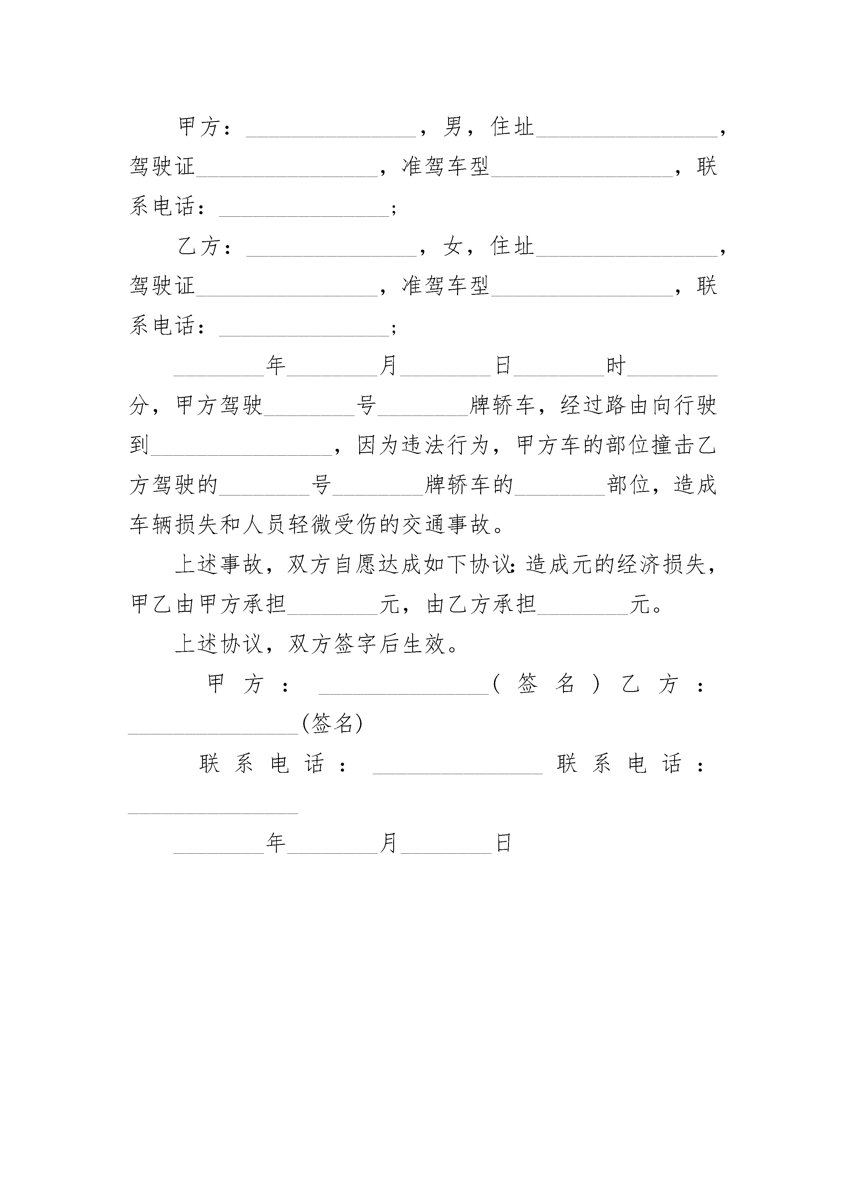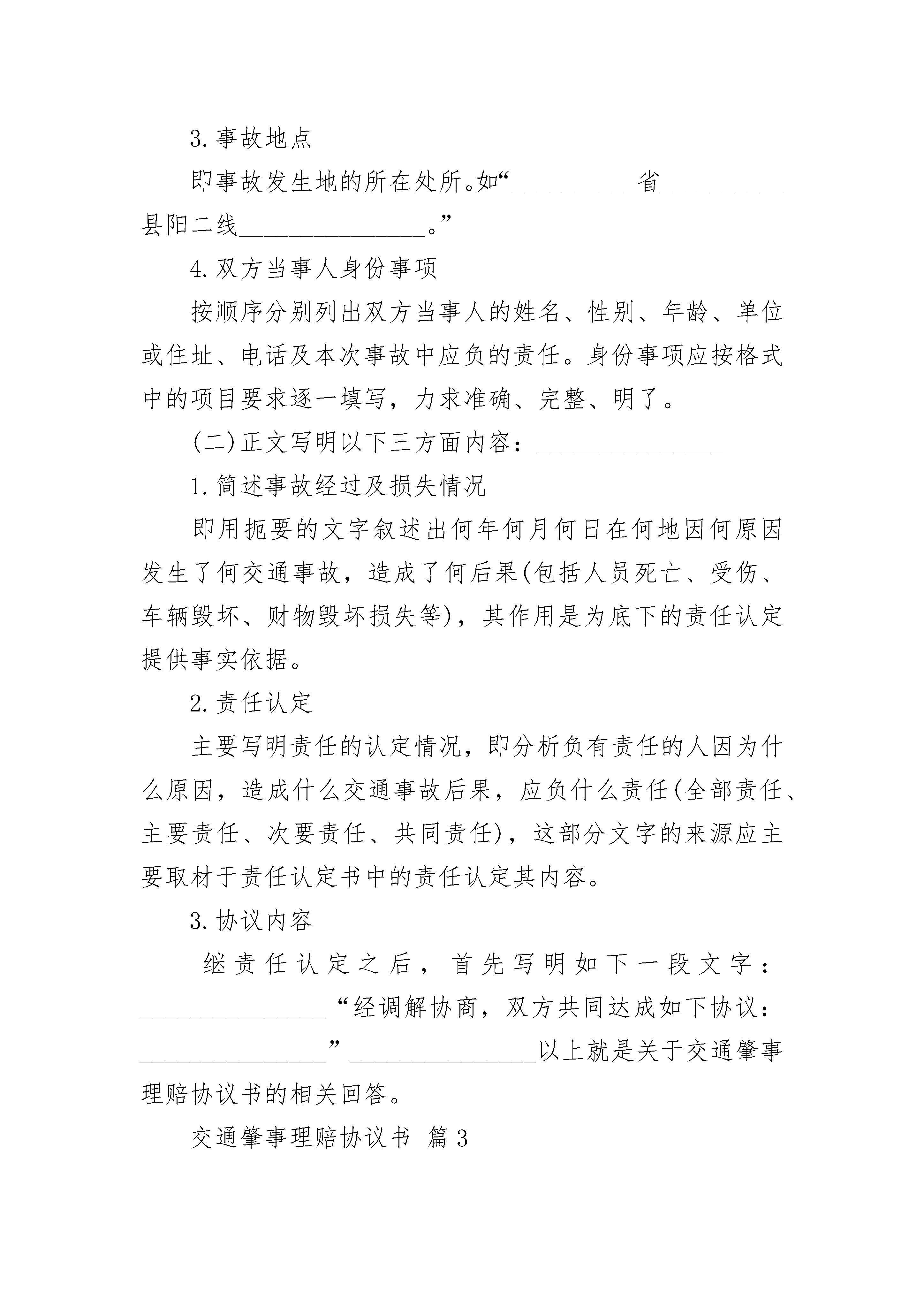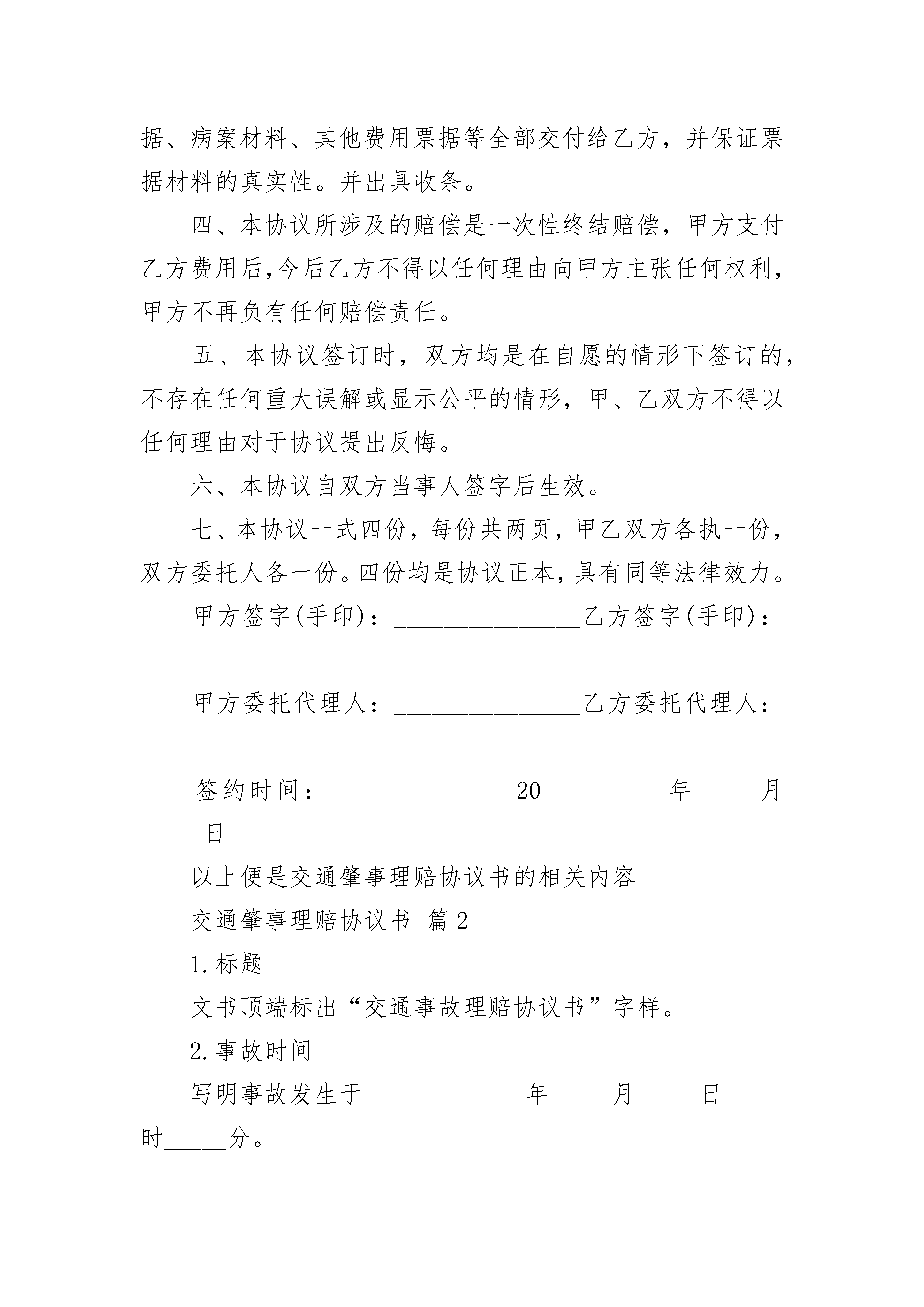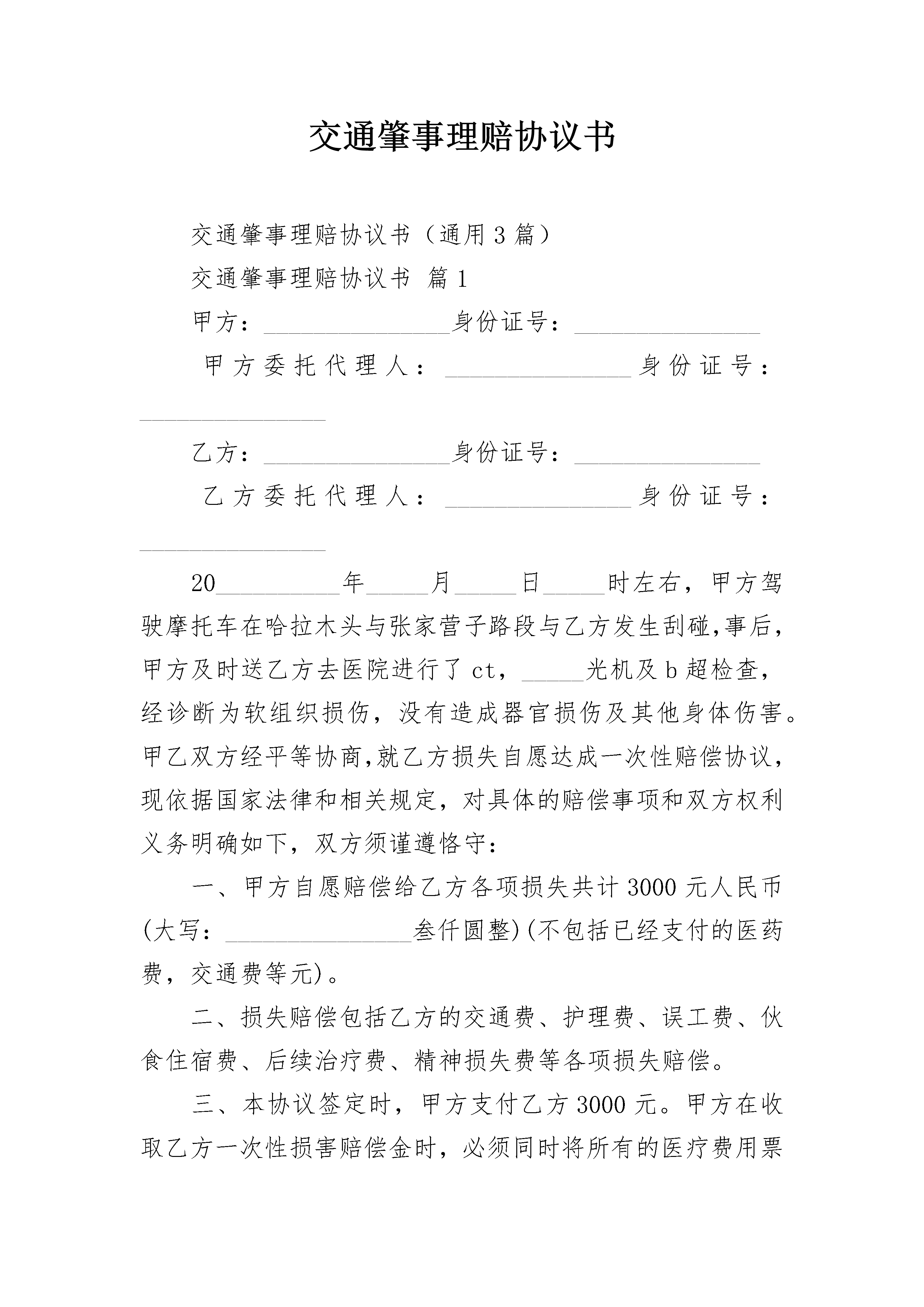 交通肇事理赔协议书交通肇事理赔协议书(通用3篇)交通肇事理赔协议书篇1甲方:_______________身份证号:_______________甲方委托代理人:_______________身份证号:_______________乙方:_______________身份证号:_______________乙方委托代理人:_______________身份证号:_______________20__________年_____月_____日_____时左右,甲方驾驶摩托车在哈拉木头与张家营子路段与乙方发生刮碰,事后,甲方及时送乙方去医院进行了ct,_____光机及b超检查,经诊断为软组织损伤,没有造成器官损伤及其他身体伤害。甲乙双方经平等协商,就乙方损失自愿达成一次性赔偿协议,现依据国家法律和相关规定,对具体的赔偿事项和双方权利义务明确如下,双方须谨遵恪守:一、甲方自愿赔偿给乙方各项损失共计3000元人民币(大写:_______________叁仟圆整)(不包括已经支付的医药费,交通费等元)。二、损失赔偿包括乙方的交通费、护理费、误工费、伙食住宿费、后续治疗费、精神损失费等各项损失赔偿。三、本协议签定时,甲方支付乙方3000元。甲方在收取乙方一次性损害赔偿金时,必须同时将所有的医疗费用票据、病案材料、其他费用票据等全部交付给乙方,并保证票据材料的真实性。并出具收条。四、本协议所涉及的赔偿是一次性终结赔偿,甲方支付乙方费用后,今后乙方不得以任何理由向甲方主张任何权利,甲方不再负有任何赔偿责任。五、本协议签订时,双方均是在自愿的情形下签订的,不存在任何重大误解或显示公平的情形,甲、乙双方不得以任何理由对于协议提出反悔。六、本协议自双方当事人签字后生效。七、本协议一式四份,每份共两页,甲乙双方各执一份,双方委托人各一份。四份均是协议正本,具有同等法律效力。甲方签字(手印):_______________乙方签字(手印):_______________甲方委托代理人:_______________乙方委托代理人:_______________签约时间:_______________20__________年_____月_____日以上便是交通肇事理赔协议书的相关内容交通肇事理赔协议书篇21.标题文书顶端标出“交通事故理赔协议书”字样。2.事故时间写明事故发生于_____________年_____月_____日_____时_____分。3.事故地点即事故发生地的所在处所。如“__________省__________县阳二线_______________。”4.双方当事人身份事项按顺序分别列出双方当事人的姓名、性别、年龄、单位或住址、电话及本次事故中应负的责任。身份事项应按格式中的项目要求逐一填写,力求准确、完整、明了。(二)正文写明以下三方面内容:_______________1.简述事故经过及损失情况即用扼要的文字叙述出何年何月何日在何地因何原因发生了何交通事故,造成了何后果(包括人员死亡、受伤、车辆毁坏、财物毁坏损失等),其作用是为底下的责任认定提供事实依据。2.责任认定主要写明责任的认定情况,即分析负有责任的人因为什么原因,造成什么交通事故后果,应负什么责任(全部责任、主要责任、次要责任、共同责任),这部分文字的来源应主要取材于责任认定书中的责任认定其内容。3.协议内容继责任认定之后,首先写明如下一段文字:_______________“经调解协商,双方共同达成如下协议:_______________”_______________以上就是关于交通肇事理赔协议书的相关回答。交通肇事理赔协议书篇3甲方:_______________,男,住址________________,驾驶证________________,准驾车型________________,联系电话:_______________;乙方:_______________,女,住址________________,驾驶证________________,准驾车型________________,联系电话:_______________;________年________月________日________时________分,甲方驾驶________号________牌轿车,经过路由向行驶到________________,因为违法行为,甲方车的部位撞击乙方驾驶的________号________牌轿车的________部位,造成车辆损失和人员轻微受伤的交通事故。上述事故,双方自愿达成如下协议:造成元的经济损失,甲乙由甲方承担________元,由乙方承担________元。上述协议,双方签字后生效。甲方:_______________(签名)乙方:_______