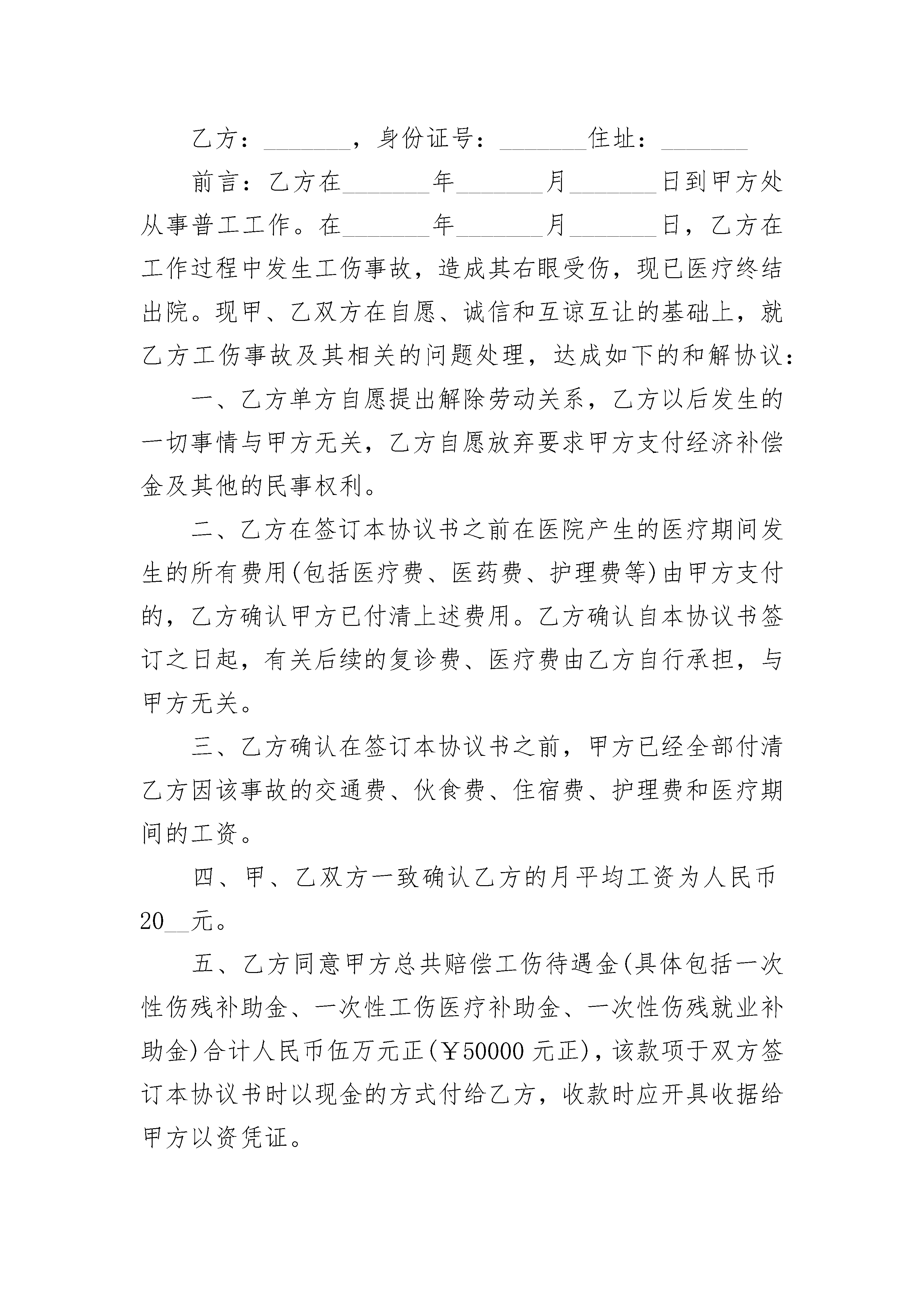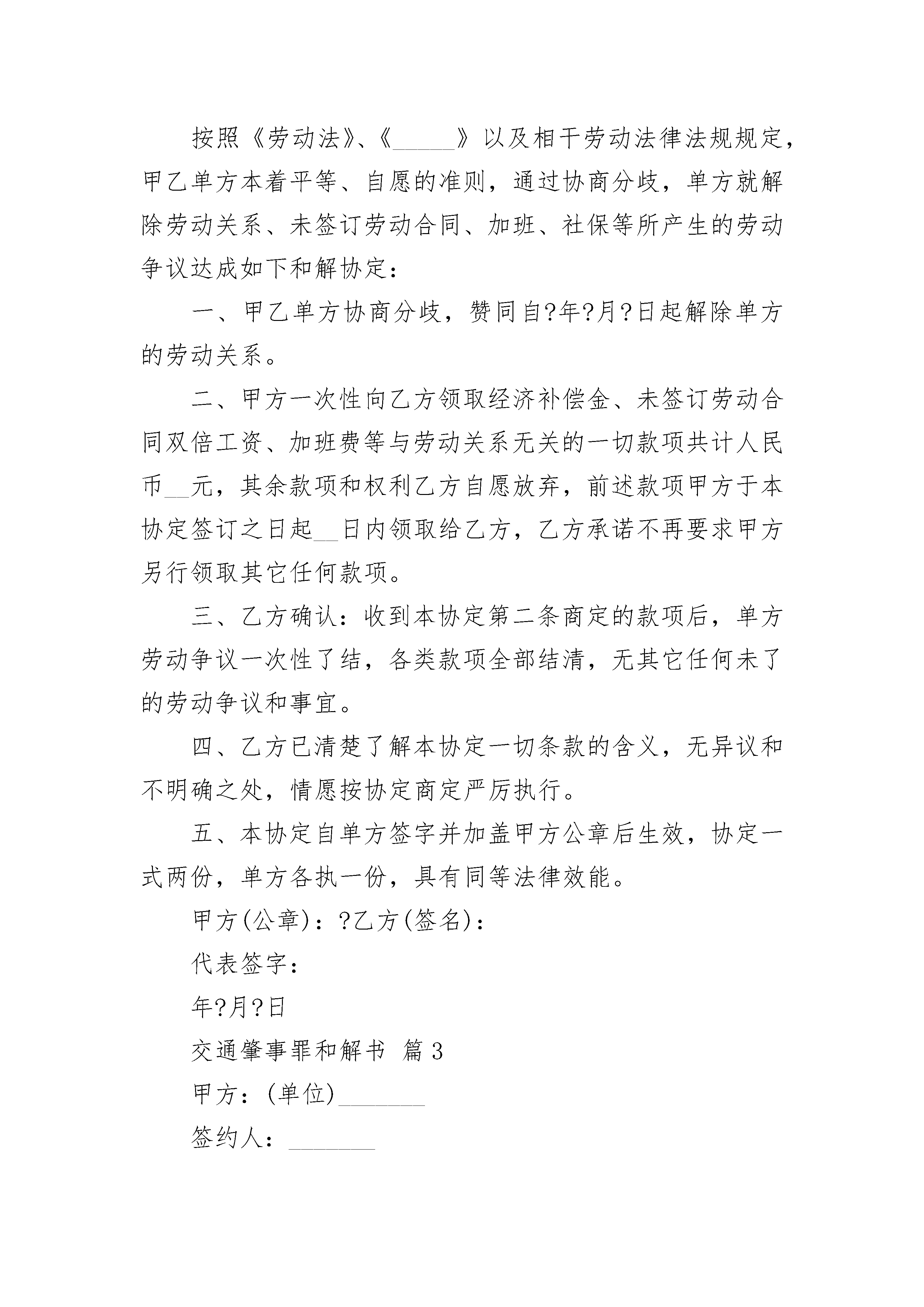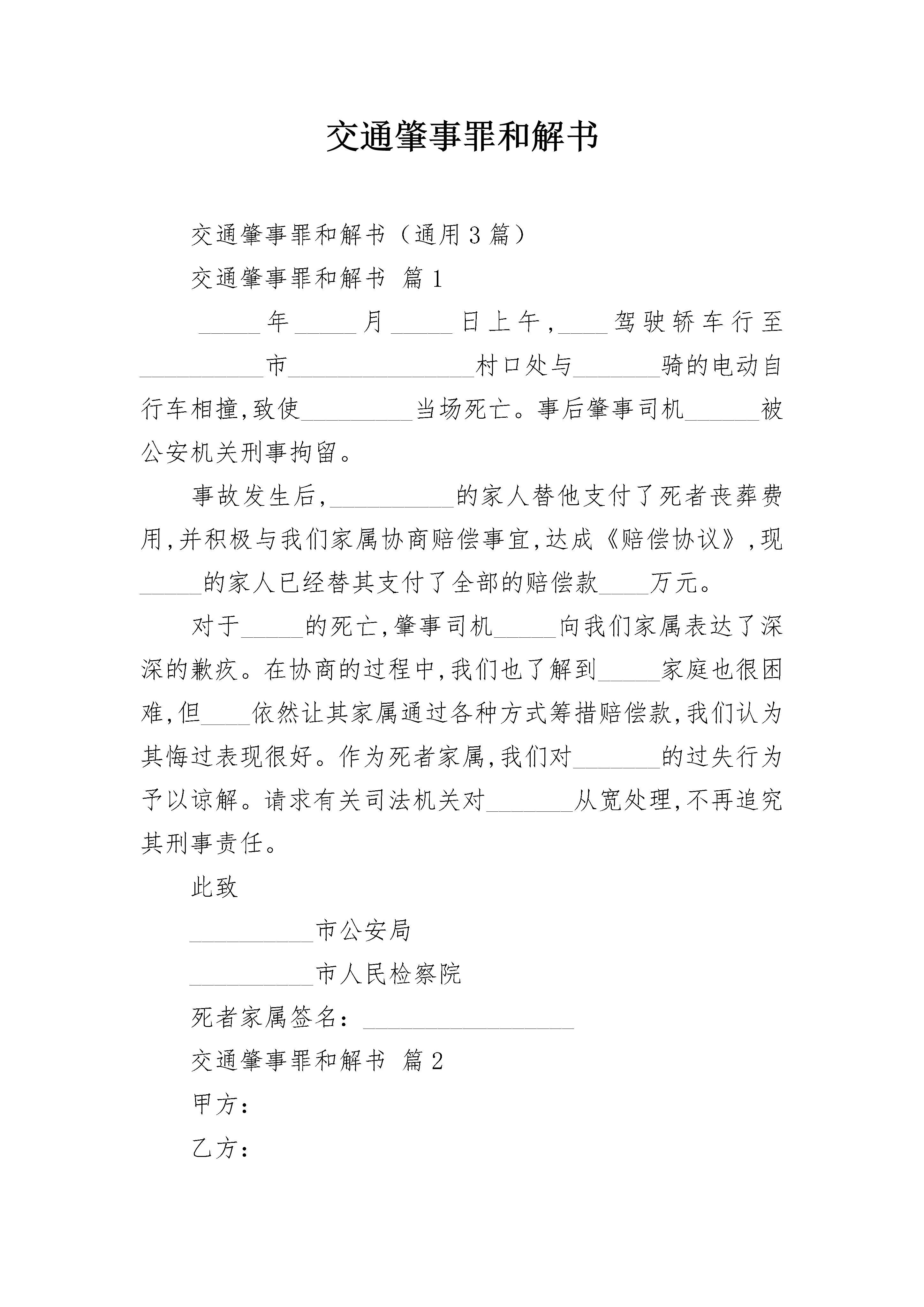 交通肇事罪和解书交通肇事罪和解书(通用3篇)交通肇事罪和解书篇1_____年_____月_____日上午,____驾驶轿车行至__________市_______________村口处与_______骑的电动自行车相撞,致使_________当场死亡。事后肇事司机______被公安机关刑事拘留。事故发生后,__________的家人替他支付了死者丧葬费用,并积极与我们家属协商赔偿事宜,达成《赔偿协议》,现_____的家人已经替其支付了全部的赔偿款____万元。对于_____的死亡,肇事司机_____向我们家属表达了深深的歉疚。在协商的过程中,我们也了解到_____家庭也很困难,但____依然让其家属通过各种方式筹措赔偿款,我们认为其悔过表现很好。作为死者家属,我们对_______的过失行为予以谅解。请求有关司法机关对_______从宽处理,不再追究其刑事责任。此致__________市公安局__________市人民检察院死者家属签名:_________________交通肇事罪和解书篇2甲方:乙方:按照《劳动法》、《_____》以及相干劳动法律法规规定,甲乙单方本着平等、自愿的准则,通过协商分歧,单方就解除劳动关系、未签订劳动合同、加班、社保等所产生的劳动争议达成如下和解协定:一、甲乙单方协商分歧,赞同自?年?月?日起解除单方的劳动关系。二、甲方一次性向乙方领取经济补偿金、未签订劳动合同双倍工资、加班费等与劳动关系无关的一切款项共计人民币__元,其余款项和权利乙方自愿放弃,前述款项甲方于本协定签订之日起__日内领取给乙方,乙方承诺不再要求甲方另行领取其它任何款项。三、乙方确认:收到本协定第二条商定的款项后,单方劳动争议一次性了结,各类款项全部结清,无其它任何未了的劳动争议和事宜。四、乙方已清楚了解本协定一切条款的含义,无异议和不明确之处,情愿按协定商定严厉执行。五、本协定自单方签字并加盖甲方公章后生效,协定一式两份,单方各执一份,具有同等法律效能。甲方(公章):?乙方(签名):代表签字:年?月?日交通肇事罪和解书篇3甲方:(单位)_______签约人:_______乙方:_______,身份证号:_______住址:_______前言:乙方在_______年_______月_______日到甲方处从事普工工作。在_______年_______月_______日,乙方在工作过程中发生工伤事故,造成其右眼受伤,现已医疗终结出院。现甲、乙双方在自愿、诚信和互谅互让的基础上,就乙方工伤事故及其相关的问题处理,达成如下的和解协议:一、乙方单方自愿提出解除劳动关系,乙方以后发生的一切事情与甲方无关,乙方自愿放弃要求甲方支付经济补偿金及其他的民事权利。二、乙方在签订本协议书之前在医院产生的医疗期间发生的所有费用(包括医疗费、医药费、护理费等)由甲方支付的,乙方确认甲方已付清上述费用。乙方确认自本协议书签订之日起,有关后续的复诊费、医疗费由乙方自行承担,与甲方无关。三、乙方确认在签订本协议书之前,甲方已经全部付清乙方因该事故的交通费、伙食费、住宿费、护理费和医疗期间的工资。四、甲、乙双方一致确认乙方的月平均工资为人民币20__元。五、乙方同意甲方总共赔偿工伤待遇金(具体包括一次性伤残补助金、一次性工伤医疗补助金、一次性伤残就业补助金)合计人民币伍万元正(¥50000元正),该款项于双方签订本协议书时以现金的方式付给乙方,收款时应开具收据给甲方以资凭证。六、甲方要求乙方作伤残鉴定,但乙方明确不愿意到东莞市劳动能力鉴定委员会作伤残鉴定。七、乙方清楚可以到东莞市劳动能力鉴定委员会作伤残鉴定。甲方:_______乙方:_______签订日期:_______签订日期:_______