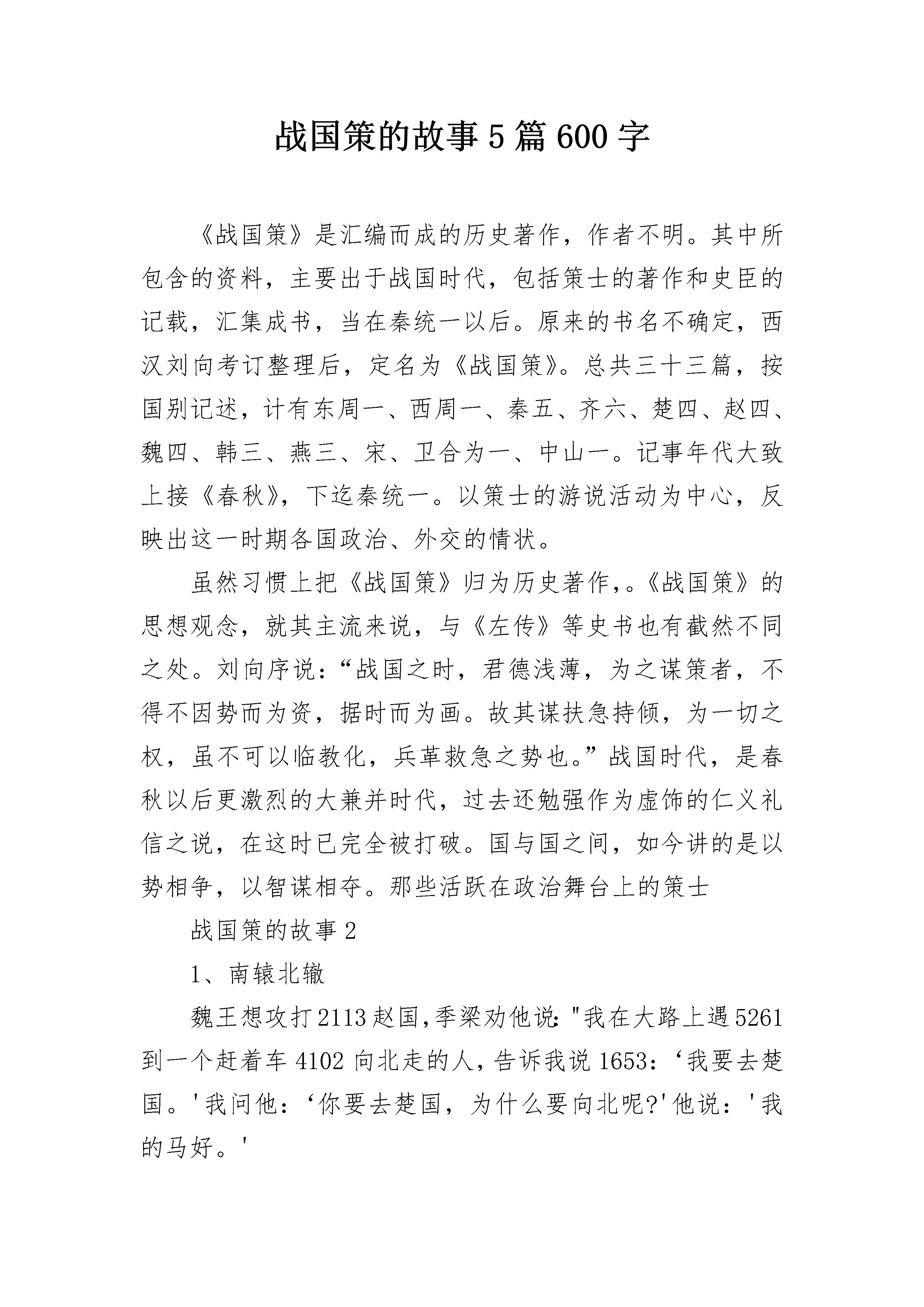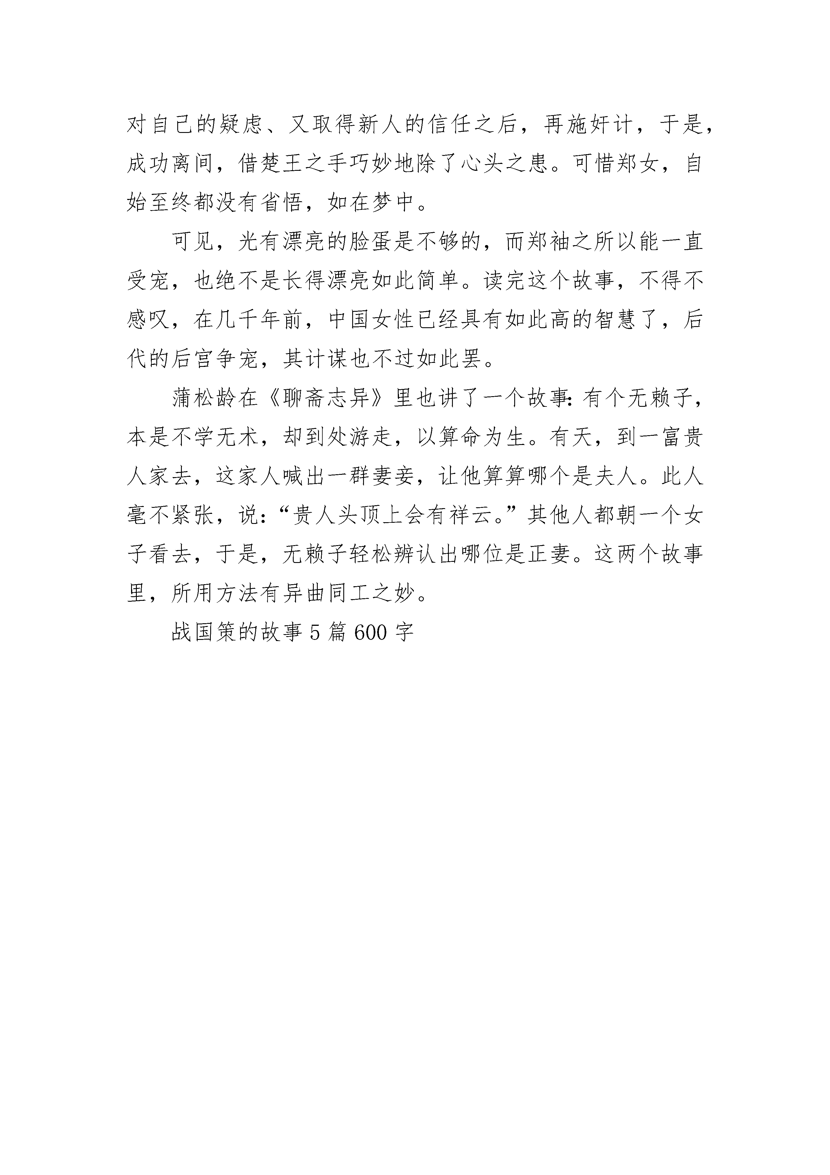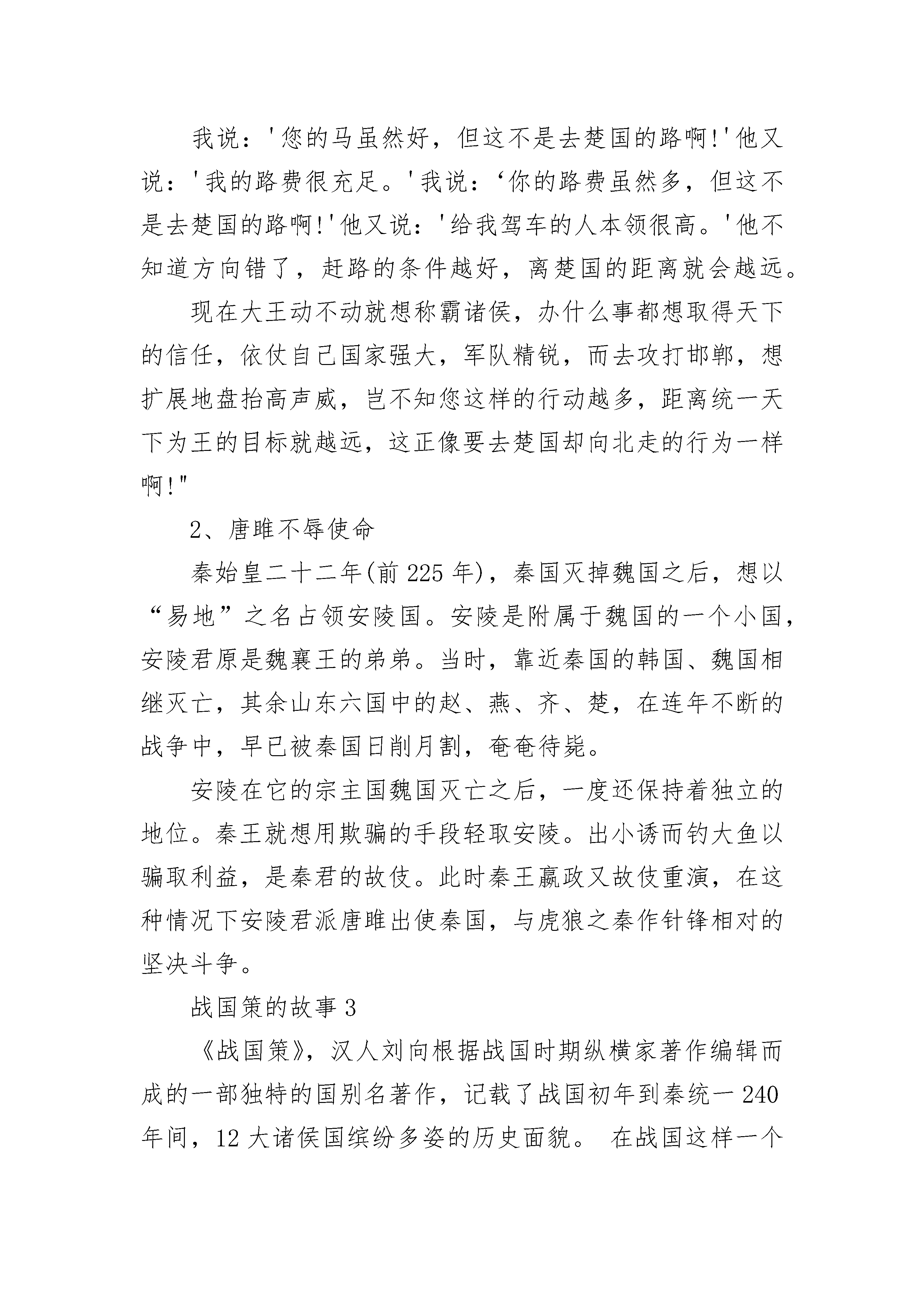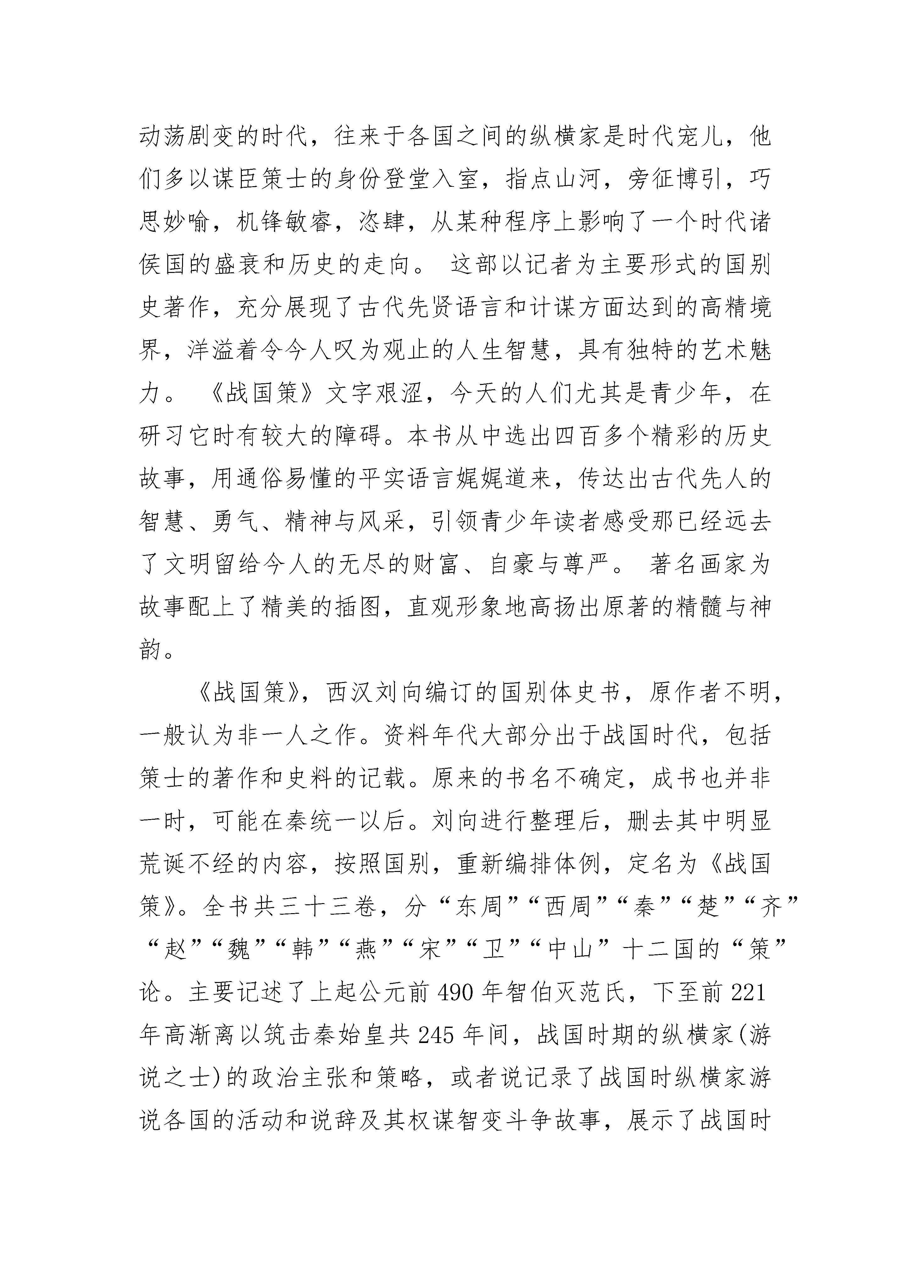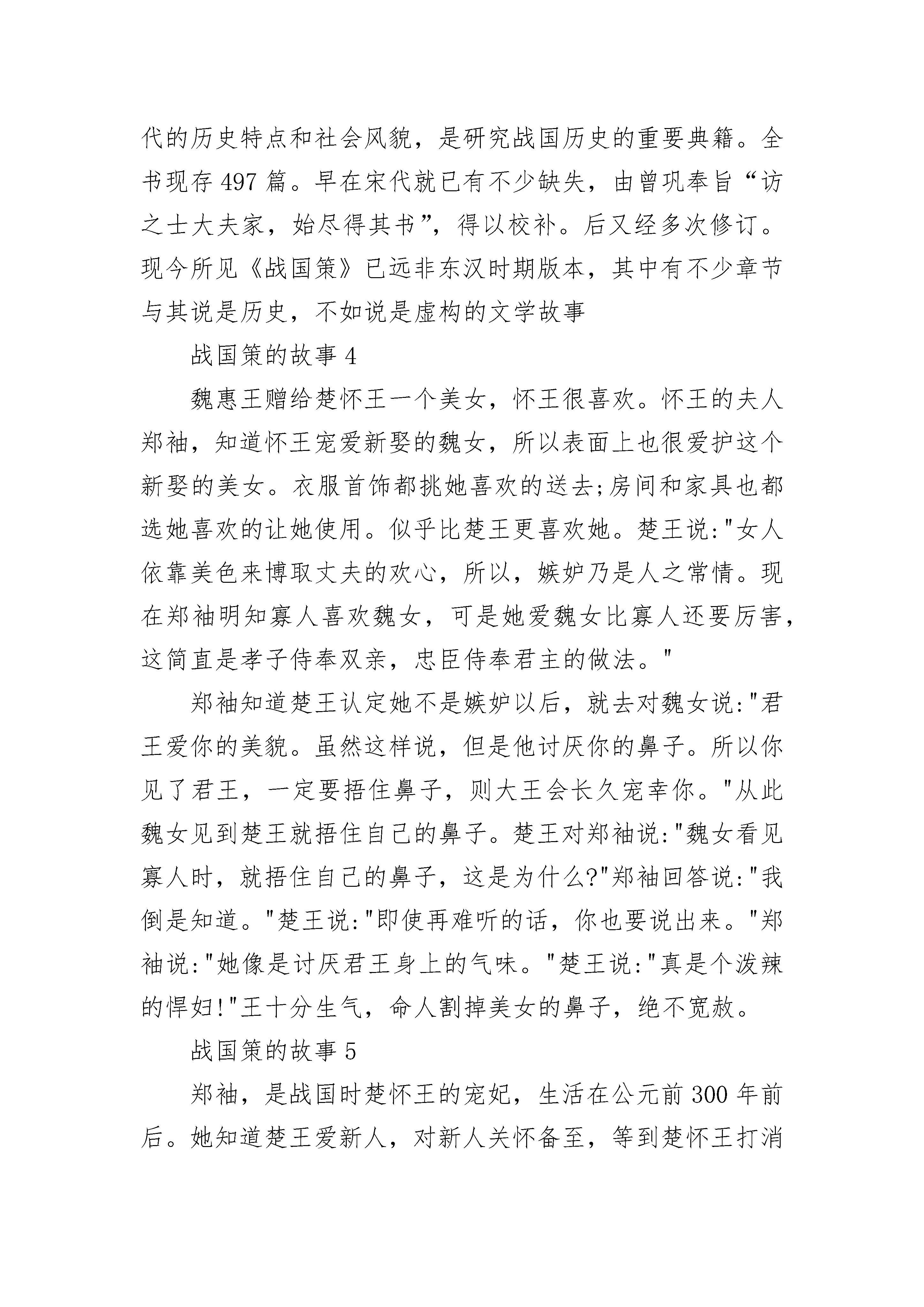 战国策的故事5篇600字《战国策》是汇编而成的历史著作,作者不明。其中所包含的资料,主要出于战国时代,包括策士的著作和史臣的记载,汇集成书,当在秦统一以后。原来的书名不确定,西汉刘向考订整理后,定名为《战国策》。总共三十三篇,按国别记述,计有东周一、西周一、秦五、齐六、楚四、赵四、魏四、韩三、燕三、宋、卫合为一、中山一。记事年代大致上接《春秋》,下迄秦统一。以策士的游说活动为中心,反映出这一时期各国政治、外交的情状。虽然习惯上把《战国策》归为历史著作,。《战国策》的思想观念,就其主流来说,与《左传》等史书也有截然不同之处。刘向序说:“战国之时,君德浅薄,为之谋策者,不得不因势而为资,据时而为画。故其谋扶急持倾,为一切之权,虽不可以临教化,兵革救急之势也。”战国时代,是春秋以后更激烈的大兼并时代,过去还勉强作为虚饰的仁义礼信之说,在这时已完全被打破。国与国之间,如今讲的是以势相争,以智谋相夺。那些活跃在政治舞台上的策士战国策的故事21、南辕北辙魏王想攻打2113赵国,季梁劝他说:"我在大路上遇5261到一个赶着车4102向北走的人,告诉我说1653:‘我要去楚国。'我问他:‘你要去楚国,为什么要向北呢?'他说:'我的马好。'我说:'您的马虽然好,但这不是去楚国的路啊!'他又说:'我的路费很充足。'我说:‘你的路费虽然多,但这不是去楚国的路啊!'他又说:'给我驾车的人本领很高。'他不知道方向错了,赶路的条件越好,离楚国的距离就会越远。现在大王动不动就想称霸诸侯,办什么事都想取得天下的信任,依仗自己国家强大,军队精锐,而去攻打邯郸,想扩展地盘抬高声威,岂不知您这样的行动越多,距离统一天下为王的目标就越远,这正像要去楚国却向北走的行为一样啊!"2、唐雎不辱使命秦始皇二十二年(前225年),秦国灭掉魏国之后,想以“易地”之名占领安陵国。安陵是附属于魏国的一个小国,安陵君原是魏襄王的弟弟。当时,靠近秦国的韩国、魏国相继灭亡,其余山东六国中的赵、燕、齐、楚,在连年不断的战争中,早已被秦国日削月割,奄奄待毙。安陵在它的宗主国魏国灭亡之后,一度还保持着独立的地位。秦王就想用欺骗的手段轻取安陵。出小诱而钓大鱼以骗取利益,是秦君的故伎。此时秦王嬴政又故伎重演,在这种情况下安陵君派唐雎出使秦国,与虎狼之秦作针锋相对的坚决斗争。战国策的故事3《战国策》,汉人刘向根据战国时期纵横家著作编辑而成的一部独特的国别名著作,记载了战国初年到秦统一240年间,12大诸侯国缤纷多姿的历史面貌。在战国这样一个动荡剧变的时代,往来于各国之间的纵横家是时代宠儿,他们多以谋臣策士的身份登堂入室,指点山河,旁征博引,巧思妙喻,机锋敏睿,恣肆,从某种程序上影响了一个时代诸侯国的盛衰和历史的走向。这部以记者为主要形式的国别史著作,充分展现了古代先贤语言和计谋方面达到的高精境界,洋溢着令今人叹为观止的人生智慧,具有独特的艺术魅力。《战国策》文字艰涩,今天的人们尤其是青少年,在研习它时有较大的障碍。本书从中选出四百多个精彩的历史故事,用通俗易懂的平实语言娓娓道来,传达出古代先人的智慧、勇气、精神与风采,引领青少年读者感受那已经远去了文明留给今人的无尽的财富、自豪与尊严。著名画家为故事配上了精美的插图,直观形象地高扬出原著的精髓与神韵。《战国策》,西汉刘向编订的国别体史书,原作者不明,一般认为非一人之作。资料年代大部分出于战国时代,包括策士的著作和史料的记载。原来的书名不确定,成书也并非一时,可能在秦统一以后。刘向进行整理后,删去其中明显荒诞不经的内容,按照国别,重新编排体例,定名为《战国策》。全书共三十三卷,分“东周”“西周”“秦”“楚”“齐”“赵”“魏”“韩”“燕”“宋”“卫”“中山”十二国的“策”论。主要记述了上起公元前490年智伯灭范氏,下至前221年高渐离以筑击秦始皇共245年间,战国时期的纵横家(游说之士)的政治主张和策略,或者说记录了战国时纵横家游说各国的活动和说辞及其权谋智变斗争故事,展示了战国时代的历史特点和社会风貌,是研究战国历史的重要典籍。全书现存497篇。早在宋代就已有不少缺失,由曾巩奉旨“访之士大夫家,始尽得其书”,得以校补。后又经多次修订。现今所见《战国策》已远非东汉时期版本,其中有不少章节与其说是历史,不如说是虚构的文学故事战国策的故事4魏惠王赠给楚怀王一个美女,怀王很喜欢。怀王的夫人郑袖,知道怀王宠爱新娶的魏女,所以表面上也很爱护这个新娶的美女。衣服首饰都挑她喜欢的送去;房间和家具也都选她喜欢的让她使用。似乎比楚王更喜欢她。楚王说:"女人依靠美色来博取丈夫的欢心,所以,嫉妒乃是人之常情。现在郑袖明知寡人喜欢魏女,可是她爱魏女比寡人还要厉害,这简直是孝子侍奉双亲,忠臣侍奉君主的做法。"郑袖知道楚王认定她不是嫉妒以后,就去对魏女说:"君王爱你的美貌。虽然