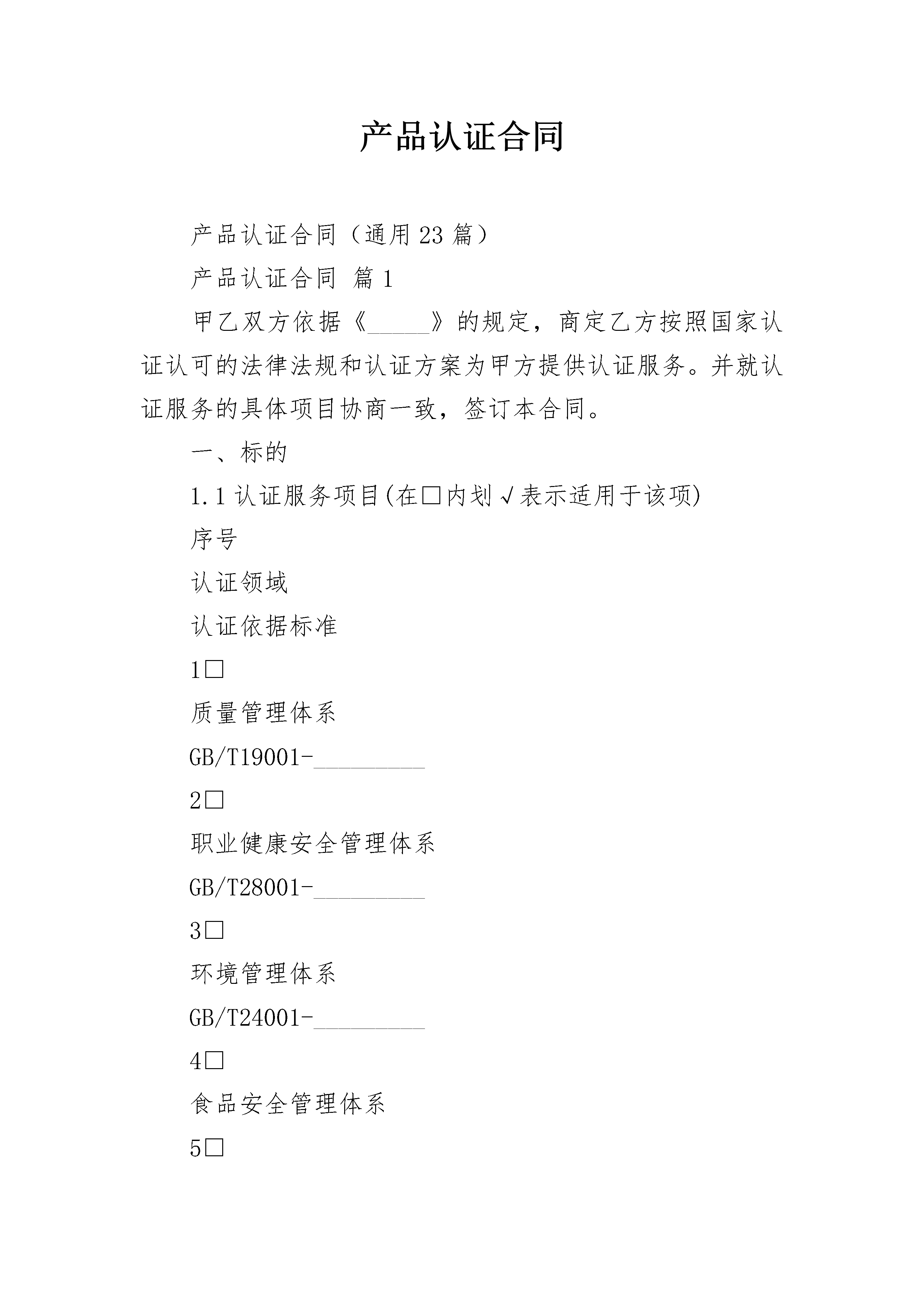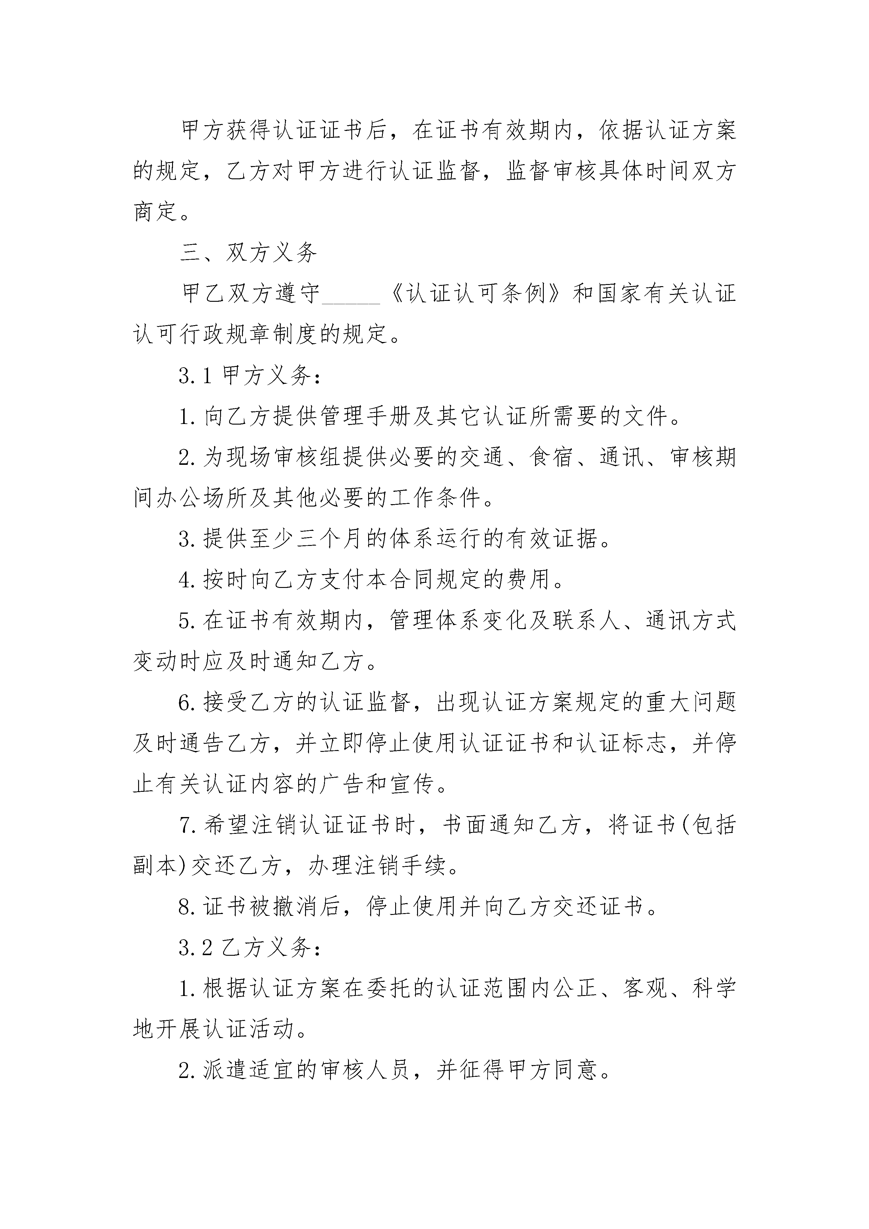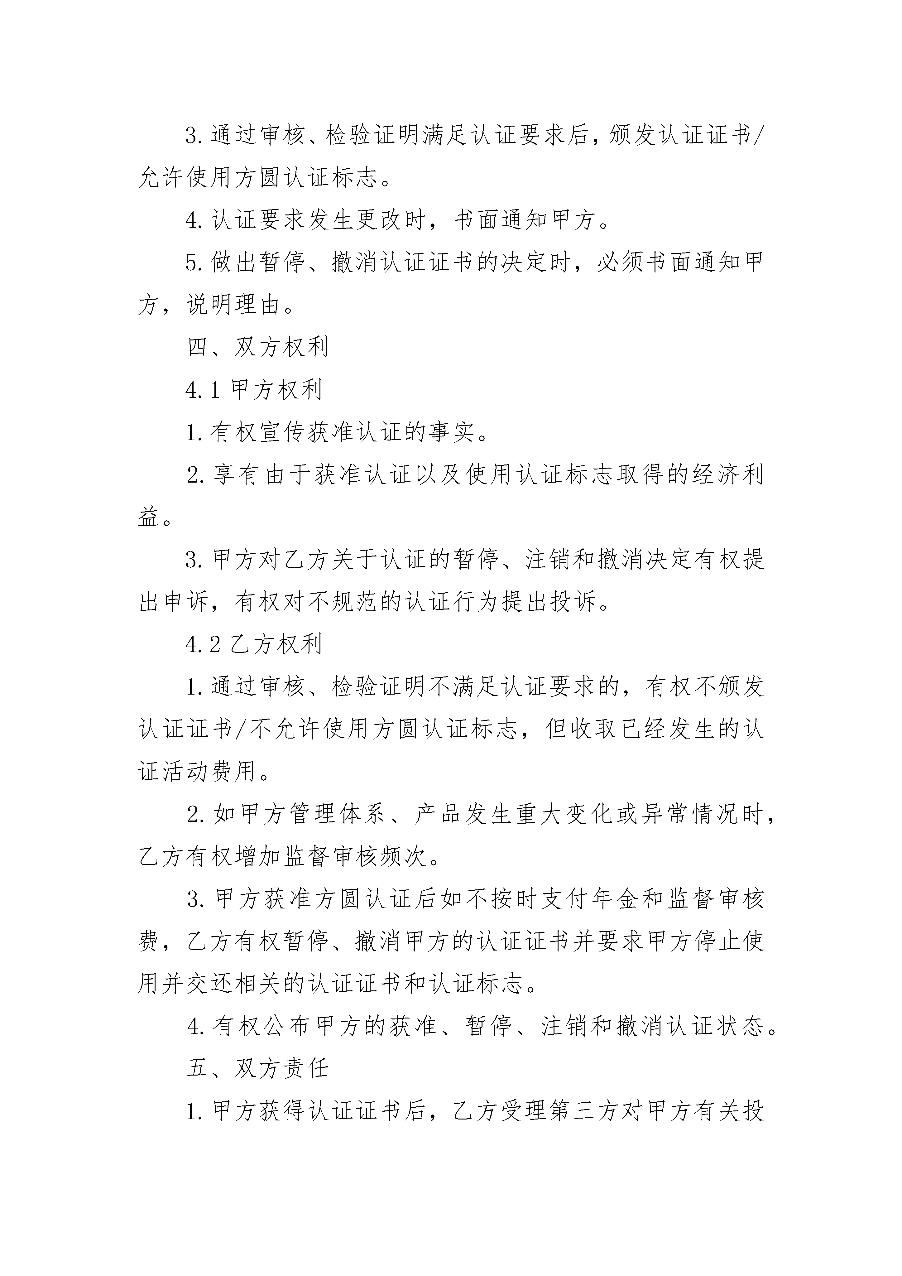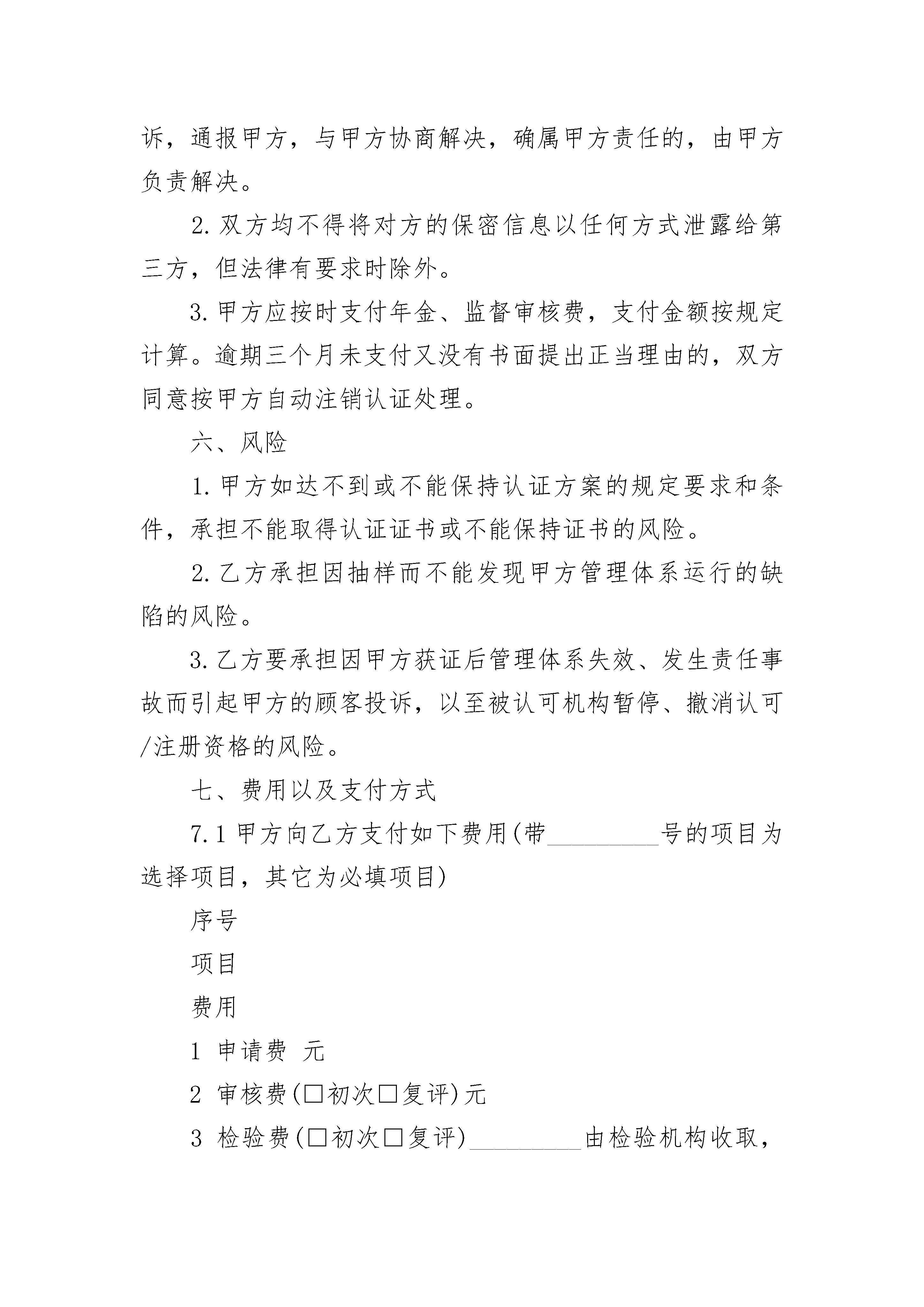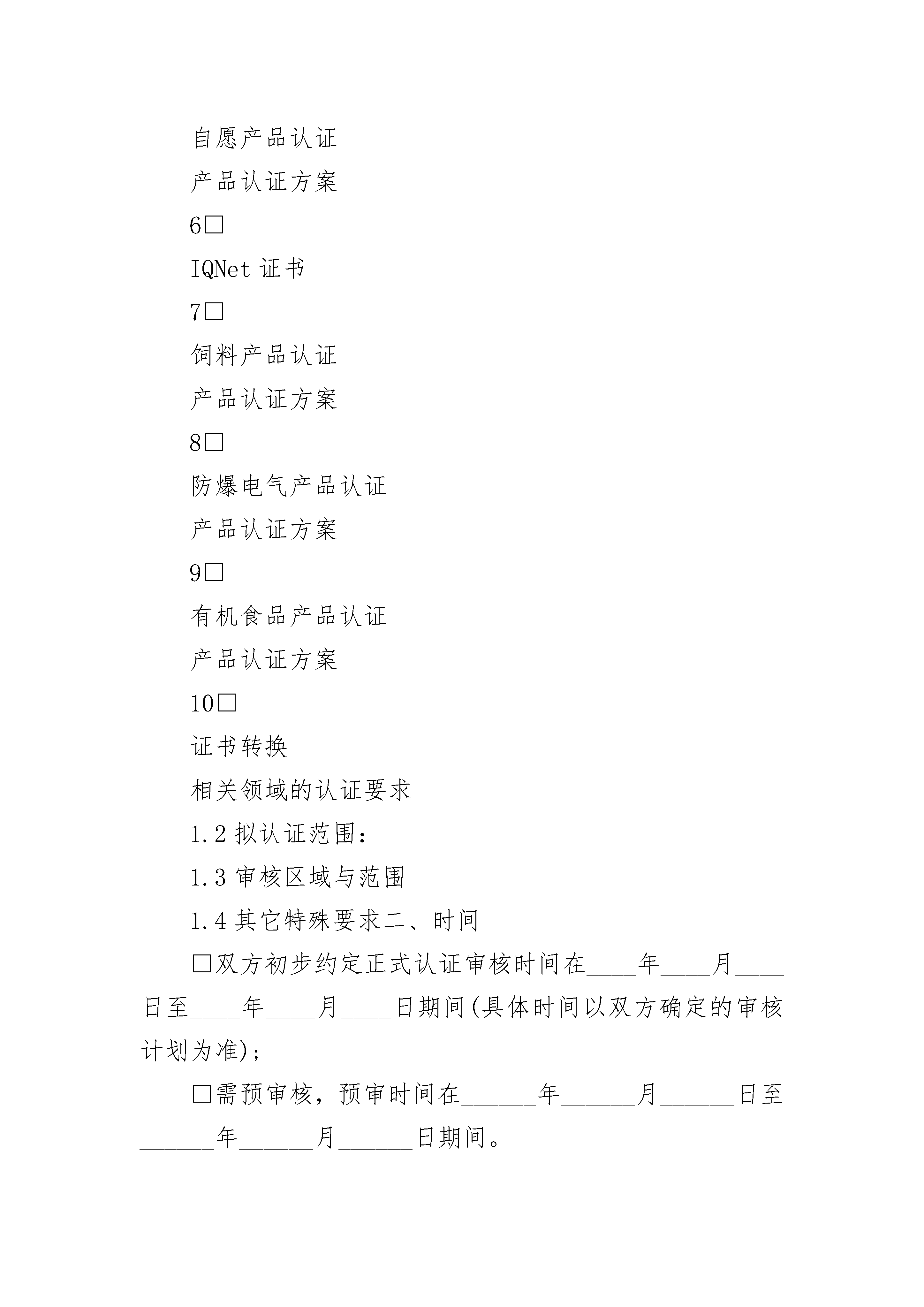 产品认证合同产品认证合同(通用23篇)产品认证合同篇1甲乙双方依据《_____》的规定,商定乙方按照国家认证认可的法律法规和认证方案为甲方提供认证服务。并就认证服务的具体项目协商一致,签订本合同。一、标的1.1认证服务项目(在□内划√表示适用于该项)序号认证领域认证依据标准1□质量管理体系GB/T19001-_________2□职业健康安全管理体系GB/T28001-_________3□环境管理体系GB/T24001-_________4□食品安全管理体系5□自愿产品认证产品认证方案6□IQNet证书7□饲料产品认证产品认证方案8□防爆电气产品认证产品认证方案9□有机食品产品认证产品认证方案10□证书转换相关领域的认证要求1.2拟认证范围:1.3审核区域与范围1.4其它特殊要求二、时间□双方初步约定正式认证审核时间在____年____月____日至____年____月____日期间(具体时间以双方确定的审核计划为准);□需预审核,预审时间在______年______月______日至______年______月______日期间。甲方获得认证证书后,在证书有效期内,依据认证方案的规定,乙方对甲方进行认证监督,监督审核具体时间双方商定。三、双方义务甲乙双方遵守_____《认证认可条例》和国家有关认证认可行政规章制度的规定。3.1甲方义务:1.向乙方提供管理手册及其它认证所需要的文件。2.为现场审核组提供必要的交通、食宿、通讯、审核期间办公场所及其他必要的工作条件。3.提供至少三个月的体系运行的有效证据。4.按时向乙方支付本合同规定的费用。5.在证书有效期内,管理体系变化及联系人、通讯方式变动时应及时通知乙方。6.接受乙方的认证监督,出现认证方案规定的重大问题及时通告乙方,并立即停止使用认证证书和认证标志,并停止有关认证内容的广告和宣传。7.希望注销认证证书时,书面通知乙方,将证书(包括副本)交还乙方,办理注销手续。8.证书被撤消后,停止使用并向乙方交还证书。3.2乙方义务:1.根据认证方案在委托的认证范围内公正、客观、科学地开展认证活动。2.派遣适宜的审核人员,并征得甲方同意。3.通过审核、检验证明满足认证要求后,颁发认证证书/允许使用方圆认证标志。4.认证要求发生更改时,书面通知甲方。5.做出暂停、撤消认证证书的决定时,必须书面通知甲方,说明理由。四、双方权利4.1甲方权利1.有权宣传获准认证的事实。2.享有由于获准认证以及使用认证标志取得的经济利益。3.甲方对乙方关于认证的暂停、注销和撤消决定有权提出申诉,有权对不规范的认证行为提出投诉。4.2乙方权利1.通过审核、检验证明不满足认证要求的,有权不颁发认证证书/不允许使用方圆认证标志,但收取已经发生的认证活动费用。2.如甲方管理体系、产品发生重大变化或异常情况时,乙方有权增加监督审核频次。3.甲方获准方圆认证后如不按时支付年金和监督审核费,乙方有权暂停、撤消甲方的认证证书并要求甲方停止使用并交还相关的认证证书和认证标志。4.有权公布甲方的获准、暂停、注销和撤消认证状态。五、双方责任1.甲方获得认证证书后,乙方受理第三方对甲方有关投诉,通报甲方,与甲方协商解决,确属甲方责任的,由甲方负责解决。2.双方均不得将对方的保密信息以任何方式泄露给第三方,但法律有要求时除外。3.甲方应按时支付年金、监督审核费,支付金额按规定计算。逾期三个月未支付又没有书面提出正当理由的,双方同意按甲方自动注销认证处理。六、风险1.甲方如达不到或不能保持认证方案的规定要求和条件,承担不能取得认证证书或不能保持证书的风险。2.乙方承担因抽样而不能发现甲方管理体系运行的缺陷的风险。3.乙方要承担因甲方获证后管理体系失效、发生责任事故而引起甲方的顾客投诉,以至被认可机构暂停、撤消认可/注册资格的风险。七、费用以及支付方式7.1甲方向乙方支付如下费用(带_________号的项目为选择项目,其它为必填项目)序号项目费用1申请费元2审核费(□初次□复评)元3检验费(□初次□复评)_________由检验机构收取,或元4批准与注册费元5第一年年金元,初次认证费合计(大写)¥万仟佰元整,每年年度监督费(含年金、审核费)_________¥万仟佰元整,审核组成员差旅费实报实销7.2付款方式□甲方于审核组进驻现场前天支付______元给乙方。□甲方于现场审核结束后天支付______元给乙方。在合同执行期间,若有变更或补充内容,经双方协商同意后以书面附件的形式记录,且附件作为本合同不可分割的组成部分与本合同具有相同的法律效力。本合同一式二份,甲方和乙方各执一份,具有同等的法律效力,自双方代表签字之日起生效。注销或撤消认证证书的同时,本合同书终止。九、违约责任十、争议处理双方若因履行本合同发生争议,应当通过友好协商解决