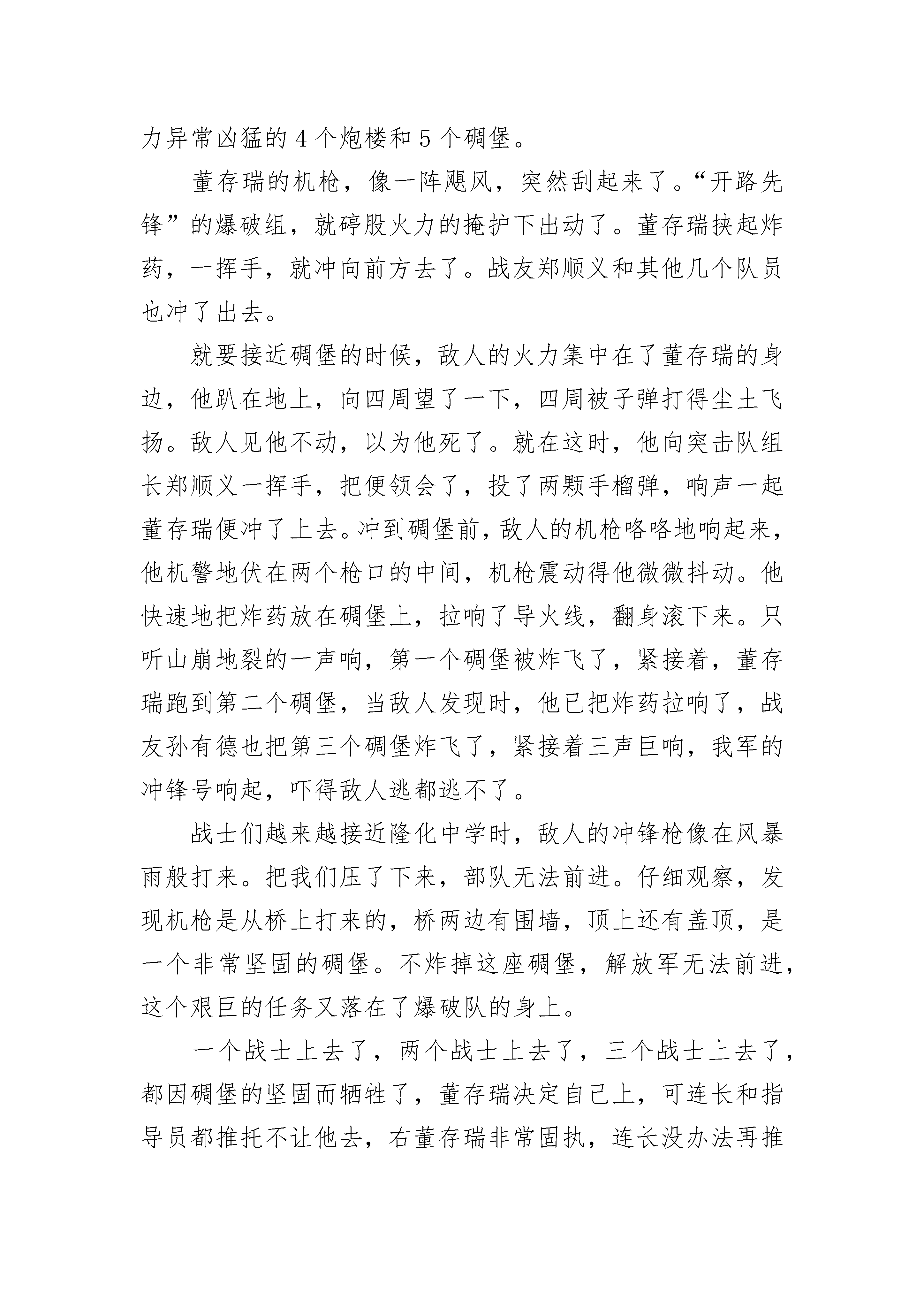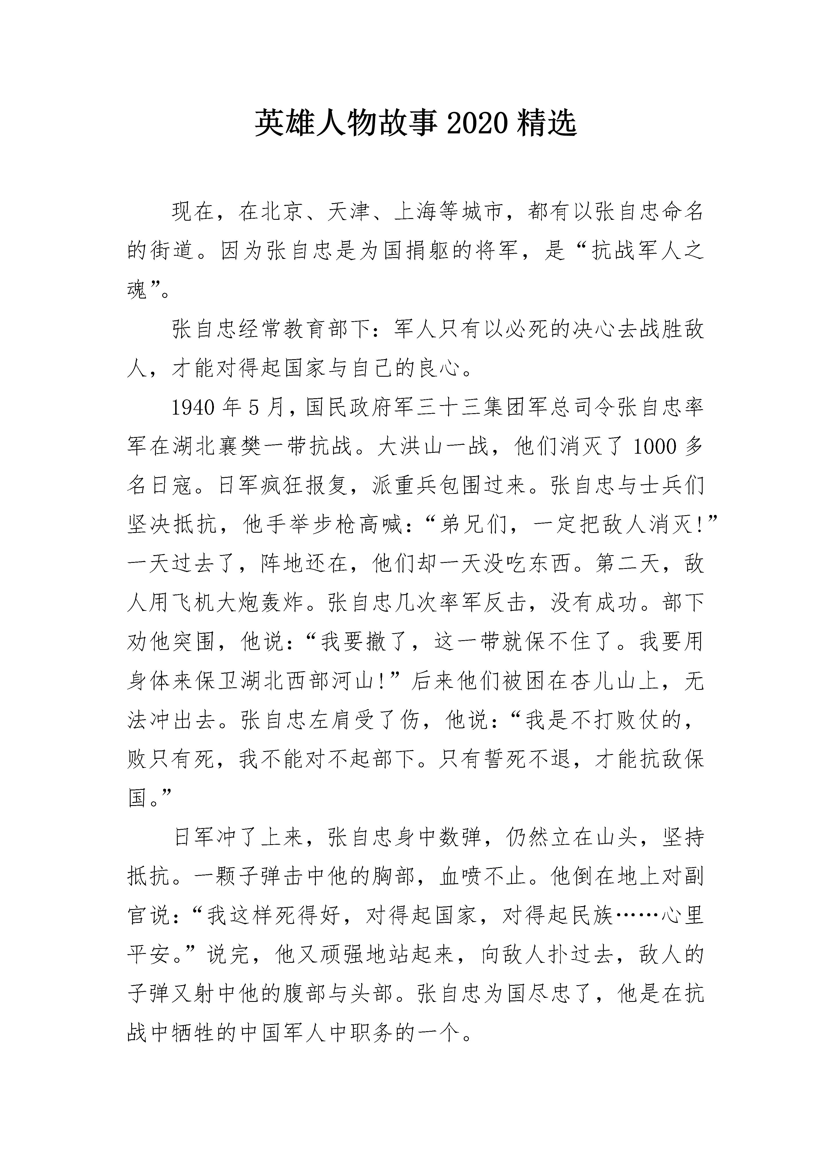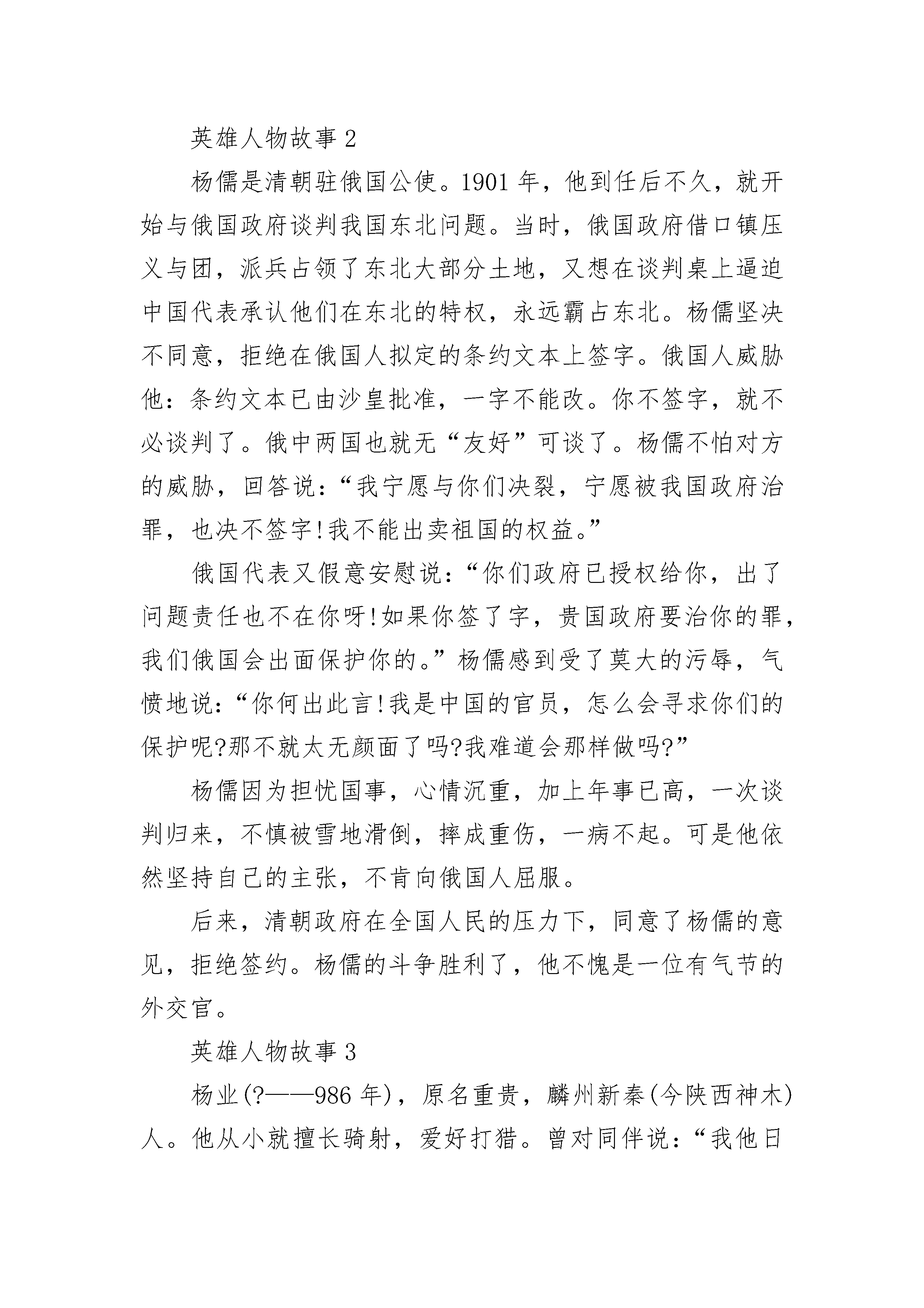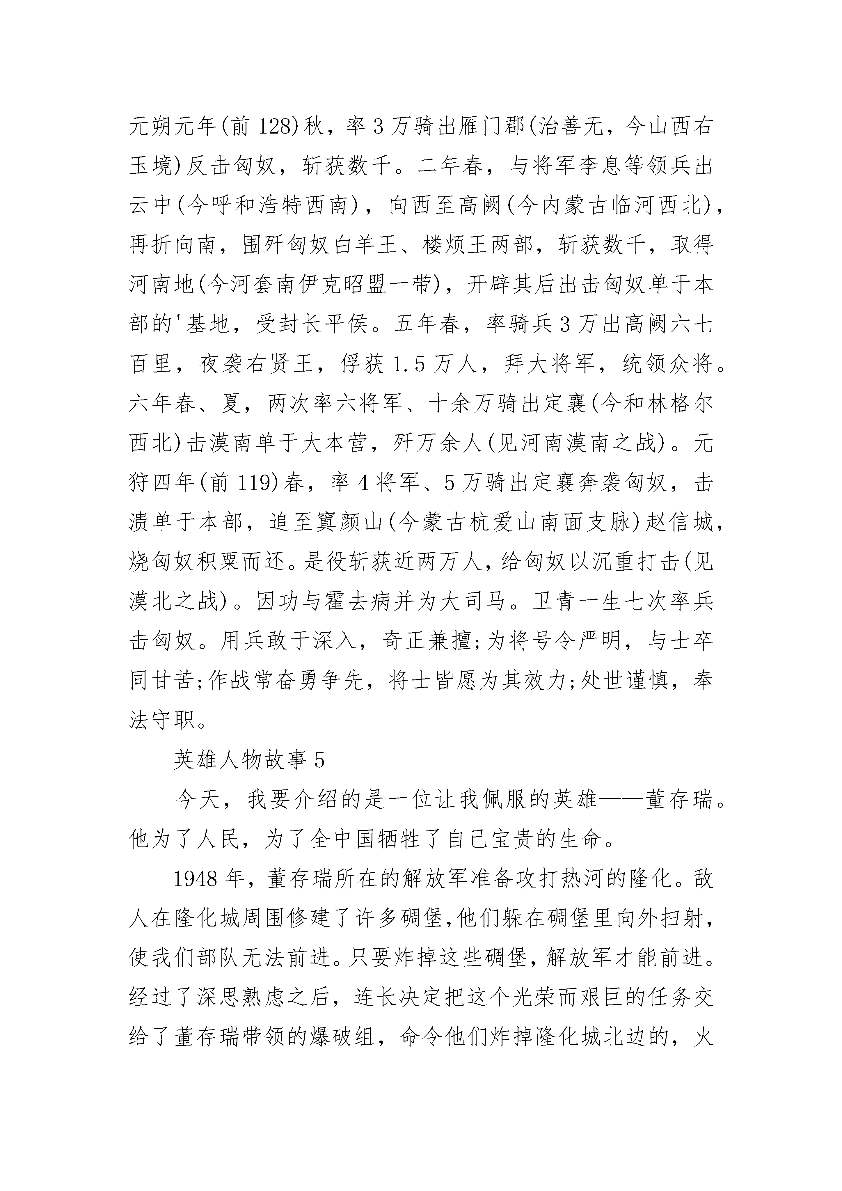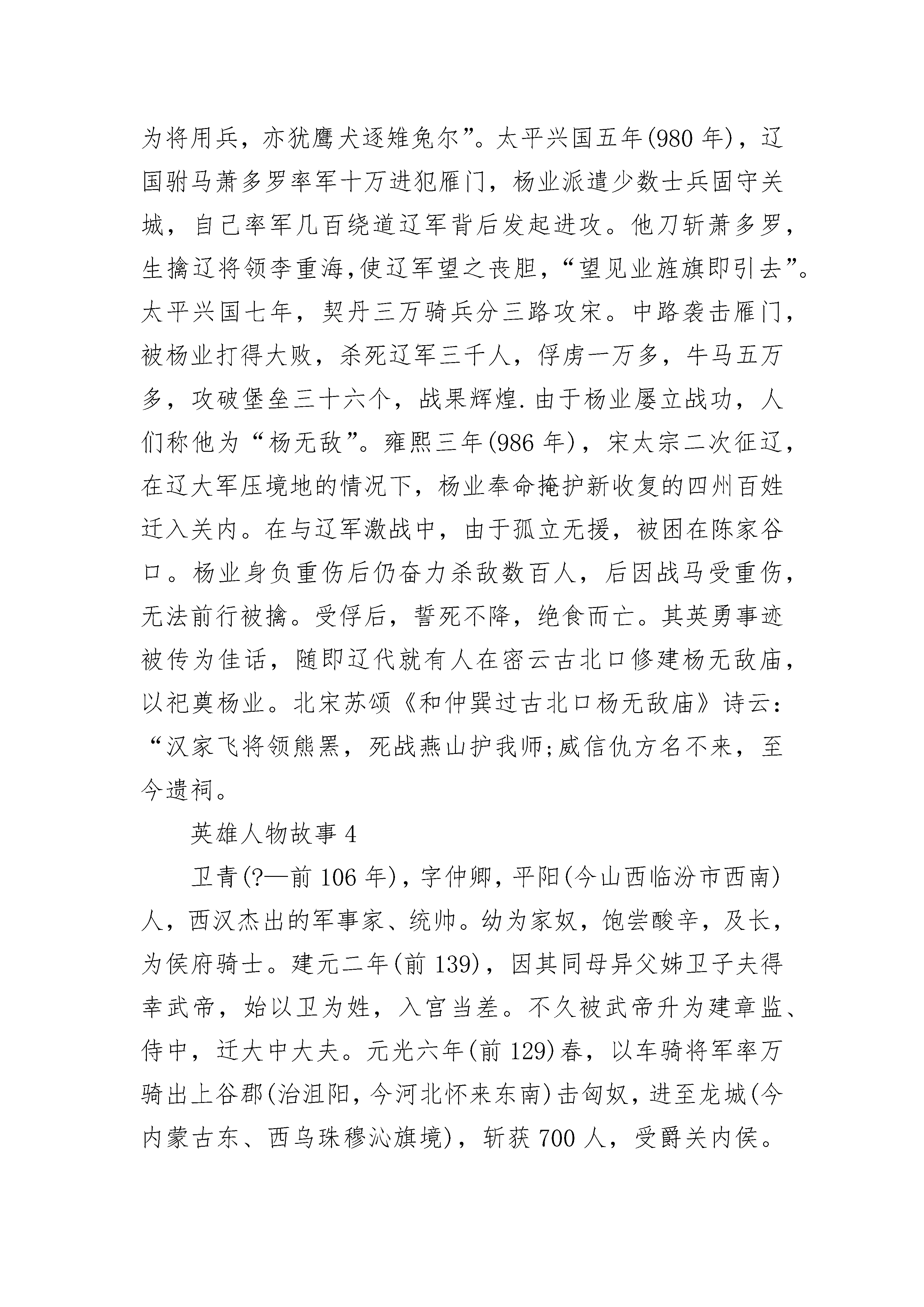 英雄人物故事2020精选现在,在北京、天津、上海等城市,都有以张自忠命名的街道。因为张自忠是为国捐躯的将军,是“抗战军人之魂”。张自忠经常教育部下:军人只有以必死的决心去战胜敌人,才能对得起国家与自己的良心。1940年5月,国民政府军三十三集团军总司令张自忠率军在湖北襄樊一带抗战。大洪山一战,他们消灭了1000多名日寇。日军疯狂报复,派重兵包围过来。张自忠与士兵们坚决抵抗,他手举步枪高喊:“弟兄们,一定把敌人消灭!”一天过去了,阵地还在,他们却一天没吃东西。第二天,敌人用飞机大炮轰炸。张自忠几次率军反击,没有成功。部下劝他突围,他说:“我要撤了,这一带就保不住了。我要用身体来保卫湖北西部河山!”后来他们被困在杏儿山上,无法冲出去。张自忠左肩受了伤,他说:“我是不打败仗的,败只有死,我不能对不起部下。只有誓死不退,才能抗敌保国。”日军冲了上来,张自忠身中数弹,仍然立在山头,坚持抵抗。一颗子弹击中他的胸部,血喷不止。他倒在地上对副官说:“我这样死得好,对得起国家,对得起民族……心里平安。”说完,他又顽强地站起来,向敌人扑过去,敌人的子弹又射中他的腹部与头部。张自忠为国尽忠了,他是在抗战中牺牲的中国军人中职务的一个。英雄人物故事2杨儒是清朝驻俄国公使。1901年,他到任后不久,就开始与俄国政府谈判我国东北问题。当时,俄国政府借口镇压义与团,派兵占领了东北大部分土地,又想在谈判桌上逼迫中国代表承认他们在东北的特权,永远霸占东北。杨儒坚决不同意,拒绝在俄国人拟定的条约文本上签字。俄国人威胁他:条约文本已由沙皇批准,一字不能改。你不签字,就不必谈判了。俄中两国也就无“友好”可谈了。杨儒不怕对方的威胁,回答说:“我宁愿与你们决裂,宁愿被我国政府治罪,也决不签字!我不能出卖祖国的权益。”俄国代表又假意安慰说:“你们政府已授权给你,出了问题责任也不在你呀!如果你签了字,贵国政府要治你的罪,我们俄国会出面保护你的。”杨儒感到受了莫大的污辱,气愤地说:“你何出此言!我是中国的官员,怎么会寻求你们的保护呢?那不就太无颜面了吗?我难道会那样做吗?”杨儒因为担忧国事,心情沉重,加上年事已高,一次谈判归来,不慎被雪地滑倒,摔成重伤,一病不起。可是他依然坚持自己的主张,不肯向俄国人屈服。后来,清朝政府在全国人民的压力下,同意了杨儒的意见,拒绝签约。杨儒的斗争胜利了,他不愧是一位有气节的外交官。英雄人物故事3杨业(?——986年),原名重贵,麟州新秦(今陕西神木)人。他从小就擅长骑射,爱好打猎。曾对同伴说:“我他日为将用兵,亦犹鹰犬逐雉兔尔”。太平兴国五年(980年),辽国驸马萧多罗率军十万进犯雁门,杨业派遣少数士兵固守关城,自己率军几百绕道辽军背后发起进攻。他刀斩萧多罗,生擒辽将领李重海,使辽军望之丧胆,“望见业旌旗即引去”。太平兴国七年,契丹三万骑兵分三路攻宋。中路袭击雁门,被杨业打得大败,杀死辽军三千人,俘虏一万多,牛马五万多,攻破堡垒三十六个,战果辉煌.由于杨业屡立战功,人们称他为“杨无敌”。雍熙三年(986年),宋太宗二次征辽,在辽大军压境地的情况下,杨业奉命掩护新收复的四州百姓迁入关内。在与辽军激战中,由于孤立无援,被困在陈家谷口。杨业身负重伤后仍奋力杀敌数百人,后因战马受重伤,无法前行被擒。受俘后,誓死不降,绝食而亡。其英勇事迹被传为佳话,随即辽代就有人在密云古北口修建杨无敌庙,以祀奠杨业。北宋苏颂《和仲巽过古北口杨无敌庙》诗云:“汉家飞将领熊罴,死战燕山护我师;威信仇方名不来,至今遗祠。英雄人物故事4卫青(?—前106年),字仲卿,平阳(今山西临汾市西南)人,西汉杰出的军事家、统帅。幼为家奴,饱尝酸辛,及长,为侯府骑士。建元二年(前139),因其同母异父姊卫子夫得幸武帝,始以卫为姓,入宫当差。不久被武帝升为建章监、侍中,迁大中大夫。元光六年(前129)春,以车骑将军率万骑出上谷郡(治沮阳,今河北怀来东南)击匈奴,进至龙城(今内蒙古东、西乌珠穆沁旗境),斩获700人,受爵关内侯。元朔元年(前128)秋,率3万骑出雁门郡(治善无,今山西右玉境)反击匈奴,斩获数千。二年春,与将军李息等领兵出云中(今呼和浩特西南),向西至高阙(今内蒙古临河西北),再折向南,围歼匈奴白羊王、楼烦王两部,斩获数千,取得河南地(今河套南伊克昭盟一带),开辟其后出击匈奴单于本部的'基地,受封长平侯。五年春,率骑兵3万出高阙六七百里,夜袭右贤王,俘获1.5万人,拜大将军,统领众将。六年春、夏,两次率六将军、十余万骑出定襄(今和林格尔西北)击漠南单于大本营,歼万余人(见河南漠南之战)。元狩四年(前119)春,率4将军、5万骑出定襄奔袭匈奴,击溃单于本部,追至窴颜山(今蒙古杭爱山南面支脉)赵信城,烧匈奴积粟而还。是役斩获近两万人,给匈奴以沉重打击(见漠北之战)。因功与霍去病并为