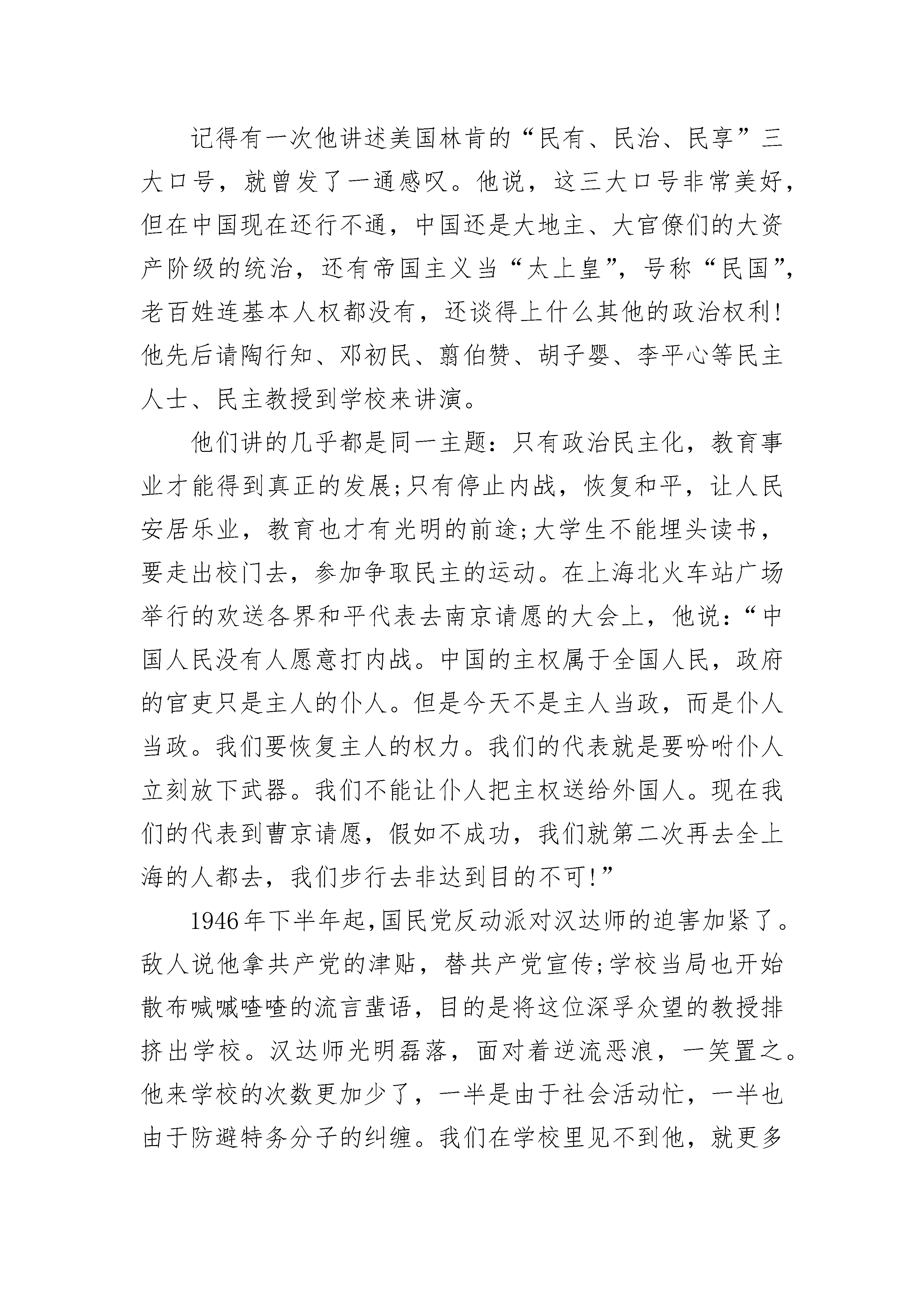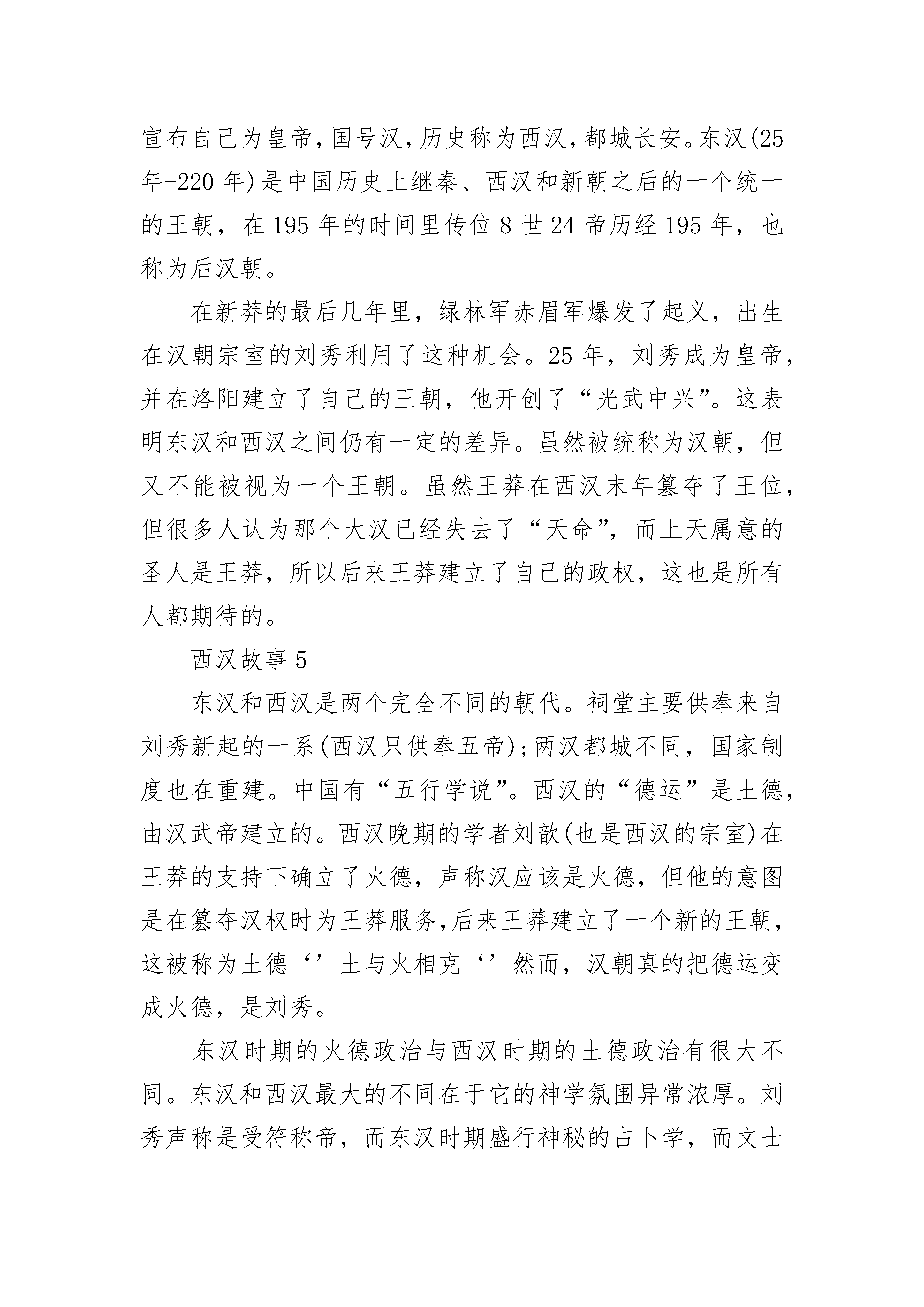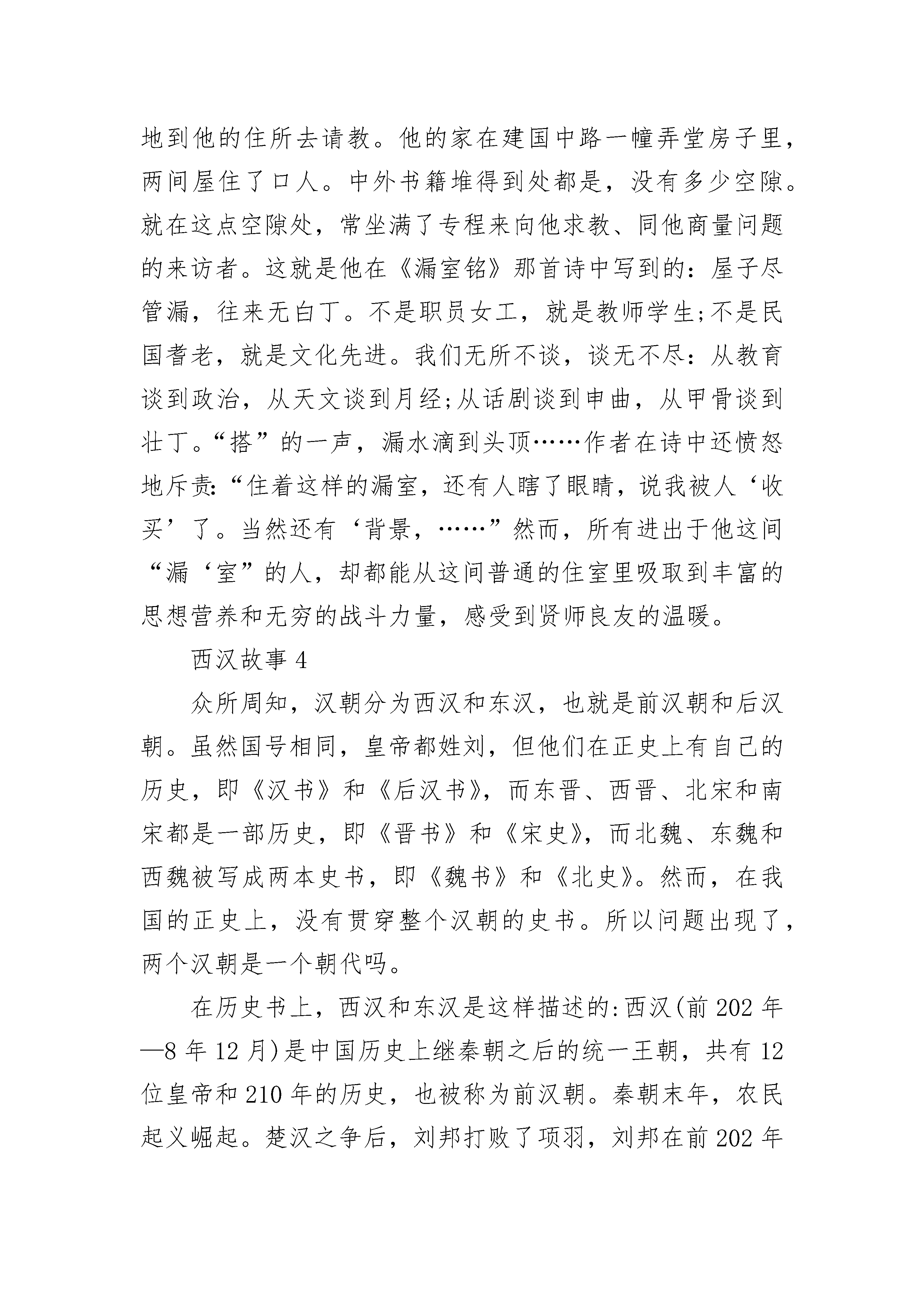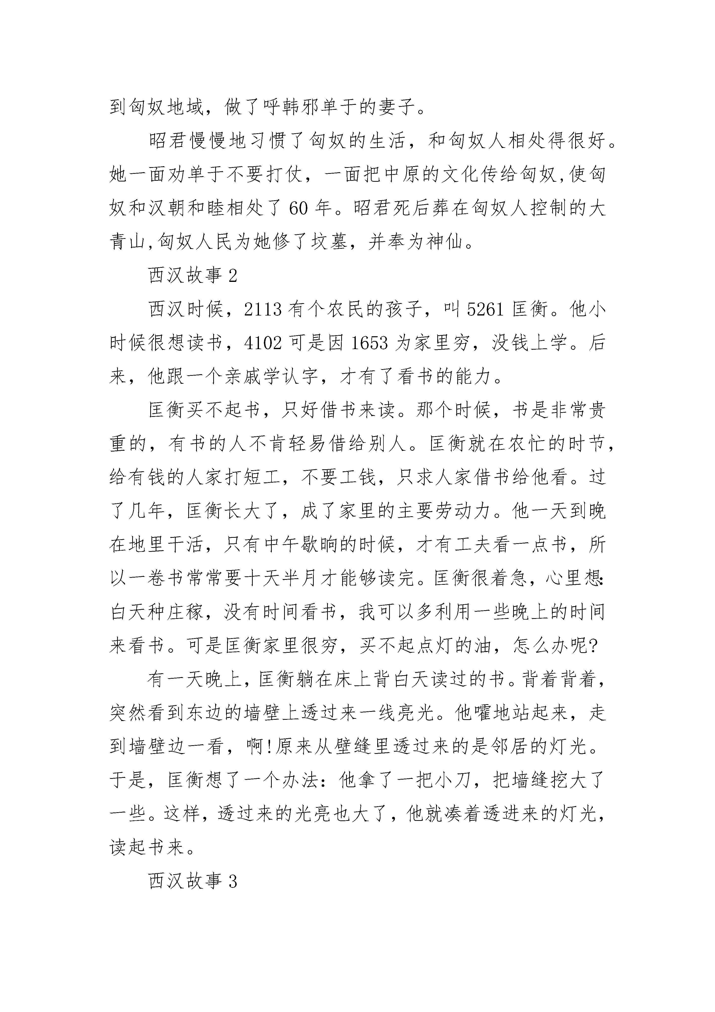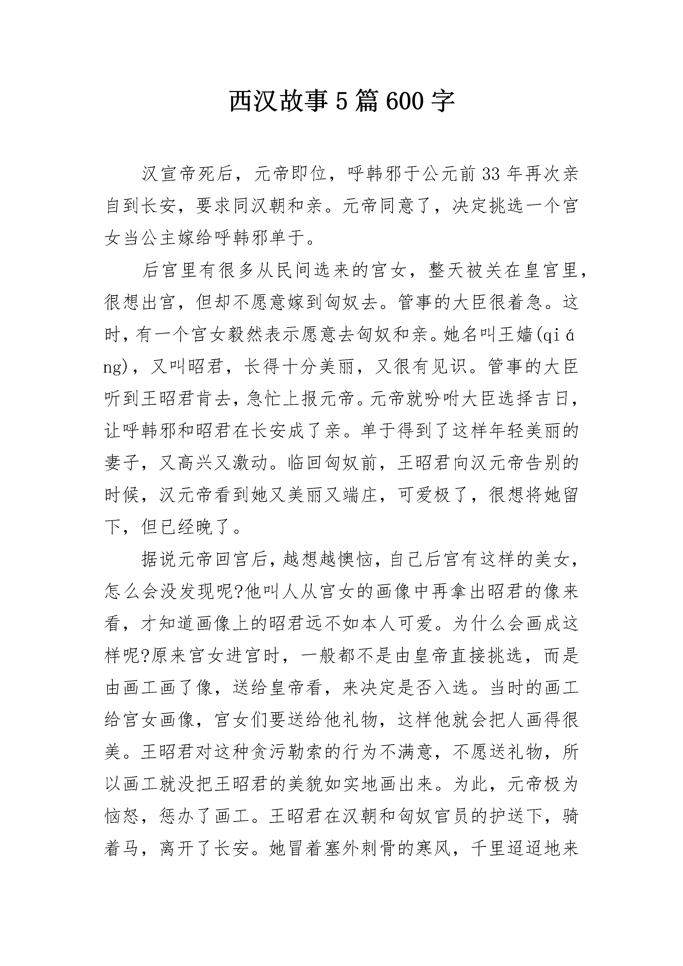 西汉故事5篇600字汉宣帝死后,元帝即位,呼韩邪于公元前33年再次亲自到长安,要求同汉朝和亲。元帝同意了,决定挑选一个宫女当公主嫁给呼韩邪单于。后宫里有很多从民间选来的宫女,整天被关在皇宫里,很想出宫,但却不愿意嫁到匈奴去。管事的大臣很着急。这时,有一个宫女毅然表示愿意去匈奴和亲。她名叫王嫱(qiáng),又叫昭君,长得十分美丽,又很有见识。管事的大臣听到王昭君肯去,急忙上报元帝。元帝就吩咐大臣选择吉日,让呼韩邪和昭君在长安成了亲。单于得到了这样年轻美丽的妻子,又高兴又激动。临回匈奴前,王昭君向汉元帝告别的时候,汉元帝看到她又美丽又端庄,可爱极了,很想将她留下,但已经晚了。据说元帝回宫后,越想越懊恼,自己后宫有这样的美女,怎么会没发现呢?他叫人从宫女的画像中再拿出昭君的像来看,才知道画像上的昭君远不如本人可爱。为什么会画成这样呢?原来宫女进宫时,一般都不是由皇帝直接挑选,而是由画工画了像,送给皇帝看,来决定是否入选。当时的画工给宫女画像,宫女们要送给他礼物,这样他就会把人画得很美。王昭君对这种贪污勒索的行为不满意,不愿送礼物,所以画工就没把王昭君的美貌如实地画出来。为此,元帝极为恼怒,惩办了画工。王昭君在汉朝和匈奴官员的护送下,骑着马,离开了长安。她冒着塞外刺骨的寒风,千里迢迢地来到匈奴地域,做了呼韩邪单于的妻子。昭君慢慢地习惯了匈奴的生活,和匈奴人相处得很好。她一面劝单于不要打仗,一面把中原的文化传给匈奴,使匈奴和汉朝和睦相处了60年。昭君死后葬在匈奴人控制的大青山,匈奴人民为她修了坟墓,并奉为神仙。西汉故事2西汉时候,2113有个农民的孩子,叫5261匡衡。他小时候很想读书,4102可是因1653为家里穷,没钱上学。后来,他跟一个亲戚学认字,才有了看书的能力。匡衡买不起书,只好借书来读。那个时候,书是非常贵重的,有书的人不肯轻易借给别人。匡衡就在农忙的时节,给有钱的人家打短工,不要工钱,只求人家借书给他看。过了几年,匡衡长大了,成了家里的主要劳动力。他一天到晚在地里干活,只有中午歇晌的时候,才有工夫看一点书,所以一卷书常常要十天半月才能够读完。匡衡很着急,心里想:白天种庄稼,没有时间看书,我可以多利用一些晚上的时间来看书。可是匡衡家里很穷,买不起点灯的油,怎么办呢?有一天晚上,匡衡躺在床上背白天读过的书。背着背着,突然看到东边的墙壁上透过来一线亮光。他嚯地站起来,走到墙壁边一看,啊!原来从壁缝里透过来的是邻居的灯光。于是,匡衡想了一个办法:他拿了一把小刀,把墙缝挖大了一些。这样,透过来的光亮也大了,他就凑着透进来的灯光,读起书来。西汉故事3记得有一次他讲述美国林肯的“民有、民治、民享”三大口号,就曾发了一通感叹。他说,这三大口号非常美好,但在中国现在还行不通,中国还是大地主、大官僚们的大资产阶级的统治,还有帝国主义当“太上皇”,号称“民国”,老百姓连基本人权都没有,还谈得上什么其他的政治权利!他先后请陶行知、邓初民、翦伯赞、胡子婴、李平心等民主人士、民主教授到学校来讲演。他们讲的几乎都是同一主题:只有政治民主化,教育事业才能得到真正的发展;只有停止内战,恢复和平,让人民安居乐业,教育也才有光明的前途;大学生不能埋头读书,要走出校门去,参加争取民主的运动。在上海北火车站广场举行的欢送各界和平代表去南京请愿的大会上,他说:“中国人民没有人愿意打内战。中国的主权属于全国人民,政府的官吏只是主人的仆人。但是今天不是主人当政,而是仆人当政。我们要恢复主人的权力。我们的代表就是要吩咐仆人立刻放下武器。我们不能让仆人把主权送给外国人。现在我们的代表到曹京请愿,假如不成功,我们就第二次再去全上海的人都去,我们步行去非达到目的不可!”1946年下半年起,国民党反动派对汉达师的迫害加紧了。敌人说他拿共产党的津贴,替共产党宣传;学校当局也开始散布喊嘁喳喳的流言蜚语,目的是将这位深孚众望的教授排挤出学校。汉达师光明磊落,面对着逆流恶浪,一笑置之。他来学校的次数更加少了,一半是由于社会活动忙,一半也由于防避特务分子的纠缠。我们在学校里见不到他,就更多地到他的住所去请教。他的家在建国中路一幢弄堂房子里,两间屋住了口人。中外书籍堆得到处都是,没有多少空隙。就在这点空隙处,常坐满了专程来向他求教、同他商量问题的来访者。这就是他在《漏室铭》那首诗中写到的:屋子尽管漏,往来无白丁。不是职员女工,就是教师学生;不是民国耆老,就是文化先进。我们无所不谈,谈无不尽:从教育谈到政治,从天文谈到月经;从话剧谈到申曲,从甲骨谈到壮丁。“搭”的一声,漏水滴到头顶……作者在诗中还愤怒地斥责:“住着这样的漏室,还有人瞎了眼睛,说我被人‘收买’了。当然还有‘背景,……”然而,所有进出于他这间“漏‘室”的人,却都能从这间普通的住室里吸取到丰富的思想营养和无穷的战斗力量,感受到