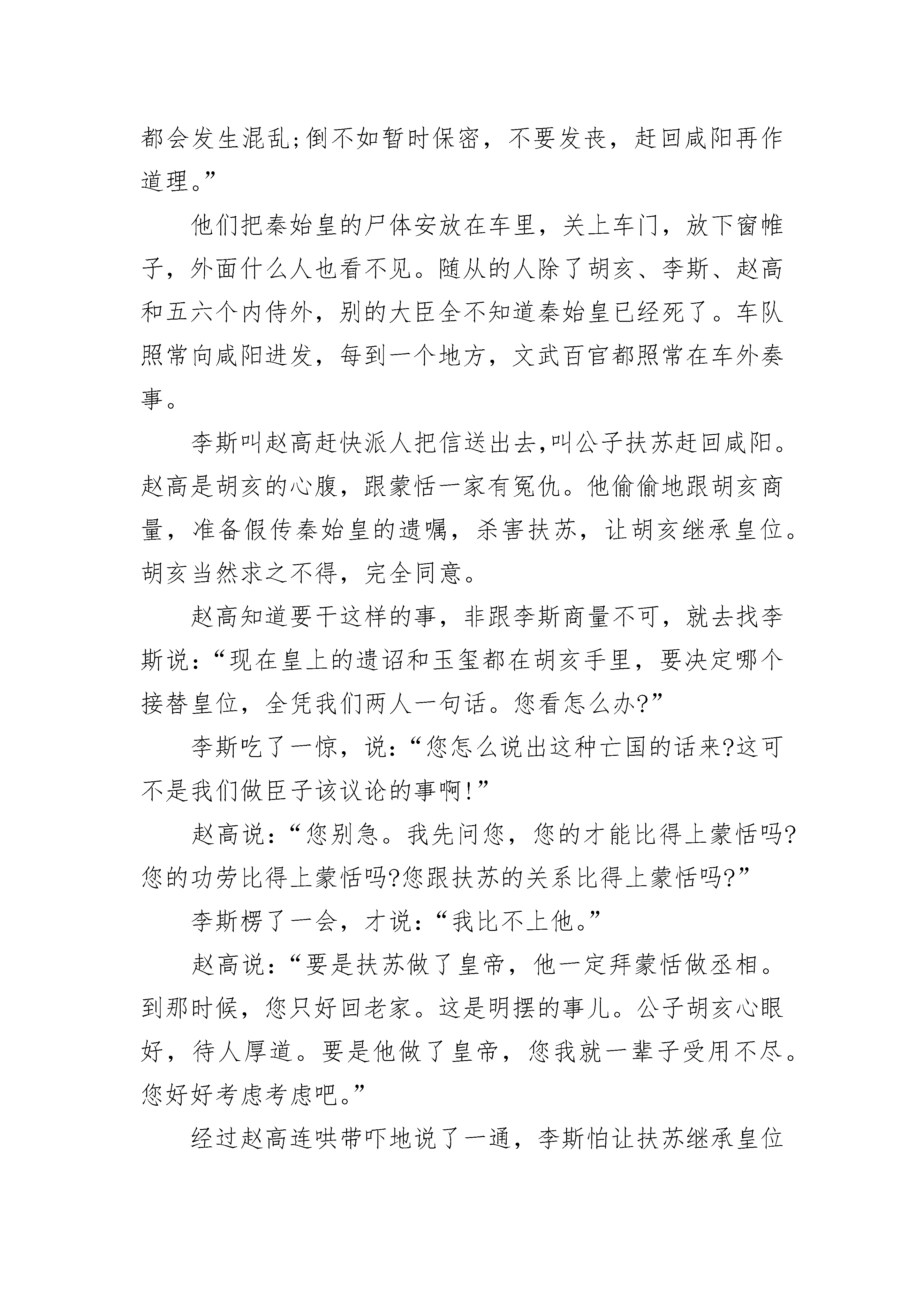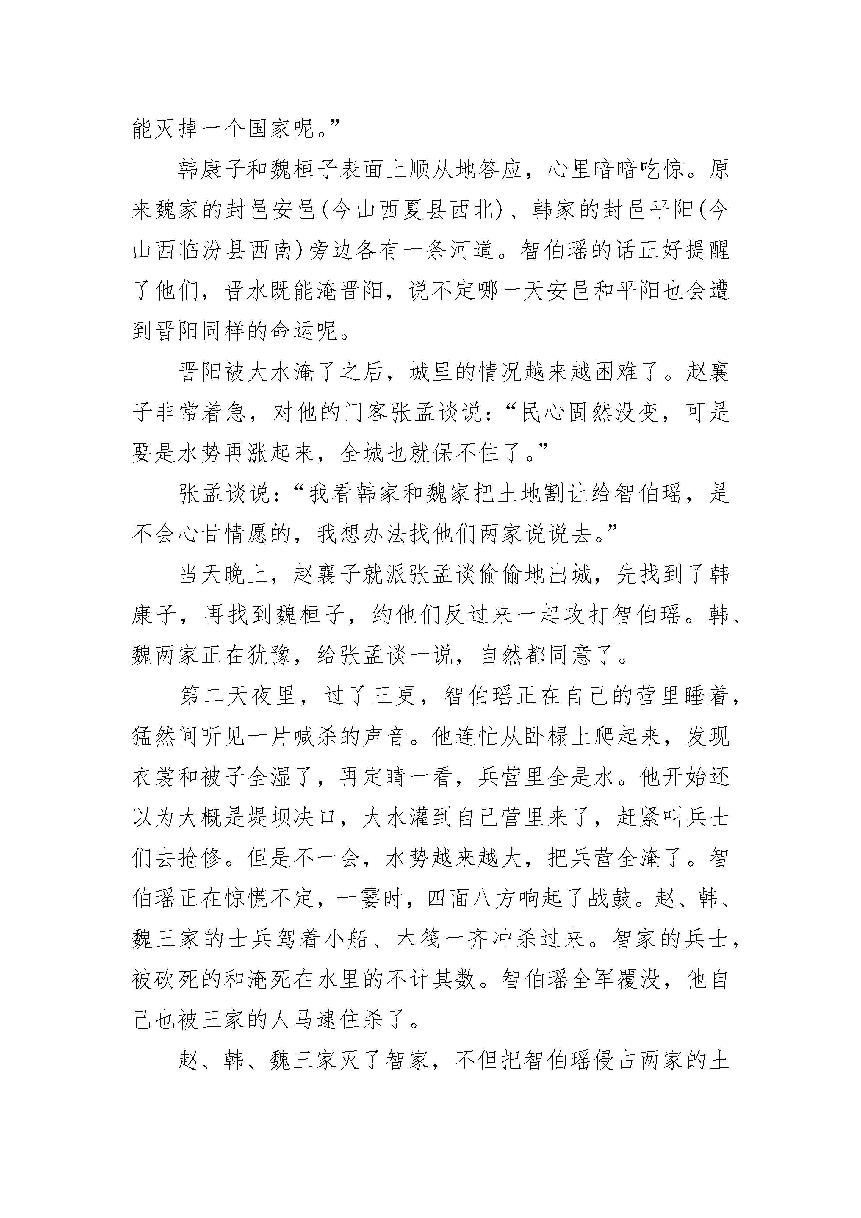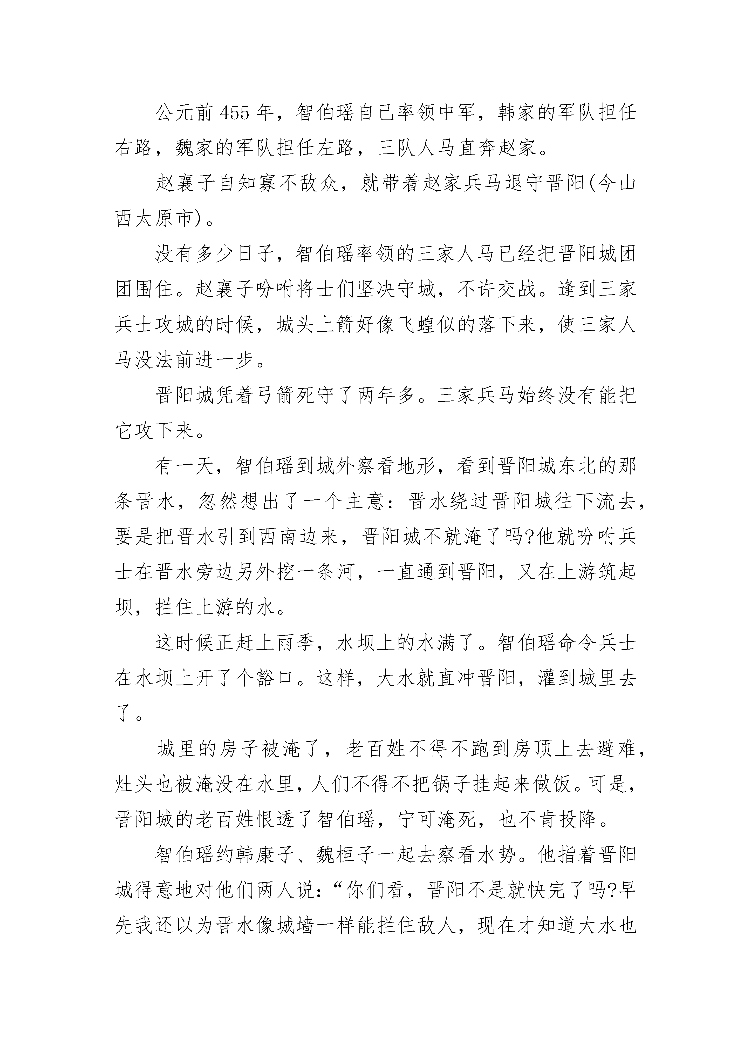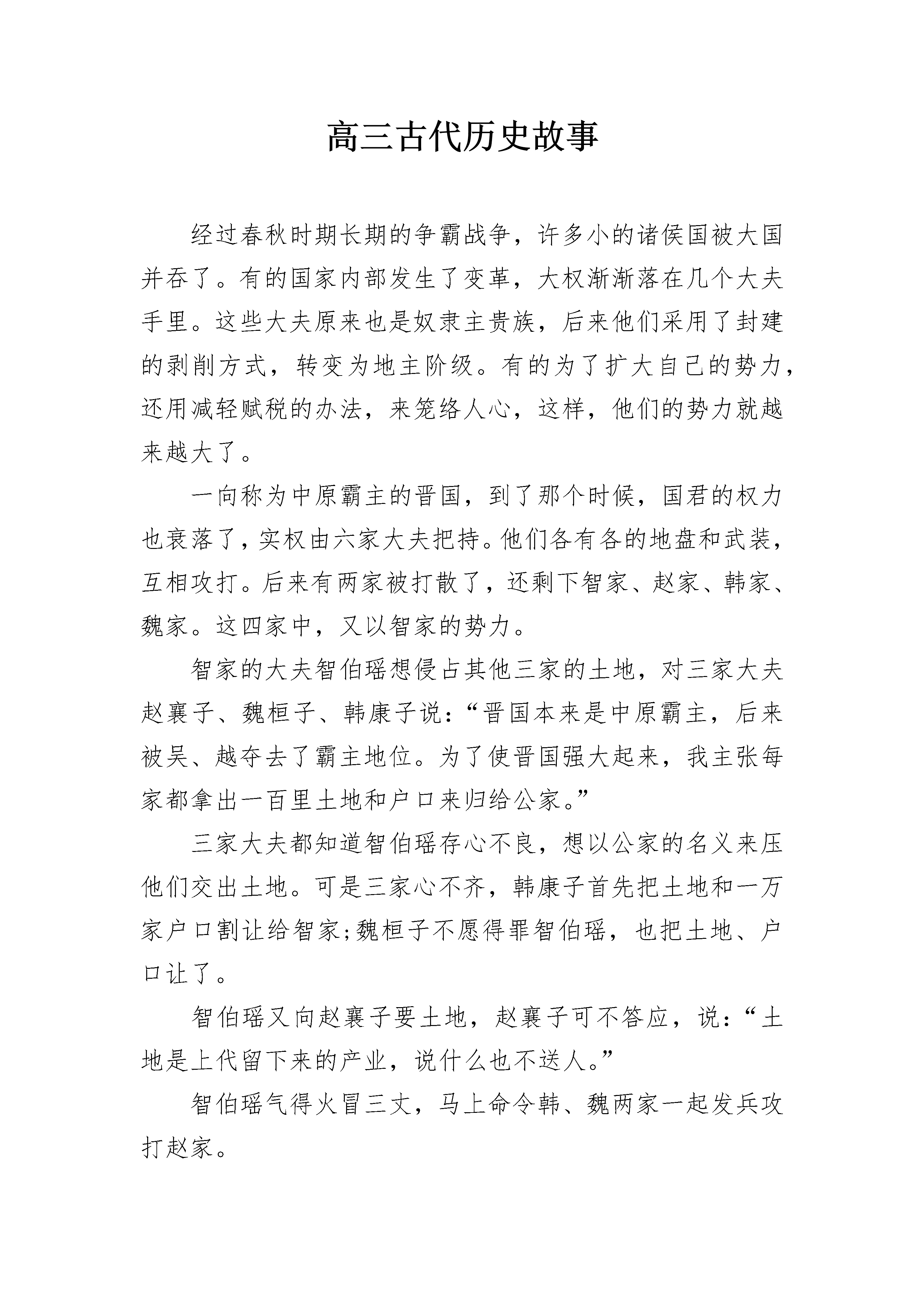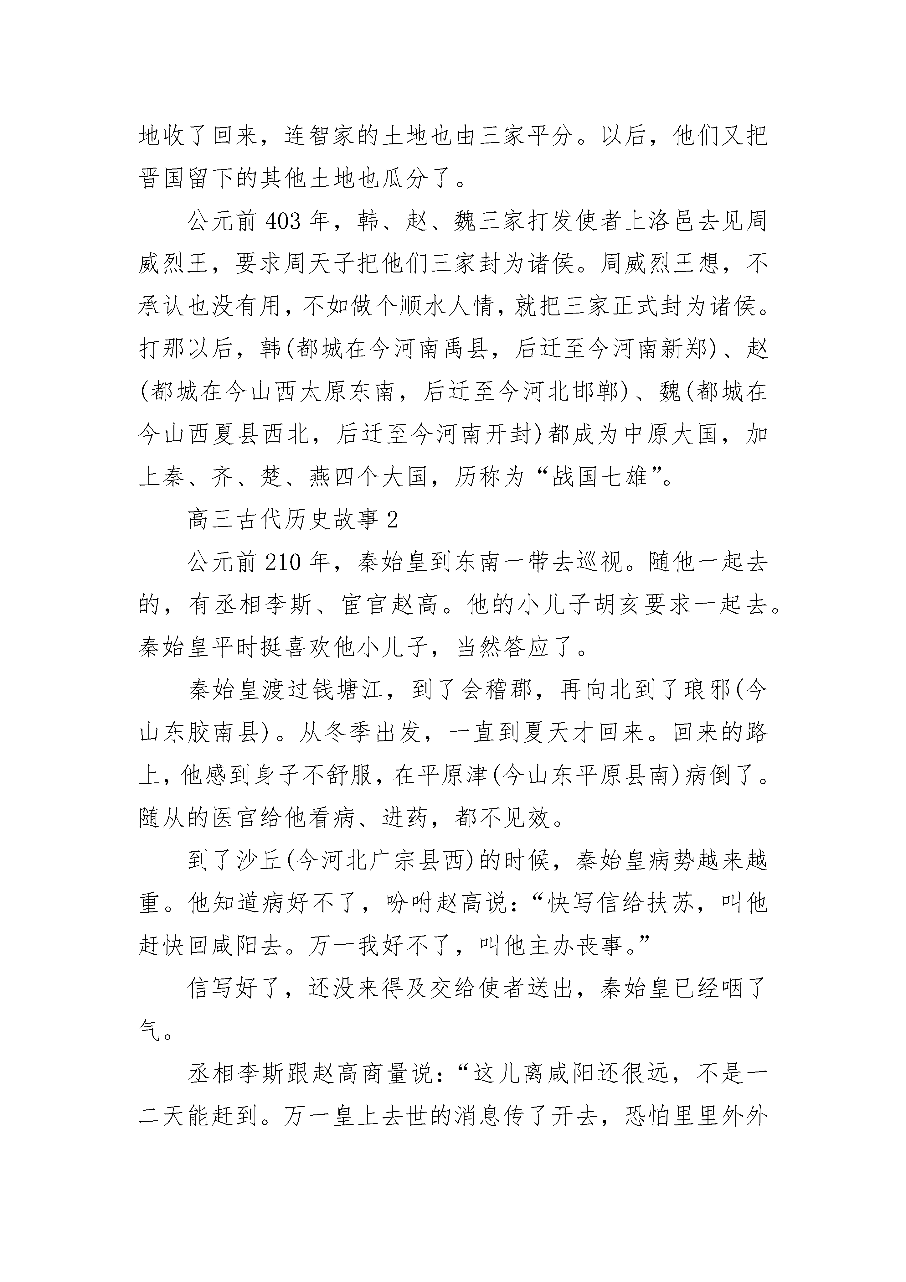 高三古代历史故事经过春秋时期长期的争霸战争,许多小的诸侯国被大国并吞了。有的国家内部发生了变革,大权渐渐落在几个大夫手里。这些大夫原来也是奴隶主贵族,后来他们采用了封建的剥削方式,转变为地主阶级。有的为了扩大自己的势力,还用减轻赋税的办法,来笼络人心,这样,他们的势力就越来越大了。一向称为中原霸主的晋国,到了那个时候,国君的权力也衰落了,实权由六家大夫把持。他们各有各的地盘和武装,互相攻打。后来有两家被打散了,还剩下智家、赵家、韩家、魏家。这四家中,又以智家的势力。智家的大夫智伯瑶想侵占其他三家的土地,对三家大夫赵襄子、魏桓子、韩康子说:“晋国本来是中原霸主,后来被吴、越夺去了霸主地位。为了使晋国强大起来,我主张每家都拿出一百里土地和户口来归给公家。”三家大夫都知道智伯瑶存心不良,想以公家的名义来压他们交出土地。可是三家心不齐,韩康子首先把土地和一万家户口割让给智家;魏桓子不愿得罪智伯瑶,也把土地、户口让了。智伯瑶又向赵襄子要土地,赵襄子可不答应,说:“土地是上代留下来的产业,说什么也不送人。”智伯瑶气得火冒三丈,马上命令韩、魏两家一起发兵攻打赵家。公元前455年,智伯瑶自己率领中军,韩家的军队担任右路,魏家的军队担任左路,三队人马直奔赵家。赵襄子自知寡不敌众,就带着赵家兵马退守晋阳(今山西太原市)。没有多少日子,智伯瑶率领的三家人马已经把晋阳城团团围住。赵襄子吩咐将士们坚决守城,不许交战。逢到三家兵士攻城的时候,城头上箭好像飞蝗似的落下来,使三家人马没法前进一步。晋阳城凭着弓箭死守了两年多。三家兵马始终没有能把它攻下来。有一天,智伯瑶到城外察看地形,看到晋阳城东北的那条晋水,忽然想出了一个主意:晋水绕过晋阳城往下流去,要是把晋水引到西南边来,晋阳城不就淹了吗?他就吩咐兵士在晋水旁边另外挖一条河,一直通到晋阳,又在上游筑起坝,拦住上游的水。这时候正赶上雨季,水坝上的水满了。智伯瑶命令兵士在水坝上开了个豁口。这样,大水就直冲晋阳,灌到城里去了。城里的房子被淹了,老百姓不得不跑到房顶上去避难,灶头也被淹没在水里,人们不得不把锅子挂起来做饭。可是,晋阳城的老百姓恨透了智伯瑶,宁可淹死,也不肯投降。智伯瑶约韩康子、魏桓子一起去察看水势。他指着晋阳城得意地对他们两人说:“你们看,晋阳不是就快完了吗?早先我还以为晋水像城墙一样能拦住敌人,现在才知道大水也能灭掉一个国家呢。”韩康子和魏桓子表面上顺从地答应,心里暗暗吃惊。原来魏家的封邑安邑(今山西夏县西北)、韩家的封邑平阳(今山西临汾县西南)旁边各有一条河道。智伯瑶的话正好提醒了他们,晋水既能淹晋阳,说不定哪一天安邑和平阳也会遭到晋阳同样的命运呢。晋阳被大水淹了之后,城里的情况越来越困难了。赵襄子非常着急,对他的门客张孟谈说:“民心固然没变,可是要是水势再涨起来,全城也就保不住了。”张孟谈说:“我看韩家和魏家把土地割让给智伯瑶,是不会心甘情愿的,我想办法找他们两家说说去。”当天晚上,赵襄子就派张孟谈偷偷地出城,先找到了韩康子,再找到魏桓子,约他们反过来一起攻打智伯瑶。韩、魏两家正在犹豫,给张孟谈一说,自然都同意了。第二天夜里,过了三更,智伯瑶正在自己的营里睡着,猛然间听见一片喊杀的声音。他连忙从卧榻上爬起来,发现衣裳和被子全湿了,再定睛一看,兵营里全是水。他开始还以为大概是堤坝决口,大水灌到自己营里来了,赶紧叫兵士们去抢修。但是不一会,水势越来越大,把兵营全淹了。智伯瑶正在惊慌不定,一霎时,四面八方响起了战鼓。赵、韩、魏三家的士兵驾着小船、木筏一齐冲杀过来。智家的兵士,被砍死的和淹死在水里的不计其数。智伯瑶全军覆没,他自己也被三家的人马逮住杀了。赵、韩、魏三家灭了智家,不但把智伯瑶侵占两家的土地收了回来,连智家的土地也由三家平分。以后,他们又把晋国留下的其他土地也瓜分了。公元前403年,韩、赵、魏三家打发使者上洛邑去见周威烈王,要求周天子把他们三家封为诸侯。周威烈王想,不承认也没有用,不如做个顺水人情,就把三家正式封为诸侯。打那以后,韩(都城在今河南禹县,后迁至今河南新郑)、赵(都城在今山西太原东南,后迁至今河北邯郸)、魏(都城在今山西夏县西北,后迁至今河南开封)都成为中原大国,加上秦、齐、楚、燕四个大国,历称为“战国七雄”。高三古代历史故事2公元前210年,秦始皇到东南一带去巡视。随他一起去的,有丞相李斯、宦官赵高。他的小儿子胡亥要求一起去。秦始皇平时挺喜欢他小儿子,当然答应了。秦始皇渡过钱塘江,到了会稽郡,再向北到了琅邪(今山东胶南县)。从冬季出发,一直到夏天才回来。回来的路上,他感到身子不舒服,在平原津(今山东平原县南)病倒了。随从的医官给他看病、进药,都不见效。到了沙丘(今河北广宗县西)的时候,秦始皇病势越来越重。他知道病好不了,吩咐赵高说:“快写信给扶苏,叫他赶快回咸阳去。万一