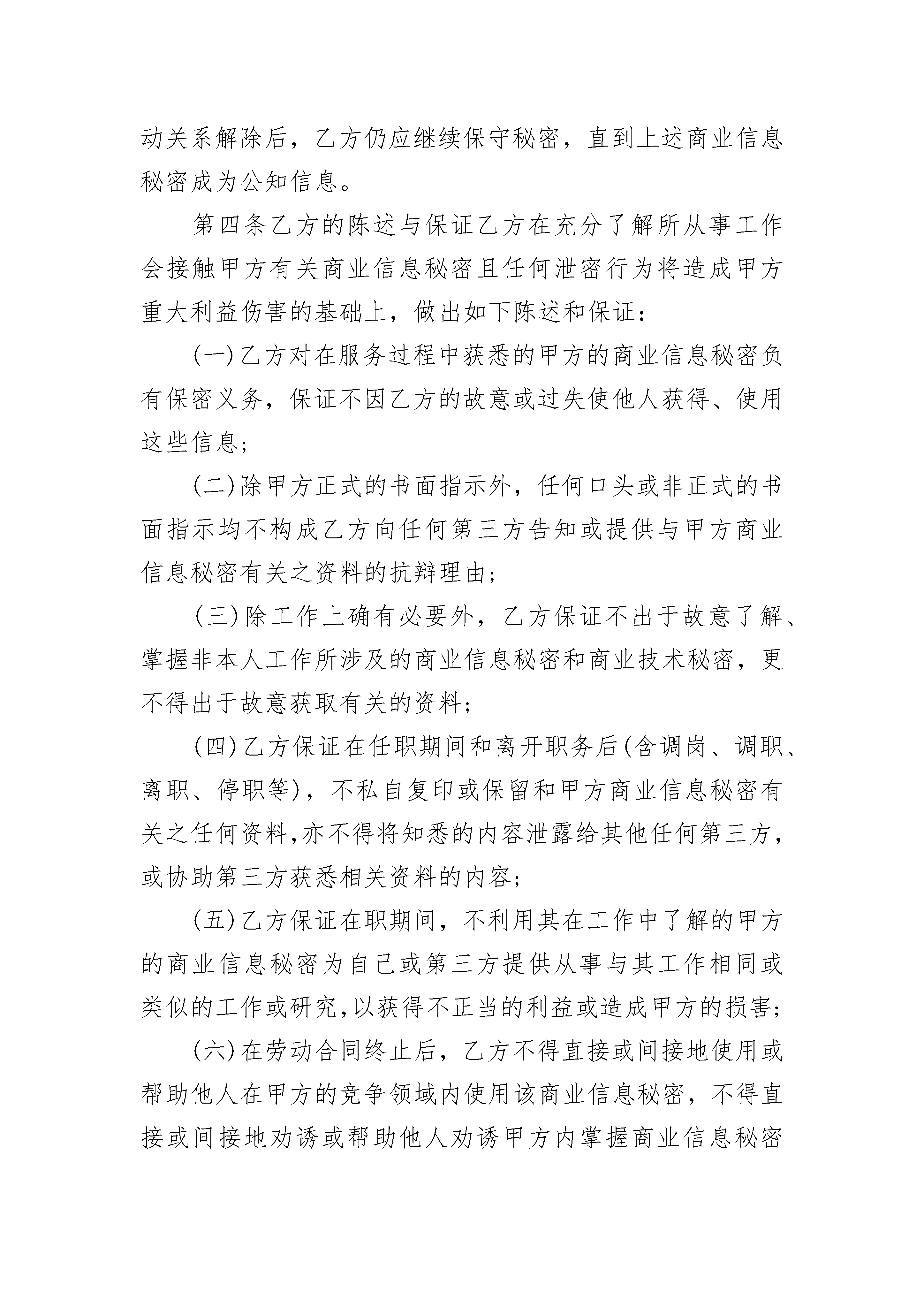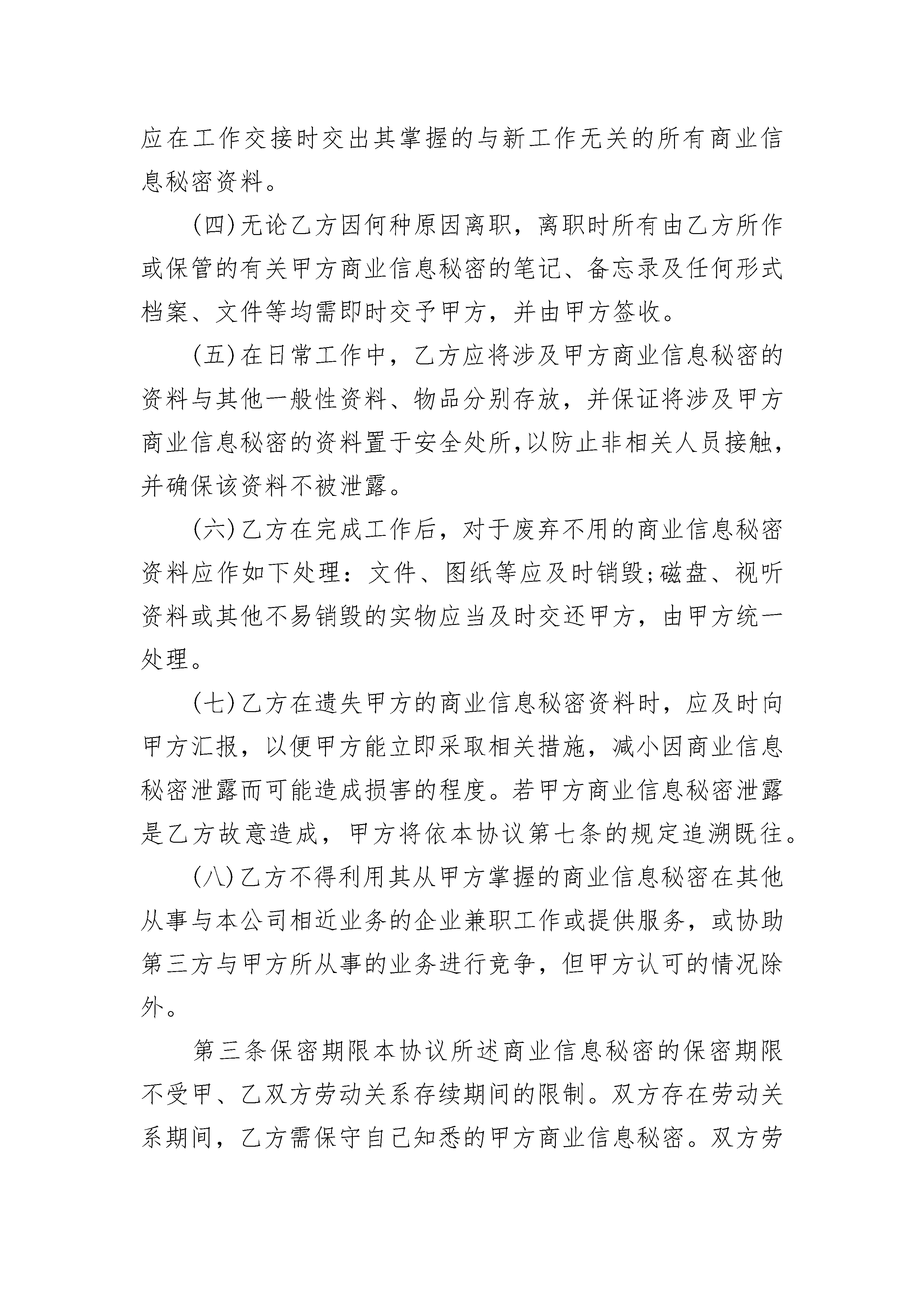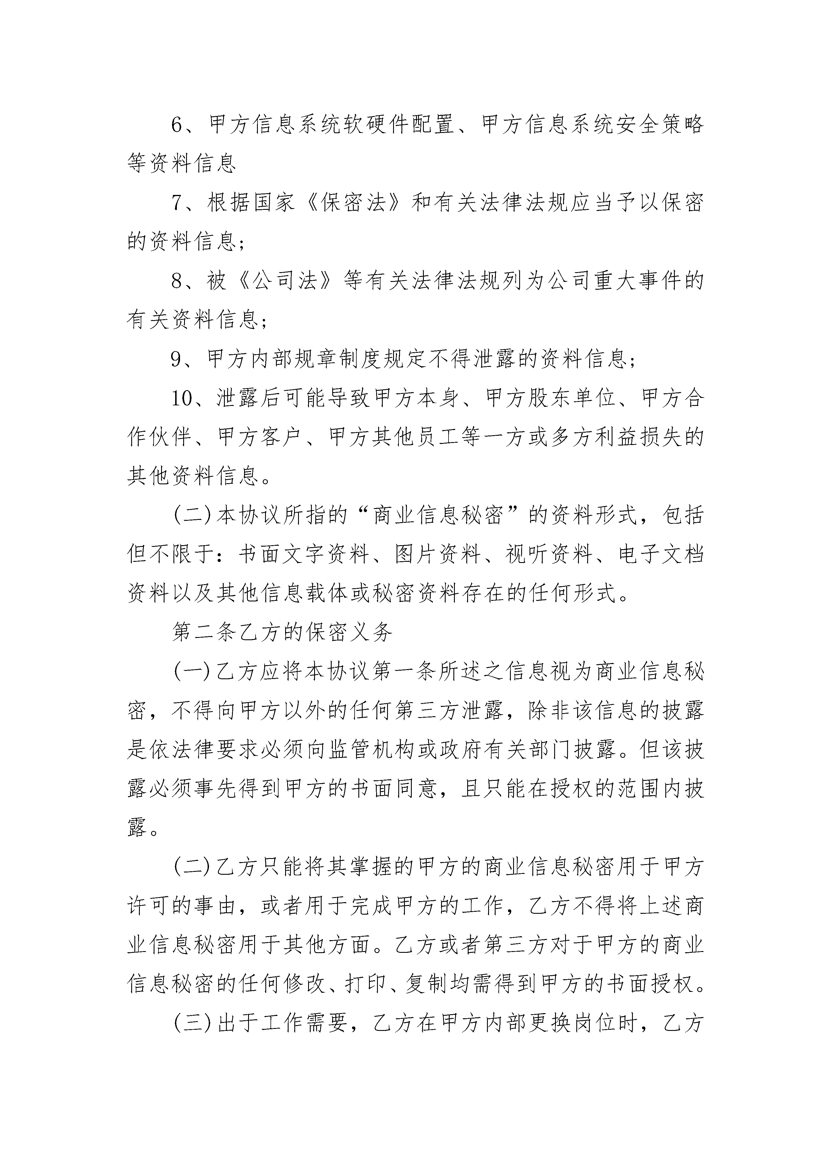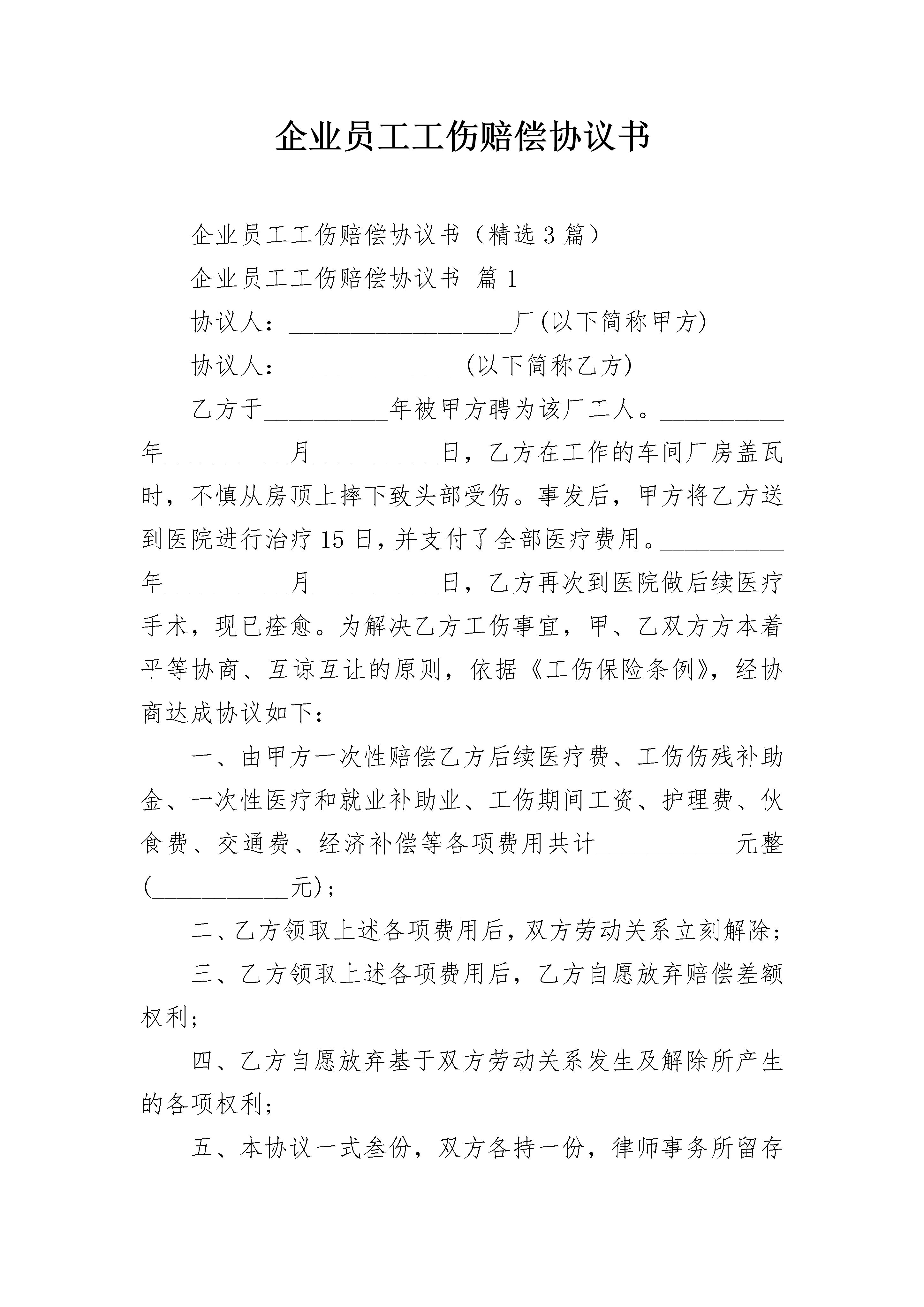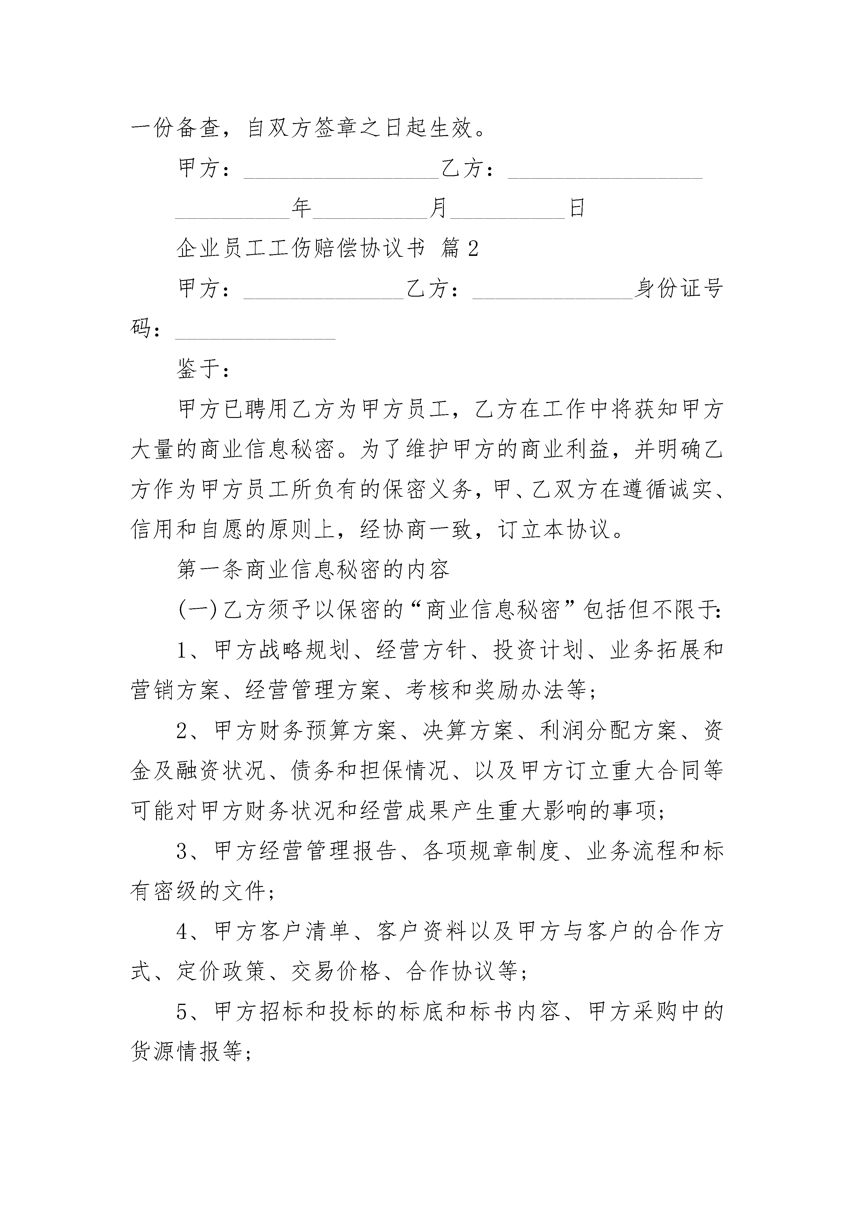 企业员工工伤赔偿协议书企业员工工伤赔偿协议书(精选3篇)企业员工工伤赔偿协议书篇1协议人:__________________厂(以下简称甲方)协议人:______________(以下简称乙方)乙方于__________年被甲方聘为该厂工人。__________年__________月__________日,乙方在工作的车间厂房盖瓦时,不慎从房顶上摔下致头部受伤。事发后,甲方将乙方送到医院进行治疗15日,并支付了全部医疗费用。__________年__________月__________日,乙方再次到医院做后续医疗手术,现已痊愈。为解决乙方工伤事宜,甲、乙双方方本着平等协商、互谅互让的原则,依据《工伤保险条例》,经协商达成协议如下:一、由甲方一次性赔偿乙方后续医疗费、工伤伤残补助金、一次性医疗和就业补助业、工伤期间工资、护理费、伙食费、交通费、经济补偿等各项费用共计___________元整(___________元);二、乙方领取上述各项费用后,双方劳动关系立刻解除;三、乙方领取上述各项费用后,乙方自愿放弃赔偿差额权利;四、乙方自愿放弃基于双方劳动关系发生及解除所产生的各项权利;五、本协议一式叁份,双方各持一份,律师事务所留存一份备查,自双方签章之日起生效。甲方:_________________乙方:___________________________年__________月__________日企业员工工伤赔偿协议书篇2甲方:______________乙方:______________身份证号码:______________鉴于:甲方已聘用乙方为甲方员工,乙方在工作中将获知甲方大量的商业信息秘密。为了维护甲方的商业利益,并明确乙方作为甲方员工所负有的保密义务,甲、乙双方在遵循诚实、信用和自愿的原则上,经协商一致,订立本协议。第一条商业信息秘密的内容(一)乙方须予以保密的“商业信息秘密”包括但不限于:1、甲方战略规划、经营方针、投资计划、业务拓展和营销方案、经营管理方案、考核和奖励办法等;2、甲方财务预算方案、决算方案、利润分配方案、资金及融资状况、债务和担保情况、以及甲方订立重大合同等可能对甲方财务状况和经营成果产生重大影响的事项;3、甲方经营管理报告、各项规章制度、业务流程和标有密级的文件;4、甲方客户清单、客户资料以及甲方与客户的合作方式、定价政策、交易价格、合作协议等;5、甲方招标和投标的标底和标书内容、甲方采购中的货源情报等;6、甲方信息系统软硬件配置、甲方信息系统安全策略等资料信息7、根据国家《保密法》和有关法律法规应当予以保密的资料信息;8、被《公司法》等有关法律法规列为公司重大事件的有关资料信息;9、甲方内部规章制度规定不得泄露的资料信息;10、泄露后可能导致甲方本身、甲方股东单位、甲方合作伙伴、甲方客户、甲方其他员工等一方或多方利益损失的其他资料信息。(二)本协议所指的“商业信息秘密”的资料形式,包括但不限于:书面文字资料、图片资料、视听资料、电子文档资料以及其他信息载体或秘密资料存在的任何形式。第二条乙方的保密义务(一)乙方应将本协议第一条所述之信息视为商业信息秘密,不得向甲方以外的任何第三方泄露,除非该信息的披露是依法律要求必须向监管机构或政府有关部门披露。但该披露必须事先得到甲方的书面同意,且只能在授权的范围内披露。(二)乙方只能将其掌握的甲方的商业信息秘密用于甲方许可的事由,或者用于完成甲方的工作,乙方不得将上述商业信息秘密用于其他方面。乙方或者第三方对于甲方的商业信息秘密的任何修改、打印、复制均需得到甲方的书面授权。(三)出于工作需要,乙方在甲方内部更换岗位时,乙方应在工作交接时交出其掌握的与新工作无关的所有商业信息秘密资料。(四)无论乙方因何种原因离职,离职时所有由乙方所作或保管的有关甲方商业信息秘密的笔记、备忘录及任何形式档案、文件等均需即时交予甲方,并由甲方签收。(五)在日常工作中,乙方应将涉及甲方商业信息秘密的资料与其他一般性资料、物品分别存放,并保证将涉及甲方商业信息秘密的资料置于安全处所,以防止非相关人员接触,并确保该资料不被泄露。(六)乙方在完成工作后,对于废弃不用的商业信息秘密资料应作如下处理:文件、图纸等应及时销毁;磁盘、视听资料或其他不易销毁的实物应当及时交还甲方,由甲方统一处理。(七)乙方在遗失甲方的商业信息秘密资料时,应及时向甲方汇报,以便甲方能立即采取相关措施,减小因商业信息秘密泄露而可能造成损害的程度。若甲方商业信息秘密泄露是乙方故意造成,甲方将依本协议第七条的规定追溯既往。(八)乙方不得利用其从甲方掌握的商业信息秘密在其他从事与本公司相近业务的企业兼职工作或提供服务,或协助第三方与甲方所从事的业务进行竞争,但甲方认可的情况除外。第三条保密期限本协议所述商