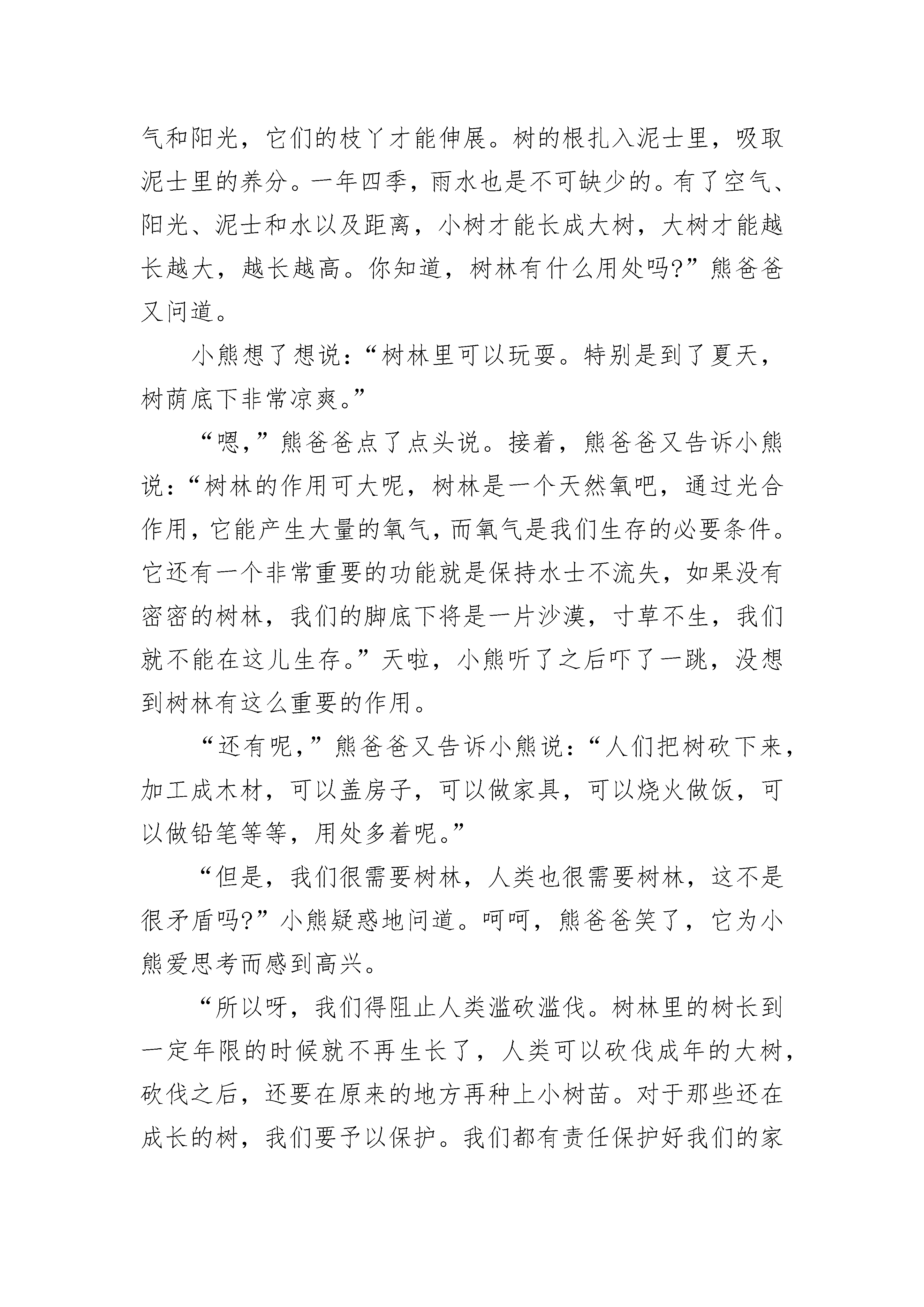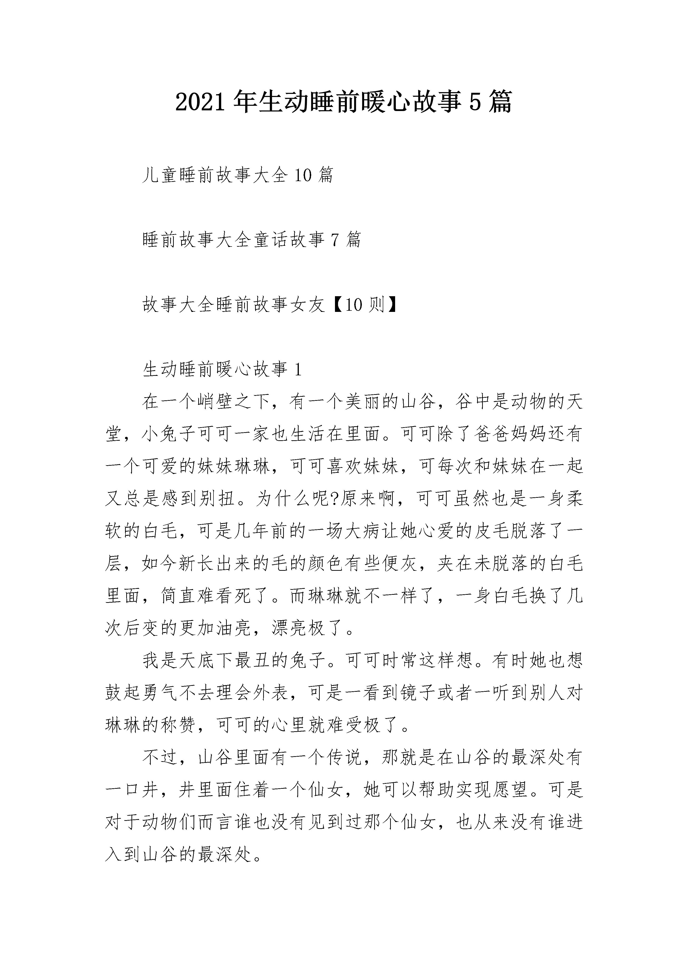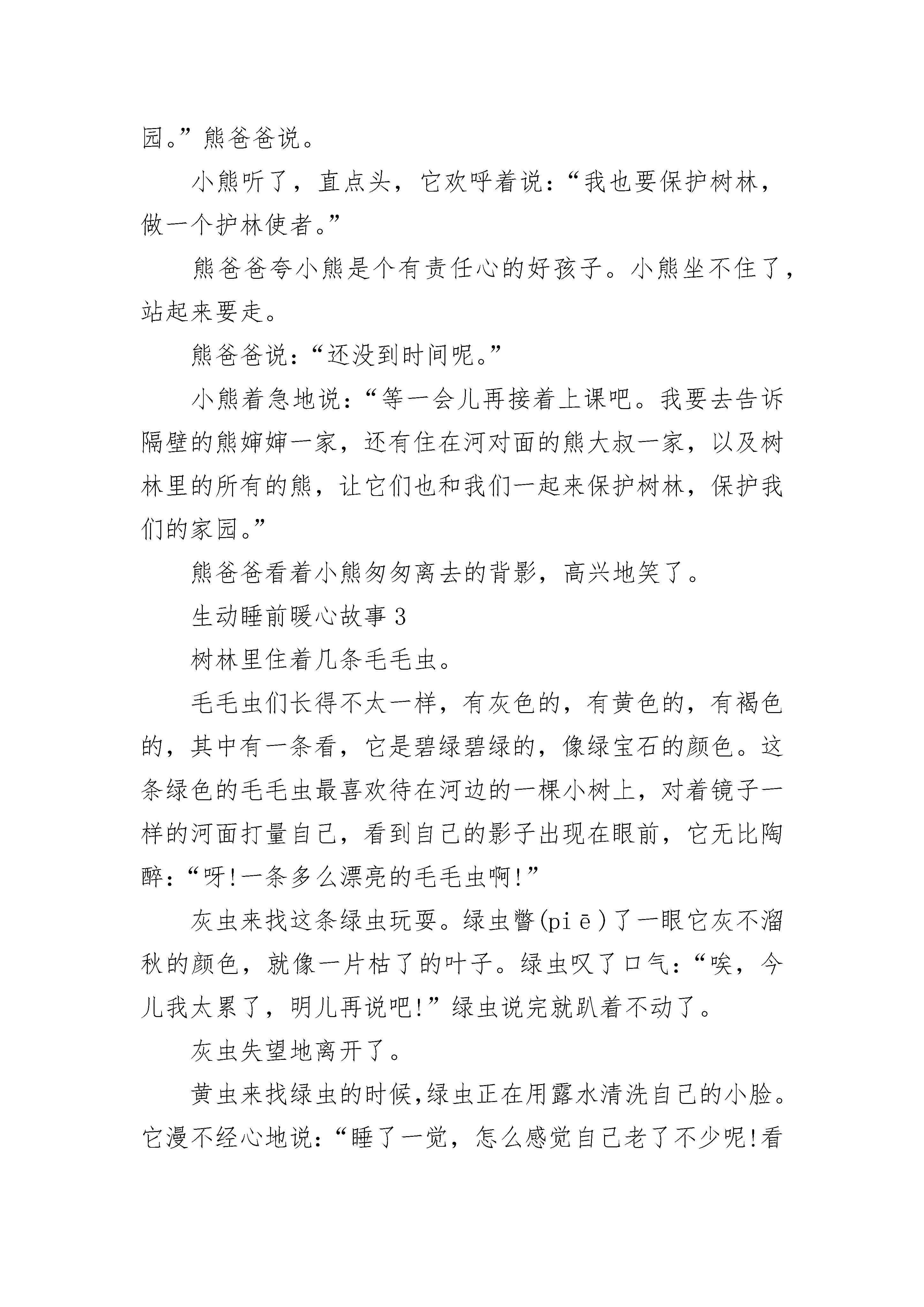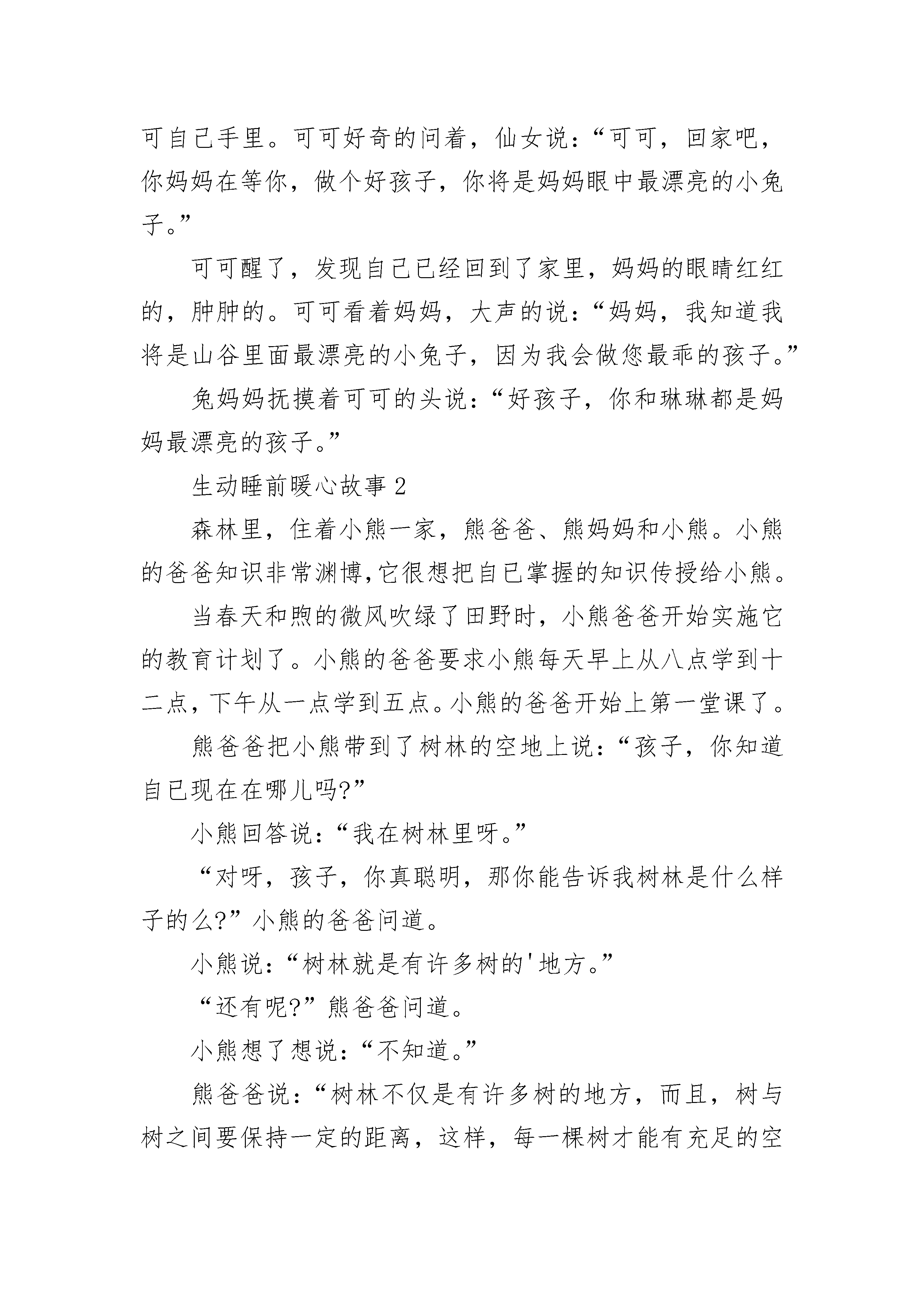 2021年生动睡前暖心故事5篇儿童睡前故事大全10篇睡前故事大全童话故事7篇故事大全睡前故事女友【10则】生动睡前暖心故事1在一个峭壁之下,有一个美丽的山谷,谷中是动物的天堂,小兔子可可一家也生活在里面。可可除了爸爸妈妈还有一个可爱的妹妹琳琳,可可喜欢妹妹,可每次和妹妹在一起又总是感到别扭。为什么呢?原来啊,可可虽然也是一身柔软的白毛,可是几年前的一场大病让她心爱的皮毛脱落了一层,如今新长出来的毛的颜色有些便灰,夹在未脱落的白毛里面,简直难看死了。而琳琳就不一样了,一身白毛换了几次后变的更加油亮,漂亮极了。我是天底下最丑的兔子。可可时常这样想。有时她也想鼓起勇气不去理会外表,可是一看到镜子或者一听到别人对琳琳的称赞,可可的心里就难受极了。不过,山谷里面有一个传说,那就是在山谷的最深处有一口井,井里面住着一个仙女,她可以帮助实现愿望。可是对于动物们而言谁也没有见到过那个仙女,也从来没有谁进入到山谷的最深处。可可告诉妈妈她想去找那个仙女,希望她可以把自己变的漂亮一些。妈妈问:“你觉得现在很丑吗?我的孩子。”可可很认真的点点头,眼泪也差点掉了出来。妈妈没有再说什么,只是给她准备了一些胡萝卜作为她路上的干粮。“可可,早点回来,妈妈在等你。”兔妈妈说。可可就这样背着一小袋干粮离开了家,往山谷的最深处走去。她不知道,在她转身离开的那一刻,最爱她的妈妈掉下了眼泪。可可走啊走,她走了很久,袋子里面的胡萝卜越来越少,可是通向山谷最深处的路似乎还有好长好长的一段。夜晚来临,山谷里面刮起大风,可可躲到一个山洞里面。“好冷哦!”可可打着哆嗦。远处传来狼的叫声,可可好怕哦。可可想回家,可是她却并不甘心,她要找到那个仙女,一定要找到。可可终于在口袋里面还剩下一根胡萝卜的时候来到了山谷的最深处,她看到了那口井,高兴的她赶紧跑过去呼唤仙女。可是,仙女没有看到,她看到的是干枯的井里杂草丛生……我不可能再变漂亮了。可可这样想着,禁不住哭了起来,她无奈的往家的方向走去。可是一根胡萝卜却无法让她顺利的回家,吃完了这一根她便饿着肚子赶路,再后来,她饿晕了过去。在可可的梦里,她见到了仙女,仙女告诉她这个世界上自己没有变漂亮的办法,但是如果想要变漂亮,办法还在可可自己手里。可可好奇的问着,仙女说:“可可,回家吧,你妈妈在等你,做个好孩子,你将是妈妈眼中最漂亮的小兔子。”可可醒了,发现自己已经回到了家里,妈妈的眼睛红红的,肿肿的。可可看着妈妈,大声的说:“妈妈,我知道我将是山谷里面最漂亮的小兔子,因为我会做您最乖的孩子。”兔妈妈抚摸着可可的头说:“好孩子,你和琳琳都是妈妈最漂亮的孩子。”生动睡前暖心故事2森林里,住着小熊一家,熊爸爸、熊妈妈和小熊。小熊的爸爸知识非常渊博,它很想把自已掌握的知识传授给小熊。当春天和煦的微风吹绿了田野时,小熊爸爸开始实施它的教育计划了。小熊的爸爸要求小熊每天早上从八点学到十二点,下午从一点学到五点。小熊的爸爸开始上第一堂课了。熊爸爸把小熊带到了树林的空地上说:“孩子,你知道自已现在在哪儿吗?”小熊回答说:“我在树林里呀。”“对呀,孩子,你真聪明,那你能告诉我树林是什么样子的么?”小熊的爸爸问道。小熊说:“树林就是有许多树的'地方。”“还有呢?”熊爸爸问道。小熊想了想说:“不知道。”熊爸爸说:“树林不仅是有许多树的地方,而且,树与树之间要保持一定的距离,这样,每一棵树才能有充足的空气和阳光,它们的枝丫才能伸展。树的根扎入泥士里,吸取泥士里的养分。一年四季,雨水也是不可缺少的。有了空气、阳光、泥士和水以及距离,小树才能长成大树,大树才能越长越大,越长越高。你知道,树林有什么用处吗?”熊爸爸又问道。小熊想了想说:“树林里可以玩耍。特别是到了夏天,树荫底下非常凉爽。”“嗯,”熊爸爸点了点头说。接着,熊爸爸又告诉小熊说:“树林的作用可大呢,树林是一个天然氧吧,通过光合作用,它能产生大量的氧气,而氧气是我们生存的必要条件。它还有一个非常重要的功能就是保持水士不流失,如果没有密密的树林,我们的脚底下将是一片沙漠,寸草不生,我们就不能在这儿生存。”天啦,小熊听了之后吓了一跳,没想到树林有这么重要的作用。“还有呢,”熊爸爸又告诉小熊说:“人们把树砍下来,加工成木材,可以盖房子,可以做家具,可以烧火做饭,可以做铅笔等等,用处多着呢。”“但是,我们很需要树林,人类也很需要树林,这不是很矛盾吗?”小熊疑惑地问道。呵呵,熊爸爸笑了,它为小熊爱思考而感到高兴。“所以呀,我们得阻止人类滥砍滥伐。树林里的树长到一定年限的时候就不再生长了,人类可以砍伐成年的大树,砍伐之后,还要在原来的地方再种上小树苗。对于那些还在成长的树,我们要予以保护。我们都有责任保护好我们的家园。”熊爸爸说。小熊听了,直点头,它欢呼着说:“我也要保护树林,做一个护林使者。”熊爸爸夸小熊是个有责任心的好