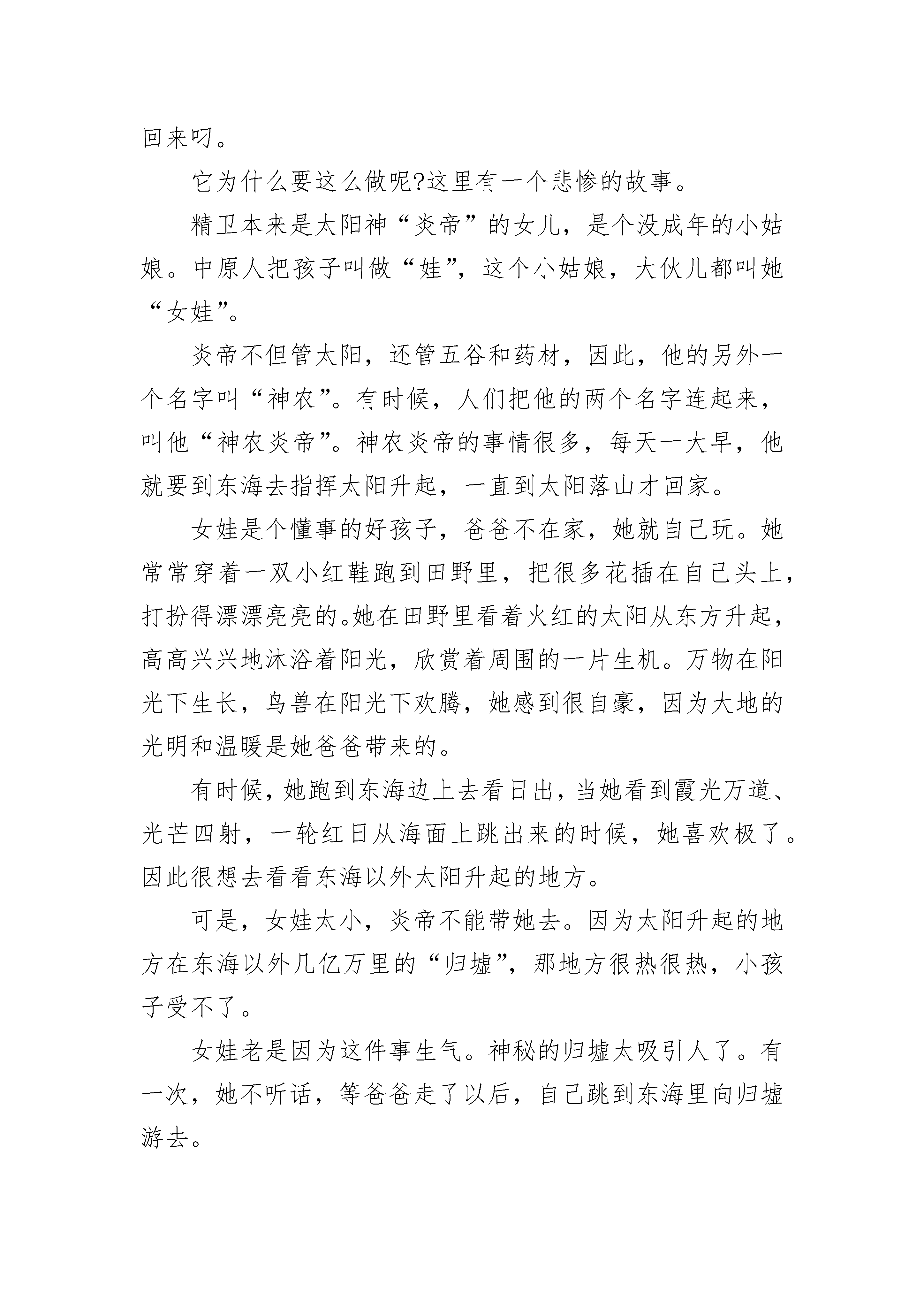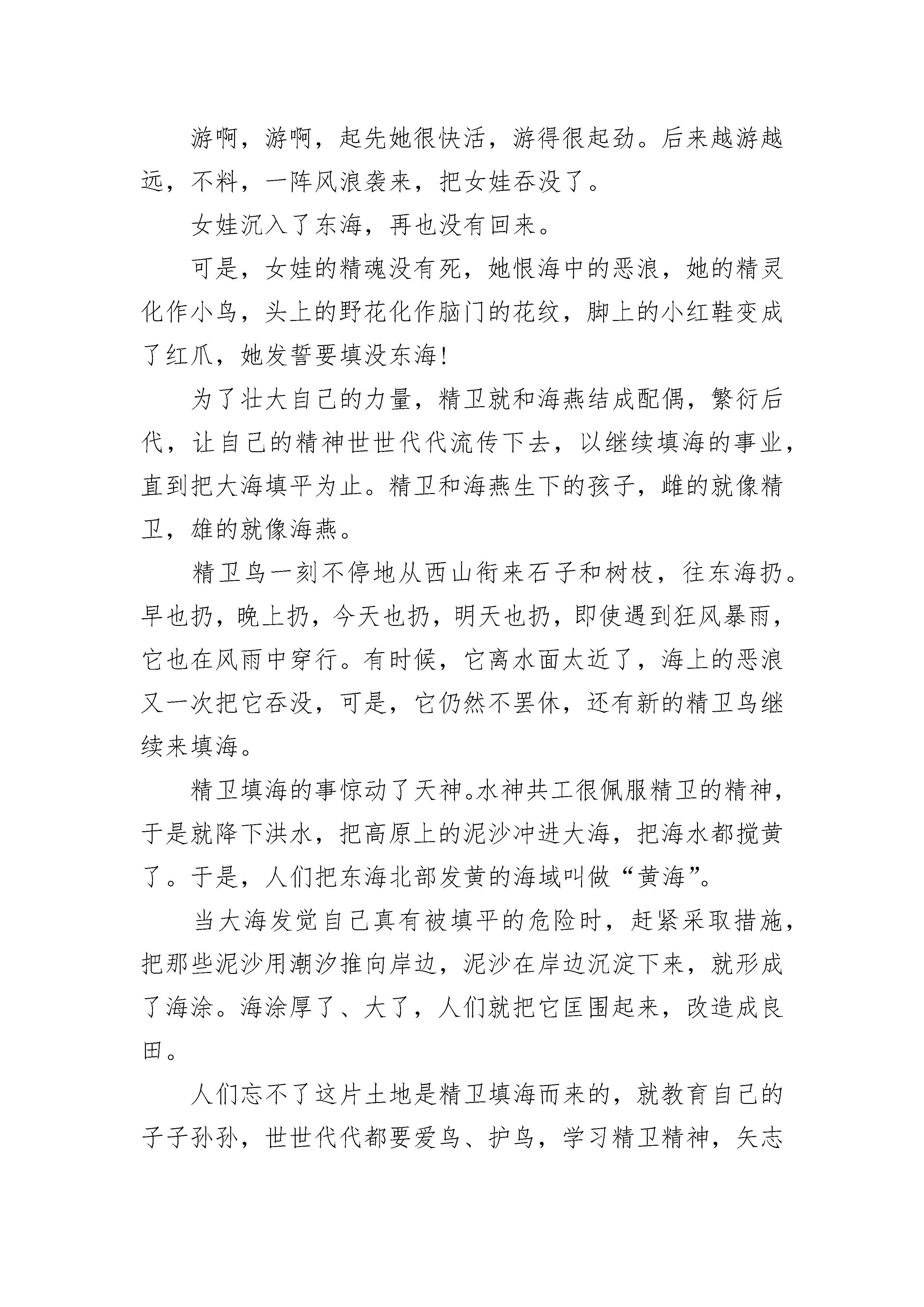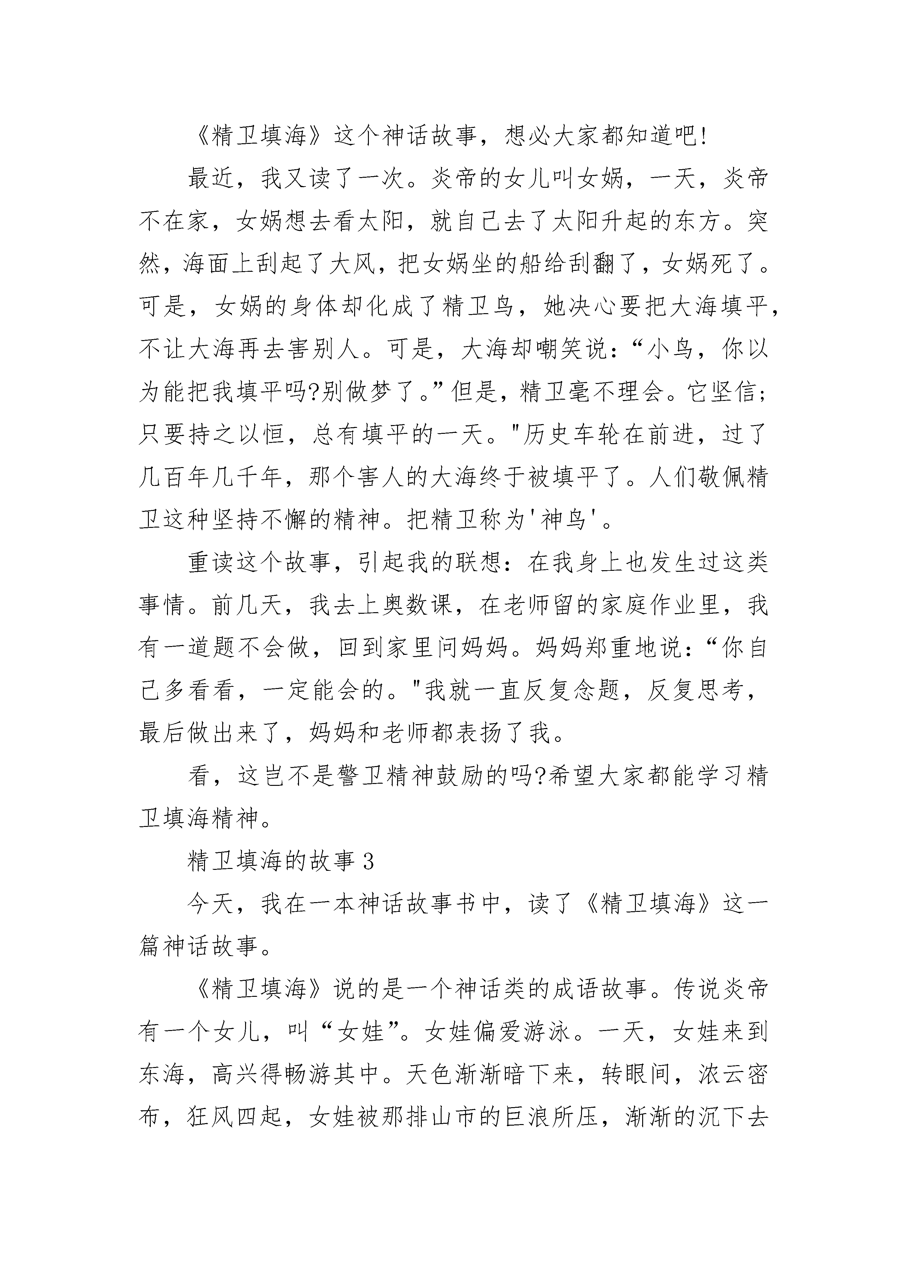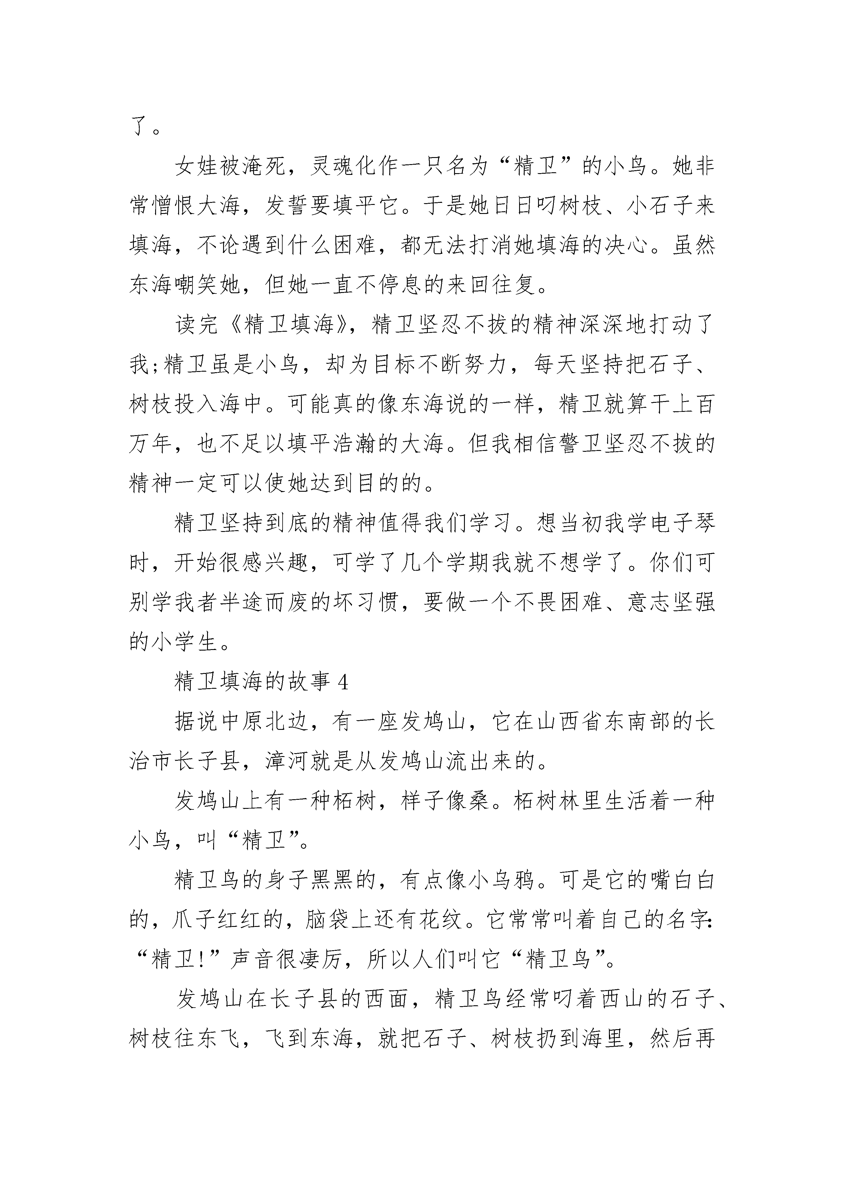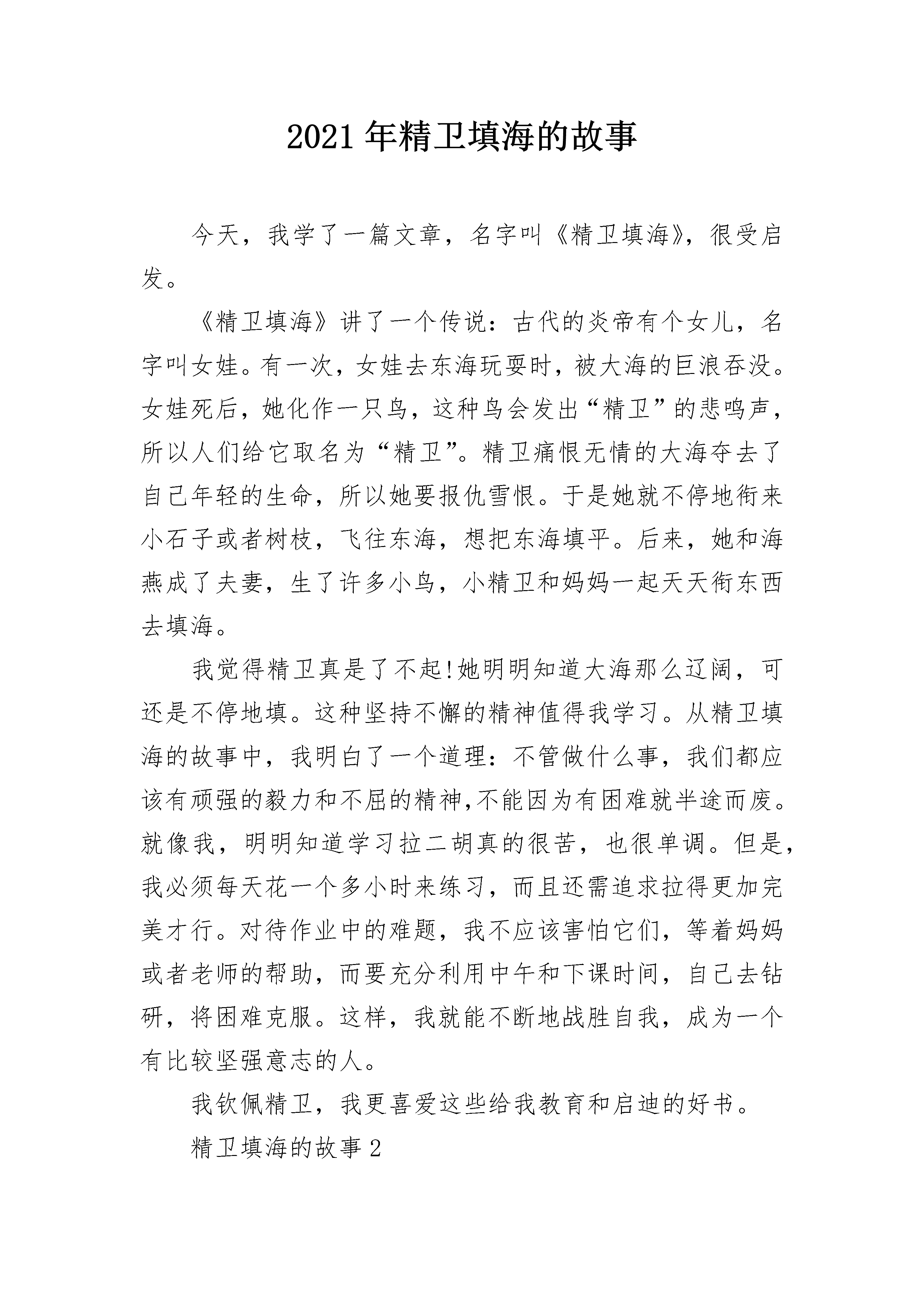 2021年精卫填海的故事今天,我学了一篇文章,名字叫《精卫填海》,很受启发。《精卫填海》讲了一个传说:古代的炎帝有个女儿,名字叫女娃。有一次,女娃去东海玩耍时,被大海的巨浪吞没。女娃死后,她化作一只鸟,这种鸟会发出“精卫”的悲鸣声,所以人们给它取名为“精卫”。精卫痛恨无情的大海夺去了自己年轻的生命,所以她要报仇雪恨。于是她就不停地衔来小石子或者树枝,飞往东海,想把东海填平。后来,她和海燕成了夫妻,生了许多小鸟,小精卫和妈妈一起天天衔东西去填海。我觉得精卫真是了不起!她明明知道大海那么辽阔,可还是不停地填。这种坚持不懈的精神值得我学习。从精卫填海的故事中,我明白了一个道理:不管做什么事,我们都应该有顽强的毅力和不屈的精神,不能因为有困难就半途而废。就像我,明明知道学习拉二胡真的很苦,也很单调。但是,我必须每天花一个多小时来练习,而且还需追求拉得更加完美才行。对待作业中的难题,我不应该害怕它们,等着妈妈或者老师的帮助,而要充分利用中午和下课时间,自己去钻研,将困难克服。这样,我就能不断地战胜自我,成为一个有比较坚强意志的人。我钦佩精卫,我更喜爱这些给我教育和启迪的好书。精卫填海的故事2《精卫填海》这个神话故事,想必大家都知道吧!最近,我又读了一次。炎帝的女儿叫女娲,一天,炎帝不在家,女娲想去看太阳,就自己去了太阳升起的东方。突然,海面上刮起了大风,把女娲坐的船给刮翻了,女娲死了。可是,女娲的身体却化成了精卫鸟,她决心要把大海填平,不让大海再去害别人。可是,大海却嘲笑说:“小鸟,你以为能把我填平吗?别做梦了。”但是,精卫毫不理会。它坚信;只要持之以恒,总有填平的一天。"历史车轮在前进,过了几百年几千年,那个害人的大海终于被填平了。人们敬佩精卫这种坚持不懈的精神。把精卫称为'神鸟'。重读这个故事,引起我的联想:在我身上也发生过这类事情。前几天,我去上奥数课,在老师留的家庭作业里,我有一道题不会做,回到家里问妈妈。妈妈郑重地说:“你自己多看看,一定能会的。"我就一直反复念题,反复思考,最后做出来了,妈妈和老师都表扬了我。看,这岂不是警卫精神鼓励的吗?希望大家都能学习精卫填海精神。精卫填海的故事3今天,我在一本神话故事书中,读了《精卫填海》这一篇神话故事。《精卫填海》说的是一个神话类的成语故事。传说炎帝有一个女儿,叫“女娃”。女娃偏爱游泳。一天,女娃来到东海,高兴得畅游其中。天色渐渐暗下来,转眼间,浓云密布,狂风四起,女娃被那排山市的巨浪所压,渐渐的沉下去了。女娃被淹死,灵魂化作一只名为“精卫”的小鸟。她非常憎恨大海,发誓要填平它。于是她日日叼树枝、小石子来填海,不论遇到什么困难,都无法打消她填海的决心。虽然东海嘲笑她,但她一直不停息的来回往复。读完《精卫填海》,精卫坚忍不拔的精神深深地打动了我;精卫虽是小鸟,却为目标不断努力,每天坚持把石子、树枝投入海中。可能真的像东海说的一样,精卫就算干上百万年,也不足以填平浩瀚的大海。但我相信警卫坚忍不拔的精神一定可以使她达到目的的。精卫坚持到底的精神值得我们学习。想当初我学电子琴时,开始很感兴趣,可学了几个学期我就不想学了。你们可别学我者半途而废的坏习惯,要做一个不畏困难、意志坚强的小学生。精卫填海的故事4据说中原北边,有一座发鸠山,它在山西省东南部的长治市长子县,漳河就是从发鸠山流出来的。发鸠山上有一种柘树,样子像桑。柘树林里生活着一种小鸟,叫“精卫”。精卫鸟的身子黑黑的,有点像小乌鸦。可是它的嘴白白的,爪子红红的,脑袋上还有花纹。它常常叫着自己的名字:“精卫!”声音很凄厉,所以人们叫它“精卫鸟”。发鸠山在长子县的西面,精卫鸟经常叼着西山的石子、树枝往东飞,飞到东海,就把石子、树枝扔到海里,然后再回来叼。它为什么要这么做呢?这里有一个悲惨的故事。精卫本来是太阳神“炎帝”的女儿,是个没成年的小姑娘。中原人把孩子叫做“娃”,这个小姑娘,大伙儿都叫她“女娃”。炎帝不但管太阳,还管五谷和药材,因此,他的另外一个名字叫“神农”。有时候,人们把他的两个名字连起来,叫他“神农炎帝”。神农炎帝的事情很多,每天一大早,他就要到东海去指挥太阳升起,一直到太阳落山才回家。女娃是个懂事的好孩子,爸爸不在家,她就自己玩。她常常穿着一双小红鞋跑到田野里,把很多花插在自己头上,打扮得漂漂亮亮的。她在田野里看着火红的太阳从东方升起,高高兴兴地沐浴着阳光,欣赏着周围的一片生机。万物在阳光下生长,鸟兽在阳光下欢腾,她感到很自豪,因为大地的光明和温暖是她爸爸带来的。有时候,她跑到东海边上去看日出,当她看到霞光万道、光芒四射,一轮红日从海面上跳出来的时候,她喜欢极了。因此很想去看看东海以外太阳升起的地方。可是,女娃太小,炎帝不能带她去。因为太阳升起的地方在东海以外几亿万里的“归墟”,那地方很热很热,小孩子受不了。女娃老是因为这件事