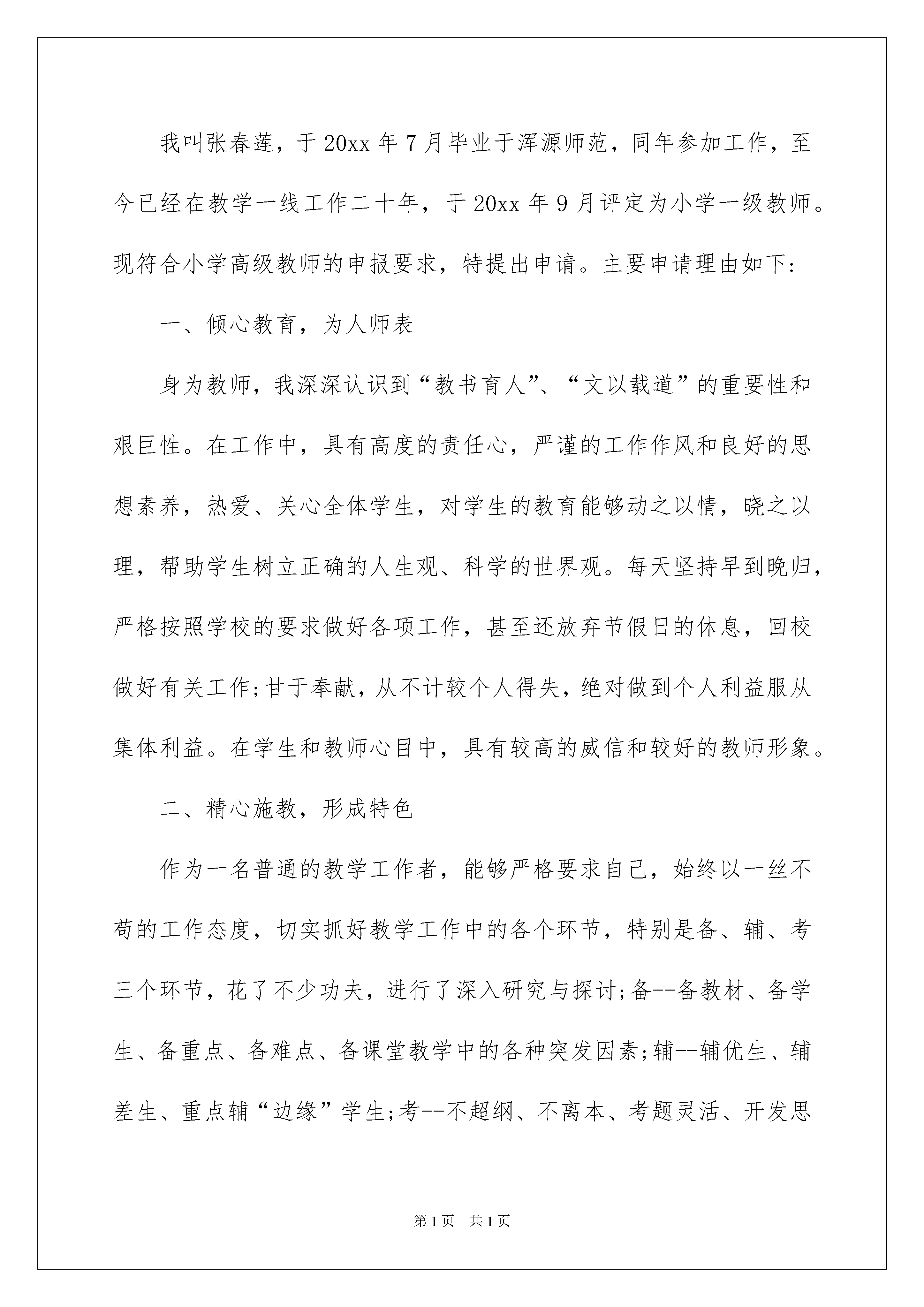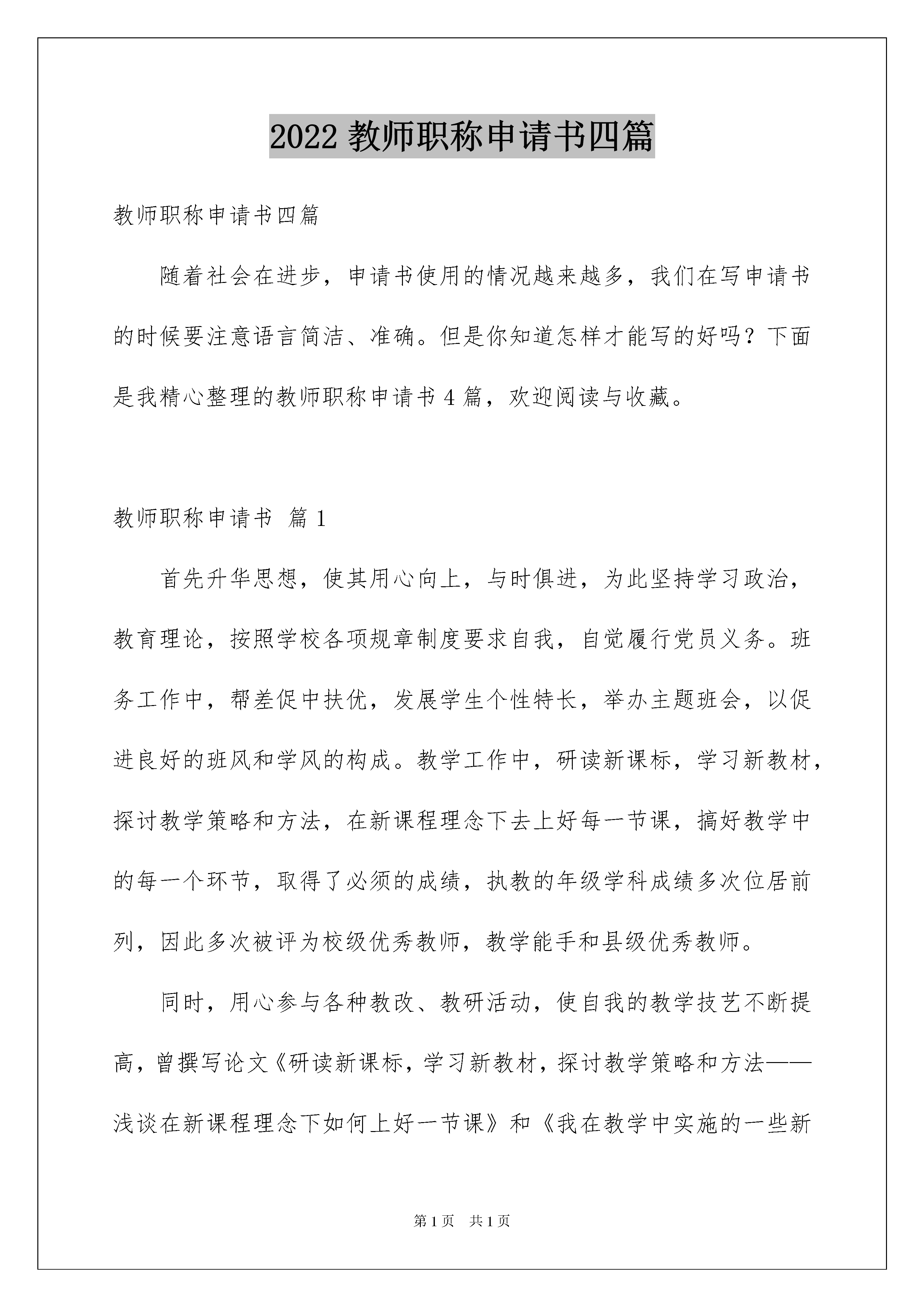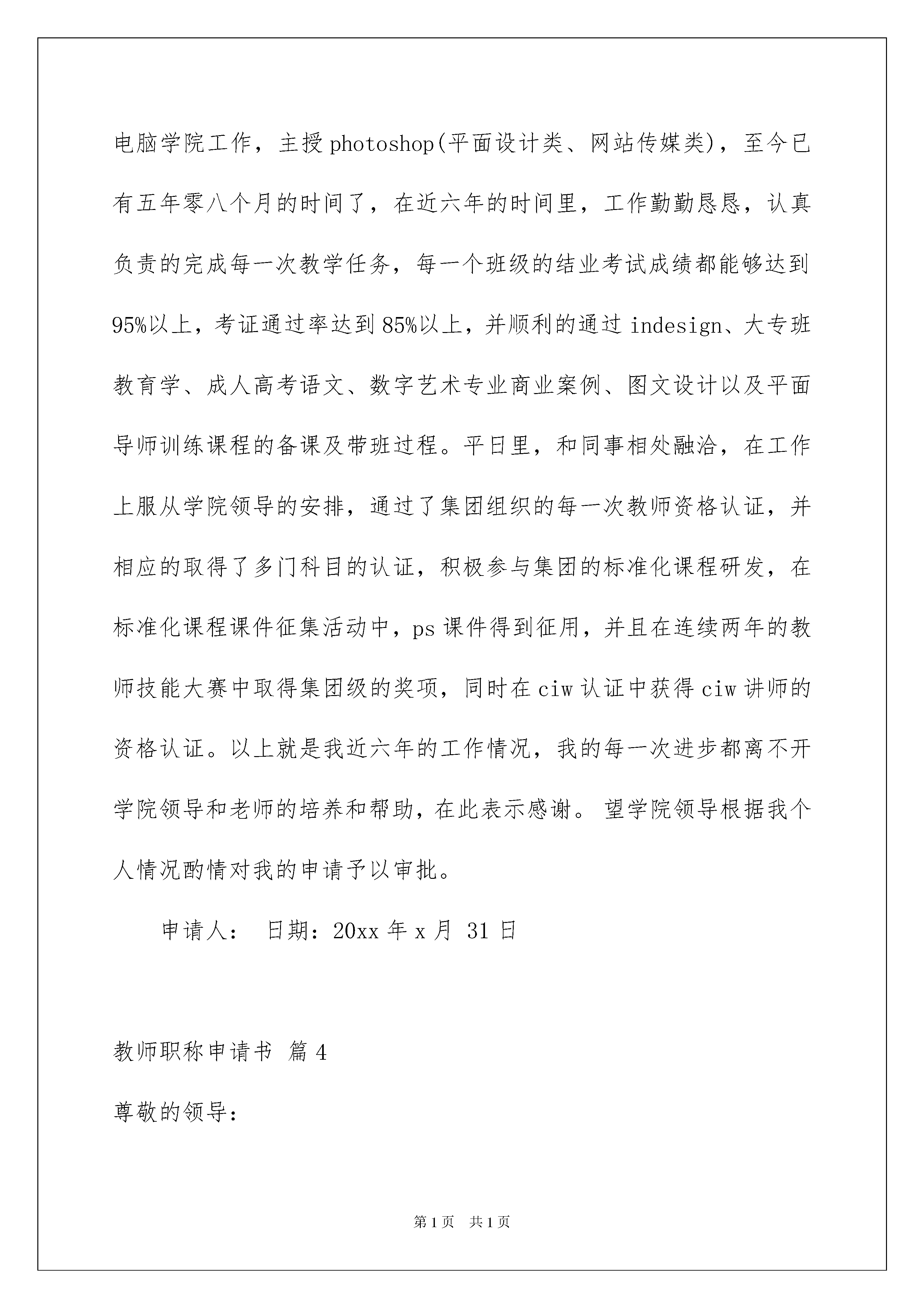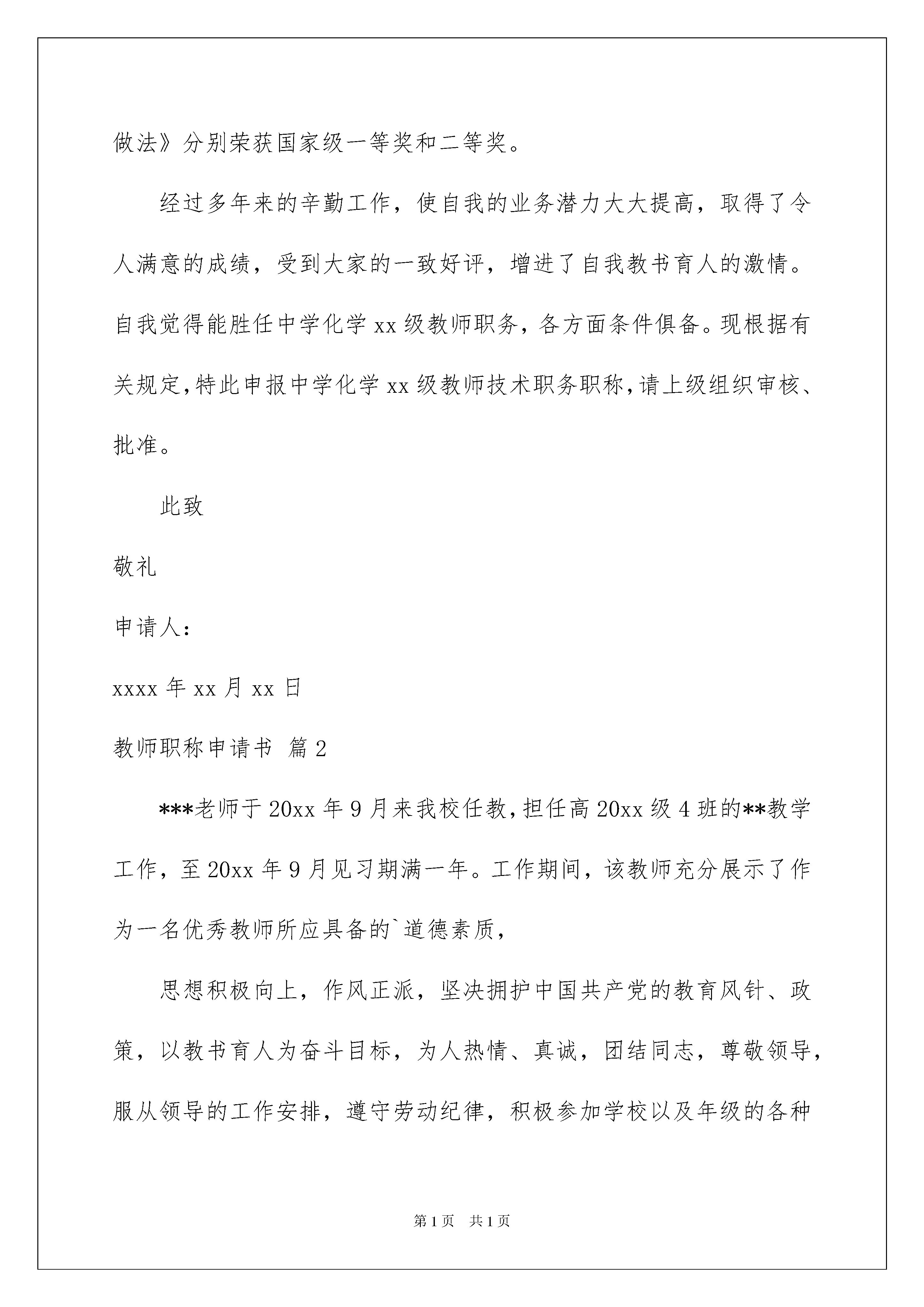2022教师职称申请书四篇教师职称申请书四篇随着社会在进步,申请书使用的情况越来越多,我们在写申请书的时候要注意语言简洁、准确。但是你知道怎样才能写的好吗?下面是我精心整理的教师职称申请书4篇,欢迎阅读与收藏。教师职称申请书篇1首先升华思想,使其用心向上,与时俱进,为此坚持学习政治,教育理论,按照学校各项规章制度要求自我,自觉履行党员义务。班务工作中,帮差促中扶优,发展学生个性特长,举办主题班会,以促进良好的班风和学风的构成。教学工作中,研读新课标,学习新教材,探讨教学策略和方法,在新课程理念下去上好每一节课,搞好教学中的每一个环节,取得了必须的成绩,执教的年级学科成绩多次位居前列,因此多次被评为校级优秀教师,教学能手和县级优秀教师。同时,用心参与各种教改、教研活动,使自我的教学技艺不断提高,曾撰写论文《研读新课标,学习新教材,探讨教学策略和方法——浅谈在新课程理念下如何上好一节课》和《我在教学中实施的一些新做法》分别荣获国家级一等奖和二等奖。经过多年来的辛勤工作,使自我的业务潜力大大提高,取得了令人满意的成绩,受到大家的一致好评,增进了自我教书育人的激情。自我觉得能胜任中学化学xx级教师职务,各方面条件俱备。现根据有关规定,特此申报中学化学xx级教师技术职务职称,请上级组织审核、批准。此致敬礼申请人:xxxx年xx月xx日教师职称申请书篇2***老师于20xx年9月来我校任教,担任高20xx级4班的**教学工作,至20xx年9月见习期满一年。工作期间,该教师充分展示了作为一名优秀教师所应具备的`道德素质,思想积极向上,作风正派,坚决拥护中国共产党的教育风针、政策,以教书育人为奋斗目标,为人热情、真诚,团结同志,尊敬领导,服从领导的工作安排,遵守劳动纪律,积极参加学校以及年级的各种相关会议,能投身社会参与社会实践和调查研究。工作上,努力钻研业务,有股年轻人的冲劲,能通过不断地自我学习加强自身专业文化知识修养,并能积极地向经验丰富的老教师学习、请教、听课,得到学校众多教师的赞赏。在教学方式上有自己认识和探索,通过与学生一起活动等方式和学生交朋友,了解他们的生活、学习、思想、兴趣和爱好,对一些成绩比较差,纪律性欠缺的学生采取谈话与和班主任交涉的方式,使他们在学习和纪律的方面有了明显的改进,得到学生的喜爱和拥护以及学生家长的好评。在平时的生活中,该老师爱清洁讲卫生,注重仪表,举止文明,谈吐有修养,有很强的劳动的观念,能吃苦耐劳,积极参加义务劳动。***老师在见习期间的教学能力和教学成绩都比较突出,得到了师生的好评,符合中学二级职称的评定,特此推荐!教师职称申请书篇3尊敬的学院领导:鉴于我在山东新华电脑学院工作教龄与工作表现,在本次职称申报过程中,特此提出副主授职称的申请。我于20xx年3月来山东新华电脑学院工作,主授photoshop(平面设计类、网站传媒类),至今已有五年零八个月的时间了,在近六年的时间里,工作勤勤恳恳,认真负责的完成每一次教学任务,每一个班级的结业考试成绩都能够达到95%以上,考证通过率达到85%以上,并顺利的通过indesign、大专班教育学、成人高考语文、数字艺术专业商业案例、图文设计以及平面导师训练课程的备课及带班过程。平日里,和同事相处融洽,在工作上服从学院领导的安排,通过了集团组织的每一次教师资格认证,并相应的取得了多门科目的认证,积极参与集团的标准化课程研发,在标准化课程课件征集活动中,ps课件得到征用,并且在连续两年的教师技能大赛中取得集团级的奖项,同时在ciw认证中获得ciw讲师的资格认证。以上就是我近六年的工作情况,我的每一次进步都离不开学院领导和老师的培养和帮助,在此表示感谢。望学院领导根据我个人情况酌情对我的申请予以审批。申请人:日期:20xx年x月31日教师职称申请书篇4尊敬的领导:我叫张春莲,于20xx年7月毕业于浑源师范,同年参加工作,至今已经在教学一线工作二十年,于20xx年9月评定为小学一级教师。现符合小学高级教师的申报要求,特提出申请。主要申请理由如下:一、倾心教育,为人师表身为教师,我深深认识到“教书育人”、“文以载道”的重要性和艰巨性。在工作中,具有高度的责任心,严谨的工作作风和良好的思想素养,热爱、关心全体学生,对学生的教育能够动之以情,晓之以理,帮助学生树立正确的人生观、科学的世界观。每天坚持早到晚归,严格按照学校的要求做好各项工作,甚至还放弃节假日的休息,回校做好有关工作;甘于奉献,从不计较个人得失,绝对做到个人利益服从集体利益。在学生和教师心目中,具有较高的威信和较好的教师形象。二、精心施教,形成特色作为一名普通