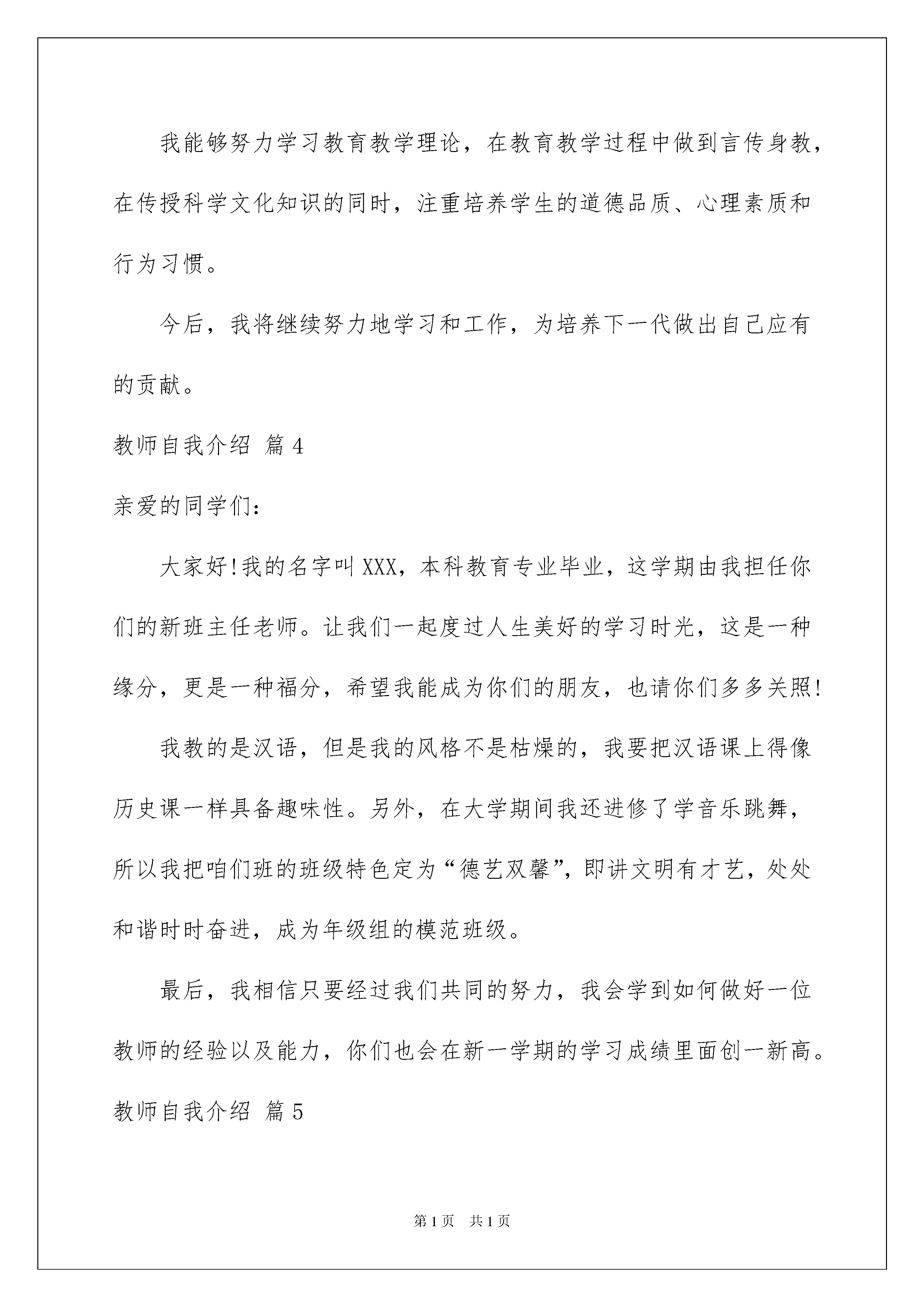 2022教师自我介绍模板八篇教师自我介绍模板八篇来到一个陌生的地方时,我们难以避免地要作出自我介绍,自我介绍是一展示自己的手段。相信大家又在为写自我介绍犯愁了吧!以下是我帮大家整理的教师自我介绍9篇,供大家参考借鉴,希望可以帮助到有需要的朋友。教师自我介绍篇1大家好!我的名字叫向南,很高兴我能成为一名老师,尤其是当你们这么聪明的同学的老师。我教的是数学,但是我的风格不是枯燥的,我要把数学课上得像语文课一样。请大家以后的学习中积极给我提意见,我第一次做老师,有很多都不懂,我也是一个学习的过程,向你们学习如何做一个好老师,合格的老师。我有信心经过我们共同努力,你们能学到知识,我也能学习到我要的。教师自我介绍篇2我叫xx,担任高年级数学教学。平常性格比较活泼、开朗、乐观、积极向上,富有同情心,敢于挑战困难、对未来充满信心,积极追求上进。担任心理健康教师已四年有余。生活中,我能做到笑口常开、知足常乐,我这人喜欢聊天,喜欢跟别人分享快乐和忧伤。工作上,我积极肯干,锐意进取,关爱学生,乐于奉献。能以同情、友善、信任、尊重的态度与人平等相处。并乐于帮助他人,能为他人所理解,人际关系协调和谐。平常遇到困难时,能勇于面对,善于分析和解决问题,受到挫折时,能坦然以对,设法克服,并始终相信风雨过后能见到美丽的彩虹。所以我的心态一直很好,对工作和生活有高度热情。但是人无完人,金无赤金,我想我应该会很清楚的认识到自己身上或多或少的存在一些暂时性的缺点,不过我对自己很有信心,相信通过不断的努力,能跨越一个个人生障碍并逐步达到自我完善、自我提升、一步步向着人生目标奋进,永不停息地去实现生命中一个又一个价值作为一名小学教师,也担任班级的班主任,在平时的工作中,深深地感受到学习心理健康教育知识的重要性,学生也需要老师在这方面进行辅导。加上目前学校的工作需要和自身对心理健康教育这门课程极大兴趣,另外也相信自己有能力、有信心、有决心胜任心理健康教育专职教师这一职务,所以,我毅然做出申请做一名心理健康教育专职教师这一决定,并最终相信自己一定能成为一位合格的心理健康教育的教师。教师自我介绍篇3尊敬的各位评审专家:大家好我叫xxx,现年xx岁,中共党员,大专学历。现为xx学校教师,从事小学语文数学教学工作。我xxxx年8月参加工作,30年来,一直工作在农村教育教学的第一线。xxxx年1月被聘为二级教师,20xx年1月取得一级教师资格,20xx年1月被聘为一级教师。我热爱党的教育事业,能够模范遵守《中小学教师职业道德规范》和吉林省教育厅重申“六条严禁”。遵纪守法,爱岗敬业,廉洁从教,为人师表。通过30年的工作实践,我积累了比较丰富的教学经验,具备了自主驾驭课堂的能力,形成了自己的教学风格,取得了比较好的教学效果。我能够努力学习教育教学理论,在教育教学过程中做到言传身教,在传授科学文化知识的同时,注重培养学生的道德品质、心理素质和行为习惯。今后,我将继续努力地学习和工作,为培养下一代做出自己应有的贡献。教师自我介绍篇4亲爱的同学们:大家好!我的名字叫XXX,本科教育专业毕业,这学期由我担任你们的新班主任老师。让我们一起度过人生美好的学习时光,这是一种缘分,更是一种福分,希望我能成为你们的朋友,也请你们多多关照!我教的是汉语,但是我的风格不是枯燥的,我要把汉语课上得像历史课一样具备趣味性。另外,在大学期间我还进修了学音乐跳舞,所以我把咱们班的班级特色定为“德艺双馨”,即讲文明有才艺,处处和谐时时奋进,成为年级组的模范班级。最后,我相信只要经过我们共同的努力,我会学到如何做好一位教师的经验以及能力,你们也会在新一学期的学习成绩里面创一新高。教师自我介绍篇5尊敬的各位家长、各位老师:你们好。首先做一下自我介绍,我姓李,是本届七年级的年段长。请允许我代表七年级全体教师,向在座的家长的准时与会表示衷心的感谢。转眼间,孩子们升入七中已八个多月了。在各位家长的密切配合下,在各位任课教师的悉心教育下,孩子们各方面均取得了不同程度的进步,年级的工作正在顺利的进行着。召开这次家长会的目的是为了加强老师、家长和学生之间的联系,相互交流一下学生在校及在家里的情况,以便老师能够更有针对性的实施教育,家长能够更好教育自己的子女如何做人与成材。教师自我介绍篇6在十三年的教育教学实践中,通过自己的努力和各学科老师的帮助,逐步形成了自己的教学风格,注重身教,师生相处和谐,有较强的课堂组织调控能力和课程创新能力。积极参加教科研活动,XX年参加了合肥市首批新课程改革试验,并在省教科所体育教研组的带领下,参与了国家级课题《超体重儿童健康行为的实验与研究》的研