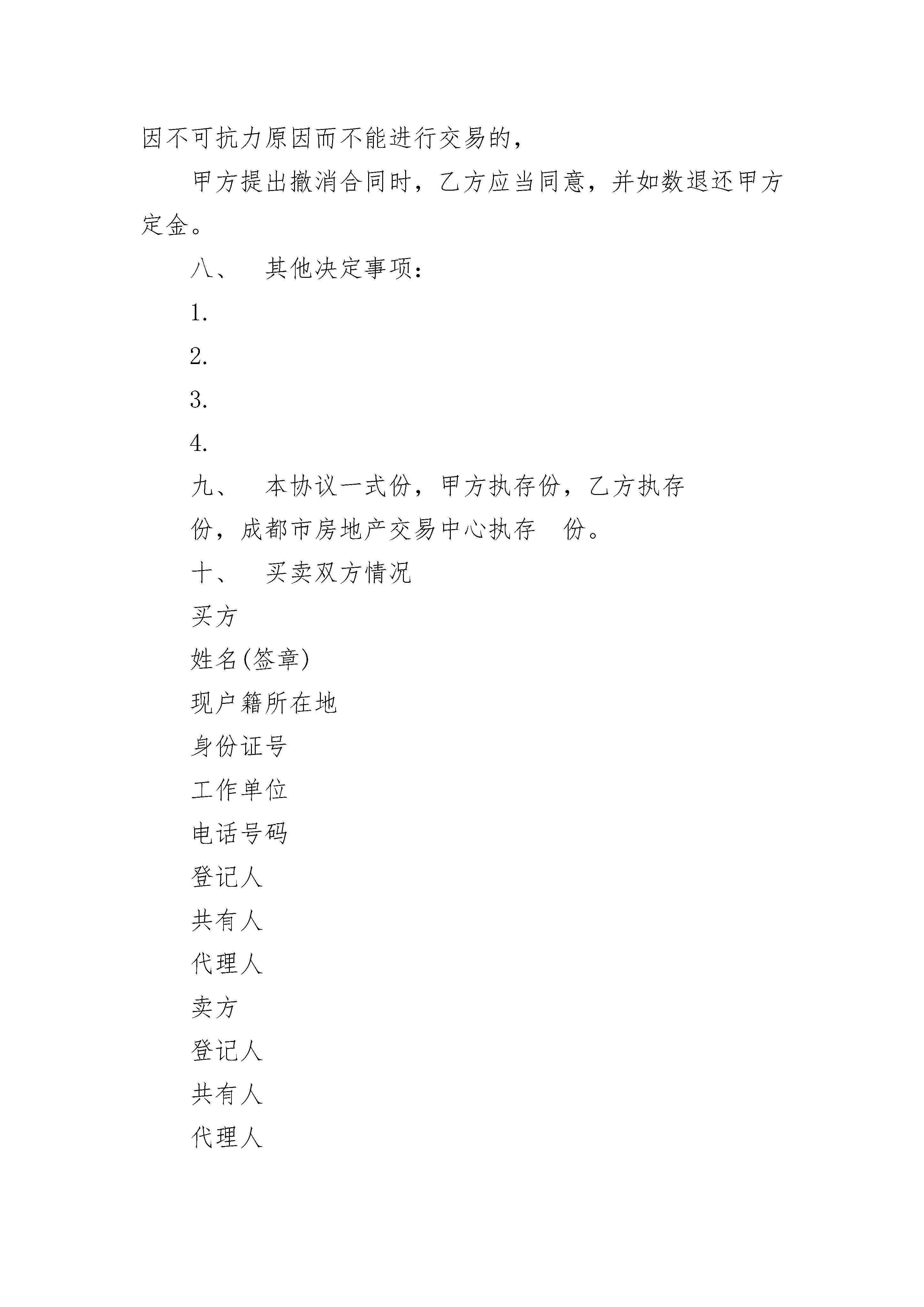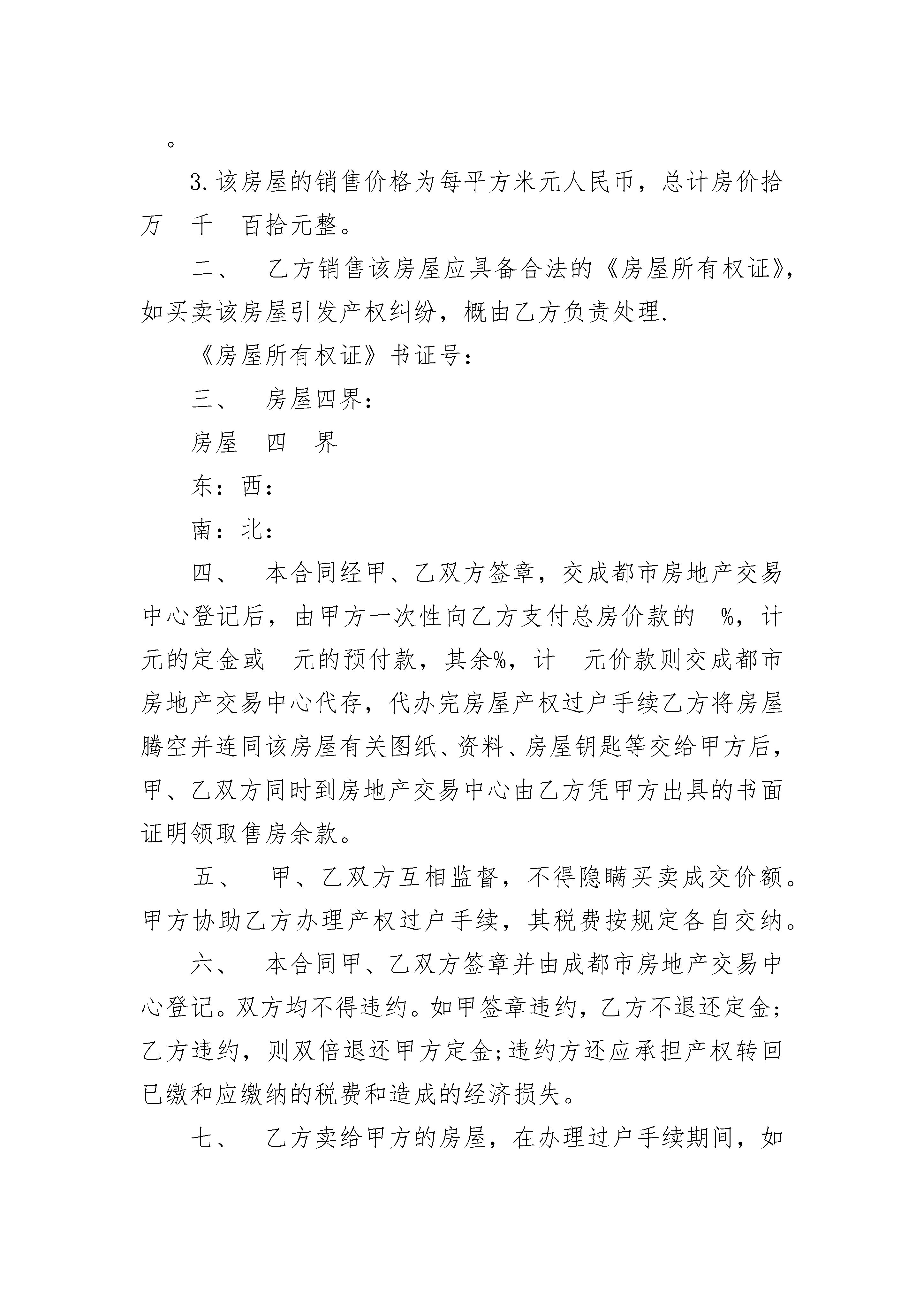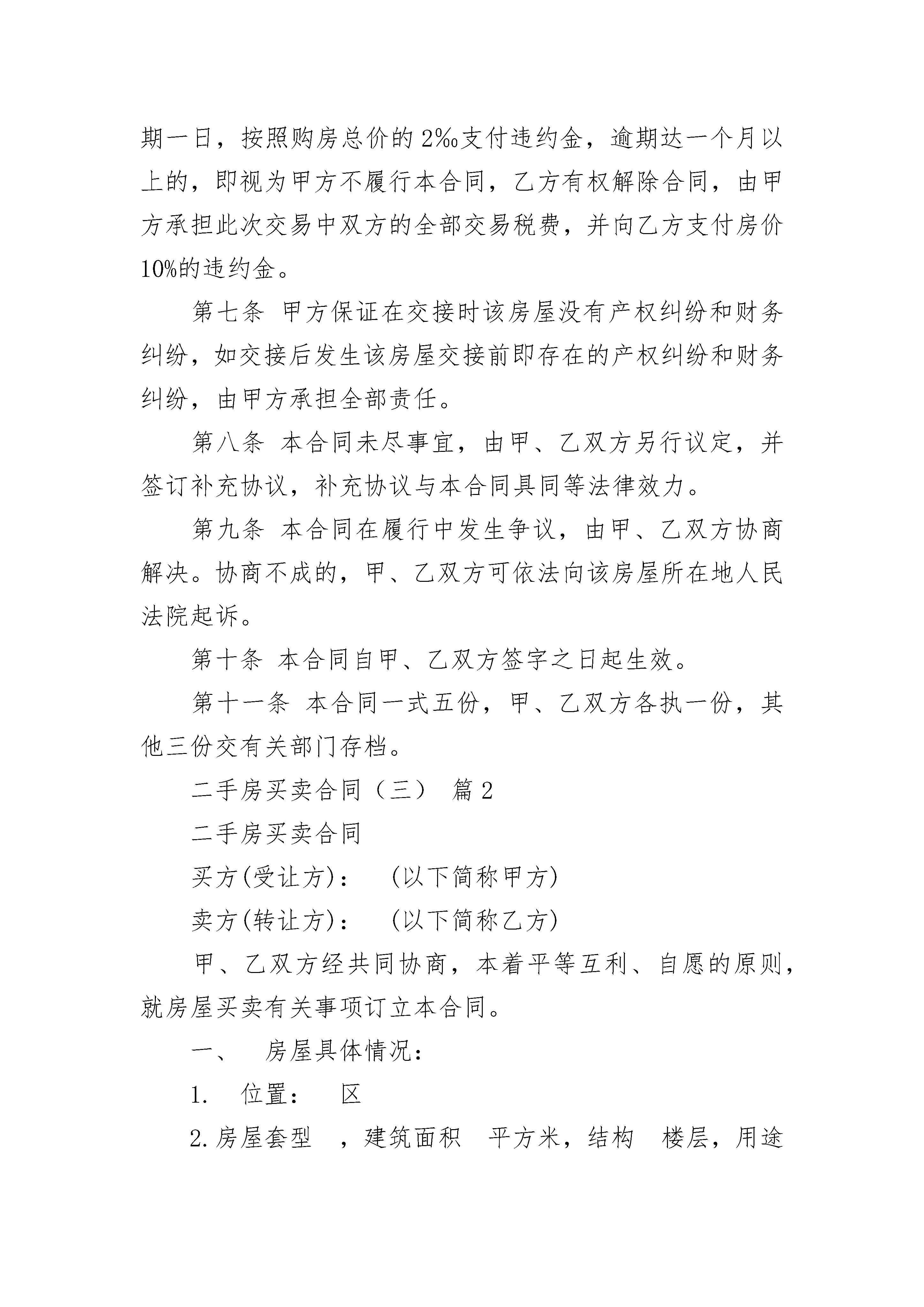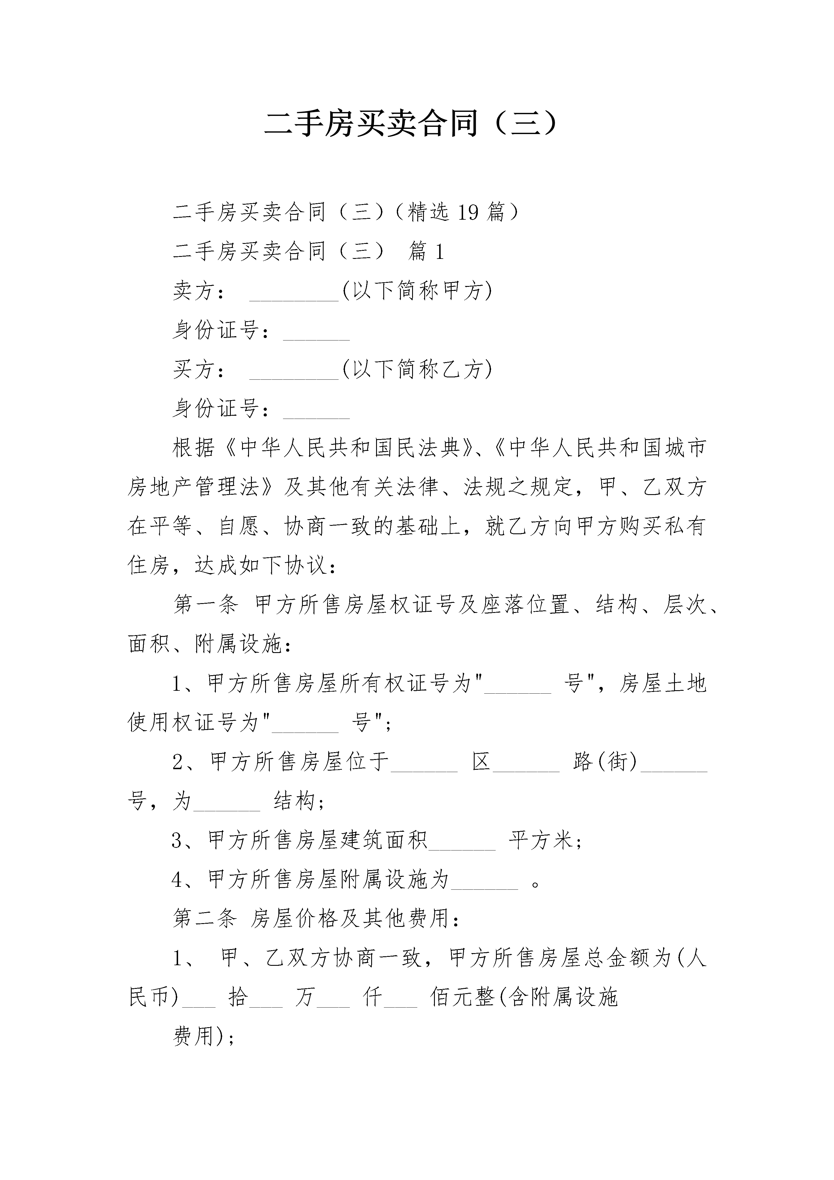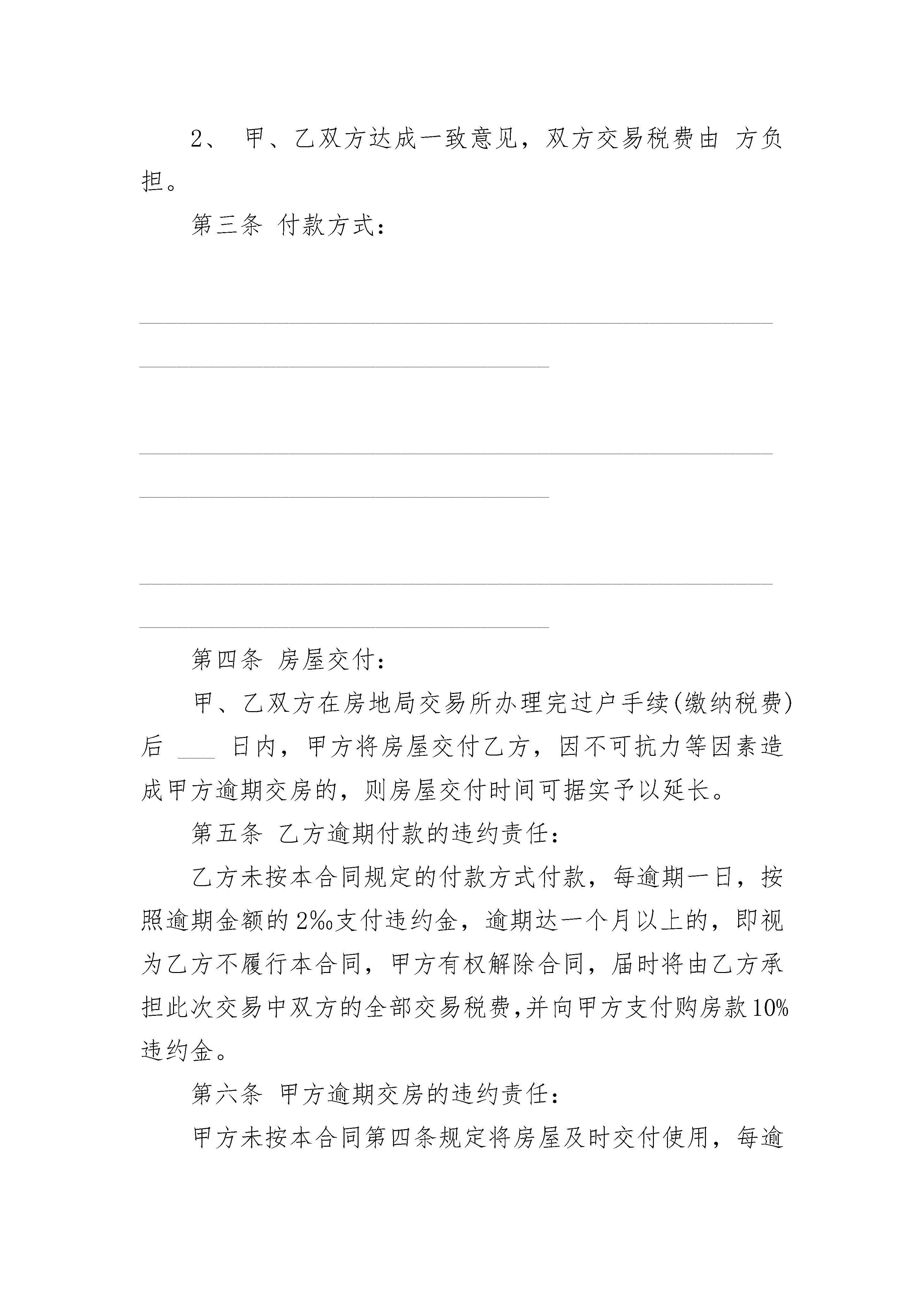 二手房买卖合同(三)二手房买卖合同(三)(精选19篇)二手房买卖合同(三)篇1卖方:________(以下简称甲方)身份证号:______买方:________(以下简称乙方)身份证号:______根据《中华人民共和国民法典》、《中华人民共和国城市房地产管理法》及其他有关法律、法规之规定,甲、乙双方在平等、自愿、协商一致的基础上,就乙方向甲方购买私有住房,达成如下协议:第一条甲方所售房屋权证号及座落位置、结构、层次、面积、附属设施:1、甲方所售房屋所有权证号为"______号",房屋土地使用权证号为"______号";2、甲方所售房屋位于______区______路(街)______号,为______结构;3、甲方所售房屋建筑面积______平方米;4、甲方所售房屋附属设施为______。第二条房屋价格及其他费用:1、甲、乙双方协商一致,甲方所售房屋总金额为(人民币)___拾___万___仟___佰元整(含附属设施费用);2、甲、乙双方达成一致意见,双方交易税费由方负担。第三条付款方式:____________________________________________________________________________________________________________________________________________________________________________________________________________________________________________________________第四条房屋交付:甲、乙双方在房地局交易所办理完过户手续(缴纳税费)后___日内,甲方将房屋交付乙方,因不可抗力等因素造成甲方逾期交房的,则房屋交付时间可据实予以延长。第五条乙方逾期付款的违约责任:乙方未按本合同规定的付款方式付款,每逾期一日,按照逾期金额的2‰支付违约金,逾期达一个月以上的,即视为乙方不履行本合同,甲方有权解除合同,届时将由乙方承担此次交易中双方的全部交易税费,并向甲方支付购房款10%违约金。第六条甲方逾期交房的违约责任:甲方未按本合同第四条规定将房屋及时交付使用,每逾期一日,按照购房总价的2‰支付违约金,逾期达一个月以上的,即视为甲方不履行本合同,乙方有权解除合同,由甲方承担此次交易中双方的全部交易税费,并向乙方支付房价10%的违约金。第七条甲方保证在交接时该房屋没有产权纠纷和财务纠纷,如交接后发生该房屋交接前即存在的产权纠纷和财务纠纷,由甲方承担全部责任。第八条本合同未尽事宜,由甲、乙双方另行议定,并签订补充协议,补充协议与本合同具同等法律效力。第九条本合同在履行中发生争议,由甲、乙双方协商解决。协商不成的,甲、乙双方可依法向该房屋所在地人民法院起诉。第十条本合同自甲、乙双方签字之日起生效。第十一条本合同一式五份,甲、乙双方各执一份,其他三份交有关部门存档。二手房买卖合同(三)篇2二手房买卖合同买方(受让方):(以下简称甲方)卖方(转让方):(以下简称乙方)甲、乙双方经共同协商,本着平等互利、自愿的原则,就房屋买卖有关事项订立本合同。一、房屋具体情况:1.位置:区2.房屋套型,建筑面积平方米,结构楼层,用途。3.该房屋的销售价格为每平方米元人民币,总计房价拾万千百拾元整。二、乙方销售该房屋应具备合法的《房屋所有权证》,如买卖该房屋引发产权纠纷,概由乙方负责处理.《房屋所有权证》书证号:三、房屋四界:房屋四界东:西:南:北:四、本合同经甲、乙双方签章,交成都市房地产交易中心登记后,由甲方一次性向乙方支付总房价款的%,计元的定金或元的预付款,其余%,计元价款则交成都市房地产交易中心代存,代办完房屋产权过户手续乙方将房屋腾空并连同该房屋有关图纸、资料、房屋钥匙等交给甲方后,甲、乙双方同时到房地产交易中心由乙方凭甲方出具的书面证明领取售房余款。五、甲、乙双方互相监督,不得隐瞒买卖成交价额。甲方协助乙方办理产权过户手续,其税费按规定各自交纳。六、本合同甲、乙双方签章并由成都市房地产交易中心登记。双方均不得违约。如甲签章违约,乙方不退还定金;乙方违约,则双倍退还甲方定金;违约方还应承担产权转回已缴和应缴纳的税费和造成的经济损失。七、乙方卖给甲方的房屋,在办理过户手续期间,如因不可抗力原因而不能进行交易的,甲方提出撤消合同时,乙方应当同意,并如数退还甲方定金。八、其他决定事项:1.2.3.4.九、本协议一式份,甲方执存份,乙方执存份,成都市房地产交易中心执存份。十、买卖双方情况买方姓名(签章)现户籍所在地身份证号工作单位电话号码登记人共有人代理人卖方登记人共有人代理人甲方(签字)乙方(签