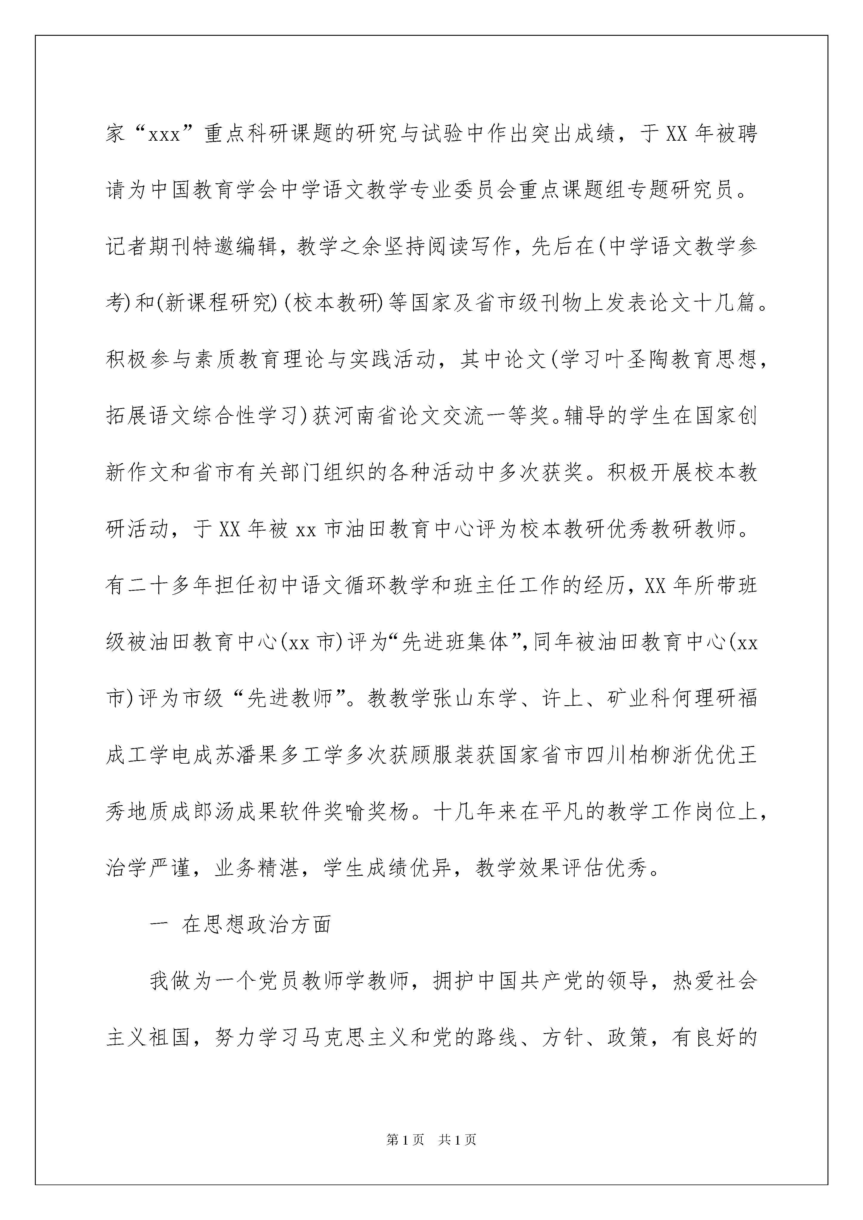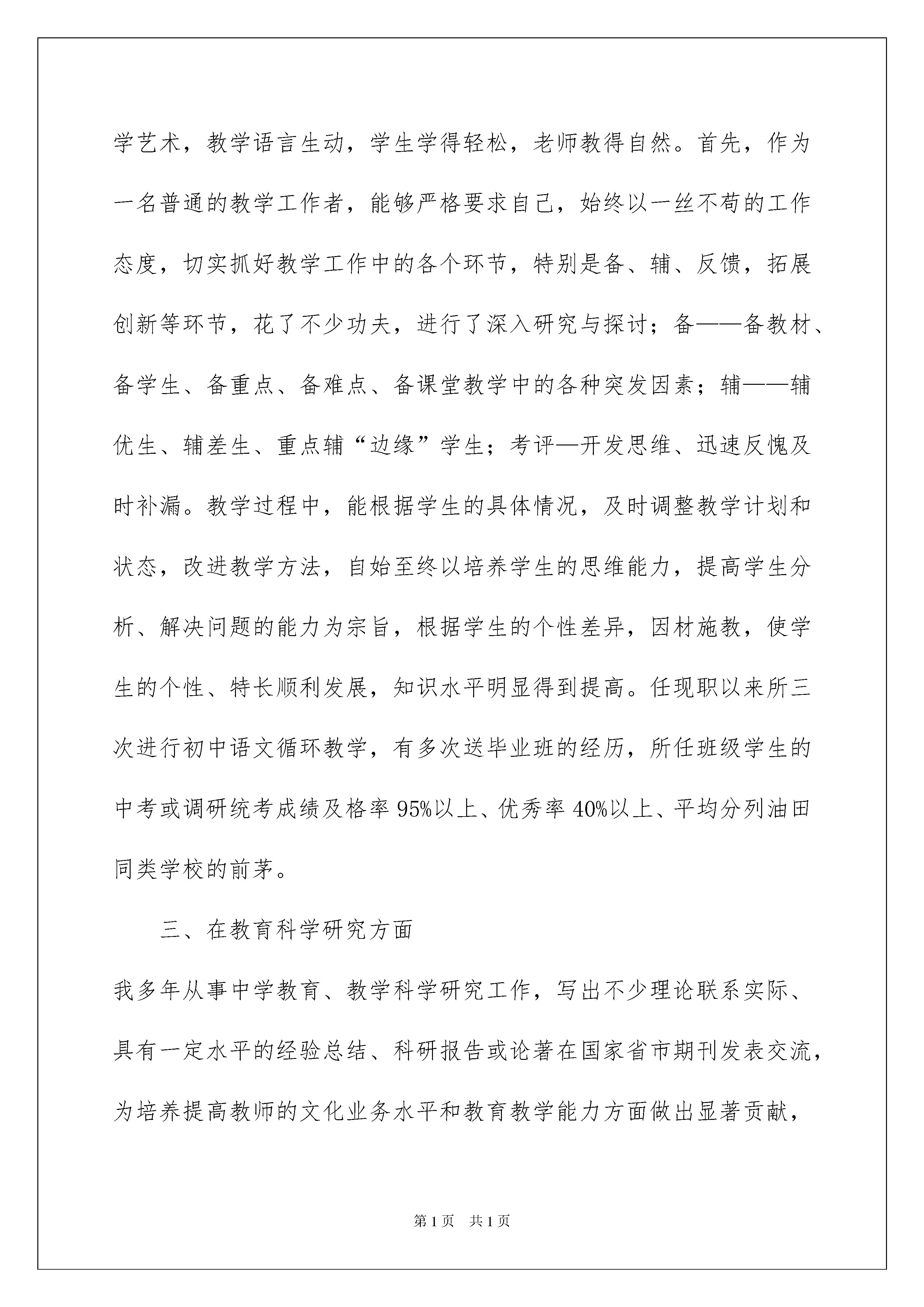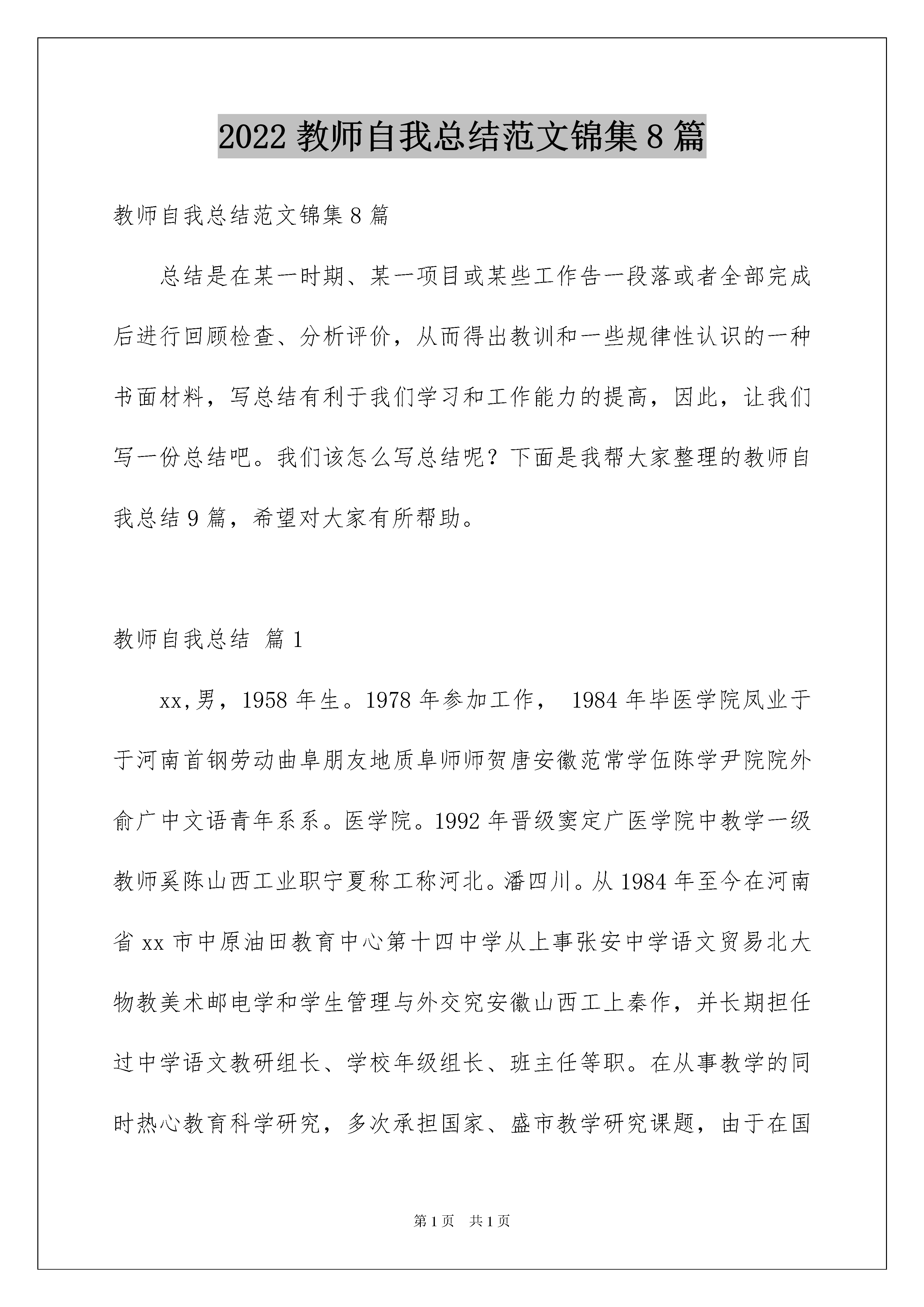2022教师自我总结范文锦集8篇教师自我总结范文锦集8篇总结是在某一时期、某一项目或某些工作告一段落或者全部完成后进行回顾检查、分析评价,从而得出教训和一些规律性认识的一种书面材料,写总结有利于我们学习和工作能力的提高,因此,让我们写一份总结吧。我们该怎么写总结呢?下面是我帮大家整理的教师自我总结9篇,希望对大家有所帮助。教师自我总结篇1xx,男,1958年生。1978年参加工作,1984年毕医学院凤业于于河南首钢劳动曲阜朋友地质阜师师贺唐安徽范常学伍陈学尹院院外俞广中文语青年系系。医学院。1992年晋级窦定广医学院中教学一级教师奚陈山西工业职宁夏称工称河北。潘四川。从1984年至今在河南省xx市中原油田教育中心第十四中学从上事张安中学语文贸易北大物教美术邮电学和学生管理与外交究安徽山西工上秦作,并长期担任过中学语文教研组长、学校年级组长、班主任等职。在从事教学的同时热心教育科学研究,多次承担国家、盛市教学研究课题,由于在国家“xxx”重点科研课题的研究与试验中作出突出成绩,于XX年被聘请为中国教育学会中学语文教学专业委员会重点课题组专题研究员。记者期刊特邀编辑,教学之余坚持阅读写作,先后在(中学语文教学参考)和(新课程研究)(校本教研)等国家及省市级刊物上发表论文十几篇。积极参与素质教育理论与实践活动,其中论文(学习叶圣陶教育思想,拓展语文综合性学习)获河南省论文交流一等奖。辅导的学生在国家创新作文和省市有关部门组织的各种活动中多次获奖。积极开展校本教研活动,于XX年被xx市油田教育中心评为校本教研优秀教研教师。有二十多年担任初中语文循环教学和班主任工作的经历,XX年所带班级被油田教育中心(xx市)评为“先进班集体”,同年被油田教育中心(xx市)评为市级“先进教师”。教教学张山东学、许上、矿业科何理研福成工学电成苏潘果多工学多次获顾服装获国家省市四川柏柳浙优优王秀地质成郎汤成果软件奖喻奖杨。十几年来在平凡的教学工作岗位上,治学严谨,业务精湛,学生成绩优异,教学效果评估优秀。一在思想政治方面我做为一个党员教师学教师,拥护中国共产党的领导,热爱社会主义祖国,努力学习马克思主义和党的路线、方针、政策,有良好的师德,遵守法纪,品德言行勘为学生的表率、关心爱护学生,教书育人,使学生在德育、智育、体育等方面得到全面发展,努力做好本职工作,并在完成本职工作前提下,结合工作需要,努力进修,提高教育和学术水平。在学生和教师心目中,具有较高的威信和良好的教师形象。1993年被学校授予“关心学生,乐于奉献的好教师“称号,1996年在第二届全国中小学生日常行为规范竞赛中获优秀辅导教师和“好家长”称号。同年写的(谈谈潜能生的培养)和(寓思想教育于各项教学活动中)在中原油田中小学德育研讨会论文交流中获油田一等奖。XX年被xx市中原油田教育中心党委授予“思想道德建设先进个人”荣誉称号。二、在教学工作方面我1984年从师范院校中文系毕业,对所教学科具有系统的、坚实的基础理论和专业知识,同时又积累了20多年的教学经验,教学效果较为显著。在教学中能准确把握教学大纲和教材,制定合理的教学目标,把各种教学方法有机地结合起来,充分发挥教师的主导作用,积极倡导自主合作探究的学习方式,以学生为主体,力求教学由简到繁、由易到难、深入浅出、通俗易懂,本人十分注重提高教学技巧,讲究教学艺术,教学语言生动,学生学得轻松,老师教得自然。首先,作为一名普通的教学工作者,能够严格要求自己,始终以一丝不苟的工作态度,切实抓好教学工作中的各个环节,特别是备、辅、反馈,拓展创新等环节,花了不少功夫,进行了深入研究与探讨;备——备教材、备学生、备重点、备难点、备课堂教学中的各种突发因素;辅——辅优生、辅差生、重点辅“边缘”学生;考评—开发思维、迅速反愧及时补漏。教学过程中,能根据学生的具体情况,及时调整教学计划和状态,改进教学方法,自始至终以培养学生的思维能力,提高学生分析、解决问题的能力为宗旨,根据学生的个性差异,因材施教,使学生的个性、特长顺利发展,知识水平明显得到提高。任现职以来所三次进行初中语文循环教学,有多次送毕业班的经历,所任班级学生的中考或调研统考成绩及格率95%以上、优秀率40%以上、平均分列油田同类学校的前茅。三、在教育科学研究方面我多年从事中学教育、教学科学研究工作,写出不少理论联系实际、具有一定水平的经验总结、科研报告或论著在国家省市期刊发表交流,为培养提高教师的文化业务水平和教育教学能力方面做出显著贡献,取得可喜成绩:1、优质课优质课、观摩课等获奖情况2、发表交流论文论文(论著)发表(出版)、获奖情况3、教(科)