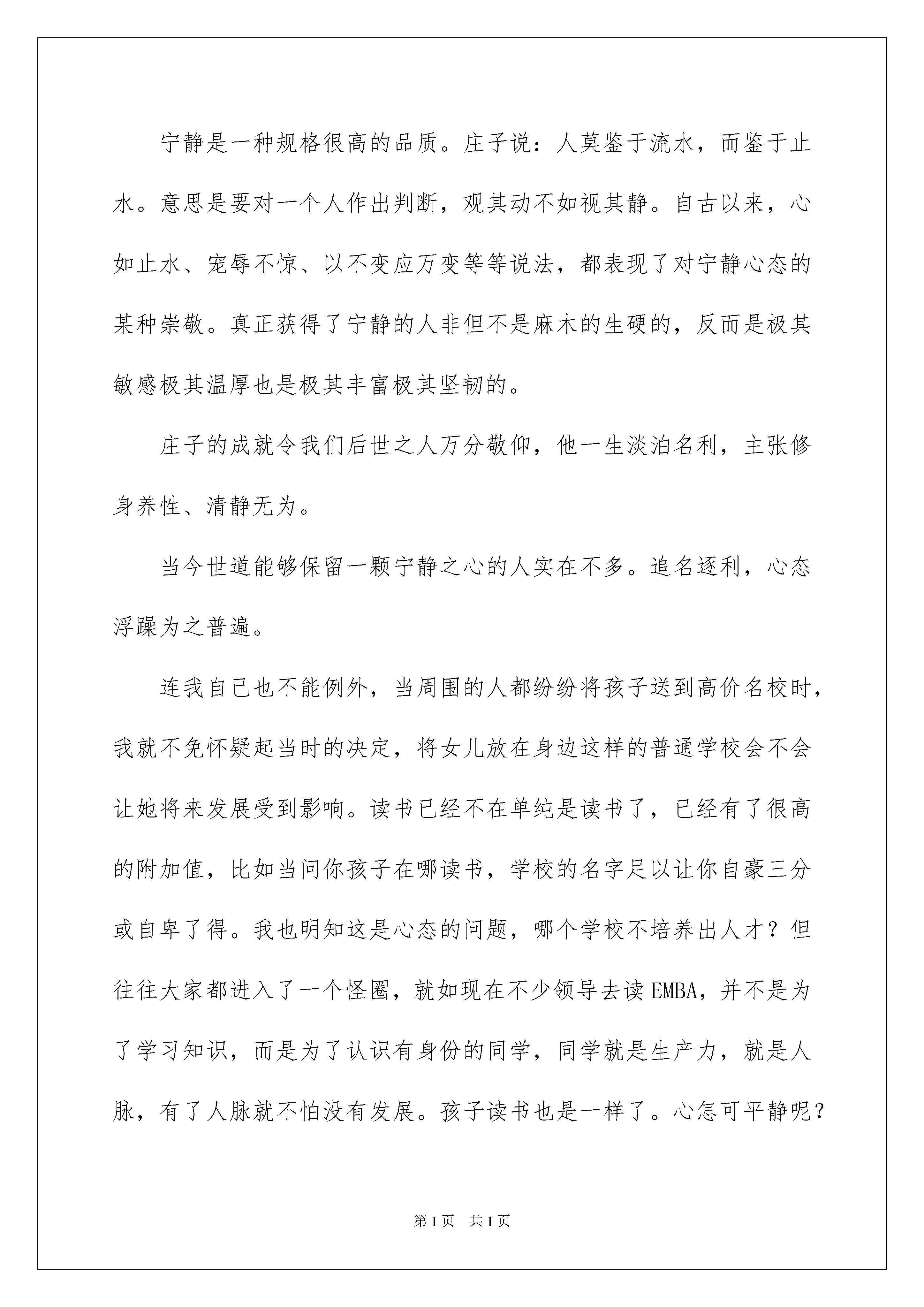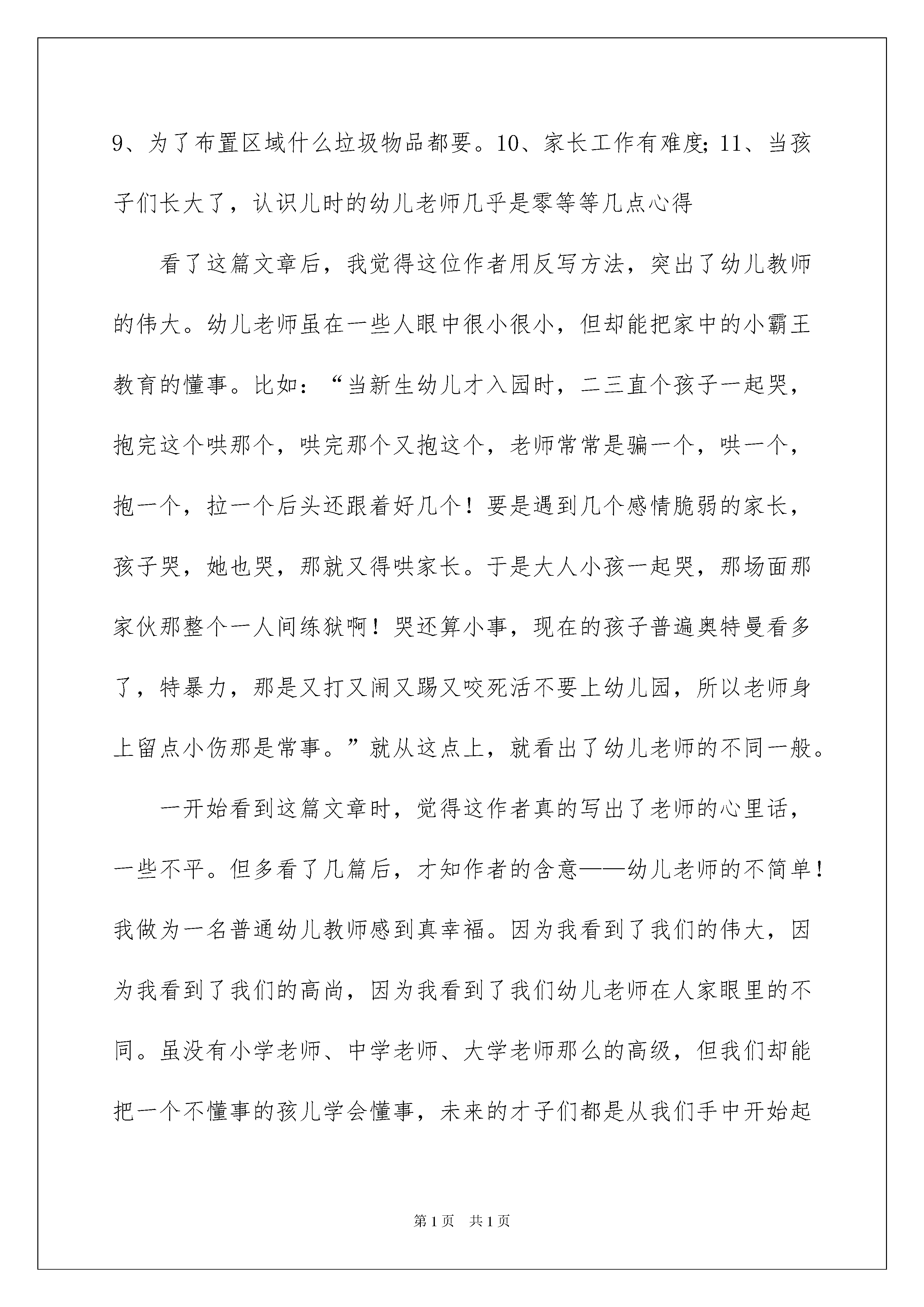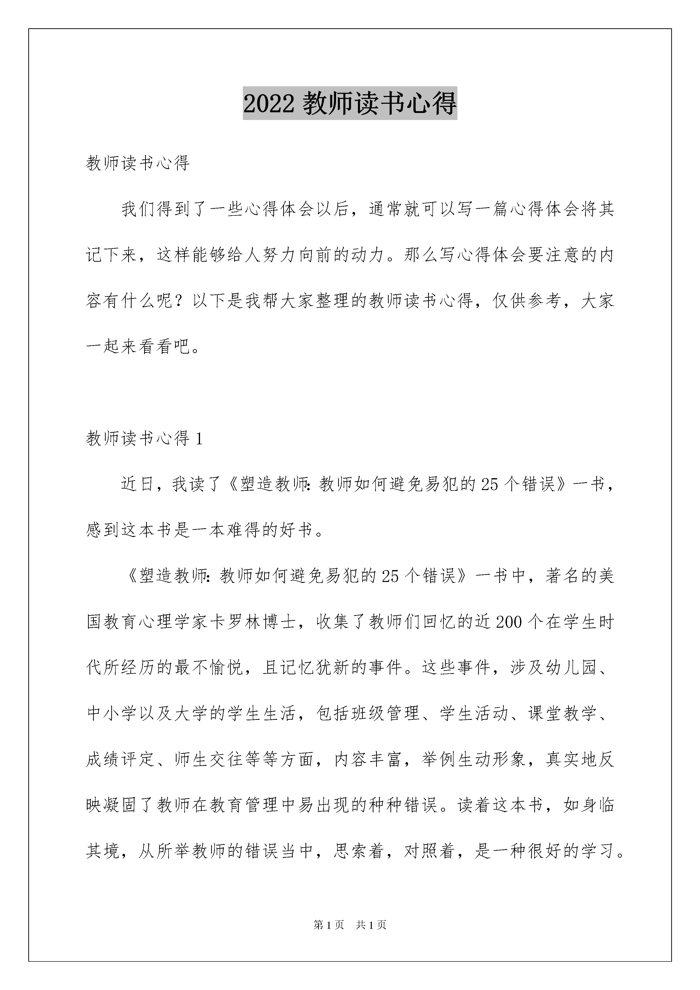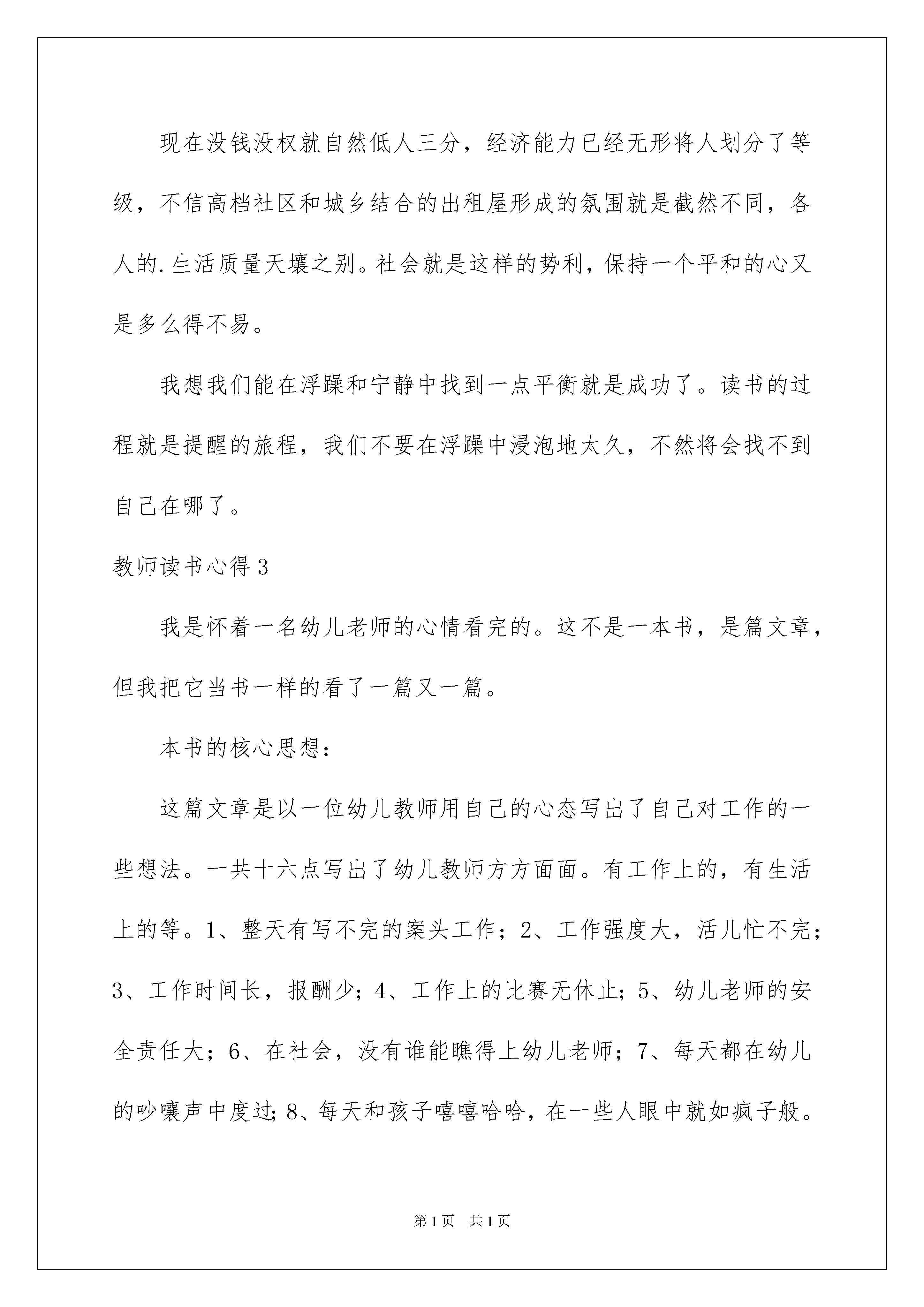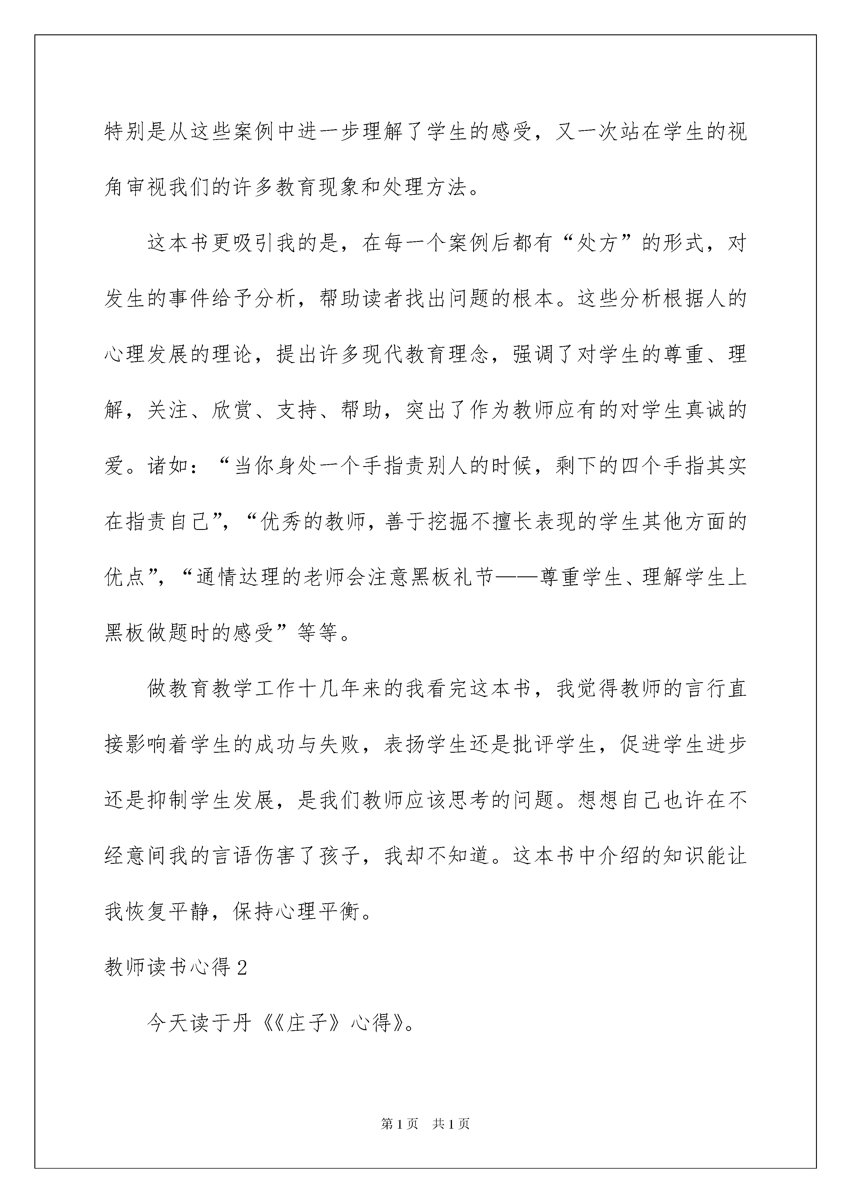 2022教师读书心得教师读书心得我们得到了一些心得体会以后,通常就可以写一篇心得体会将其记下来,这样能够给人努力向前的动力。那么写心得体会要注意的内容有什么呢?以下是我帮大家整理的教师读书心得,仅供参考,大家一起来看看吧。教师读书心得1近日,我读了《塑造教师:教师如何避免易犯的25个错误》一书,感到这本书是一本难得的好书。《塑造教师:教师如何避免易犯的25个错误》一书中,著名的美国教育心理学家卡罗林博士,收集了教师们回忆的近200个在学生时代所经历的最不愉悦,且记忆犹新的事件。这些事件,涉及幼儿园、中小学以及大学的学生生活,包括班级管理、学生活动、课堂教学、成绩评定、师生交往等等方面,内容丰富,举例生动形象,真实地反映凝固了教师在教育管理中易出现的种种错误。读着这本书,如身临其境,从所举教师的错误当中,思索着,对照着,是一种很好的学习。特别是从这些案例中进一步理解了学生的感受,又一次站在学生的视角审视我们的许多教育现象和处理方法。这本书更吸引我的是,在每一个案例后都有“处方”的形式,对发生的事件给予分析,帮助读者找出问题的根本。这些分析根据人的心理发展的理论,提出许多现代教育理念,强调了对学生的尊重、理解,关注、欣赏、支持、帮助,突出了作为教师应有的对学生真诚的爱。诸如:“当你身处一个手指责别人的时候,剩下的四个手指其实在指责自己”,“优秀的教师,善于挖掘不擅长表现的学生其他方面的优点”,“通情达理的老师会注意黑板礼节——尊重学生、理解学生上黑板做题时的感受”等等。做教育教学工作十几年来的我看完这本书,我觉得教师的言行直接影响着学生的成功与失败,表扬学生还是批评学生,促进学生进步还是抑制学生发展,是我们教师应该思考的问题。想想自己也许在不经意间我的言语伤害了孩子,我却不知道。这本书中介绍的知识能让我恢复平静,保持心理平衡。教师读书心得2今天读于丹《《庄子》心得》。宁静是一种规格很高的品质。庄子说:人莫鉴于流水,而鉴于止水。意思是要对一个人作出判断,观其动不如视其静。自古以来,心如止水、宠辱不惊、以不变应万变等等说法,都表现了对宁静心态的某种崇敬。真正获得了宁静的人非但不是麻木的生硬的,反而是极其敏感极其温厚也是极其丰富极其坚韧的。庄子的成就令我们后世之人万分敬仰,他一生淡泊名利,主张修身养性、清静无为。当今世道能够保留一颗宁静之心的人实在不多。追名逐利,心态浮躁为之普遍。连我自己也不能例外,当周围的人都纷纷将孩子送到高价名校时,我就不免怀疑起当时的决定,将女儿放在身边这样的普通学校会不会让她将来发展受到影响。读书已经不在单纯是读书了,已经有了很高的附加值,比如当问你孩子在哪读书,学校的名字足以让你自豪三分或自卑了得。我也明知这是心态的问题,哪个学校不培养出人才?但往往大家都进入了一个怪圈,就如现在不少领导去读EMBA,并不是为了学习知识,而是为了认识有身份的同学,同学就是生产力,就是人脉,有了人脉就不怕没有发展。孩子读书也是一样了。心怎可平静呢?现在没钱没权就自然低人三分,经济能力已经无形将人划分了等级,不信高档社区和城乡结合的出租屋形成的氛围就是截然不同,各人的.生活质量天壤之别。社会就是这样的势利,保持一个平和的心又是多么得不易。我想我们能在浮躁和宁静中找到一点平衡就是成功了。读书的过程就是提醒的旅程,我们不要在浮躁中浸泡地太久,不然将会找不到自己在哪了。教师读书心得3我是怀着一名幼儿老师的心情看完的。这不是一本书,是篇文章,但我把它当书一样的看了一篇又一篇。本书的核心思想:这篇文章是以一位幼儿教师用自己的心态写出了自己对工作的一些想法。一共十六点写出了幼儿教师方方面面。有工作上的,有生活上的等。1、整天有写不完的案头工作;2、工作强度大,活儿忙不完;3、工作时间长,报酬少;4、工作上的比赛无休止;5、幼儿老师的安全责任大;6、在社会,没有谁能瞧得上幼儿老师;7、每天都在幼儿的吵嚷声中度过;8、每天和孩子嘻嘻哈哈,在一些人眼中就如疯子般。9、为了布置区域什么垃圾物品都要。10、家长工作有难度;11、当孩子们长大了,认识儿时的幼儿老师几乎是零等等几点心得看了这篇文章后,我觉得这位作者用反写方法,突出了幼儿教师的伟大。幼儿老师虽在一些人眼中很小很小,但却能把家中的小霸王教育的懂事。比如:“当新生幼儿才入园时,二三直个孩子一起哭,抱完这个哄那个,哄完那个又抱这个,老师常常是骗一个,哄一个,抱一个,拉一个后头还跟着好几个!要是遇到几个感情脆弱的家长,孩子哭,她也哭,那就又得哄家长。于是大人小孩一起哭,那场面那家伙那整个一人间练狱啊!哭还算小事,现在的孩子普遍奥特曼看多了,特暴