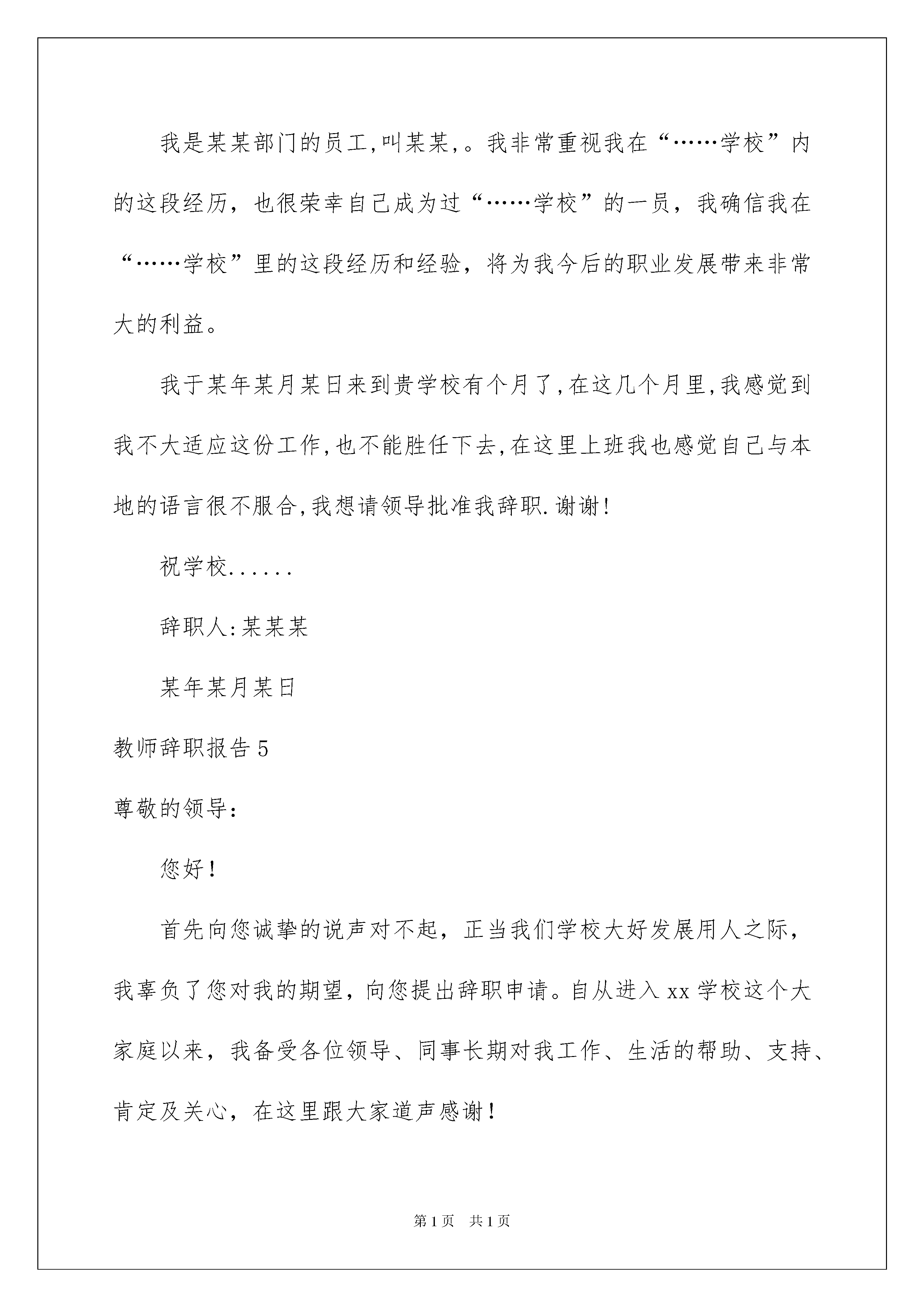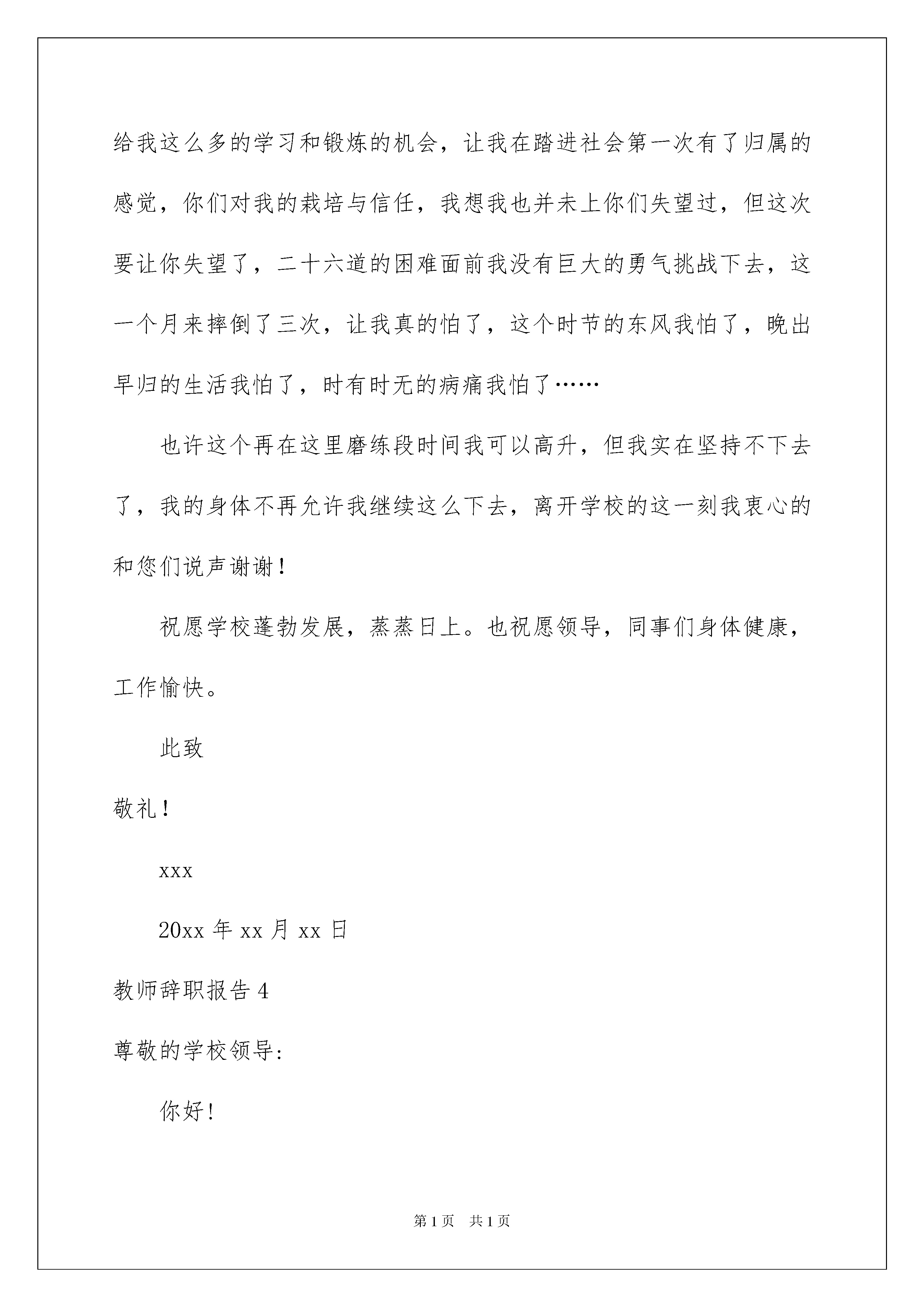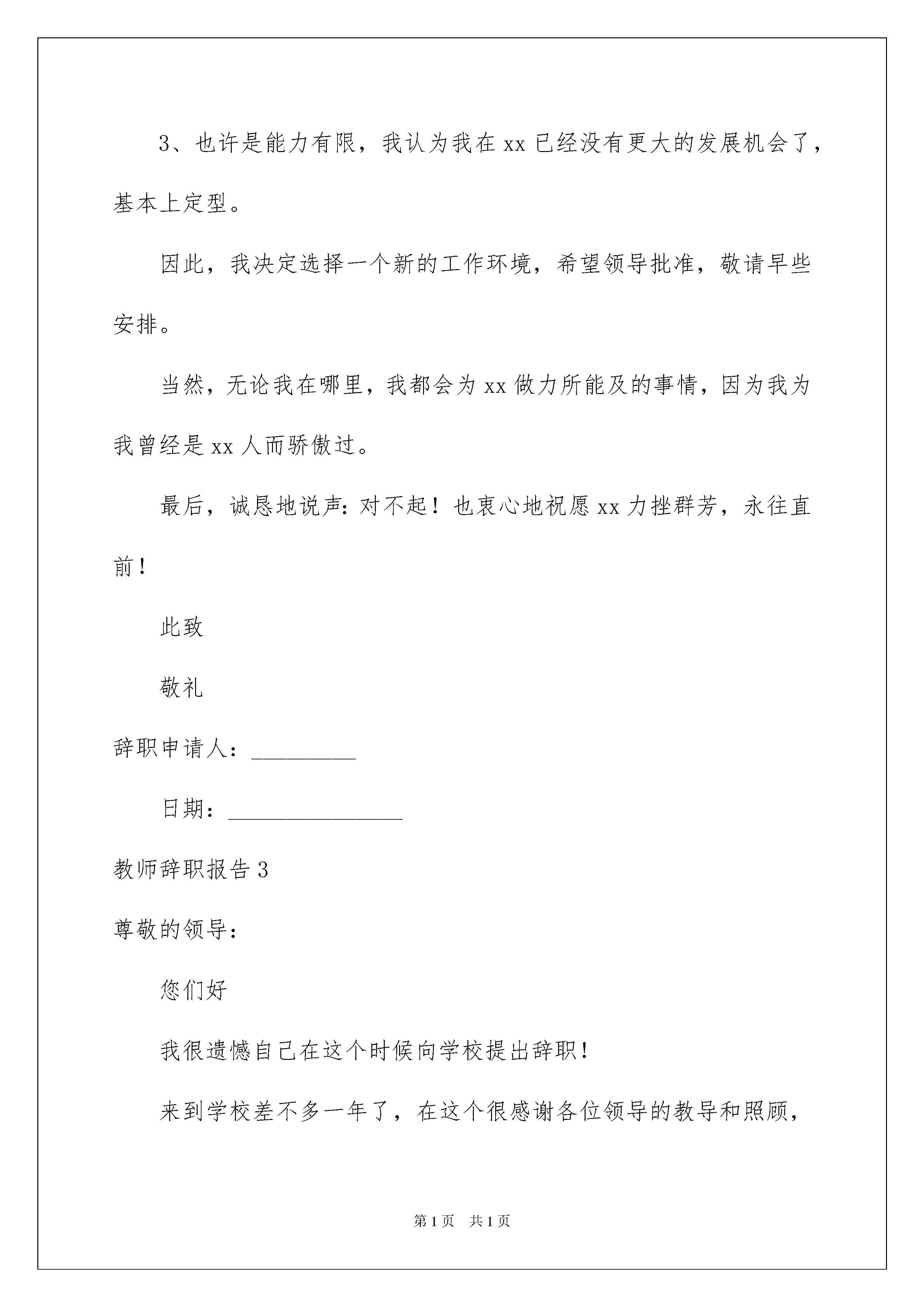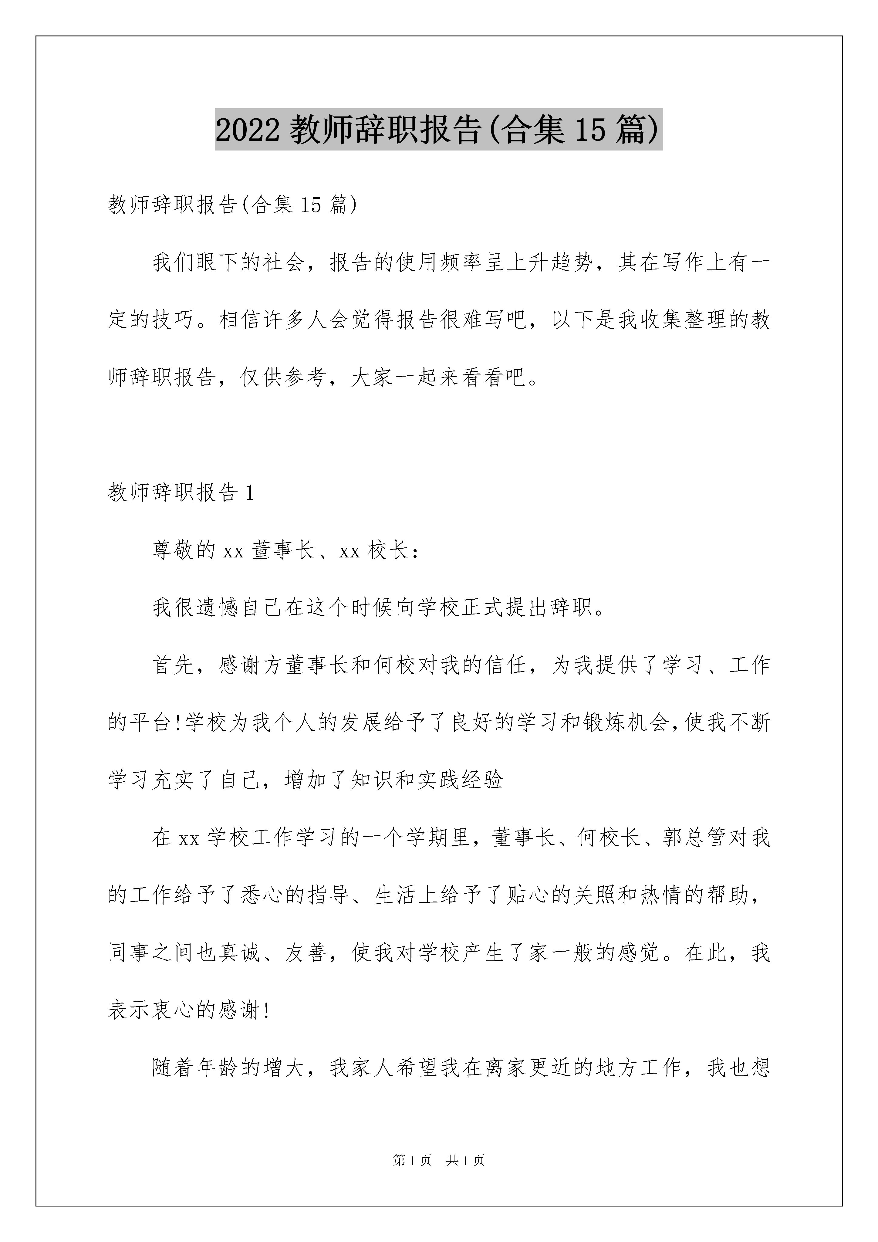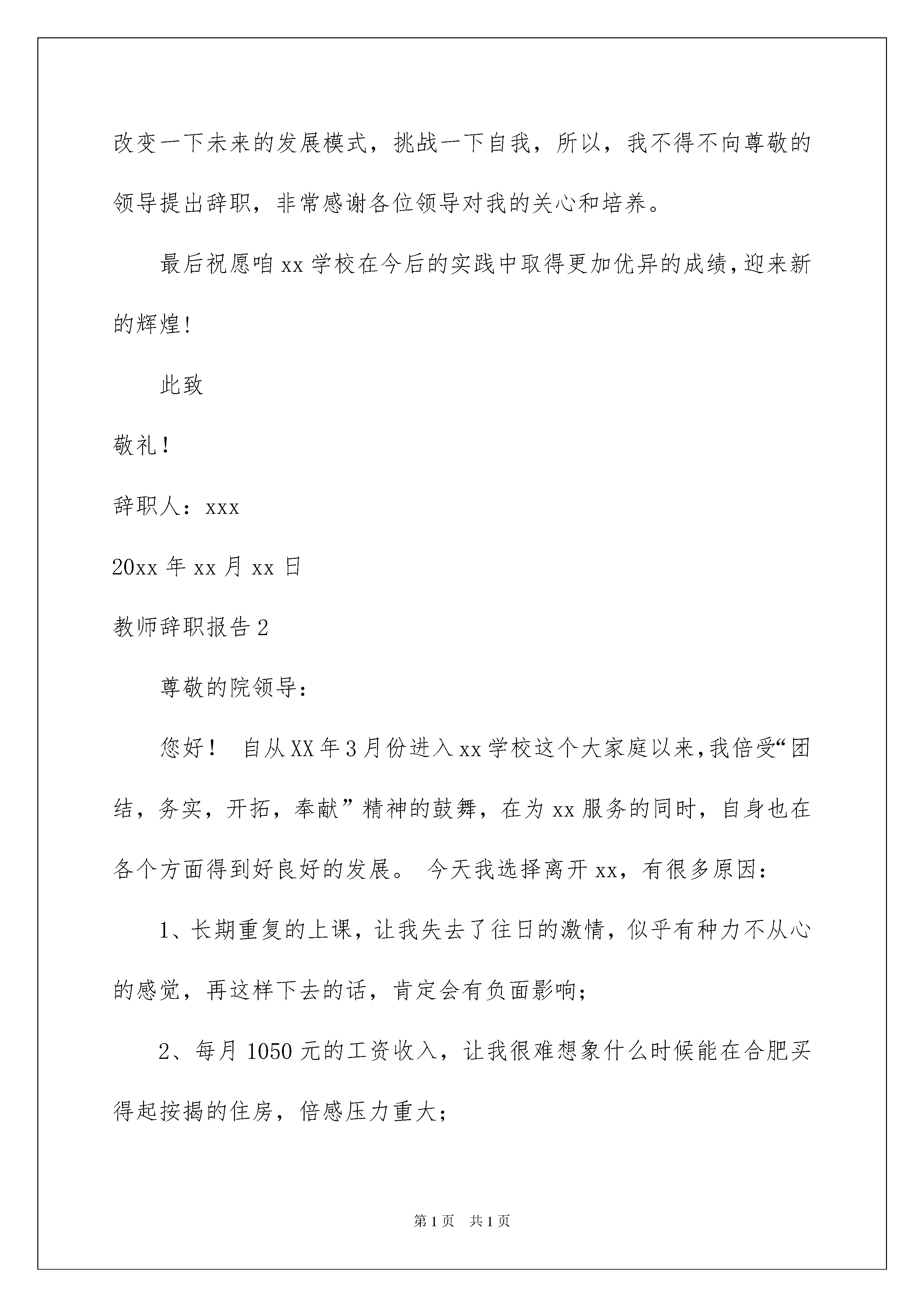 2022教师辞职报告(合集15篇)教师辞职报告(合集15篇)我们眼下的社会,报告的使用频率呈上升趋势,其在写作上有一定的技巧。相信许多人会觉得报告很难写吧,以下是我收集整理的教师辞职报告,仅供参考,大家一起来看看吧。教师辞职报告1尊敬的xx董事长、xx校长:我很遗憾自己在这个时候向学校正式提出辞职。首先,感谢方董事长和何校对我的信任,为我提供了学习、工作的平台!学校为我个人的发展给予了良好的学习和锻炼机会,使我不断学习充实了自己,增加了知识和实践经验在xx学校工作学习的一个学期里,董事长、何校长、郭总管对我的工作给予了悉心的指导、生活上给予了贴心的关照和热情的帮助,同事之间也真诚、友善,使我对学校产生了家一般的感觉。在此,我表示衷心的感谢!随着年龄的增大,我家人希望我在离家更近的地方工作,我也想改变一下未来的发展模式,挑战一下自我,所以,我不得不向尊敬的领导提出辞职,非常感谢各位领导对我的关心和培养。最后祝愿咱xx学校在今后的实践中取得更加优异的成绩,迎来新的辉煌!此致敬礼!辞职人:xxx20xx年xx月xx日教师辞职报告2尊敬的院领导:您好!自从XX年3月份进入xx学校这个大家庭以来,我倍受“团结,务实,开拓,奉献”精神的鼓舞,在为xx服务的同时,自身也在各个方面得到好良好的发展。今天我选择离开xx,有很多原因:1、长期重复的上课,让我失去了往日的激情,似乎有种力不从心的感觉,再这样下去的话,肯定会有负面影响;2、每月1050元的工资收入,让我很难想象什么时候能在合肥买得起按揭的住房,倍感压力重大;3、也许是能力有限,我认为我在xx已经没有更大的发展机会了,基本上定型。因此,我决定选择一个新的工作环境,希望领导批准,敬请早些安排。当然,无论我在哪里,我都会为xx做力所能及的事情,因为我为我曾经是xx人而骄傲过。最后,诚恳地说声:对不起!也衷心地祝愿xx力挫群芳,永往直前!此致敬礼辞职申请人:_________日期:_______________教师辞职报告3尊敬的领导:您们好我很遗憾自己在这个时候向学校提出辞职!来到学校差不多一年了,在这个很感谢各位领导的教导和照顾,给我这么多的学习和锻炼的机会,让我在踏进社会第一次有了归属的感觉,你们对我的栽培与信任,我想我也并未上你们失望过,但这次要让你失望了,二十六道的困难面前我没有巨大的勇气挑战下去,这一个月来摔倒了三次,让我真的怕了,这个时节的东风我怕了,晚出早归的生活我怕了,时有时无的病痛我怕了……也许这个再在这里磨练段时间我可以高升,但我实在坚持不下去了,我的身体不再允许我继续这么下去,离开学校的这一刻我衷心的和您们说声谢谢!祝愿学校蓬勃发展,蒸蒸日上。也祝愿领导,同事们身体健康,工作愉快。此致敬礼!xxx20xx年xx月xx日教师辞职报告4尊敬的学校领导:你好!我是某某部门的员工,叫某某,。我非常重视我在“……学校”内的这段经历,也很荣幸自己成为过“……学校”的一员,我确信我在“……学校”里的这段经历和经验,将为我今后的职业发展带来非常大的利益。我于某年某月某日来到贵学校有个月了,在这几个月里,我感觉到我不大适应这份工作,也不能胜任下去,在这里上班我也感觉自己与本地的语言很不服合,我想请领导批准我辞职.谢谢!祝学校......辞职人:某某某某年某月某日教师辞职报告5尊敬的领导:您好!首先向您诚挚的说声对不起,正当我们学校大好发展用人之际,我辜负了您对我的期望,向您提出辞职申请。自从进入xx学校这个大家庭以来,我备受各位领导、同事长期对我工作、生活的帮助、支持、肯定及关心,在这里跟大家道声感谢!这几个月来我在为xx学校服务的同时,自身也在各个方面得到良好的发展。正值xx学校迎来大好发展的今天,我选择离开xx学校,我内心也有很多留恋与不舍,之所以我选择离开xx学校,原因有很多。离家太远,不能照顾父母,父母也很不放心。这里到我家有xxxx公里,离家很远,父母都很不放心,想让我在家乡的学校教书。其次,我也是家里的长子,父母年龄也大了,有些重要的事情或选择都需要我来做,家里的大事也差不多要我来处理了,我在家乡工作就会方便很多。对这边的工作生活方式有些不适应,出现问题较多。初次来xx,对这边的许多方面都不怎么适应,阻力较多。对这边学生的学习方式和学习能力不能很好的把握,我的课堂教学情况没有达到学校和自己的预期目标,这点很是惭愧。家乡那边的学校的学生毕竟还是了解一些,语言等习惯都能相互适应和接受,自己也想在家乡那边有个安定的工作,这符合我自身的意愿,也是父母希望的。没有达到自己期望的薪资待遇。说到薪资,这的确是不好说的,一分耕耘一分收