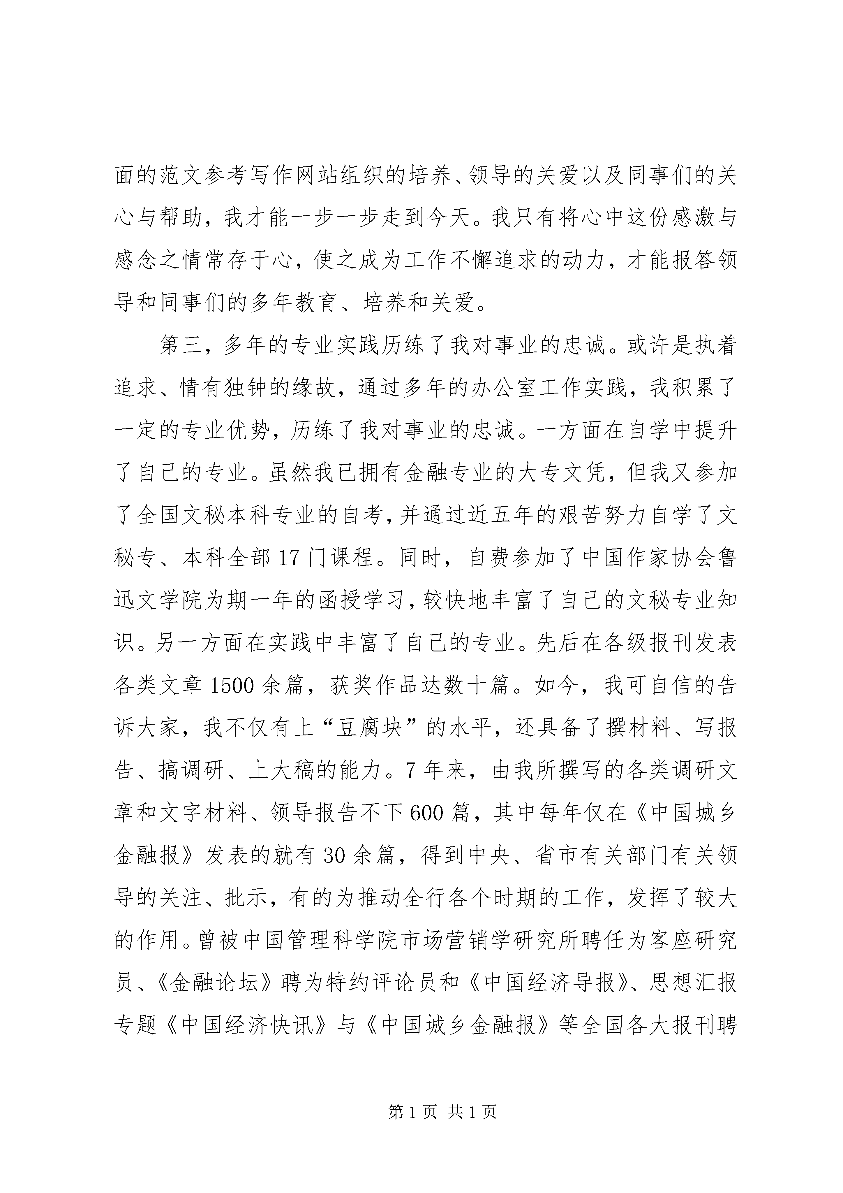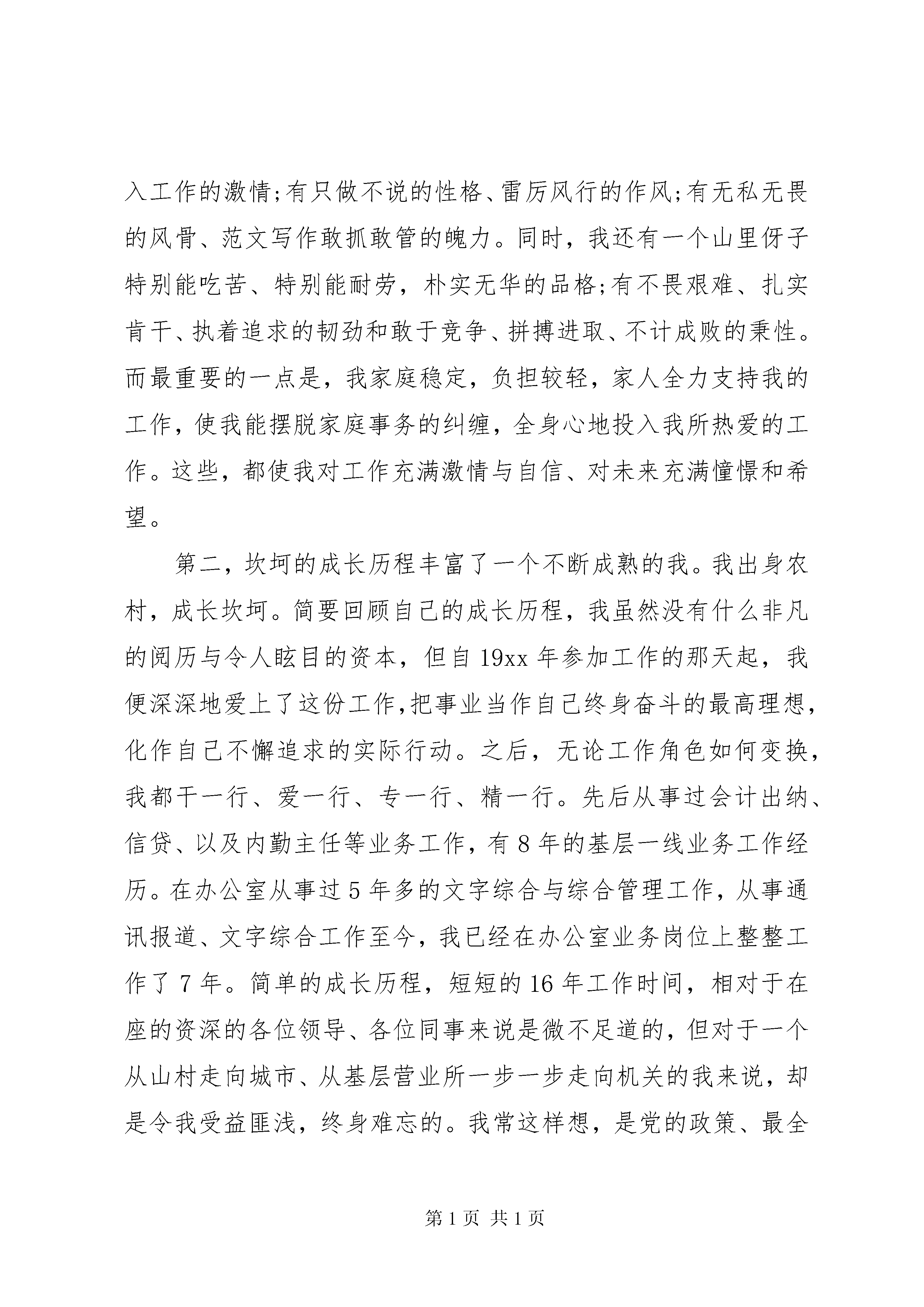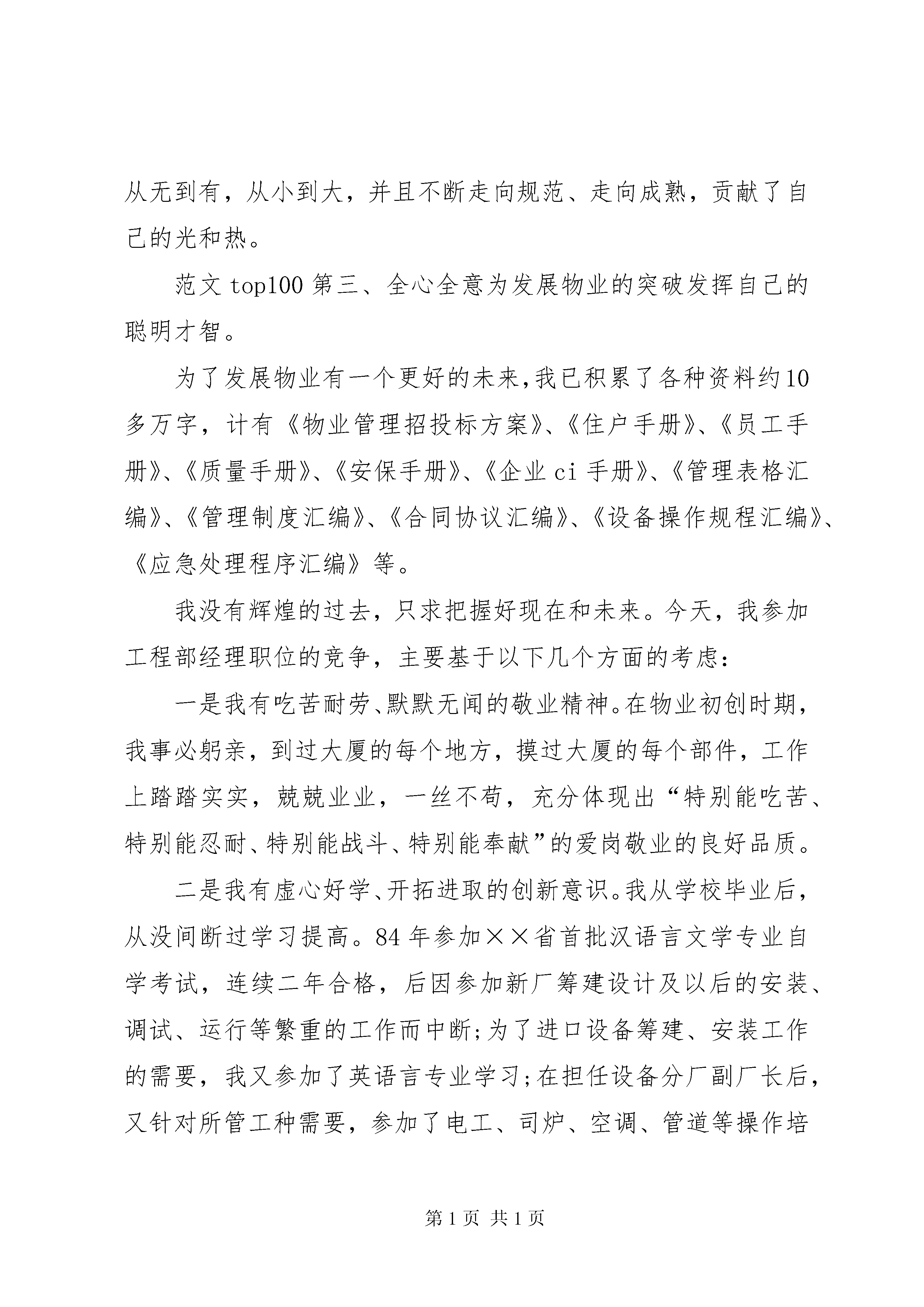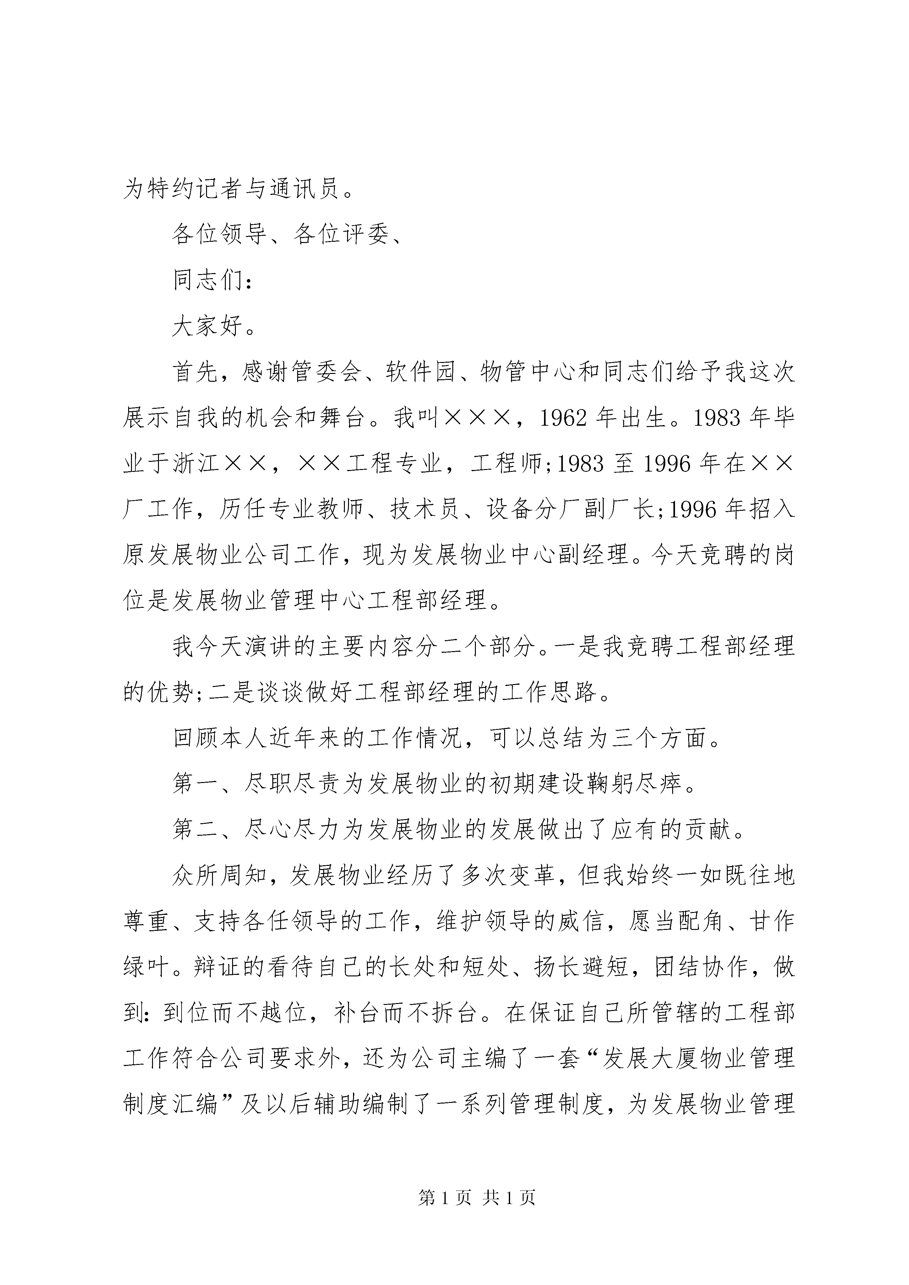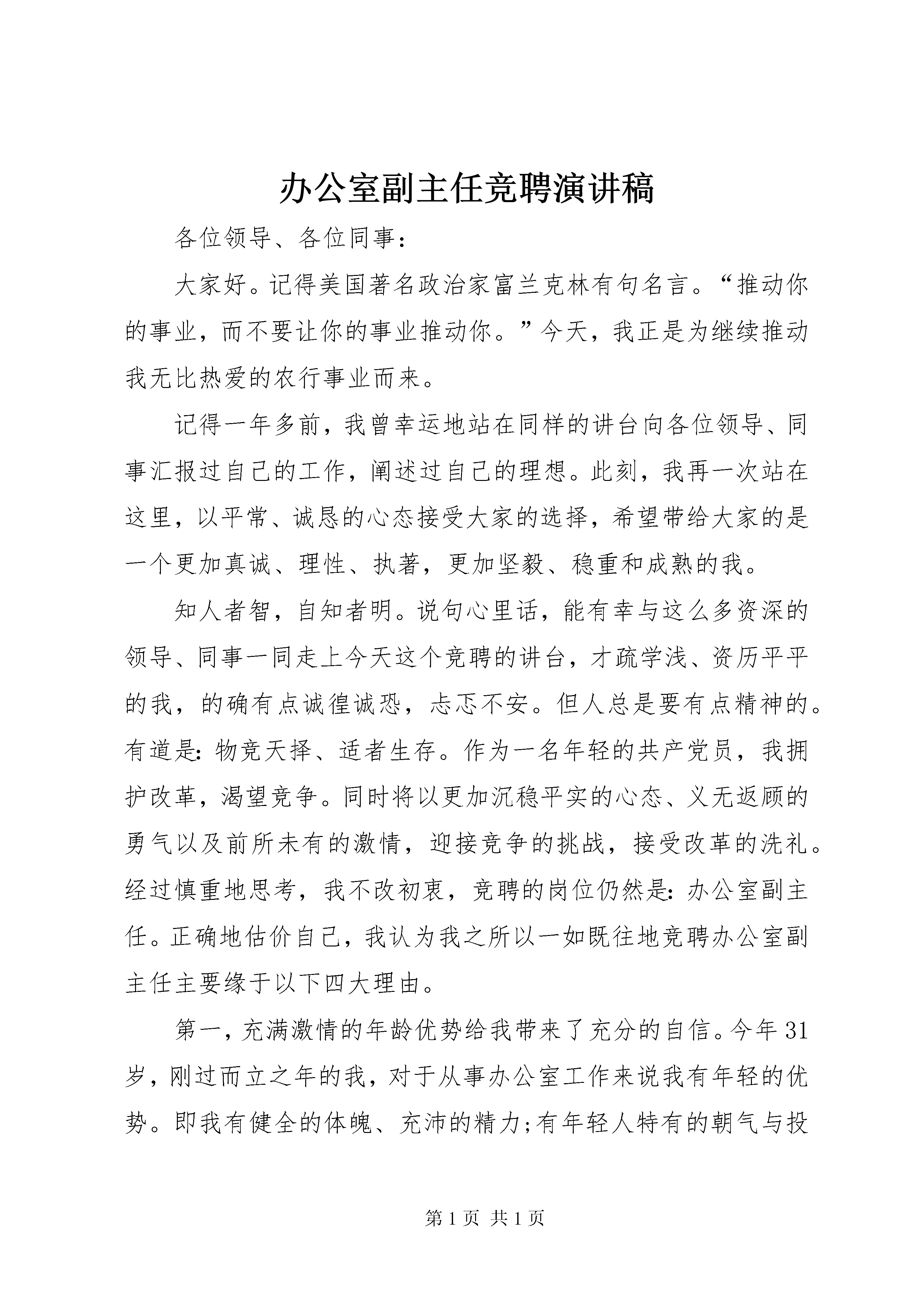 办公室副主任竞聘演讲稿各位领导、各位同事:大家好。记得美国著名政治家富兰克林有句名言。“推动你的事业,而不要让你的事业推动你。”今天,我正是为继续推动我无比热爱的农行事业而来。记得一年多前,我曾幸运地站在同样的讲台向各位领导、同事汇报过自己的工作,阐述过自己的理想。此刻,我再一次站在这里,以平常、诚恳的心态接受大家的选择,希望带给大家的是一个更加真诚、理性、执著,更加坚毅、稳重和成熟的我。知人者智,自知者明。说句心里话,能有幸与这么多资深的领导、同事一同走上今天这个竞聘的讲台,才疏学浅、资历平平的我,的确有点诚徨诚恐,忐忑不安。但人总是要有点精神的。有道是:物竞天择、适者生存。作为一名年轻的共产党员,我拥护改革,渴望竞争。同时将以更加沉稳平实的心态、义无返顾的勇气以及前所未有的激情,迎接竞争的挑战,接受改革的洗礼。经过慎重地思考,我不改初衷,竞聘的岗位仍然是:办公室副主任。正确地估价自己,我认为我之所以一如既往地竞聘办公室副主任主要缘于以下四大理由。第一,充满激情的年龄优势给我带来了充分的自信。今年31岁,刚过而立之年的我,对于从事办公室工作来说我有年轻的优势。即我有健全的体魄、充沛的精力;有年轻人特有的朝气与投入工作的激情;有只做不说的性格、雷厉风行的作风;有无私无畏的风骨、范文写作敢抓敢管的魄力。同时,我还有一个山里伢子特别能吃苦、特别能耐劳,朴实无华的品格;有不畏艰难、扎实肯干、执着追求的韧劲和敢于竞争、拼搏进取、不计成败的秉性。而最重要的一点是,我家庭稳定,负担较轻,家人全力支持我的工作,使我能摆脱家庭事务的纠缠,全身心地投入我所热爱的工作。这些,都使我对工作充满激情与自信、对未来充满憧憬和希望。第二,坎坷的成长历程丰富了一个不断成熟的我。我出身农村,成长坎坷。简要回顾自己的成长历程,我虽然没有什么非凡的阅历与令人眩目的资本,但自19xx年参加工作的那天起,我便深深地爱上了这份工作,把事业当作自己终身奋斗的最高理想,化作自己不懈追求的实际行动。之后,无论工作角色如何变换,我都干一行、爱一行、专一行、精一行。先后从事过会计出纳、信贷、以及内勤主任等业务工作,有8年的基层一线业务工作经历。在办公室从事过5年多的文字综合与综合管理工作,从事通讯报道、文字综合工作至今,我已经在办公室业务岗位上整整工作了7年。简单的成长历程,短短的16年工作时间,相对于在座的资深的各位领导、各位同事来说是微不足道的,但对于一个从山村走向城市、从基层营业所一步一步走向机关的我来说,却是令我受益匪浅,终身难忘的。我常这样想,是党的政策、最全面的范文参考写作网站组织的培养、领导的关爱以及同事们的关心与帮助,我才能一步一步走到今天。我只有将心中这份感激与感念之情常存于心,使之成为工作不懈追求的动力,才能报答领导和同事们的多年教育、培养和关爱。第三,多年的专业实践历练了我对事业的忠诚。或许是执着追求、情有独钟的缘故,通过多年的办公室工作实践,我积累了一定的专业优势,历练了我对事业的忠诚。一方面在自学中提升了自己的专业。虽然我已拥有金融专业的大专文凭,但我又参加了全国文秘本科专业的自考,并通过近五年的艰苦努力自学了文秘专、本科全部17门课程。同时,自费参加了中国作家协会鲁迅文学院为期一年的函授学习,较快地丰富了自己的文秘专业知识。另一方面在实践中丰富了自己的专业。先后在各级报刊发表各类文章1500余篇,获奖作品达数十篇。如今,我可自信的告诉大家,我不仅有上“豆腐块”的水平,还具备了撰材料、写报告、搞调研、上大稿的能力。7年来,由我所撰写的各类调研文章和文字材料、领导报告不下600篇,其中每年仅在《中国城乡金融报》发表的就有30余篇,得到中央、省市有关部门有关领导的关注、批示,有的为推动全行各个时期的工作,发挥了较大的作用。曾被中国管理科学院市场营销学研究所聘任为客座研究员、《金融论坛》聘为特约评论员和《中国经济导报》、思想汇报专题《中国经济快讯》与《中国城乡金融报》等全国各大报刊聘为特约记者与通讯员。各位领导、各位评委、同志们:大家好。首先,感谢管委会、软件园、物管中心和同志们给予我这次展示自我的机会和舞台。我叫×××,1962年出生。1983年毕业于浙江××,××工程专业,工程师;1983至1996年在××厂工作,历任专业教师、技术员、设备分厂副厂长;1996年招入原发展物业公司工作,现为发展物业中心副经理。今天竞聘的岗位是发展物业管理中心工程部经理。我今天演讲的主要内容分二个部分。一是我竞聘工程部经理的优势;二是谈谈做好工程部经理的工作思路。回顾本人近年来的工作情况,可以总结为三个方面。第一、尽职尽责为发展物业的初期建设鞠躬尽瘁。第二、尽心尽力为发展物业的发展做出了应有的贡献。众所周知,发展物业经历了多次变革,但我始终一如既往