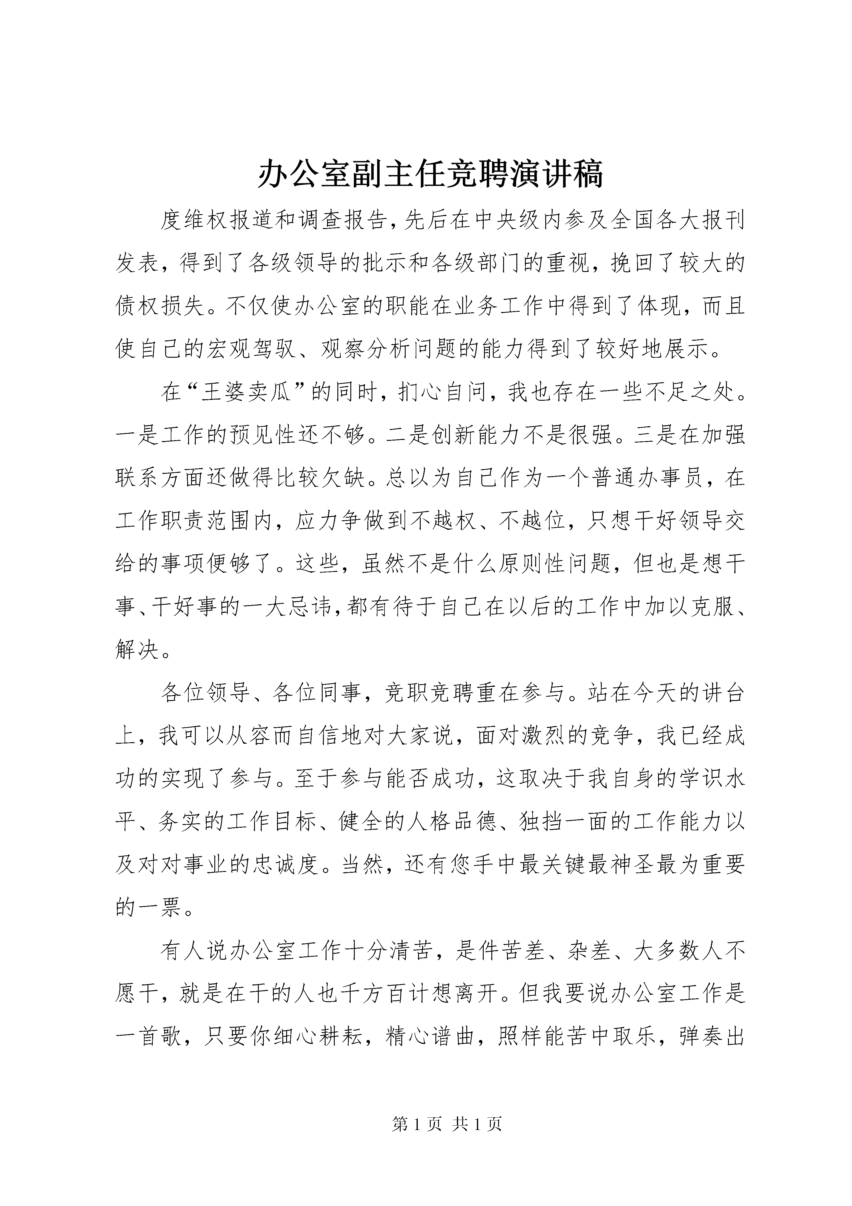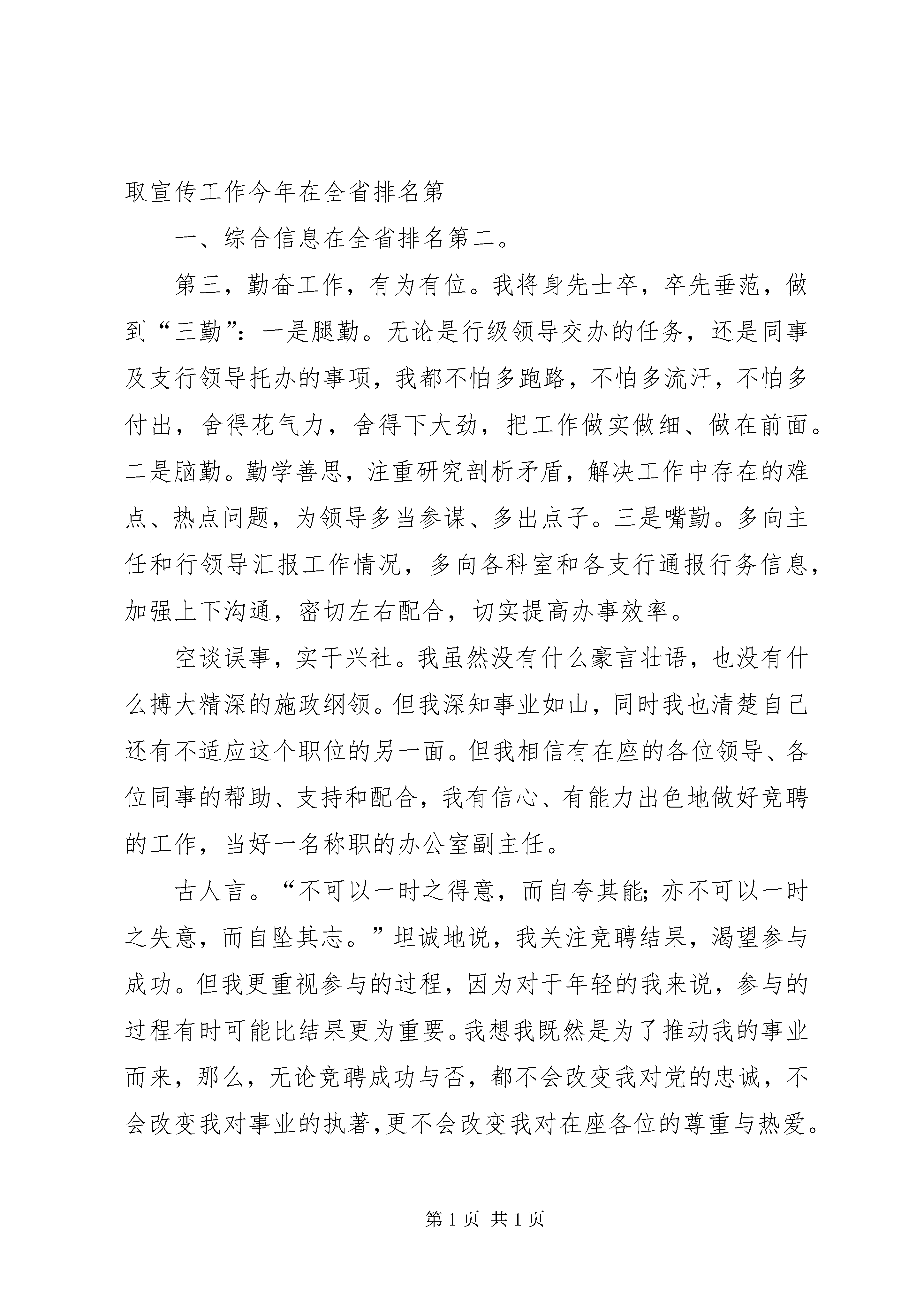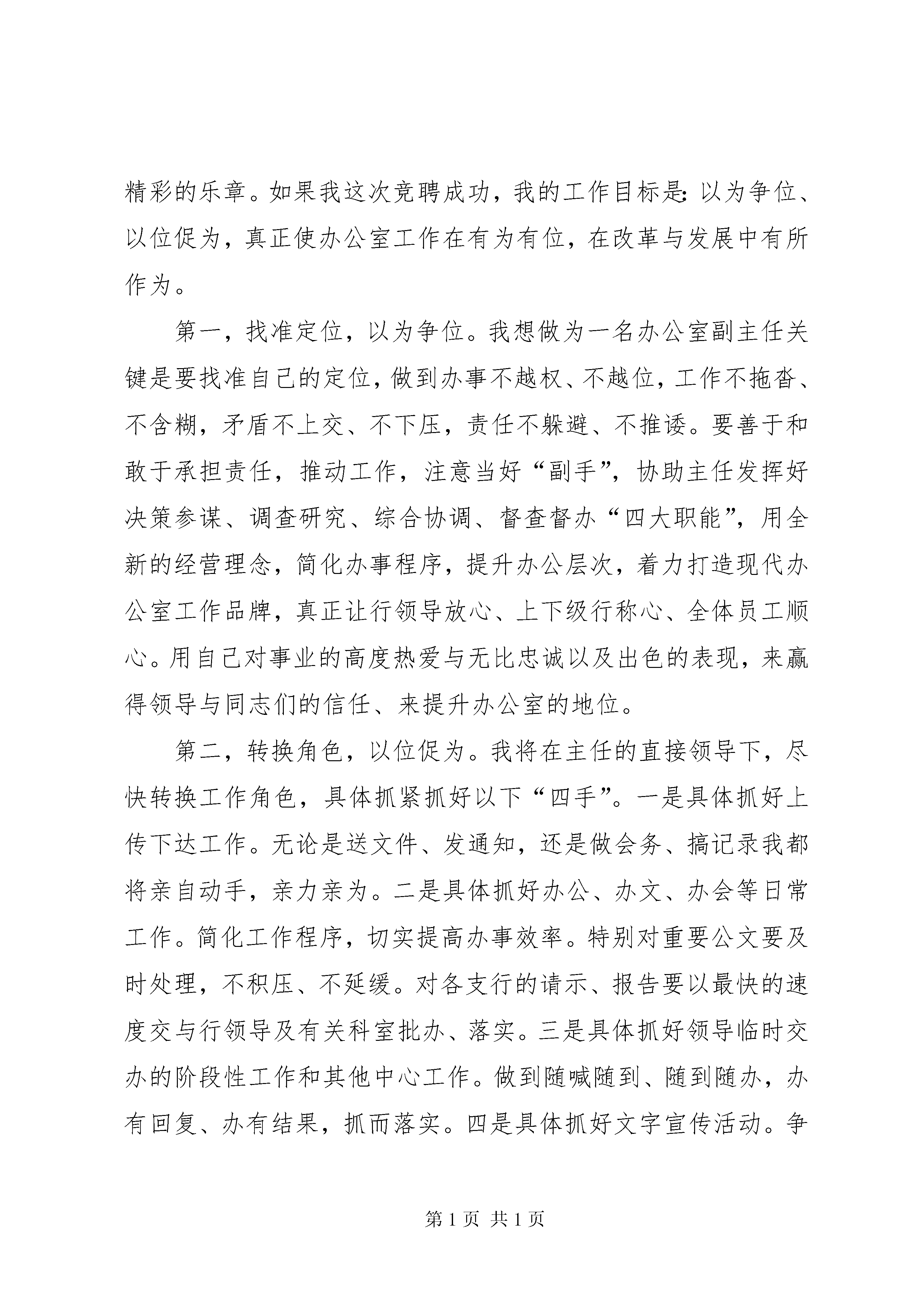 办公室副主任竞聘演讲稿度维权报道和调查报告,先后在中央级内参及全国各大报刊发表,得到了各级领导的批示和各级部门的重视,挽回了较大的债权损失。不仅使办公室的职能在业务工作中得到了体现,而且使自己的宏观驾驭、观察分析问题的能力得到了较好地展示。在“王婆卖瓜”的同时,扪心自问,我也存在一些不足之处。一是工作的预见性还不够。二是创新能力不是很强。三是在加强联系方面还做得比较欠缺。总以为自己作为一个普通办事员,在工作职责范围内,应力争做到不越权、不越位,只想干好领导交给的事项便够了。这些,虽然不是什么原则性问题,但也是想干事、干好事的一大忌讳,都有待于自己在以后的工作中加以克服、解决。各位领导、各位同事,竞职竞聘重在参与。站在今天的讲台上,我可以从容而自信地对大家说,面对激烈的竞争,我已经成功的实现了参与。至于参与能否成功,这取决于我自身的学识水平、务实的工作目标、健全的人格品德、独挡一面的工作能力以及对对事业的忠诚度。当然,还有您手中最关键最神圣最为重要的一票。有人说办公室工作十分清苦,是件苦差、杂差、大多数人不愿干,就是在干的人也千方百计想离开。但我要说办公室工作是一首歌,只要你细心耕耘,精心谱曲,照样能苦中取乐,弹奏出精彩的乐章。如果我这次竞聘成功,我的工作目标是:以为争位、以位促为,真正使办公室工作在有为有位,在改革与发展中有所作为。第一,找准定位,以为争位。我想做为一名办公室副主任关键是要找准自己的定位,做到办事不越权、不越位,工作不拖沓、不含糊,矛盾不上交、不下压,责任不躲避、不推诿。要善于和敢于承担责任,推动工作,注意当好“副手”,协助主任发挥好决策参谋、调查研究、综合协调、督查督办“四大职能”,用全新的经营理念,简化办事程序,提升办公层次,着力打造现代办公室工作品牌,真正让行领导放心、上下级行称心、全体员工顺心。用自己对事业的高度热爱与无比忠诚以及出色的表现,来赢得领导与同志们的信任、来提升办公室的地位。第二,转换角色,以位促为。我将在主任的直接领导下,尽快转换工作角色,具体抓紧抓好以下“四手”。一是具体抓好上传下达工作。无论是送文件、发通知,还是做会务、搞记录我都将亲自动手,亲力亲为。二是具体抓好办公、办文、办会等日常工作。简化工作程序,切实提高办事效率。特别对重要公文要及时处理,不积压、不延缓。对各支行的请示、报告要以最快的速度交与行领导及有关科室批办、落实。三是具体抓好领导临时交办的阶段性工作和其他中心工作。做到随喊随到、随到随办,办有回复、办有结果,抓而落实。四是具体抓好文字宣传活动。争取宣传工作今年在全省排名第一、综合信息在全省排名第二。第三,勤奋工作,有为有位。我将身先士卒,卒先垂范,做到“三勤”:一是腿勤。无论是行级领导交办的任务,还是同事及支行领导托办的事项,我都不怕多跑路,不怕多流汗,不怕多付出,舍得花气力,舍得下大劲,把工作做实做细、做在前面。二是脑勤。勤学善思,注重研究剖析矛盾,解决工作中存在的难点、热点问题,为领导多当参谋、多出点子。三是嘴勤。多向主任和行领导汇报工作情况,多向各科室和各支行通报行务信息,加强上下沟通,密切左右配合,切实提高办事效率。空谈误事,实干兴社。我虽然没有什么豪言壮语,也没有什么搏大精深的施政纲领。但我深知事业如山,同时我也清楚自己还有不适应这个职位的另一面。但我相信有在座的各位领导、各位同事的帮助、支持和配合,我有信心、有能力出色地做好竞聘的工作,当好一名称职的办公室副主任。古人言。“不可以一时之得意,而自夸其能;亦不可以一时之失意,而自坠其志。”坦诚地说,我关注竞聘结果,渴望参与成功。但我更重视参与的过程,因为对于年轻的我来说,参与的过程有时可能比结果更为重要。我想我既然是为了推动我的事业而来,那么,无论竞聘成功与否,都不会改变我对党的忠诚,不会改变我对事业的执著,更不会改变我对在座各位的尊重与热爱。总之,无论怎样,我都会用同样年轻的心态,直面挑战,笑对人生。给我一次机会,我将还您十分精彩。这就是我永恒不变的信念和这次竞聘的诺言。
