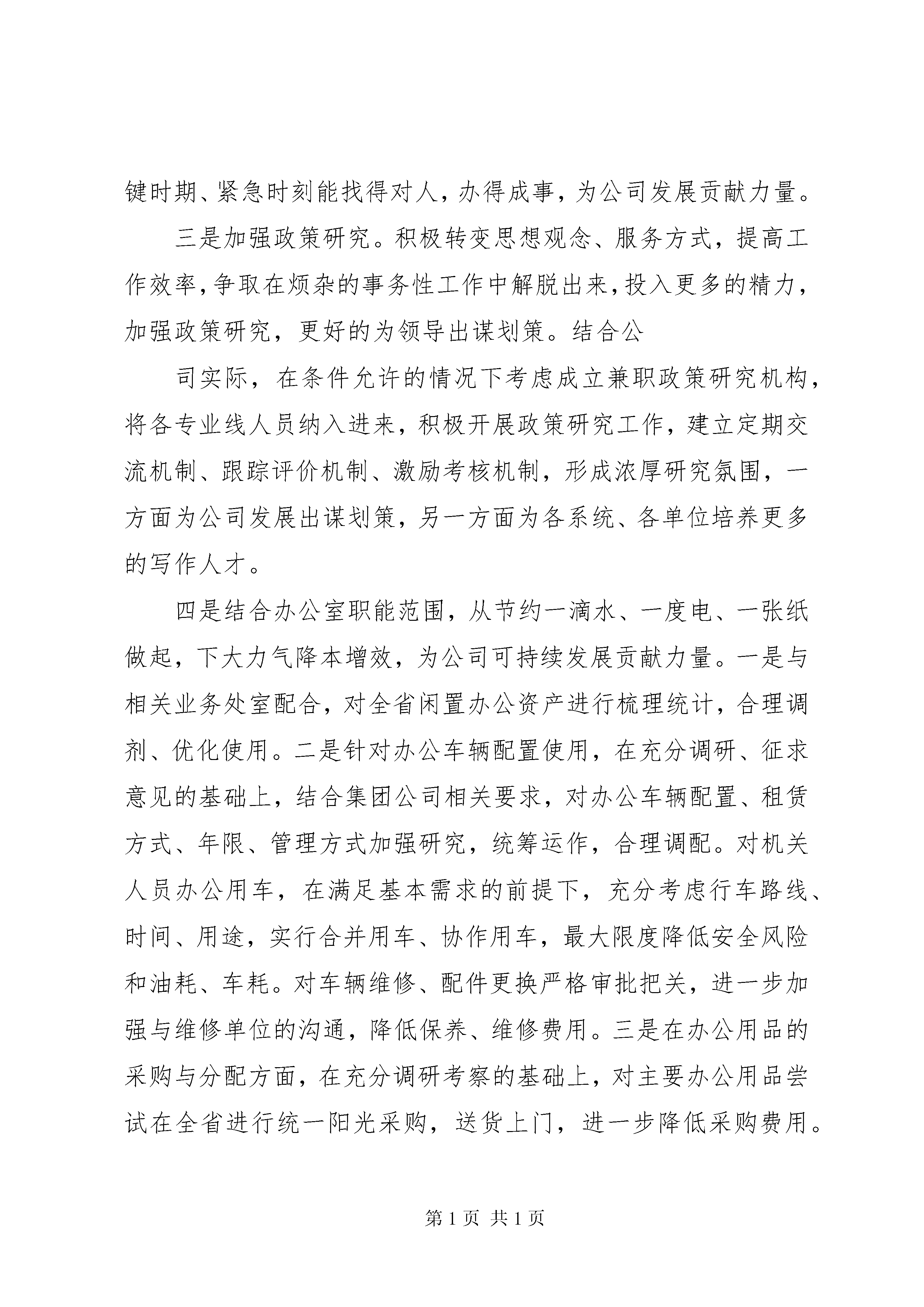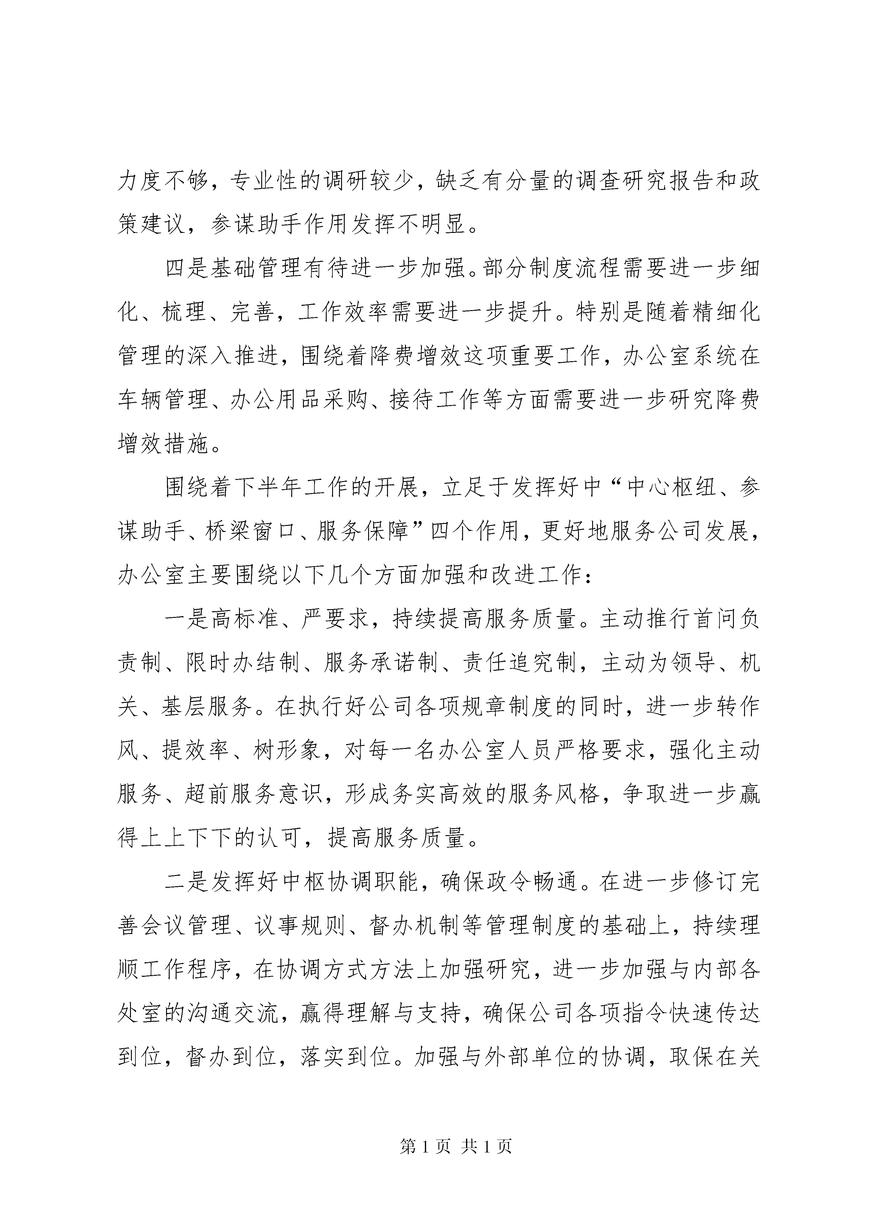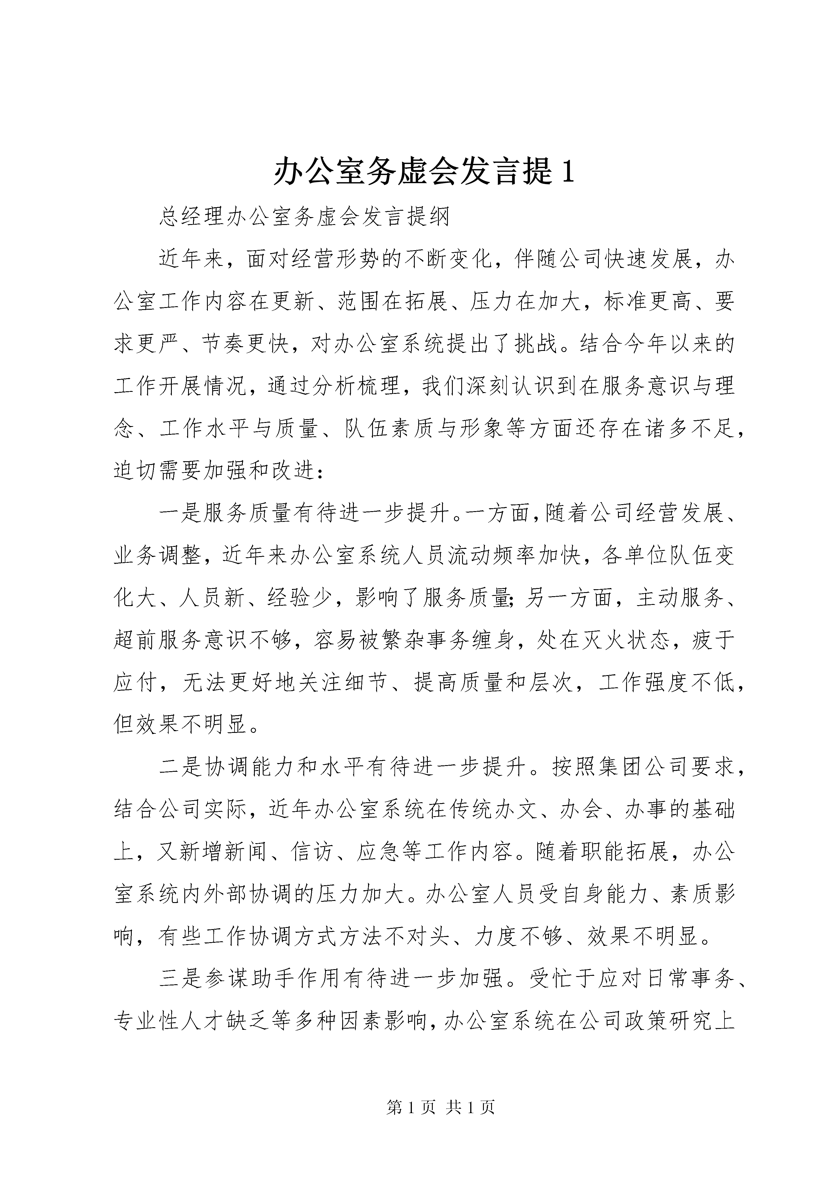 办公室务虚会发言提1总经理办公室务虚会发言提纲近年来,面对经营形势的不断变化,伴随公司快速发展,办公室工作内容在更新、范围在拓展、压力在加大,标准更高、要求更严、节奏更快,对办公室系统提出了挑战。结合今年以来的工作开展情况,通过分析梳理,我们深刻认识到在服务意识与理念、工作水平与质量、队伍素质与形象等方面还存在诸多不足,迫切需要加强和改进:一是服务质量有待进一步提升。一方面,随着公司经营发展、业务调整,近年来办公室系统人员流动频率加快,各单位队伍变化大、人员新、经验少,影响了服务质量;另一方面,主动服务、超前服务意识不够,容易被繁杂事务缠身,处在灭火状态,疲于应付,无法更好地关注细节、提高质量和层次,工作强度不低,但效果不明显。二是协调能力和水平有待进一步提升。按照集团公司要求,结合公司实际,近年办公室系统在传统办文、办会、办事的基础上,又新增新闻、信访、应急等工作内容。随着职能拓展,办公室系统内外部协调的压力加大。办公室人员受自身能力、素质影响,有些工作协调方式方法不对头、力度不够、效果不明显。三是参谋助手作用有待进一步加强。受忙于应对日常事务、专业性人才缺乏等多种因素影响,办公室系统在公司政策研究上力度不够,专业性的调研较少,缺乏有分量的调查研究报告和政策建议,参谋助手作用发挥不明显。四是基础管理有待进一步加强。部分制度流程需要进一步细化、梳理、完善,工作效率需要进一步提升。特别是随着精细化管理的深入推进,围绕着降费增效这项重要工作,办公室系统在车辆管理、办公用品采购、接待工作等方面需要进一步研究降费增效措施。围绕着下半年工作的开展,立足于发挥好中“中心枢纽、参谋助手、桥梁窗口、服务保障”四个作用,更好地服务公司发展,办公室主要围绕以下几个方面加强和改进工作:一是高标准、严要求,持续提高服务质量。主动推行首问负责制、限时办结制、服务承诺制、责任追究制,主动为领导、机关、基层服务。在执行好公司各项规章制度的同时,进一步转作风、提效率、树形象,对每一名办公室人员严格要求,强化主动服务、超前服务意识,形成务实高效的服务风格,争取进一步赢得上上下下的认可,提高服务质量。二是发挥好中枢协调职能,确保政令畅通。在进一步修订完善会议管理、议事规则、督办机制等管理制度的基础上,持续理顺工作程序,在协调方式方法上加强研究,进一步加强与内部各处室的沟通交流,赢得理解与支持,确保公司各项指令快速传达到位,督办到位,落实到位。加强与外部单位的协调,取保在关键时期、紧急时刻能找得对人,办得成事,为公司发展贡献力量。三是加强政策研究。积极转变思想观念、服务方式,提高工作效率,争取在烦杂的事务性工作中解脱出来,投入更多的精力,加强政策研究,更好的为领导出谋划策。结合公司实际,在条件允许的情况下考虑成立兼职政策研究机构,将各专业线人员纳入进来,积极开展政策研究工作,建立定期交流机制、跟踪评价机制、激励考核机制,形成浓厚研究氛围,一方面为公司发展出谋划策,另一方面为各系统、各单位培养更多的写作人才。四是结合办公室职能范围,从节约一滴水、一度电、一张纸做起,下大力气降本增效,为公司可持续发展贡献力量。一是与相关业务处室配合,对全省闲置办公资产进行梳理统计,合理调剂、优化使用。二是针对办公车辆配置使用,在充分调研、征求意见的基础上,结合集团公司相关要求,对办公车辆配置、租赁方式、年限、管理方式加强研究,统筹运作,合理调配。对机关人员办公用车,在满足基本需求的前提下,充分考虑行车路线、时间、用途,实行合并用车、协作用车,最大限度降低安全风险和油耗、车耗。对车辆维修、配件更换严格审批把关,进一步加强与维修单位的沟通,降低保养、维修费用。三是在办公用品的采购与分配方面,在充分调研考察的基础上,对主要办公用品尝试在全省进行统一阳光采购,送货上门,进一步降低采购费用。继续实行定额管理,根据使用情况,对各处室办公用品配备标准进一步梳理。对部分办公用品考虑进行回收处理、循环使用。四是针对接待工作,继续加强与协议酒店、餐饮场所的沟通,探索通过与旅行社等单位合作,尝试进行外包服务,进一步降低费用,提高效率。