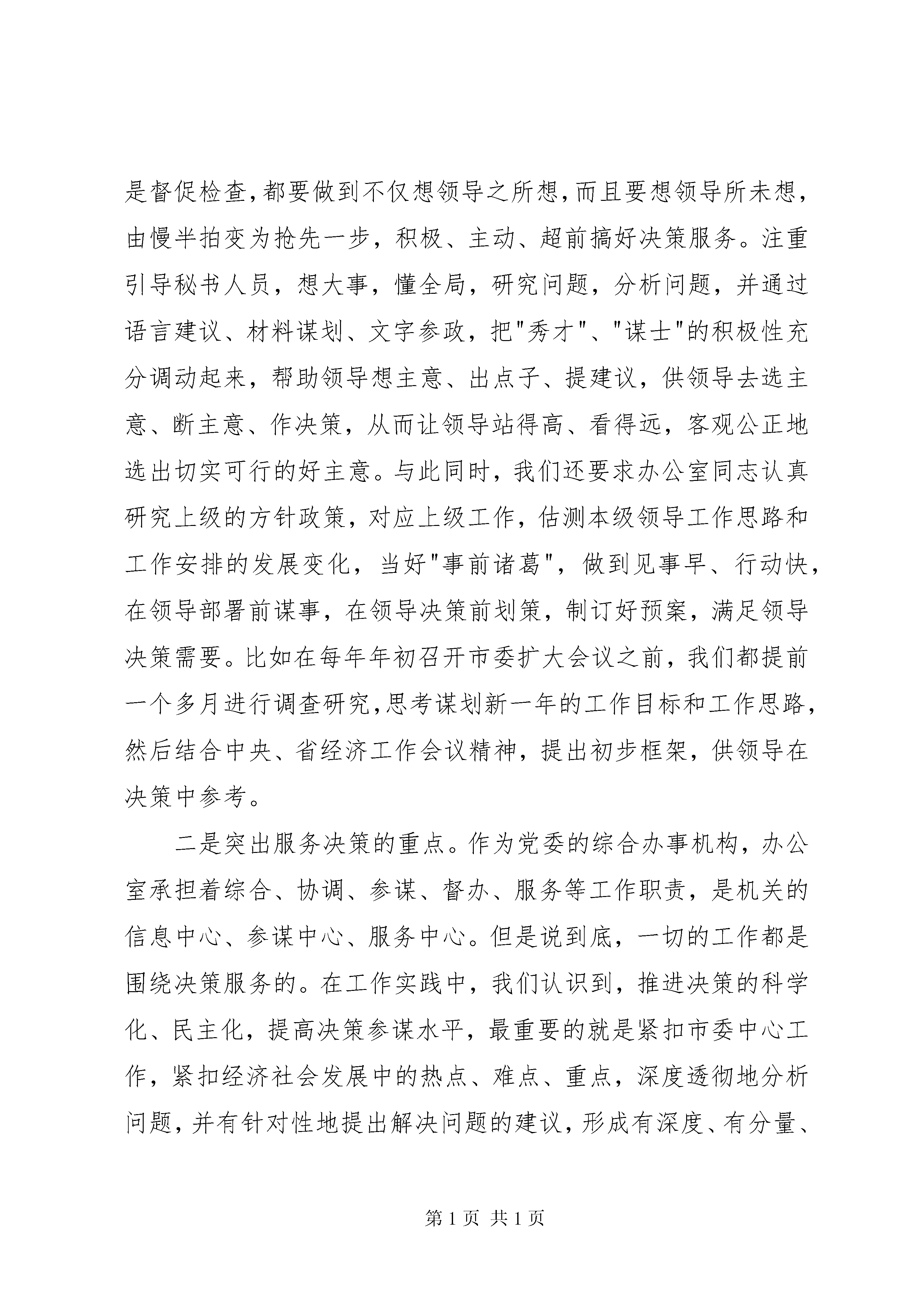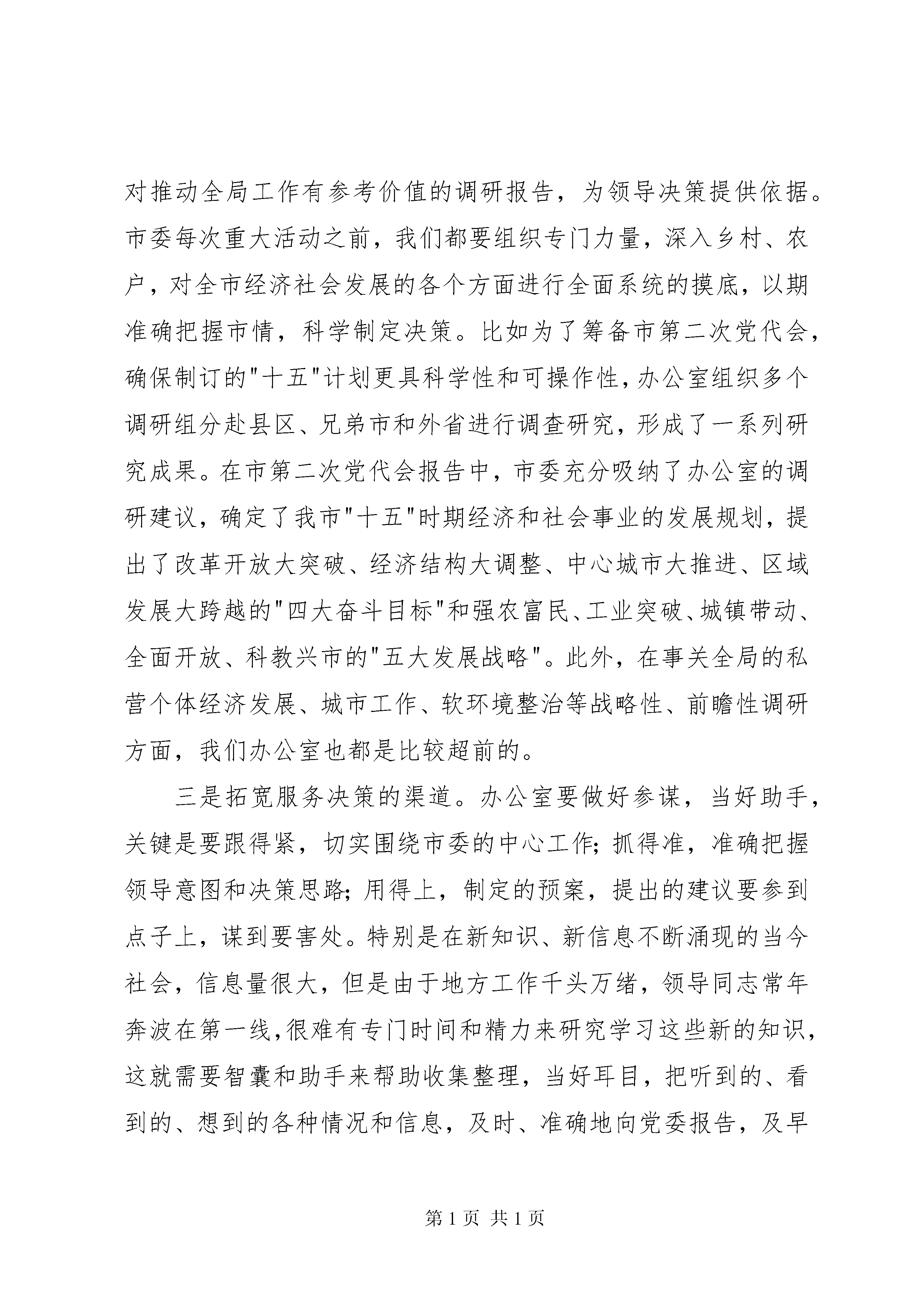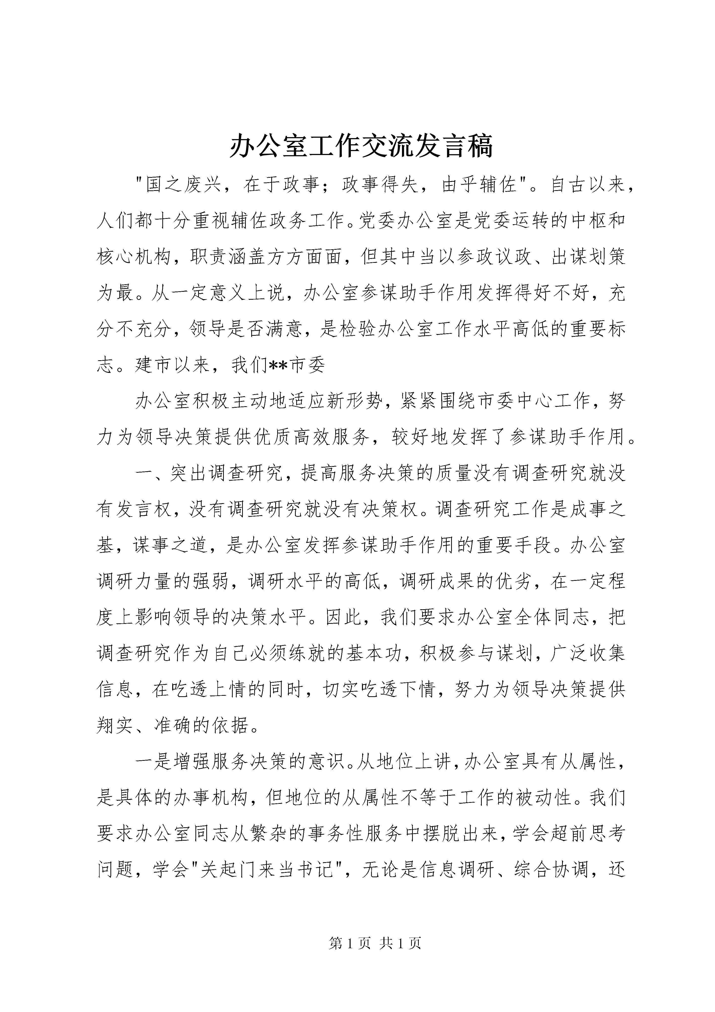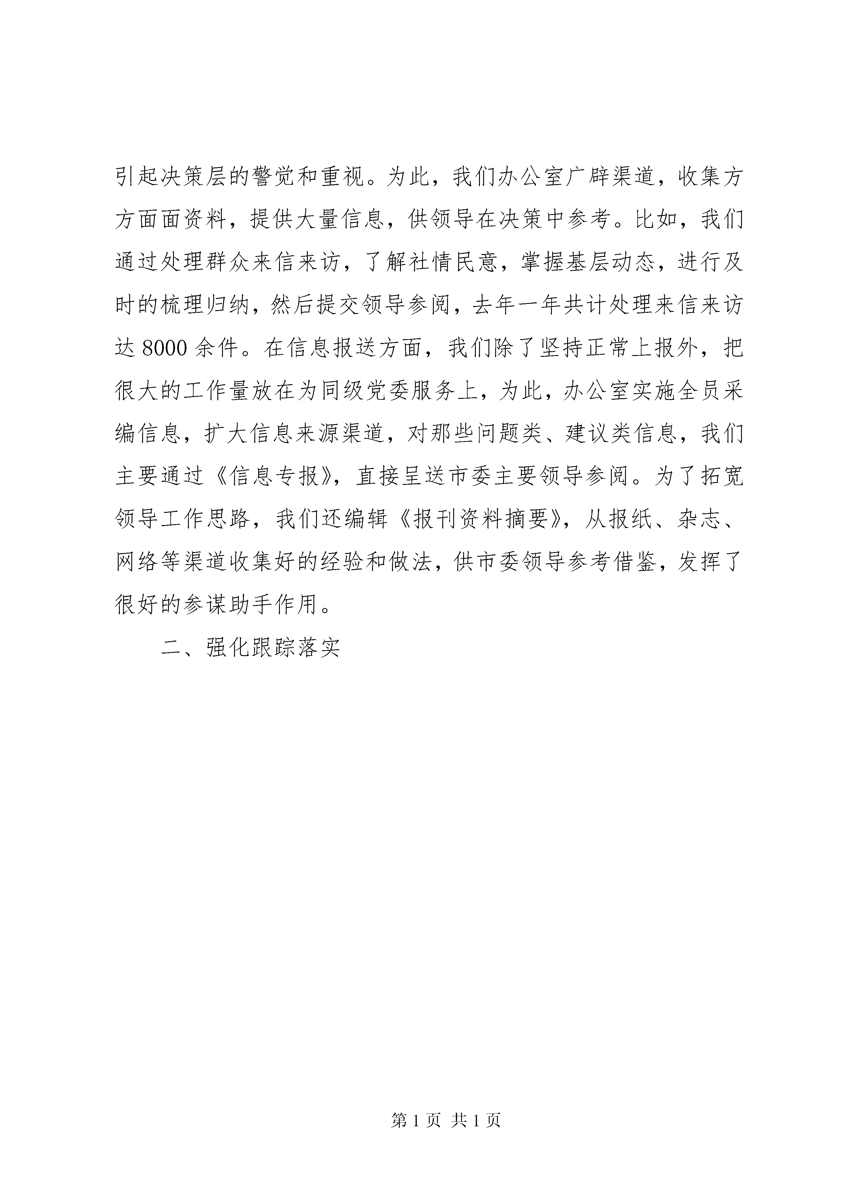 办公室工作交流发言稿"国之废兴,在于政事;政事得失,由乎辅佐"。自古以来,人们都十分重视辅佐政务工作。党委办公室是党委运转的中枢和核心机构,职责涵盖方方面面,但其中当以参政议政、出谋划策为最。从一定意义上说,办公室参谋助手作用发挥得好不好,充分不充分,领导是否满意,是检验办公室工作水平高低的重要标志。建市以来,我们**市委办公室积极主动地适应新形势,紧紧围绕市委中心工作,努力为领导决策提供优质高效服务,较好地发挥了参谋助手作用。一、突出调查研究,提高服务决策的质量没有调查研究就没有发言权,没有调查研究就没有决策权。调查研究工作是成事之基,谋事之道,是办公室发挥参谋助手作用的重要手段。办公室调研力量的强弱,调研水平的高低,调研成果的优劣,在一定程度上影响领导的决策水平。因此,我们要求办公室全体同志,把调查研究作为自己必须练就的基本功,积极参与谋划,广泛收集信息,在吃透上情的同时,切实吃透下情,努力为领导决策提供翔实、准确的依据。一是增强服务决策的意识。从地位上讲,办公室具有从属性,是具体的办事机构,但地位的从属性不等于工作的被动性。我们要求办公室同志从繁杂的事务性服务中摆脱出来,学会超前思考问题,学会"关起门来当书记",无论是信息调研、综合协调,还是督促检查,都要做到不仅想领导之所想,而且要想领导所未想,由慢半拍变为抢先一步,积极、主动、超前搞好决策服务。注重引导秘书人员,想大事,懂全局,研究问题,分析问题,并通过语言建议、材料谋划、文字参政,把"秀才"、"谋士"的积极性充分调动起来,帮助领导想主意、出点子、提建议,供领导去选主意、断主意、作决策,从而让领导站得高、看得远,客观公正地选出切实可行的好主意。与此同时,我们还要求办公室同志认真研究上级的方针政策,对应上级工作,估测本级领导工作思路和工作安排的发展变化,当好"事前诸葛",做到见事早、行动快,在领导部署前谋事,在领导决策前划策,制订好预案,满足领导决策需要。比如在每年年初召开市委扩大会议之前,我们都提前一个多月进行调查研究,思考谋划新一年的工作目标和工作思路,然后结合中央、省经济工作会议精神,提出初步框架,供领导在决策中参考。二是突出服务决策的重点。作为党委的综合办事机构,办公室承担着综合、协调、参谋、督办、服务等工作职责,是机关的信息中心、参谋中心、服务中心。但是说到底,一切的工作都是围绕决策服务的。在工作实践中,我们认识到,推进决策的科学化、民主化,提高决策参谋水平,最重要的就是紧扣市委中心工作,紧扣经济社会发展中的热点、难点、重点,深度透彻地分析问题,并有针对性地提出解决问题的建议,形成有深度、有分量、对推动全局工作有参考价值的调研报告,为领导决策提供依据。市委每次重大活动之前,我们都要组织专门力量,深入乡村、农户,对全市经济社会发展的各个方面进行全面系统的摸底,以期准确把握市情,科学制定决策。比如为了筹备市第二次党代会,确保制订的"十五"计划更具科学性和可操作性,办公室组织多个调研组分赴县区、兄弟市和外省进行调查研究,形成了一系列研究成果。在市第二次党代会报告中,市委充分吸纳了办公室的调研建议,确定了我市"十五"时期经济和社会事业的发展规划,提出了改革开放大突破、经济结构大调整、中心城市大推进、区域发展大跨越的"四大奋斗目标"和强农富民、工业突破、城镇带动、全面开放、科教兴市的"五大发展战略"。此外,在事关全局的私营个体经济发展、城市工作、软环境整治等战略性、前瞻性调研方面,我们办公室也都是比较超前的。三是拓宽服务决策的渠道。办公室要做好参谋,当好助手,关键是要跟得紧,切实围绕市委的中心工作;抓得准,准确把握领导意图和决策思路;用得上,制定的预案,提出的建议要参到点子上,谋到要害处。特别是在新知识、新信息不断涌现的当今社会,信息量很大,但是由于地方工作千头万绪,领导同志常年奔波在第一线,很难有专门时间和精力来研究学习这些新的知识,这就需要智囊和助手来帮助收集整理,当好耳目,把听到的、看到的、想到的各种情况和信息,及时、准确地向党委报告,及早引起决策层的警觉和重视。为此,我们办公室广辟渠道,收集方方面面资料,提供大量信息,供领导在决策中参考。比如,我们通过处理群众来信来访,了解社情民意,掌握基层动态,进行及时的梳理归纳,然后提交领导参阅,去年一年共计处理来信来访达8000余件。在信息报送方面,我们除了坚持正常上报外,把很大的工作量放在为同级党委服务上,为此,办公室实施全员采编信息,扩大信息来源渠道,对那些问题类、建议类信息,我们主要通过《信息专报》,直接呈送市委主要领导参阅。为了拓宽领导工作思路,我们还编辑《报刊资料摘要》,从报纸、杂志、网络等渠道收集好的经验和做法,供市委领导参考借鉴,发挥了很好的参谋助手作用。二、强化跟踪落实