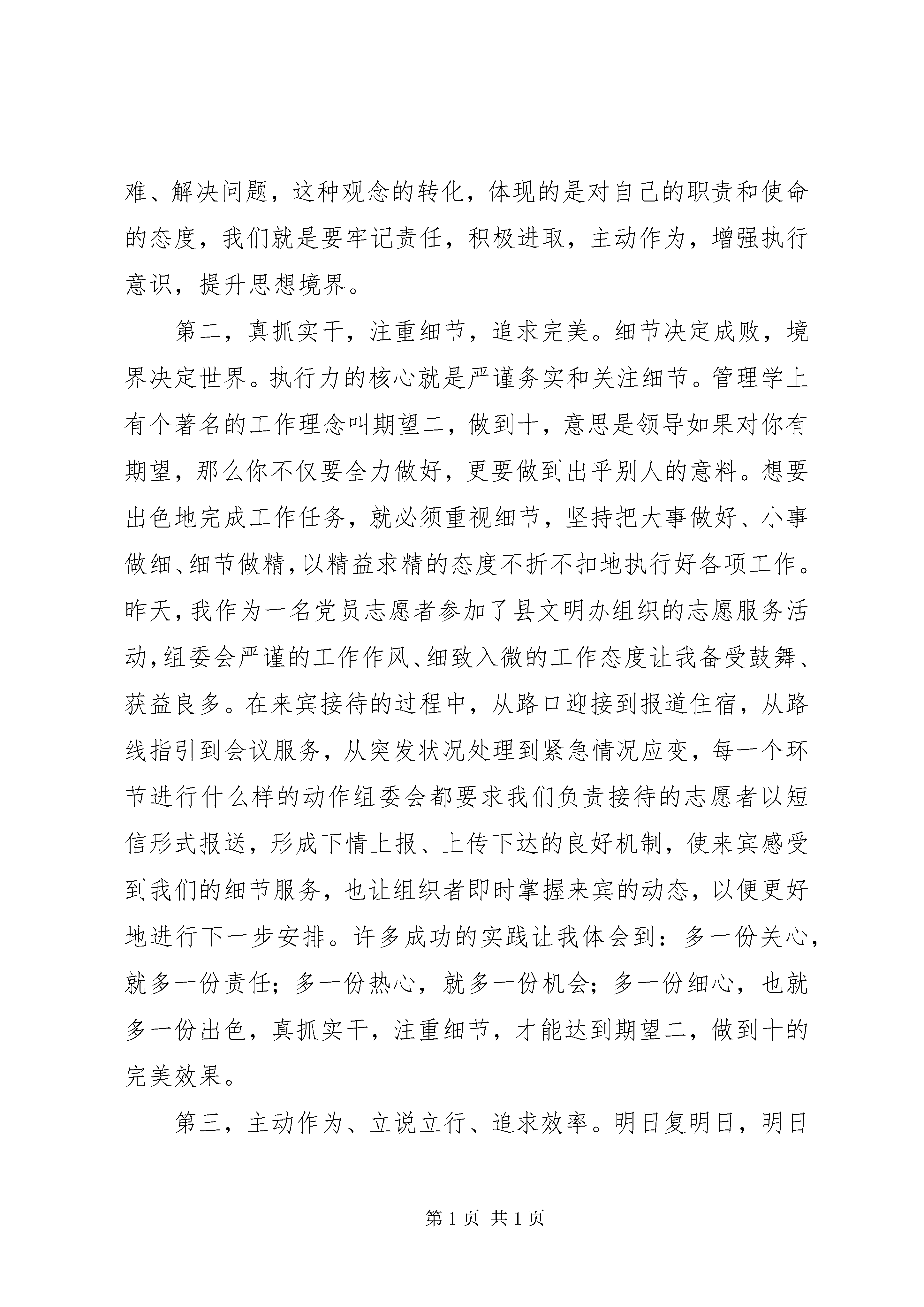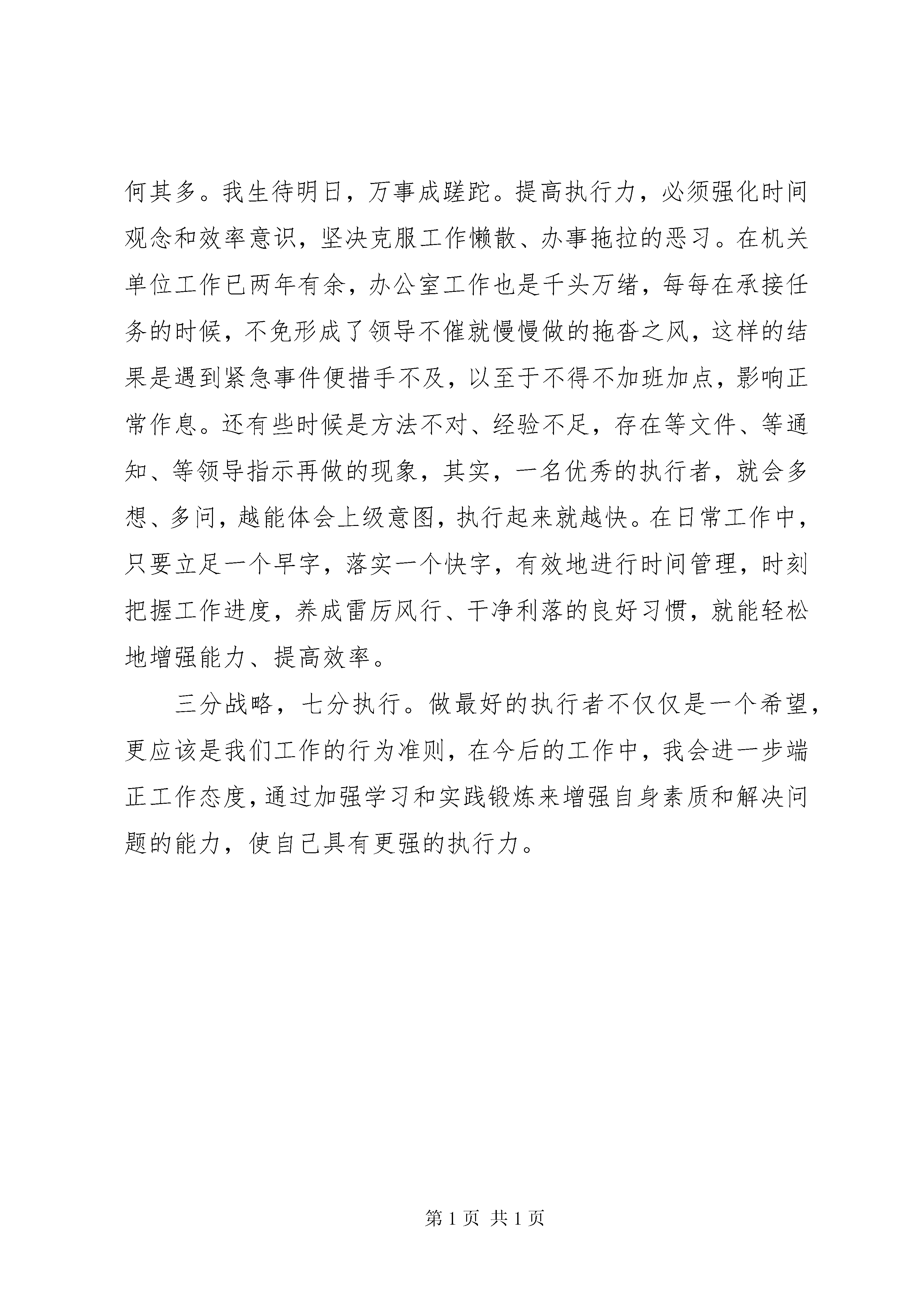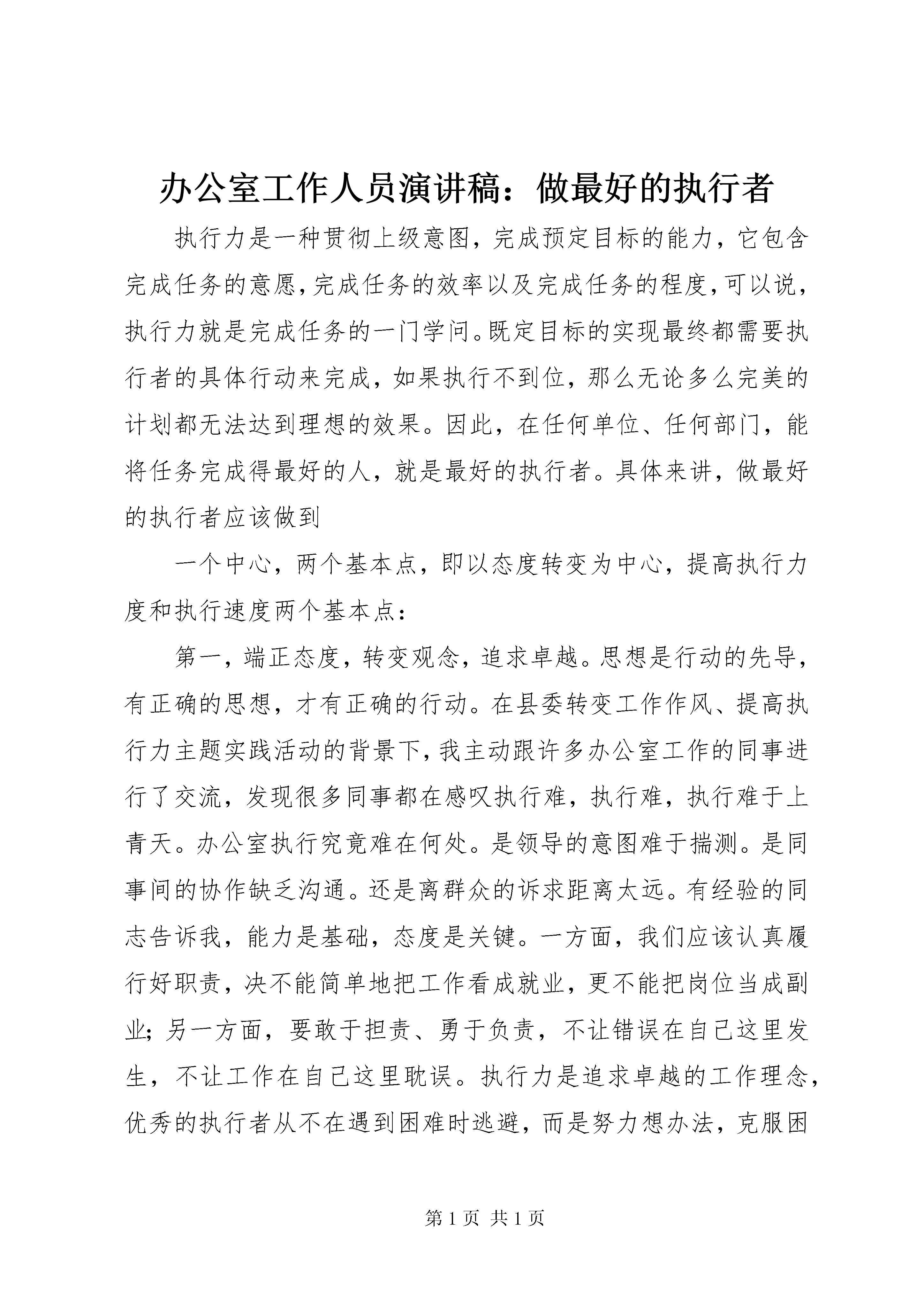 办公室工作人员演讲稿:做最好的执行者执行力是一种贯彻上级意图,完成预定目标的能力,它包含完成任务的意愿,完成任务的效率以及完成任务的程度,可以说,执行力就是完成任务的一门学问。既定目标的实现最终都需要执行者的具体行动来完成,如果执行不到位,那么无论多么完美的计划都无法达到理想的效果。因此,在任何单位、任何部门,能将任务完成得最好的人,就是最好的执行者。具体来讲,做最好的执行者应该做到一个中心,两个基本点,即以态度转变为中心,提高执行力度和执行速度两个基本点:第一,端正态度,转变观念,追求卓越。思想是行动的先导,有正确的思想,才有正确的行动。在县委转变工作作风、提高执行力主题实践活动的背景下,我主动跟许多办公室工作的同事进行了交流,发现很多同事都在感叹执行难,执行难,执行难于上青天。办公室执行究竟难在何处。是领导的意图难于揣测。是同事间的协作缺乏沟通。还是离群众的诉求距离太远。有经验的同志告诉我,能力是基础,态度是关键。一方面,我们应该认真履行好职责,决不能简单地把工作看成就业,更不能把岗位当成副业;另一方面,要敢于担责、勇于负责,不让错误在自己这里发生,不让工作在自己这里耽误。执行力是追求卓越的工作理念,优秀的执行者从不在遇到困难时逃避,而是努力想办法,克服困难、解决问题,这种观念的转化,体现的是对自己的职责和使命的态度,我们就是要牢记责任,积极进取,主动作为,增强执行意识,提升思想境界。第二,真抓实干,注重细节,追求完美。细节决定成败,境界决定世界。执行力的核心就是严谨务实和关注细节。管理学上有个著名的工作理念叫期望二,做到十,意思是领导如果对你有期望,那么你不仅要全力做好,更要做到出乎别人的意料。想要出色地完成工作任务,就必须重视细节,坚持把大事做好、小事做细、细节做精,以精益求精的态度不折不扣地执行好各项工作。昨天,我作为一名党员志愿者参加了县文明办组织的志愿服务活动,组委会严谨的工作作风、细致入微的工作态度让我备受鼓舞、获益良多。在来宾接待的过程中,从路口迎接到报道住宿,从路线指引到会议服务,从突发状况处理到紧急情况应变,每一个环节进行什么样的动作组委会都要求我们负责接待的志愿者以短信形式报送,形成下情上报、上传下达的良好机制,使来宾感受到我们的细节服务,也让组织者即时掌握来宾的动态,以便更好地进行下一步安排。许多成功的实践让我体会到:多一份关心,就多一份责任;多一份热心,就多一份机会;多一份细心,也就多一份出色,真抓实干,注重细节,才能达到期望二,做到十的完美效果。第三,主动作为、立说立行、追求效率。明日复明日,明日何其多。我生待明日,万事成蹉跎。提高执行力,必须强化时间观念和效率意识,坚决克服工作懒散、办事拖拉的恶习。在机关单位工作已两年有余,办公室工作也是千头万绪,每每在承接任务的时候,不免形成了领导不催就慢慢做的拖沓之风,这样的结果是遇到紧急事件便措手不及,以至于不得不加班加点,影响正常作息。还有些时候是方法不对、经验不足,存在等文件、等通知、等领导指示再做的现象,其实,一名优秀的执行者,就会多想、多问,越能体会上级意图,执行起来就越快。在日常工作中,只要立足一个早字,落实一个快字,有效地进行时间管理,时刻把握工作进度,养成雷厉风行、干净利落的良好习惯,就能轻松地增强能力、提高效率。三分战略,七分执行。做最好的执行者不仅仅是一个希望,更应该是我们工作的行为准则,在今后的工作中,我会进一步端正工作态度,通过加强学习和实践锻炼来增强自身素质和解决问题的能力,使自己具有更强的执行力。