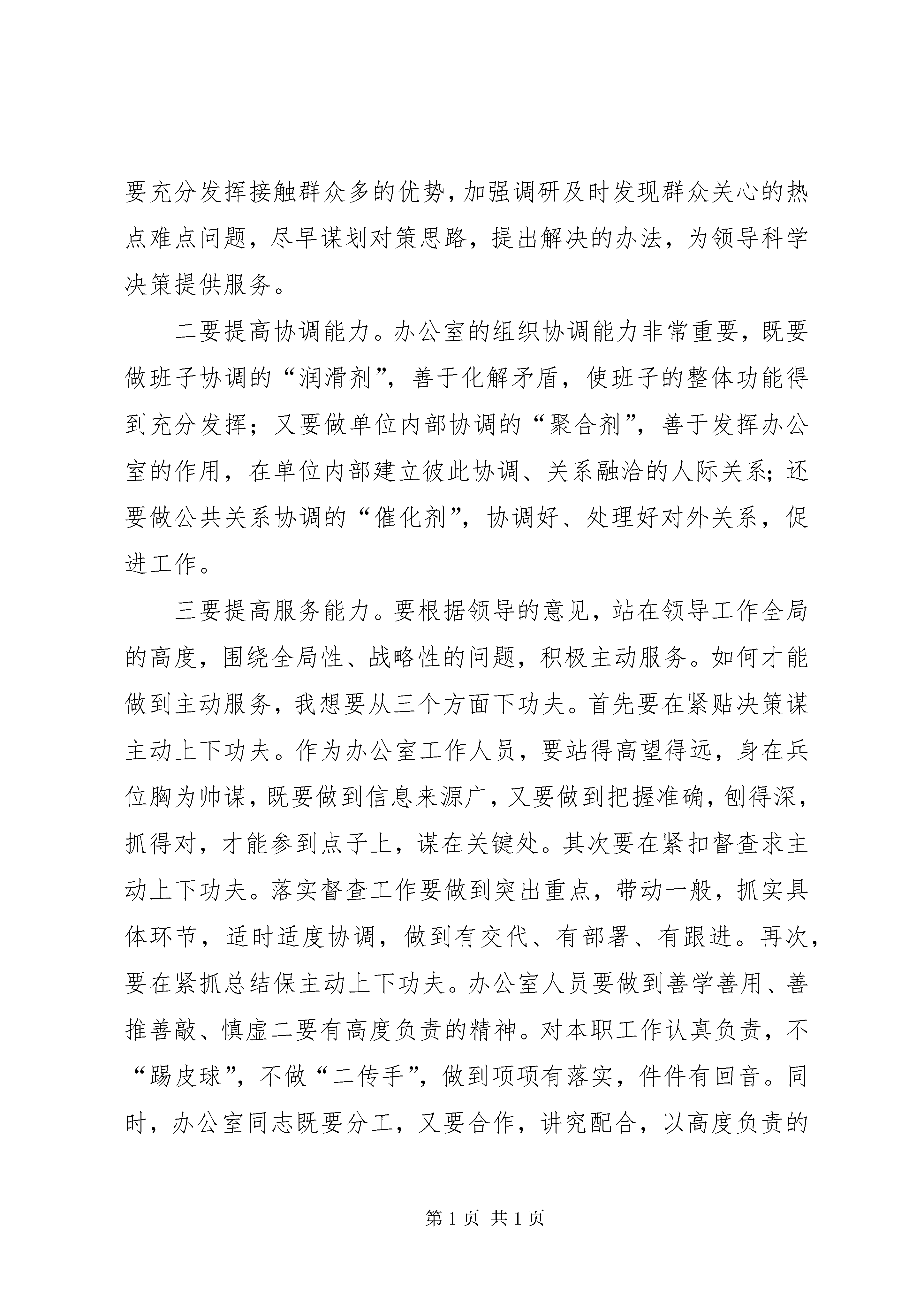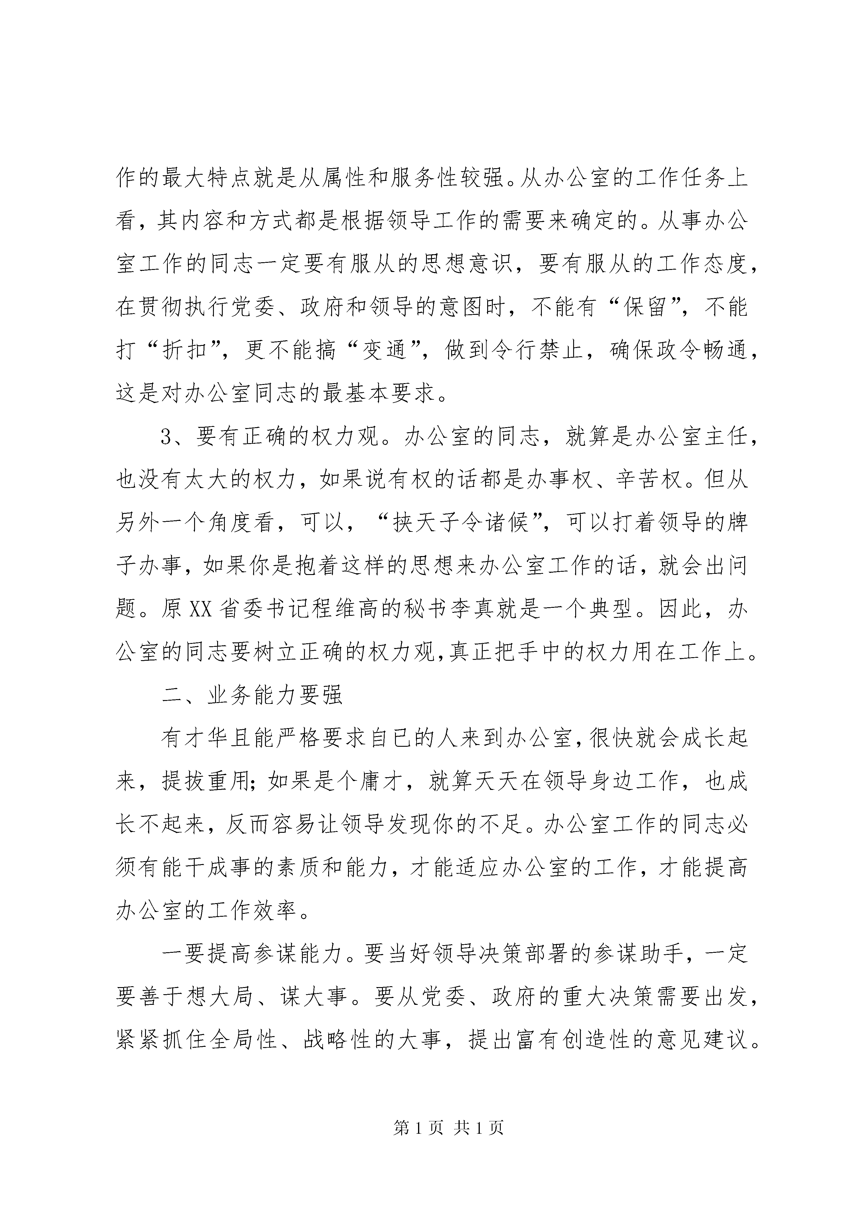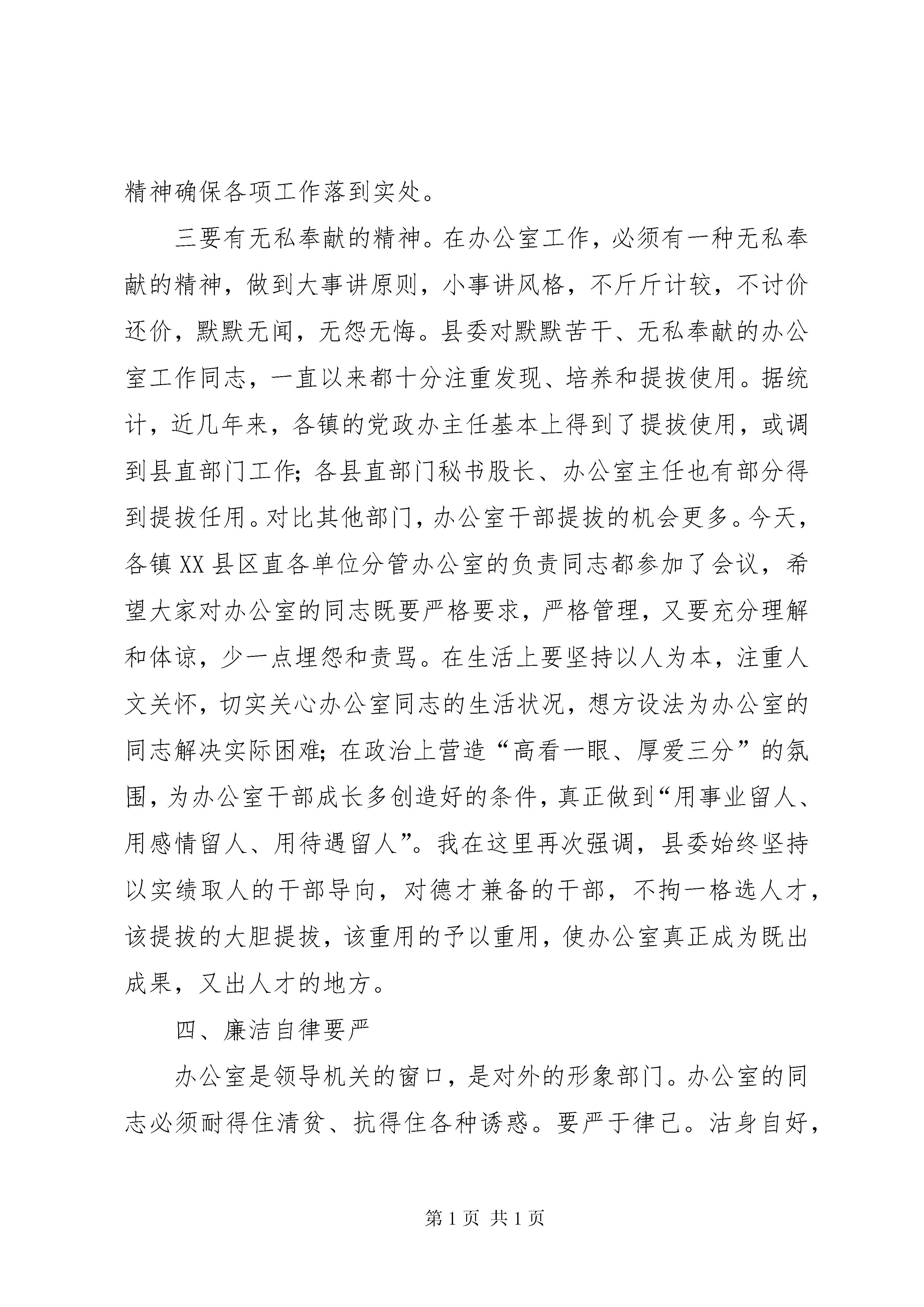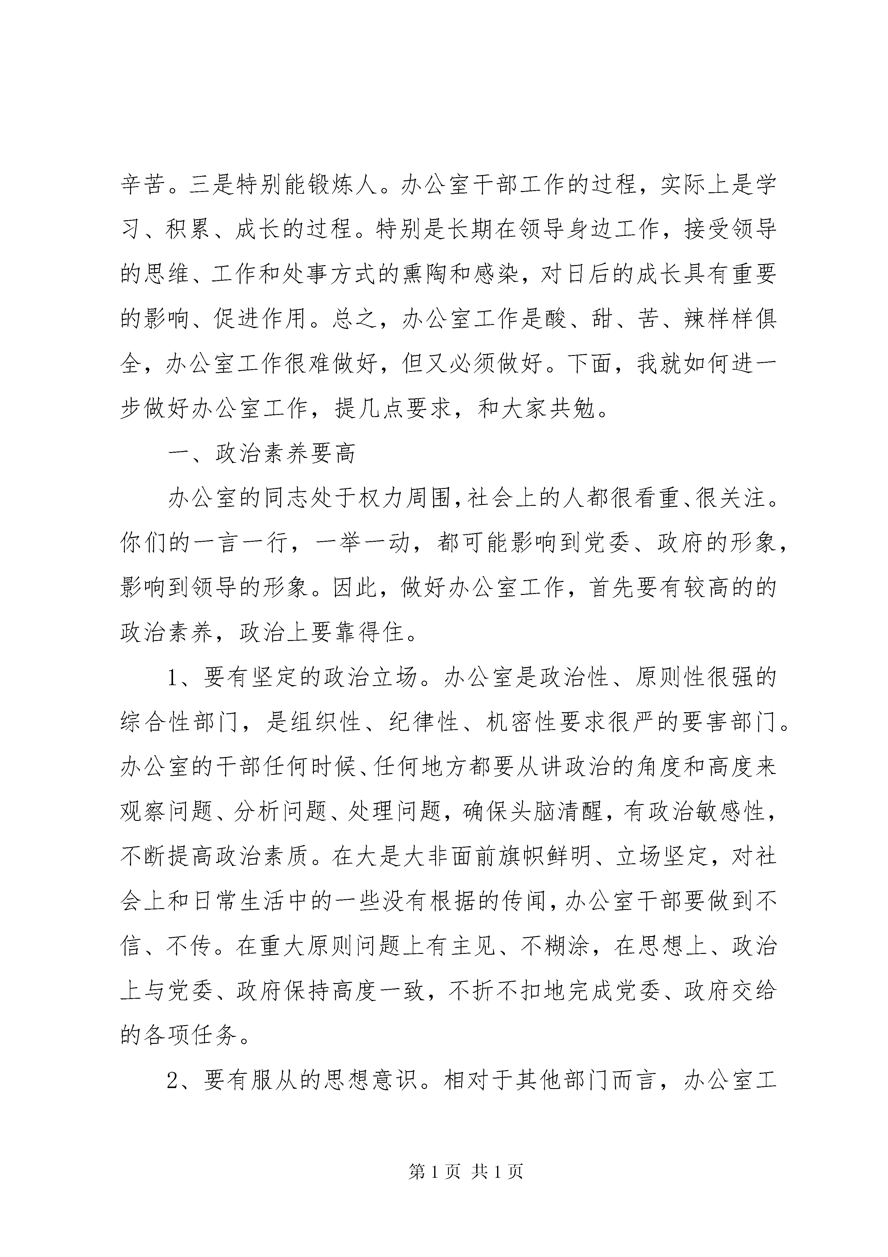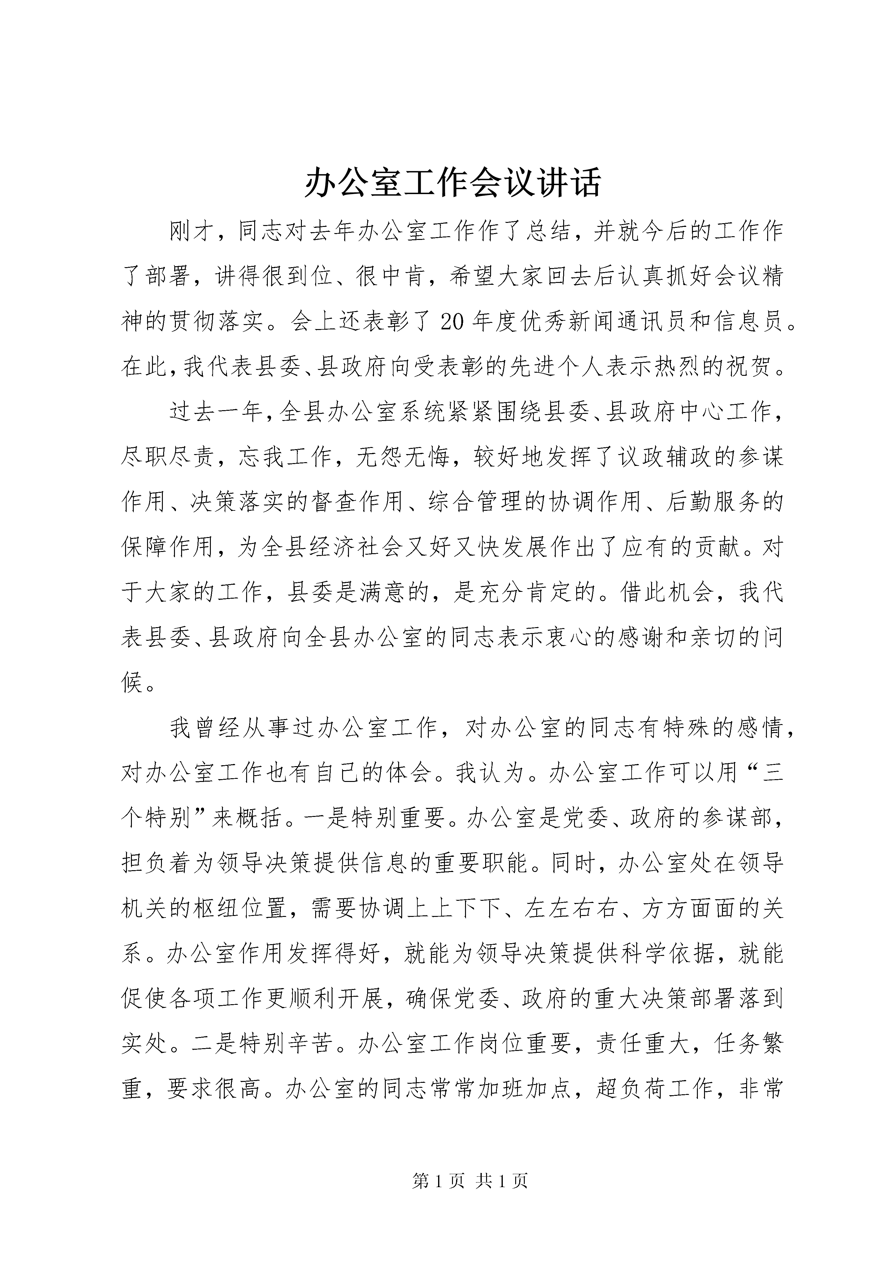 办公室工作会议讲话刚才,同志对去年办公室工作作了总结,并就今后的工作作了部署,讲得很到位、很中肯,希望大家回去后认真抓好会议精神的贯彻落实。会上还表彰了20年度优秀新闻通讯员和信息员。在此,我代表县委、县政府向受表彰的先进个人表示热烈的祝贺。过去一年,全县办公室系统紧紧围绕县委、县政府中心工作,尽职尽责,忘我工作,无怨无悔,较好地发挥了议政辅政的参谋作用、决策落实的督查作用、综合管理的协调作用、后勤服务的保障作用,为全县经济社会又好又快发展作出了应有的贡献。对于大家的工作,县委是满意的,是充分肯定的。借此机会,我代表县委、县政府向全县办公室的同志表示衷心的感谢和亲切的问候。我曾经从事过办公室工作,对办公室的同志有特殊的感情,对办公室工作也有自己的体会。我认为。办公室工作可以用“三个特别”来概括。一是特别重要。办公室是党委、政府的参谋部,担负着为领导决策提供信息的重要职能。同时,办公室处在领导机关的枢纽位置,需要协调上上下下、左左右右、方方面面的关系。办公室作用发挥得好,就能为领导决策提供科学依据,就能促使各项工作更顺利开展,确保党委、政府的重大决策部署落到实处。二是特别辛苦。办公室工作岗位重要,责任重大,任务繁重,要求很高。办公室的同志常常加班加点,超负荷工作,非常辛苦。三是特别能锻炼人。办公室干部工作的过程,实际上是学习、积累、成长的过程。特别是长期在领导身边工作,接受领导的思维、工作和处事方式的熏陶和感染,对日后的成长具有重要的影响、促进作用。总之,办公室工作是酸、甜、苦、辣样样俱全,办公室工作很难做好,但又必须做好。下面,我就如何进一步做好办公室工作,提几点要求,和大家共勉。一、政治素养要高办公室的同志处于权力周围,社会上的人都很看重、很关注。你们的一言一行,一举一动,都可能影响到党委、政府的形象,影响到领导的形象。因此,做好办公室工作,首先要有较高的的政治素养,政治上要靠得住。1、要有坚定的政治立场。办公室是政治性、原则性很强的综合性部门,是组织性、纪律性、机密性要求很严的要害部门。办公室的干部任何时候、任何地方都要从讲政治的角度和高度来观察问题、分析问题、处理问题,确保头脑清醒,有政治敏感性,不断提高政治素质。在大是大非面前旗帜鲜明、立场坚定,对社会上和日常生活中的一些没有根据的传闻,办公室干部要做到不信、不传。在重大原则问题上有主见、不糊涂,在思想上、政治上与党委、政府保持高度一致,不折不扣地完成党委、政府交给的各项任务。2、要有服从的思想意识。相对于其他部门而言,办公室工作的最大特点就是从属性和服务性较强。从办公室的工作任务上看,其内容和方式都是根据领导工作的需要来确定的。从事办公室工作的同志一定要有服从的思想意识,要有服从的工作态度,在贯彻执行党委、政府和领导的意图时,不能有“保留”,不能打“折扣”,更不能搞“变通”,做到令行禁止,确保政令畅通,这是对办公室同志的最基本要求。3、要有正确的权力观。办公室的同志,就算是办公室主任,也没有太大的权力,如果说有权的话都是办事权、辛苦权。但从另外一个角度看,可以,“挟天子令诸候”,可以打着领导的牌子办事,如果你是抱着这样的思想来办公室工作的话,就会出问题。原XX省委书记程维高的秘书李真就是一个典型。因此,办公室的同志要树立正确的权力观,真正把手中的权力用在工作上。二、业务能力要强有才华且能严格要求自已的人来到办公室,很快就会成长起来,提拔重用;如果是个庸才,就算天天在领导身边工作,也成长不起来,反而容易让领导发现你的不足。办公室工作的同志必须有能干成事的素质和能力,才能适应办公室的工作,才能提高办公室的工作效率。一要提高参谋能力。要当好领导决策部署的参谋助手,一定要善于想大局、谋大事。要从党委、政府的重大决策需要出发,紧紧抓住全局性、战略性的大事,提出富有创造性的意见建议。要充分发挥接触群众多的优势,加强调研及时发现群众关心的热点难点问题,尽早谋划对策思路,提出解决的办法,为领导科学决策提供服务。二要提高协调能力。办公室的组织协调能力非常重要,既要做班子协调的“润滑剂”,善于化解矛盾,使班子的整体功能得到充分发挥;又要做单位内部协调的“聚合剂”,善于发挥办公室的作用,在单位内部建立彼此协调、关系融洽的人际关系;还要做公共关系协调的“催化剂”,协调好、处理好对外关系,促进工作。三要提高服务能力。要根据领导的意见,站在领导工作全局的高度,围绕全局性、战略性的问题,积极主动服务。如何才能做到主动服务,我想要从三个方面下功夫。首先要在紧贴决策谋主动上下功夫。作为办公室工作人员,要站得高望得远,身在兵位胸为帅谋,既要做到信息来源广,又要做到把握准确,刨得深,抓得对,才能参到点子上,谋在关键处。其次要在紧扣督查求主动上下功夫。落实督查工作要做到突出重点,带