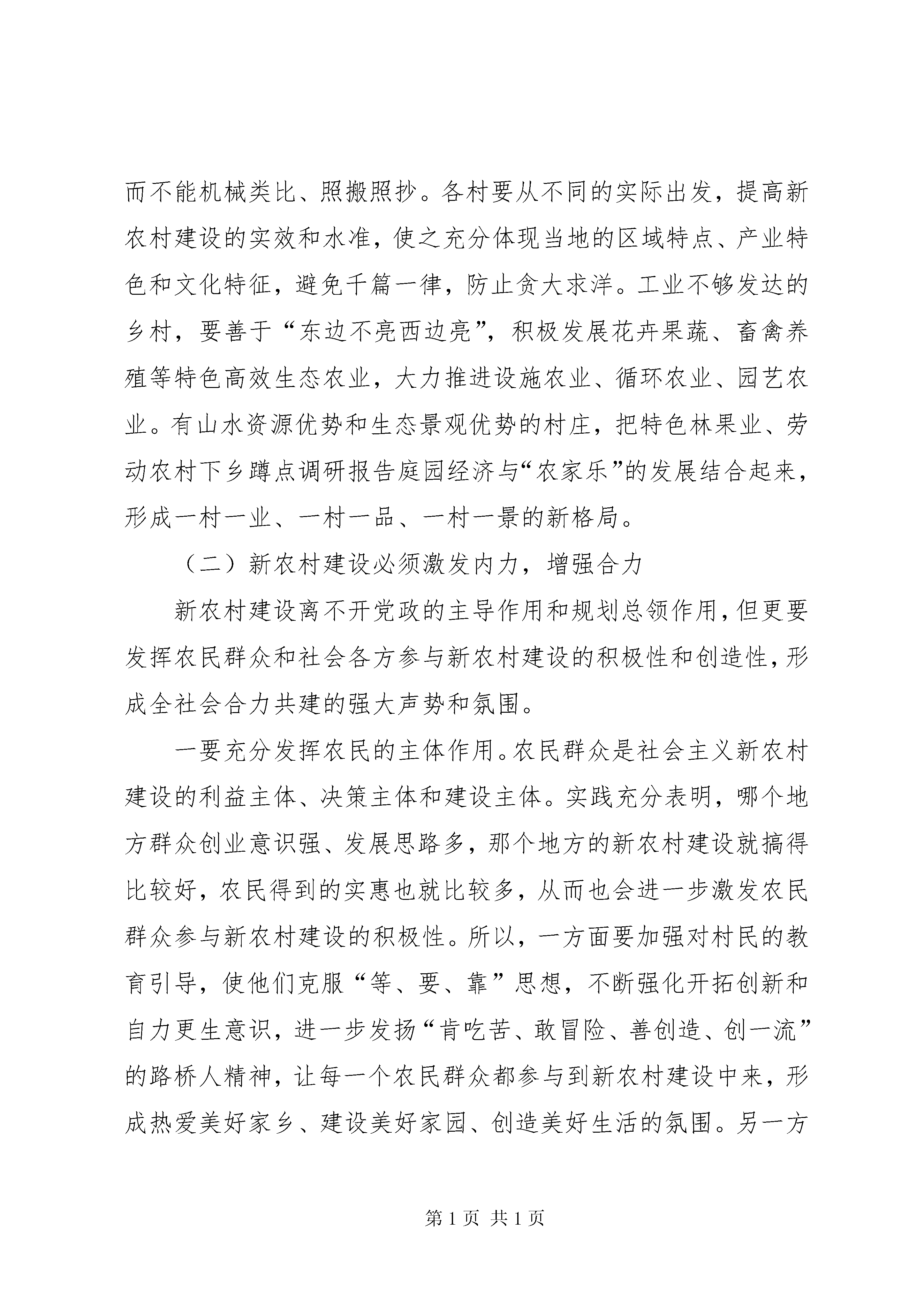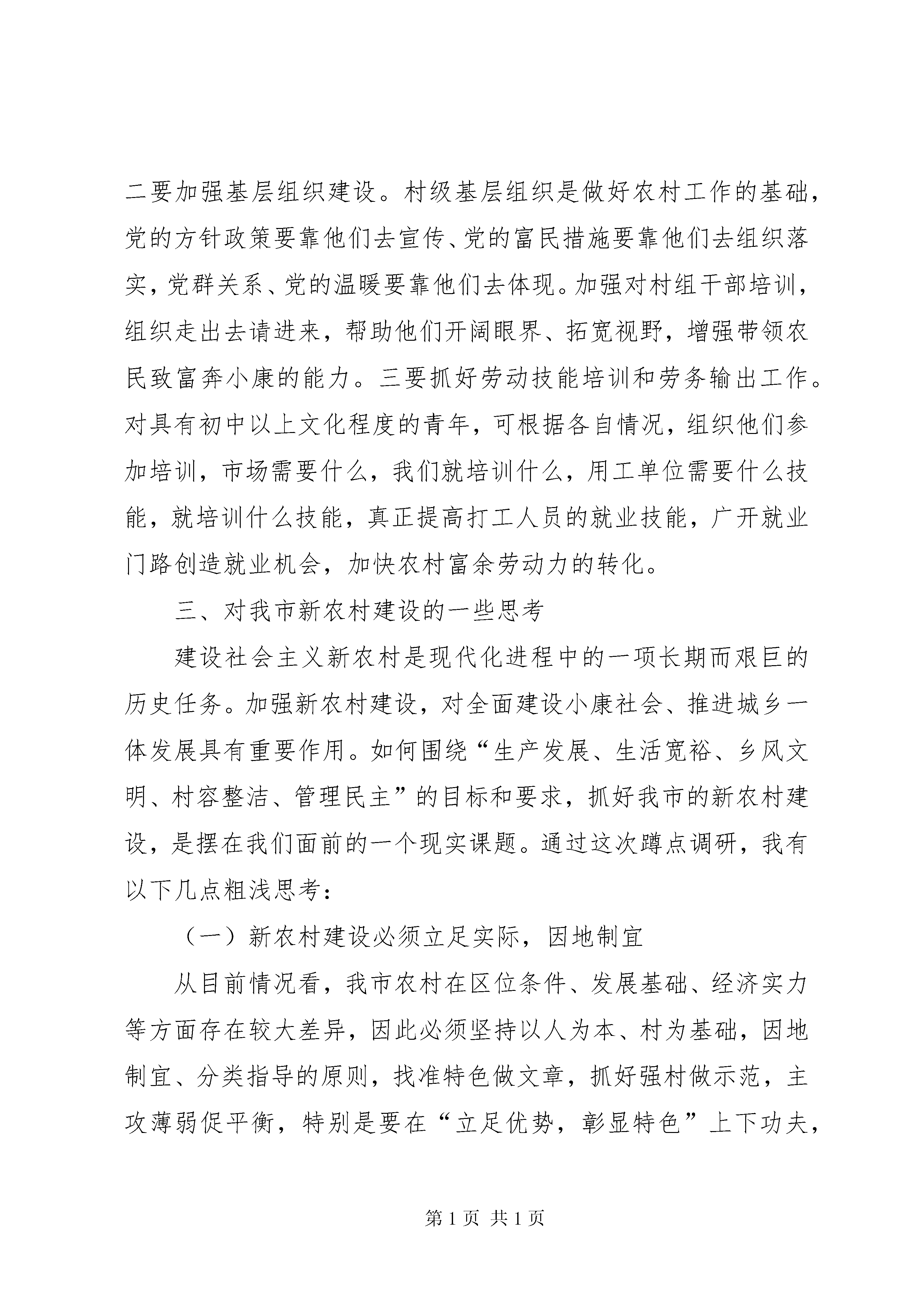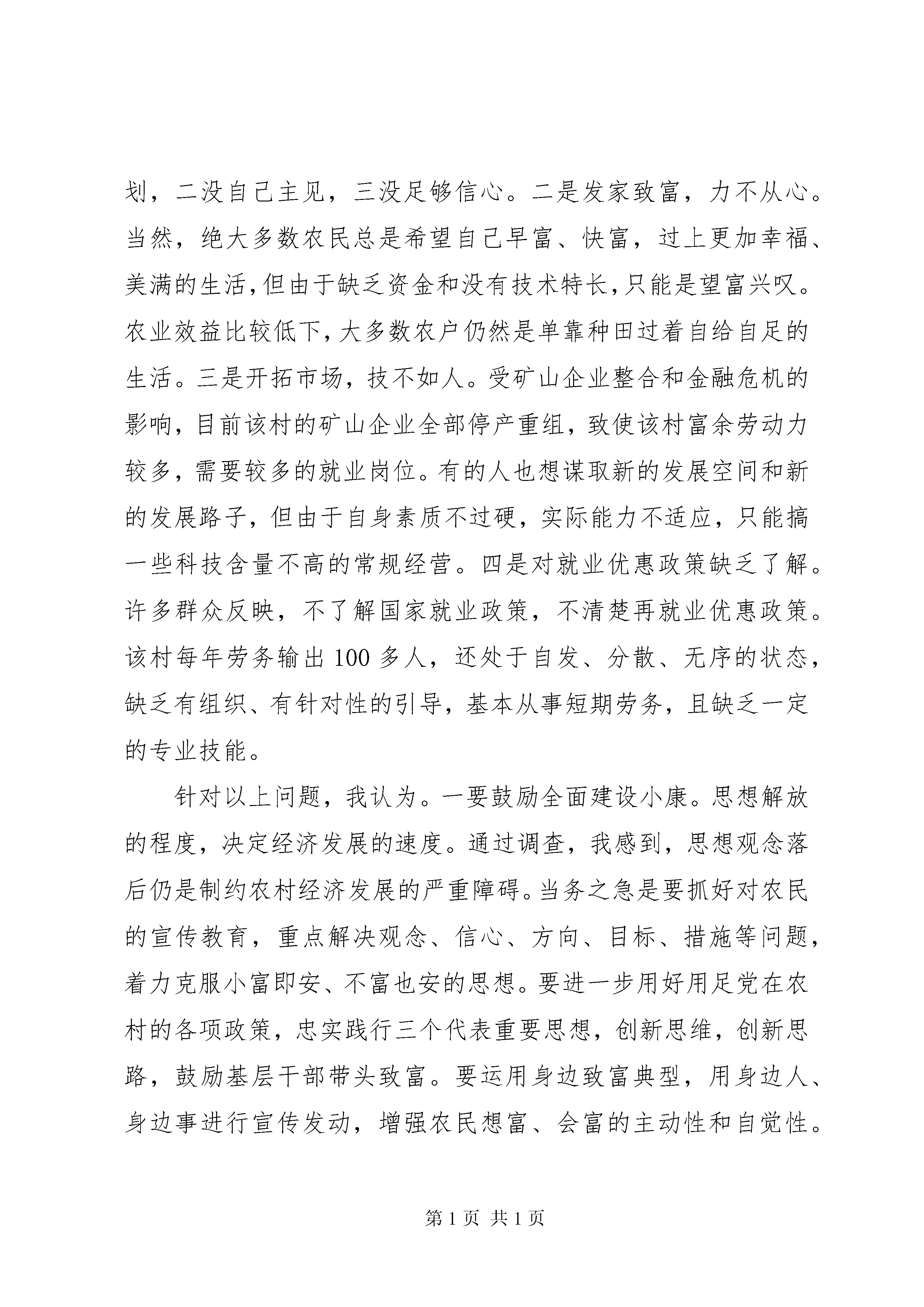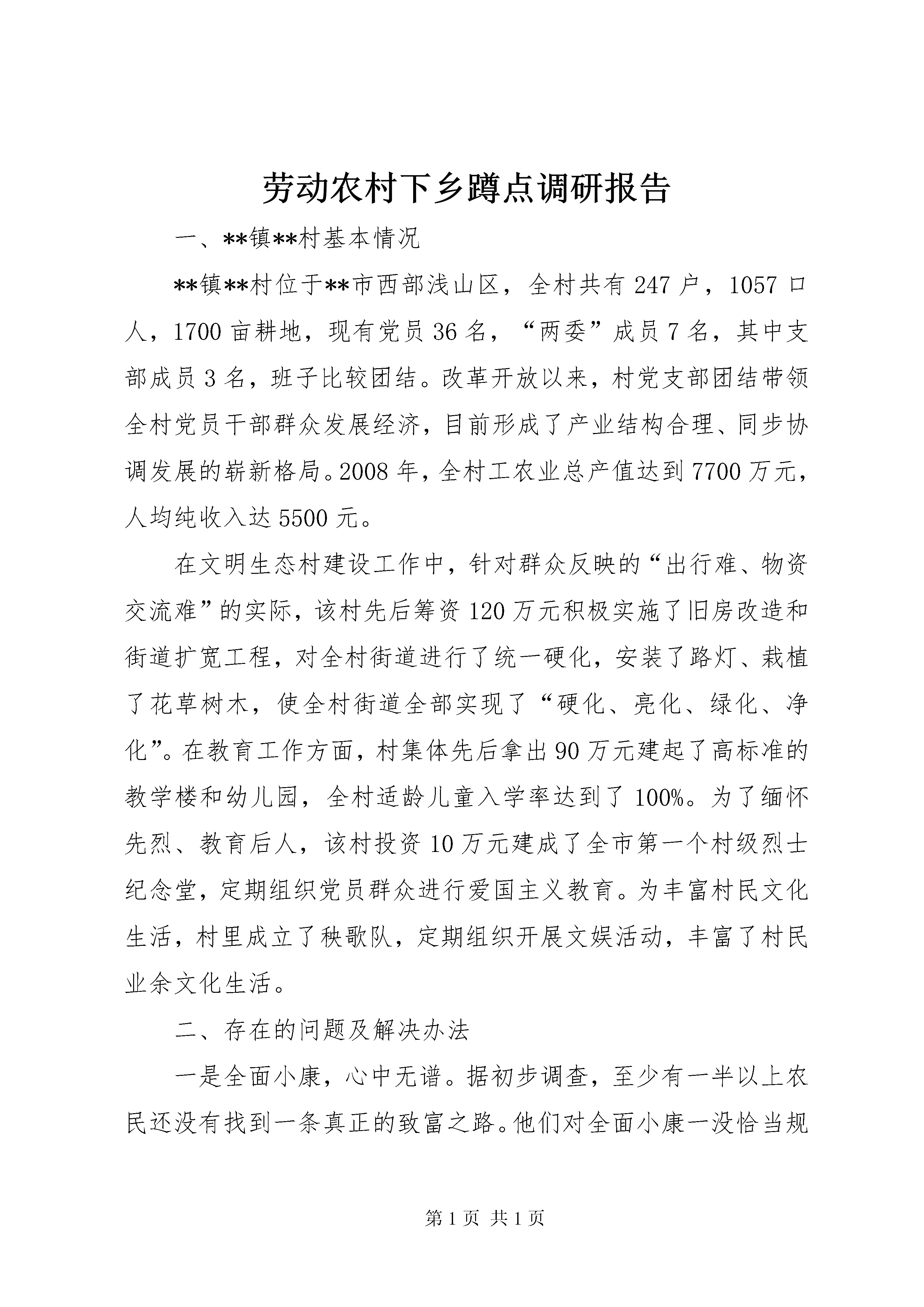 劳动农村下乡蹲点调研报告一、**镇**村基本情况**镇**村位于**市西部浅山区,全村共有247户,1057口人,1700亩耕地,现有党员36名,“两委”成员7名,其中支部成员3名,班子比较团结。改革开放以来,村党支部团结带领全村党员干部群众发展经济,目前形成了产业结构合理、同步协调发展的崭新格局。2008年,全村工农业总产值达到7700万元,人均纯收入达5500元。在文明生态村建设工作中,针对群众反映的“出行难、物资交流难”的实际,该村先后筹资120万元积极实施了旧房改造和街道扩宽工程,对全村街道进行了统一硬化,安装了路灯、栽植了花草树木,使全村街道全部实现了“硬化、亮化、绿化、净化”。在教育工作方面,村集体先后拿出90万元建起了高标准的教学楼和幼儿园,全村适龄儿童入学率达到了100%。为了缅怀先烈、教育后人,该村投资10万元建成了全市第一个村级烈士纪念堂,定期组织党员群众进行爱国主义教育。为丰富村民文化生活,村里成立了秧歌队,定期组织开展文娱活动,丰富了村民业余文化生活。二、存在的问题及解决办法一是全面小康,心中无谱。据初步调查,至少有一半以上农民还没有找到一条真正的致富之路。他们对全面小康一没恰当规划,二没自己主见,三没足够信心。二是发家致富,力不从心。当然,绝大多数农民总是希望自己早富、快富,过上更加幸福、美满的生活,但由于缺乏资金和没有技术特长,只能是望富兴叹。农业效益比较低下,大多数农户仍然是单靠种田过着自给自足的生活。三是开拓市场,技不如人。受矿山企业整合和金融危机的影响,目前该村的矿山企业全部停产重组,致使该村富余劳动力较多,需要较多的就业岗位。有的人也想谋取新的发展空间和新的发展路子,但由于自身素质不过硬,实际能力不适应,只能搞一些科技含量不高的常规经营。四是对就业优惠政策缺乏了解。许多群众反映,不了解国家就业政策,不清楚再就业优惠政策。该村每年劳务输出100多人,还处于自发、分散、无序的状态,缺乏有组织、有针对性的引导,基本从事短期劳务,且缺乏一定的专业技能。针对以上问题,我认为。一要鼓励全面建设小康。思想解放的程度,决定经济发展的速度。通过调查,我感到,思想观念落后仍是制约农村经济发展的严重障碍。当务之急是要抓好对农民的宣传教育,重点解决观念、信心、方向、目标、措施等问题,着力克服小富即安、不富也安的思想。要进一步用好用足党在农村的各项政策,忠实践行三个代表重要思想,创新思维,创新思路,鼓励基层干部带头致富。要运用身边致富典型,用身边人、身边事进行宣传发动,增强农民想富、会富的主动性和自觉性。二要加强基层组织建设。村级基层组织是做好农村工作的基础,党的方针政策要靠他们去宣传、党的富民措施要靠他们去组织落实,党群关系、党的温暖要靠他们去体现。加强对村组干部培训,组织走出去请进来,帮助他们开阔眼界、拓宽视野,增强带领农民致富奔小康的能力。三要抓好劳动技能培训和劳务输出工作。对具有初中以上文化程度的青年,可根据各自情况,组织他们参加培训,市场需要什么,我们就培训什么,用工单位需要什么技能,就培训什么技能,真正提高打工人员的就业技能,广开就业门路创造就业机会,加快农村富余劳动力的转化。三、对我市新农村建设的一些思考建设社会主义新农村是现代化进程中的一项长期而艰巨的历史任务。加强新农村建设,对全面建设小康社会、推进城乡一体发展具有重要作用。如何围绕“生产发展、生活宽裕、乡风文明、村容整洁、管理民主”的目标和要求,抓好我市的新农村建设,是摆在我们面前的一个现实课题。通过这次蹲点调研,我有以下几点粗浅思考:(一)新农村建设必须立足实际,因地制宜从目前情况看,我市农村在区位条件、发展基础、经济实力等方面存在较大差异,因此必须坚持以人为本、村为基础,因地制宜、分类指导的原则,找准特色做文章,抓好强村做示范,主攻薄弱促平衡,特别是要在“立足优势,彰显特色”上下功夫,而不能机械类比、照搬照抄。各村要从不同的实际出发,提高新农村建设的实效和水准,使之充分体现当地的区域特点、产业特色和文化特征,避免千篇一律,防止贪大求洋。工业不够发达的乡村,要善于“东边不亮西边亮”,积极发展花卉果蔬、畜禽养殖等特色高效生态农业,大力推进设施农业、循环农业、园艺农业。有山水资源优势和生态景观优势的村庄,把特色林果业、劳动农村下乡蹲点调研报告庭园经济与“农家乐”的发展结合起来,形成一村一业、一村一品、一村一景的新格局。(二)新农村建设必须激发内力,增强合力新农村建设离不开党政的主导作用和规划总领作用,但更要发挥农民群众和社会各方参与新农村建设的积极性和创造性,形成全社会合力共建的强大声势和氛围。一要充分发挥农民的主体作用。农民群众是社会主义新农村建设的利益主体、决策主体和建设主体。实践充分表明,哪个地方群众创业意识强、发展思
