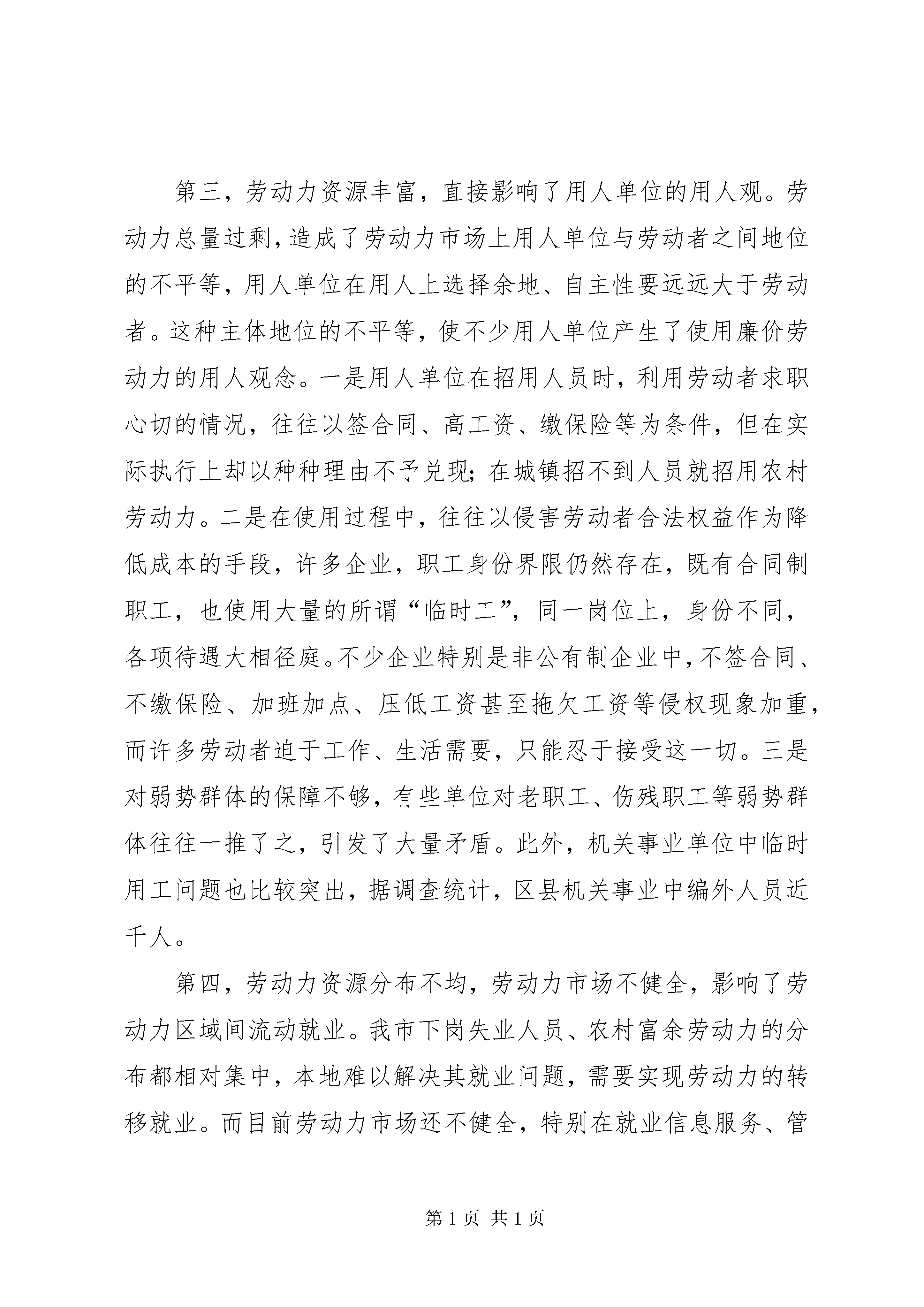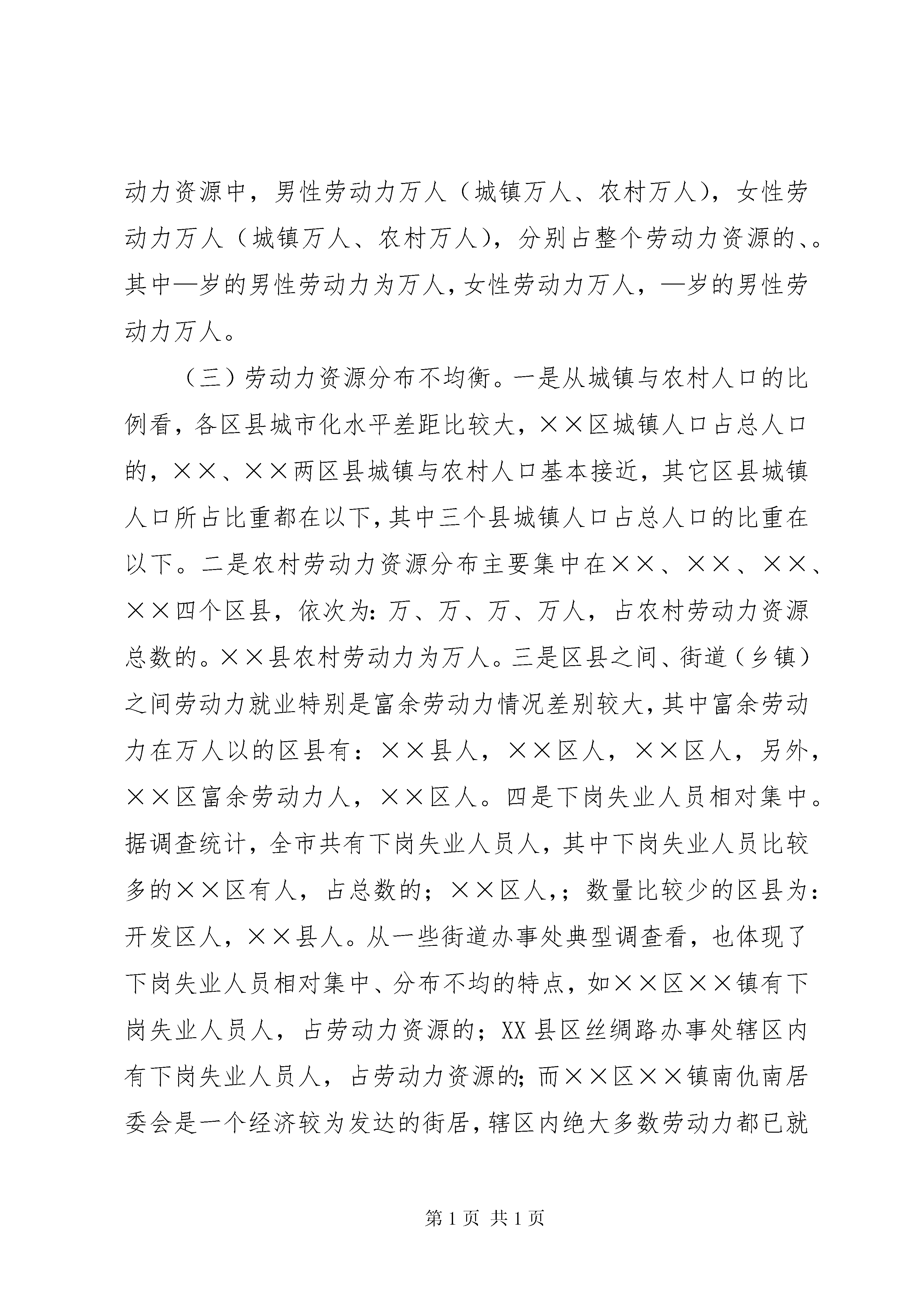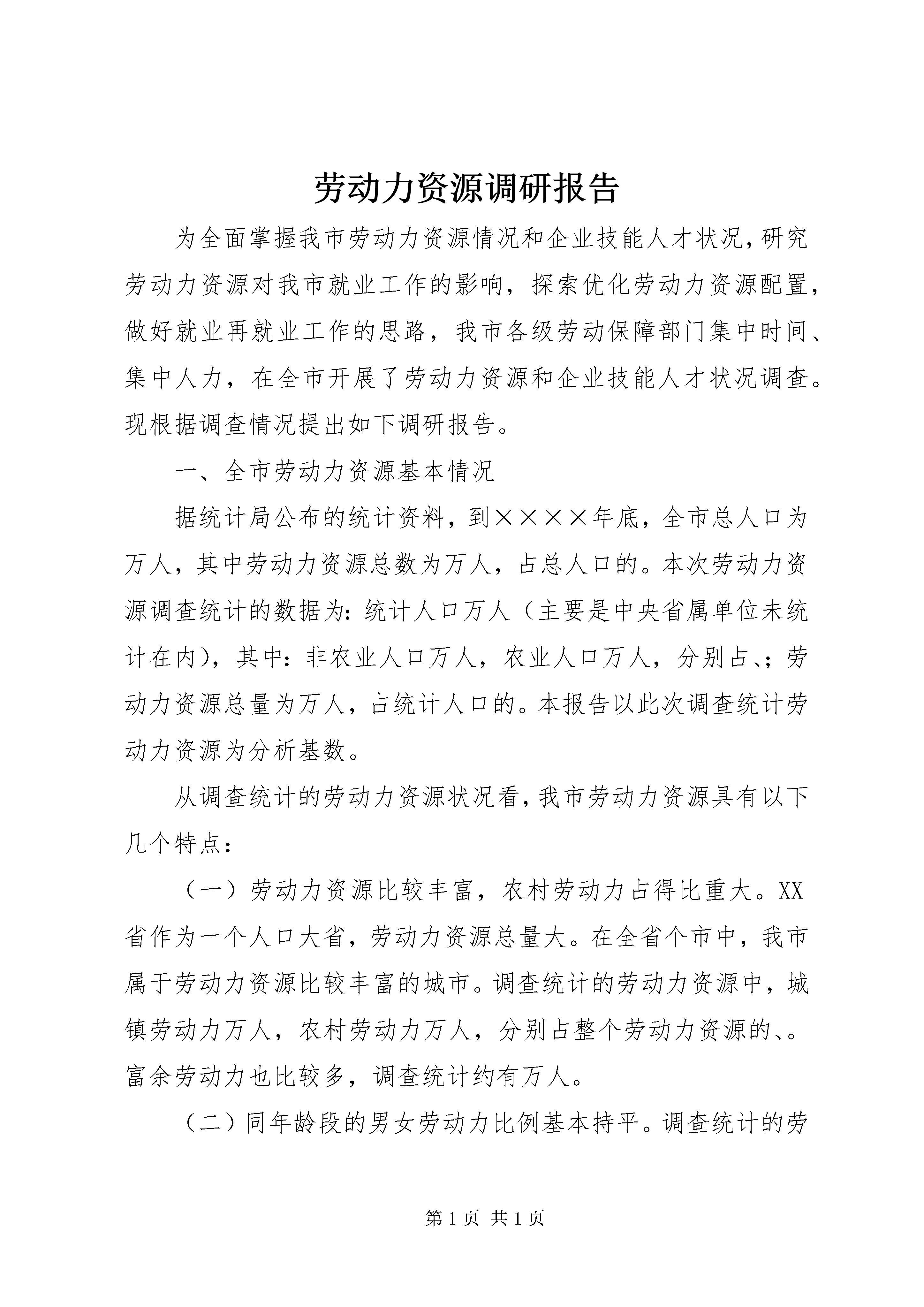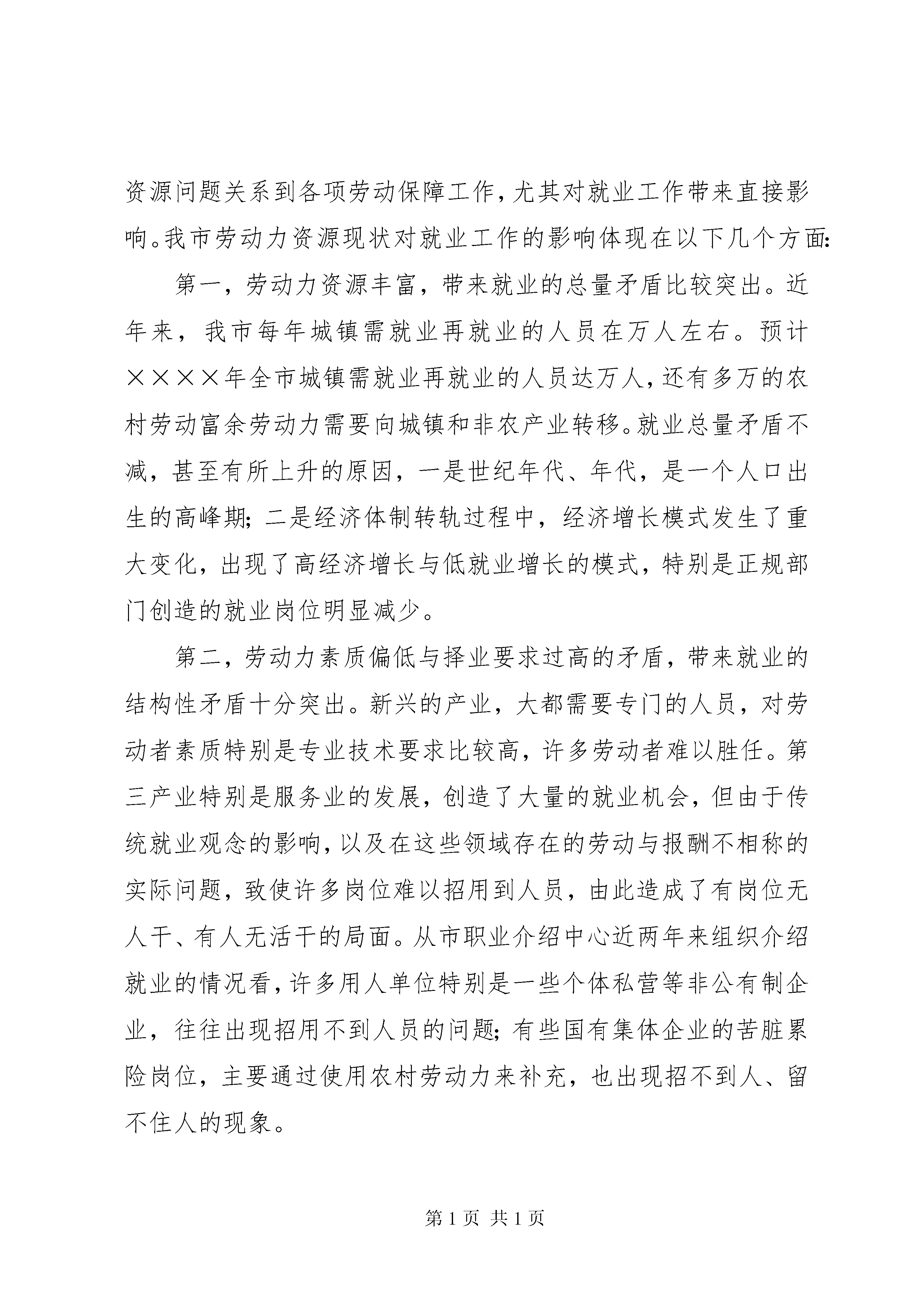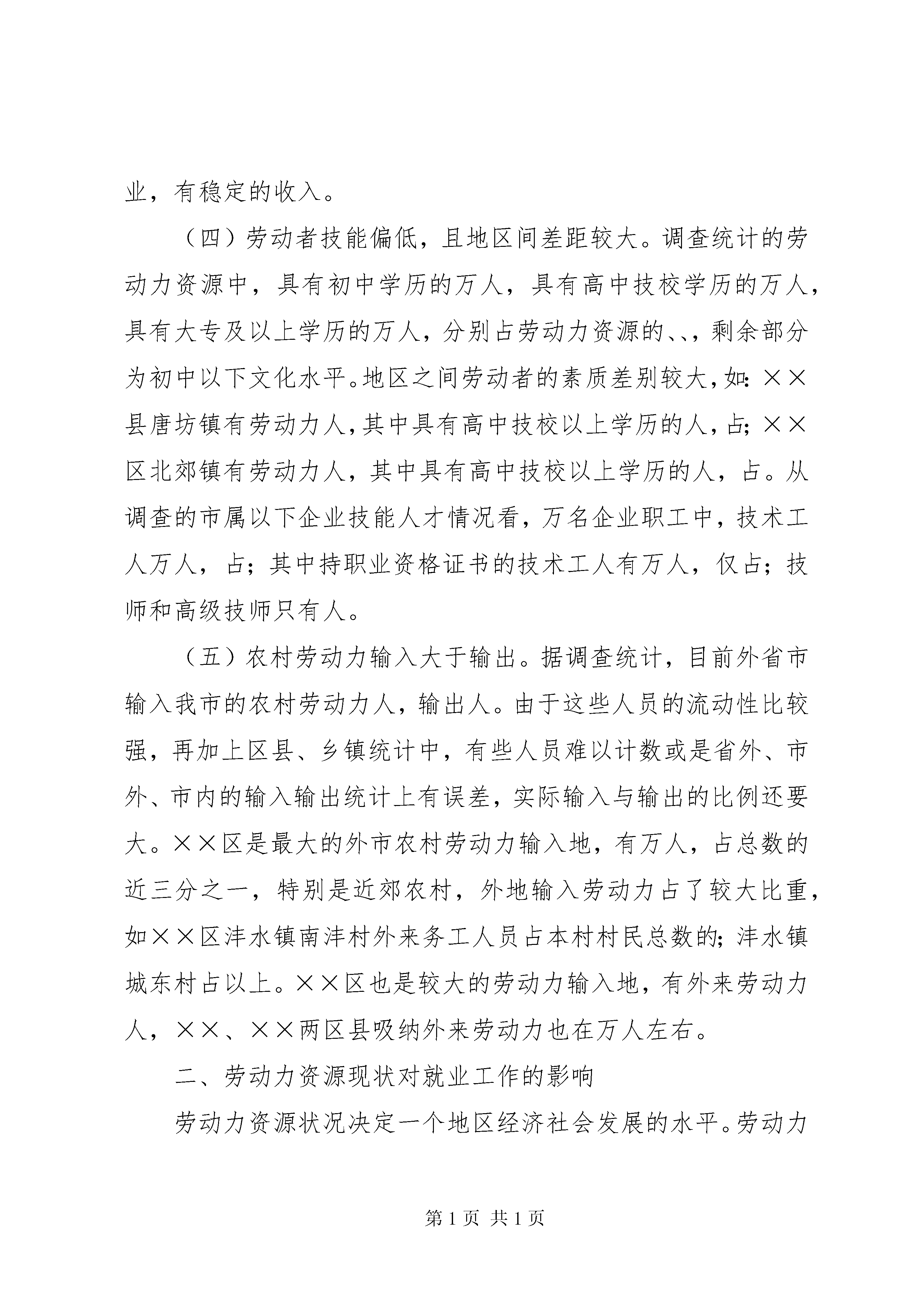 劳动力资源调研报告为全面掌握我市劳动力资源情况和企业技能人才状况,研究劳动力资源对我市就业工作的影响,探索优化劳动力资源配置,做好就业再就业工作的思路,我市各级劳动保障部门集中时间、集中人力,在全市开展了劳动力资源和企业技能人才状况调查。现根据调查情况提出如下调研报告。一、全市劳动力资源基本情况据统计局公布的统计资料,到××××年底,全市总人口为万人,其中劳动力资源总数为万人,占总人口的。本次劳动力资源调查统计的数据为:统计人口万人(主要是中央省属单位未统计在内),其中:非农业人口万人,农业人口万人,分别占、;劳动力资源总量为万人,占统计人口的。本报告以此次调查统计劳动力资源为分析基数。从调查统计的劳动力资源状况看,我市劳动力资源具有以下几个特点:(一)劳动力资源比较丰富,农村劳动力占得比重大。XX省作为一个人口大省,劳动力资源总量大。在全省个市中,我市属于劳动力资源比较丰富的城市。调查统计的劳动力资源中,城镇劳动力万人,农村劳动力万人,分别占整个劳动力资源的、。富余劳动力也比较多,调查统计约有万人。(二)同年龄段的男女劳动力比例基本持平。调查统计的劳动力资源中,男性劳动力万人(城镇万人、农村万人),女性劳动力万人(城镇万人、农村万人),分别占整个劳动力资源的、。其中—岁的男性劳动力为万人,女性劳动力万人,—岁的男性劳动力万人。(三)劳动力资源分布不均衡。一是从城镇与农村人口的比例看,各区县城市化水平差距比较大,××区城镇人口占总人口的,××、××两区县城镇与农村人口基本接近,其它区县城镇人口所占比重都在以下,其中三个县城镇人口占总人口的比重在以下。二是农村劳动力资源分布主要集中在××、××、××、××四个区县,依次为:万、万、万、万人,占农村劳动力资源总数的。××县农村劳动力为万人。三是区县之间、街道(乡镇)之间劳动力就业特别是富余劳动力情况差别较大,其中富余劳动力在万人以的区县有:××县人,××区人,××区人,另外,××区富余劳动力人,××区人。四是下岗失业人员相对集中。据调查统计,全市共有下岗失业人员人,其中下岗失业人员比较多的××区有人,占总数的;××区人,;数量比较少的区县为:开发区人,××县人。从一些街道办事处典型调查看,也体现了下岗失业人员相对集中、分布不均的特点,如××区××镇有下岗失业人员人,占劳动力资源的;XX县区丝绸路办事处辖区内有下岗失业人员人,占劳动力资源的;而××区××镇南仇南居委会是一个经济较为发达的街居,辖区内绝大多数劳动力都已就业,有稳定的收入。(四)劳动者技能偏低,且地区间差距较大。调查统计的劳动力资源中,具有初中学历的万人,具有高中技校学历的万人,具有大专及以上学历的万人,分别占劳动力资源的、、,剩余部分为初中以下文化水平。地区之间劳动者的素质差别较大,如:××县唐坊镇有劳动力人,其中具有高中技校以上学历的人,占;××区北郊镇有劳动力人,其中具有高中技校以上学历的人,占。从调查的市属以下企业技能人才情况看,万名企业职工中,技术工人万人,占;其中持职业资格证书的技术工人有万人,仅占;技师和高级技师只有人。(五)农村劳动力输入大于输出。据调查统计,目前外省市输入我市的农村劳动力人,输出人。由于这些人员的流动性比较强,再加上区县、乡镇统计中,有些人员难以计数或是省外、市外、市内的输入输出统计上有误差,实际输入与输出的比例还要大。××区是最大的外市农村劳动力输入地,有万人,占总数的近三分之一,特别是近郊农村,外地输入劳动力占了较大比重,如××区沣水镇南沣村外来务工人员占本村村民总数的;沣水镇城东村占以上。××区也是较大的劳动力输入地,有外来劳动力人,××、××两区县吸纳外来劳动力也在万人左右。二、劳动力资源现状对就业工作的影响劳动力资源状况决定一个地区经济社会发展的水平。劳动力资源问题关系到各项劳动保障工作,尤其对就业工作带来直接影响。我市劳动力资源现状对就业工作的影响体现在以下几个方面:第一,劳动力资源丰富,带来就业的总量矛盾比较突出。近年来,我市每年城镇需就业再就业的人员在万人左右。预计××××年全市城镇需就业再就业的人员达万人,还有多万的农村劳动富余劳动力需要向城镇和非农产业转移。就业总量矛盾不减,甚至有所上升的原因,一是世纪年代、年代,是一个人口出生的高峰期;二是经济体制转轨过程中,经济增长模式发生了重大变化,出现了高经济增长与低就业增长的模式,特别是正规部门创造的就业岗位明显减少。第二,劳动力素质偏低与择业要求过高的矛盾,带来就业的结构性矛盾十分突出。新兴的产业,大都需要专门的人员,对劳动者素质特别是专业技术要求比较高,许多劳动者难以胜任。第三产业特别是服务业的发展,创造了大量的就业机会,但由于传统就业观念的影响,以及在这些领域存在的劳动与报酬不相称的实际问题,