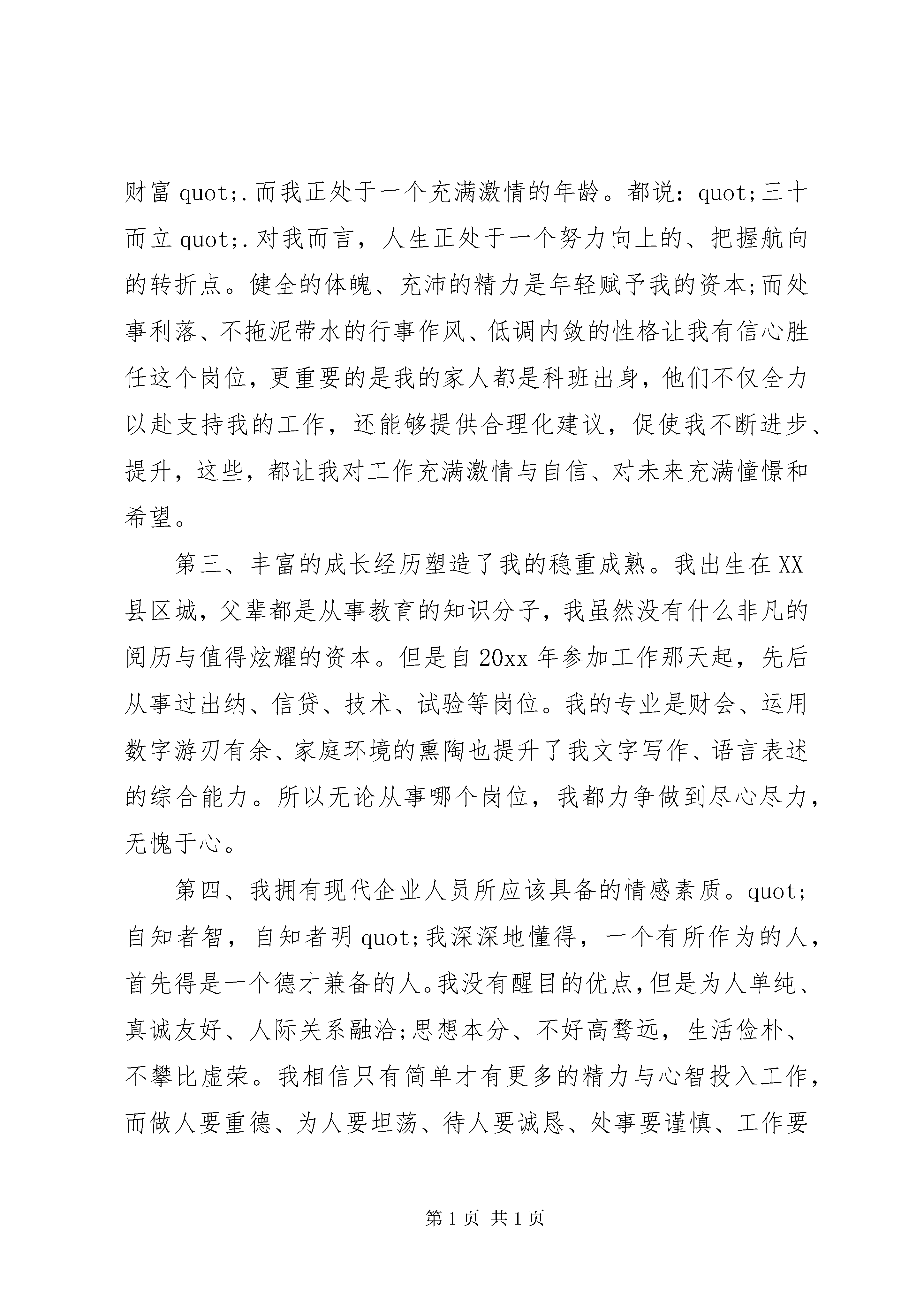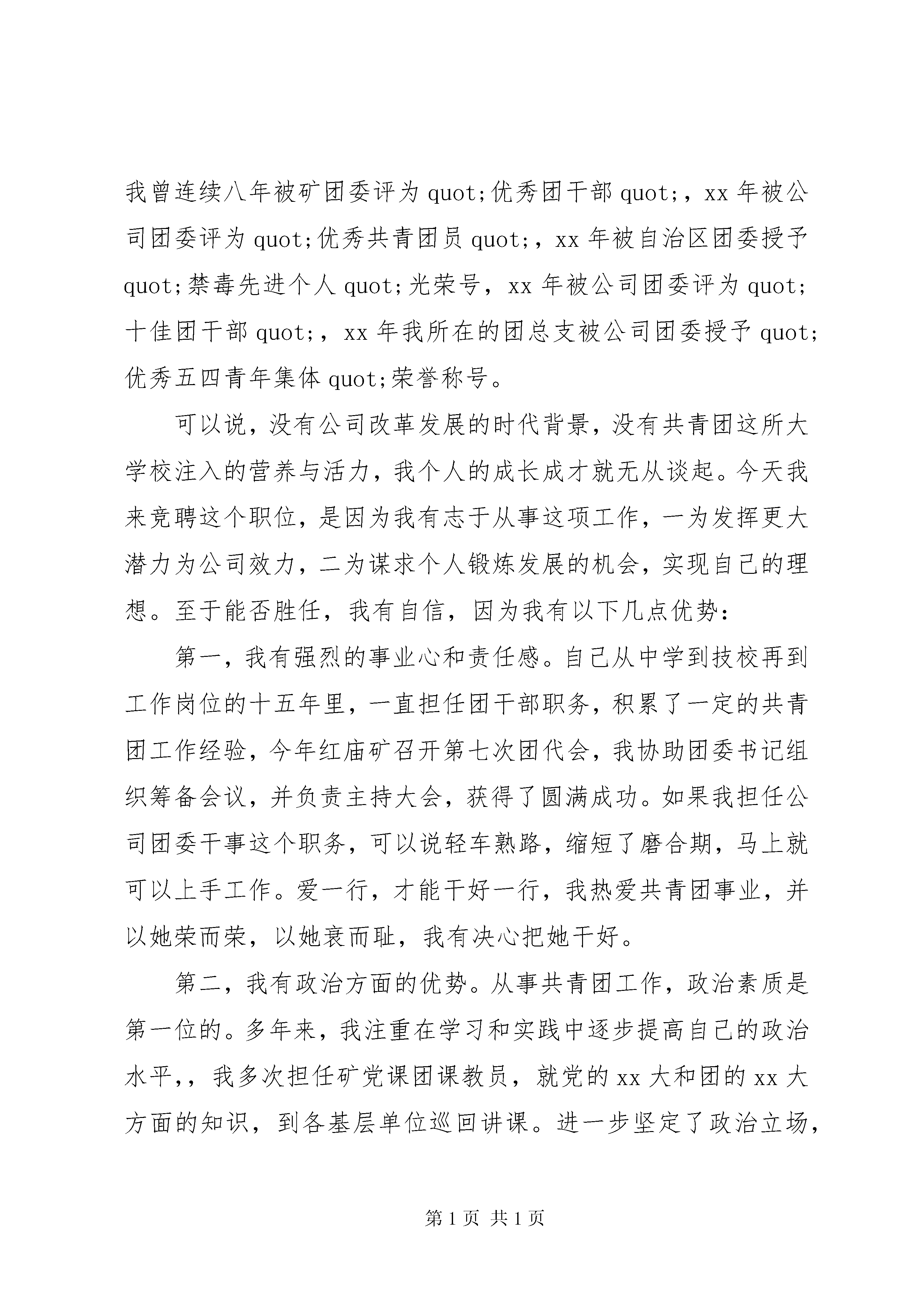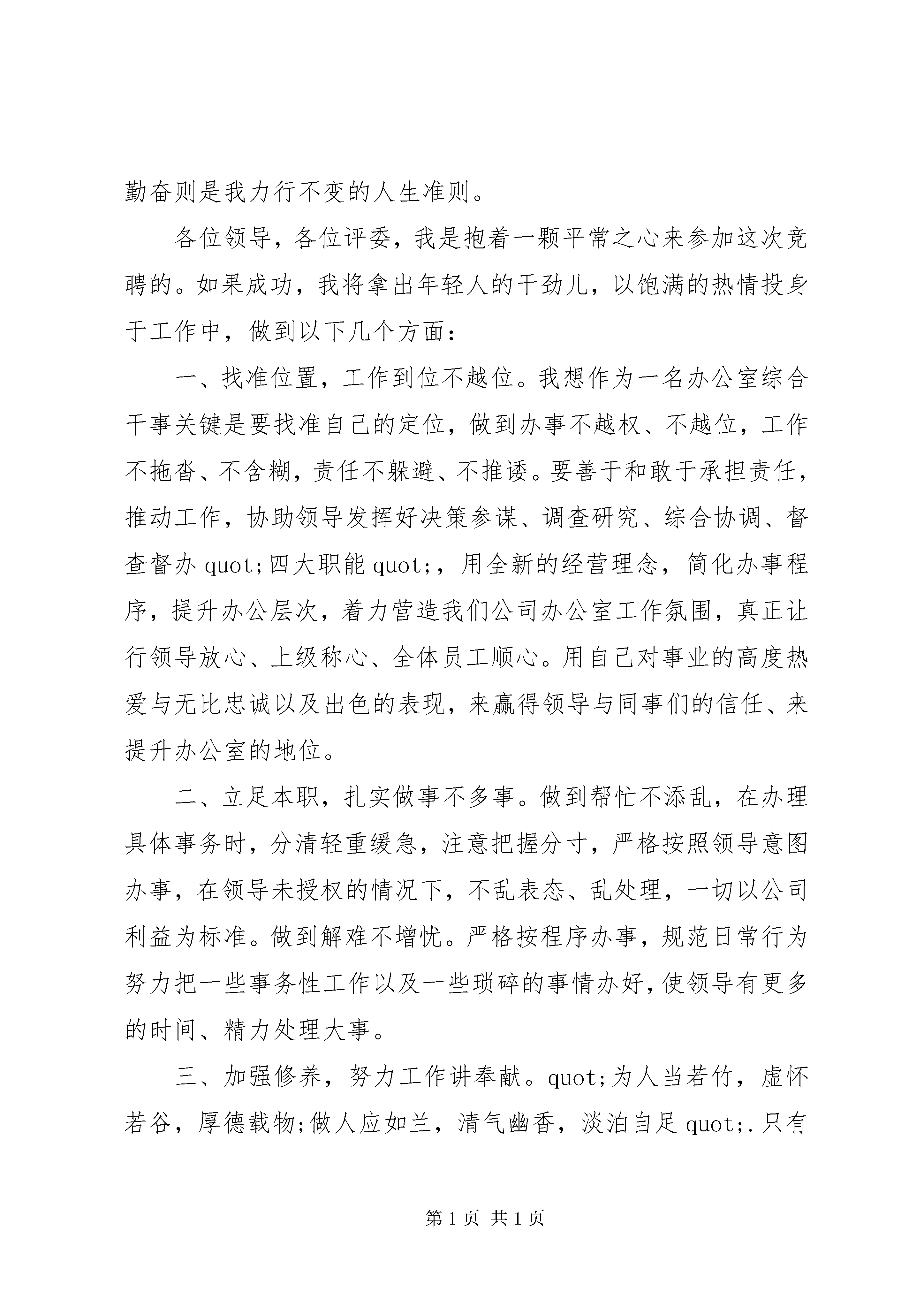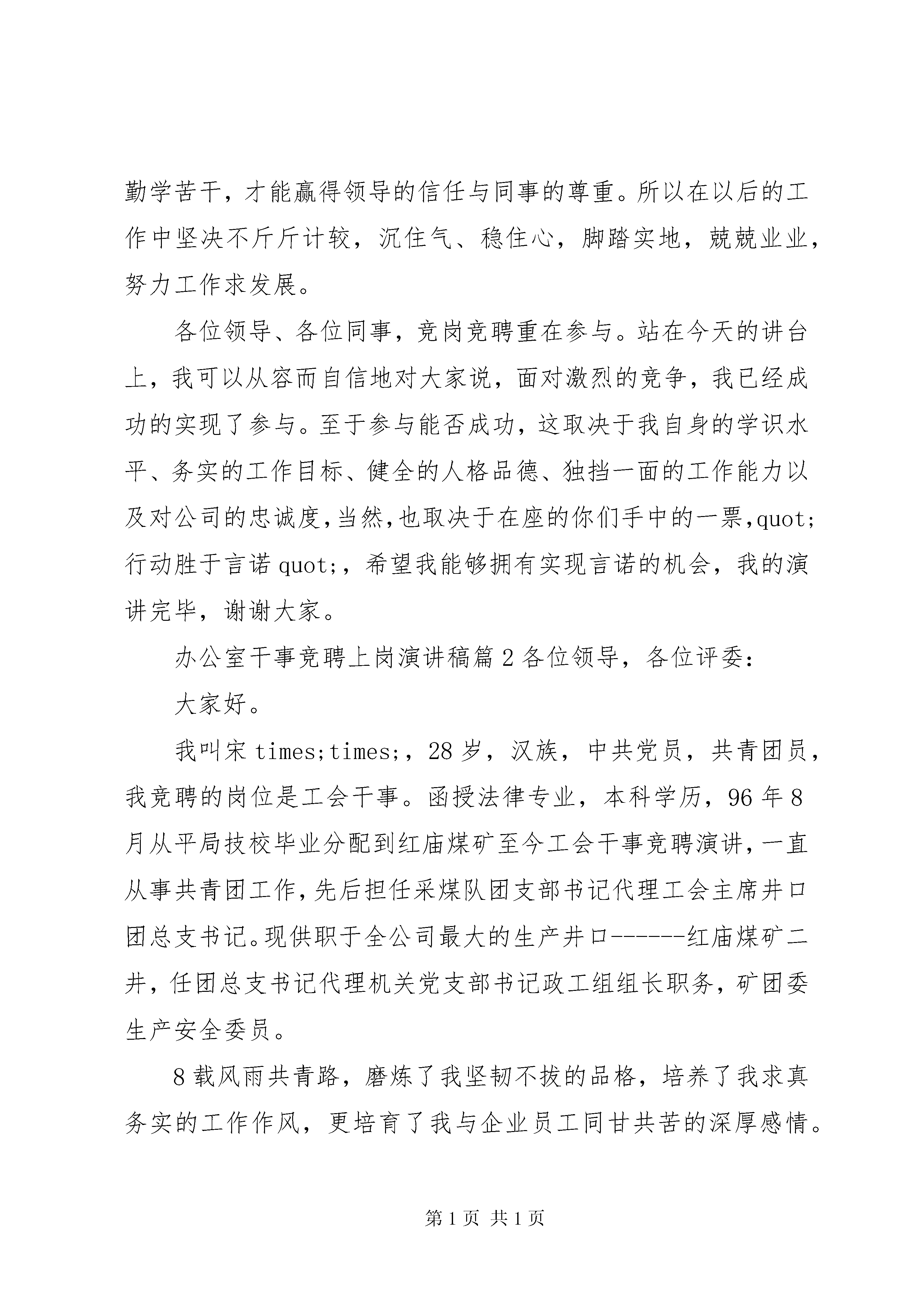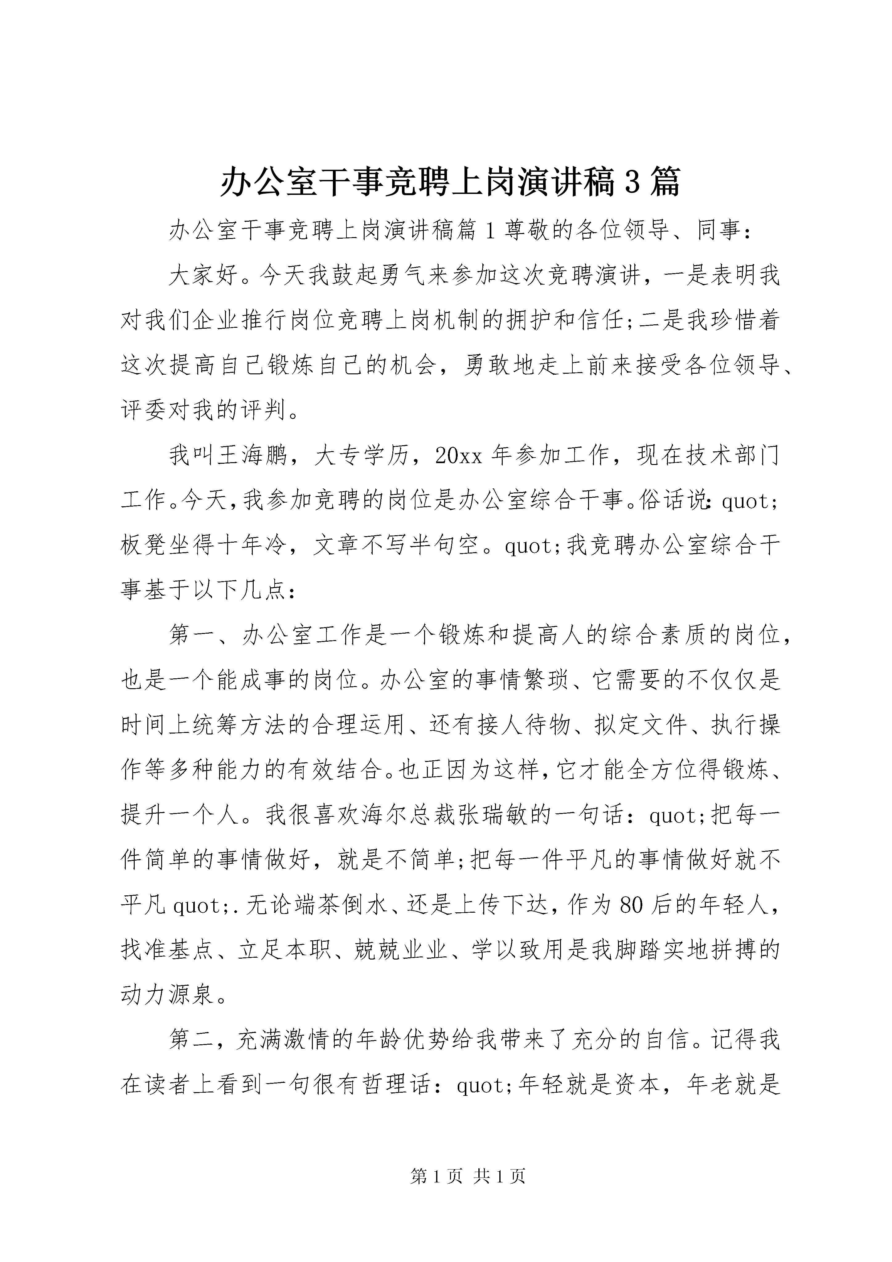 办公室干事竞聘上岗演讲稿3篇办公室干事竞聘上岗演讲稿篇1尊敬的各位领导、同事:大家好。今天我鼓起勇气来参加这次竞聘演讲,一是表明我对我们企业推行岗位竞聘上岗机制的拥护和信任;二是我珍惜着这次提高自己锻炼自己的机会,勇敢地走上前来接受各位领导、评委对我的评判。我叫王海鹏,大专学历,20xx年参加工作,现在技术部门工作。今天,我参加竞聘的岗位是办公室综合干事。俗话说:quot;板凳坐得十年冷,文章不写半句空。quot;我竞聘办公室综合干事基于以下几点:第一、办公室工作是一个锻炼和提高人的综合素质的岗位,也是一个能成事的岗位。办公室的事情繁琐、它需要的不仅仅是时间上统筹方法的合理运用、还有接人待物、拟定文件、执行操作等多种能力的有效结合。也正因为这样,它才能全方位得锻炼、提升一个人。我很喜欢海尔总裁张瑞敏的一句话:quot;把每一件简单的事情做好,就是不简单;把每一件平凡的事情做好就不平凡quot;.无论端茶倒水、还是上传下达,作为80后的年轻人,找准基点、立足本职、兢兢业业、学以致用是我脚踏实地拼搏的动力源泉。第二,充满激情的年龄优势给我带来了充分的自信。记得我在读者上看到一句很有哲理话:quot;年轻就是资本,年老就是财富quot;.而我正处于一个充满激情的年龄。都说:quot;三十而立quot;.对我而言,人生正处于一个努力向上的、把握航向的转折点。健全的体魄、充沛的精力是年轻赋予我的资本;而处事利落、不拖泥带水的行事作风、低调内敛的性格让我有信心胜任这个岗位,更重要的是我的家人都是科班出身,他们不仅全力以赴支持我的工作,还能够提供合理化建议,促使我不断进步、提升,这些,都让我对工作充满激情与自信、对未来充满憧憬和希望。第三、丰富的成长经历塑造了我的稳重成熟。我出生在XX县区城,父辈都是从事教育的知识分子,我虽然没有什么非凡的阅历与值得炫耀的资本。但是自20xx年参加工作那天起,先后从事过出纳、信贷、技术、试验等岗位。我的专业是财会、运用数字游刃有余、家庭环境的熏陶也提升了我文字写作、语言表述的综合能力。所以无论从事哪个岗位,我都力争做到尽心尽力,无愧于心。第四、我拥有现代企业人员所应该具备的情感素质。quot;自知者智,自知者明quot;我深深地懂得,一个有所作为的人,首先得是一个德才兼备的人。我没有醒目的优点,但是为人单纯、真诚友好、人际关系融洽;思想本分、不好高骛远,生活俭朴、不攀比虚荣。我相信只有简单才有更多的精力与心智投入工作,而做人要重德、为人要坦荡、待人要诚恳、处事要谨慎、工作要勤奋则是我力行不变的人生准则。各位领导,各位评委,我是抱着一颗平常之心来参加这次竞聘的。如果成功,我将拿出年轻人的干劲儿,以饱满的热情投身于工作中,做到以下几个方面:一、找准位置,工作到位不越位。我想作为一名办公室综合干事关键是要找准自己的定位,做到办事不越权、不越位,工作不拖沓、不含糊,责任不躲避、不推诿。要善于和敢于承担责任,推动工作,协助领导发挥好决策参谋、调查研究、综合协调、督查督办quot;四大职能quot;,用全新的经营理念,简化办事程序,提升办公层次,着力营造我们公司办公室工作氛围,真正让行领导放心、上级称心、全体员工顺心。用自己对事业的高度热爱与无比忠诚以及出色的表现,来赢得领导与同事们的信任、来提升办公室的地位。二、立足本职,扎实做事不多事。做到帮忙不添乱,在办理具体事务时,分清轻重缓急,注意把握分寸,严格按照领导意图办事,在领导未授权的情况下,不乱表态、乱处理,一切以公司利益为标准。做到解难不增忧。严格按程序办事,规范日常行为努力把一些事务性工作以及一些琐碎的事情办好,使领导有更多的时间、精力处理大事。三、加强修养,努力工作讲奉献。quot;为人当若竹,虚怀若谷,厚德载物;做人应如兰,清气幽香,淡泊自足quot;.只有勤学苦干,才能赢得领导的信任与同事的尊重。所以在以后的工作中坚决不斤斤计较,沉住气、稳住心,脚踏实地,兢兢业业,努力工作求发展。各位领导、各位同事,竞岗竞聘重在参与。站在今天的讲台上,我可以从容而自信地对大家说,面对激烈的竞争,我已经成功的实现了参与。至于参与能否成功,这取决于我自身的学识水平、务实的工作目标、健全的人格品德、独挡一面的工作能力以及对公司的忠诚度,当然,也取决于在座的你们手中的一票,quot;行动胜于言诺quot;,希望我能够拥有实现言诺的机会,我的演讲完毕,谢谢大家。办公室干事竞聘上岗演讲稿篇2各位领导,各位评委:大家好。我叫宋times;times;,28岁,汉族,中共党员,共青团员,我竞聘的岗位是工会干事。函授法律专业,本科学历,96年8月从平局技校毕业分配到红庙煤矿至今工会干事竞聘演讲,一直从事共青团工作,先后担任采煤队团支部书记代理工会主席井口团总支书记