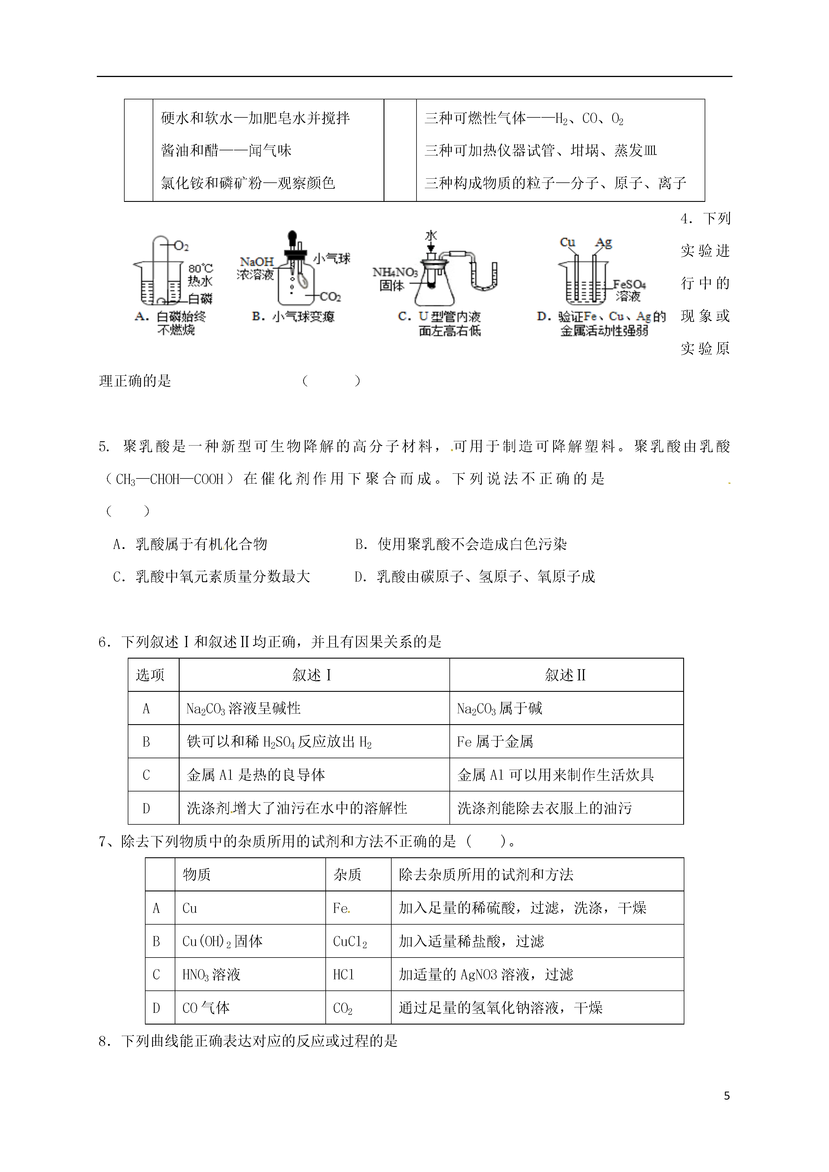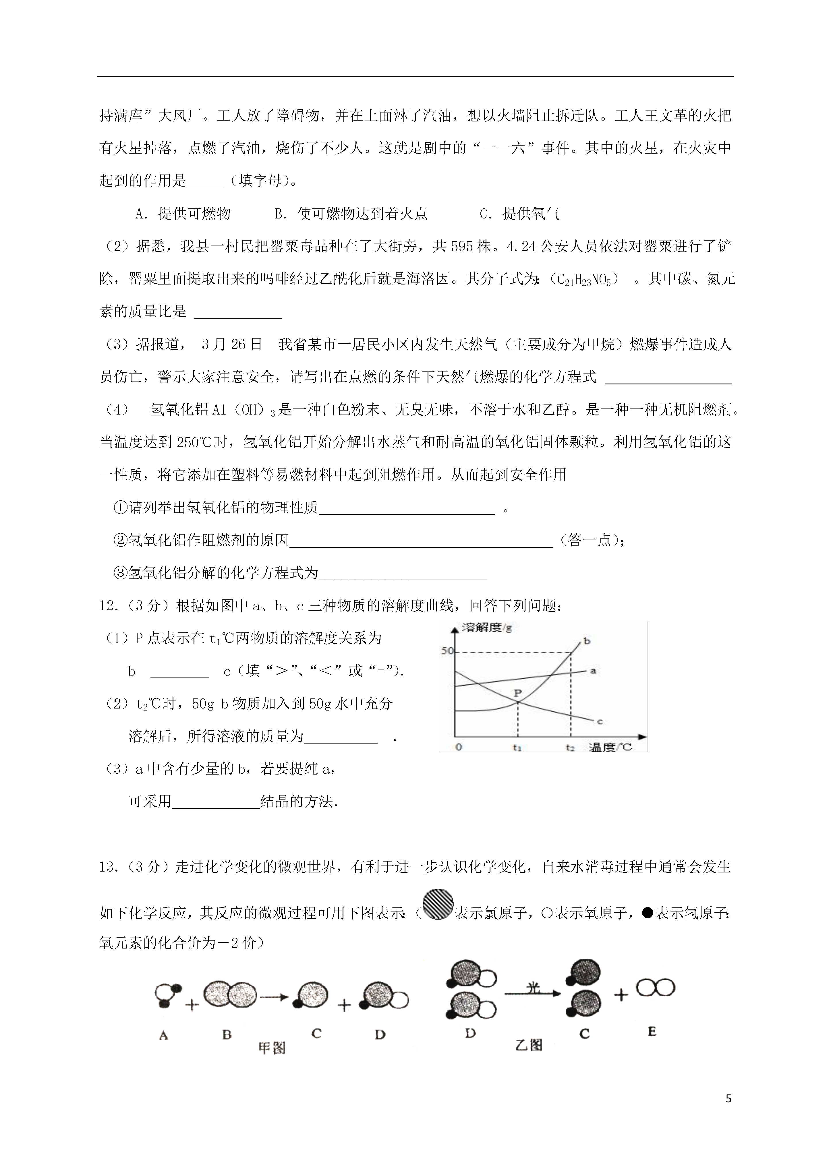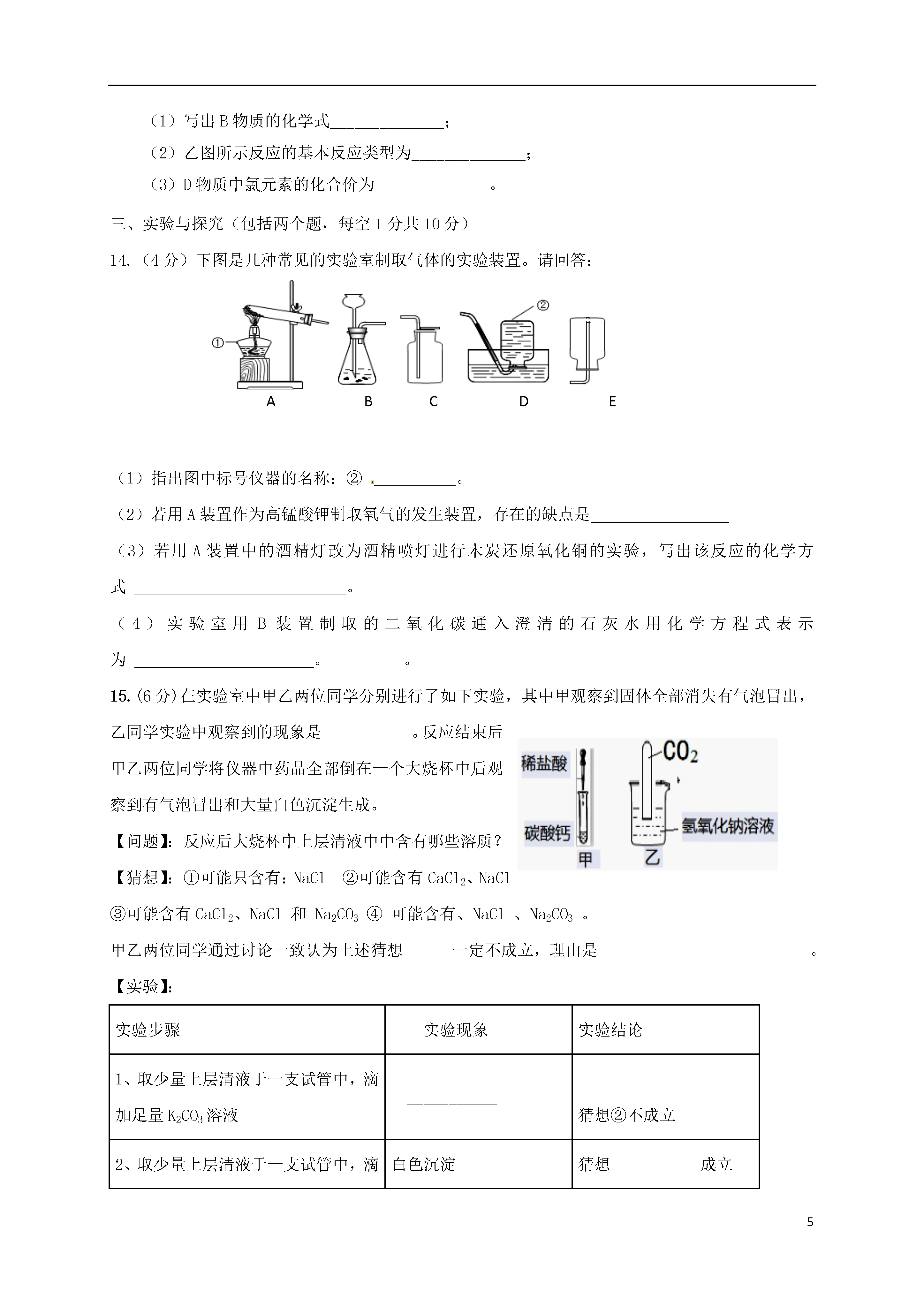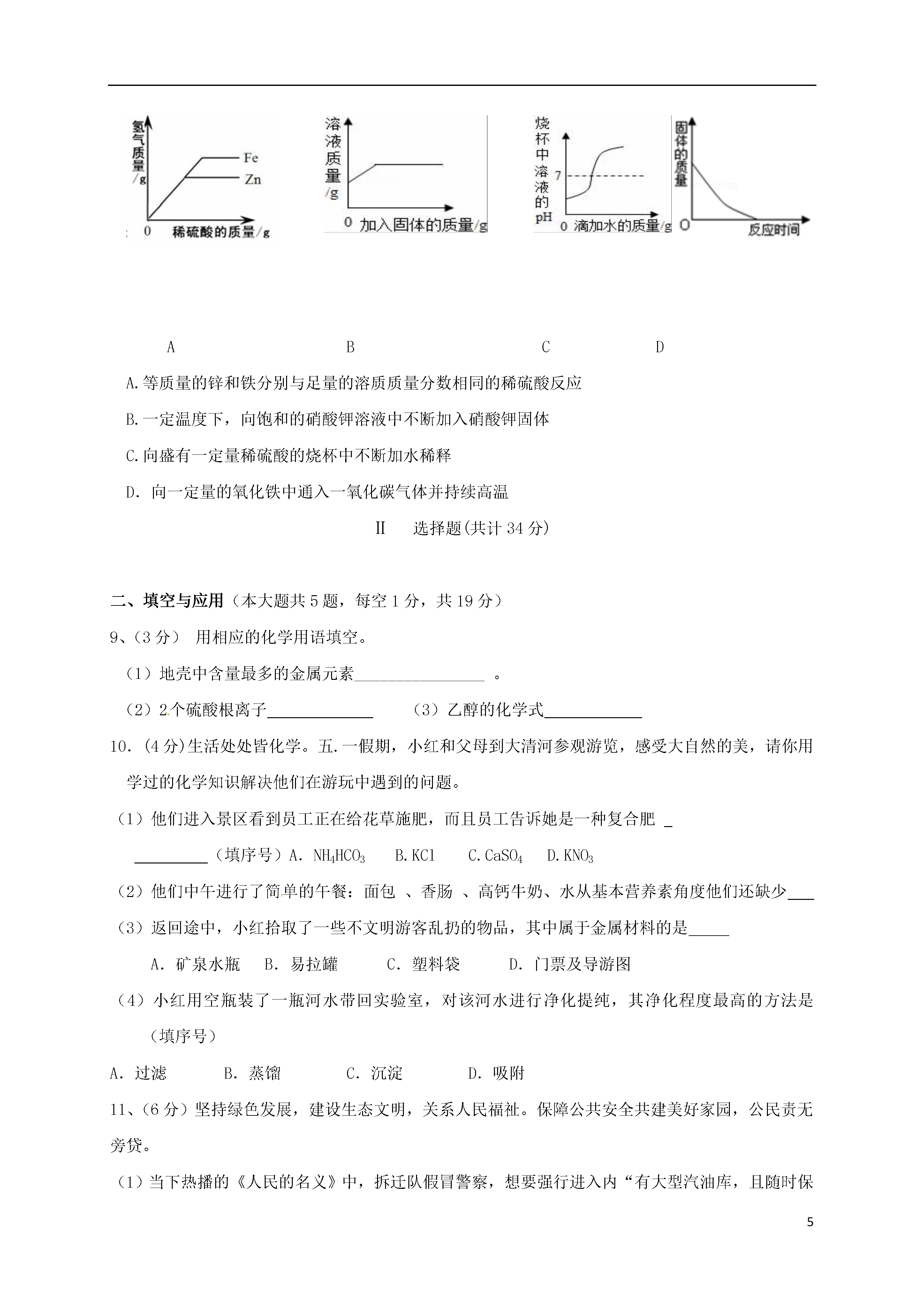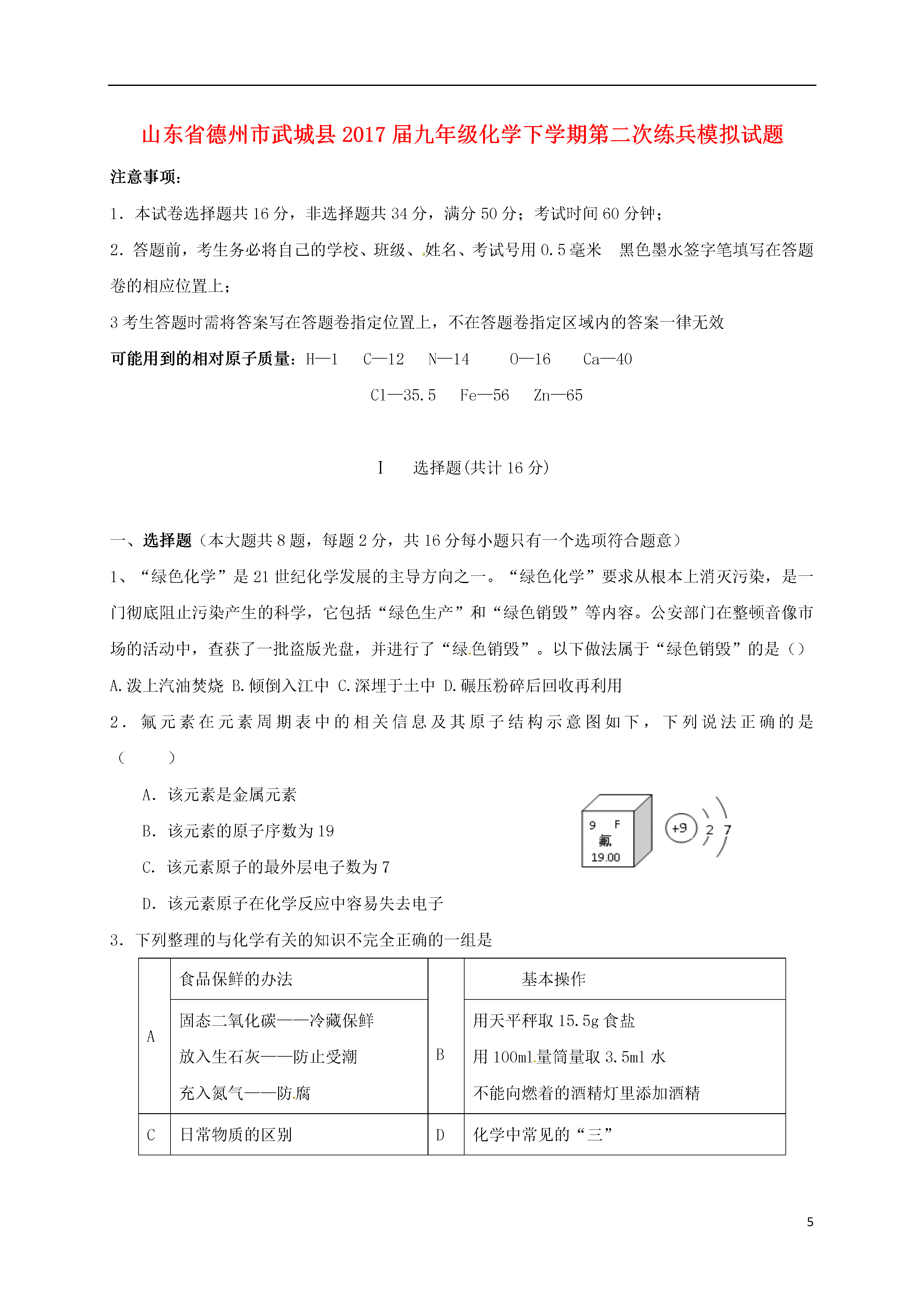 5山东省德州市武城县2017届九年级化学下学期第二次练兵模拟试题注意事项:1.本试卷选择题共16分,非选择题共34分,满分50分;考试时间60分钟;2.答题前,考生务必将自己的学校、班级、姓名、考试号用0.5毫米黑色墨水签字笔填写在答题卷的相应位置上;3考生答题时需将答案写在答题卷指定位置上,不在答题卷指定区域内的答案一律无效可能用到的相对原子质量:H—1C—12N—14O—16Ca—40Cl—35.5Fe—56Zn—65Ⅰ选择题(共计16分)一、选择题(本大题共8题,每题2分,共16分每小题只有一个选项符合题意)1、“绿色化学”是21世纪化学发展的主导方向之一。“绿色化学”要求从根本上消灭污染,是一门彻底阻止污染产生的科学,它包括“绿色生产”和“绿色销毁”等内容。公安部门在整顿音像市场的活动中,查获了一批盗版光盘,并进行了“绿色销毁”。以下做法属于“绿色销毁”的是()A.泼上汽油焚烧B.倾倒入江中C.深埋于土中D.碾压粉碎后回收再利用2.氟元素在元素周期表中的相关信息及其原子结构示意图如下,下列说法正确的是()A.该元素是金属元素B.该元素的原子序数为19C.该元素原子的最外层电子数为7D.该元素原子在化学反应中容易失去电子3.下列整理的与化学有关的知识不完全正确的一组是A食品保鲜的办法B基本操作固态二氧化碳——冷藏保鲜放入生石灰——防止受潮充入氮气——防腐用天平秤取15.5g食盐用100ml量筒量取3.5ml水不能向燃着的酒精灯里添加酒精C日常物质的区别D化学中常见的“三”硬水和软水—加肥皂水并搅拌酱油和醋——闻气味氯化铵和磷矿粉—观察颜色三种可燃性气体——H2、CO、O2三种可加热仪器试管、坩埚、蒸发皿三种构成物质的粒子—分子、原子、离子4.下列实验进行中的现象或实验原理正确的是()5.聚乳酸是一种新型可生物降解的高分子材料,可用于制造可降解塑料。聚乳酸由乳酸(CH3—CHOH—COOH)在催化剂作用下聚合而成。下列说法不正确的是()A.乳酸属于有机化合物B.使用聚乳酸不会造成白色污染C.乳酸中氧元素质量分数最大D.乳酸由碳原子、氢原子、氧原子成6.下列叙述Ⅰ和叙述Ⅱ均正确,并且有因果关系的是选项叙述Ⅰ叙述ⅡANa2CO3溶液呈碱性Na2CO3属于碱B铁可以和稀H2SO4反应放出H2Fe属于金属C金属Al是热的良导体金属Al可以用来制作生活炊具D洗涤剂增大了油污在水中的溶解性洗涤剂能除去衣服上的油污7、除去下列物质中的杂质所用的试剂和方法不正确的是()。物质杂质除去杂质所用的试剂和方法ACuFe加入足量的稀硫酸,过滤,洗涤,干燥BCu(OH)2固体CuCl2加入适量稀盐酸,过滤CHNO3溶液HCl加适量的AgNO3溶液,过滤DCO气体CO2通过足量的氢氧化钠溶液,干燥8.下列曲线能正确表达对应的反应或过程的是ABCDA.等质量的锌和铁分别与足量的溶质质量分数相同的稀硫酸反应B.一定温度下,向饱和的硝酸钾溶液中不断加入硝酸钾固体C.向盛有一定量稀硫酸的烧杯中不断加水稀释D.向一定量的氧化铁中通入一氧化碳气体并持续高温Ⅱ选择题(共计34分)二、填空与应用(本大题共5题,每空1分,共19分)9、(3分)用相应的化学用语填空。(1)地壳中含量最多的金属元素________________。(2)2个硫酸根离子(3)乙醇的化学式10.(4分)生活处处皆化学。五.一假期,小红和父母到大清河参观游览,感受大自然的美,请你用学过的化学知识解决他们在游玩中遇到的问题。(1)他们进入景区看到员工正在给花草施肥,而且员工告诉她是一种复合肥(填序号)A.NH4HCO3B.KClC.CaSO4D.KNO3(2)他们中午进行了简单的午餐:面包、香肠、高钙牛奶、水从基本营养素角度他们还缺少(3)返回途中,小红拾取了一些不文明游客乱扔的物品,其中属于金属材料的是A.矿泉水瓶B.易拉罐C.塑料袋D.门票及导游图(4)小红用空瓶装了一瓶河水带回实验室,对该河水进行净化提纯,其净化程度最高的方法是(填序号)A.过滤B.蒸馏C.沉淀D.吸附11、(6分)坚持绿色发展,建设生态文明,关系人民福祉。保障公共安全共建美好家园,公民责无旁贷。(1)当下热播的《人民的名义》中,拆迁队假冒警察,想要强行进入内“有大型汽油库,且随时保持满库”大风厂。工人放了障碍物,并在上面淋了汽油,想以火墙阻止拆迁队。工人王文革的火把有火星掉落,点燃了汽油,烧伤了不少人。这就是剧中的“一一六”事件。其中的火星,在火灾中起到的作用是(填字母)。A.提供可燃物B.使可燃物达到着火点C.提供氧气(2)据悉,我县一村民把罂粟毒品种在了大街旁,共