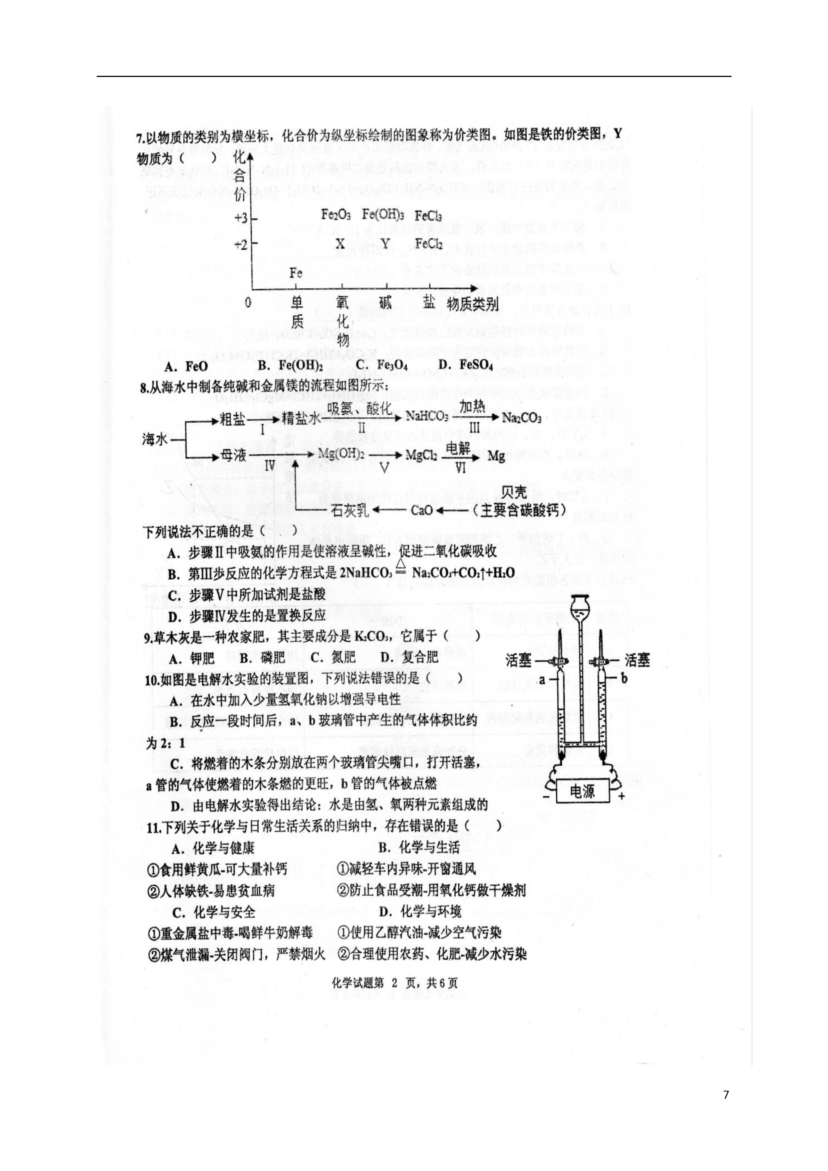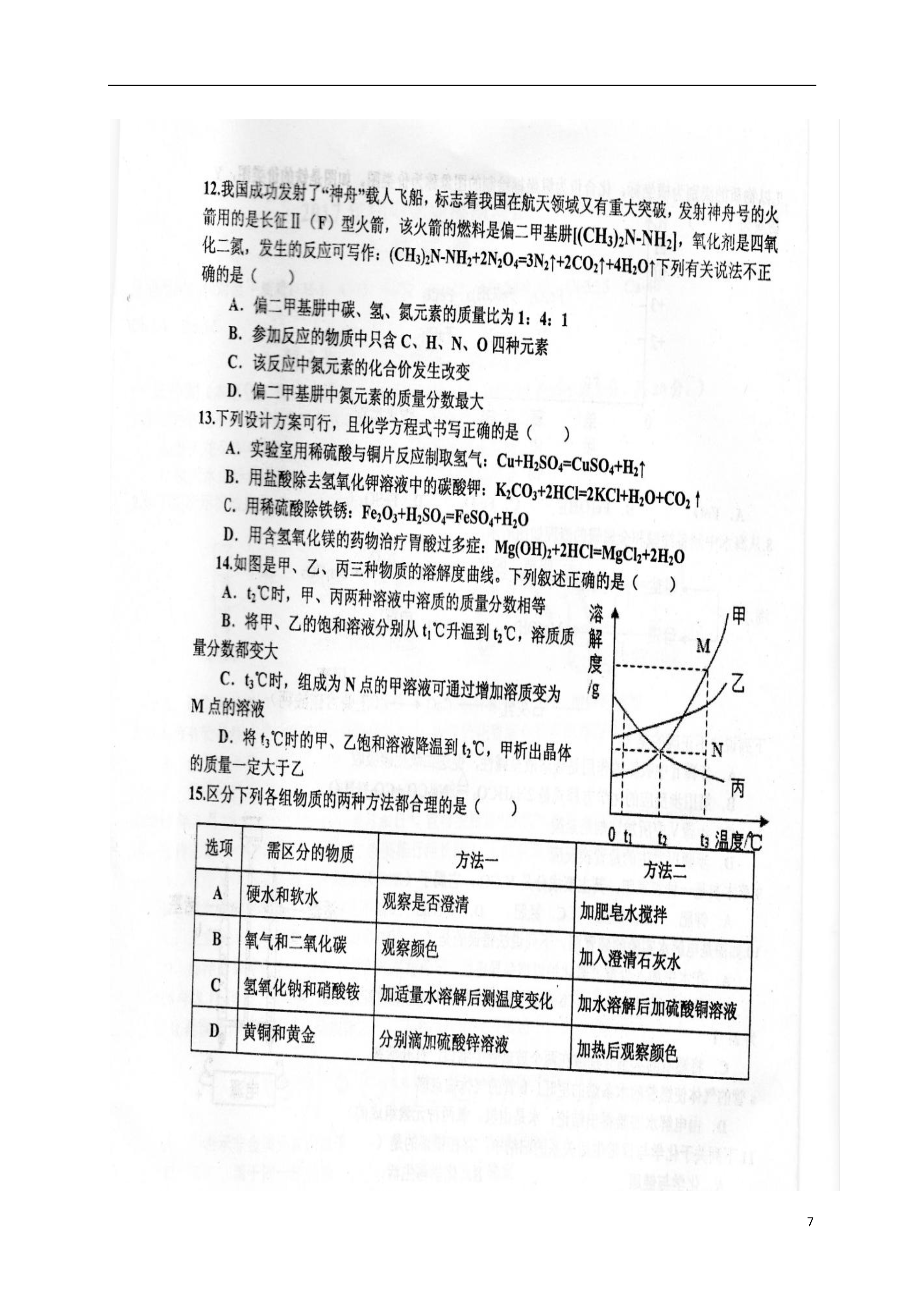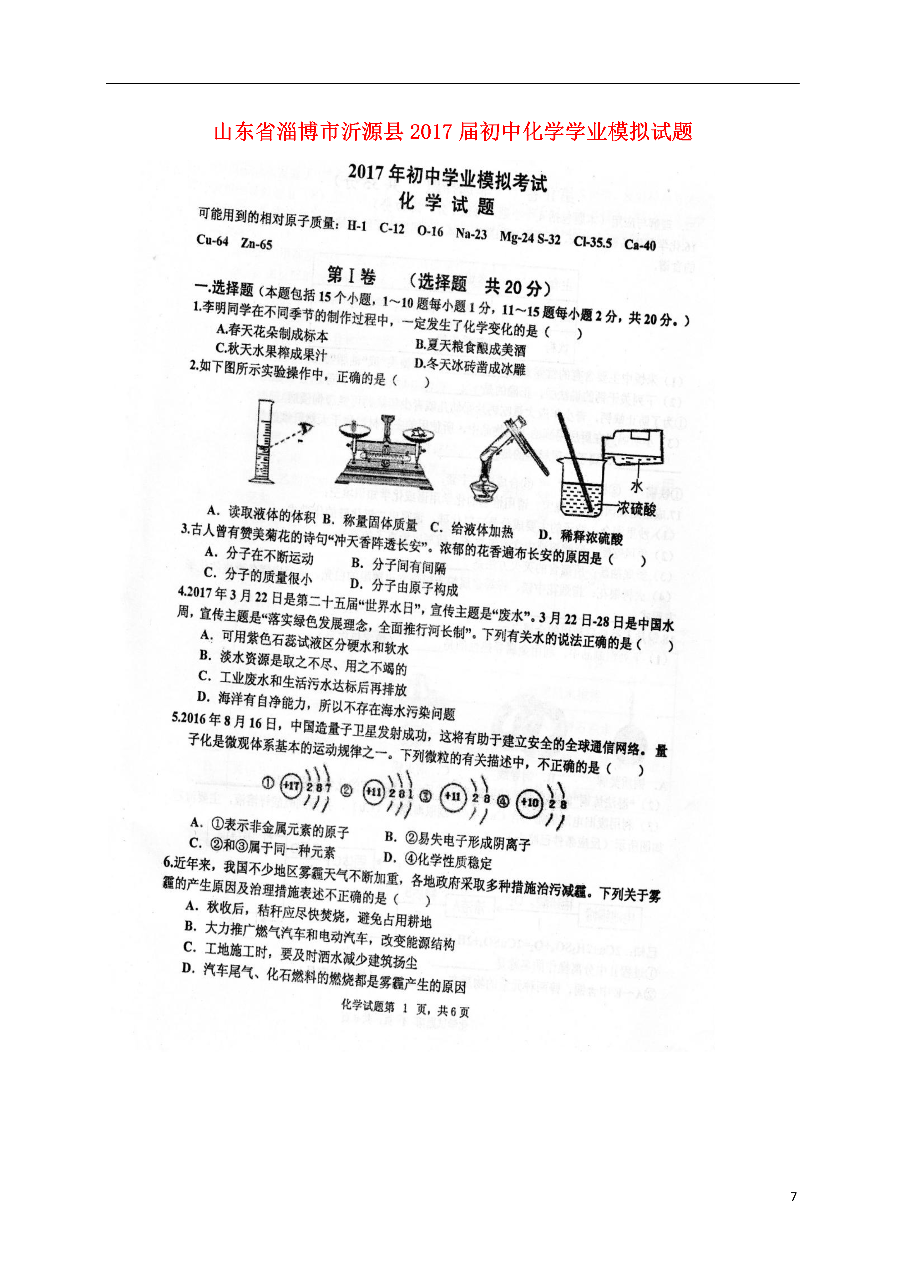 7山东省淄博市沂源县2017届初中化学学业模拟试题