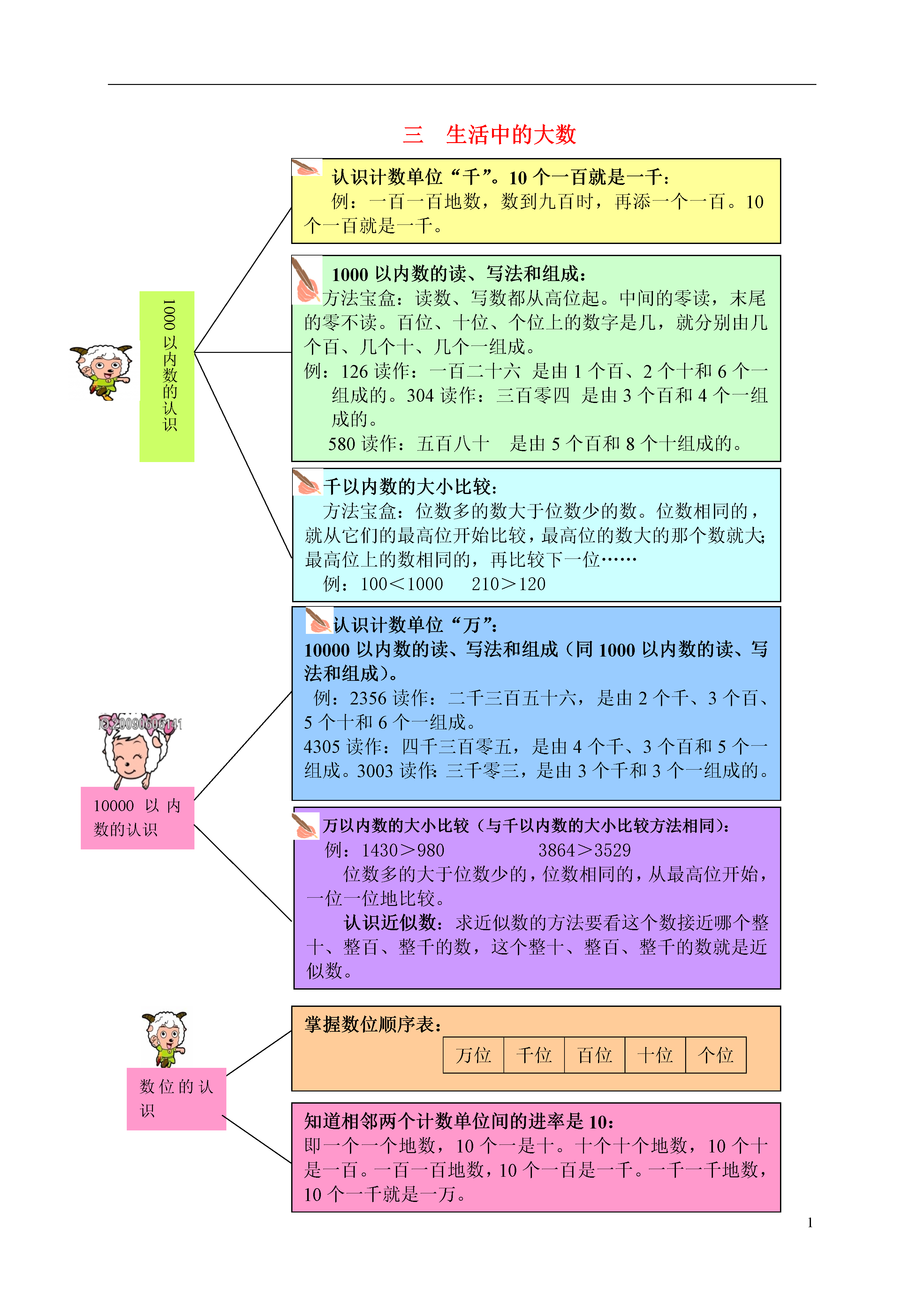 1三生活中的大数认识计数单位“千”。10个一百就是一千:例:一百一百地数,数到九百时,再添一个一百。10个一百就是一千。11000以内数的读、写法和组成:方法宝盒:读数、写数都从高位起。中间的零读,末尾的零不读。百位、十位、个位上的数字是几,就分别由几个百、几个十、几个一组成。例:126读作:一百二十六是由1个百、2个十和6个一组成的。304读作:三百零四是由3个百和4个一组成的。580读作:五百八十是由5个百和8个十组成的。1000以内数的认识千以内数的大小比较:方法宝盒:位数多的数大于位数少的数。位数相同的,就从它们的最高位开始比较,最高位的数大的那个数就大;最高位上的数相同的,再比较下一位……例:100<1000210>120认识计数单位“万”:10000以内数的读、写法和组成(同1000以内数的读、写法和组成)。例:2356读作:二千三百五十六,是由2个千、3个百、5个十和6个一组成。4305读作:四千三百零五,是由4个千、3个百和5个一组成。3003读作:三千零三,是由3个千和3个一组成的。10000以内数的认识万以内数的大小比较(与千以内数的大小比较方法相同):例:1430>9803864>3529位数多的大于位数少的,位数相同的,从最高位开始,一位一位地比较。认识近似数:求近似数的方法要看这个数接近哪个整十、整百、整千的数,这个整十、整百、整千的数就是近似数。例:1500是1506的近似数,10000是9992的近似数。掌握数位顺序表:万位千位百位十位个位。数位的认识知道相邻两个计数单位间的进率是10:即一个一个地数,10个一是十。十个十个地数,10个十是一百。一百一百地数,10个一百是一千。一千一千地数,10个一千就是一万。