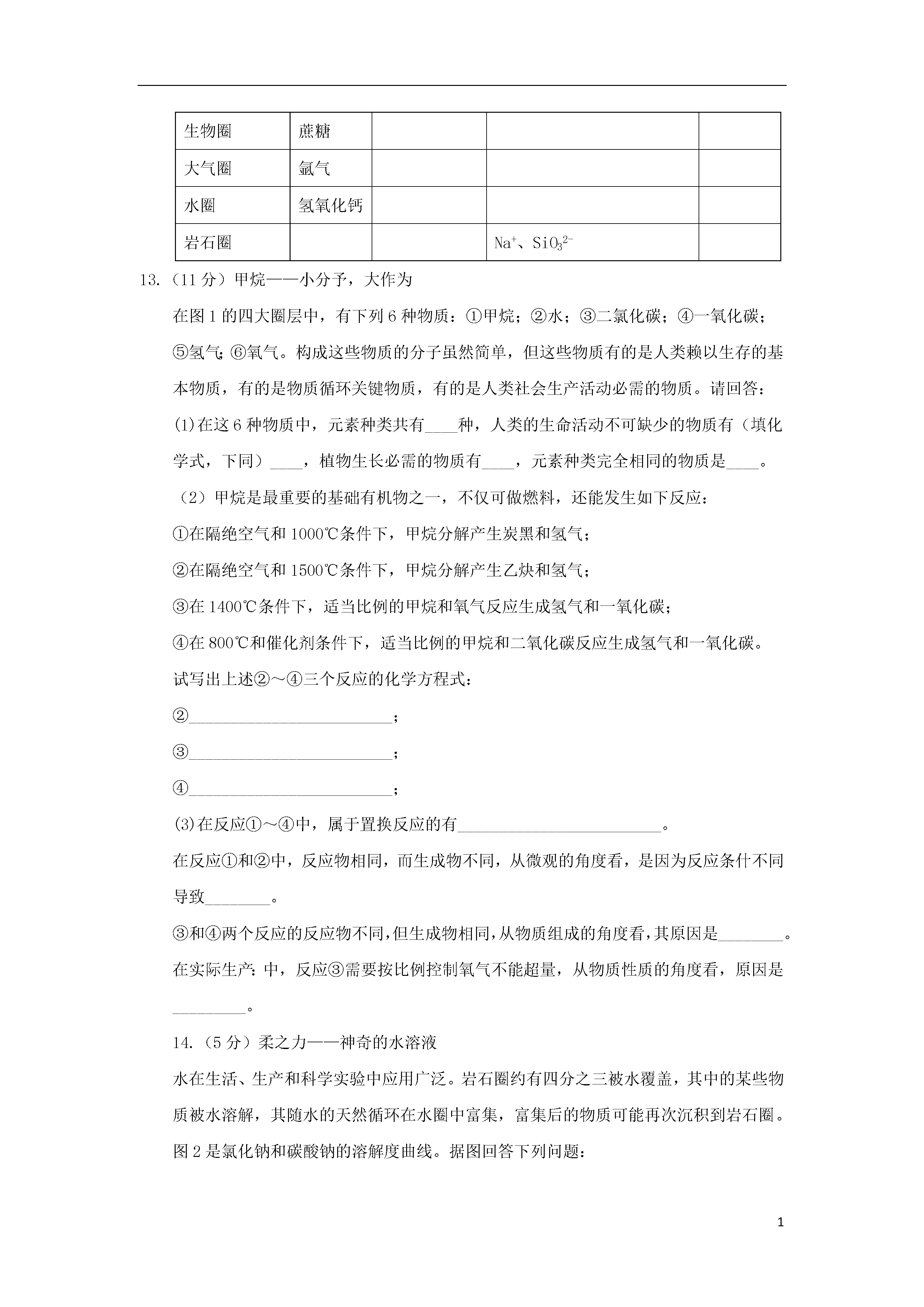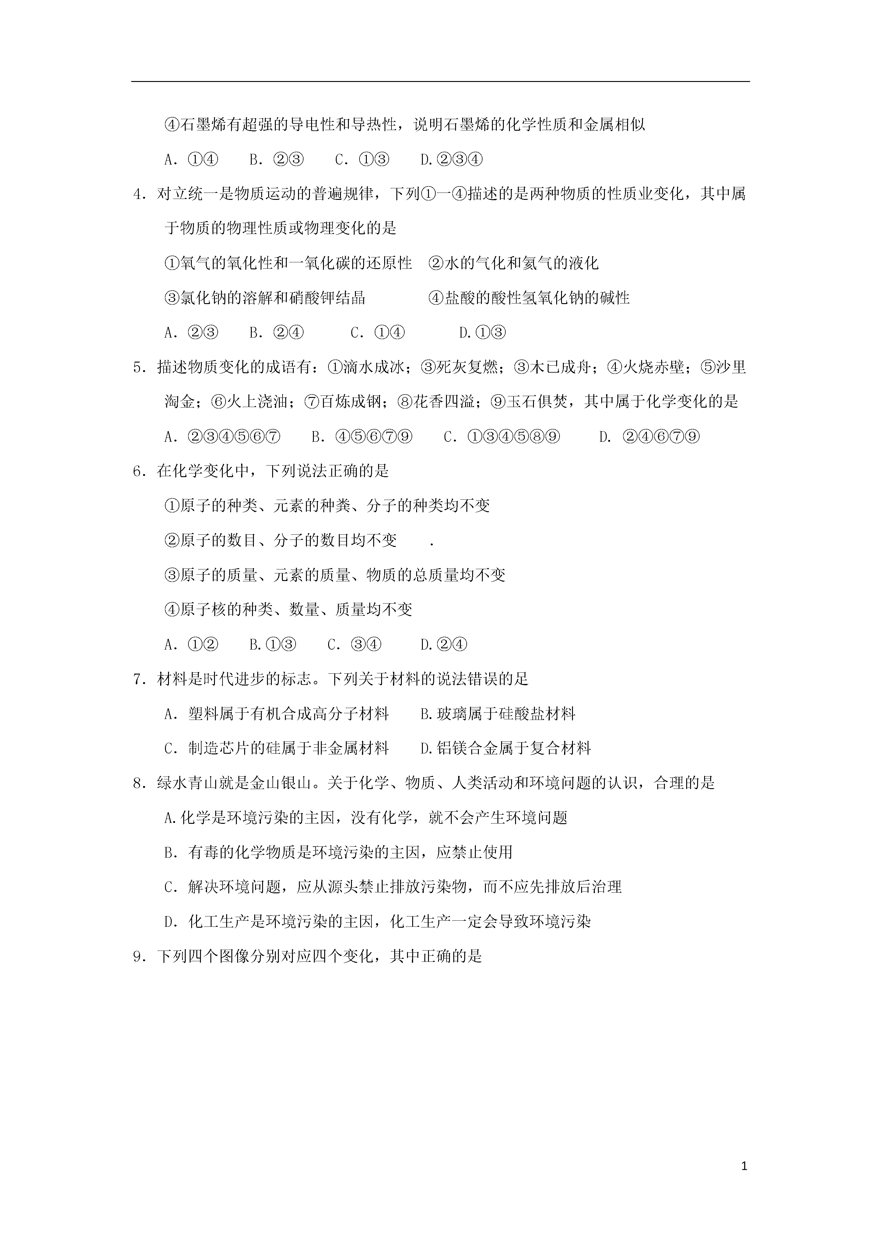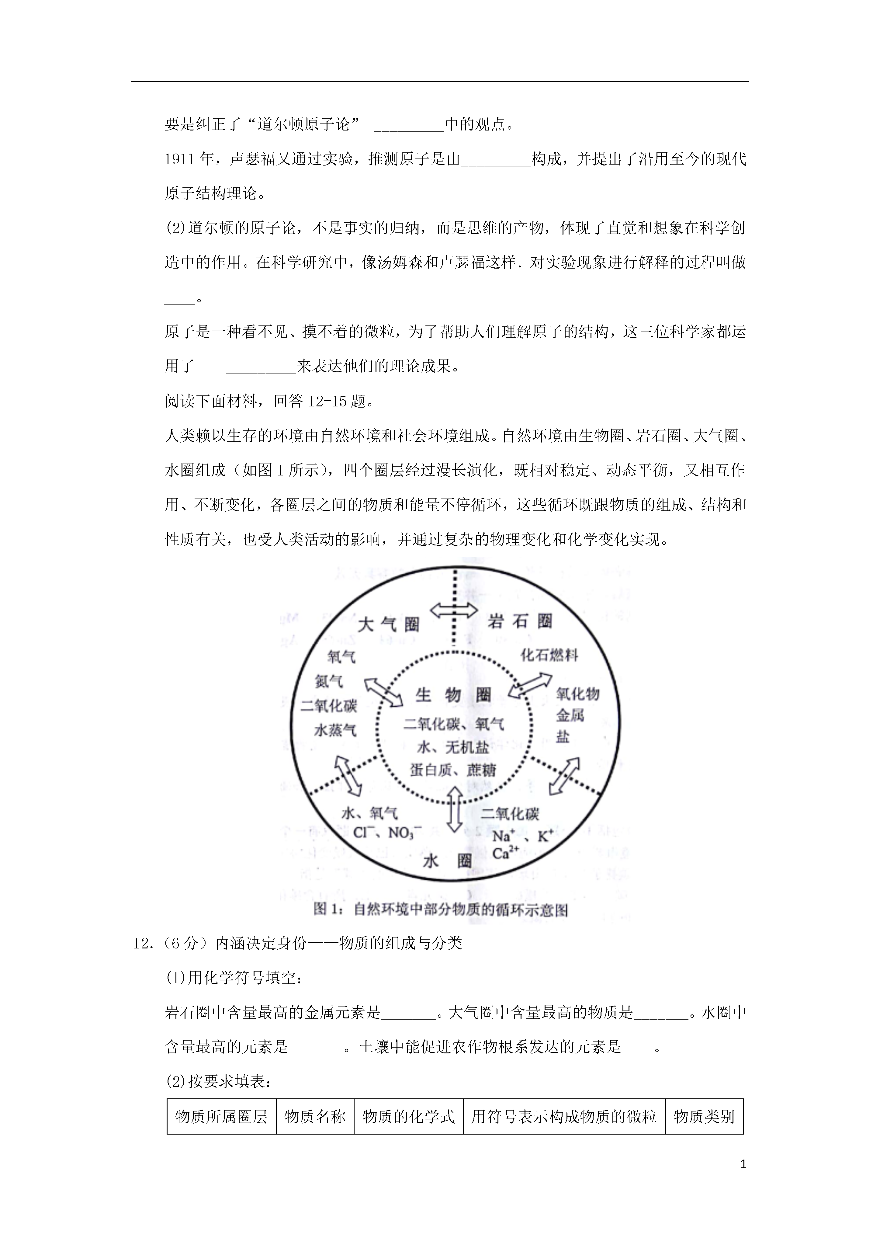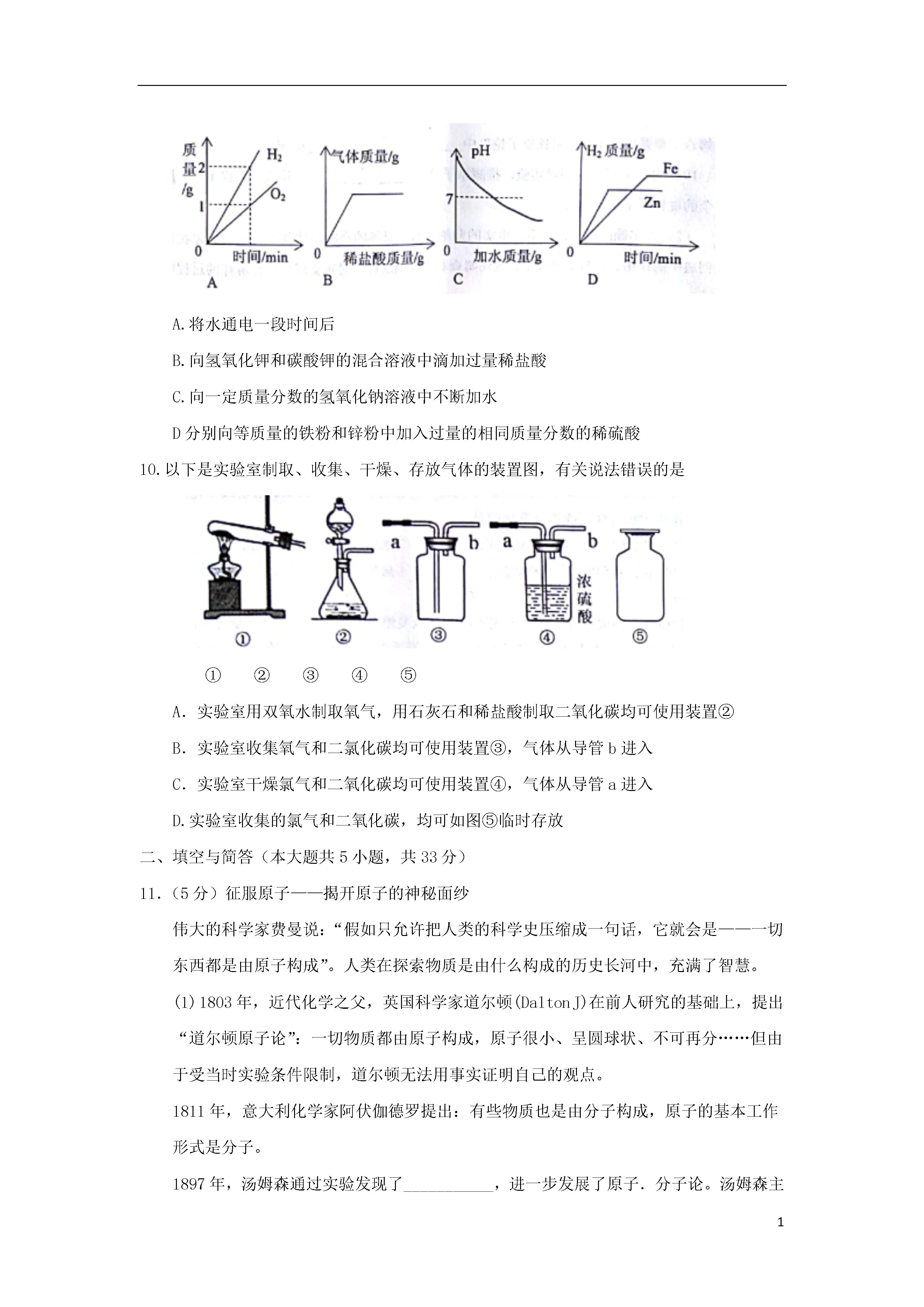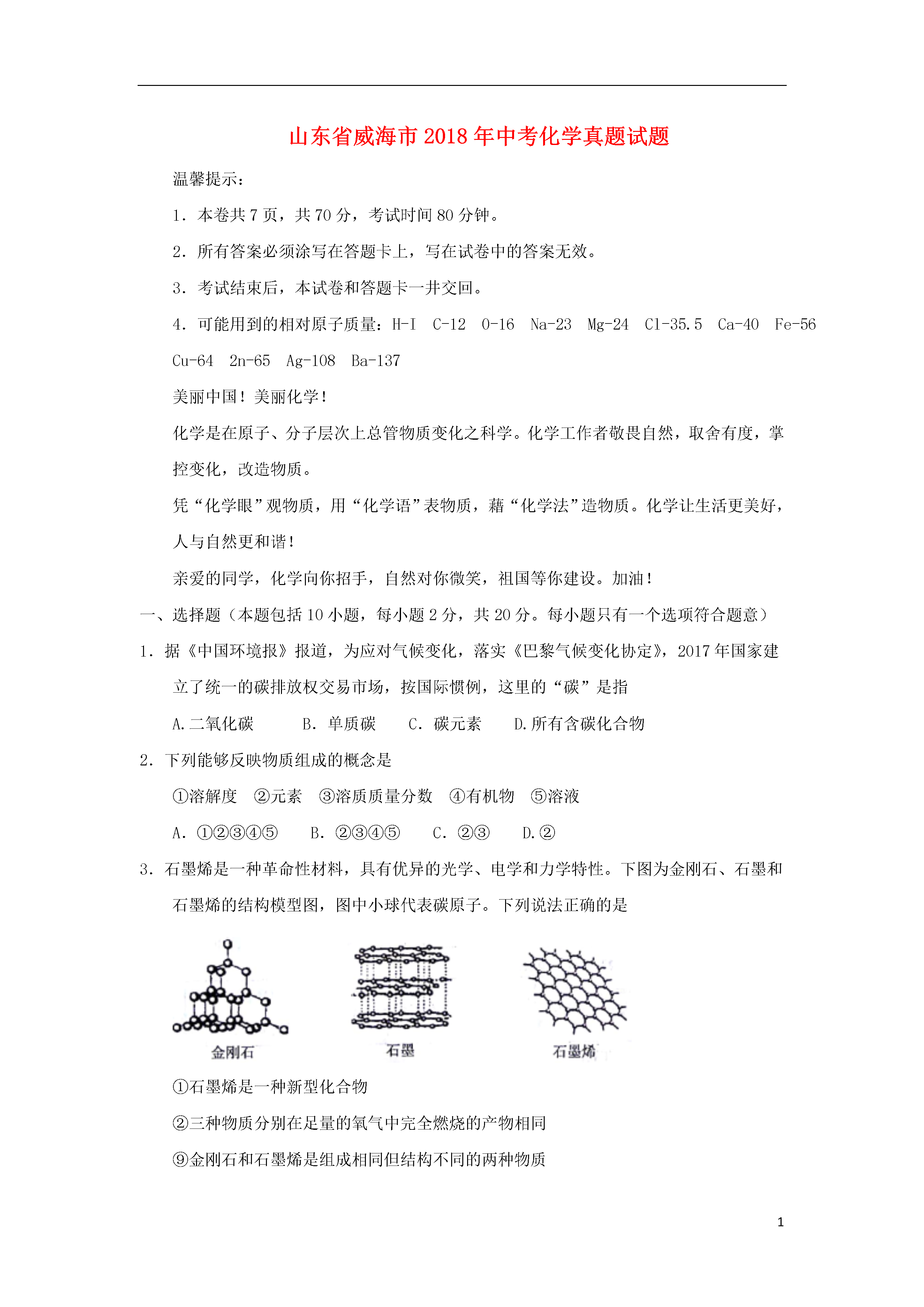 1山东省威海市2018年中考化学真题试题温馨提示:1.本卷,共70分,考试时间80分钟。2.所有答案必须涂写在答题卡上,写在试卷中的答案无效。3.考试结束后,本试卷和答题卡一井交回。4.可能用到的相对原子质量:H-IC-120-16Na-23Mg-24Cl-35.5Ca-40Fe-56Cu-642n-65Ag-108Ba-137美丽中国!美丽化学!化学是在原子、分子层次上总管物质变化之科学。化学工作者敬畏自然,取舍有度,掌控变化,改造物质。凭“化学眼”观物质,用“化学语”表物质,藉“化学法”造物质。化学让生活更美好,人与自然更和谐!亲爱的同学,化学向你招手,自然对你微笑,祖国等你建设。加油!一、选择题(本题包括10小题,每小题2分,共20分。每小题只有一个选项符合题意)1.据《中国环境报》报道,为应对气候变化,落实《巴黎气候变化协定》,2017年国家建立了统一的碳排放权交易市场,按国际惯例,这里的“碳”是指A.二氧化碳B.单质碳C.碳元素D.所有含碳化合物2.下列能够反映物质组成的概念是①溶解度②元素③溶质质量分数④有机物⑤溶液A.①②③④⑤B.②③④⑤C.②③D.②3.石墨烯是一种革命性材料,具有优异的光学、电学和力学特性。下图为金刚石、石墨和石墨烯的结构模型图,图中小球代表碳原子。下列说法正确的是①石墨烯是一种新型化合物②三种物质分别在足量的氧气中完全燃烧的产物相同⑨金刚石和石墨烯是组成相同但结构不同的两种物质④石墨烯有超强的导电性和导热性,说明石墨烯的化学性质和金属相似A.①④B.②③C.①③D.②③④4.对立统一是物质运动的普遍规律,下列①一④描述的是两种物质的性质业变化,其中属于物质的物理性质或物理变化的是①氧气的氧化性和一氧化碳的还原性②水的气化和氦气的液化③氯化钠的溶解和硝酸钾结晶④盐酸的酸性氢氧化钠的碱性A.②③B.②④C.①④D.①③5.描述物质变化的成语有:①滴水成冰;③死灰复燃;③木已成舟;④火烧赤壁;⑤沙里淘金;⑥火上浇油;⑦百炼成钢;⑧花香四溢;⑨玉石俱焚,其中属于化学变化的是A.②③④⑤⑥⑦B.④⑤⑥⑦⑨C.①③④⑤⑧⑨D.②④⑥⑦⑨6.在化学变化中,下列说法正确的是①原子的种类、元素的种粪、分子的种类均不变②原子的数目、分子的数目均不变.③原子的质量、元素的质量、物质的总质量均不变④原子核的种类、数量、质量均不变A.①②B.①③C.③④D.②④7.材料是时代进步的标志。下列关于材料的说法错误的足A.塑料属于有机合成高分子材料B.玻璃属于硅酸盐材料C.制造芯片的硅属于非金属材料D.铝镁合金属于复合材料8.绿水青山就是金山银山。关于化学、物质、人类活动和环境问题的认识,合理的是A.化学是环境污染的主因,没有化学,就不会产生环境问题B.有毒的化学物质是环境污染的主因,应禁止使用C.解决环境问题,应从源头禁止排放污染物,而不应先排放后治理D.化工生产是环境污染的主因,化工生产一定会导致环境污染9.下列四个图像分别对应四个变化,其中正确的是A.将水通电一段时间后B.向氢氧化钾和碳酸钾的混合溶液中滴加过量稀盐酸C.向一定质量分数的氢氧化钠溶液中不断加水D分别向等质量的铁粉和锌粉中加入过量的相同质量分数的稀硫酸10.以下是实验室制取、收集、干燥、存放气体的装置图,有关说法错误的是①②③④⑤A.实验室用双氧水制取氧气,用石灰石和稀盐酸制取二氧化碳均可使用装置②B.实验室收集氧气和二氯化碳均可使用装置③,气体从导管b进入C.实验室干燥氯气和二氧化碳均可使用装置④,气体从导管a进入D.实验室收集的氯气和二氧化碳,均可如图⑤临时存放二、填空与简答(本大题共5小题,共33分)11.(5分)征服原子——揭开原子的神秘面纱伟大的科学家费曼说:“假如只允许把人类的科学史压缩成一句话,它就会是——一切东西都是由原子构成”。人类在探索物质是由什么构成的历史长河中,充满了智慧。(1)1803年,近代化学之父,英国科学家道尔顿(DaltonJ)在前人研究的基础上,提出“道尔顿原子论”:一切物质都由原子构成,原子很小、呈圆球状、不可再分……但由于受当时实验条件限制,道尔顿无法用事实证明自己的观点。1811年,意大利化学家阿伏伽德罗提出:有些物质也是由分子构成,原子的基本工作形式是分子。1897年,汤姆森通过实验发现了___________,进一步发展了原子.分子论。汤姆森主要是纠正了“道尔顿原子论”_________中的观点。1911年,声瑟福又通过实验,推测原子是由_________构成,并提出了沿用至今的现代原子结构理论。(2)道尔顿的原子论,不是事实的归纳,而是思维的产物,体现了直觉和