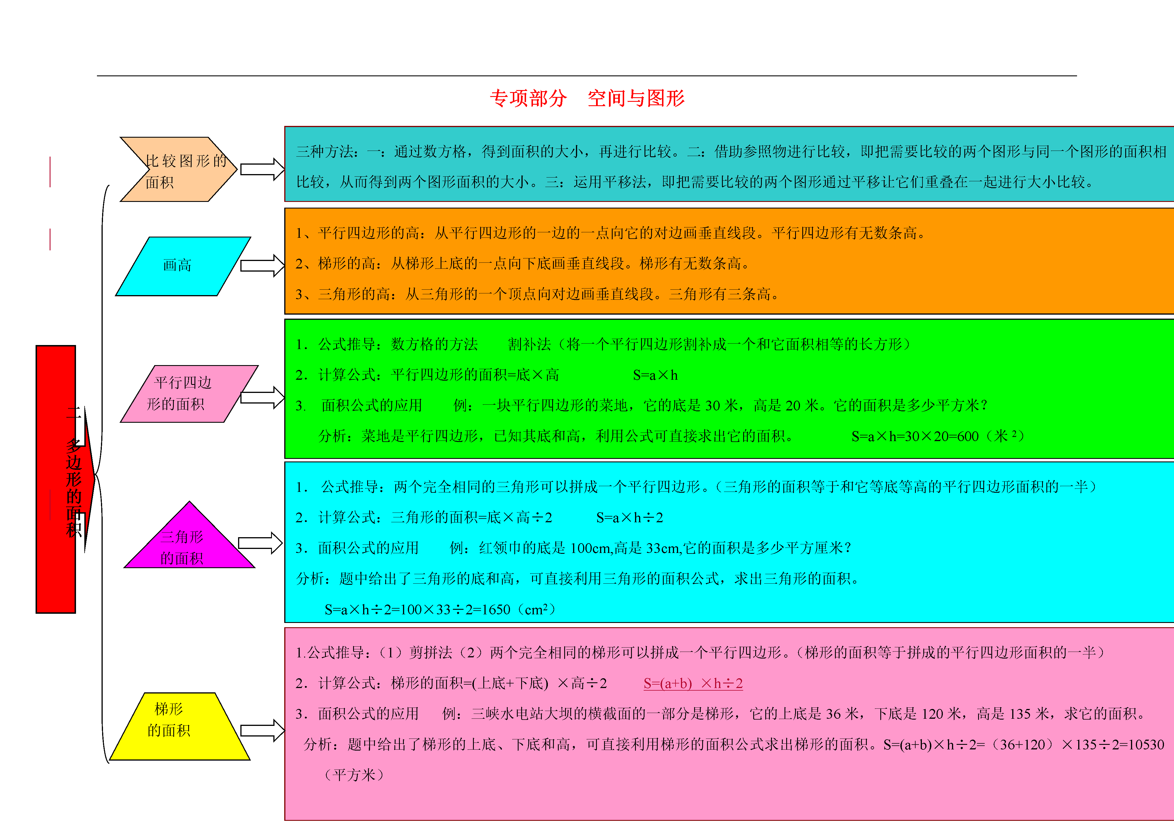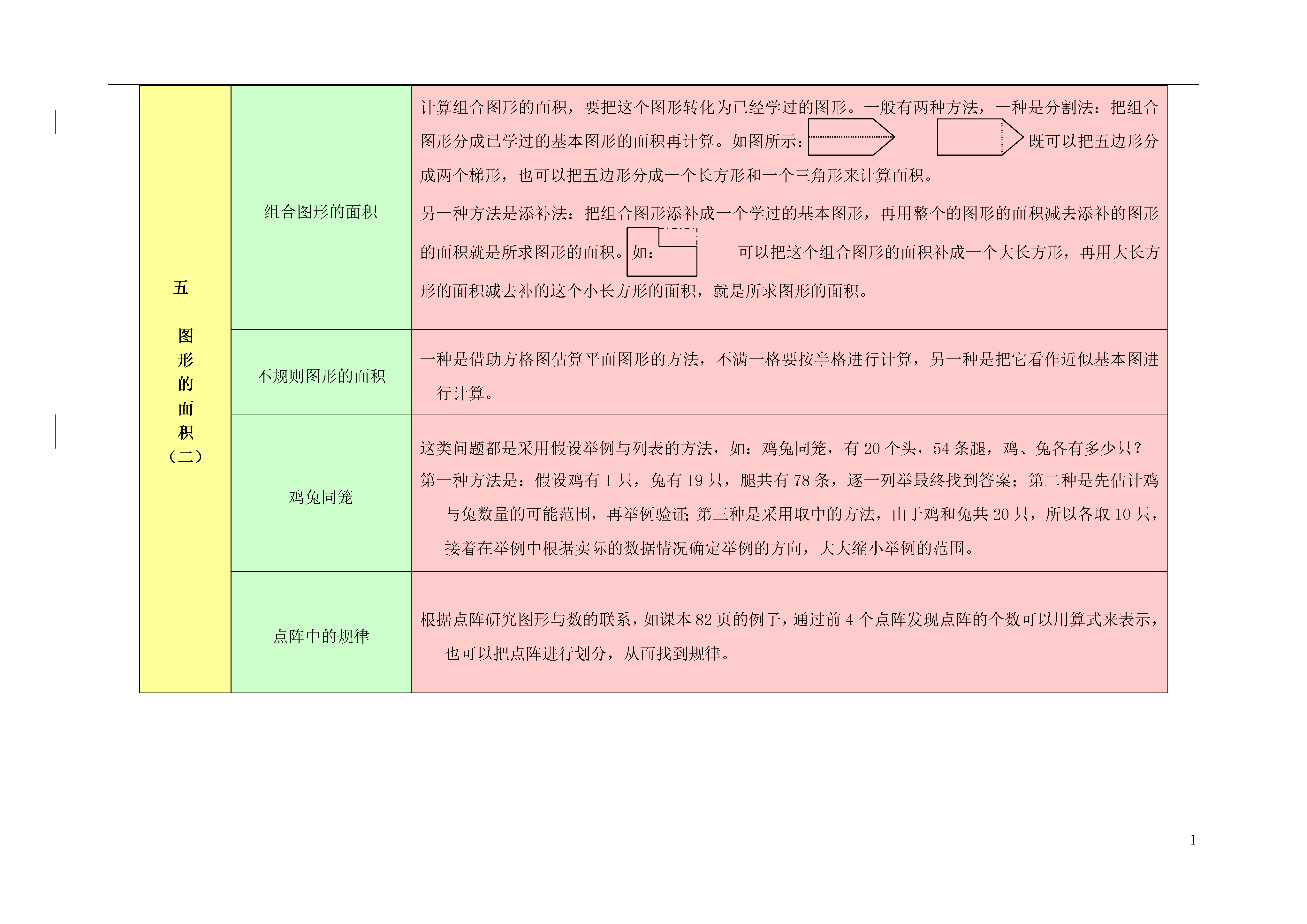1专项部分空间与图形三角形的面积公式推导:两个完全相同的三角形可以拼成一个平行四边形。(三角形的面积等于和它等底等高的平行四边形面积的一半)2.计算公式:三角形的面积=底×高÷2S=a×h÷23.面积公式的应用例:红领巾的底是100cm,高是33cm,它的面积是多少平方厘米?分析:题中给出了三角形的底和高,可直接利用三角形的面积公式,求出三角形的面积。S=a×h÷2=100×33÷2=1650(cm2)梯形的面积1.公式推导:(1)剪拼法(2)两个完全相同的梯形可以拼成一个平行四边形。(梯形的面积等于拼成的平行四边形面积的一半)2.计算公式:梯形的面积=(上底+下底)×高÷2S=(a+b)×h÷23.面积公式的应用例:三峡水电站大坝的横截面的一部分是梯形,它的上底是36米,下底是120米,高是135米,求它的面积。分析:题中给出了梯形的上底、下底和高,可直接利用梯形的面积公式求出梯形的面积。S=(a+b)×h÷2=(36+120)×135÷2=10530(平方米)画高1.公式推导:数方格的方法割补法(将一个平行四边形割补成一个和它面积相等的长方形)2.计算公式:平行四边形的面积=底×高S=a×h3.面积公式的应用例:一块平行四边形的菜地,它的底是30米,高是20米。它的面积是多少平方米?分析:菜地是平行四边形,已知其底和高,利用公式可直接求出它的面积。S=a×h=30×20=600(米2)二多边形的面积平行四边形的面积三种方法:一:通过数方格,得到面积的大小,再进行比较。二:借助参照物进行比较,即把需要比较的两个图形与同一个图形的面积相比较,从而得到两个图形面积的大小。三:运用平移法,即把需要比较的两个图形通过平移让它们重叠在一起进行大小比较。1、平行四边形的高:从平行四边形的一边的一点向它的对边画垂直线段。平行四边形有无数条高。2、梯形的高:从梯形上底的一点向下底画垂直线段。梯形有无数条高。3、三角形的高:从三角形的一个顶点向对边画垂直线段。三角形有三条高。比较图形的面积五图形的面积(二)组合图形的面积计算组合图形的面积,要把这个图形转化为已经学过的图形。一般有两种方法,一种是分割法:把组合图形分成已学过的基本图形的面积再计算。如图所示:既可以把五边形分成两个梯形,也可以把五边形分成一个长方形和一个三角形来计算面积。另一种方法是添补法:把组合图形添补成一个学过的基本图形,再用整个的图形的面积减去添补的图形的面积就是所求图形的面积。如:可以把这个组合图形的面积补成一个大长方形,再用大长方形的面积减去补的这个小长方形的面积,就是所求图形的面积。不规则图形的面积一种是借助方格图估算平面图形的方法,不满一格要按半格进行计算,另一种是把它看作近似基本图进行计算。鸡兔同笼这类问题都是采用假设举例与列表的方法,如:鸡兔同笼,有20个头,54条腿,鸡、兔各有多少只?第一种方法是:假设鸡有1只,兔有19只,腿共有78条,逐一列举最终找到答案;第二种是先估计鸡与兔数量的可能范围,再举例验证;第三种是采用取中的方法,由于鸡和兔共20只,所以各取10只,接着在举例中根据实际的数据情况确定举例的方向,大大缩小举例的范围。点阵中的规律根据点阵研究图形与数的联系,如课本82页的例子,通过前4个点阵发现点阵的个数可以用算式来表示,也可以把点阵进行划分,从而找到规律。