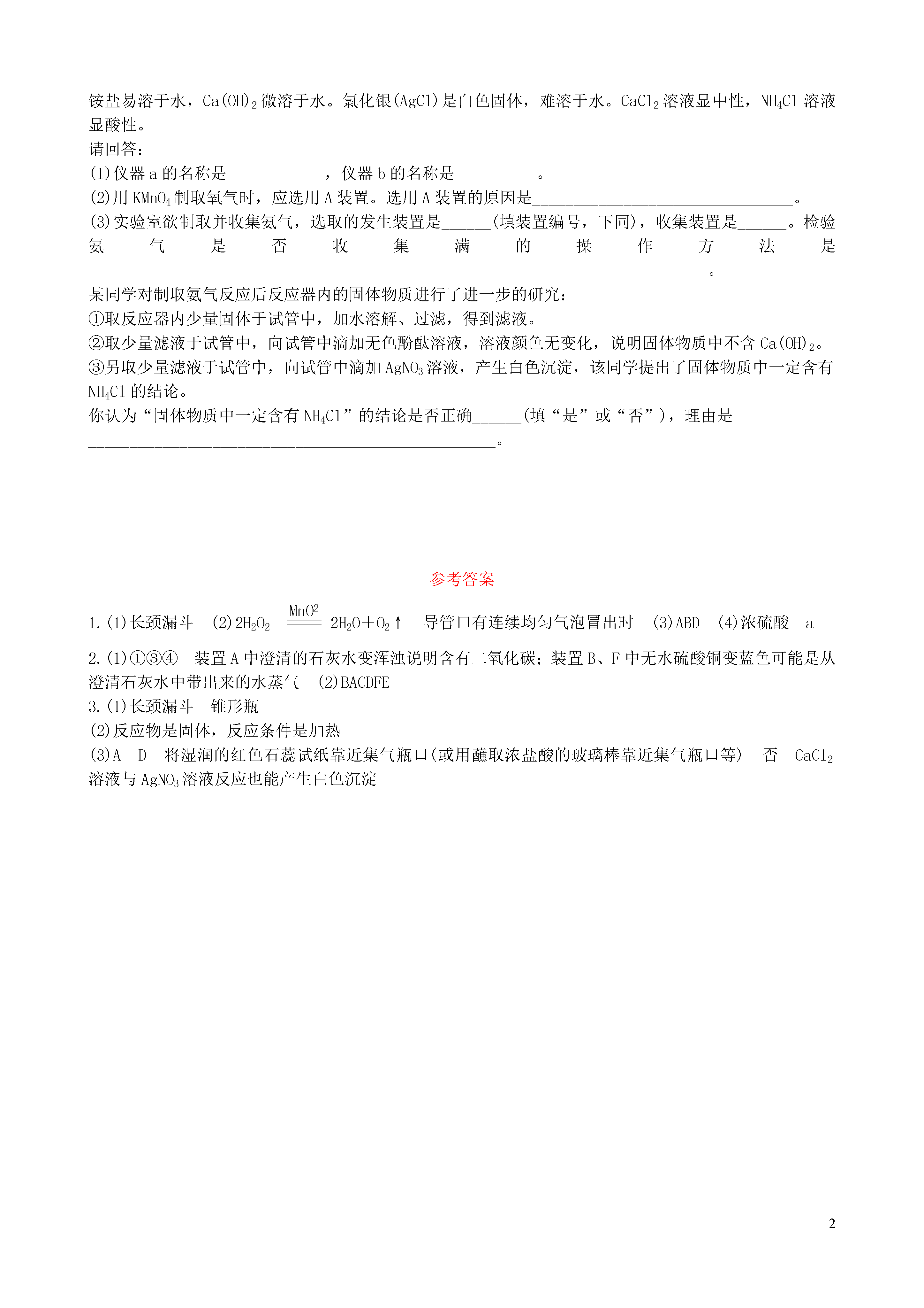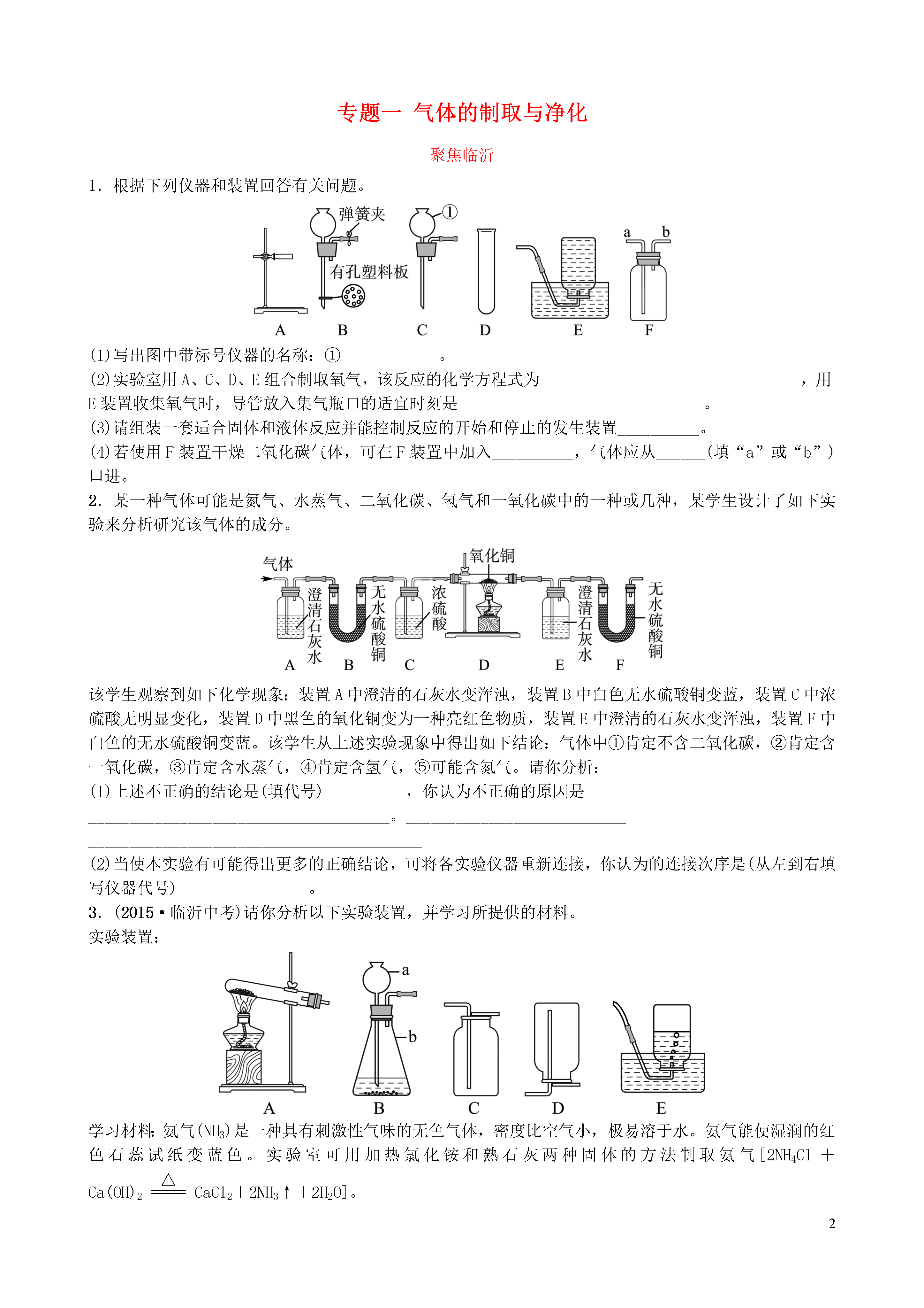 2专题一气体的制取与净化聚焦临沂1.根据下列仪器和装置回答有关问题。(1)写出图中带标号仪器的名称:①____________。(2)实验室用A、C、D、E组合制取氧气,该反应的化学方程式为________________________________,用E装置收集氧气时,导管放入集气瓶口的适宜时刻是______________________________。(3)请组装一套适合固体和液体反应并能控制反应的开始和停止的发生装置__________。(4)若使用F装置干燥二氧化碳气体,可在F装置中加入__________,气体应从______(填“a”或“b”)口进。2.某一种气体可能是氮气、水蒸气、二氧化碳、氢气和一氧化碳中的一种或几种,某学生设计了如下实验来分析研究该气体的成分。该学生观察到如下化学现象:装置A中澄清的石灰水变浑浊,装置B中白色无水硫酸铜变蓝,装置C中浓硫酸无明显变化,装置D中黑色的氧化铜变为一种亮红色物质,装置E中澄清的石灰水变浑浊,装置F中白色的无水硫酸铜变蓝。该学生从上述实验现象中得出如下结论:气体中①肯定不含二氧化碳,②肯定含一氧化碳,③肯定含水蒸气,④肯定含氢气,⑤可能含氮气。请你分析:(1)上述不正确的结论是(填代号)__________,你认为不正确的原因是__________________________________________。____________________________________________________________________(2)当使本实验有可能得出更多的正确结论,可将各实验仪器重新连接,你认为的连接次序是(从左到右填写仪器代号)________________。3.(2015·临沂中考)请你分析以下实验装置,并学习所提供的材料。实验装置:学习材料:氨气(NH3)是一种具有刺激性气味的无色气体,密度比空气小,极易溶于水。氨气能使湿润的红色石蕊试纸变蓝色。实验室可用加热氯化铵和熟石灰两种固体的方法制取氨气[2NH4Cl+Ca(OH)2eq\o(=====,\s\up7(△))CaCl2+2NH3↑+2H2O]。铵盐易溶于水,Ca(OH)2微溶于水。氯化银(AgCl)是白色固体,难溶于水。CaCl2溶液显中性,NH4Cl溶液显酸性。请回答:(1)仪器a的名称是____________,仪器b的名称是__________。(2)用KMnO4制取氧气时,应选用A装置。选用A装置的原因是________________________________。(3)实验室欲制取并收集氨气,选取的发生装置是______(填装置编号,下同),收集装置是______。检验氨气是否收集满的操作方法是____________________________________________________________________________。某同学对制取氨气反应后反应器内的固体物质进行了进一步的研究:①取反应器内少量固体于试管中,加水溶解、过滤,得到滤液。②取少量滤液于试管中,向试管中滴加无色酚酞溶液,溶液颜色无变化,说明固体物质中不含Ca(OH)2。③另取少量滤液于试管中,向试管中滴加AgNO3溶液,产生白色沉淀,该同学提出了固体物质中一定含有NH4Cl的结论。你认为“固体物质中一定含有NH4Cl”的结论是否正确______(填“是”或“否”),理由是__________________________________________________。参考答案1.(1)长颈漏斗(2)2H2O2eq\o(=====,\s\up7(MnO2))2H2O+O2↑导管口有连续均匀气泡冒出时(3)ABD(4)浓硫酸a2.(1)①③④装置A中澄清的石灰水变浑浊说明含有二氧化碳;装置B、F中无水硫酸铜变蓝色可能是从澄清石灰水中带出来的水蒸气(2)BACDFE3.(1)长颈漏斗锥形瓶(2)反应物是固体,反应条件是加热(3)AD将湿润的红色石蕊试纸靠近集气瓶口(或用蘸取浓盐酸的玻璃棒靠近集气瓶口等)否CaCl2溶液与AgNO3溶液反应也能产生白色沉淀