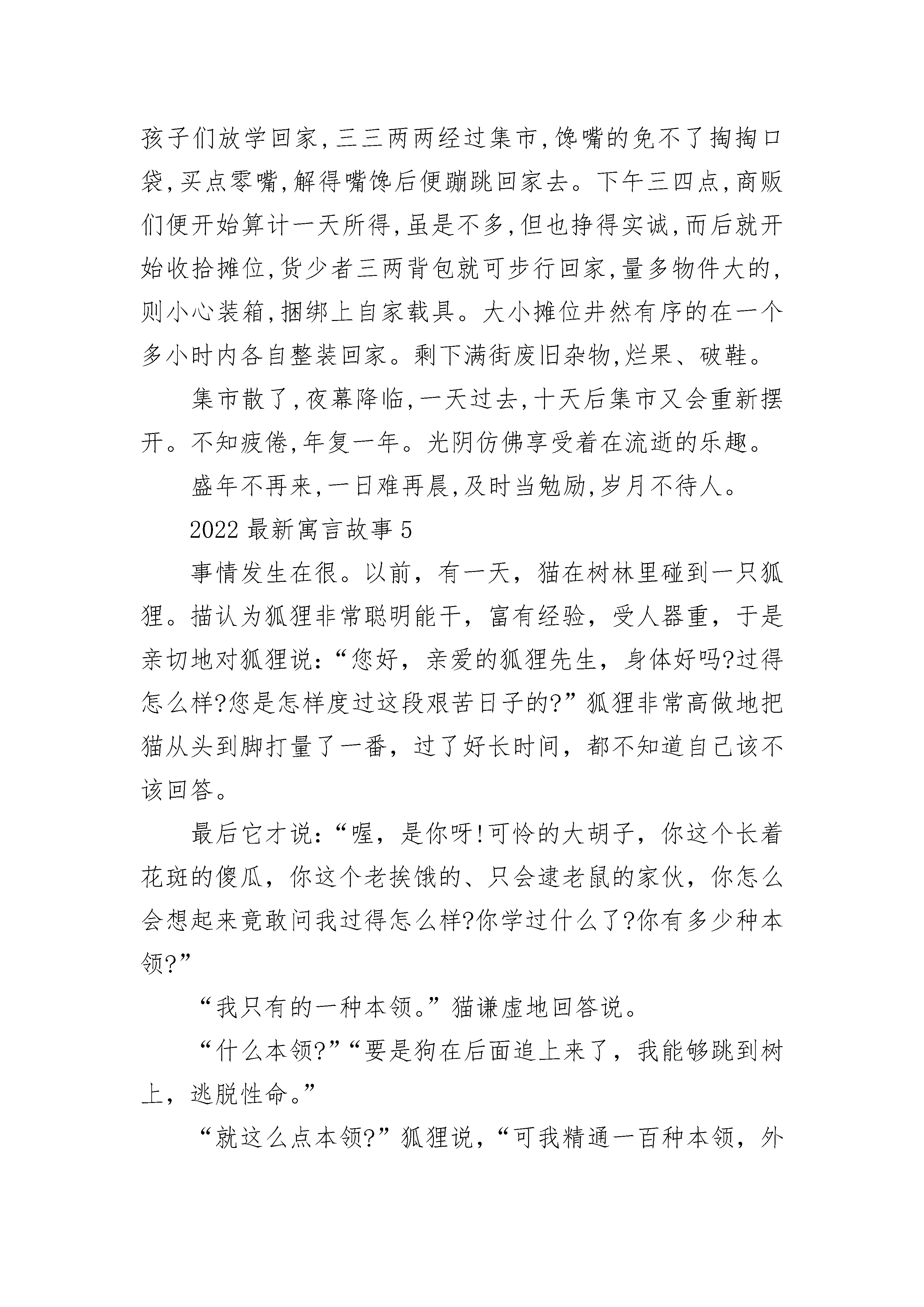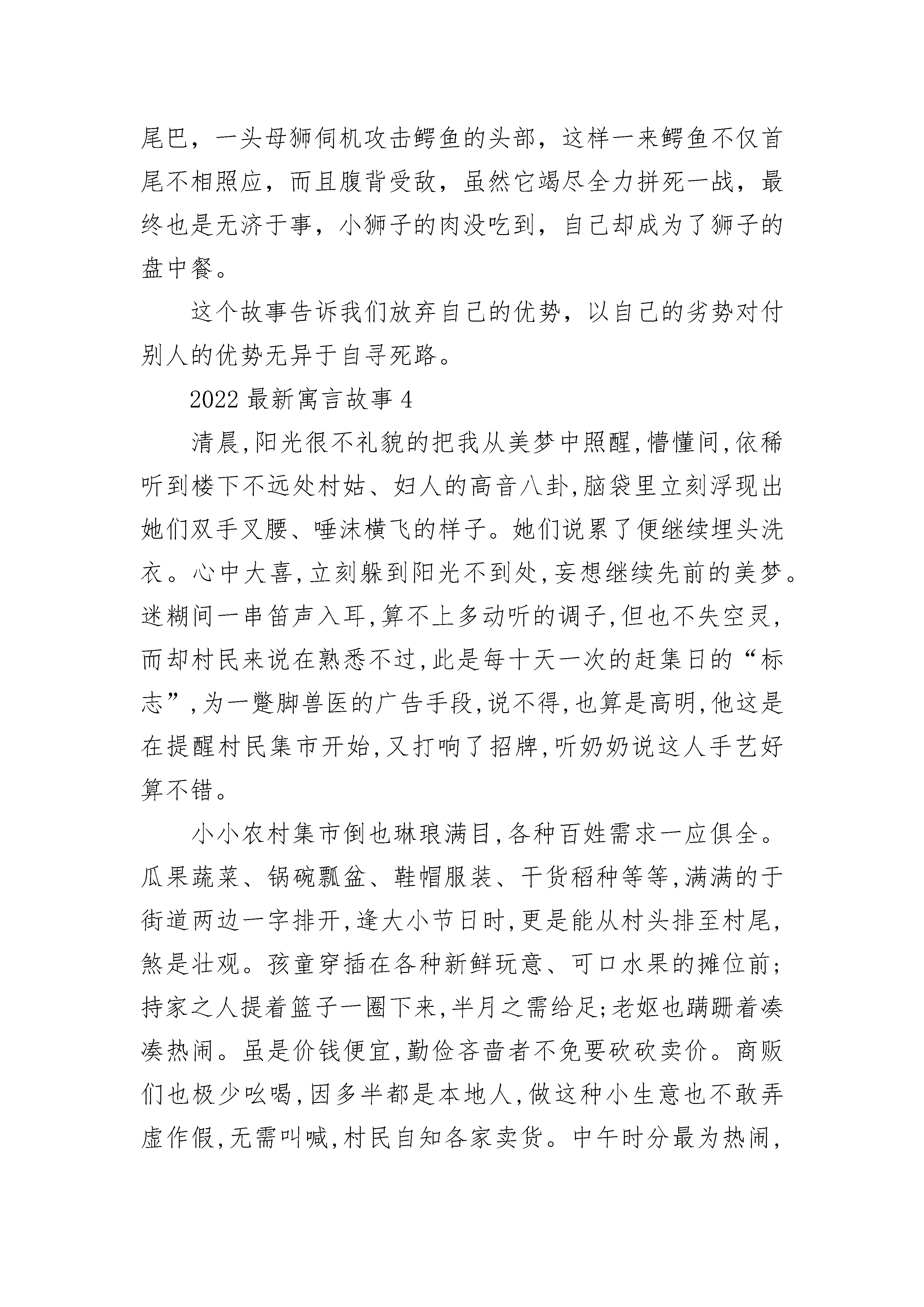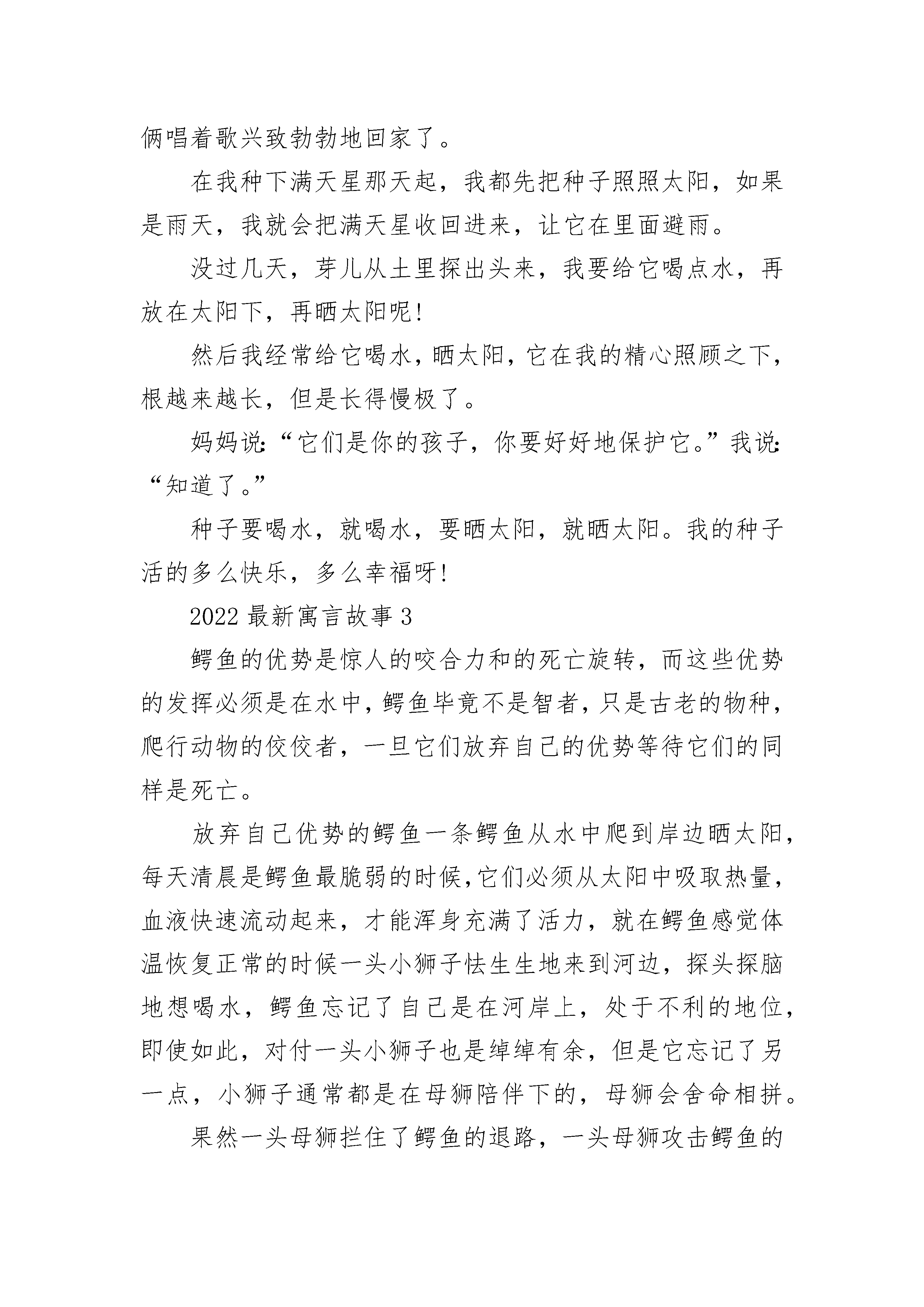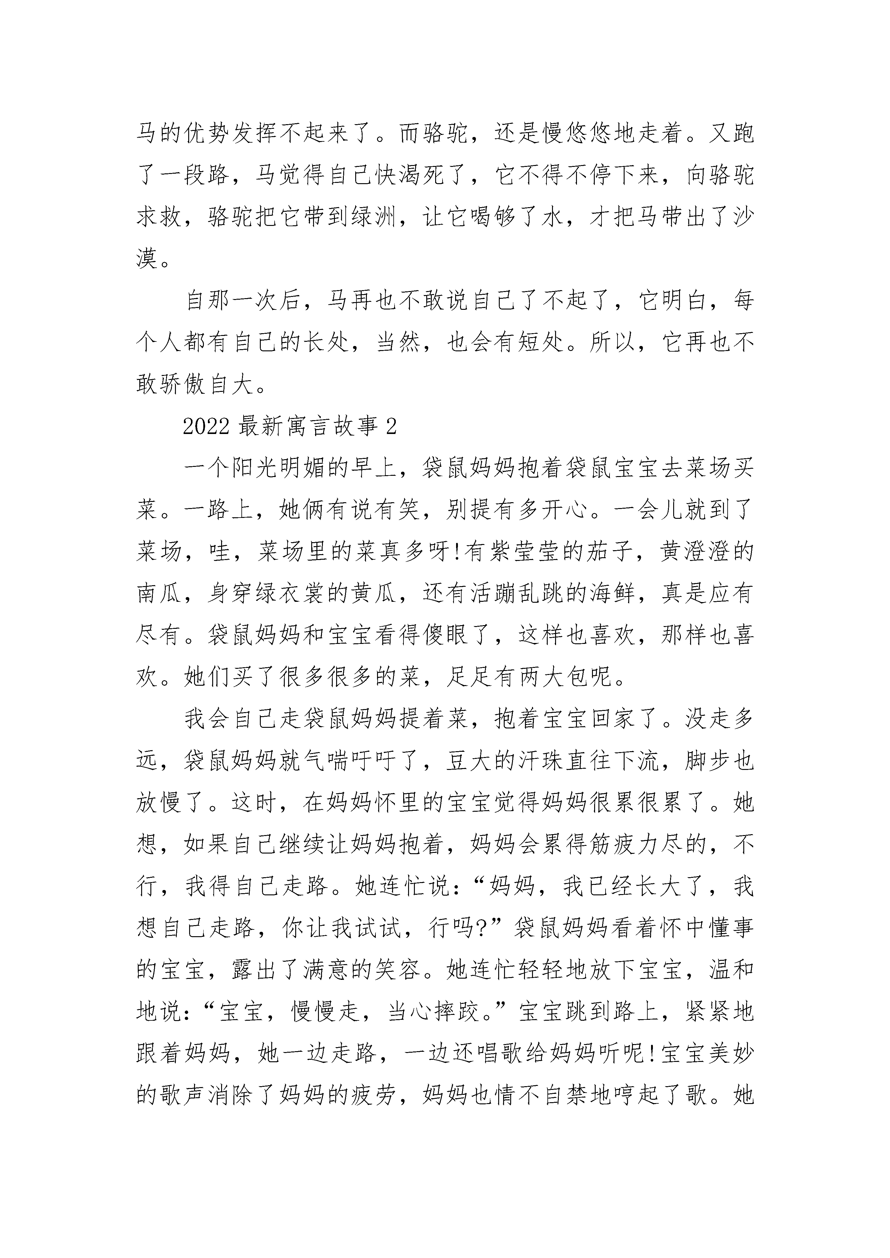 2022最新寓言故事文本【五篇】从前,森林里有一匹马,它非常骄傲自大。小动物们都不喜欢和它玩。有一天,马去散步,在狭窄的小路上,一只小狗挡住了它的去路。马生气地说:“小狗,快走开!我是世界上最珍贵的一匹马,不管是什么马,都不可以和我比。而你呢?你算哪根葱!你是世界上最难看的小狗,任何小狗都能比得上你。现在快点给我走一边去,别再让我看到你!”小狗听了,没说什么,就跑开了。“看来这只狗根本就不敢和我比!”说完,马大摇大摆地走了。骄傲的马第二天,马听说小白兔跑得很快,和乌龟比赛还赢了。马就跑到小白兔家门口,叫道:“小白兔,听说你跑得很快,你敢和我比一比吗?”小白兔听了,放下手中的红萝卜,和马比起来。虽然小白兔跑赢了小乌龟,但怎么可能是马的对手呢?结果,马当然赢了。这下,马更觉得自己了不起,更看不起其它小动物了。一天,骆驼听说了马的骄傲自大,于是,它对马说:“你敢和我在沙漠里比一比吗?看我们谁更厉害?”马心里想:“你算什么东西,也敢向我挑战?在这个森林里,没有谁有我厉害,看我不打败你!”刚开始,马跑在前面,觉得很轻松。骆驼呢,慢吞吞地走着,一点也不着急。马心里想:“哼,跑得这么慢,还敢向我挑战。”不一会,马渐渐地受不了了,沙漠可不比草原,马的优势发挥不起来了。而骆驼,还是慢悠悠地走着。又跑了一段路,马觉得自己快渴死了,它不得不停下来,向骆驼求救,骆驼把它带到绿洲,让它喝够了水,才把马带出了沙漠。自那一次后,马再也不敢说自己了不起了,它明白,每个人都有自己的长处,当然,也会有短处。所以,它再也不敢骄傲自大。2022最新寓言故事2一个阳光明媚的早上,袋鼠妈妈抱着袋鼠宝宝去菜场买菜。一路上,她俩有说有笑,别提有多开心。一会儿就到了菜场,哇,菜场里的菜真多呀!有紫莹莹的茄子,黄澄澄的南瓜,身穿绿衣裳的黄瓜,还有活蹦乱跳的海鲜,真是应有尽有。袋鼠妈妈和宝宝看得傻眼了,这样也喜欢,那样也喜欢。她们买了很多很多的菜,足足有两大包呢。我会自己走袋鼠妈妈提着菜,抱着宝宝回家了。没走多远,袋鼠妈妈就气喘吁吁了,豆大的汗珠直往下流,脚步也放慢了。这时,在妈妈怀里的宝宝觉得妈妈很累很累了。她想,如果自己继续让妈妈抱着,妈妈会累得筋疲力尽的,不行,我得自己走路。她连忙说:“妈妈,我已经长大了,我想自己走路,你让我试试,行吗?”袋鼠妈妈看着怀中懂事的宝宝,露出了满意的笑容。她连忙轻轻地放下宝宝,温和地说:“宝宝,慢慢走,当心摔跤。”宝宝跳到路上,紧紧地跟着妈妈,她一边走路,一边还唱歌给妈妈听呢!宝宝美妙的歌声消除了妈妈的疲劳,妈妈也情不自禁地哼起了歌。她俩唱着歌兴致勃勃地回家了。在我种下满天星那天起,我都先把种子照照太阳,如果是雨天,我就会把满天星收回进来,让它在里面避雨。没过几天,芽儿从土里探出头来,我要给它喝点水,再放在太阳下,再晒太阳呢!然后我经常给它喝水,晒太阳,它在我的精心照顾之下,根越来越长,但是长得慢极了。妈妈说:“它们是你的孩子,你要好好地保护它。”我说:“知道了。”种子要喝水,就喝水,要晒太阳,就晒太阳。我的种子活的多么快乐,多么幸福呀!2022最新寓言故事3鳄鱼的优势是惊人的咬合力和的死亡旋转,而这些优势的发挥必须是在水中,鳄鱼毕竟不是智者,只是古老的物种,爬行动物的佼佼者,一旦它们放弃自己的优势等待它们的同样是死亡。放弃自己优势的鳄鱼一条鳄鱼从水中爬到岸边晒太阳,每天清晨是鳄鱼最脆弱的时候,它们必须从太阳中吸取热量,血液快速流动起来,才能浑身充满了活力,就在鳄鱼感觉体温恢复正常的时候一头小狮子怯生生地来到河边,探头探脑地想喝水,鳄鱼忘记了自己是在河岸上,处于不利的地位,即使如此,对付一头小狮子也是绰绰有余,但是它忘记了另一点,小狮子通常都是在母狮陪伴下的,母狮会舍命相拼。果然一头母狮拦住了鳄鱼的退路,一头母狮攻击鳄鱼的尾巴,一头母狮伺机攻击鳄鱼的头部,这样一来鳄鱼不仅首尾不相照应,而且腹背受敌,虽然它竭尽全力拼死一战,最终也是无济于事,小狮子的肉没吃到,自己却成为了狮子的盘中餐。这个故事告诉我们放弃自己的优势,以自己的劣势对付别人的优势无异于自寻死路。2022最新寓言故事4清晨,阳光很不礼貌的把我从美梦中照醒,懵懂间,依稀听到楼下不远处村姑、妇人的高音八卦,脑袋里立刻浮现出她们双手叉腰、唾沫横飞的样子。她们说累了便继续埋头洗衣。心中大喜,立刻躲到阳光不到处,妄想继续先前的美梦。迷糊间一串笛声入耳,算不上多动听的调子,但也不失空灵,而却村民来说在熟悉不过,此是每十天一次的赶集日的“标志”,为一蹩脚兽医的广告手段,说不得,也算是高明,他这是在提醒村民集市开始,又打响了招牌,听奶奶说这人手艺好算不错。小小农村集市倒也琳琅满目,各种百姓需求一应俱全。瓜果蔬菜、锅碗瓢盆、鞋帽服装、干货稻种等等,满满的于街道两边一字排开,逢大小节日时,更是能从村头
