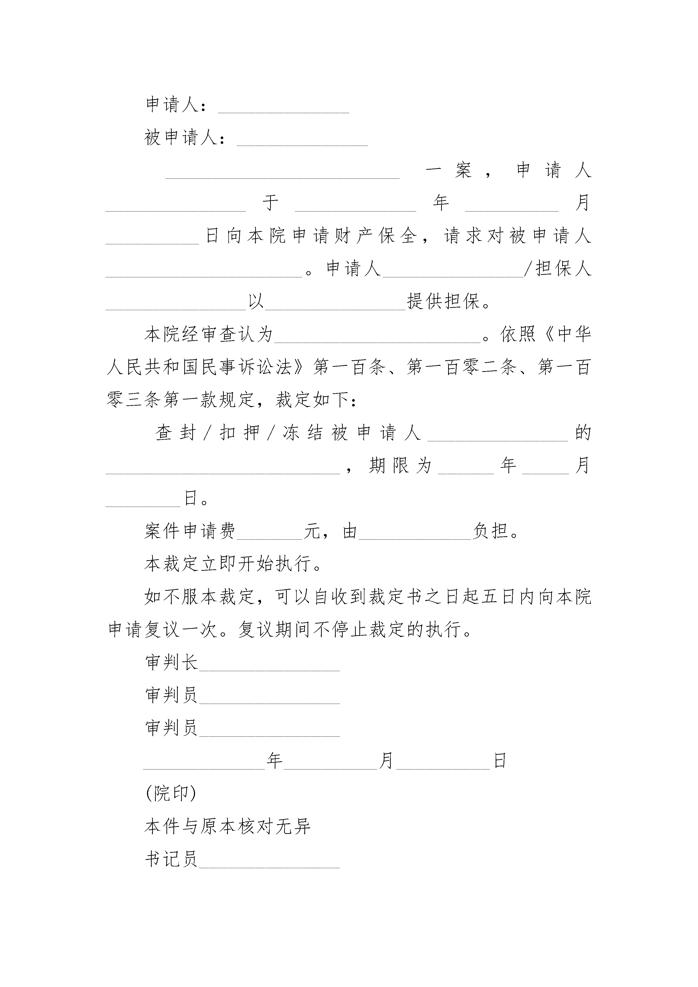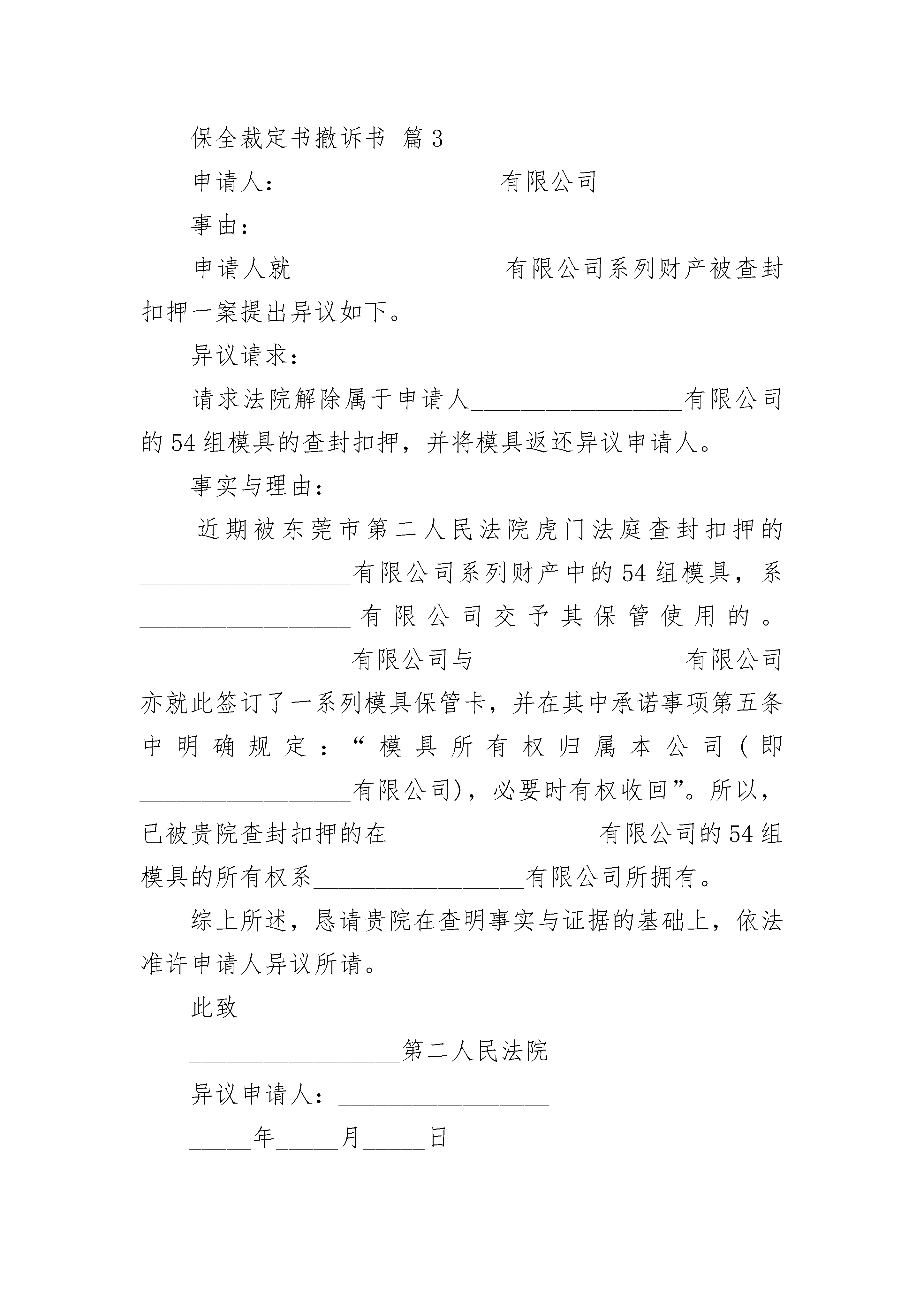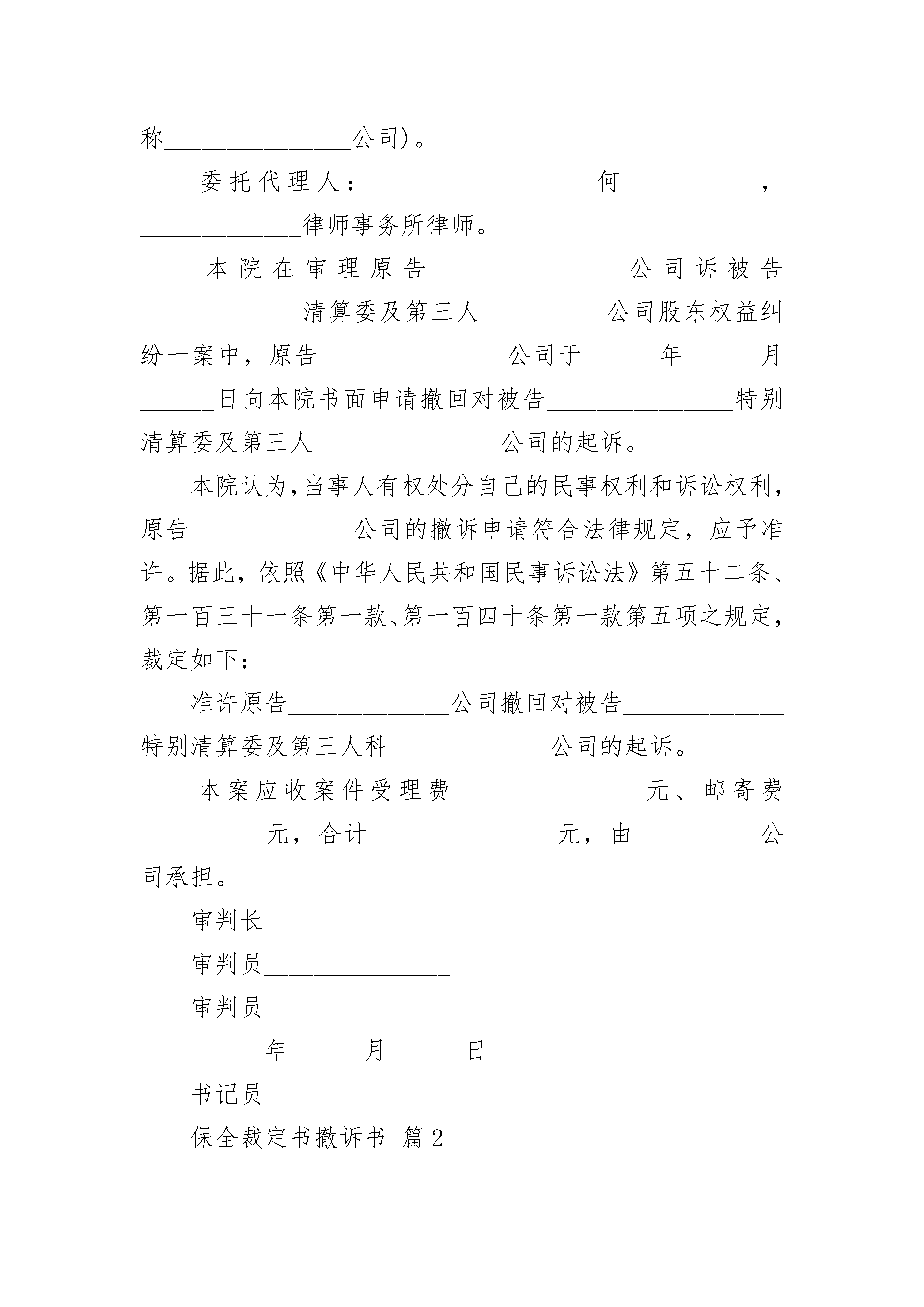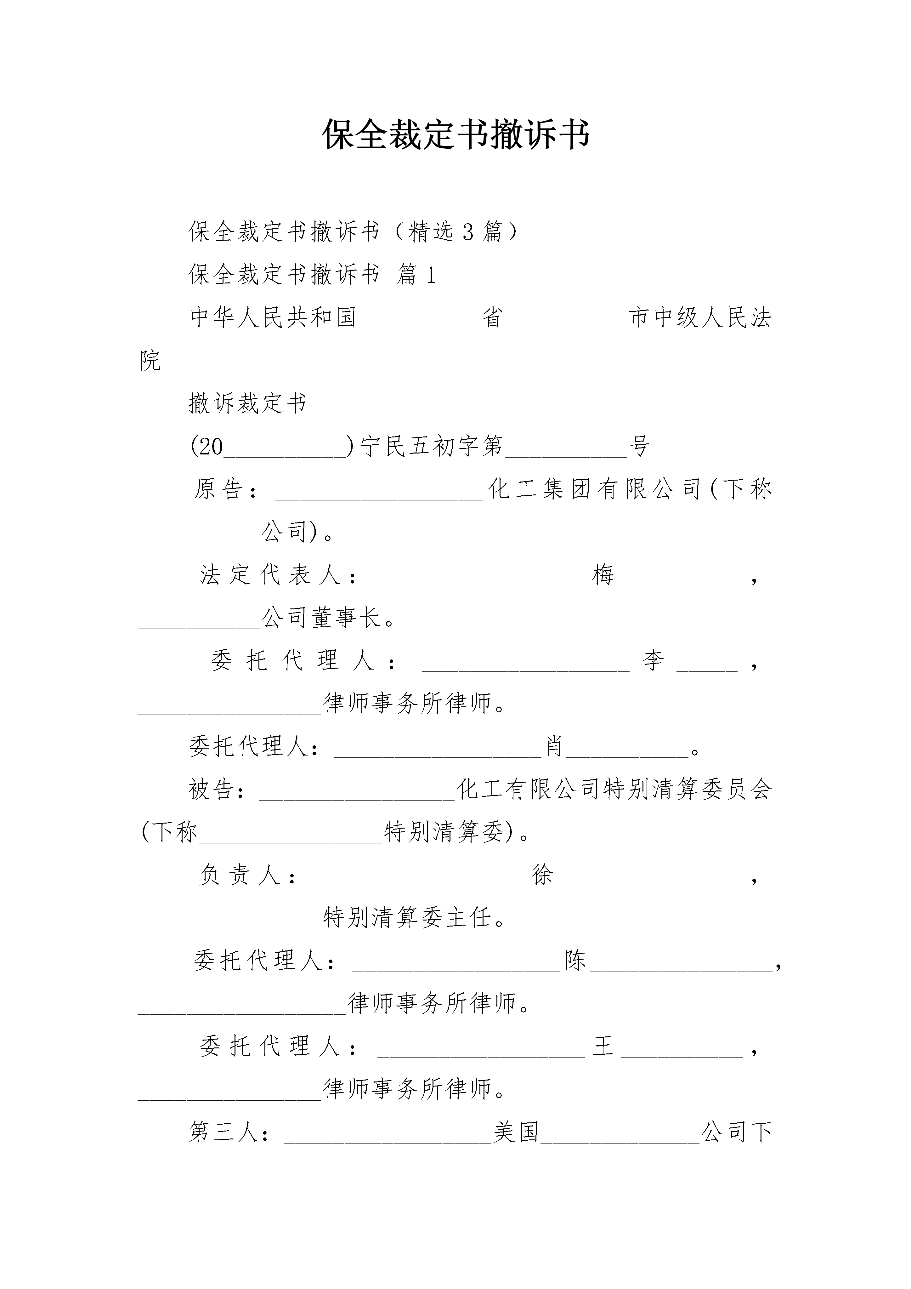 保全裁定书撤诉书保全裁定书撤诉书(精选3篇)保全裁定书撤诉书篇1中华人民共和国__________省__________市中级人民法院撤诉裁定书(20__________)宁民五初字第__________号原告:_________________化工集团有限公司(下称__________公司)。法定代表人:_________________梅__________,__________公司董事长。委托代理人:_________________李_____,_______________律师事务所律师。委托代理人:_________________肖__________。被告:________________化工有限公司特别清算委员会(下称_______________特别清算委)。负责人:_________________徐_______________,_______________特别清算委主任。委托代理人:_________________陈_______________,_________________律师事务所律师。委托代理人:_________________王__________,_______________律师事务所律师。第三人:_________________美国_____________公司下称_______________公司)。委托代理人:_________________何__________,_____________律师事务所律师。本院在审理原告_______________公司诉被告_____________清算委及第三人__________公司股东权益纠纷一案中,原告_______________公司于______年______月______日向本院书面申请撤回对被告_______________特别清算委及第三人_______________公司的起诉。本院认为,当事人有权处分自己的民事权利和诉讼权利,原告_____________公司的撤诉申请符合法律规定,应予准许。据此,依照《中华人民共和国民事诉讼法》第五十二条、第一百三十一条第一款、第一百四十条第一款第五项之规定,裁定如下:_________________准许原告_____________公司撤回对被告_____________特别清算委及第三人科_____________公司的起诉。本案应收案件受理费_______________元、邮寄费__________元,合计_______________元,由__________公司承担。审判长__________审判员_______________审判员________________年______月______日书记员_______________保全裁定书撤诉书篇2申请人:______________被申请人:_______________________________________一案,申请人_______________于_____________年__________月__________日向本院申请财产保全,请求对被申请人_____________________。申请人_______________/担保人_______________以_______________提供担保。本院经审查认为______________________。依照《中华人民共和国民事诉讼法》第一百条、第一百零二条、第一百零三条第一款规定,裁定如下:查封/扣押/冻结被申请人_______________的_________________________,期限为______年_____月________日。案件申请费_______元,由____________负担。本裁定立即开始执行。如不服本裁定,可以自收到裁定书之日起五日内向本院申请复议一次。复议期间不停止裁定的执行。审判长_______________审判员_______________审判员____________________________年__________月__________日(院印)本件与原本核对无异书记员_______________保全裁定书撤诉书篇3申请人:_________________有限公司事由:申请人就_________________有限公司系列财产被查封扣押一案提出异议如下。异议请求:请求法院解除属于申请人_________________有限公司的54组模具的查封扣押,并将模具返还异议申请人。事实与理由:近期被东莞市第二人民法院虎门法庭查封扣押的_________________有限公司系列财产中的54组模具,系_________________有限公司交予其保管使用的。__________