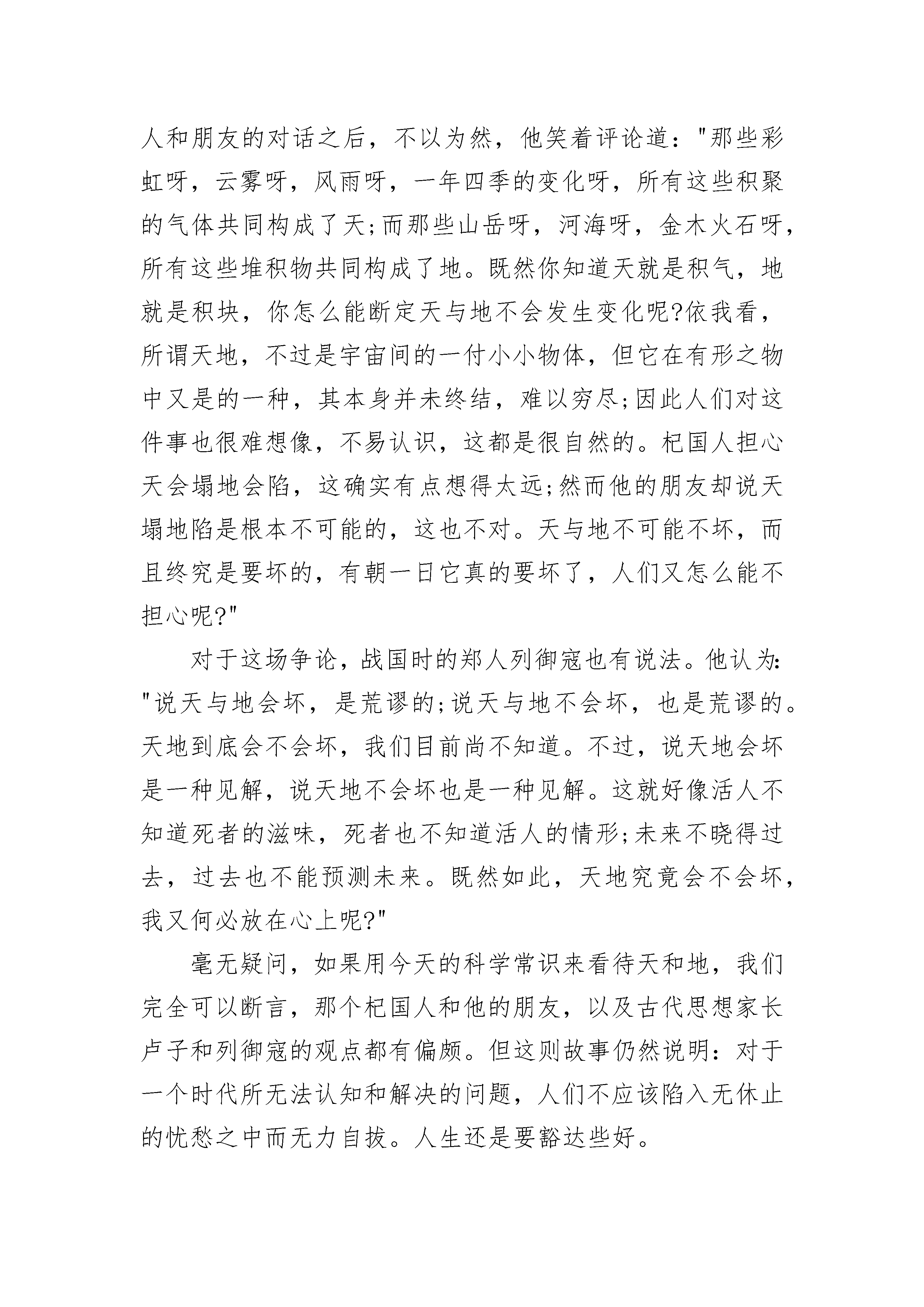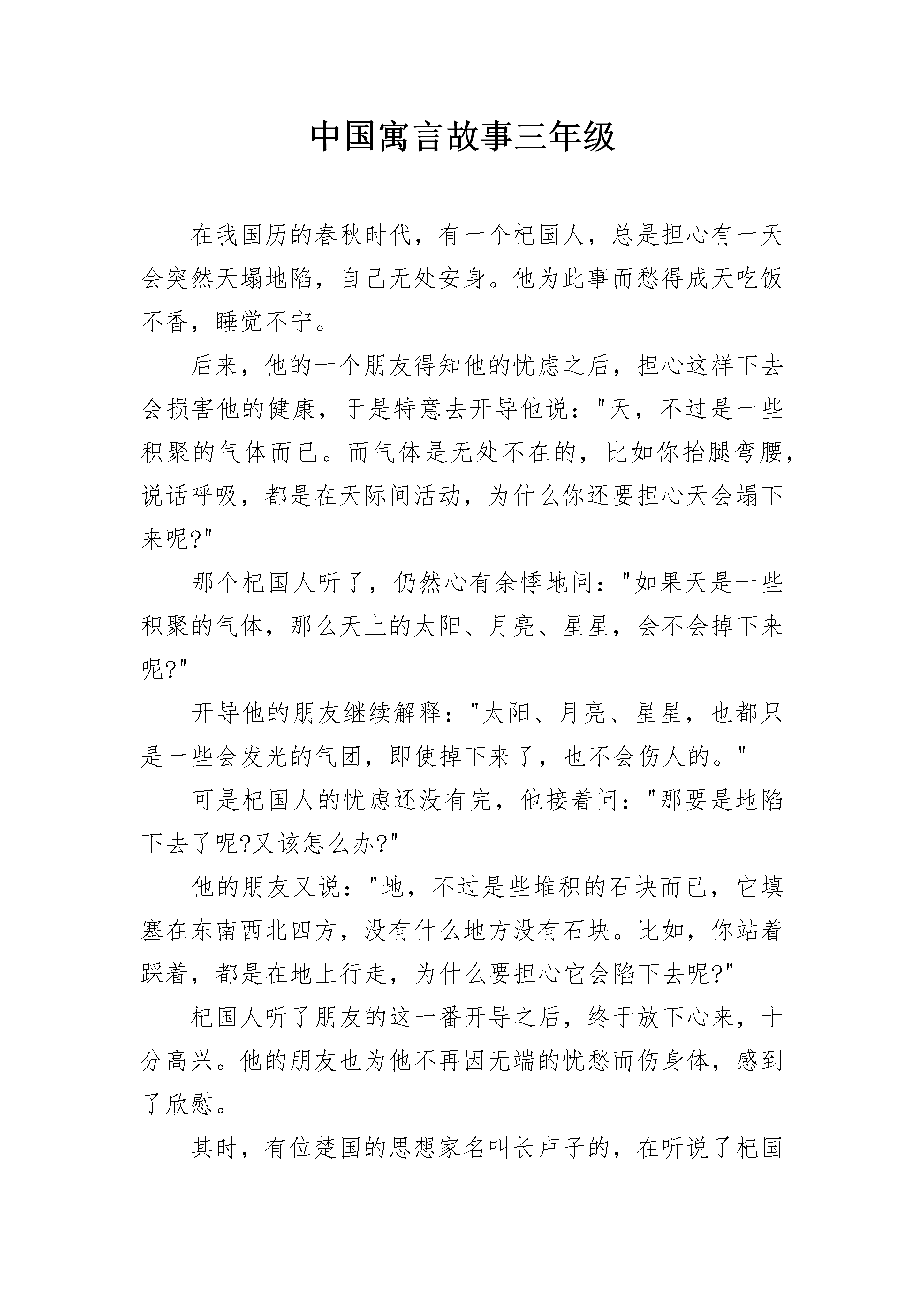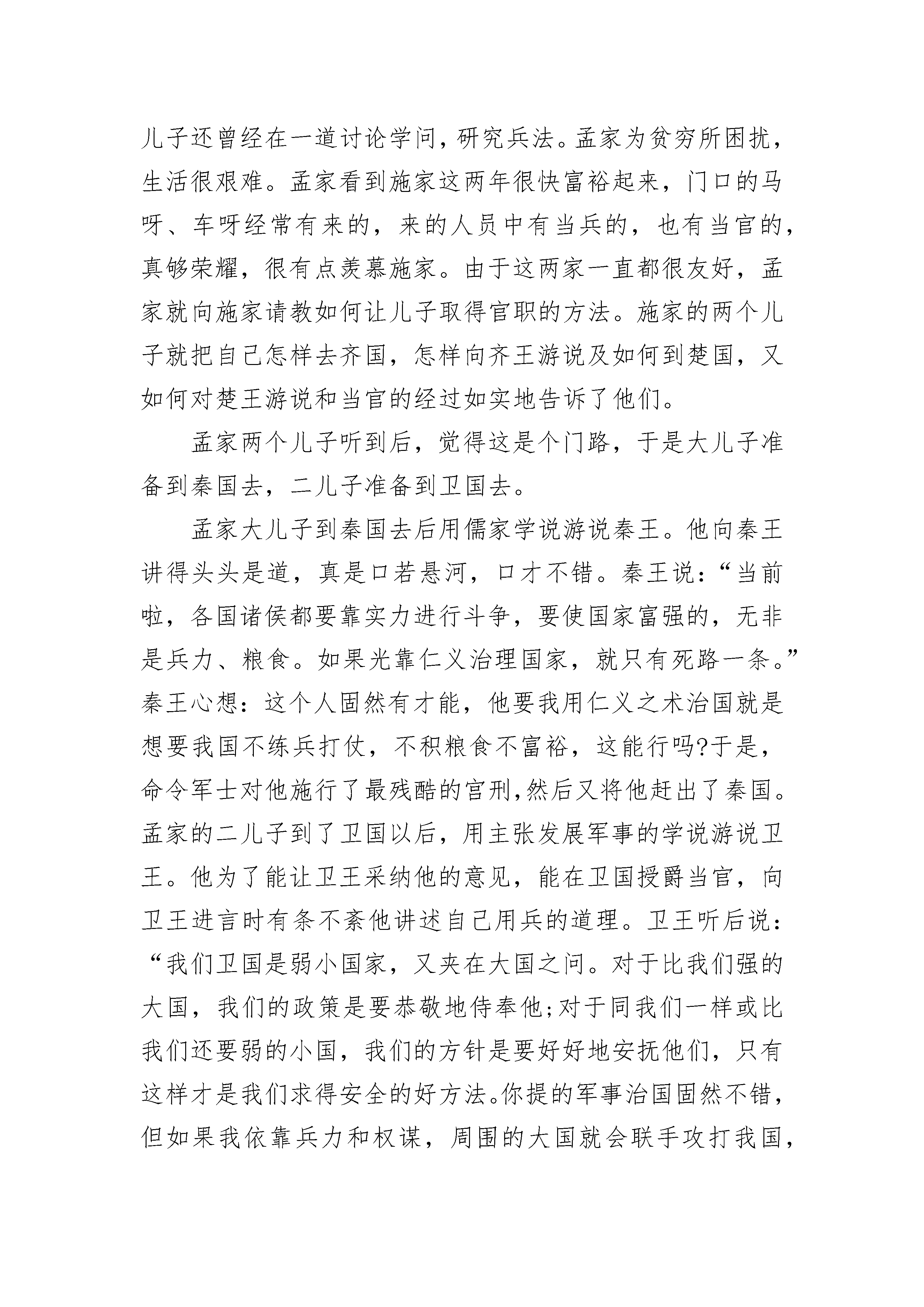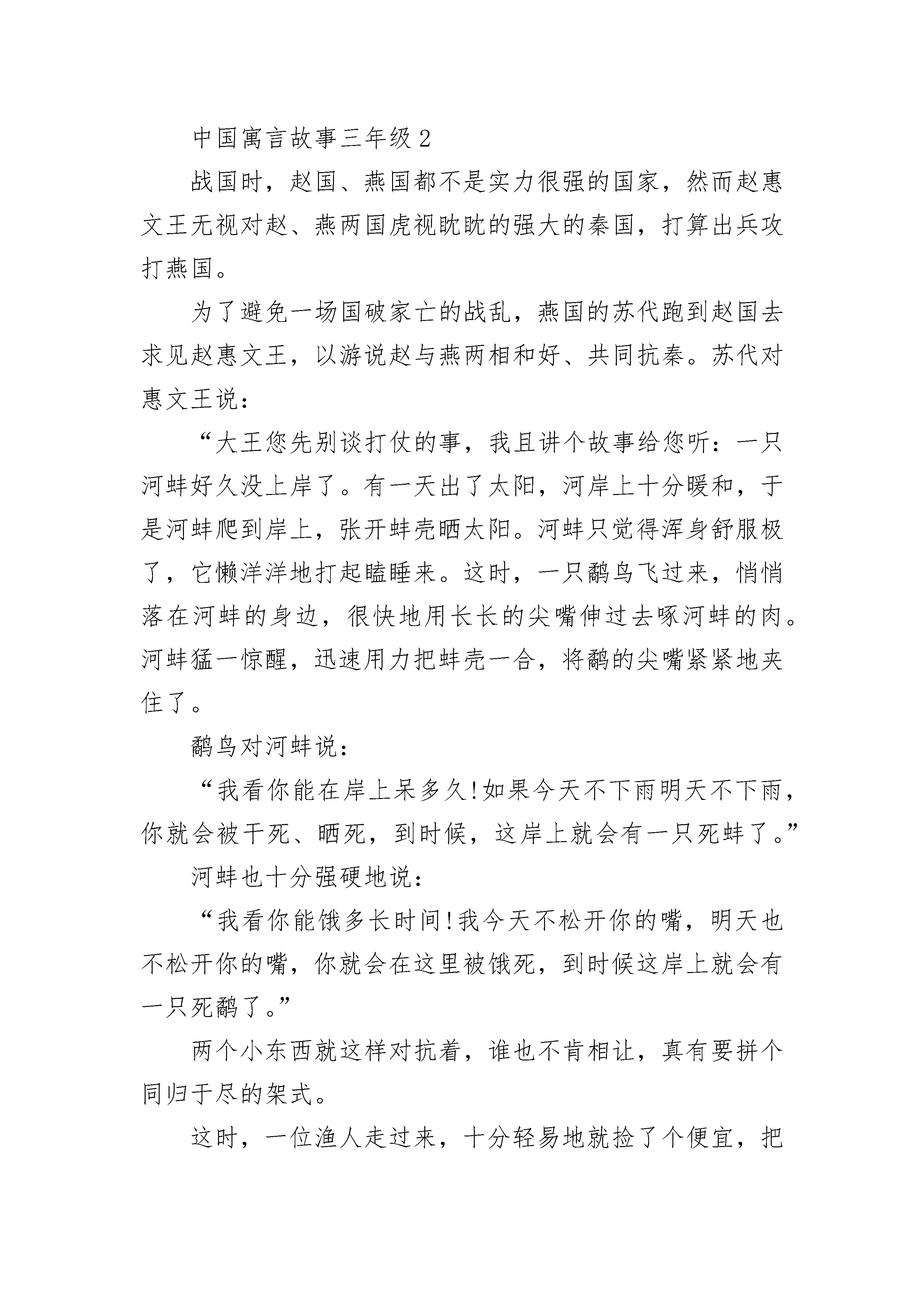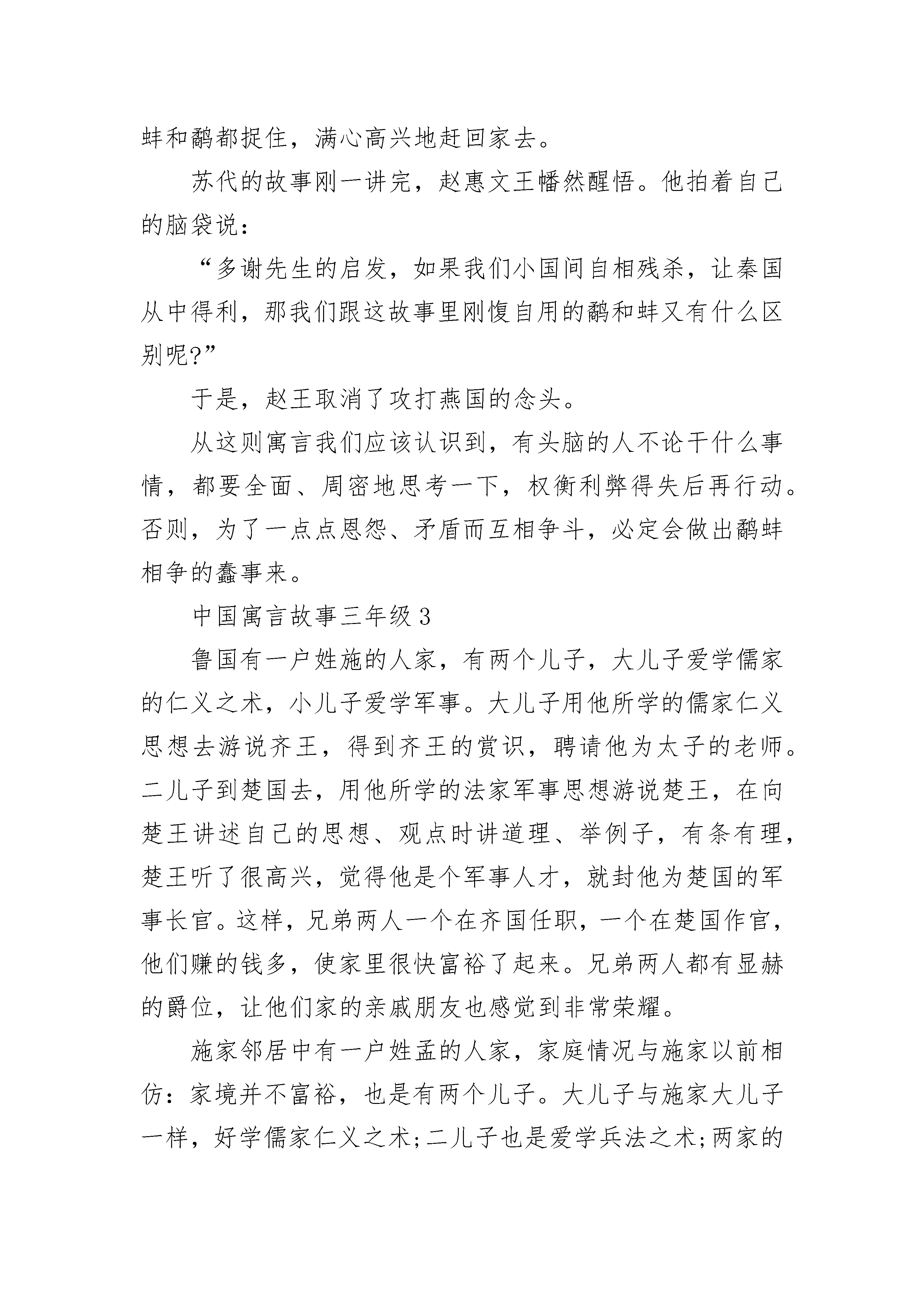 中国寓言故事三年级在我国历的春秋时代,有一个杞国人,总是担心有一天会突然天塌地陷,自己无处安身。他为此事而愁得成天吃饭不香,睡觉不宁。后来,他的一个朋友得知他的忧虑之后,担心这样下去会损害他的健康,于是特意去开导他说:"天,不过是一些积聚的气体而已。而气体是无处不在的,比如你抬腿弯腰,说话呼吸,都是在天际间活动,为什么你还要担心天会塌下来呢?"那个杞国人听了,仍然心有余悸地问:"如果天是一些积聚的气体,那么天上的太阳、月亮、星星,会不会掉下来呢?"开导他的朋友继续解释:"太阳、月亮、星星,也都只是一些会发光的气团,即使掉下来了,也不会伤人的。"可是杞国人的忧虑还没有完,他接着问:"那要是地陷下去了呢?又该怎么办?"他的朋友又说:"地,不过是些堆积的石块而已,它填塞在东南西北四方,没有什么地方没有石块。比如,你站着踩着,都是在地上行走,为什么要担心它会陷下去呢?"杞国人听了朋友的这一番开导之后,终于放下心来,十分高兴。他的朋友也为他不再因无端的忧愁而伤身体,感到了欣慰。其时,有位楚国的思想家名叫长卢子的,在听说了杞国人和朋友的对话之后,不以为然,他笑着评论道:"那些彩虹呀,云雾呀,风雨呀,一年四季的变化呀,所有这些积聚的气体共同构成了天;而那些山岳呀,河海呀,金木火石呀,所有这些堆积物共同构成了地。既然你知道天就是积气,地就是积块,你怎么能断定天与地不会发生变化呢?依我看,所谓天地,不过是宇宙间的一付小小物体,但它在有形之物中又是的一种,其本身并未终结,难以穷尽;因此人们对这件事也很难想像,不易认识,这都是很自然的。杞国人担心天会塌地会陷,这确实有点想得太远;然而他的朋友却说天塌地陷是根本不可能的,这也不对。天与地不可能不坏,而且终究是要坏的,有朝一日它真的要坏了,人们又怎么能不担心呢?"对于这场争论,战国时的郑人列御寇也有说法。他认为:"说天与地会坏,是荒谬的;说天与地不会坏,也是荒谬的。天地到底会不会坏,我们目前尚不知道。不过,说天地会坏是一种见解,说天地不会坏也是一种见解。这就好像活人不知道死者的滋味,死者也不知道活人的情形;未来不晓得过去,过去也不能预测未来。既然如此,天地究竟会不会坏,我又何必放在心上呢?"毫无疑问,如果用今天的科学常识来看待天和地,我们完全可以断言,那个杞国人和他的朋友,以及古代思想家长卢子和列御寇的观点都有偏颇。但这则故事仍然说明:对于一个时代所无法认知和解决的问题,人们不应该陷入无休止的忧愁之中而无力自拔。人生还是要豁达些好。中国寓言故事三年级2战国时,赵国、燕国都不是实力很强的国家,然而赵惠文王无视对赵、燕两国虎视眈眈的强大的秦国,打算出兵攻打燕国。为了避免一场国破家亡的战乱,燕国的苏代跑到赵国去求见赵惠文王,以游说赵与燕两相和好、共同抗秦。苏代对惠文王说:“大王您先别谈打仗的事,我且讲个故事给您听:一只河蚌好久没上岸了。有一天出了太阳,河岸上十分暖和,于是河蚌爬到岸上,张开蚌壳晒太阳。河蚌只觉得浑身舒服极了,它懒洋洋地打起瞌睡来。这时,一只鹬鸟飞过来,悄悄落在河蚌的身边,很快地用长长的尖嘴伸过去啄河蚌的肉。河蚌猛一惊醒,迅速用力把蚌壳一合,将鹬的尖嘴紧紧地夹住了。鹬鸟对河蚌说:“我看你能在岸上呆多久!如果今天不下雨明天不下雨,你就会被干死、晒死,到时候,这岸上就会有一只死蚌了。”河蚌也十分强硬地说:“我看你能饿多长时间!我今天不松开你的嘴,明天也不松开你的嘴,你就会在这里被饿死,到时候这岸上就会有一只死鹬了。”两个小东西就这样对抗着,谁也不肯相让,真有要拼个同归于尽的架式。这时,一位渔人走过来,十分轻易地就捡了个便宜,把蚌和鹬都捉住,满心高兴地赶回家去。苏代的故事刚一讲完,赵惠文王幡然醒悟。他拍着自己的脑袋说:“多谢先生的启发,如果我们小国间自相残杀,让秦国从中得利,那我们跟这故事里刚愎自用的鹬和蚌又有什么区别呢?”于是,赵王取消了攻打燕国的念头。从这则寓言我们应该认识到,有头脑的人不论干什么事情,都要全面、周密地思考一下,权衡利弊得失后再行动。否则,为了一点点恩怨、矛盾而互相争斗,必定会做出鹬蚌相争的蠢事来。中国寓言故事三年级3鲁国有一户姓施的人家,有两个儿子,大儿子爱学儒家的仁义之术,小儿子爱学军事。大儿子用他所学的儒家仁义思想去游说齐王,得到齐王的赏识,聘请他为太子的老师。二儿子到楚国去,用他所学的法家军事思想游说楚王,在向楚王讲述自己的思想、观点时讲道理、举例子,有条有理,楚王听了很高兴,觉得他是个军事人才,就封他为楚国的军事长官。这样,兄弟两人一个在齐国任职,一个在楚国作官,他们赚的钱多,使家里很快富裕了起来。兄弟两人都有显赫的爵位,让他们家的亲戚朋友也感觉到非常荣耀。施家邻居中有一户姓孟的人家,家庭情况与施家以前相仿:家境并不富裕,也是有两个儿子。大儿子与施家大儿子一样,好学儒