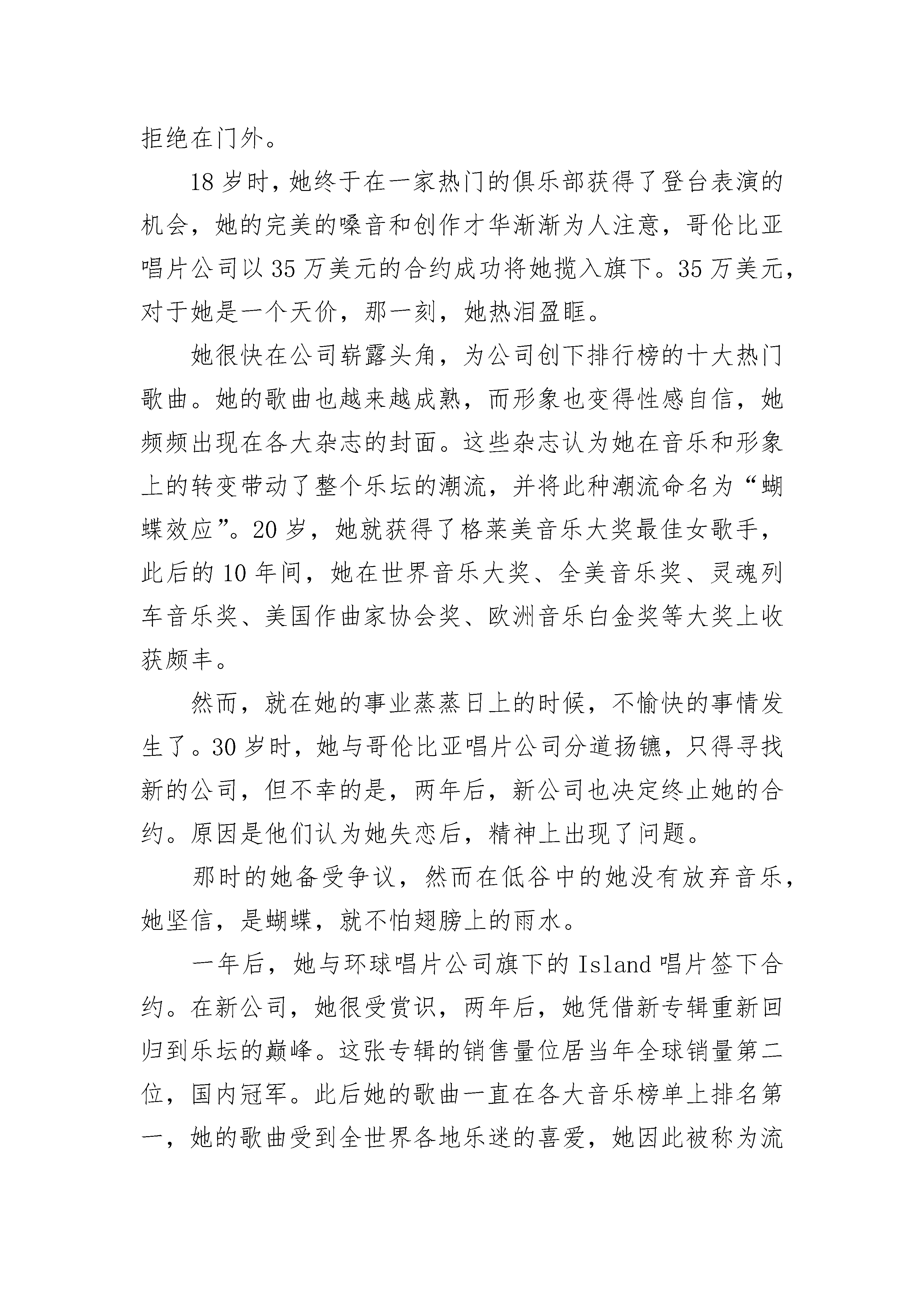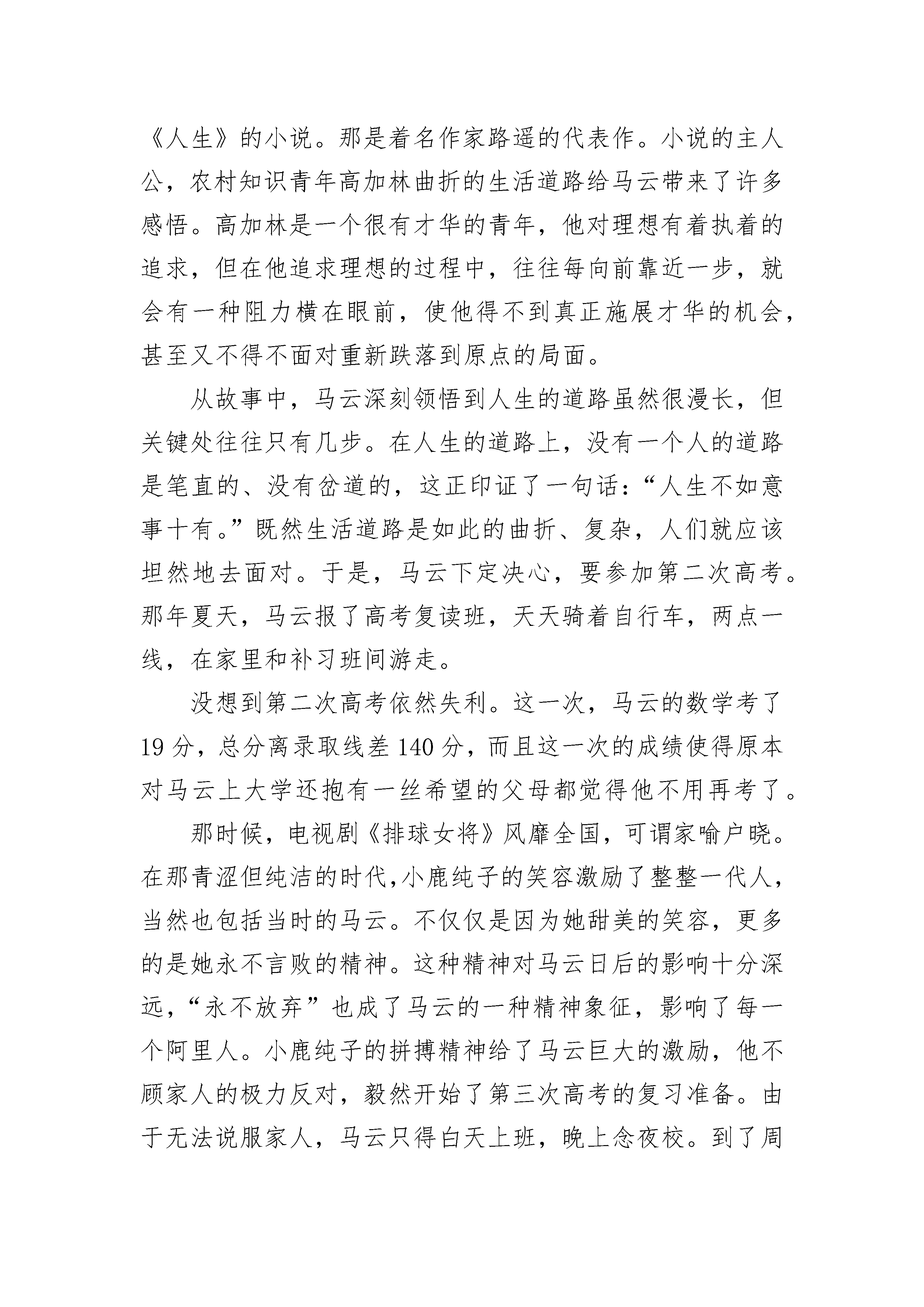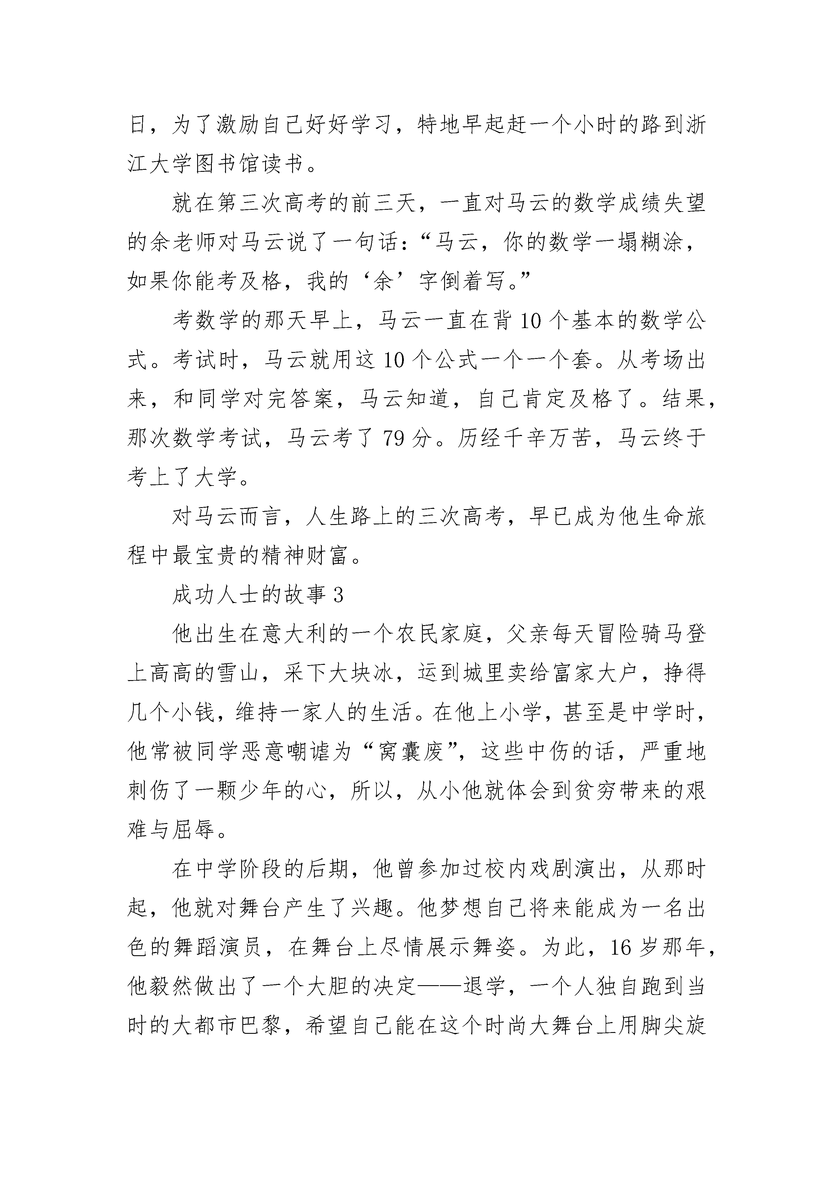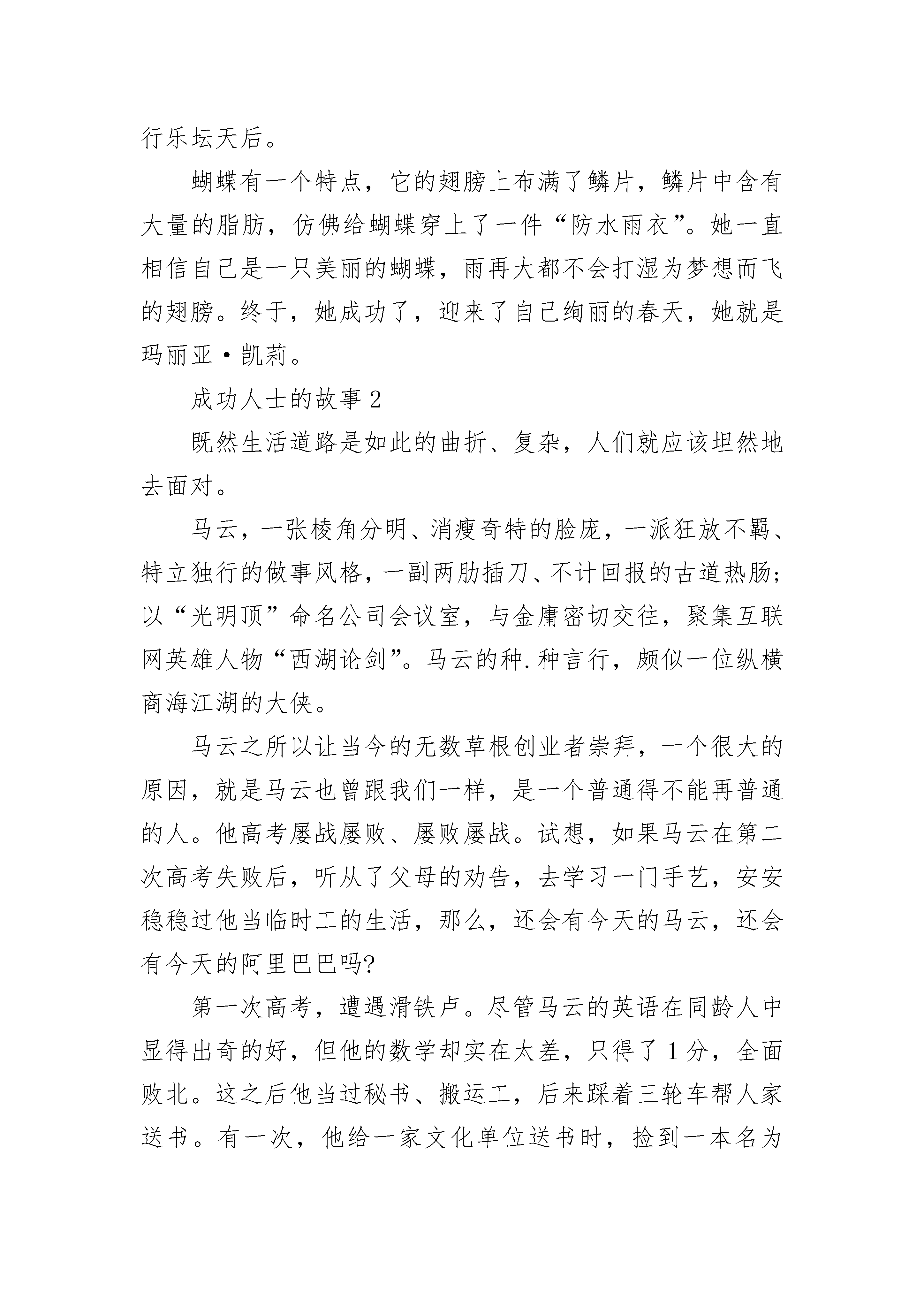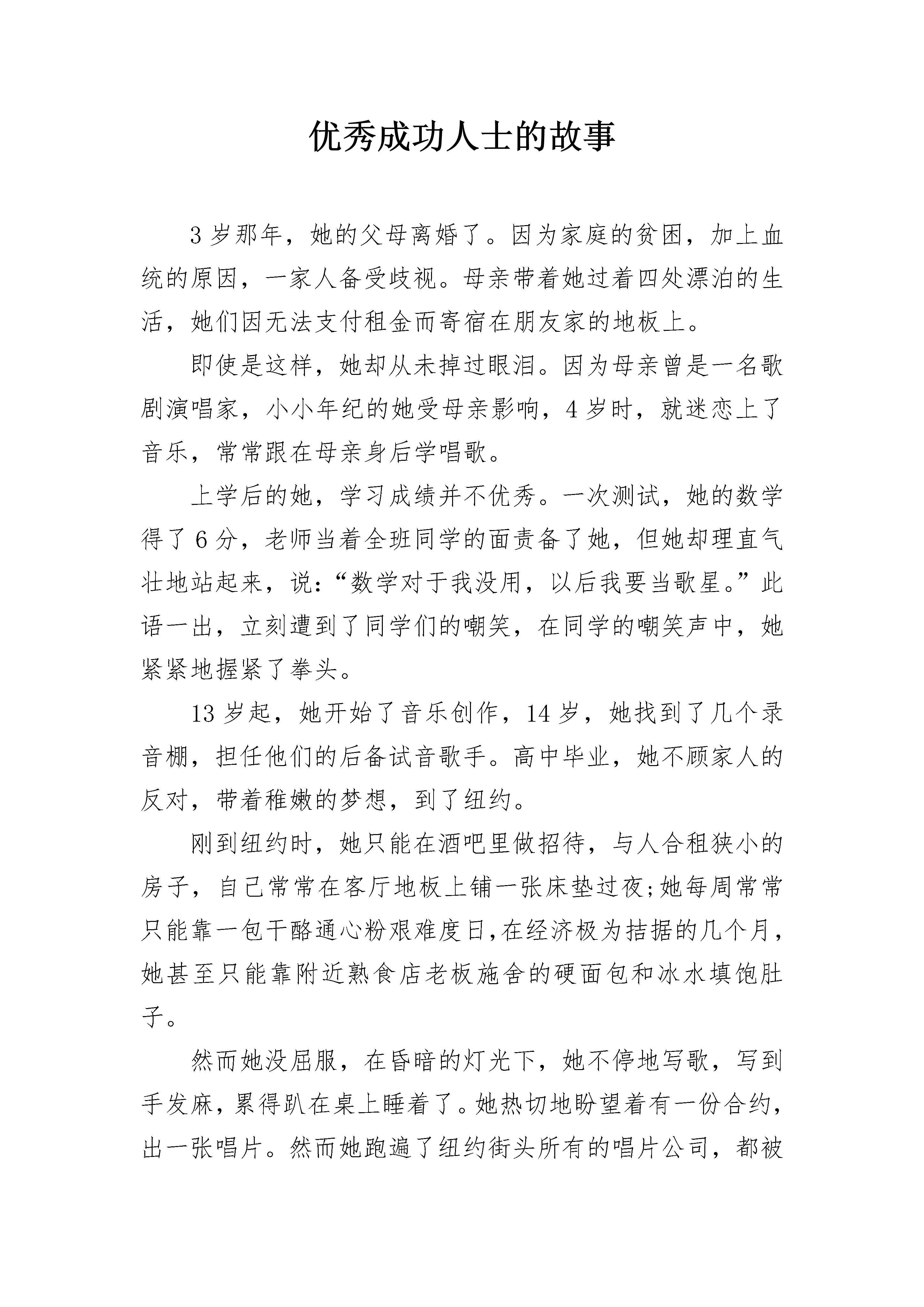 优秀成功人士的故事3岁那年,她的父母离婚了。因为家庭的贫困,加上血统的原因,一家人备受歧视。母亲带着她过着四处漂泊的生活,她们因无法支付租金而寄宿在朋友家的地板上。即使是这样,她却从未掉过眼泪。因为母亲曾是一名歌剧演唱家,小小年纪的她受母亲影响,4岁时,就迷恋上了音乐,常常跟在母亲身后学唱歌。上学后的她,学习成绩并不优秀。一次测试,她的数学得了6分,老师当着全班同学的面责备了她,但她却理直气壮地站起来,说:“数学对于我没用,以后我要当歌星。”此语一出,立刻遭到了同学们的嘲笑,在同学的嘲笑声中,她紧紧地握紧了拳头。13岁起,她开始了音乐创作,14岁,她找到了几个录音棚,担任他们的后备试音歌手。高中毕业,她不顾家人的反对,带着稚嫩的梦想,到了纽约。刚到纽约时,她只能在酒吧里做招待,与人合租狭小的房子,自己常常在客厅地板上铺一张床垫过夜;她每周常常只能靠一包干酪通心粉艰难度日,在经济极为拮据的几个月,她甚至只能靠附近熟食店老板施舍的硬面包和冰水填饱肚子。然而她没屈服,在昏暗的灯光下,她不停地写歌,写到手发麻,累得趴在桌上睡着了。她热切地盼望着有一份合约,出一张唱片。然而她跑遍了纽约街头所有的唱片公司,都被拒绝在门外。18岁时,她终于在一家热门的俱乐部获得了登台表演的机会,她的完美的嗓音和创作才华渐渐为人注意,哥伦比亚唱片公司以35万美元的合约成功将她揽入旗下。35万美元,对于她是一个天价,那一刻,她热泪盈眶。她很快在公司崭露头角,为公司创下排行榜的十大热门歌曲。她的歌曲也越来越成熟,而形象也变得性感自信,她频频出现在各大杂志的封面。这些杂志认为她在音乐和形象上的转变带动了整个乐坛的潮流,并将此种潮流命名为“蝴蝶效应”。20岁,她就获得了格莱美音乐大奖最佳女歌手,此后的10年间,她在世界音乐大奖、全美音乐奖、灵魂列车音乐奖、美国作曲家协会奖、欧洲音乐白金奖等大奖上收获颇丰。然而,就在她的事业蒸蒸日上的时候,不愉快的事情发生了。30岁时,她与哥伦比亚唱片公司分道扬镳,只得寻找新的公司,但不幸的是,两年后,新公司也决定终止她的合约。原因是他们认为她失恋后,精神上出现了问题。那时的她备受争议,然而在低谷中的她没有放弃音乐,她坚信,是蝴蝶,就不怕翅膀上的雨水。一年后,她与环球唱片公司旗下的Island唱片签下合约。在新公司,她很受赏识,两年后,她凭借新专辑重新回归到乐坛的巅峰。这张专辑的销售量位居当年全球销量第二位,国内冠军。此后她的歌曲一直在各大音乐榜单上排名第一,她的歌曲受到全世界各地乐迷的喜爱,她因此被称为流行乐坛天后。蝴蝶有一个特点,它的翅膀上布满了鳞片,鳞片中含有大量的脂肪,仿佛给蝴蝶穿上了一件“防水雨衣”。她一直相信自己是一只美丽的蝴蝶,雨再大都不会打湿为梦想而飞的翅膀。终于,她成功了,迎来了自己绚丽的春天,她就是玛丽亚·凯莉。成功人士的故事2既然生活道路是如此的曲折、复杂,人们就应该坦然地去面对。马云,一张棱角分明、消瘦奇特的脸庞,一派狂放不羁、特立独行的做事风格,一副两肋插刀、不计回报的古道热肠;以“光明顶”命名公司会议室,与金庸密切交往,聚集互联网英雄人物“西湖论剑”。马云的种.种言行,颇似一位纵横商海江湖的大侠。马云之所以让当今的无数草根创业者崇拜,一个很大的原因,就是马云也曾跟我们一样,是一个普通得不能再普通的人。他高考屡战屡败、屡败屡战。试想,如果马云在第二次高考失败后,听从了父母的劝告,去学习一门手艺,安安稳稳过他当临时工的生活,那么,还会有今天的马云,还会有今天的阿里巴巴吗?第一次高考,遭遇滑铁卢。尽管马云的英语在同龄人中显得出奇的好,但他的数学却实在太差,只得了1分,全面败北。这之后他当过秘书、搬运工,后来踩着三轮车帮人家送书。有一次,他给一家文化单位送书时,捡到一本名为《人生》的小说。那是着名作家路遥的代表作。小说的主人公,农村知识青年高加林曲折的生活道路给马云带来了许多感悟。高加林是一个很有才华的青年,他对理想有着执着的追求,但在他追求理想的过程中,往往每向前靠近一步,就会有一种阻力横在眼前,使他得不到真正施展才华的机会,甚至又不得不面对重新跌落到原点的局面。从故事中,马云深刻领悟到人生的道路虽然很漫长,但关键处往往只有几步。在人生的道路上,没有一个人的道路是笔直的、没有岔道的,这正印证了一句话:“人生不如意事十有。”既然生活道路是如此的曲折、复杂,人们就应该坦然地去面对。于是,马云下定决心,要参加第二次高考。那年夏天,马云报了高考复读班,天天骑着自行车,两点一线,在家里和补习班间游走。没想到第二次高考依然失利。这一次,马云的数学考了19分,总分离录取线差140分,而且这一次的成绩使得原本对马云上大学还抱有一丝希望的父母都觉得他不用再考了。那时候,电视剧《排球女将》风靡全国,可谓家喻户晓。在那青涩但纯洁的