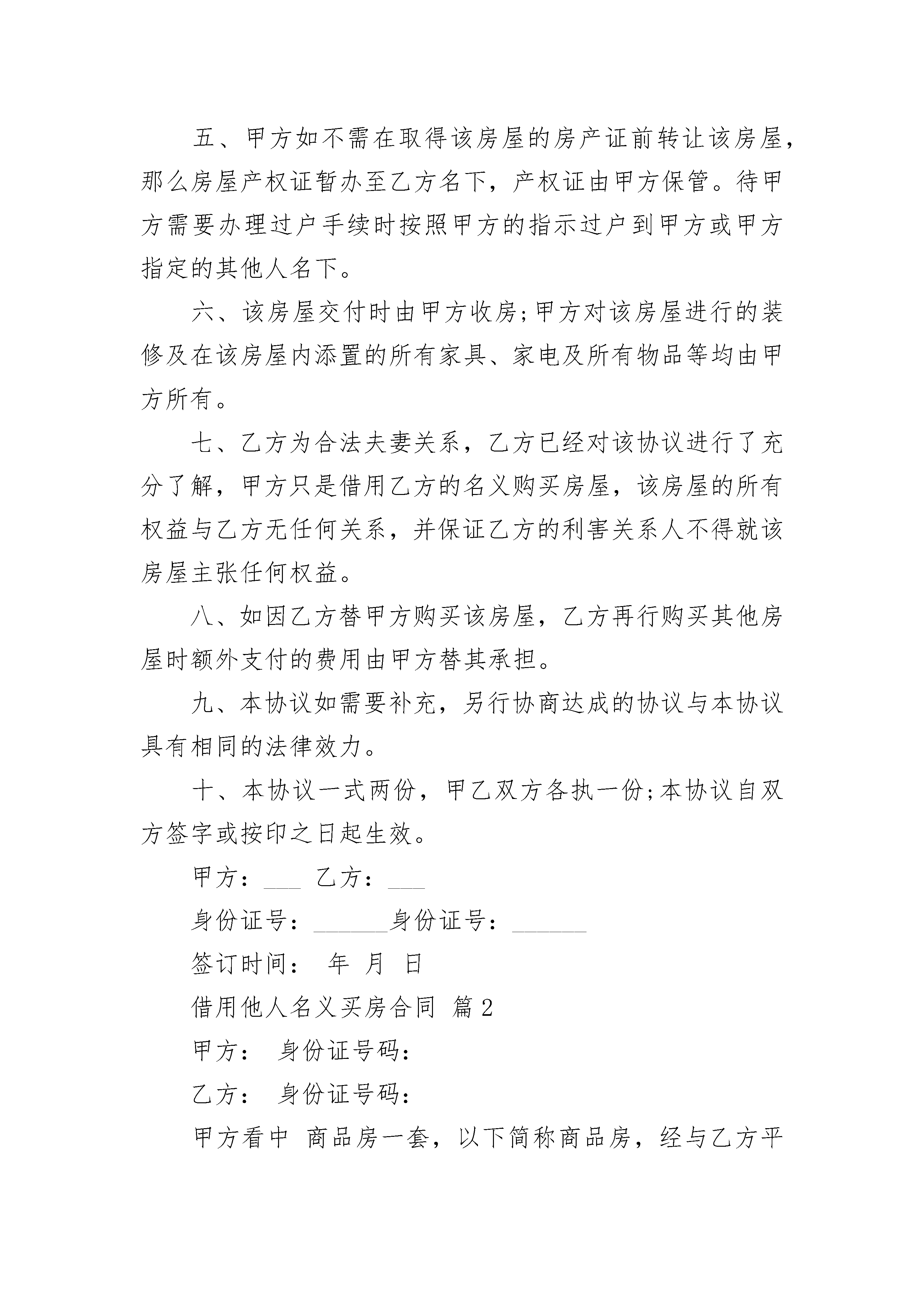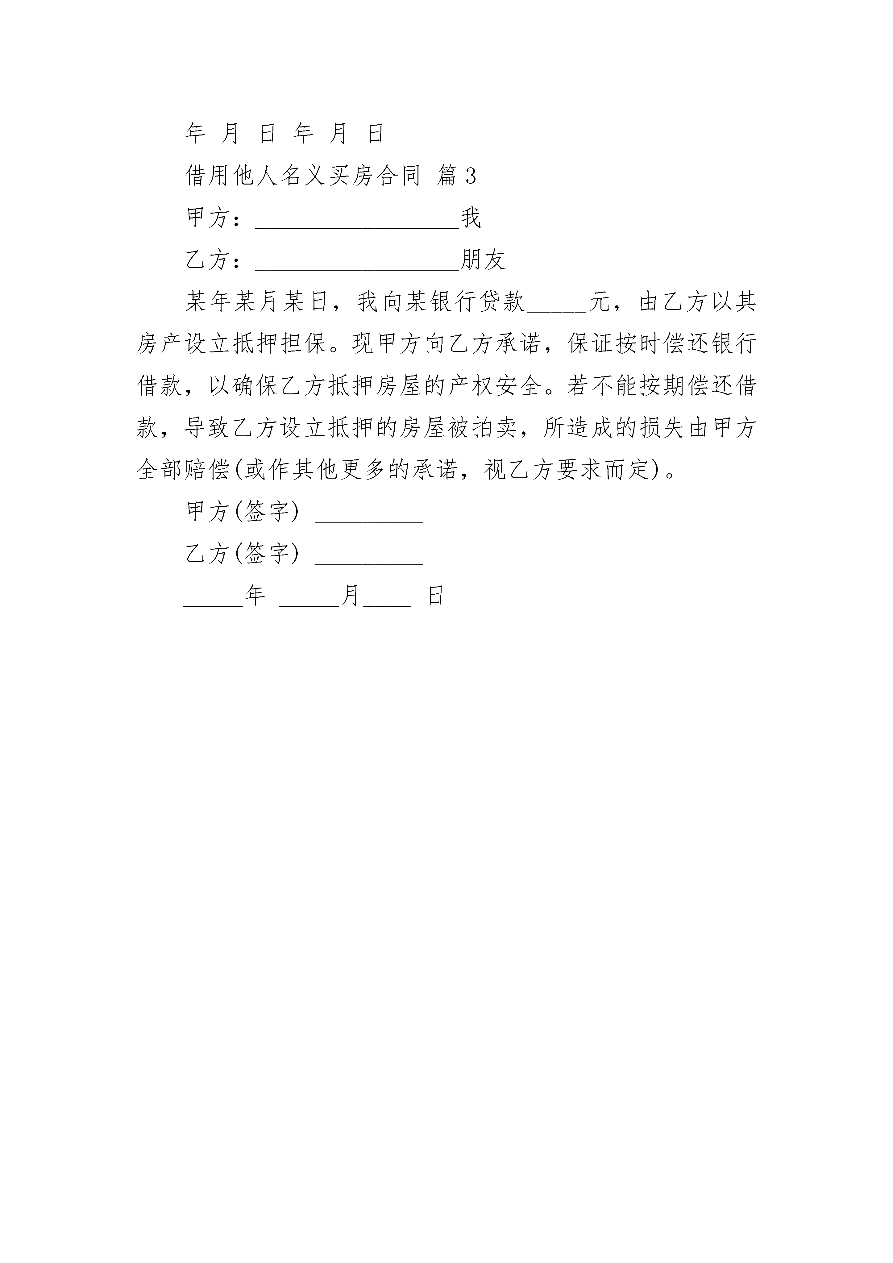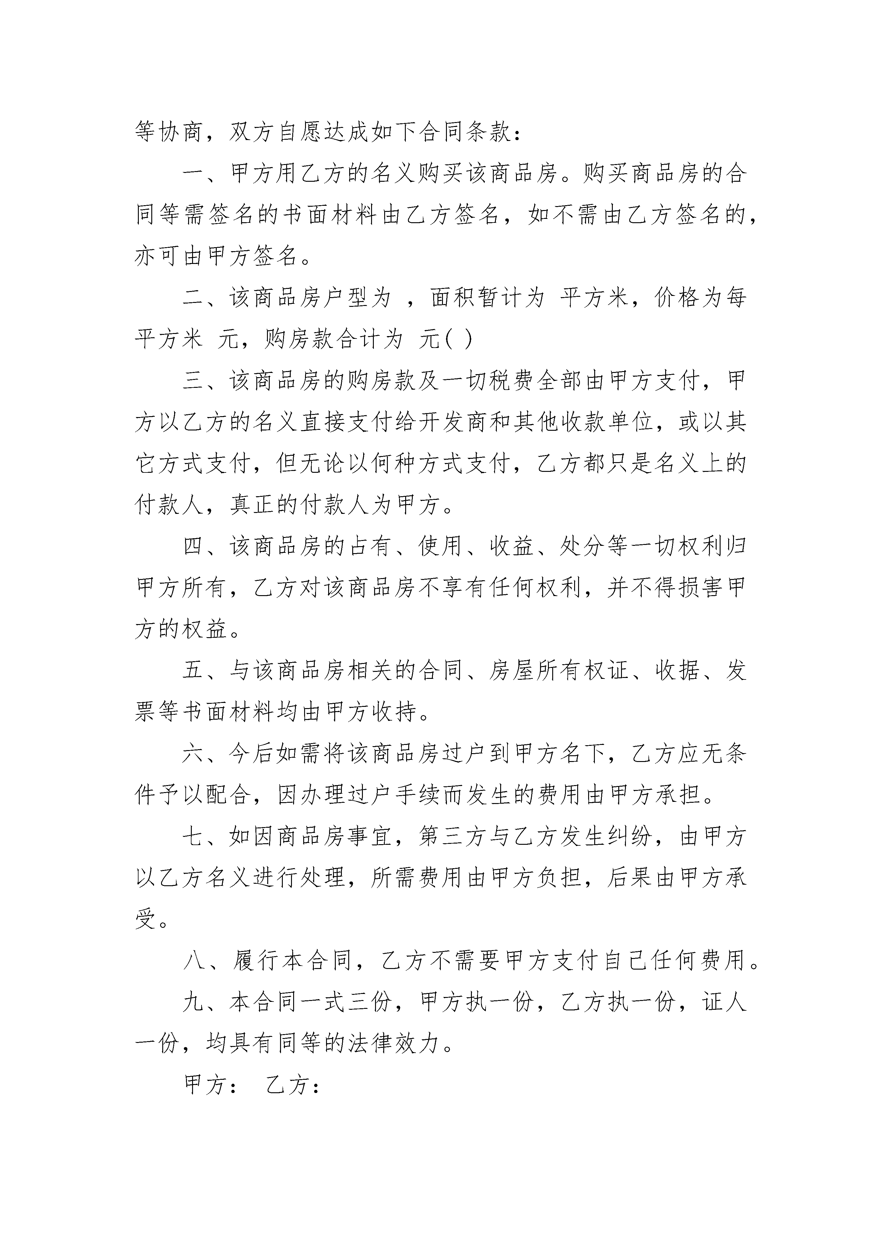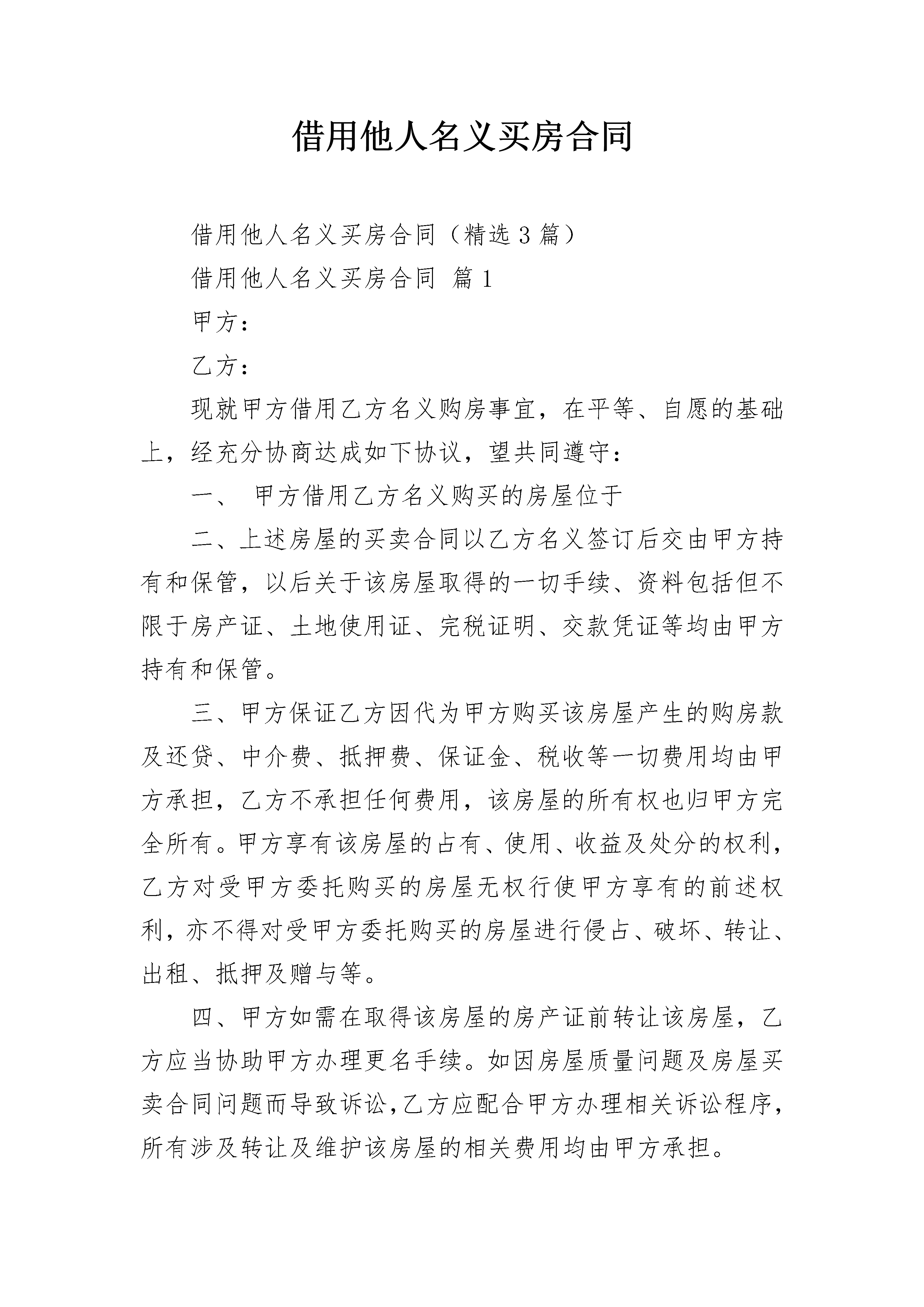 借用他人名义买房合同借用他人名义买房合同(精选3篇)借用他人名义买房合同篇1甲方:乙方:现就甲方借用乙方名义购房事宜,在平等、自愿的基础上,经充分协商达成如下协议,望共同遵守:一、甲方借用乙方名义购买的房屋位于二、上述房屋的买卖合同以乙方名义签订后交由甲方持有和保管,以后关于该房屋取得的一切手续、资料包括但不限于房产证、土地使用证、完税证明、交款凭证等均由甲方持有和保管。三、甲方保证乙方因代为甲方购买该房屋产生的购房款及还贷、中介费、抵押费、保证金、税收等一切费用均由甲方承担,乙方不承担任何费用,该房屋的所有权也归甲方完全所有。甲方享有该房屋的占有、使用、收益及处分的权利,乙方对受甲方委托购买的房屋无权行使甲方享有的前述权利,亦不得对受甲方委托购买的房屋进行侵占、破坏、转让、出租、抵押及赠与等。四、甲方如需在取得该房屋的房产证前转让该房屋,乙方应当协助甲方办理更名手续。如因房屋质量问题及房屋买卖合同问题而导致诉讼,乙方应配合甲方办理相关诉讼程序,所有涉及转让及维护该房屋的相关费用均由甲方承担。五、甲方如不需在取得该房屋的房产证前转让该房屋,那么房屋产权证暂办至乙方名下,产权证由甲方保管。待甲方需要办理过户手续时按照甲方的指示过户到甲方或甲方指定的其他人名下。六、该房屋交付时由甲方收房;甲方对该房屋进行的装修及在该房屋内添置的所有家具、家电及所有物品等均由甲方所有。七、乙方为合法夫妻关系,乙方已经对该协议进行了充分了解,甲方只是借用乙方的名义购买房屋,该房屋的所有权益与乙方无任何关系,并保证乙方的利害关系人不得就该房屋主张任何权益。八、如因乙方替甲方购买该房屋,乙方再行购买其他房屋时额外支付的费用由甲方替其承担。九、本协议如需要补充,另行协商达成的协议与本协议具有相同的法律效力。十、本协议一式两份,甲乙双方各执一份;本协议自双方签字或按印之日起生效。甲方:___乙方:___身份证号:______身份证号:______签订时间:年月日借用他人名义买房合同篇2甲方:身份证号码:乙方:身份证号码:甲方看中商品房一套,以下简称商品房,经与乙方平等协商,双方自愿达成如下合同条款:一、甲方用乙方的名义购买该商品房。购买商品房的合同等需签名的书面材料由乙方签名,如不需由乙方签名的,亦可由甲方签名。二、该商品房户型为,面积暂计为平方米,价格为每平方米元,购房款合计为元()三、该商品房的购房款及一切税费全部由甲方支付,甲方以乙方的名义直接支付给开发商和其他收款单位,或以其它方式支付,但无论以何种方式支付,乙方都只是名义上的付款人,真正的付款人为甲方。四、该商品房的占有、使用、收益、处分等一切权利归甲方所有,乙方对该商品房不享有任何权利,并不得损害甲方的权益。五、与该商品房相关的合同、房屋所有权证、收据、发票等书面材料均由甲方收持。六、今后如需将该商品房过户到甲方名下,乙方应无条件予以配合,因办理过户手续而发生的费用由甲方承担。七、如因商品房事宜,第三方与乙方发生纠纷,由甲方以乙方名义进行处理,所需费用由甲方负担,后果由甲方承受。八、履行本合同,乙方不需要甲方支付自己任何费用。九、本合同一式三份,甲方执一份,乙方执一份,证人一份,均具有同等的法律效力。甲方:乙方:年月日年月日借用他人名义买房合同篇3甲方:_________________我乙方:_________________朋友某年某月某日,我向某银行贷款_____元,由乙方以其房产设立抵押担保。现甲方向乙方承诺,保证按时偿还银行借款,以确保乙方抵押房屋的产权安全。若不能按期偿还借款,导致乙方设立抵押的房屋被拍卖,所造成的损失由甲方全部赔偿(或作其他更多的承诺,视乙方要求而定)。甲方(签字)_________乙方(签字)______________年_____月____日