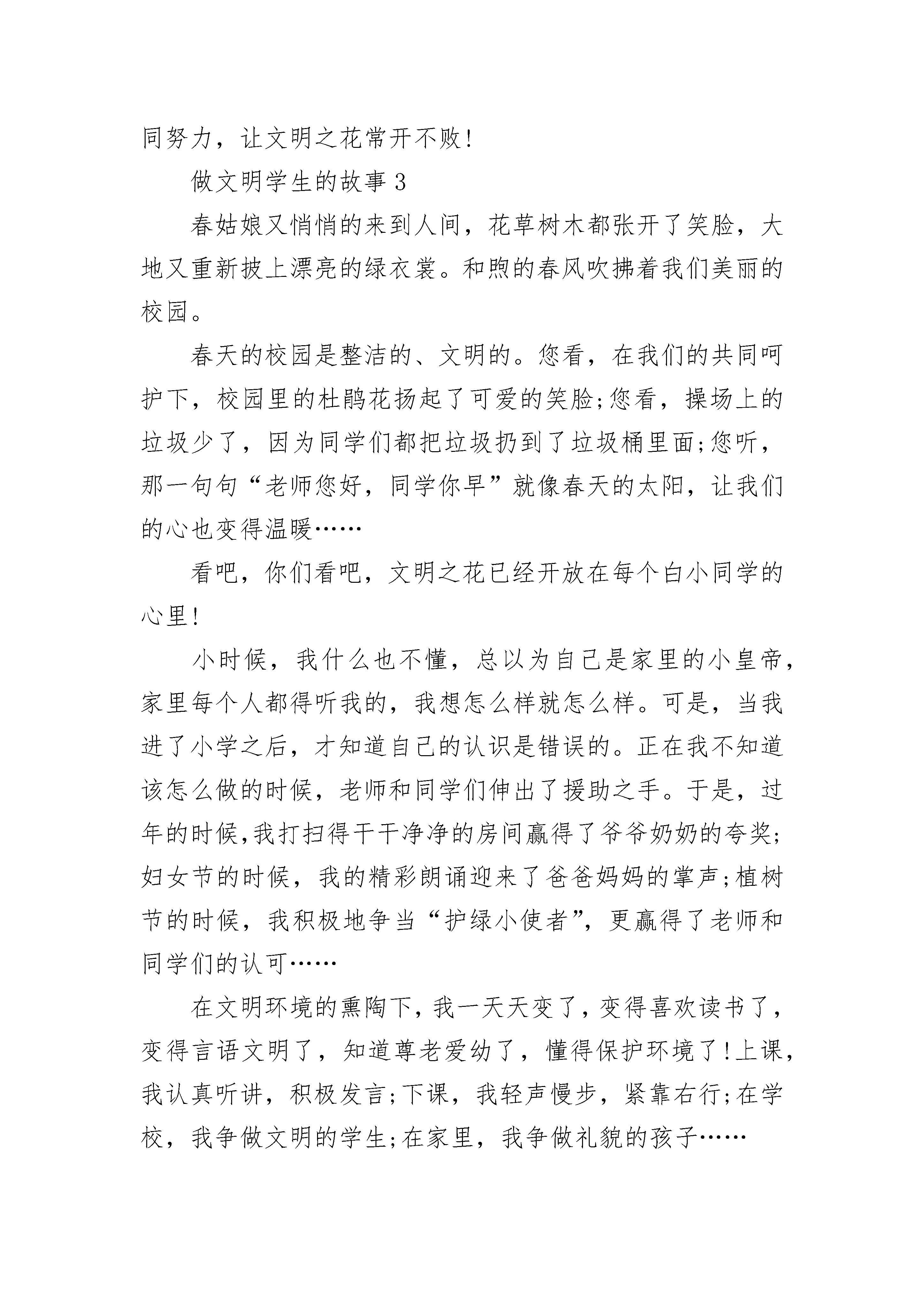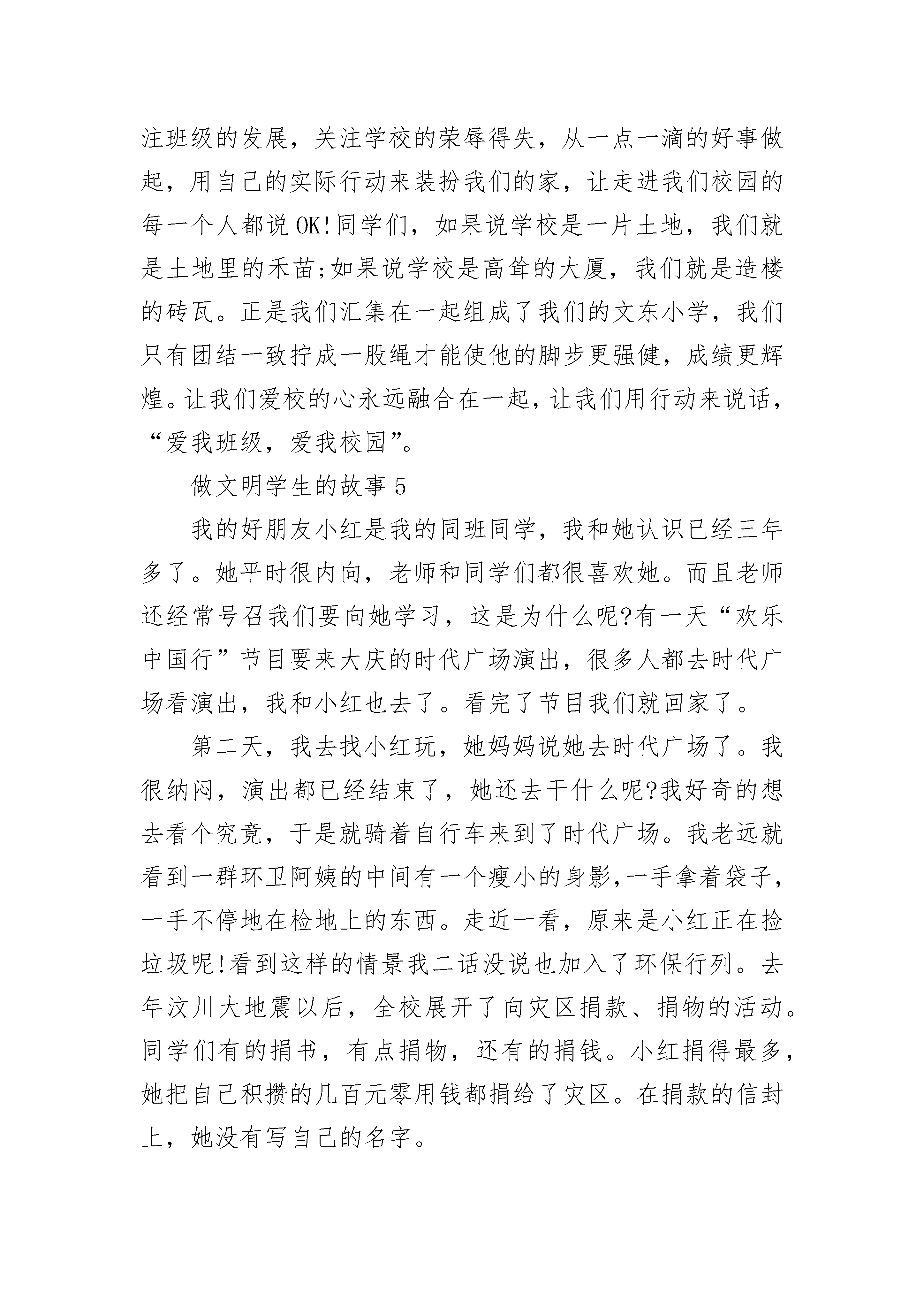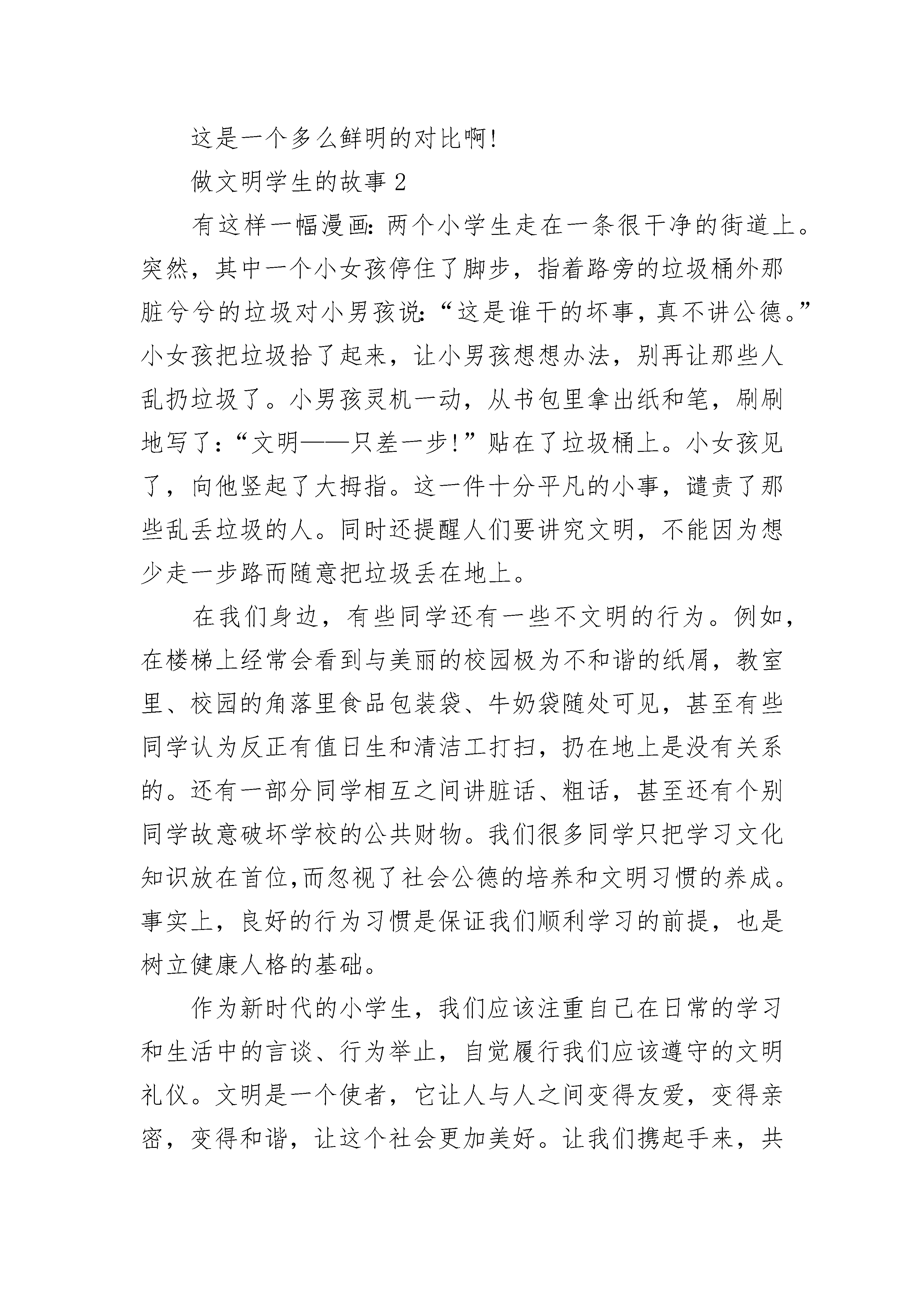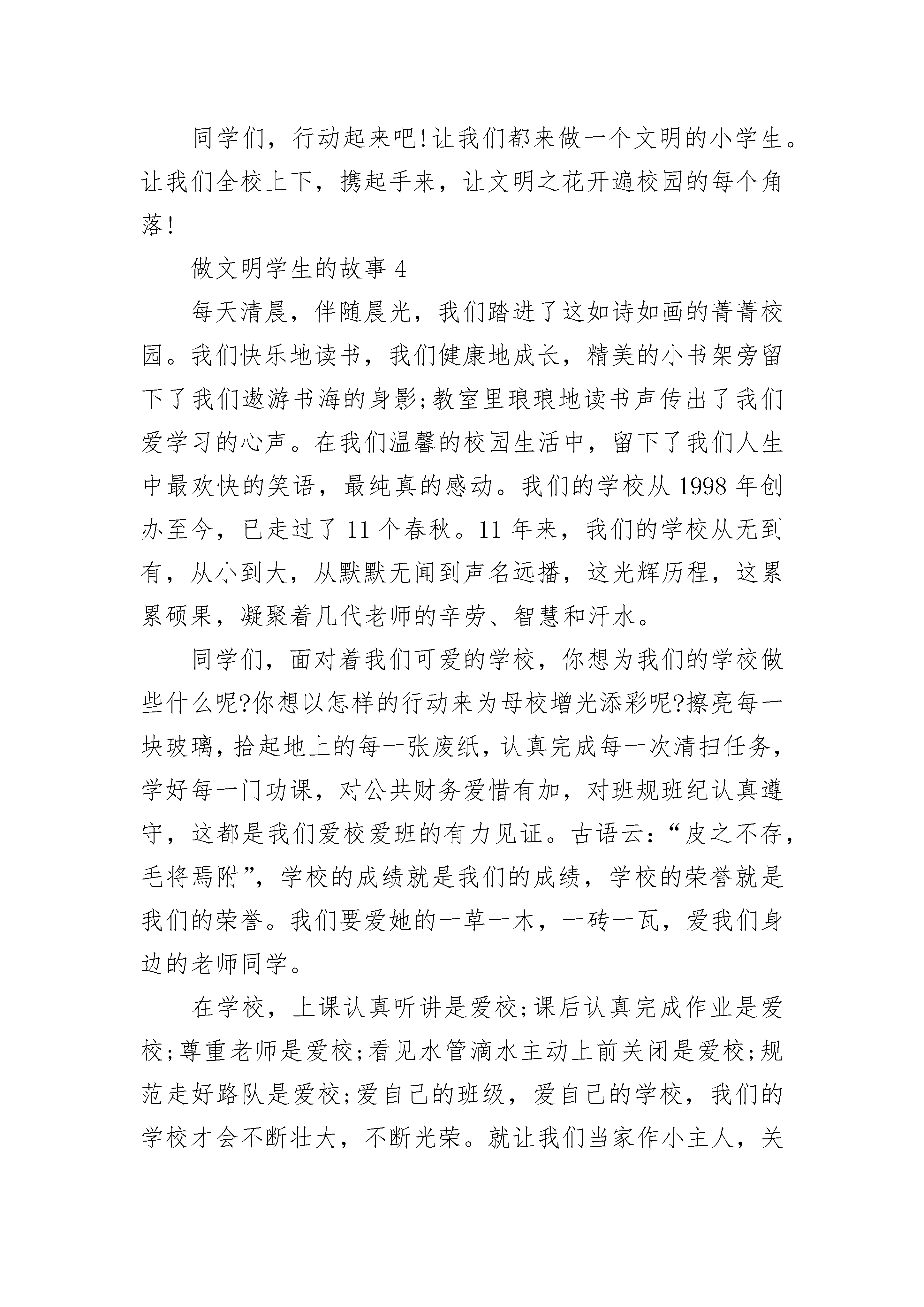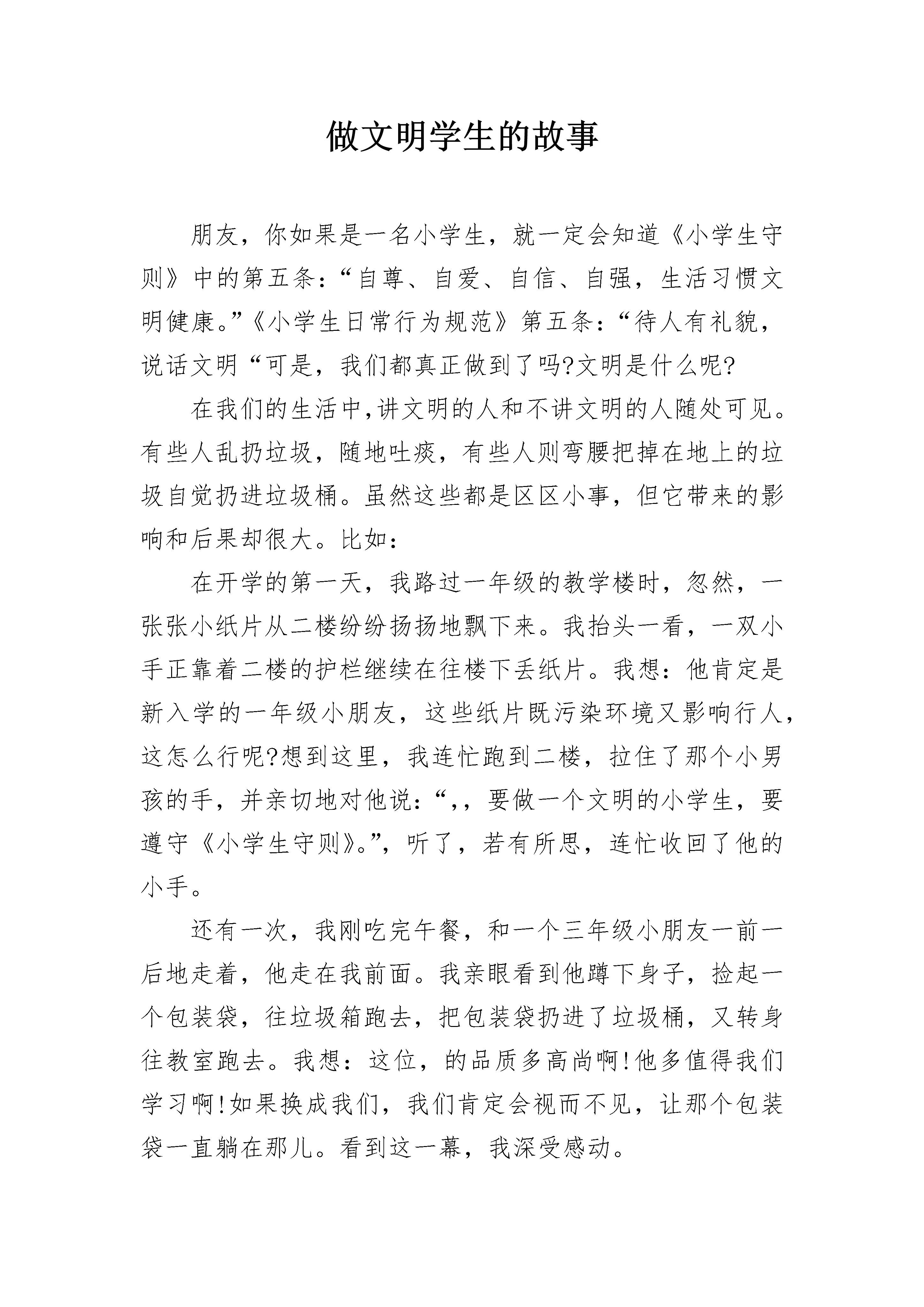 做文明学生的故事朋友,你如果是一名小学生,就一定会知道《小学生守则》中的第五条:“自尊、自爱、自信、自强,生活习惯文明健康。”《小学生日常行为规范》第五条:“待人有礼貌,说话文明“可是,我们都真正做到了吗?文明是什么呢?在我们的生活中,讲文明的人和不讲文明的人随处可见。有些人乱扔垃圾,随地吐痰,有些人则弯腰把掉在地上的垃圾自觉扔进垃圾桶。虽然这些都是区区小事,但它带来的影响和后果却很大。比如:在开学的第一天,我路过一年级的教学楼时,忽然,一张张小纸片从二楼纷纷扬扬地飘下来。我抬头一看,一双小手正靠着二楼的护栏继续在往楼下丢纸片。我想:他肯定是新入学的一年级小朋友,这些纸片既污染环境又影响行人,这怎么行呢?想到这里,我连忙跑到二楼,拉住了那个小男孩的手,并亲切地对他说:“,,要做一个文明的小学生,要遵守《小学生守则》。”,听了,若有所思,连忙收回了他的小手。还有一次,我刚吃完午餐,和一个三年级小朋友一前一后地走着,他走在我前面。我亲眼看到他蹲下身子,捡起一个包装袋,往垃圾箱跑去,把包装袋扔进了垃圾桶,又转身往教室跑去。我想:这位,的品质多高尚啊!他多值得我们学习啊!如果换成我们,我们肯定会视而不见,让那个包装袋一直躺在那儿。看到这一幕,我深受感动。这是一个多么鲜明的对比啊!做文明学生的故事2有这样一幅漫画:两个小学生走在一条很干净的街道上。突然,其中一个小女孩停住了脚步,指着路旁的垃圾桶外那脏兮兮的垃圾对小男孩说:“这是谁干的坏事,真不讲公德。”小女孩把垃圾拾了起来,让小男孩想想办法,别再让那些人乱扔垃圾了。小男孩灵机一动,从书包里拿出纸和笔,刷刷地写了:“文明——只差一步!”贴在了垃圾桶上。小女孩见了,向他竖起了大拇指。这一件十分平凡的小事,谴责了那些乱丢垃圾的人。同时还提醒人们要讲究文明,不能因为想少走一步路而随意把垃圾丢在地上。在我们身边,有些同学还有一些不文明的行为。例如,在楼梯上经常会看到与美丽的校园极为不和谐的纸屑,教室里、校园的角落里食品包装袋、牛奶袋随处可见,甚至有些同学认为反正有值日生和清洁工打扫,扔在地上是没有关系的。还有一部分同学相互之间讲脏话、粗话,甚至还有个别同学故意破坏学校的公共财物。我们很多同学只把学习文化知识放在首位,而忽视了社会公德的培养和文明习惯的养成。事实上,良好的行为习惯是保证我们顺利学习的前提,也是树立健康人格的基础。作为新时代的小学生,我们应该注重自己在日常的学习和生活中的言谈、行为举止,自觉履行我们应该遵守的文明礼仪。文明是一个使者,它让人与人之间变得友爱,变得亲密,变得和谐,让这个社会更加美好。让我们携起手来,共同努力,让文明之花常开不败!做文明学生的故事3春姑娘又悄悄的来到人间,花草树木都张开了笑脸,大地又重新披上漂亮的绿衣裳。和煦的春风吹拂着我们美丽的校园。春天的校园是整洁的、文明的。您看,在我们的共同呵护下,校园里的杜鹃花扬起了可爱的笑脸;您看,操场上的垃圾少了,因为同学们都把垃圾扔到了垃圾桶里面;您听,那一句句“老师您好,同学你早”就像春天的太阳,让我们的心也变得温暖……看吧,你们看吧,文明之花已经开放在每个白小同学的心里!小时候,我什么也不懂,总以为自己是家里的小皇帝,家里每个人都得听我的,我想怎么样就怎么样。可是,当我进了小学之后,才知道自己的认识是错误的。正在我不知道该怎么做的时候,老师和同学们伸出了援助之手。于是,过年的时候,我打扫得干干净净的房间赢得了爷爷奶奶的夸奖;妇女节的时候,我的精彩朗诵迎来了爸爸妈妈的掌声;植树节的时候,我积极地争当“护绿小使者”,更赢得了老师和同学们的认可……在文明环境的熏陶下,我一天天变了,变得喜欢读书了,变得言语文明了,知道尊老爱幼了,懂得保护环境了!上课,我认真听讲,积极发言;下课,我轻声慢步,紧靠右行;在学校,我争做文明的学生;在家里,我争做礼貌的孩子……同学们,行动起来吧!让我们都来做一个文明的小学生。让我们全校上下,携起手来,让文明之花开遍校园的每个角落!做文明学生的故事4每天清晨,伴随晨光,我们踏进了这如诗如画的菁菁校园。我们快乐地读书,我们健康地成长,精美的小书架旁留下了我们遨游书海的身影;教室里琅琅地读书声传出了我们爱学习的心声。在我们温馨的校园生活中,留下了我们人生中最欢快的笑语,最纯真的感动。我们的学校从1998年创办至今,已走过了11个春秋。11年来,我们的学校从无到有,从小到大,从默默无闻到声名远播,这光辉历程,这累累硕果,凝聚着几代老师的辛劳、智慧和汗水。同学们,面对着我们可爱的学校,你想为我们的学校做些什么呢?你想以怎样的行动来为母校增光添彩呢?擦亮每一块玻璃,拾起地上的每一张废纸,认真完成每一次清扫任务,学好每一门功课,对公共财务爱惜有加,对班规班纪认真遵守,这都是我们爱校爱班的有力见证。古语云:“皮之