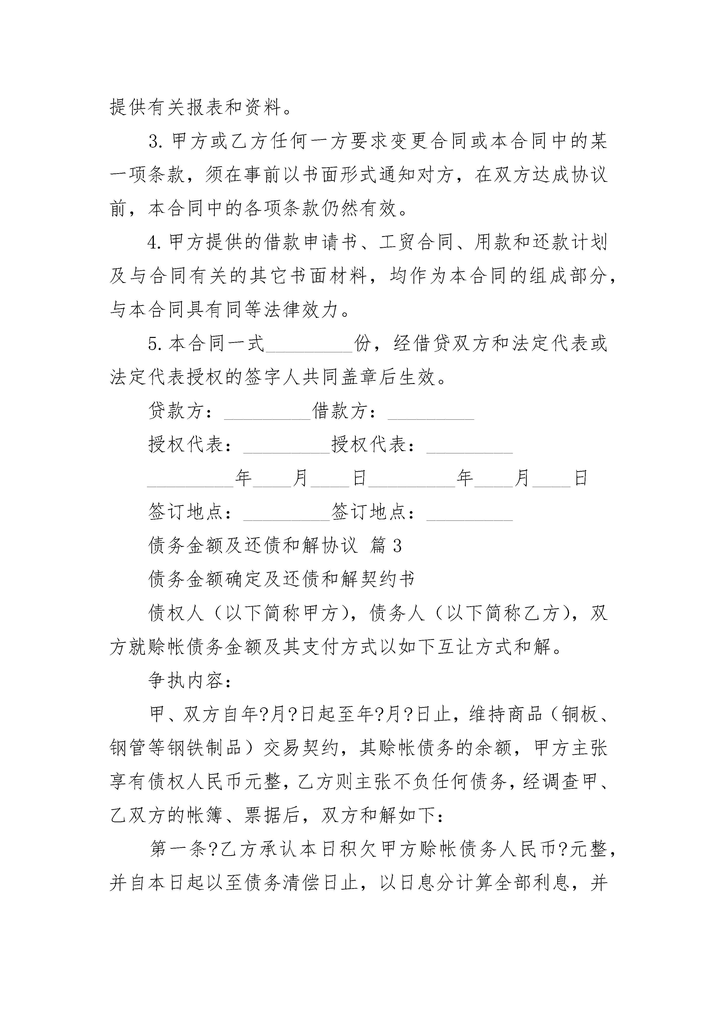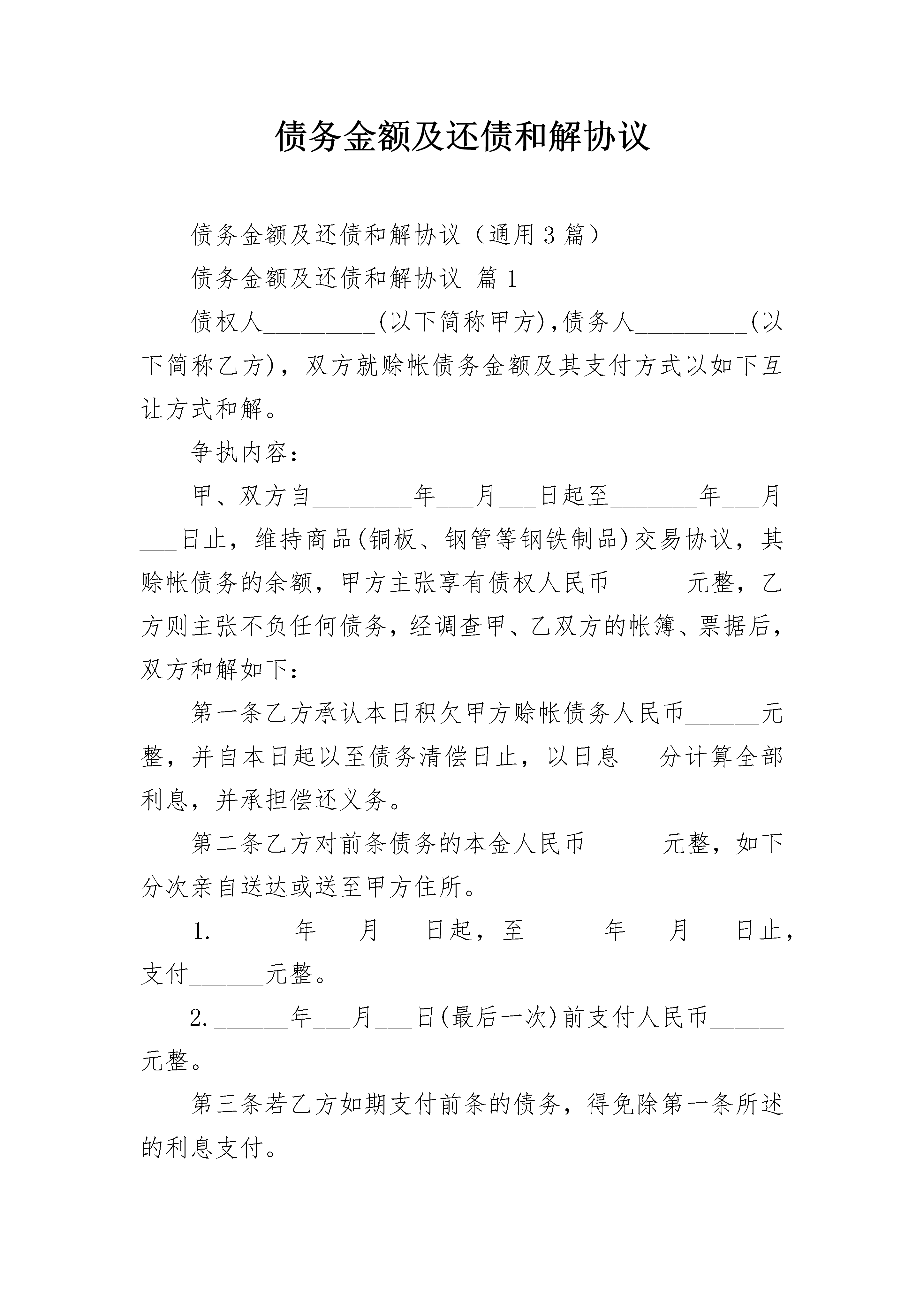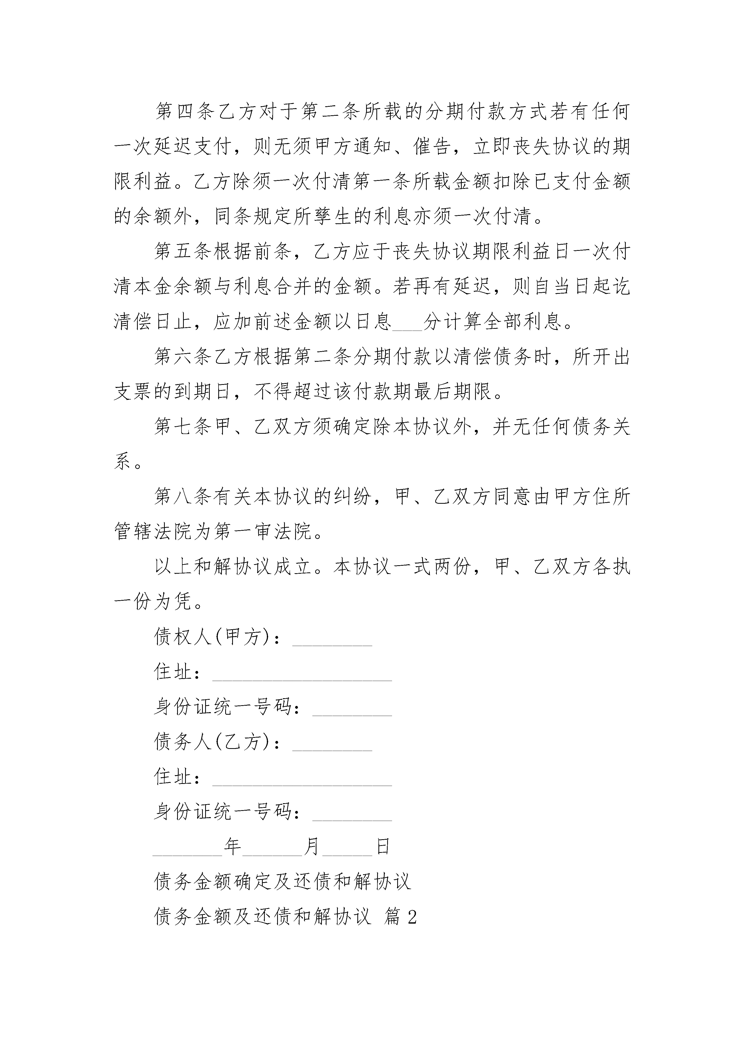 债务金额及还债和解协议债务金额及还债和解协议(通用3篇)债务金额及还债和解协议篇1债权人_________(以下简称甲方),债务人_________(以下简称乙方),双方就赊帐债务金额及其支付方式以如下互让方式和解。争执内容:甲、双方自________年___月___日起至_______年___月___日止,维持商品(铜板、钢管等钢铁制品)交易协议,其赊帐债务的余额,甲方主张享有债权人民币______元整,乙方则主张不负任何债务,经调查甲、乙双方的帐簿、票据后,双方和解如下:第一条乙方承认本日积欠甲方赊帐债务人民币______元整,并自本日起以至债务清偿日止,以日息___分计算全部利息,并承担偿还义务。第二条乙方对前条债务的本金人民币______元整,如下分次亲自送达或送至甲方住所。1.______年___月___日起,至______年___月___日止,支付______元整。2.______年___月___日(最后一次)前支付人民币______元整。第三条若乙方如期支付前条的债务,得免除第一条所述的利息支付。第四条乙方对于第二条所载的分期付款方式若有任何一次延迟支付,则无须甲方通知、催告,立即丧失协议的期限利益。乙方除须一次付清第一条所载金额扣除已支付金额的余额外,同条规定所孳生的利息亦须一次付清。第五条根据前条,乙方应于丧失协议期限利益日一次付清本金余额与利息合并的金额。若再有延迟,则自当日起讫清偿日止,应加前述金额以日息___分计算全部利息。第六条乙方根据第二条分期付款以清偿债务时,所开出支票的到期日,不得超过该付款期最后期限。第七条甲、乙双方须确定除本协议外,并无任何债务关系。第八条有关本协议的纠纷,甲、乙双方同意由甲方住所管辖法院为第一审法院。以上和解协议成立。本协议一式两份,甲、乙双方各执一份为凭。债权人(甲方):________住址:__________________身份证统一号码:________债务人(乙方):________住址:__________________身份证统一号码:_______________年______月_____日债务金额确定及还债和解协议债务金额及还债和解协议篇2合同编号:_________借款方:_________贷款方:_________根据_________号文件批准的_________项目。所需资金经甲方申请,乙方审查同意发放短期外汇贷款。双方同意遵照_________的规定签订本合同,并共同遵守。第一条借金额:外汇贷款_________。第二条借款用途:外汇贷款用于_________。第三条借款期限:本期贷款从_________年_________月_________日起至_________年_________月_________日甲方还清乙方全部贷款本息止。第四条借款利率:本期贷款年利率为_________%,乙方按季计收利息,如甲方不能按期付息,则转入贷款本金计收复息。在合同履行期间,如遇国家调整利率或变更计息办法,按国家规定执行。第五条借款使用:本合同签订后,甲方须向乙方提供订货卡片对外采购合同作为付款依据。甲方授权乙方凭有关进口部门的付款确认通知,主动从贷款账户中支付款项。以外币计算的保险费,国外银行手续费等,甲方委托乙方从贷款账户中扣收,并将“支款通知”联寄交甲方。第六条借款偿还:甲方保证在本合同规定的借款期限内按还款计划以所借同种外币偿还借款本息。还款计划附后。第七条还款担保:本合同项下的借款本息由_________作为甲方的担保人,并由担保人按乙方的要求向乙方出具担保函。一旦甲方不能按期偿还贷款本息,由担保单位承担还本付息责任。第八条违约责任1.甲方不按用款计划用款,其少用或多用部分须向乙方支付‰的承担费。乙方因本身责任不按用款计划提供贷款向甲方支付‰的违约金。2.甲方如不按合同规定使用贷款,乙方有权停止或收回全部或部分贷款,挪用贷款部分在原贷款利率的基础上加收%的罚息。3.如因不可抗力的原因,甲方不能在贷款期限终止日全部还清本息,应在到期日十天前向乙方提出展期申请。经乙方同意,双方共同修改合同的原借款期限,并重新确定相应的贷款利率。甲方未经乙方同意不按期归还的贷款,乙方有权从甲方在任何银行开立的账户内扣收,并从过期之日起,对逾期贷款部分按借款利率加收%的利息。第九条其它规定1.发生下列情况之一时,乙方有权停止发放贷款并立即或限期收回已经发放的贷款。甲方向乙方提供的情况、报表和各项资料不真实;甲方与第三者发生诉讼,经法院判决败诉,偿付赔偿金后,无力向乙方偿付贷款本息;甲方的资产总额不足抵偿其负债总额;甲方的保证人违反或失去保证书中规定的条件。2.乙方有权检查、监督贷款的使用情况,甲方应向乙方提供有关报表和资料。3.甲方或乙方任何一方要求变更合同或本合同