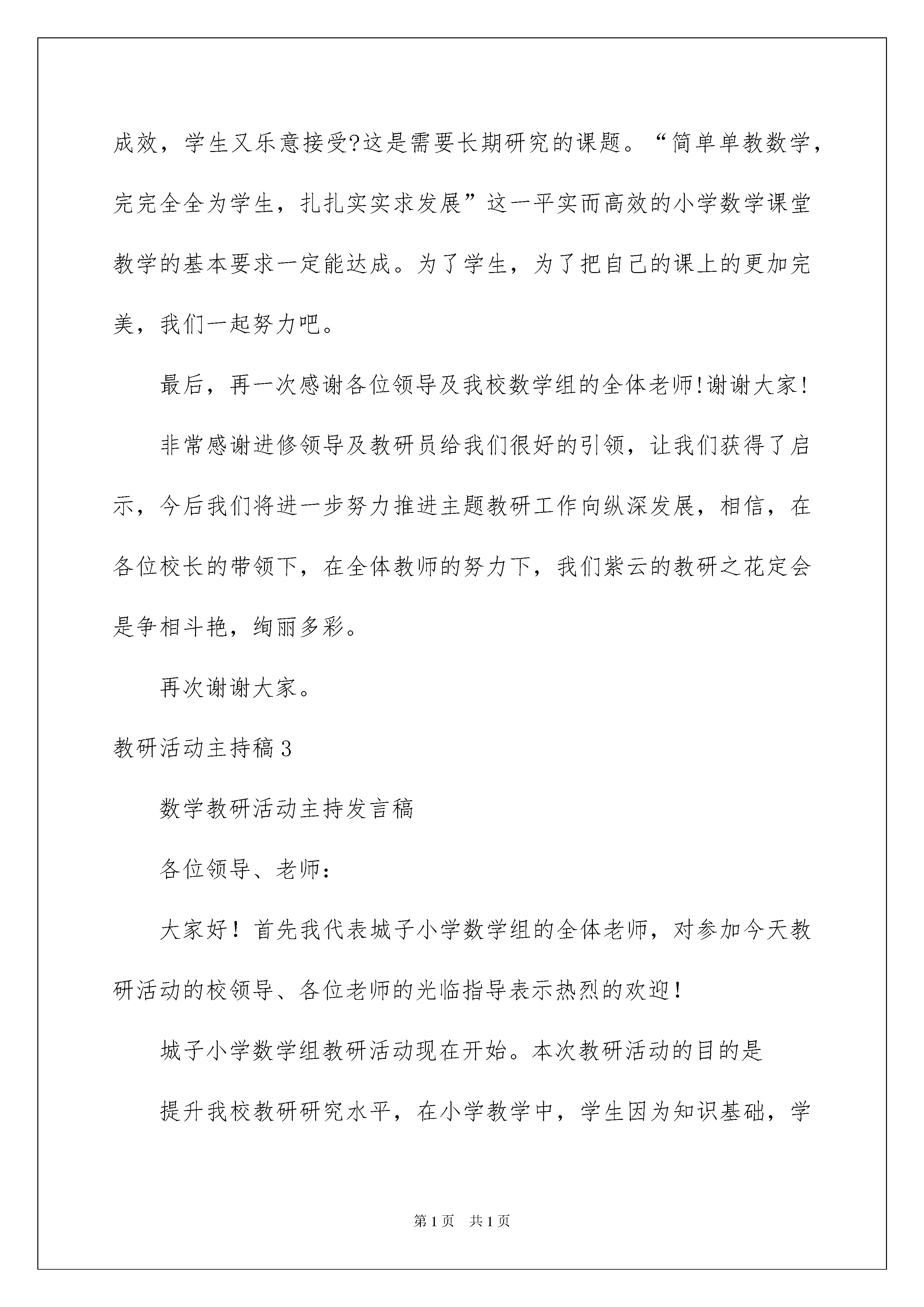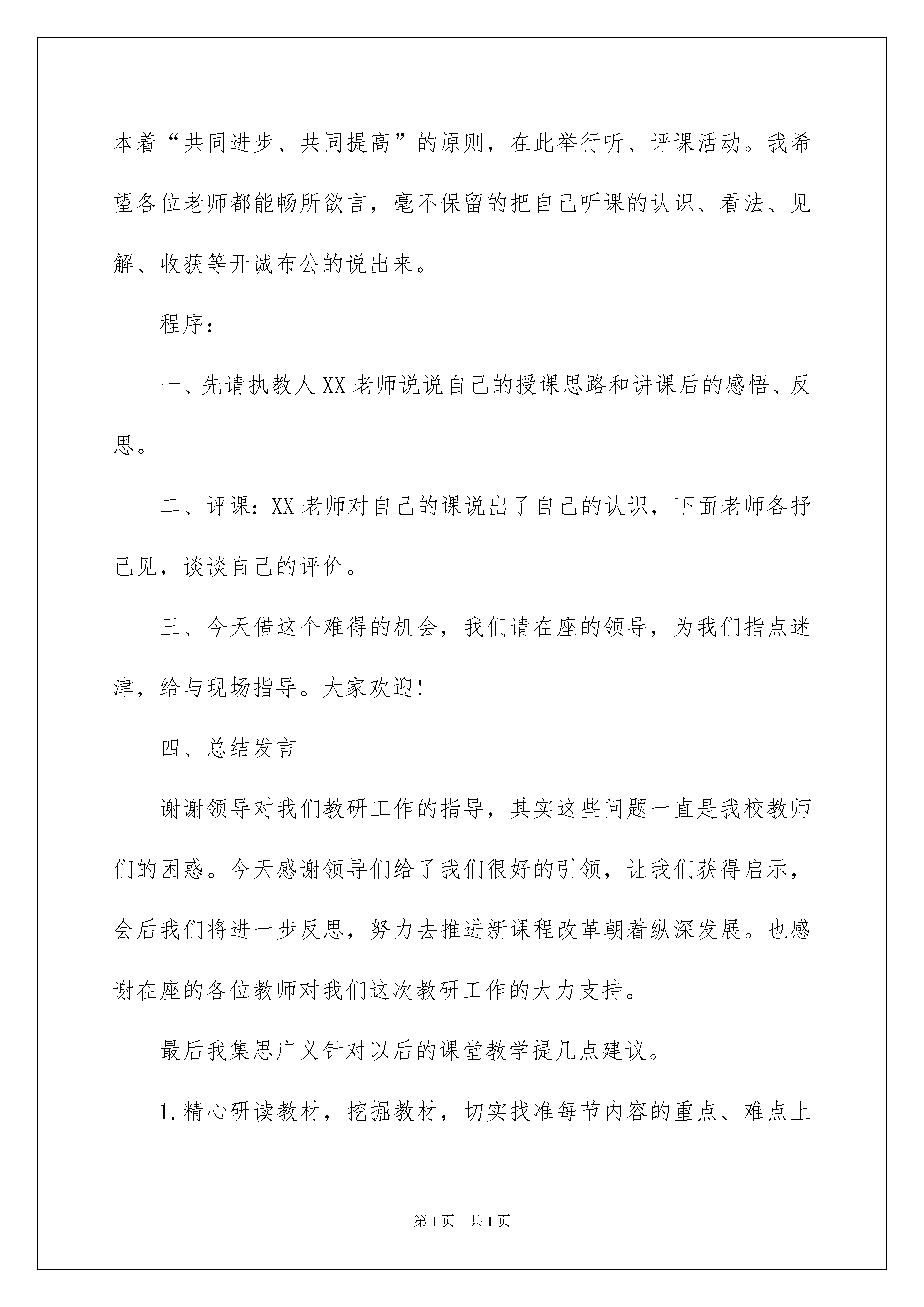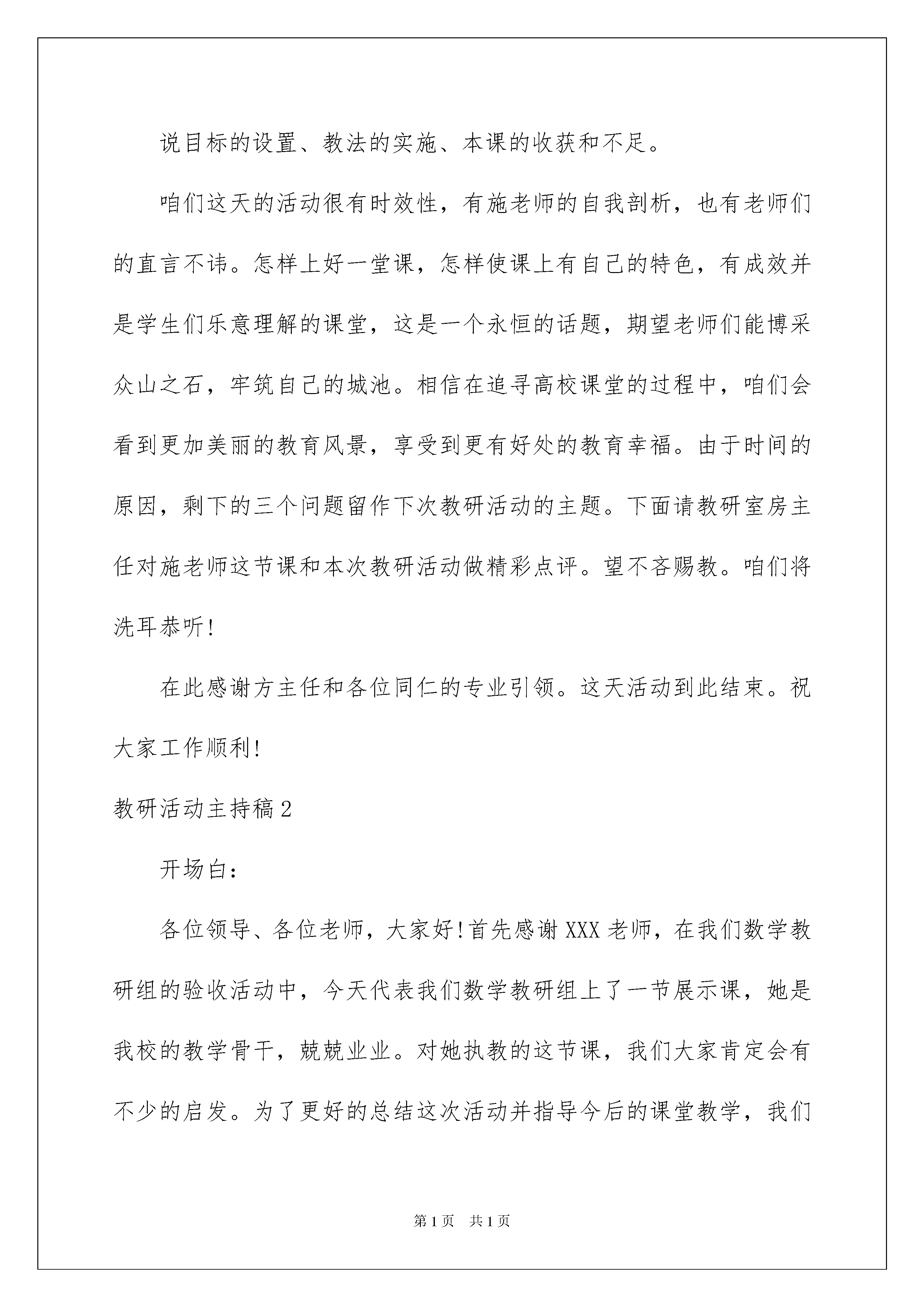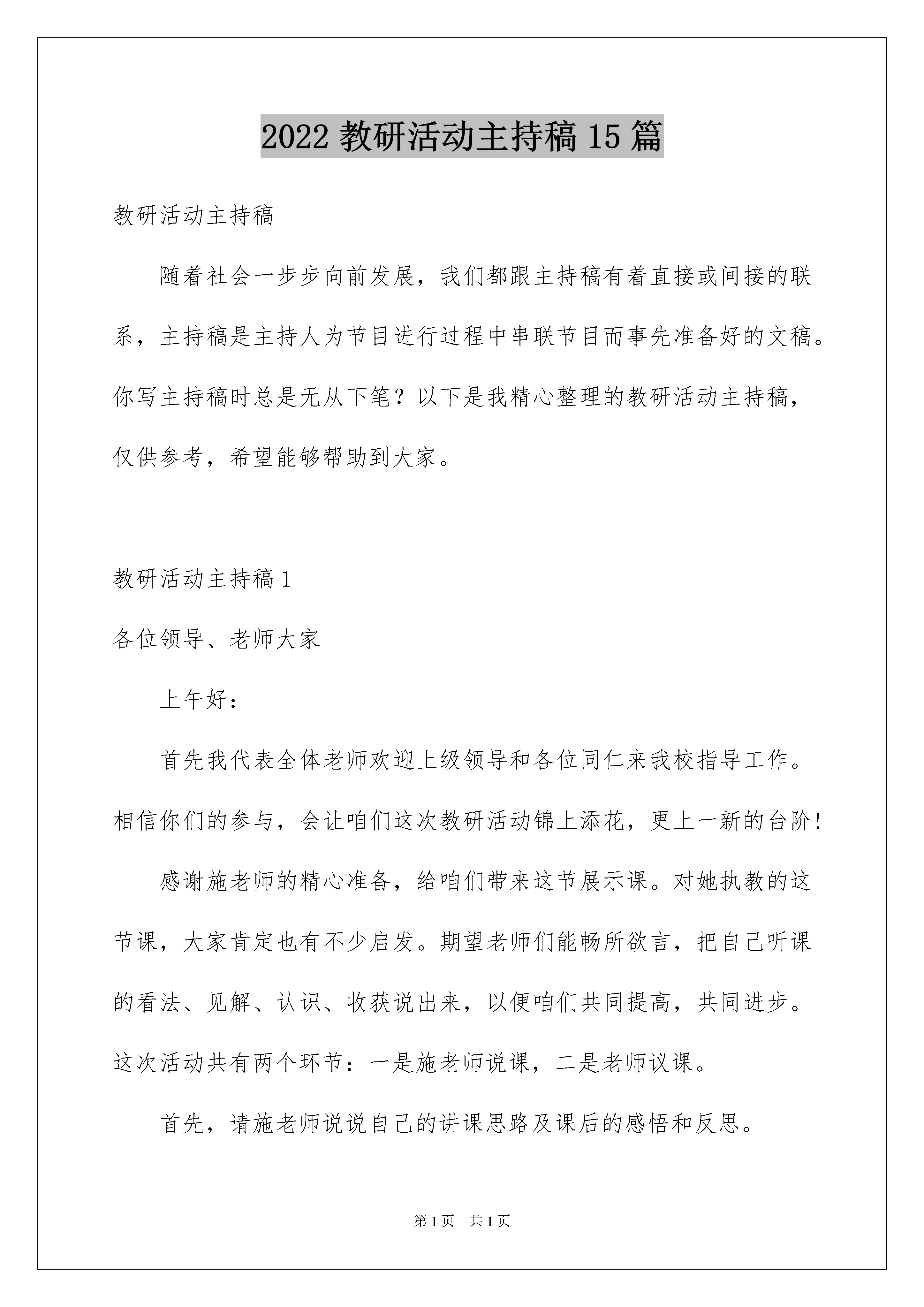 2022教研活动主持稿15篇教研活动主持稿随着社会一步步向前发展,我们都跟主持稿有着直接或间接的联系,主持稿是主持人为节目进行过程中串联节目而事先准备好的文稿。你写主持稿时总是无从下笔?以下是我精心整理的教研活动主持稿,仅供参考,希望能够帮助到大家。教研活动主持稿1各位领导、老师大家上午好:首先我代表全体老师欢迎上级领导和各位同仁来我校指导工作。相信你们的参与,会让咱们这次教研活动锦上添花,更上一新的台阶!感谢施老师的精心准备,给咱们带来这节展示课。对她执教的这节课,大家肯定也有不少启发。期望老师们能畅所欲言,把自己听课的看法、见解、认识、收获说出来,以便咱们共同提高,共同进步。这次活动共有两个环节:一是施老师说课,二是老师议课。首先,请施老师说说自己的讲课思路及课后的感悟和反思。说目标的设置、教法的实施、本课的收获和不足。咱们这天的活动很有时效性,有施老师的自我剖析,也有老师们的直言不讳。怎样上好一堂课,怎样使课上有自己的特色,有成效并是学生们乐意理解的课堂,这是一个永恒的话题,期望老师们能博采众山之石,牢筑自己的城池。相信在追寻高校课堂的过程中,咱们会看到更加美丽的教育风景,享受到更有好处的教育幸福。由于时间的原因,剩下的三个问题留作下次教研活动的主题。下面请教研室房主任对施老师这节课和本次教研活动做精彩点评。望不吝赐教。咱们将洗耳恭听!在此感谢方主任和各位同仁的专业引领。这天活动到此结束。祝大家工作顺利!教研活动主持稿2开场白:各位领导、各位老师,大家好!首先感谢XXX老师,在我们数学教研组的验收活动中,今天代表我们数学教研组上了一节展示课,她是我校的教学骨干,兢兢业业。对她执教的这节课,我们大家肯定会有不少的启发。为了更好的总结这次活动并指导今后的课堂教学,我们本着“共同进步、共同提高”的原则,在此举行听、评课活动。我希望各位老师都能畅所欲言,毫不保留的把自己听课的认识、看法、见解、收获等开诚布公的说出来。程序:一、先请执教人XX老师说说自己的授课思路和讲课后的感悟、反思。二、评课:XX老师对自己的课说出了自己的认识,下面老师各抒己见,谈谈自己的评价。三、今天借这个难得的机会,我们请在座的领导,为我们指点迷津,给与现场指导。大家欢迎!四、总结发言谢谢领导对我们教研工作的指导,其实这些问题一直是我校教师们的困惑。今天感谢领导们给了我们很好的引领,让我们获得启示,会后我们将进一步反思,努力去推进新课程改革朝着纵深发展。也感谢在座的各位教师对我们这次教研工作的大力支持。最后我集思广义针对以后的课堂教学提几点建议。1.精心研读教材,挖掘教材,切实找准每节内容的重点、难点上课前要思考一下:我这节课的理想目标是什么?我想让学生经历什么?获得什么?采用什么样的手段怎样才能达成我的教学目标?怎样设计教学比较合理?学生出现某种情况可怎样回应?怎样才能有效的抓住重点、突破难点?对这一切教师都要做到心中有数。2.要处理好内容与形式的关系一堂好课应该是内容与形式的完美结合。充实的内容能使学生获得更多的知识,并能提高能力、发展智力,而好的形式能激发学生的学习兴趣,使课堂教学收到事半功倍的效果。可是,当内容和形式不能统一时,我们宁可只要内容,不要花架子。3.要精心设计每个问题,引导学生多读书。我们的提问要有目的性,力求每道题都有存在的价值。要让学生在读书中感悟文本。4.努力提高自身素质。在闲暇时间里,我们要多读有关的教育教学书籍杂志,多掌握一些新的教学理念和先进的教学方法。特别是谢宇老师,你是我校的后备力量,是我们的生力军,一定要加强自身的基本功练习,内提素质,外塑形象,争取在较短的时间内把自己推出去。如何上好每一节课?怎样才能使课上的有自己的特色,而且还要有成效,学生又乐意接受?这是需要长期研究的课题。“简单单教数学,完完全全为学生,扎扎实实求发展”这一平实而高效的小学数学课堂教学的基本要求一定能达成。为了学生,为了把自己的课上的更加完美,我们一起努力吧。最后,再一次感谢各位领导及我校数学组的全体老师!谢谢大家!非常感谢进修领导及教研员给我们很好的引领,让我们获得了启示,今后我们将进一步努力推进主题教研工作向纵深发展,相信,在各位校长的带领下,在全体教师的努力下,我们紫云的教研之花定会是争相斗艳,绚丽多彩。再次谢谢大家。教研活动主持稿3数学教研活动主持发言稿各位领导、老师:大家好!首先我代表城子小学数学组的全体老师,对参加今天教研活动的校领导、各位老师的光临指导表示热烈的欢迎!城子小学数学组教研活动现在开始。本次教研活动的目的是提升我校教研研究水平,在小学教学中,学生因为知识基础,学习能力