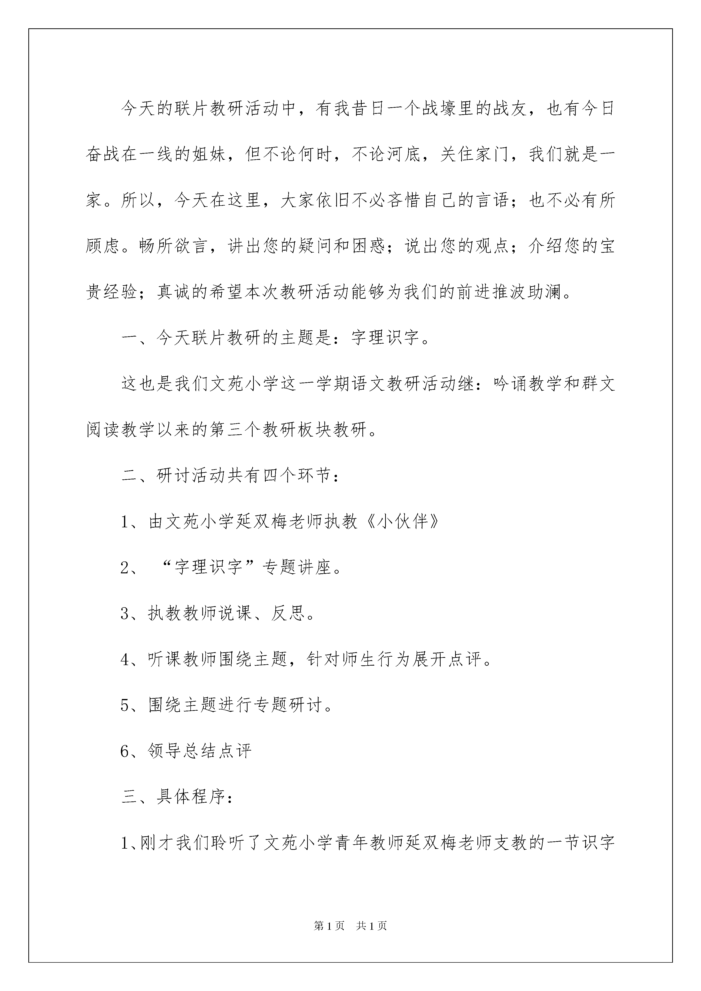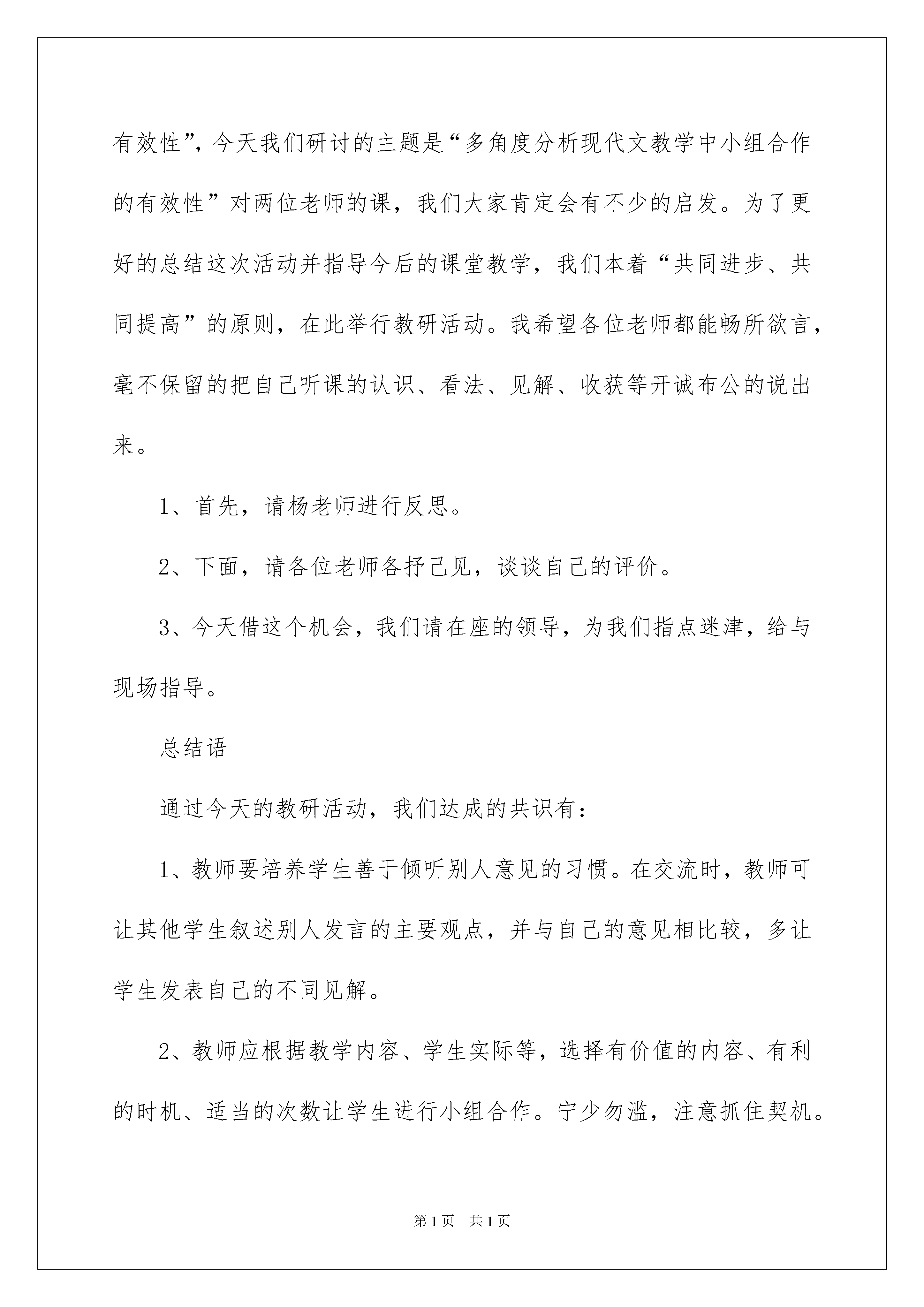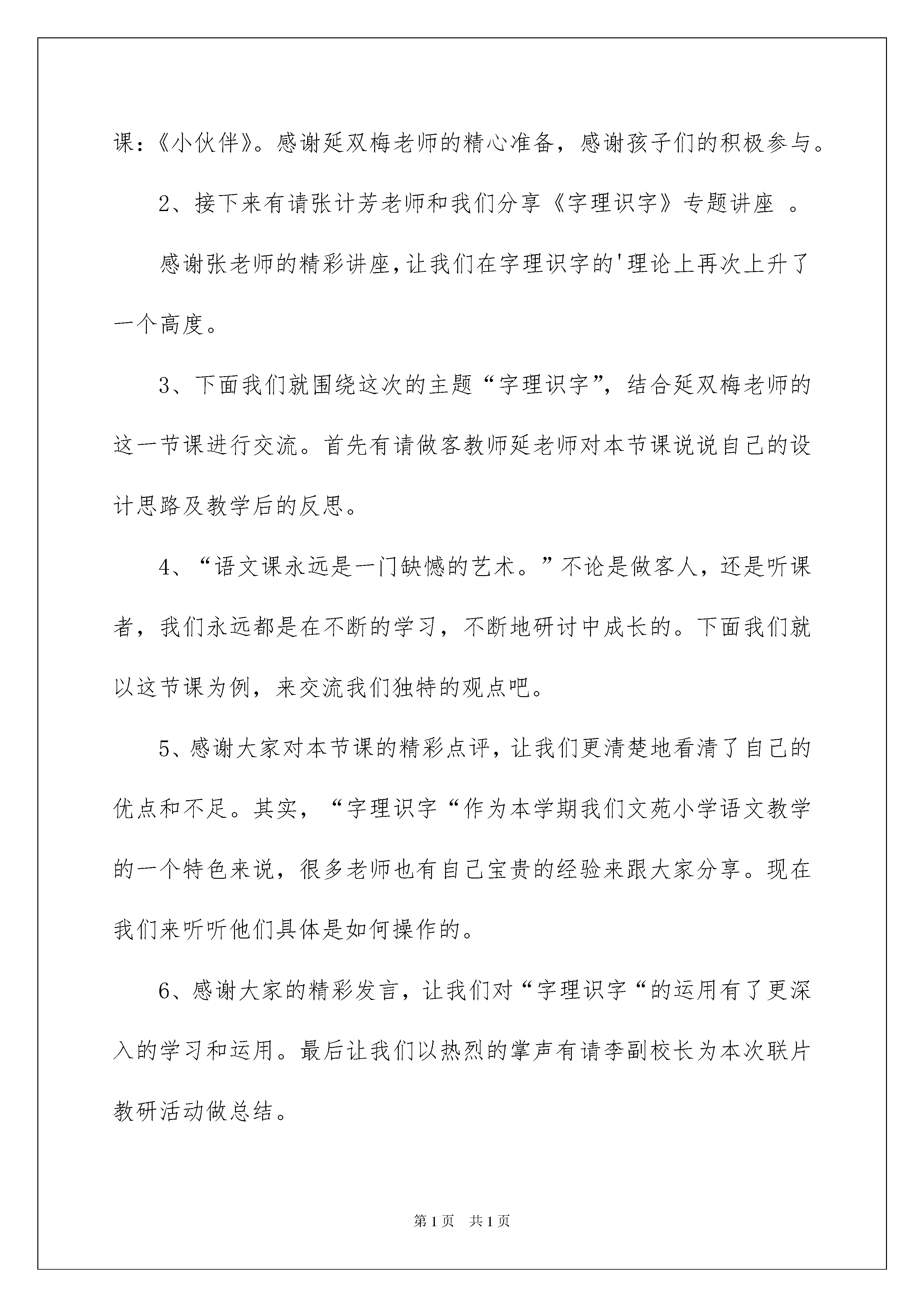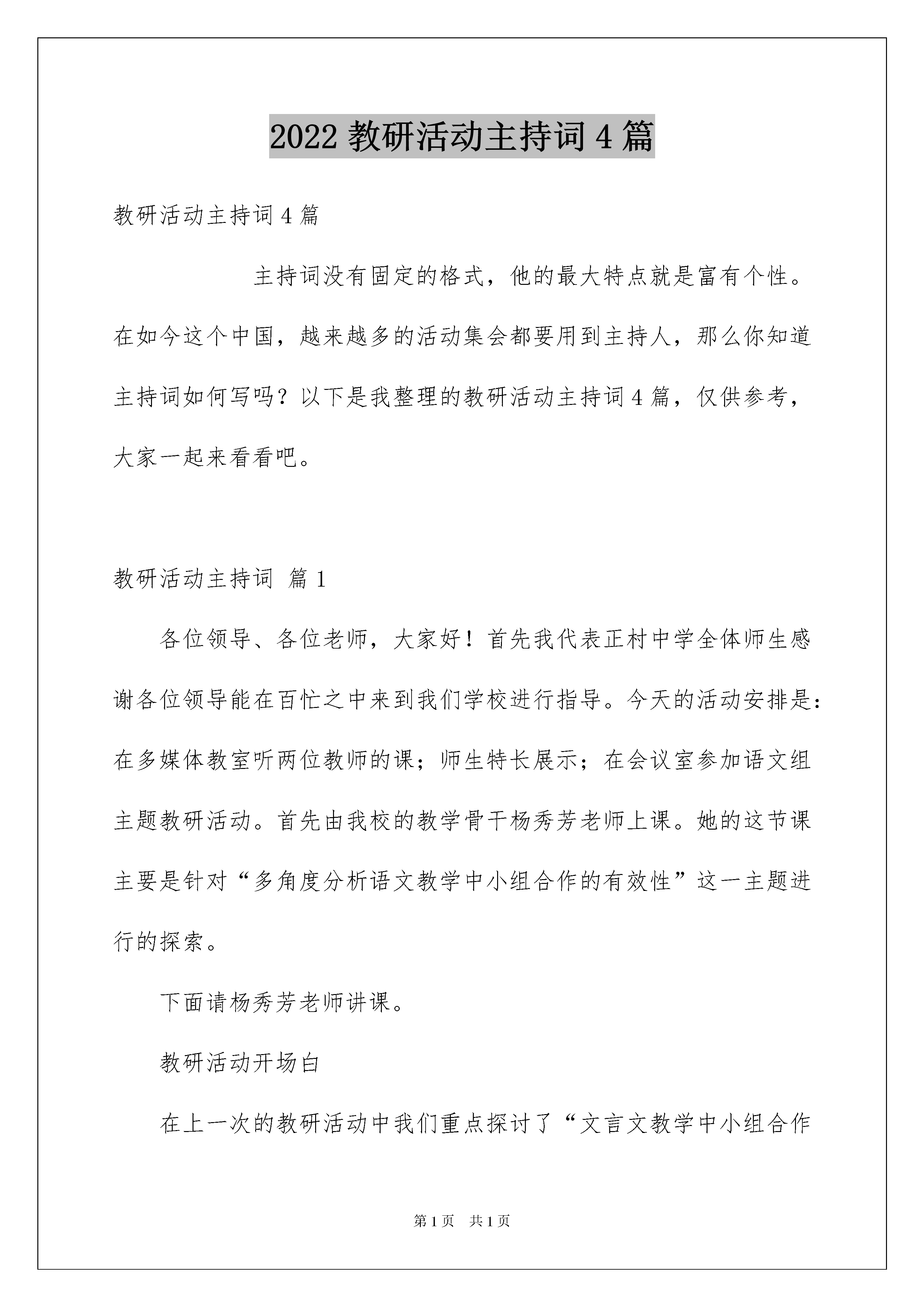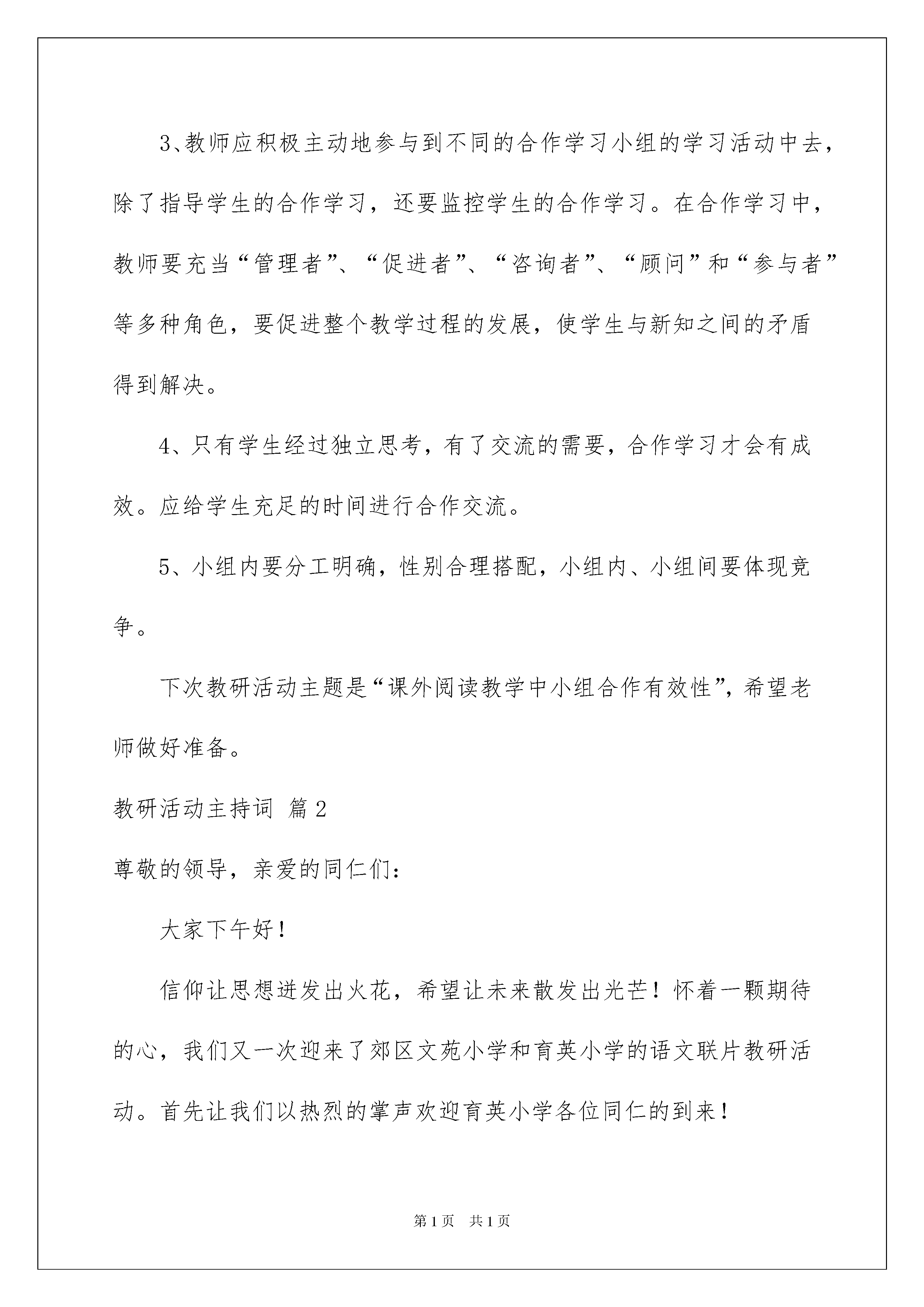 2022教研活动主持词4篇教研活动主持词4篇主持词没有固定的格式,他的最大特点就是富有个性。在如今这个中国,越来越多的活动集会都要用到主持人,那么你知道主持词如何写吗?以下是我整理的教研活动主持词4篇,仅供参考,大家一起来看看吧。教研活动主持词篇1各位领导、各位老师,大家好!首先我代表正村中学全体师生感谢各位领导能在百忙之中来到我们学校进行指导。今天的活动安排是:在多媒体教室听两位教师的课;师生特长展示;在会议室参加语文组主题教研活动。首先由我校的教学骨干杨秀芳老师上课。她的这节课主要是针对“多角度分析语文教学中小组合作的有效性”这一主题进行的探索。下面请杨秀芳老师讲课。教研活动开场白在上一次的教研活动中我们重点探讨了“文言文教学中小组合作有效性”,今天我们研讨的主题是“多角度分析现代文教学中小组合作的有效性”对两位老师的课,我们大家肯定会有不少的启发。为了更好的总结这次活动并指导今后的课堂教学,我们本着“共同进步、共同提高”的原则,在此举行教研活动。我希望各位老师都能畅所欲言,毫不保留的把自己听课的认识、看法、见解、收获等开诚布公的说出来。1、首先,请杨老师进行反思。2、下面,请各位老师各抒己见,谈谈自己的评价。3、今天借这个机会,我们请在座的领导,为我们指点迷津,给与现场指导。总结语通过今天的教研活动,我们达成的共识有:1、教师要培养学生善于倾听别人意见的习惯。在交流时,教师可让其他学生叙述别人发言的主要观点,并与自己的意见相比较,多让学生发表自己的不同见解。2、教师应根据教学内容、学生实际等,选择有价值的内容、有利的时机、适当的次数让学生进行小组合作。宁少勿滥,注意抓住契机。3、教师应积极主动地参与到不同的合作学习小组的学习活动中去,除了指导学生的合作学习,还要监控学生的合作学习。在合作学习中,教师要充当“管理者”、“促进者”、“咨询者”、“顾问”和“参与者”等多种角色,要促进整个教学过程的发展,使学生与新知之间的矛盾得到解决。4、只有学生经过独立思考,有了交流的需要,合作学习才会有成效。应给学生充足的时间进行合作交流。5、小组内要分工明确,性别合理搭配,小组内、小组间要体现竞争。下次教研活动主题是“课外阅读教学中小组合作有效性”,希望老师做好准备。教研活动主持词篇2尊敬的领导,亲爱的同仁们:大家下午好!信仰让思想迸发出火花,希望让未来散发出光芒!怀着一颗期待的心,我们又一次迎来了郊区文苑小学和育英小学的语文联片教研活动。首先让我们以热烈的掌声欢迎育英小学各位同仁的到来!今天的联片教研活动中,有我昔日一个战壕里的战友,也有今日奋战在一线的姐妹,但不论何时,不论河底,关住家门,我们就是一家。所以,今天在这里,大家依旧不必吝惜自己的言语;也不必有所顾虑。畅所欲言,讲出您的疑问和困惑;说出您的观点;介绍您的宝贵经验;真诚的希望本次教研活动能够为我们的前进推波助澜。一、今天联片教研的主题是:字理识字。这也是我们文苑小学这一学期语文教研活动继:吟诵教学和群文阅读教学以来的第三个教研板块教研。二、研讨活动共有四个环节:1、由文苑小学延双梅老师执教《小伙伴》2、“字理识字”专题讲座。3、执教教师说课、反思。4、听课教师围绕主题,针对师生行为展开点评。5、围绕主题进行专题研讨。6、领导总结点评三、具体程序:1、刚才我们聆听了文苑小学青年教师延双梅老师支教的一节识字课:《小伙伴》。感谢延双梅老师的精心准备,感谢孩子们的积极参与。2、接下来有请张计芳老师和我们分享《字理识字》专题讲座。感谢张老师的精彩讲座,让我们在字理识字的'理论上再次上升了一个高度。3、下面我们就围绕这次的主题“字理识字”,结合延双梅老师的这一节课进行交流。首先有请做客教师延老师对本节课说说自己的设计思路及教学后的反思。4、“语文课永远是一门缺憾的艺术。”不论是做客人,还是听课者,我们永远都是在不断的学习,不断地研讨中成长的。下面我们就以这节课为例,来交流我们独特的观点吧。5、感谢大家对本节课的精彩点评,让我们更清楚地看清了自己的优点和不足。其实,“字理识字“作为本学期我们文苑小学语文教学的一个特色来说,很多老师也有自己宝贵的经验来跟大家分享。现在我们来听听他们具体是如何操作的。6、感谢大家的精彩发言,让我们对“字理识字“的运用有了更深入的学习和运用。最后让我们以热烈的掌声有请李副校长为本次联片教研活动做总结。感谢李校长精彩的点评,感谢大家的大家的畅所欲言,最后让我们用最热烈的掌声有请杭锦旗教研室李彩梅老师为本次区域教研活动做总结。7、感谢李老师海纳百川式的总结,感谢各位同仁的积极参与。每一次的联片教研活动都记录着我