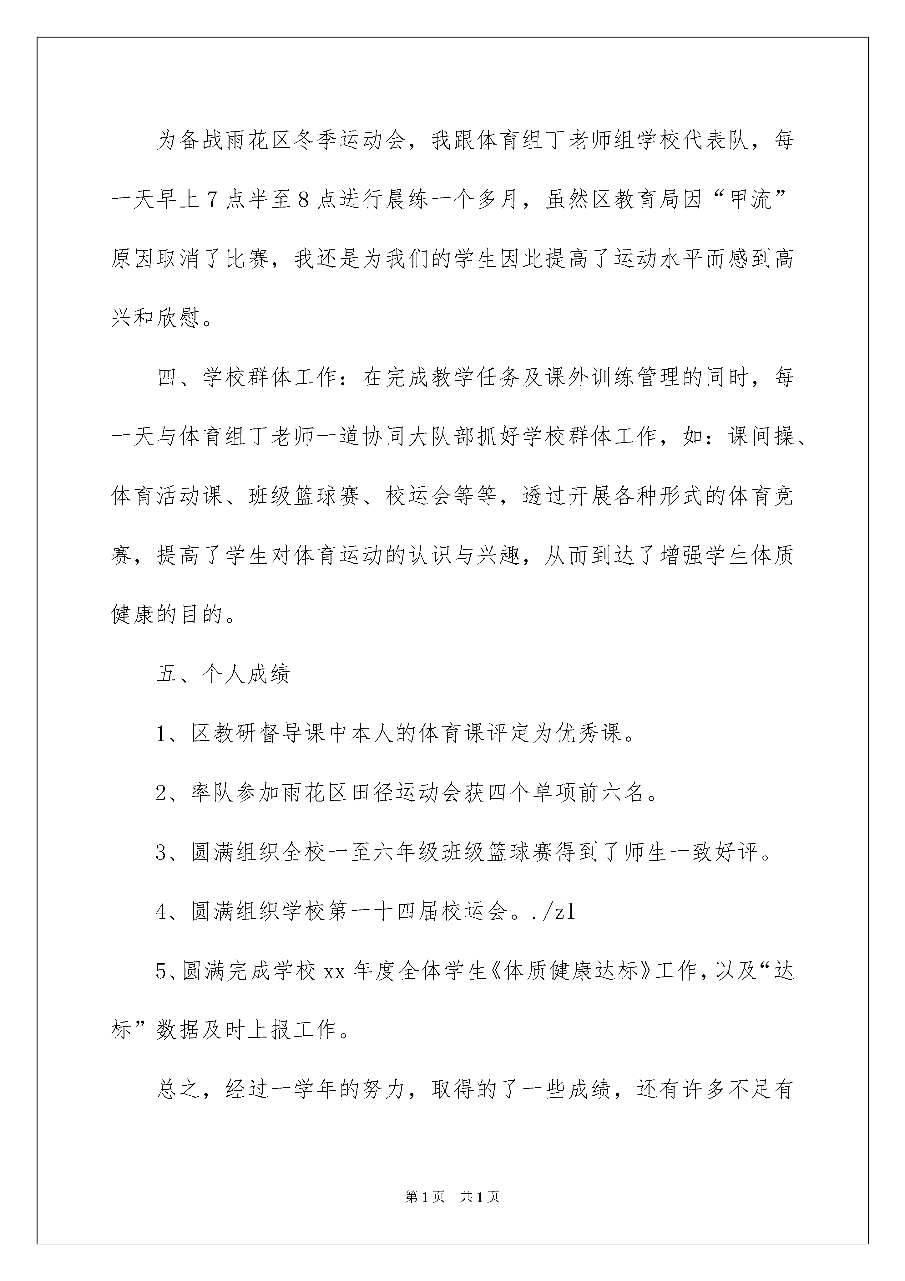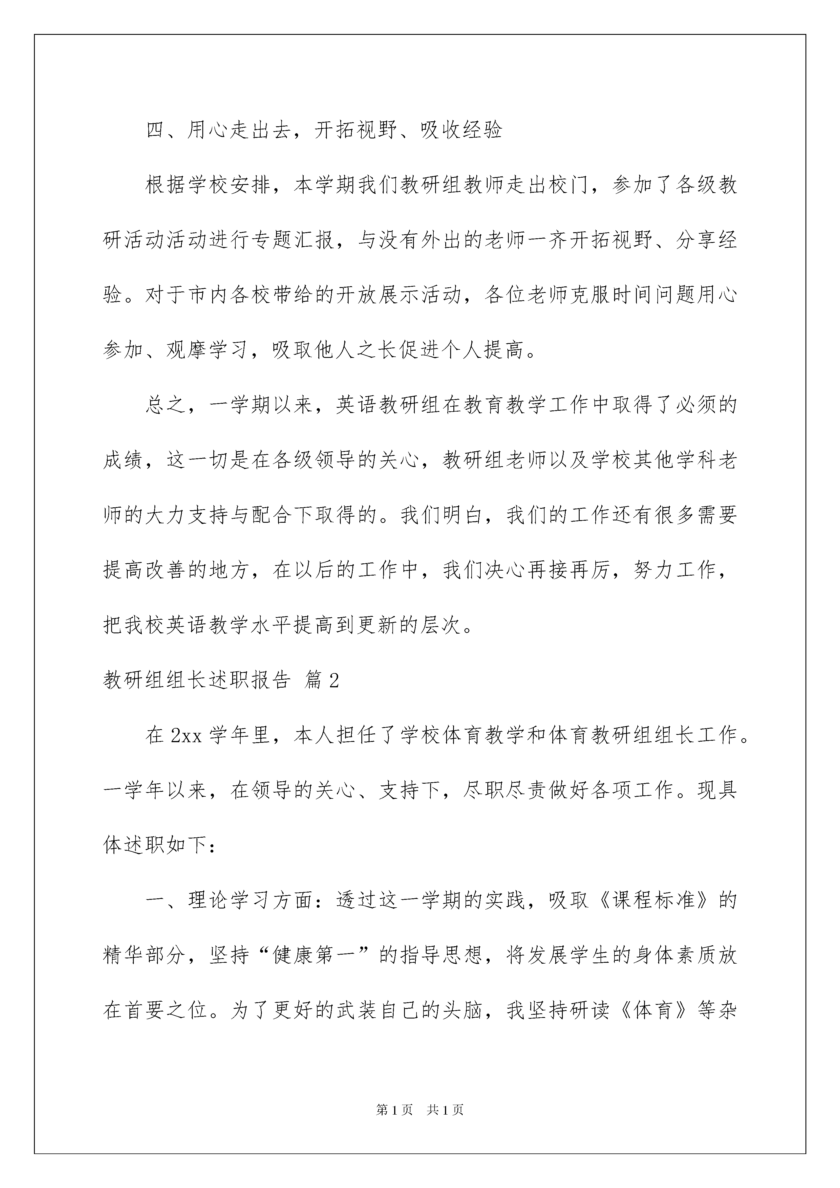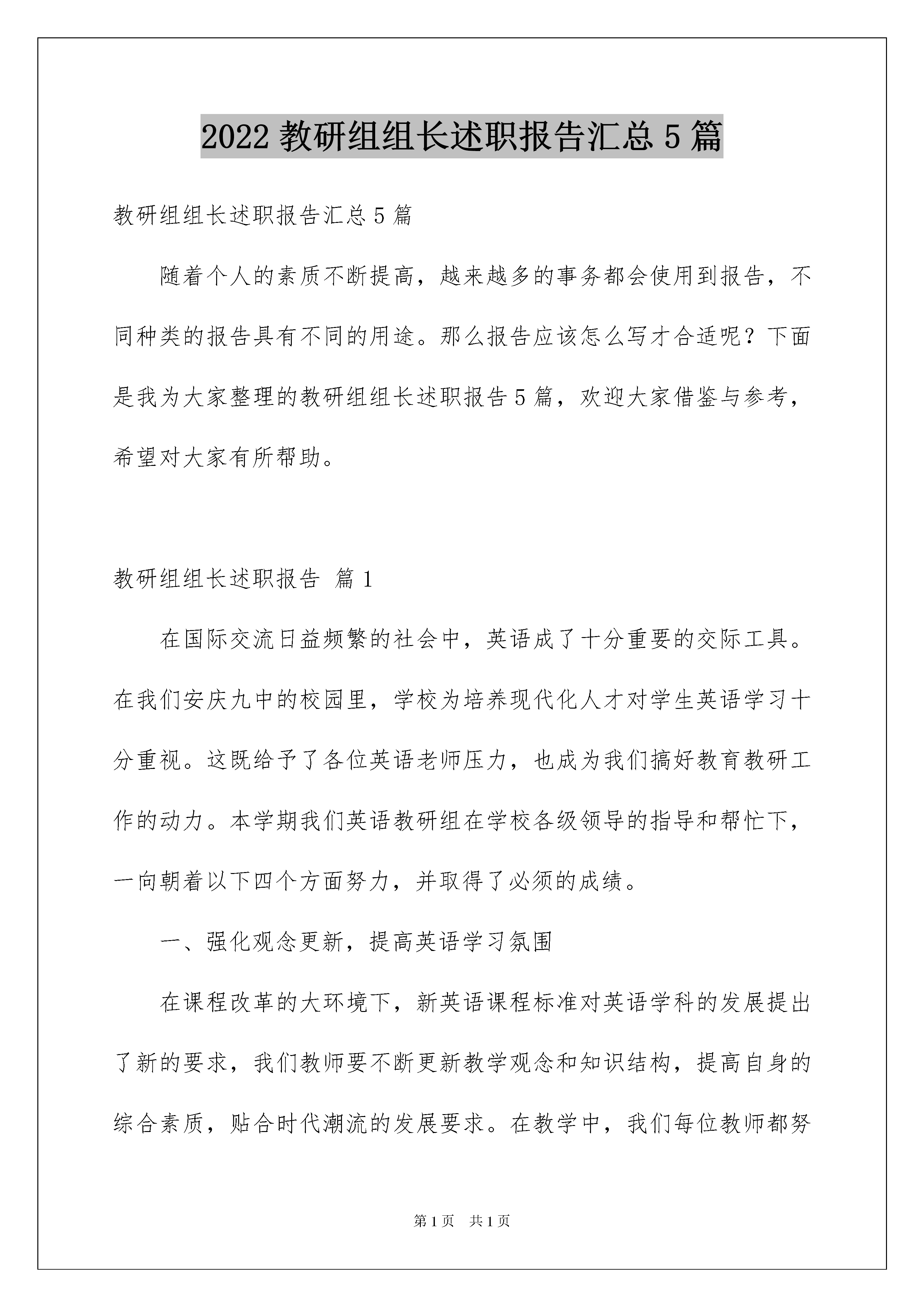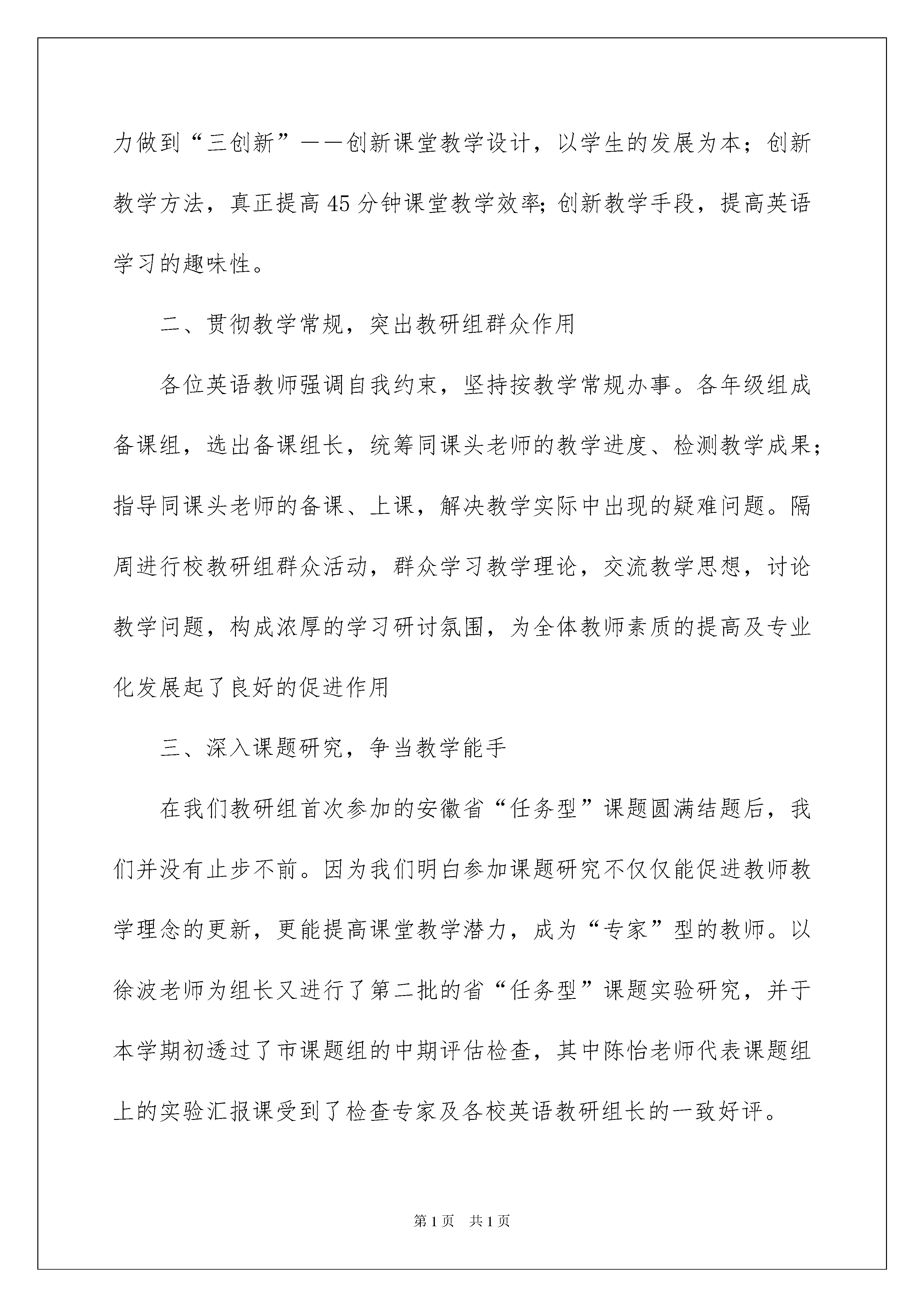 2022教研组组长述职报告汇总5篇教研组组长述职报告汇总5篇随着个人的素质不断提高,越来越多的事务都会使用到报告,不同种类的报告具有不同的用途。那么报告应该怎么写才合适呢?下面是我为大家整理的教研组组长述职报告5篇,欢迎大家借鉴与参考,希望对大家有所帮助。教研组组长述职报告篇1在国际交流日益频繁的社会中,英语成了十分重要的交际工具。在我们安庆九中的校园里,学校为培养现代化人才对学生英语学习十分重视。这既给予了各位英语老师压力,也成为我们搞好教育教研工作的动力。本学期我们英语教研组在学校各级领导的指导和帮忙下,一向朝着以下四个方面努力,并取得了必须的成绩。一、强化观念更新,提高英语学习氛围在课程改革的大环境下,新英语课程标准对英语学科的发展提出了新的要求,我们教师要不断更新教学观念和知识结构,提高自身的综合素质,贴合时代潮流的发展要求。在教学中,我们每位教师都努力做到“三创新”――创新课堂教学设计,以学生的发展为本;创新教学方法,真正提高45分钟课堂教学效率;创新教学手段,提高英语学习的趣味性。二、贯彻教学常规,突出教研组群众作用各位英语教师强调自我约束,坚持按教学常规办事。各年级组成备课组,选出备课组长,统筹同课头老师的教学进度、检测教学成果;指导同课头老师的备课、上课,解决教学实际中出现的疑难问题。隔周进行校教研组群众活动,群众学习教学理论,交流教学思想,讨论教学问题,构成浓厚的学习研讨氛围,为全体教师素质的提高及专业化发展起了良好的促进作用三、深入课题研究,争当教学能手在我们教研组首次参加的安徽省“任务型”课题圆满结题后,我们并没有止步不前。因为我们明白参加课题研究不仅仅能促进教师教学理念的更新,更能提高课堂教学潜力,成为“专家”型的教师。以徐波老师为组长又进行了第二批的省“任务型”课题实验研究,并于本学期初透过了市课题组的中期评估检查,其中陈怡老师代表课题组上的实验汇报课受到了检查专家及各校英语教研组长的一致好评。四、用心走出去,开拓视野、吸收经验根据学校安排,本学期我们教研组教师走出校门,参加了各级教研活动活动进行专题汇报,与没有外出的老师一齐开拓视野、分享经验。对于市内各校带给的开放展示活动,各位老师克服时间问题用心参加、观摩学习,吸取他人之长促进个人提高。总之,一学期以来,英语教研组在教育教学工作中取得了必须的成绩,这一切是在各级领导的关心,教研组老师以及学校其他学科老师的大力支持与配合下取得的。我们明白,我们的工作还有很多需要提高改善的地方,在以后的工作中,我们决心再接再厉,努力工作,把我校英语教学水平提高到更新的层次。教研组组长述职报告篇2在2xx学年里,本人担任了学校体育教学和体育教研组组长工作。一学年以来,在领导的关心、支持下,尽职尽责做好各项工作。现具体述职如下:一、理论学习方面:透过这一学期的实践,吸取《课程标准》的精华部分,坚持“健康第一”的指导思想,将发展学生的身体素质放在首要之位。为了更好的武装自己的头脑,我坚持研读《体育》等杂志,登陆体育学科的前沿网站,并认真做笔记,建立了自己的博客,及时反思每一节课的教学,记录经典案例,用心撰写自己的所感所思。二、体育教学方面:一学期来,在区体校领导的指导和自己的努力下,教育教学水平有了必须的提高,在课堂上,注重常规教育。日常教学中,认真备课,严格按照教学计划上每一节课,绝不“放羊”,由于专业的原因,体育老师都是带几个班的课,所以我认真分析各班的学情与不同点,采用不同的教学方法,努力让学生掌握各项运动技能。在每学期开学第一节课我就会将体育课的常规、要求对他们说清楚,并且强调体育课和语文、数学、外语等学科一样,是一门课,不是玩。此刻已经构成了常规,我们的体育课有序而精彩。上半年的学校教研课和区教研督导课中受到区体校领导和学校领导的好评,并获得优秀课的光荣称号,为学校体育教学做出了必须的成绩。三、业余训练方面:篮球运动是我校的传统体育项目,本年度由于本人身体等状况虽不能承担教练员工作,作为体育教研组长心系学校,为学校寻找能胜任篮球训练的教练员,承担了学校篮球训练队的管理工作,并把自己多年来的训练经验传授给年轻教练,促使我校篮球训练工作顺利开展以及继续发扬光大。为备战雨花区冬季运动会,我跟体育组丁老师组学校代表队,每一天早上7点半至8点进行晨练一个多月,虽然区教育局因“甲流”原因取消了比赛,我还是为我们的学生因此提高了运动水平而感到高兴和欣慰。四、学校群体工作:在完成教学任务及课外训练管理的同时,每一天与体育组丁老师一道协同大队部抓好学校群体工作,如:课间操、体育活动课、班级篮球赛、校运会等等,透过开展各种形式