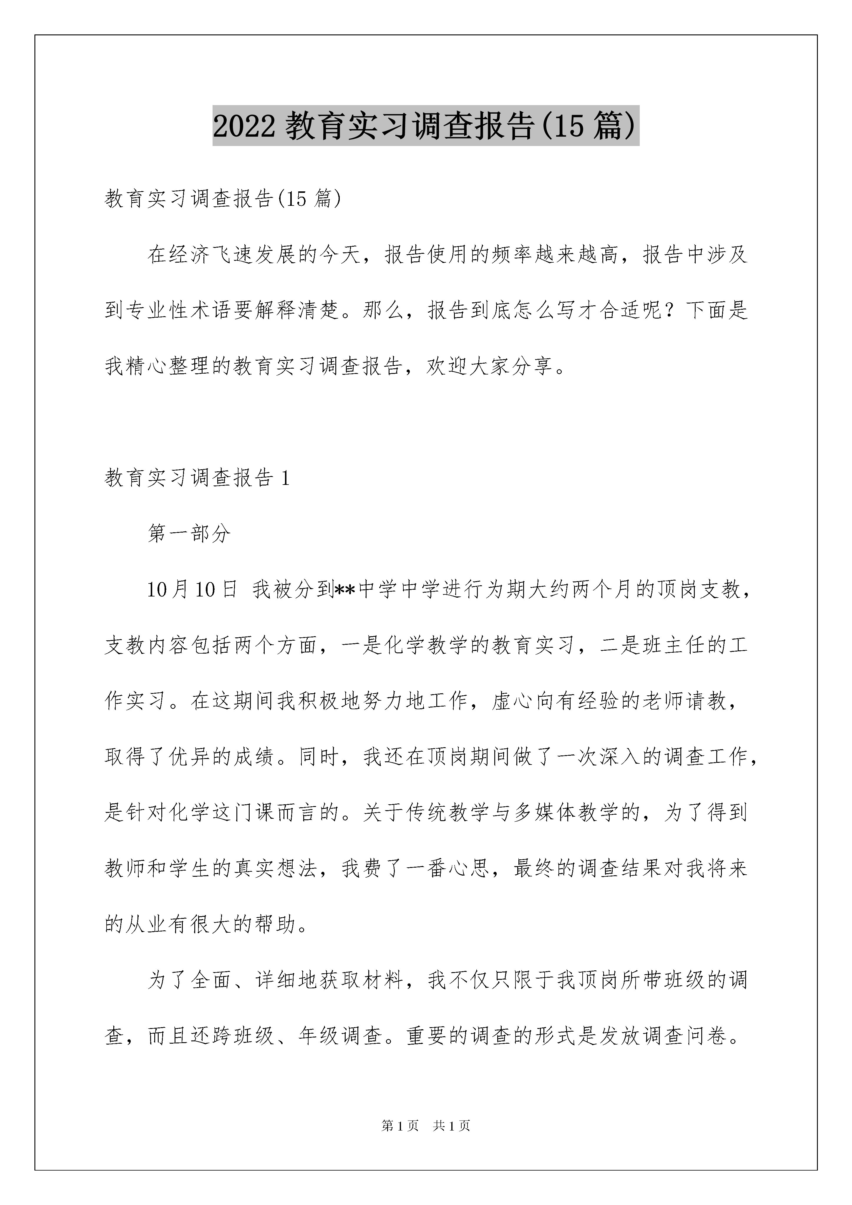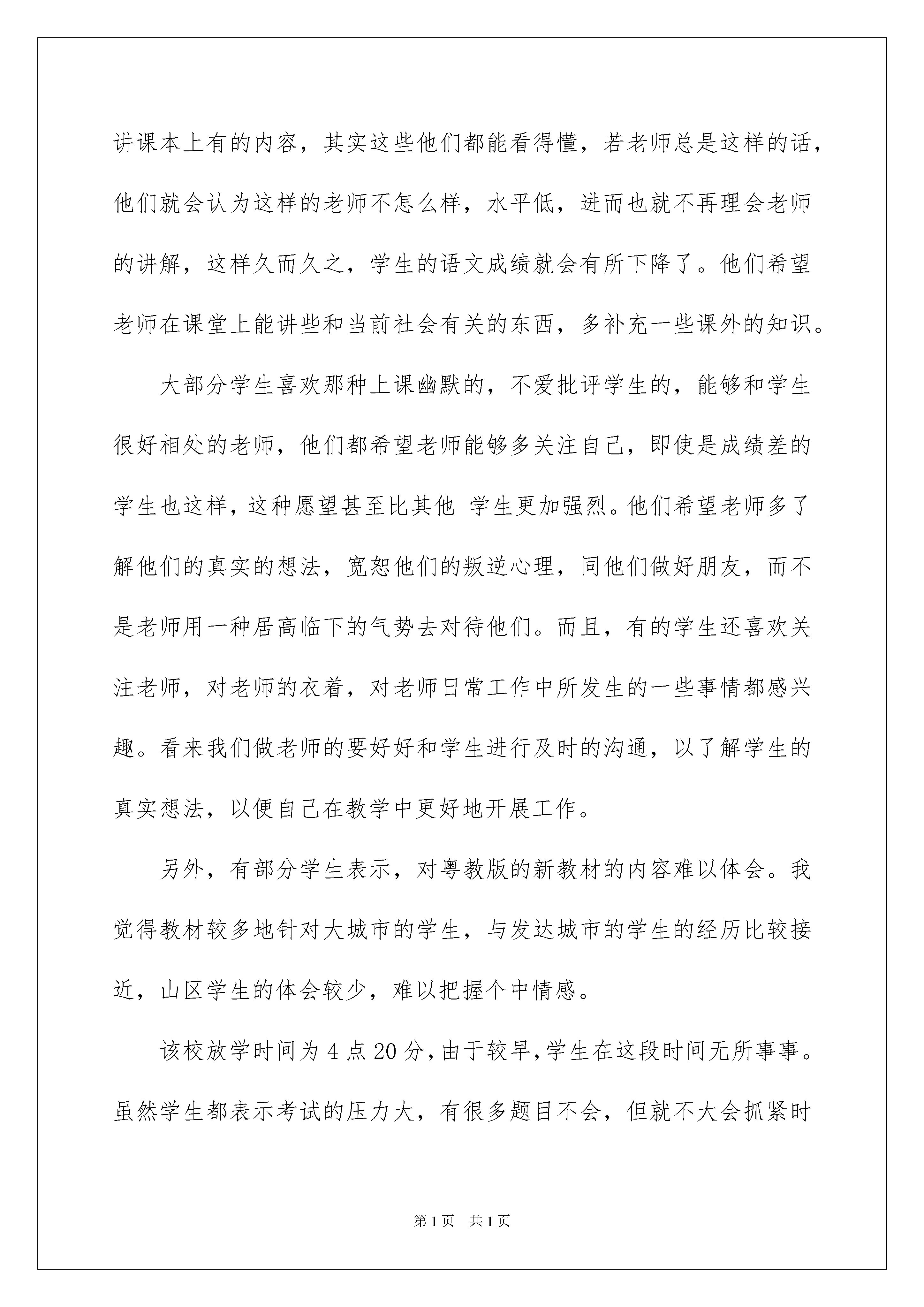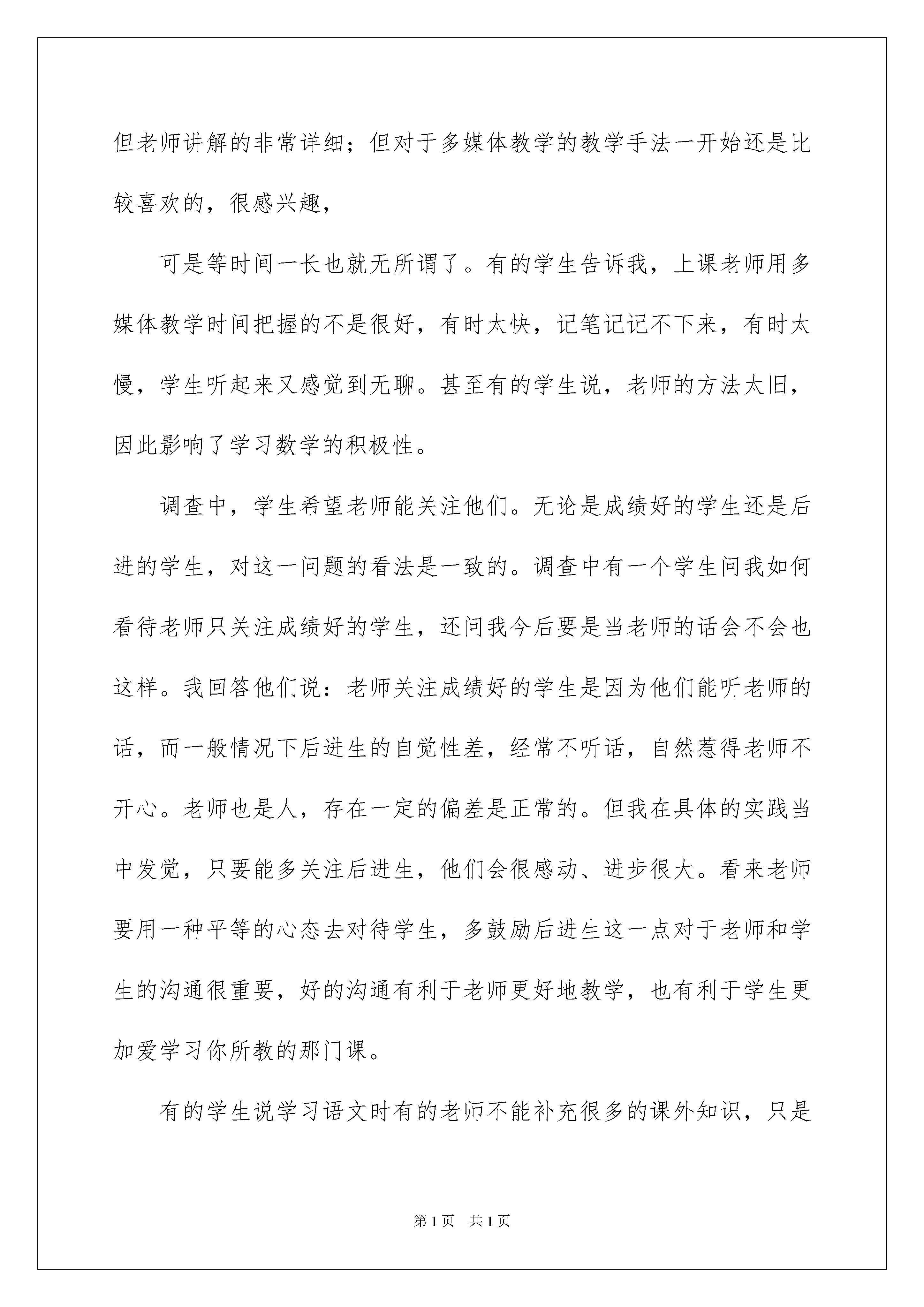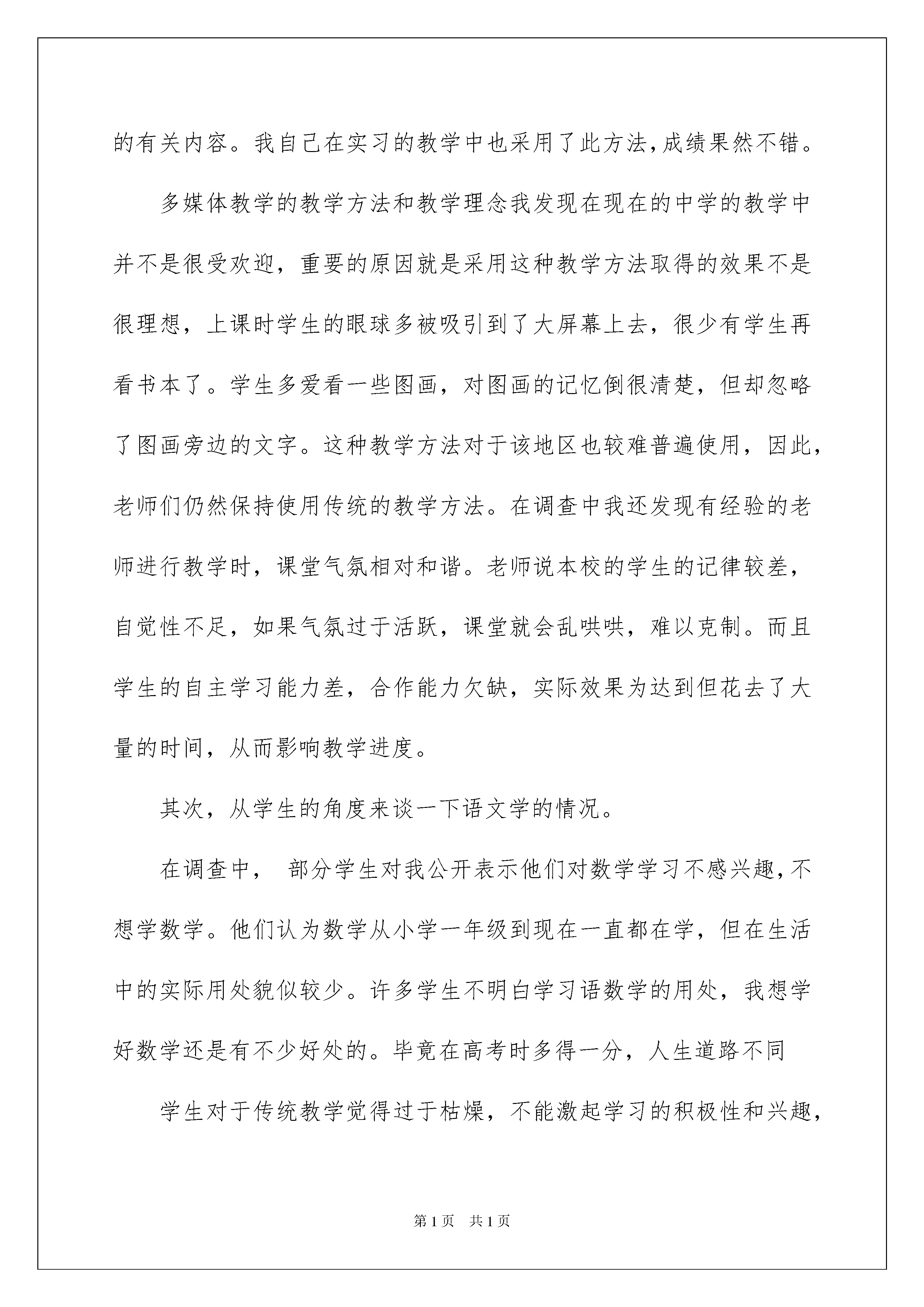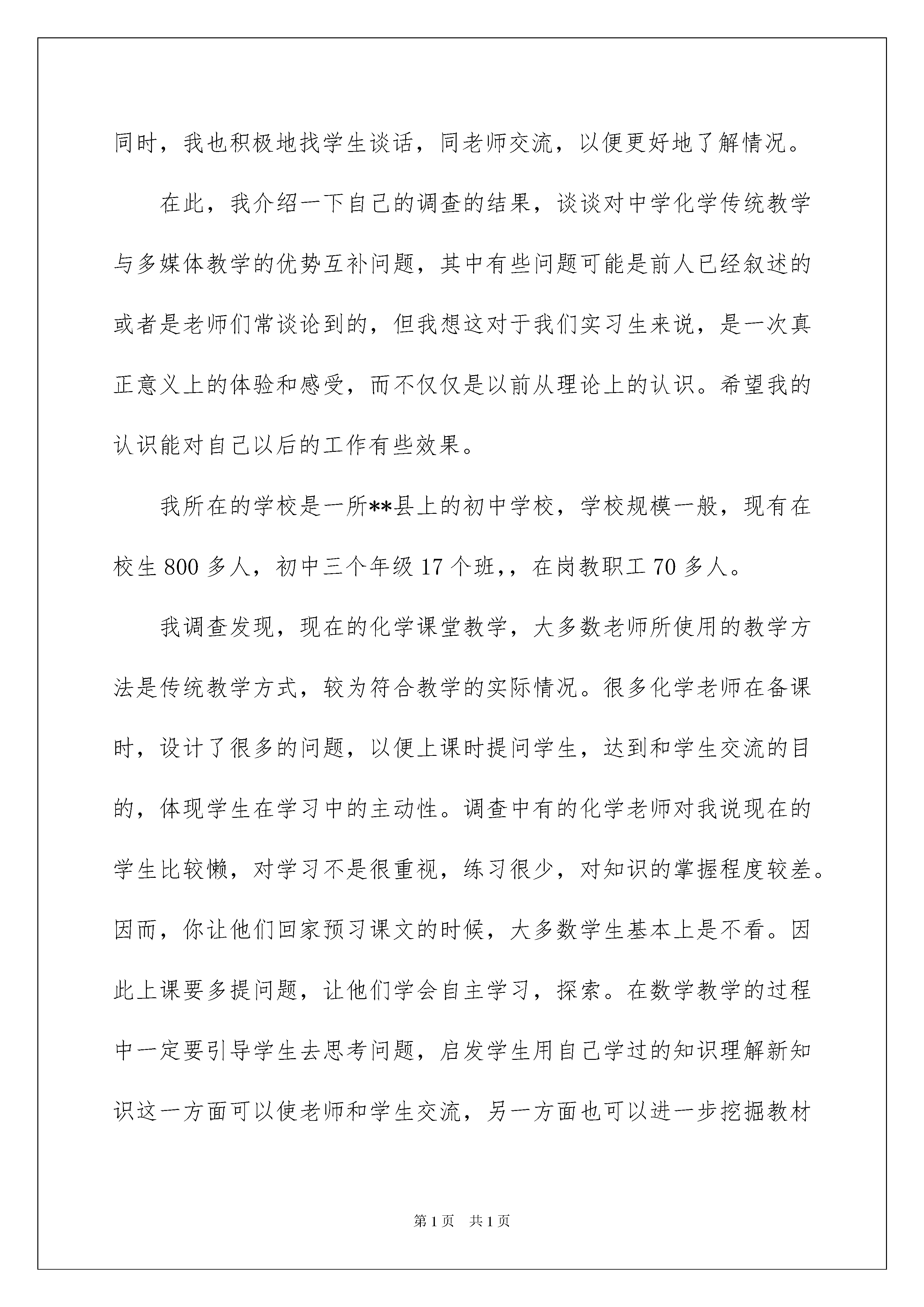 2022教育实习调查报告(15篇)教育实习调查报告(15篇)在经济飞速发展的今天,报告使用的频率越来越高,报告中涉及到专业性术语要解释清楚。那么,报告到底怎么写才合适呢?下面是我精心整理的教育实习调查报告,欢迎大家分享。教育实习调查报告1第一部分10月10日我被分到**中学中学进行为期大约两个月的顶岗支教,支教内容包括两个方面,一是化学教学的教育实习,二是班主任的工作实习。在这期间我积极地努力地工作,虚心向有经验的老师请教,取得了优异的成绩。同时,我还在顶岗期间做了一次深入的调查工作,是针对化学这门课而言的。关于传统教学与多媒体教学的,为了得到教师和学生的真实想法,我费了一番心思,最终的调查结果对我将来的从业有很大的帮助。为了全面、详细地获取材料,我不仅只限于我顶岗所带班级的调查,而且还跨班级、年级调查。重要的调查的形式是发放调查问卷。同时,我也积极地找学生谈话,同老师交流,以便更好地了解情况。在此,我介绍一下自己的调查的结果,谈谈对中学化学传统教学与多媒体教学的优势互补问题,其中有些问题可能是前人已经叙述的或者是老师们常谈论到的,但我想这对于我们实习生来说,是一次真正意义上的体验和感受,而不仅仅是以前从理论上的认识。希望我的认识能对自己以后的工作有些效果。我所在的学校是一所**县上的初中学校,学校规模一般,现有在校生800多人,初中三个年级17个班,,在岗教职工70多人。我调查发现,现在的化学课堂教学,大多数老师所使用的教学方法是传统教学方式,较为符合教学的实际情况。很多化学老师在备课时,设计了很多的问题,以便上课时提问学生,达到和学生交流的目的,体现学生在学习中的主动性。调查中有的化学老师对我说现在的学生比较懒,对学习不是很重视,练习很少,对知识的掌握程度较差。因而,你让他们回家预习课文的时候,大多数学生基本上是不看。因此上课要多提问题,让他们学会自主学习,探索。在数学教学的过程中一定要引导学生去思考问题,启发学生用自己学过的知识理解新知识这一方面可以使老师和学生交流,另一方面也可以进一步挖掘教材的有关内容。我自己在实习的教学中也采用了此方法,成绩果然不错。多媒体教学的教学方法和教学理念我发现在现在的中学的教学中并不是很受欢迎,重要的原因就是采用这种教学方法取得的效果不是很理想,上课时学生的眼球多被吸引到了大屏幕上去,很少有学生再看书本了。学生多爱看一些图画,对图画的记忆倒很清楚,但却忽略了图画旁边的文字。这种教学方法对于该地区也较难普遍使用,因此,老师们仍然保持使用传统的教学方法。在调查中我还发现有经验的老师进行教学时,课堂气氛相对和谐。老师说本校的学生的记律较差,自觉性不足,如果气氛过于活跃,课堂就会乱哄哄,难以克制。而且学生的自主学习能力差,合作能力欠缺,实际效果为达到但花去了大量的时间,从而影响教学进度。其次,从学生的角度来谈一下语文学的情况。在调查中,部分学生对我公开表示他们对数学学习不感兴趣,不想学数学。他们认为数学从小学一年级到现在一直都在学,但在生活中的实际用处貌似较少。许多学生不明白学习语数学的用处,我想学好数学还是有不少好处的。毕竟在高考时多得一分,人生道路不同学生对于传统教学觉得过于枯燥,不能激起学习的积极性和兴趣,但老师讲解的非常详细;但对于多媒体教学的教学手法一开始还是比较喜欢的,很感兴趣,可是等时间一长也就无所谓了。有的学生告诉我,上课老师用多媒体教学时间把握的不是很好,有时太快,记笔记记不下来,有时太慢,学生听起来又感觉到无聊。甚至有的学生说,老师的方法太旧,因此影响了学习数学的积极性。调查中,学生希望老师能关注他们。无论是成绩好的学生还是后进的学生,对这一问题的看法是一致的。调查中有一个学生问我如何看待老师只关注成绩好的学生,还问我今后要是当老师的话会不会也这样。我回答他们说:老师关注成绩好的学生是因为他们能听老师的话,而一般情况下后进生的自觉性差,经常不听话,自然惹得老师不开心。老师也是人,存在一定的偏差是正常的。但我在具体的实践当中发觉,只要能多关注后进生,他们会很感动、进步很大。看来老师要用一种平等的心态去对待学生,多鼓励后进生这一点对于老师和学生的沟通很重要,好的沟通有利于老师更好地教学,也有利于学生更加爱学习你所教的那门课。有的学生说学习语文时有的老师不能补充很多的课外知识,只是讲课本上有的内容,其实这些他们都能看得懂,若老师总是这样的话,他们就会认为这样的老师不怎么样,水平低,进而也就不再理会老师的讲解,这样久而久之,学生的语文成绩就会有所下降了。他们希望老师在课堂上能讲些和当前社会有关的东西,多补充一些课外的知识。大部分学